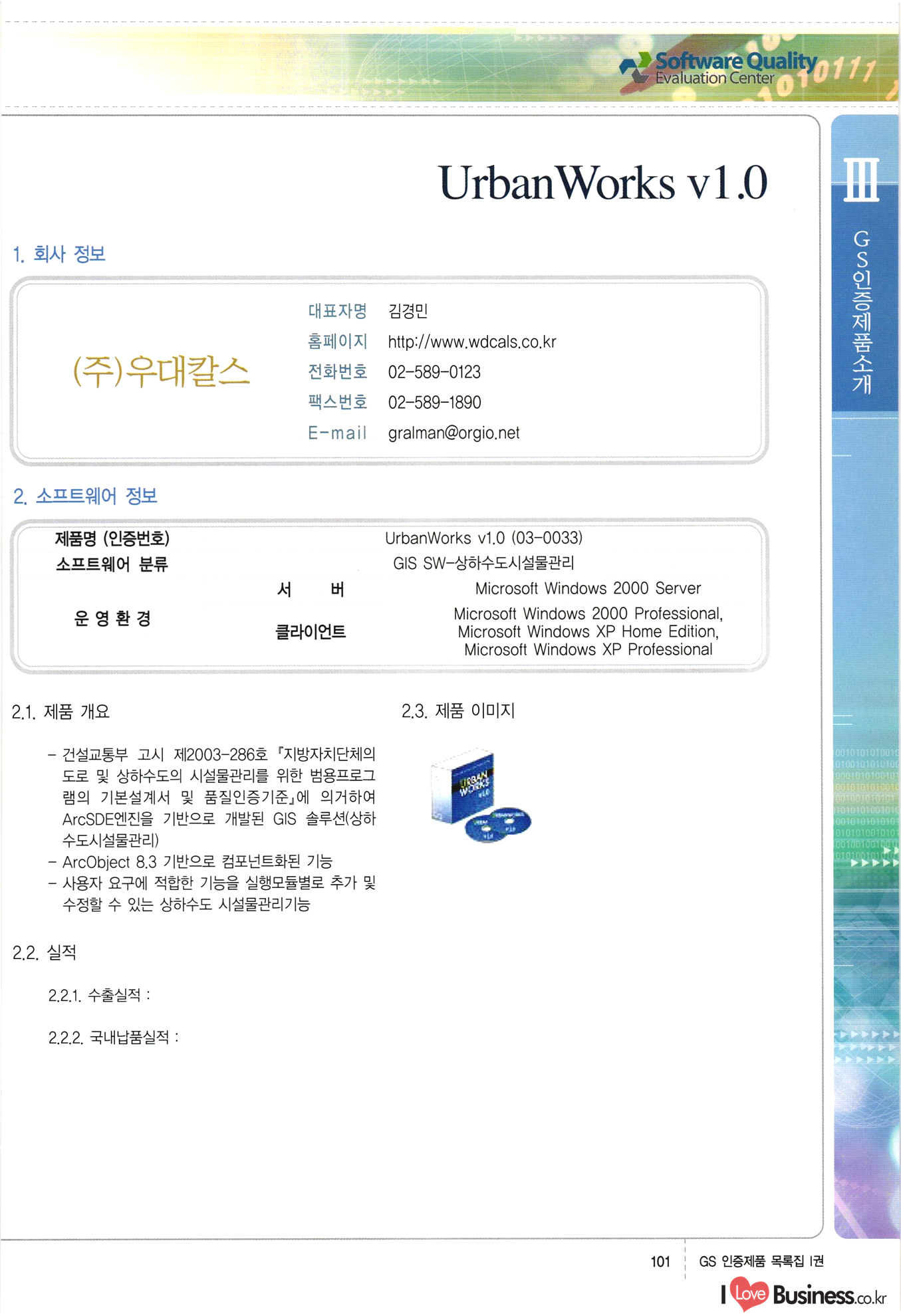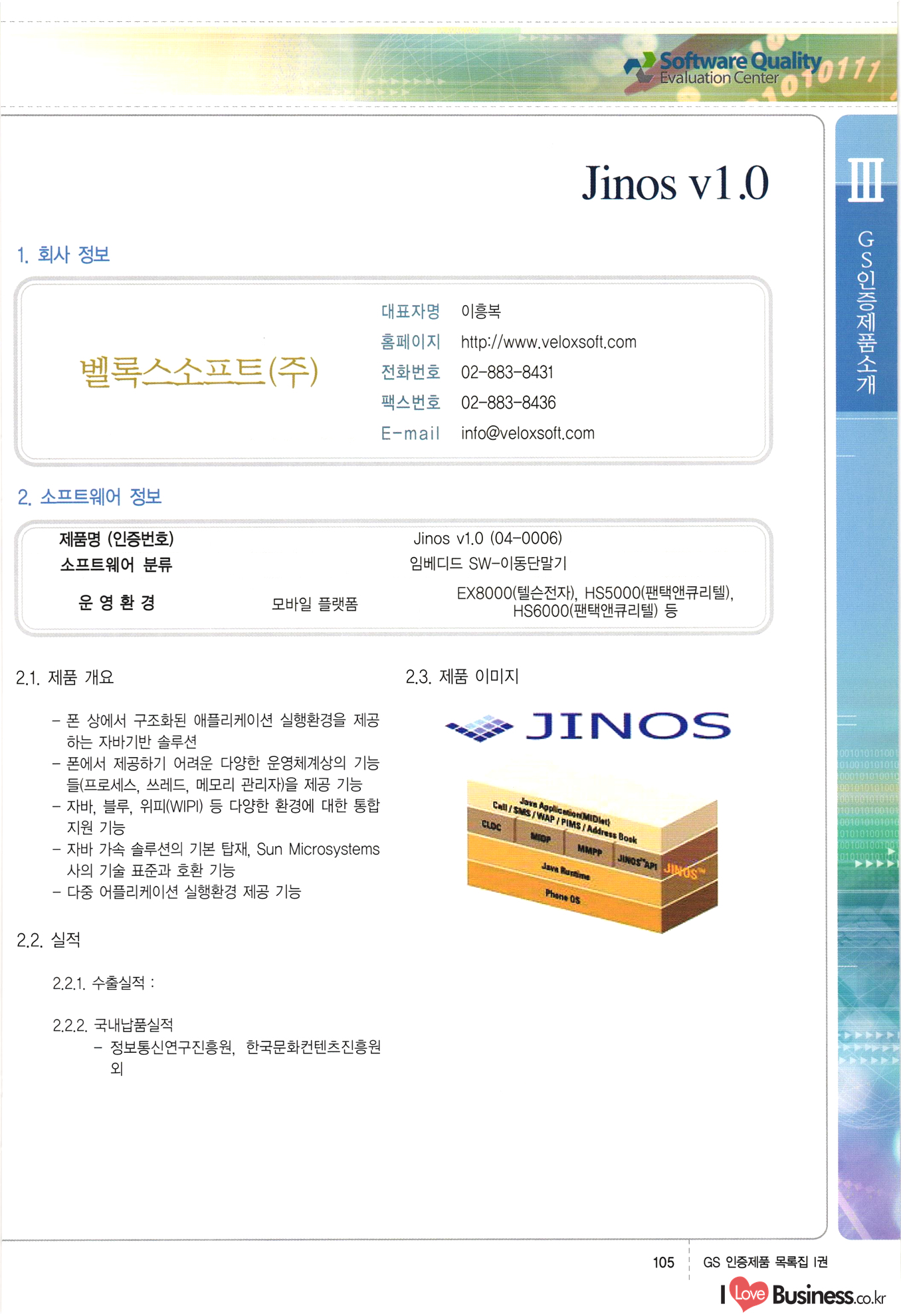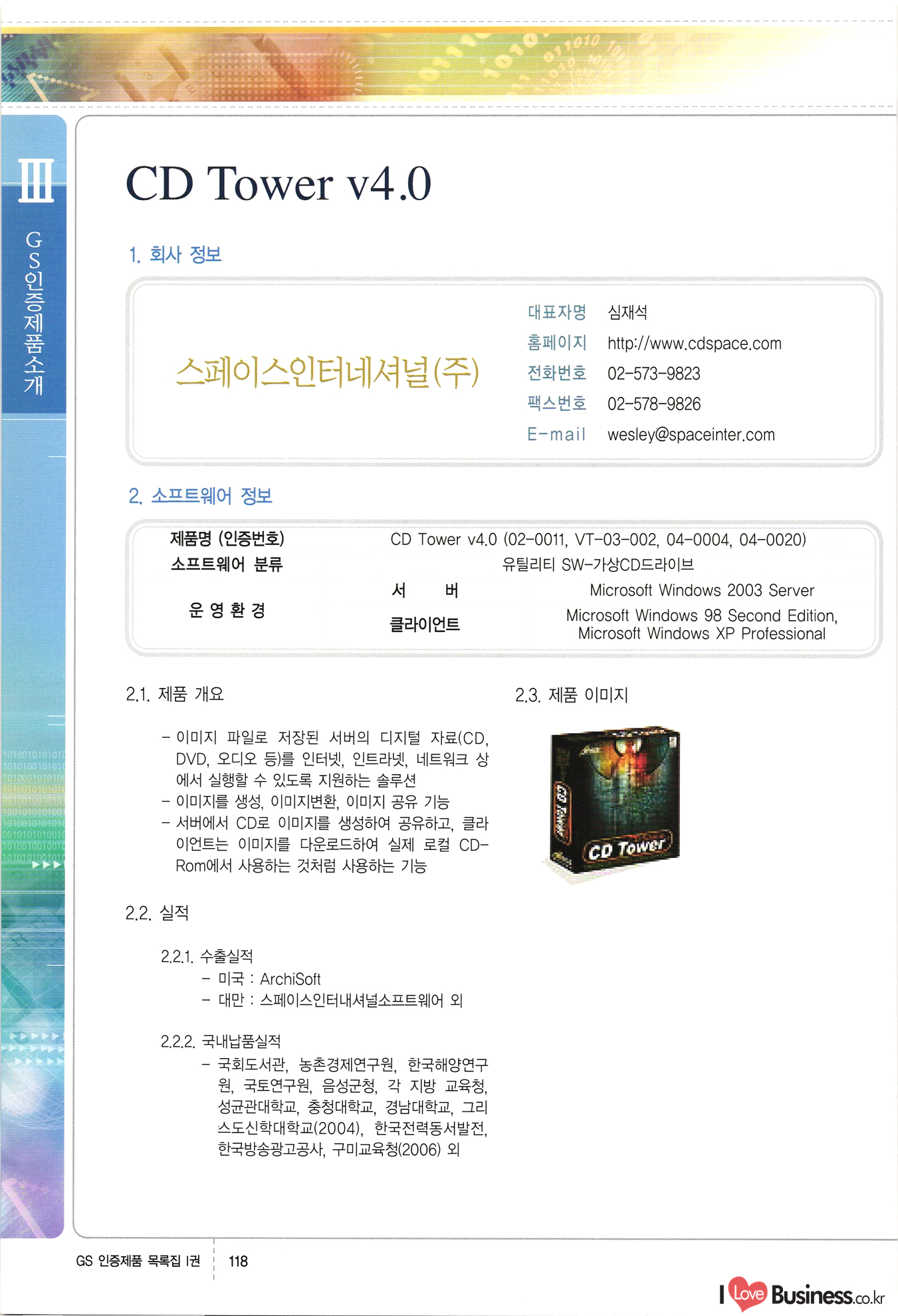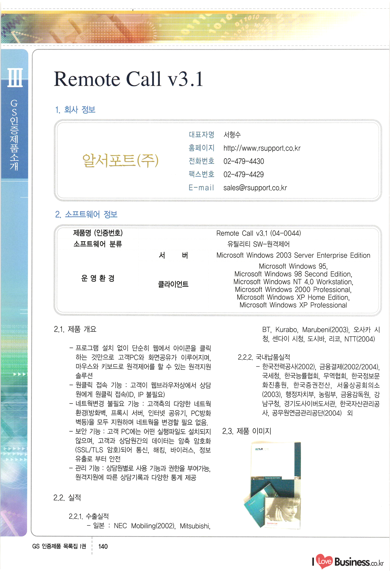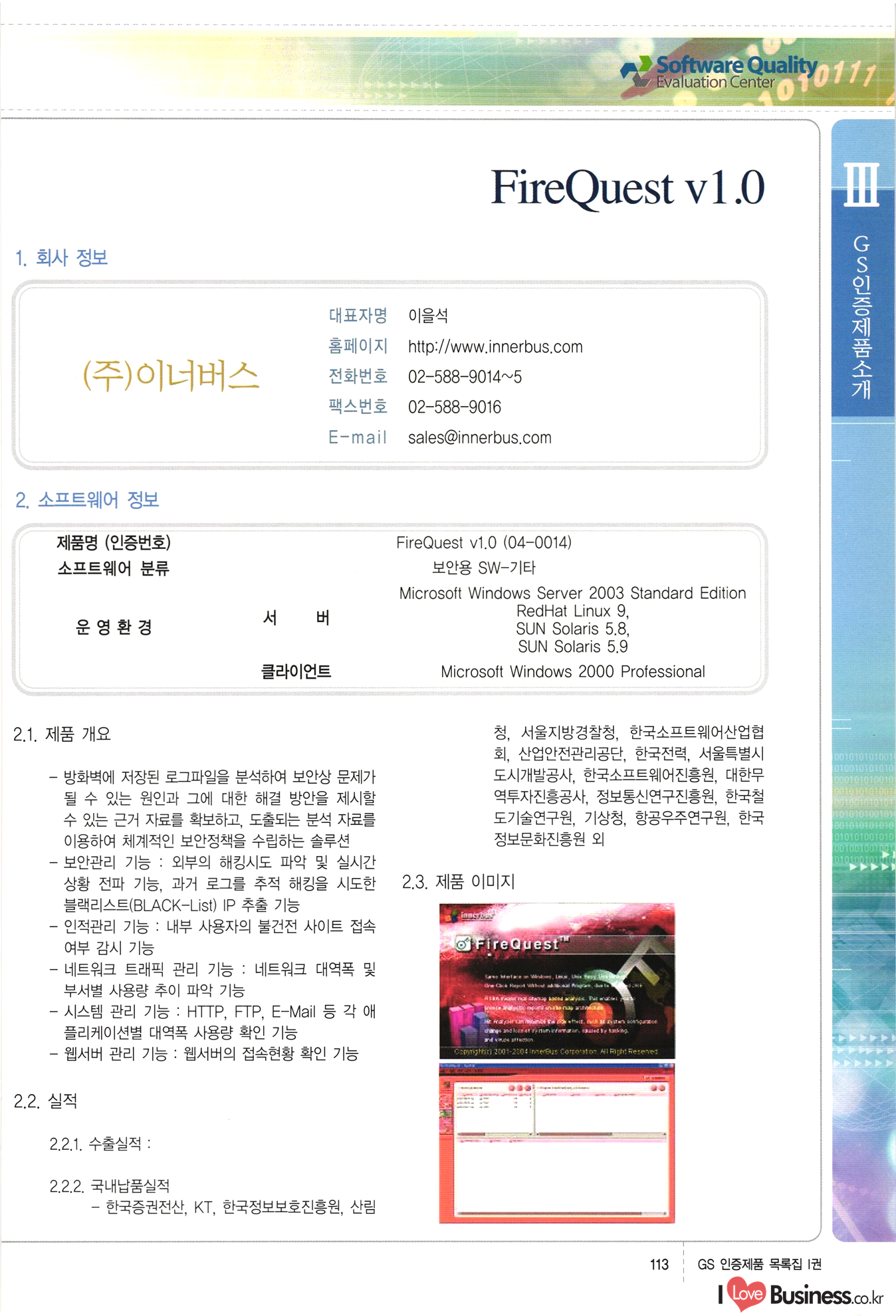 | III. GS 인증제품 목록 | 권-페이지번호 | 권-페이지번호 VT : VeriTest 국제 인증 GS인증제품목록 회사명 삼성에스디에스(주) 제품. EasyBase v4.1 페이지 50 1 제이엔에스 3DM Survey System v1.0 2 | 51 1 (주)싸이웍스 (주)테크다임 (주)다보넷 (주)로지스인포 CyberWALL 2000 v2.16 Jword v1.5 Touchsign v 2.1 키퍼엣홈 v1.0 78 52 (주)미래에듀테크 아이버스 v1.0 53 54 55 56 57 번호 | 인증번호 | 인증일자 01-0001 | 2001.07.25 101-0002 2001.10.22 (02-0027) | 01-0003 | 2001.11.27 | 01-0004 | 2001.11.27 | 01-0005 2001.11.27 5 | 01-0006 | 2001.12.27 02-0001 (02-0029) 2002.01.29 16 | | 02-0002 1 | 2002.02.16 | 02-0003 | 2002.02.16 02-0004 2002.02.27 9 | 02-0005 | 2002.02.27 110 | | 02-0006 | 2002.03.27 11 | || 02-0007 | 2002.03.27 | 02-0008 | 2002.04.30 | 02-0009 | 2002.04.30 | 02-0010 | 2002.04.30 15. | 02-0011 | 2002.04.30 16 102-0012 | 2002.04.30 | 17 | 02-0013 | 2002.05.30 | 18 | 02-0014 | 2002.05.30 | 02-0015 2002.06.28 | 20 | 02-0016 | 2002.06.28 02-0017 1 2002.06.28 | 02-0018 1 | 2002.06.28 23 | 02-0019 | 2002.06.28 24 02-0020 | 2002.07.31 25 | 02-0021 | 2002.07.31 224 58 14 59 118 (주)마크애니 (주)핸디소프트 (주)슈퍼테크놀러지 (주)스펙트라 이래정보시스템(주) (주)컴리빙아이티 | (주)시큐브 (주)케이게이트 (주)소프트4소프트 스페이스인터네셔널(주) (주)컴리빙아이티 (주)그린벨시스템즈 닉스테크(주) 심플소프트 (주)한국데이타비즈네스 (주)테크다임 (주)수세리눅스코리아 (주)한컴리눅스 소프트온넷(주) 와우리눅스(주) 60 61 Document Safer v1.0 | BizFlow Groupware v3.21 | Eg columbus || v1.0 | | eNomix v1.0 Blue Eyes v3.0 i-Class Five v1.05 Secuve TOS WG v1.0 위즈웹3 v3.0 RESORT v1.01 CD Tower v2.0 i-Class One2one v1.05 MANTIS-Professional v1.0 | | SAFEpc v1.5 Simple Gallery v1.00 통합카드발급프로그램 v1.0 Techdigm JCalc v2.0 Suse Linux 7.1K Professional Hancom Linux OS 2.2 Professional | Z!Stream v2.0 와우리눅스 7.1 파란 Secuve TOS WG Agent (Secuve Tos WG Manager) | SMERP v1.1 상하수도범용/ZEUS v1.0 U-Solver v1.0 dDIMS v3.0 DAL v2.5 101010101 1000 101003010101 190 1001010101 21 78. 122 | UL 63 64 65 26 | VT-02-001 | 2002.08.29 (주)시큐브 224 27 1 66 67 | 28 29 130 | 02-0022 | 2002.08.30 | 02-0023 | 2002.10.31 | 02-0024 | 2002.10.31 | 02-0025 | 2002.11.27 | 02-0026 | 2002.11.27 02-0027 (01-0002) 2002.11.27 | 02-0028 (03-0021) 2002.12.09 | 대한상공회의소 한국통신데이타(주) (주)지노시스템 유니온정보시스템(주) (주) 스 68 69 | 70 311 제이엔에스 소프트(구 제이엔에스) 3DM Survey System v1.0 (주)한국지능형정보시스템 한국관(상하수도 범용/TGW) v1.00 92 GS 인증제품 목록집 1권 | 26 I Love Business.co.kr Software Quality, 111 Evaluation Center | 권-페이지번호 II권페이지번호 VT : VeriTest 국제 인증 페이지 회사명 (주)포스데이타 제품 | iSign v2.0 | GS인증제품목록 171 | 34 | 02-0029 (주)제이슨테크(구 미래에듀테크) 아이버스 v1.0 91 72 73. 74 (주)인텔리젼스웨어 (주)하나디에스디 (주)연성정보기술 (주)포스정보 (주)켈코인 (주)포스데이타 스페이스인터내셔널 연희정보통신(주) (주)뉴테크웨이브 c-napse(GSS) v1.0 Life EduBuilder v1.0 | Email+ v3.0 1 책꽃이KDC v3.1 Challenger Webzine Webschool v3.0 1 Biz Binder v1.0 CD-Tower v3.1 상하수도 범용/UFCom v1.0 | | VirusChaser v5.0 | 175 76 118. (주)웨어벨리 Orange for ORACLE v2.2 | 번호 | 인증번호 | 인증일자 | 33 |VT-02-0022002.12.12 | | 2002.12.24 (02-0001) 35 | VT-02-003 | 2002.12.30 | 36 | 03-0001 | 2003.02.28 37. 03-0002 | 2003.02.28 | 38 | 03-0003 | 2003.02.28 | 39 | 03-0004 | 2003.02.28 40 | VT-03-001 | 2003.03.10 41 | VT-03-002) 2003.03.10 1 42 | 03-0005 | 2003.04.07 43 | 03-0006 | 2003.04.07 03-0007 2003.04.30 (03-0026) | 03-0008 | 2003.04.30 45 | 03-0009 | 2003.04.30 | 03-0010 | 2003.04.30 | 47 | 03-0011 | 2003.04.30 | 48 VT-03-003 2003.05.26 49 | 03-0012 | 2003.06.05 | 50 | 03-0013 | 2003.06.05 | 51 | 03-0014 | 2003.06.05 | 52 | 03-0015 | 2003.07.10 | 53 | 03-0016 | 2003.07.10 | 54 | 03-0017 | 2003.07.10 | | 55 | 03-0018 | 2003.07.10 | 56 | 03-0019 | 2003.08.06 57 | | 03-0020 | 2003.08.06 44 1 18 46 80 81 82 83 | (주)테크다임 (주)엔지스테크널러지 삼성에스디에스(주) 삼성에스디에스(주) (주)미디어랜드 인터컴소프트웨어(주) 에스케이씨앤씨(주) 아이티로직스(주) (주)에이씨티소프트 (주)위즈북 (주)에스오엔코리아 (주)아리수미디어 한진정보통신(주) (주)인텔리전스웨어 (주)웨어밸리 (구 (주)오알솔루션즈코리아) Techdigm Office v2.0 | G-Solution Waterworks/Sewerage v1.0 | | 79 UniCITY Standard v1.0 UniCITY Enterprise v1.0 TCO!stream 2002 v4.0 | ServerGuard v3.0 | SK-UPEX v1.0 84 NexWeb v1.2 e-Library Deluxe v4.1.5 86 DL Pro v1.0 SiR v1.01 파워CD뱅크 v4.0 89 InfoMatrix v1.00 190 Bizpus v1.0 91 85 87 88 10010010101.03 1101010100101 1100100100107 58 |VT-03-004 2003.08.12 Orange for ORACLE v2.2 | 111 59 (주)티지더블유 (구 한국지능형정보시스템) 한국관(상하수도 범용/TGW) v1.0 92 93 GIS Free v1.0 DeskPlus v2.0 1 | 94 ArcCITY v1.0 110 03-0021 (02-0028) | 2003.09.04 | 60 | 03-0022 | 2003.09.30 03-0023 | 2003.09.30 03-0024 (04-0011) | 2003.09.30 | 03-0025 | 2003.09.30 03-0026 (03-0007) | 2003.10.07 63 | 03-0027 | 2003.11.12 64 | 03-0028 | 2003.11.12 622 세광정보시스템(주) 제오스페이스(주) (주)선도소프트 (구 (주)캐드랜드) 중앙항업(주) (주)웨어밸리 (구 (주)오알솔루션즈코리아) (주)우암닷컴 (주)오투라인 geoCUBE상하수도 v1.0 95 Orange for ORACLE V2.2 111 96 RAVCOMS Eyecon v4.0 오투스쿨 v2.01 97 GS 인증제품 목록집 1권 I Love Business.co.kr | 권-페이지번호 | 권 - 페이지번호 VT : VeriTest 국제 인증 번호 페이지 회사명 소프트캠프