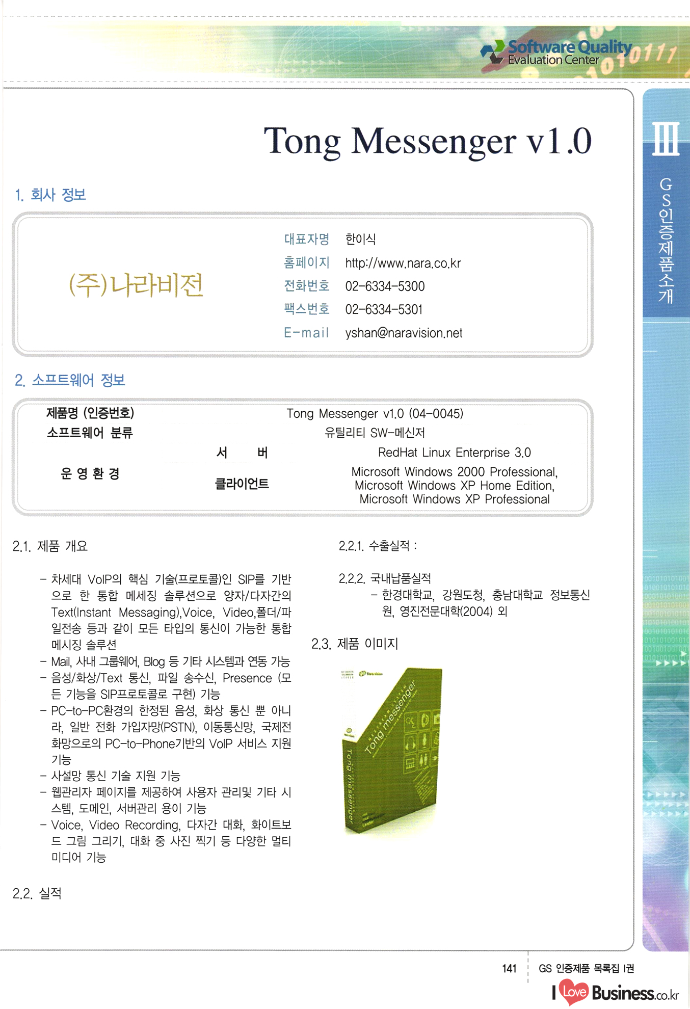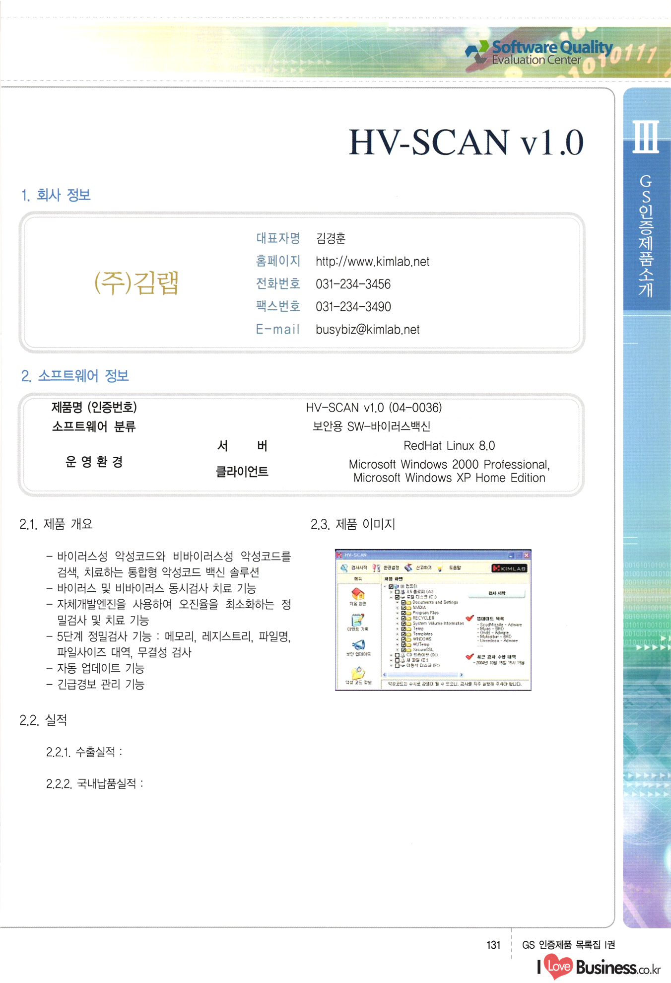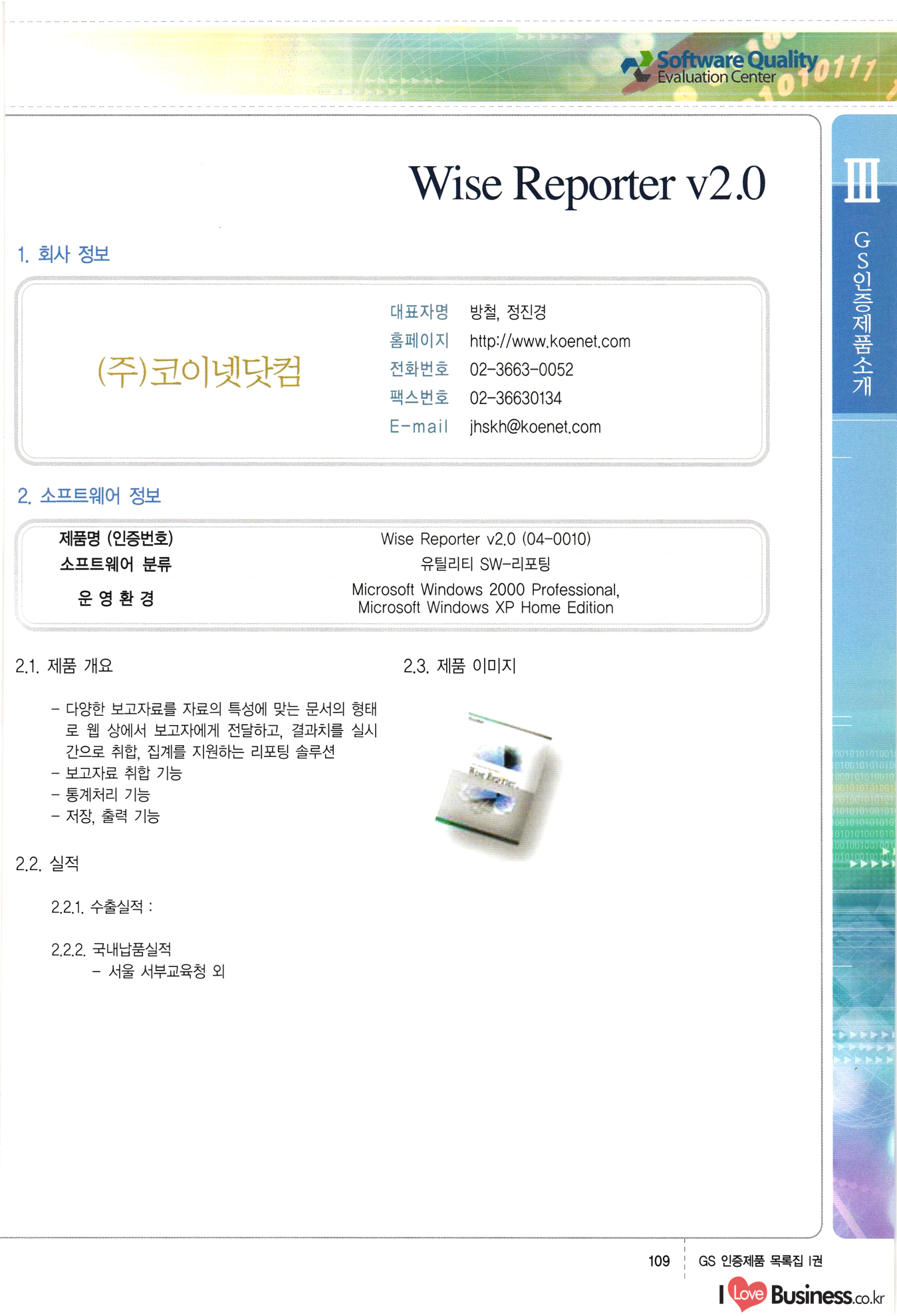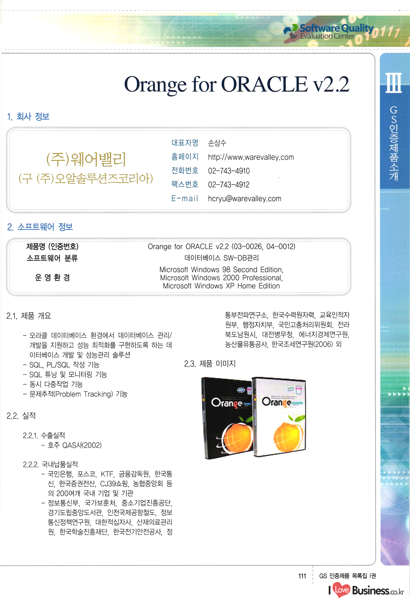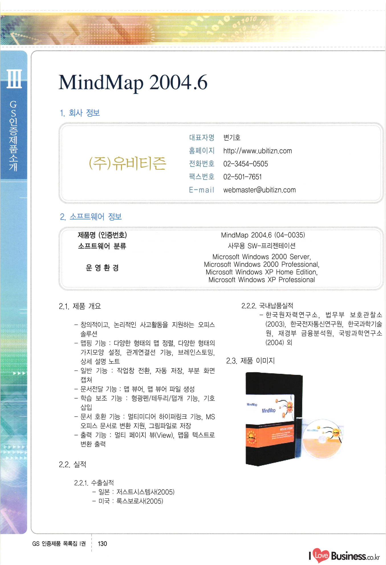 | III. GS 인증제품 목록 | 권-페이지번호 | 권-페이지번호 VT : VeriTest 국제 인증 GS인증제품목록 회사명 삼성에스디에스(주) 제품. EasyBase v4.1 페이지 50 1 제이엔에스 3DM Survey System v1.0 2 | 51 1 (주)싸이웍스 (주)테크다임 (주)다보넷 (주)로지스인포 CyberWALL 2000 v2.16 Jword v1.5 Touchsign v 2.1 키퍼엣홈 v1.0 78 52 (주)미래에듀테크 아이버스 v1.0 53 54 55 56 57 번호 | 인증번호 | 인증일자 01-0001 | 2001.07.25 101-0002 2001.10.22 (02-0027) | 01-0003 | 2001.11.27 | 01-0004 | 2001.11.27 | 01-0005 2001.11.27 5 | 01-0006 | 2001.12.27 02-0001 (02-0029) 2002.01.29 16 | | 02-0002 1 | 2002.02.16 | 02-0003 | 2002.02.16 02-0004 2002.02.27 9 | 02-0005 | 2002.02.27 110 | | 02-0006 | 2002.03.27 11 | || 02-0007 | 2002.03.27 | 02-0008 | 2002.04.30 | 02-0009 | 2002.04.30 | 02-0010 | 2002.04.30 15. | 02-0011 | 2002.04.30 16 102-0012 | 2002.04.30 | 17 | 02-0013 | 2002.05.30 | 18 | 02-0014 | 2002.05.30 | 02-0015 2002.06.28 | 20 | 02-0016 | 2002.06.28 02-0017 1 2002.06.28 | 02-0018 1 | 2002.06.28 23 | 02-0019 | 2002.06.28 24 02-0020 | 2002.07.31 25 | 02-0021 | 2002.07.31 224 58 14 59 118 (주)마크애니 (주)핸디소프트 (주)슈퍼테크놀러지 (주)스펙트라 이래정보시스템(주) (주)컴리빙아이티 | (주)시큐브 (주)케이게이트 (주)소프트4소프트 스페이스인터네셔널(주) (주)컴리빙아이티 (주)그린벨시스템즈 닉스테크(주) 심플소프트 (주)한국데이타비즈네스 (주)테크다임 (주)수세리눅스코리아 (주)한컴리눅스 소프트온넷(주) 와우리눅스(주) 60 61 Document Safer v1.0 | BizFlow Groupware v3.21 | Eg columbus || v1.0 | | eNomix v1.0 Blue Eyes v3.0 i-Class Five v1.05 Secuve TOS WG v1.0 위즈웹3 v3.0 RESORT v1.01 CD Tower v2.0 i-Class One2one v1.05 MANTIS-Professional v1.0 | | SAFEpc v1.5 Simple Gallery v1.00 통합카드발급프로그램 v1.0 Techdigm JCalc v2.0 Suse Linux 7.1K Professional Hancom Linux OS 2.2 Professional | Z!Stream v2.0 와우리눅스 7.1 파란 Secuve TOS WG Agent (Secuve Tos WG Manager) | SMERP v1.1 상하수도범용/ZEUS v1.0 U-Solver v1.0 dDIMS v3.0 DAL v2.5 101010101 1000 101003010101 190 1001010101 21 78. 122 | UL 63 64 65 26 | VT-02-001 | 2002.08.29 (주)시큐브 224 27 1 66 67 | 28 29 130 | 02-0022 | 2002.08.30 | 02-0023 | 2002.10.31 | 02-0024 | 2002.10.31 | 02-0025 | 2002.11.27 | 02-0026 | 2002.11.27 02-0027 (01-0002) 2002.11.27 | 02-0028 (03-0021) 2002.12.09 | 대한상공회의소 한국통신데이타(주) (주)지노시스템 유니온정보시스템(주) (주) 스 68 69 | 70 311 제이엔에스 소프트(구 제이엔에스) 3DM Survey System v1.0 (주)한국지능형정보시스템 한국관(상하수도 범용/TGW) v1.00 92 GS 인증제품 목록집 1권 | 26 I Love Business.co.kr Software Quality, 111 Evaluation Center | 권-페이지번호 II권페이지번호 VT : VeriTest 국제 인증 페이지 회사명 (주)포스데이타 제품 | iSign v2.0 | GS인증제품목록 171 | 34 | 02-0029 (주)제이슨테크(구 미래에듀테크) 아이버스 v1.0 91 72 73. 74 (주)인텔리젼스웨어 (주)하나디에스디 (주)연성정보기술 (주)포스정보 (주)켈코인 (주)포스데이타 스페이스인터내셔널 연희정보통신(주) (주)뉴테크웨이브 c-napse(GSS) v1.0 Life EduBuilder v1.0 | Email+ v3.0 1 책꽃이KDC v3.1 Challenger Webzine Webschool v3.0 1 Biz Binder v1.0 CD-Tower v3.1 상하수도 범용/UFCom v1.0 | | VirusChaser v5.0 | 175 76 118. (주)웨어벨리 Orange for ORACLE v2.2 | 번호 | 인증번호 | 인증일자 | 33 |VT-02-0022002.12.12 | | 2002.12.24 (02-0001) 35 | VT-02-003 | 2002.12.30 | 36 | 03-0001 | 2003.02.28 37. 03-0002 | 2003.02.28 | 38 | 03-0003 | 2003.02.28 | 39 | 03-0004 | 2003.02.28 40 | VT-03-001 | 2003.03.10 41 | VT-03-002) 2003.03.10 1 42 | 03-0005 | 2003.04.07 43 | 03-0006 | 2003.04.07 03-0007 2003.04.30 (03-0026) | 03-0008 | 2003.04.30 45 | 03-0009 | 2003.04.30 | 03-0010 | 2003.04.30 | 47 | 03-0011 | 2003.04.30 | 48 VT-03-003 2003.05.26 49 | 03-0012 | 2003.06.05 | 50 | 03-0013 | 2003.06.05 | 51 | 03-0014 | 2003.06.05 | 52 | 03-0015 | 2003.07.10 | 53 | 03-0016 | 2003.07.10 | 54 | 03-0017 | 2003.07.10 | | 55 | 03-0018 | 2003.07.10 | 56 | 03-0019 | 2003.08.06 57 | | 03-0020 | 2003.08.06 44 1 18 46 80 81 82 83 | (주)테크다임 (주)엔지스테크널러지 삼성에스디에스(주) 삼성에스디에스(주) (주)미디어랜드 인터컴소프트웨어(주) 에스케이씨앤씨(주) 아이티로직스(주) (주)에이씨티소프트 (주)위즈북 (주)에스오엔코리아 (주)아리수미디어 한진정보통신(주) (주)인텔리전스웨어 (주)웨어밸리 (구 (주)오알솔루션즈코리아) Techdigm Office v2.0 | G-Solution Waterworks/Sewerage v1.0 | | 79 UniCITY Standard v1.0 UniCITY Enterprise v1.0 TCO!stream 2002 v4.0 | ServerGuard v3.0 | SK-UPEX v1.0 84 NexWeb v1.2 e-Library Deluxe v4.1.5 86 DL Pro v1.0 SiR v1.01 파워CD뱅크 v4.0 89 InfoMatrix v1.00 190 Bizpus v1.0 91 85 87 88 10010010101.03 1101010100101 1100100100107 58 |VT-03-004 2003.08.12 Orange for ORACLE v2.2 | 111 59 (주)티지더블유 (구 한국지능형정보시스템) 한국관(상하수도 범용/TGW) v1.0 92 93 GIS Free v1.0 DeskPlus v2.0 1 | 94 ArcCITY v1.0 110 03-0021 (02-0028) | 2003.09.04 | 60 | 03-0022 | 2003.09.30 03-0023 | 2003.09.30 03-0024 (04-0011) | 2003.09.30 | 03-0025 | 2003.09.30 03-0026 (03-0007) | 2003.10.07 63 | 03-0027 | 2003.11.12 64 | 03-0028 | 2003.11.12 622 세광정보시스템(주) 제오스페이스(주) (주)선도소프트 (구 (주)캐드랜드) 중앙항업(주) (주)웨어밸리 (구 (주)오알솔루션즈코리아) (주)우암닷컴 (주)오투라인 geoCUBE상하수도 v1.0 95 Orange for ORACLE V2.2 111 96 RAVCOMS Eyecon v4.0 오투스쿨 v2.01 97 GS 인증제품 목록집 1권 I Love Business.co.kr | 권-페이지번호 | 권 - 페이지번호 VT : VeriTest 국제 인증 번호 페이지 회사명 소프트캠프