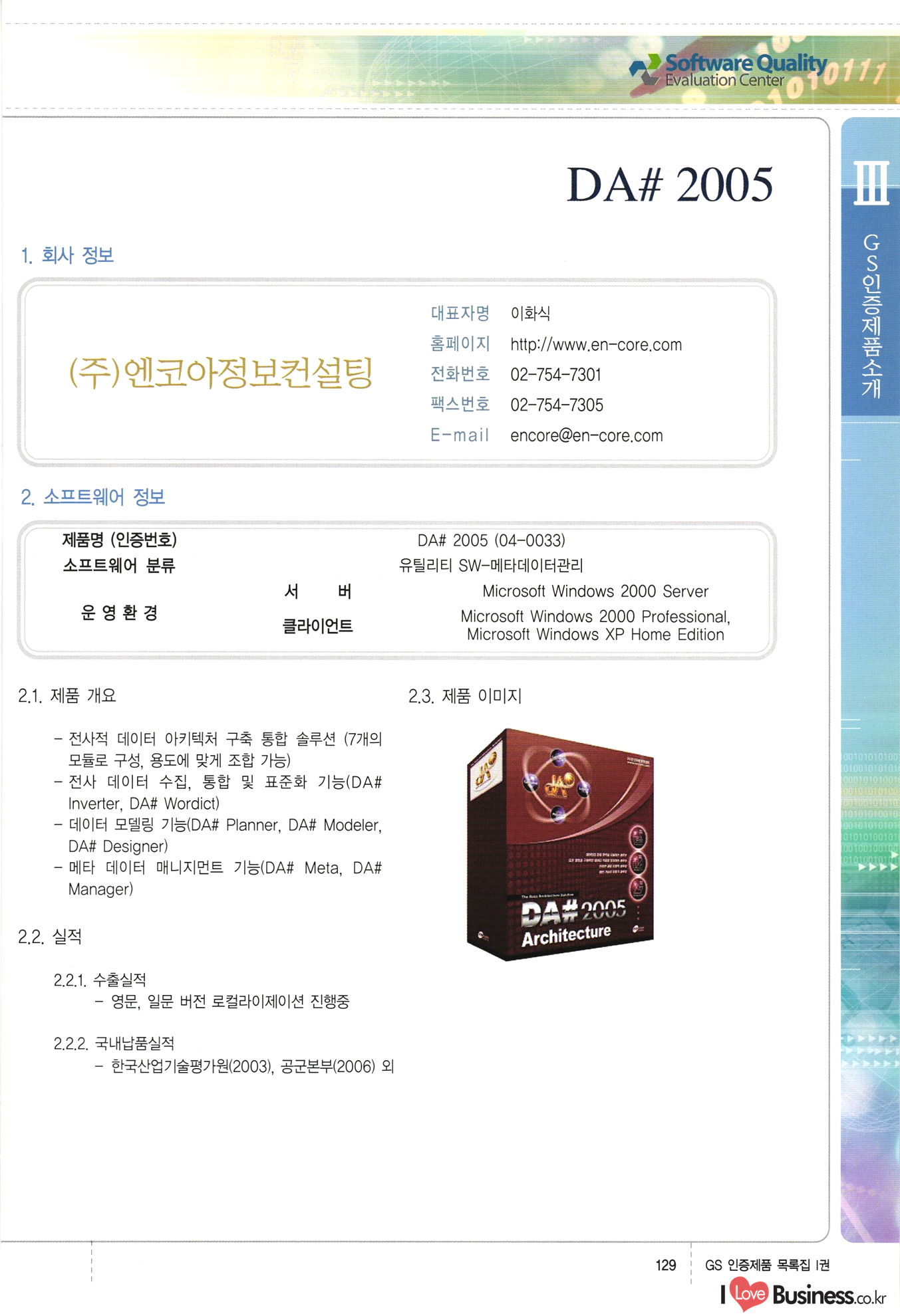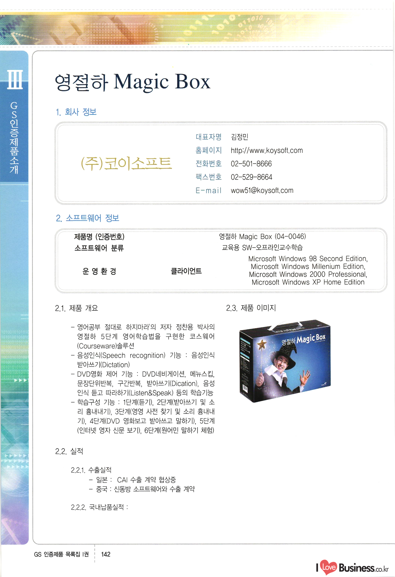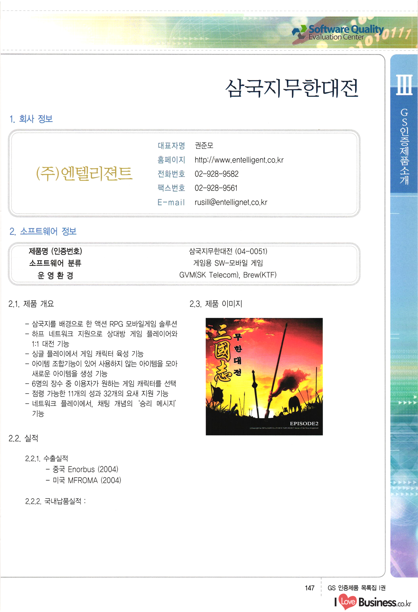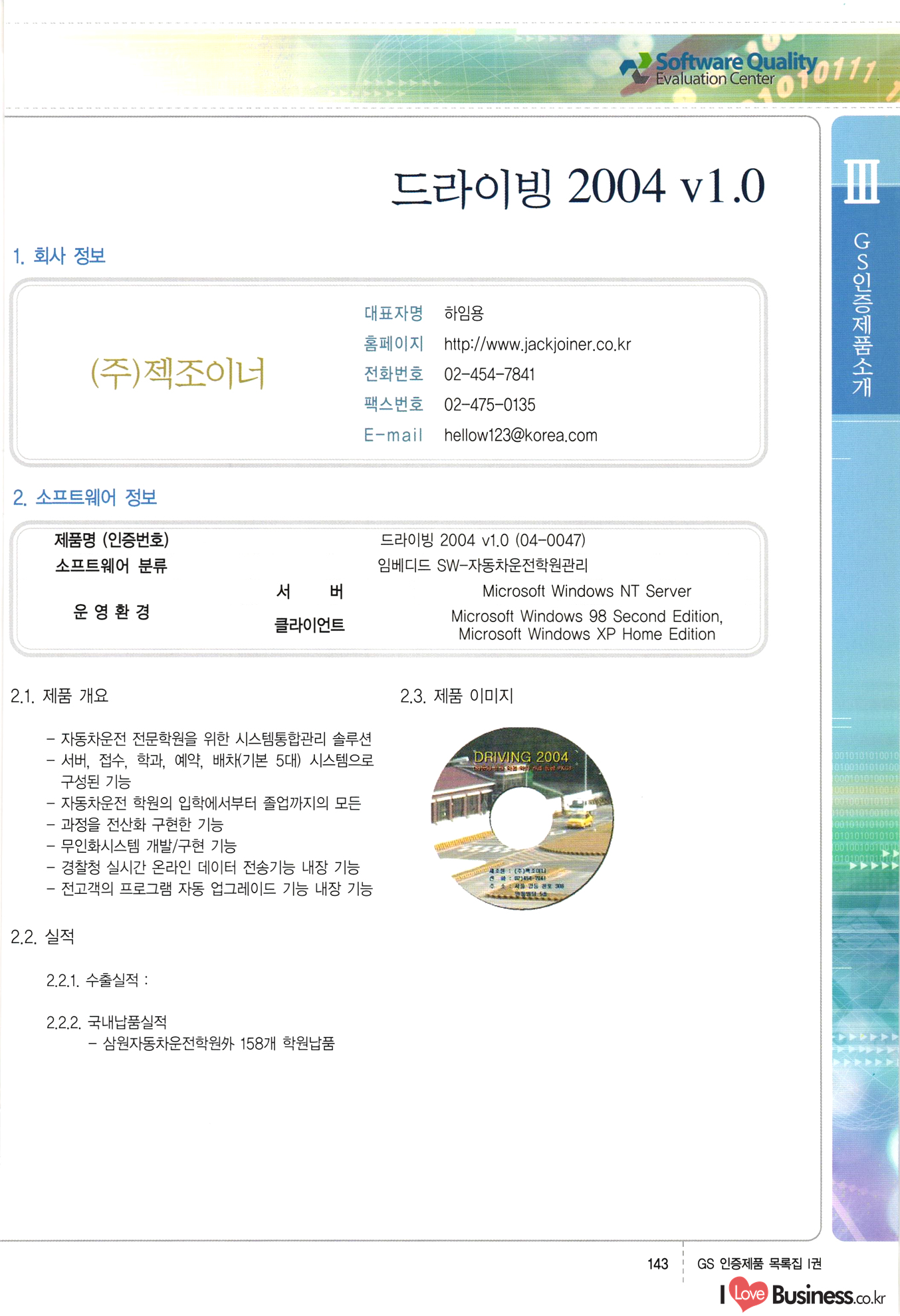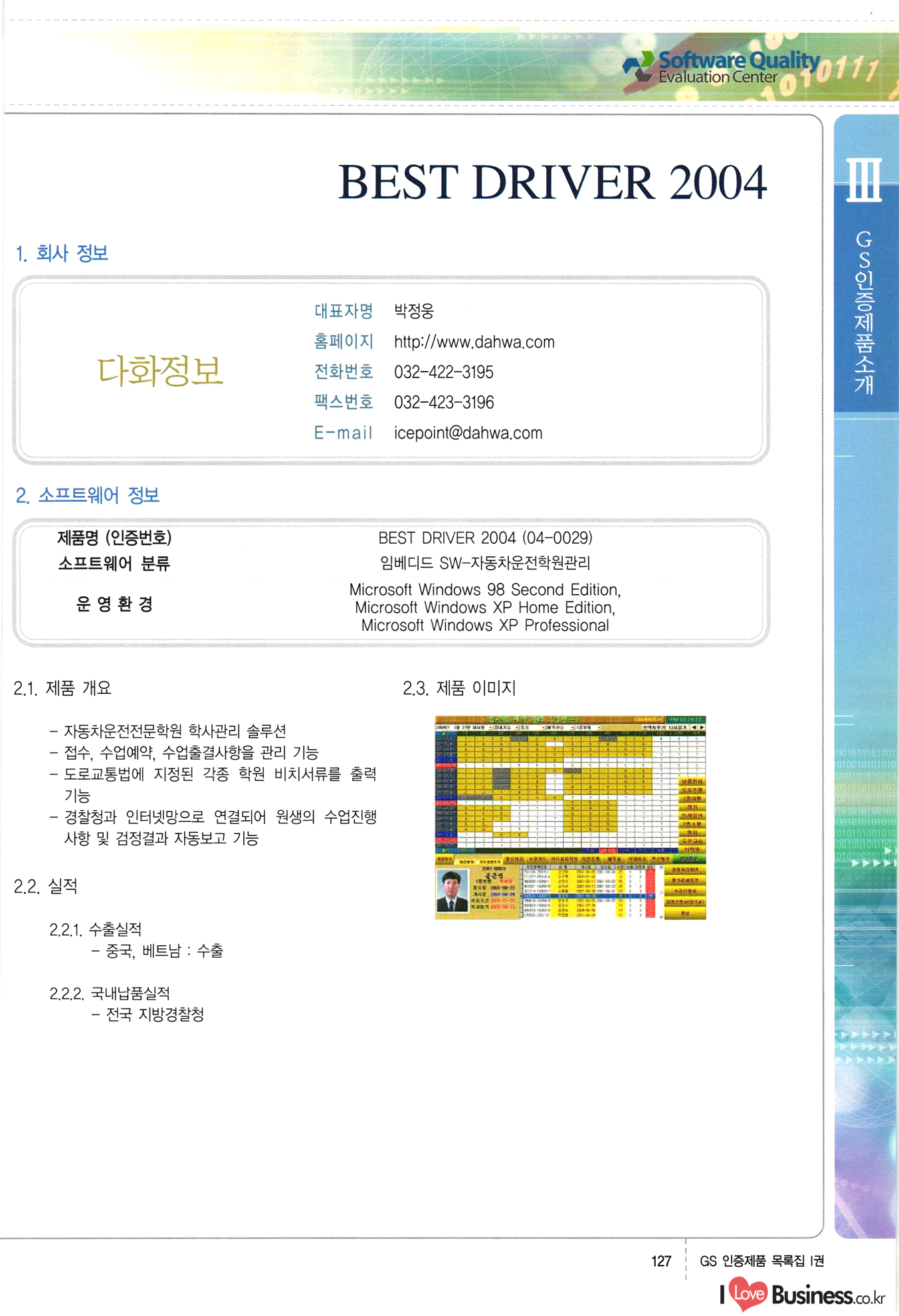 | III. GS 인증제품 목록 | 권-페이지번호 | 권-페이지번호 VT : VeriTest 국제 인증 GS인증제품목록 회사명 삼성에스디에스(주) 제품. EasyBase v4.1 페이지 50 1 제이엔에스 3DM Survey System v1.0 2 | 51 1 (주)싸이웍스 (주)테크다임 (주)다보넷 (주)로지스인포 CyberWALL 2000 v2.16 Jword v1.5 Touchsign v 2.1 키퍼엣홈 v1.0 78 52 (주)미래에듀테크 아이버스 v1.0 53 54 55 56 57 번호 | 인증번호 | 인증일자 01-0001 | 2001.07.25 101-0002 2001.10.22 (02-0027) | 01-0003 | 2001.11.27 | 01-0004 | 2001.11.27 | 01-0005 2001.11.27 5 | 01-0006 | 2001.12.27 02-0001 (02-0029) 2002.01.29 16 | | 02-0002 1 | 2002.02.16 | 02-0003 | 2002.02.16 02-0004 2002.02.27 9 | 02-0005 | 2002.02.27 110 | | 02-0006 | 2002.03.27 11 | || 02-0007 | 2002.03.27 | 02-0008 | 2002.04.30 | 02-0009 | 2002.04.30 | 02-0010 | 2002.04.30 15. | 02-0011 | 2002.04.30 16 102-0012 | 2002.04.30 | 17 | 02-0013 | 2002.05.30 | 18 | 02-0014 | 2002.05.30 | 02-0015 2002.06.28 | 20 | 02-0016 | 2002.06.28 02-0017 1 2002.06.28 | 02-0018 1 | 2002.06.28 23 | 02-0019 | 2002.06.28 24 02-0020 | 2002.07.31 25 | 02-0021 | 2002.07.31 224 58 14 59 118 (주)마크애니 (주)핸디소프트 (주)슈퍼테크놀러지 (주)스펙트라 이래정보시스템(주) (주)컴리빙아이티 | (주)시큐브 (주)케이게이트 (주)소프트4소프트 스페이스인터네셔널(주) (주)컴리빙아이티 (주)그린벨시스템즈 닉스테크(주) 심플소프트 (주)한국데이타비즈네스 (주)테크다임 (주)수세리눅스코리아 (주)한컴리눅스 소프트온넷(주) 와우리눅스(주) 60 61 Document Safer v1.0 | BizFlow Groupware v3.21 | Eg columbus || v1.0 | | eNomix v1.0 Blue Eyes v3.0 i-Class Five v1.05 Secuve TOS WG v1.0 위즈웹3 v3.0 RESORT v1.01 CD Tower v2.0 i-Class One2one v1.05 MANTIS-Professional v1.0 | | SAFEpc v1.5 Simple Gallery v1.00 통합카드발급프로그램 v1.0 Techdigm JCalc v2.0 Suse Linux 7.1K Professional Hancom Linux OS 2.2 Professional | Z!Stream v2.0 와우리눅스 7.1 파란 Secuve TOS WG Agent (Secuve Tos WG Manager) | SMERP v1.1 상하수도범용/ZEUS v1.0 U-Solver v1.0 dDIMS v3.0 DAL v2.5 101010101 1000 101003010101 190 1001010101 21 78. 122 | UL 63 64 65 26 | VT-02-001 | 2002.08.29 (주)시큐브 224 27 1 66 67 | 28 29 130 | 02-0022 | 2002.08.30 | 02-0023 | 2002.10.31 | 02-0024 | 2002.10.31 | 02-0025 | 2002.11.27 | 02-0026 | 2002.11.27 02-0027 (01-0002) 2002.11.27 | 02-0028 (03-0021) 2002.12.09 | 대한상공회의소 한국통신데이타(주) (주)지노시스템 유니온정보시스템(주) (주) 스 68 69 | 70 311 제이엔에스 소프트(구 제이엔에스) 3DM Survey System v1.0 (주)한국지능형정보시스템 한국관(상하수도 범용/TGW) v1.00 92 GS 인증제품 목록집 1권 | 26 I Love Business.co.kr Software Quality, 111 Evaluation Center | 권-페이지번호 II권페이지번호 VT : VeriTest 국제 인증 페이지 회사명 (주)포스데이타 제품 | iSign v2.0 | GS인증제품목록 171 | 34 | 02-0029 (주)제이슨테크(구 미래에듀테크) 아이버스 v1.0 91 72 73. 74 (주)인텔리젼스웨어 (주)하나디에스디 (주)연성정보기술 (주)포스정보 (주)켈코인 (주)포스데이타 스페이스인터내셔널 연희정보통신(주) (주)뉴테크웨이브 c-napse(GSS) v1.0 Life EduBuilder v1.0 | Email+ v3.0 1 책꽃이KDC v3.1 Challenger Webzine Webschool v3.0 1 Biz Binder v1.0 CD-Tower v3.1 상하수도 범용/UFCom v1.0 | | VirusChaser v5.0 | 175 76 118. (주)웨어벨리 Orange for ORACLE v2.2 | 번호 | 인증번호 | 인증일자 | 33 |VT-02-0022002.12.12 | | 2002.12.24 (02-0001) 35 | VT-02-003 | 2002.12.30 | 36 | 03-0001 | 2003.02.28 37. 03-0002 | 2003.02.28 | 38 | 03-0003 | 2003.02.28 | 39 | 03-0004 | 2003.02.28 40 | VT-03-001 | 2003.03.10 41 | VT-03-002) 2003.03.10 1 42 | 03-0005 | 2003.04.07 43 | 03-0006 | 2003.04.07 03-0007 2003.04.30 (03-0026) | 03-0008 | 2003.04.30 45 | 03-0009 | 2003.04.30 | 03-0010 | 2003.04.30 | 47 | 03-0011 | 2003.04.30 | 48 VT-03-003 2003.05.26 49 | 03-0012 | 2003.06.05 | 50 | 03-0013 | 2003.06.05 | 51 | 03-0014 | 2003.06.05 | 52 | 03-0015 | 2003.07.10 | 53 | 03-0016 | 2003.07.10 | 54 | 03-0017 | 2003.07.10 | | 55 | 03-0018 | 2003.07.10 | 56 | 03-0019 | 2003.08.06 57 | | 03-0020 | 2003.08.06 44 1 18 46 80 81 82 83 | (주)테크다임 (주)엔지스테크널러지 삼성에스디에스(주) 삼성에스디에스(주) (주)미디어랜드 인터컴소프트웨어(주) 에스케이씨앤씨(주) 아이티로직스(주) (주)에이씨티소프트 (주)위즈북 (주)에스오엔코리아 (주)아리수미디어 한진정보통신(주) (주)인텔리전스웨어 (주)웨어밸리 (구 (주)오알솔루션즈코리아) Techdigm Office v2.0 | G-Solution Waterworks/Sewerage v1.0 | | 79 UniCITY Standard v1.0 UniCITY Enterprise v1.0 TCO!stream 2002 v4.0 | ServerGuard v3.0 | SK-UPEX v1.0 84 NexWeb v1.2 e-Library Deluxe v4.1.5 86 DL Pro v1.0 SiR v1.01 파워CD뱅크 v4.0 89 InfoMatrix v1.00 190 Bizpus v1.0 91 85 87 88 10010010101.03 1101010100101 1100100100107 58 |VT-03-004 2003.08.12 Orange for ORACLE v2.2 | 111 59 (주)티지더블유 (구 한국지능형정보시스템) 한국관(상하수도 범용/TGW) v1.0 92 93 GIS Free v1.0 DeskPlus v2.0 1 | 94 ArcCITY v1.0 110 03-0021 (02-0028) | 2003.09.04 | 60 | 03-0022 | 2003.09.30 03-0023 | 2003.09.30 03-0024 (04-0011) | 2003.09.30 | 03-0025 | 2003.09.30 03-0026 (03-0007) | 2003.10.07 63 | 03-0027 | 2003.11.12 64 | 03-0028 | 2003.11.12 622 세광정보시스템(주) 제오스페이스(주) (주)선도소프트 (구 (주)캐드랜드) 중앙항업(주) (주)웨어밸리 (구 (주)오알솔루션즈코리아) (주)우암닷컴 (주)오투라인 geoCUBE상하수도 v1.0 95 Orange for ORACLE V2.2 111 96 RAVCOMS Eyecon v4.0 오투스쿨 v2.01 97 GS 인증제품 목록집 1권 I Love Business.co.kr | 권-페이지번호 | 권 - 페이지번호 VT : VeriTest 국제 인증 번호 페이지 회사명 소프트캠프