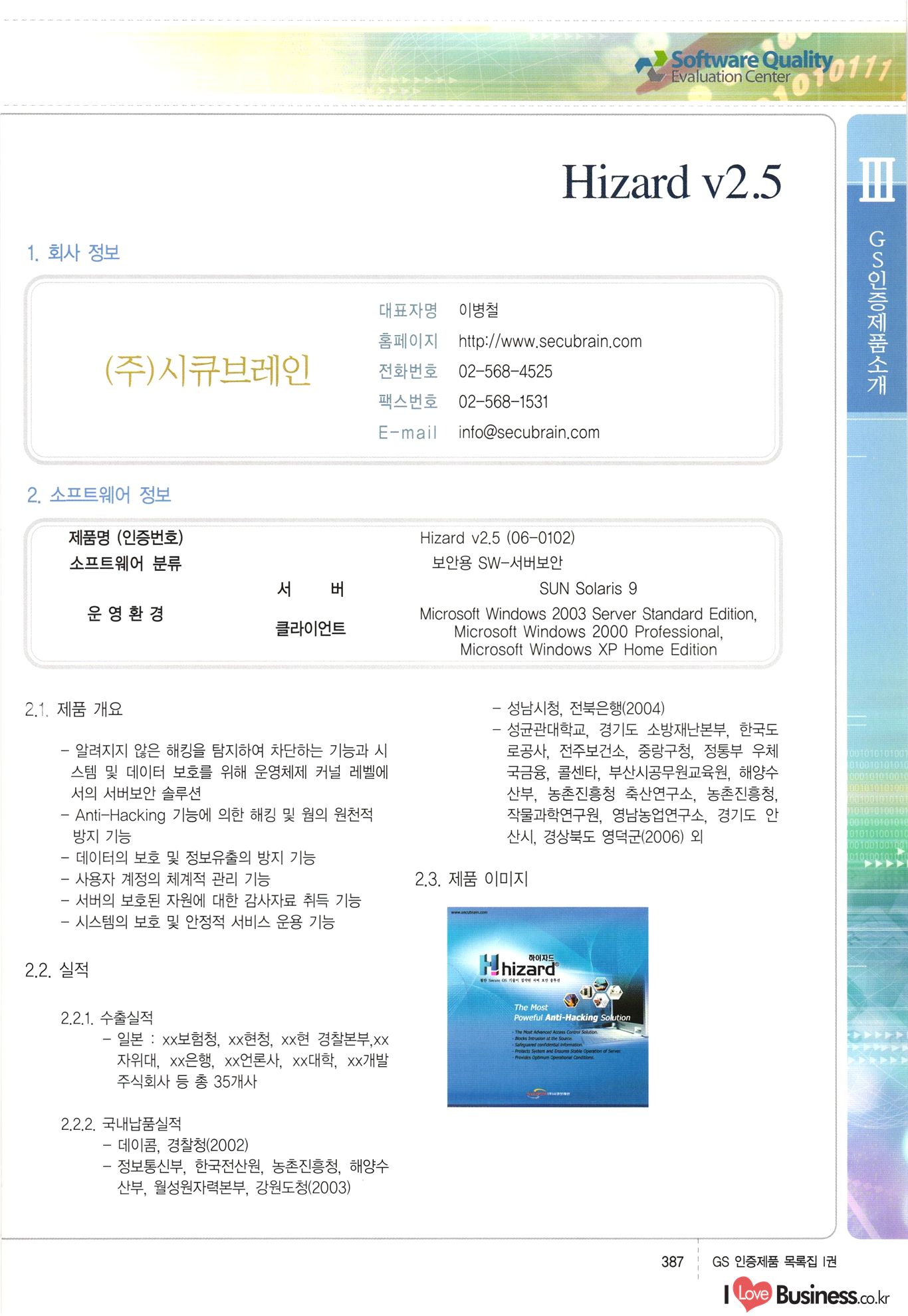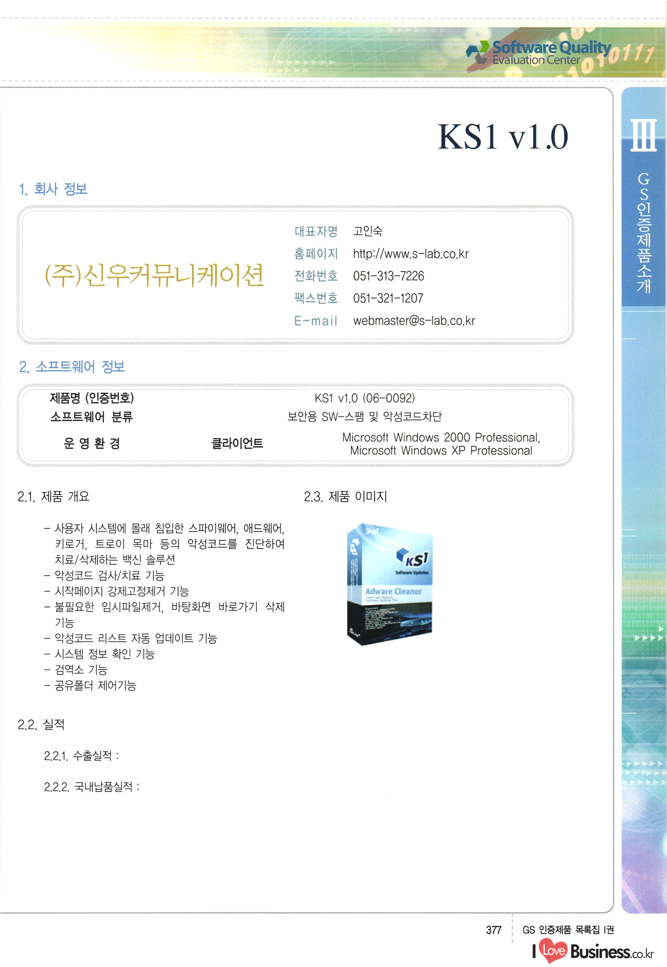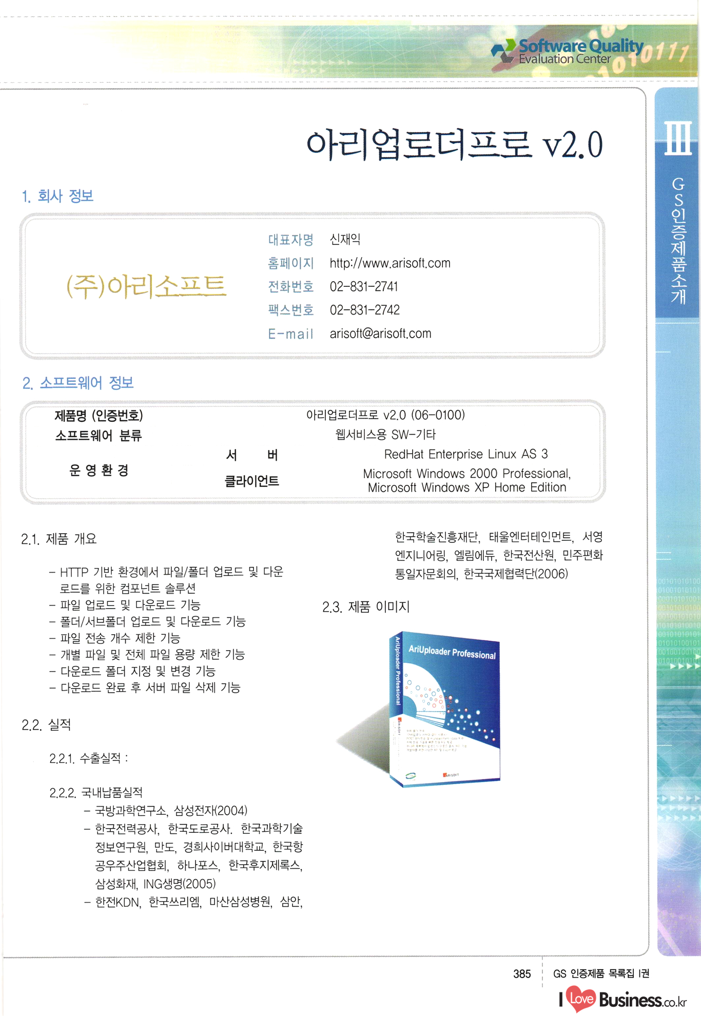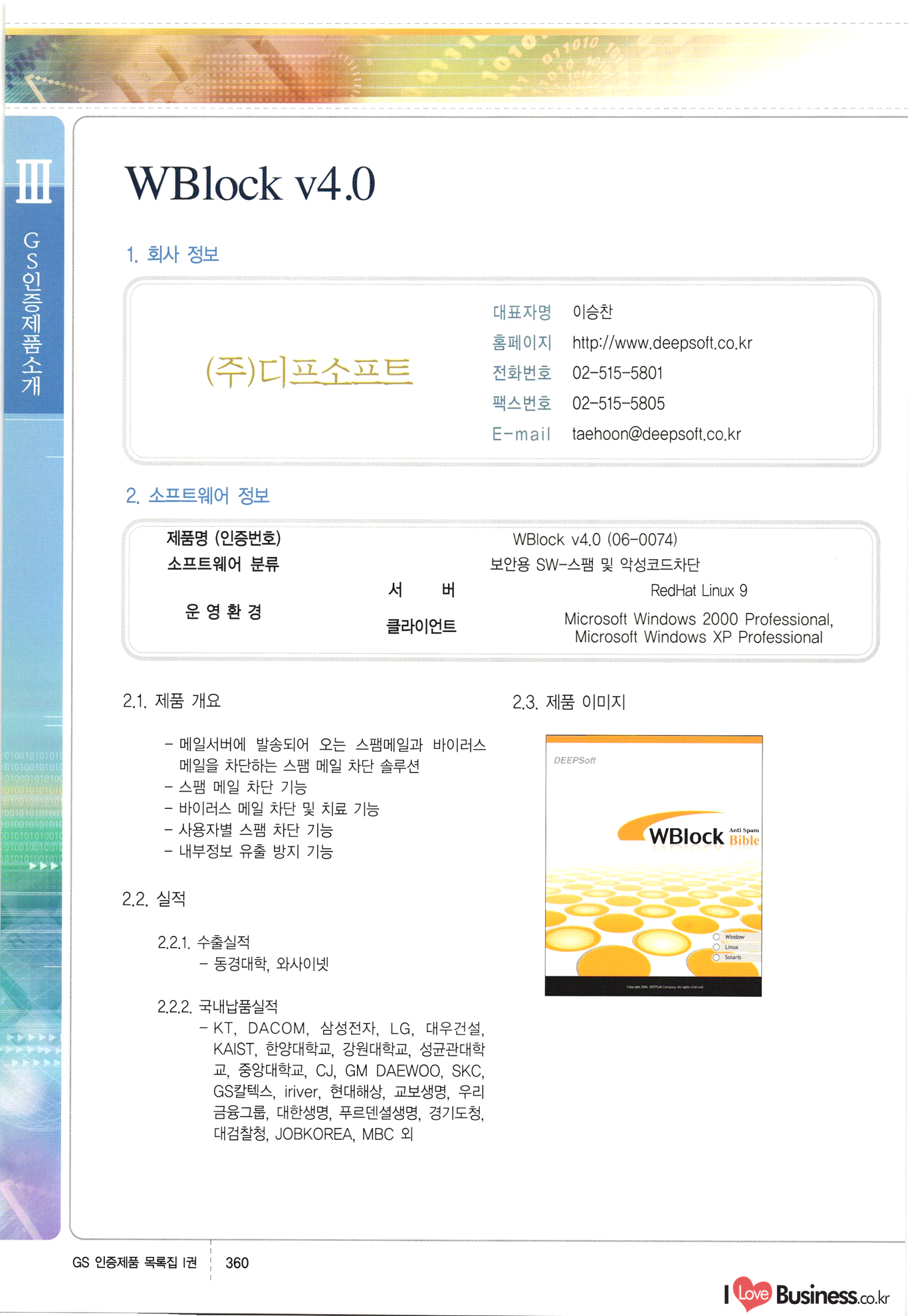 | III. GS 인증제품 목록 | 권-페이지번호 | 권-페이지번호 VT : VeriTest 국제 인증 GS인증제품목록 회사명 삼성에스디에스(주) 제품. EasyBase v4.1 페이지 50 1 제이엔에스 3DM Survey System v1.0 2 | 51 1 (주)싸이웍스 (주)테크다임 (주)다보넷 (주)로지스인포 CyberWALL 2000 v2.16 Jword v1.5 Touchsign v 2.1 키퍼엣홈 v1.0 78 52 (주)미래에듀테크 아이버스 v1.0 53 54 55 56 57 번호 | 인증번호 | 인증일자 01-0001 | 2001.07.25 101-0002 2001.10.22 (02-0027) | 01-0003 | 2001.11.27 | 01-0004 | 2001.11.27 | 01-0005 2001.11.27 5 | 01-0006 | 2001.12.27 02-0001 (02-0029) 2002.01.29 16 | | 02-0002 1 | 2002.02.16 | 02-0003 | 2002.02.16 02-0004 2002.02.27 9 | 02-0005 | 2002.02.27 110 | | 02-0006 | 2002.03.27 11 | || 02-0007 | 2002.03.27 | 02-0008 | 2002.04.30 | 02-0009 | 2002.04.30 | 02-0010 | 2002.04.30 15. | 02-0011 | 2002.04.30 16 102-0012 | 2002.04.30 | 17 | 02-0013 | 2002.05.30 | 18 | 02-0014 | 2002.05.30 | 02-0015 2002.06.28 | 20 | 02-0016 | 2002.06.28 02-0017 1 2002.06.28 | 02-0018 1 | 2002.06.28 23 | 02-0019 | 2002.06.28 24 02-0020 | 2002.07.31 25 | 02-0021 | 2002.07.31 224 58 14 59 118 (주)마크애니 (주)핸디소프트 (주)슈퍼테크놀러지 (주)스펙트라 이래정보시스템(주) (주)컴리빙아이티 | (주)시큐브 (주)케이게이트 (주)소프트4소프트 스페이스인터네셔널(주) (주)컴리빙아이티 (주)그린벨시스템즈 닉스테크(주) 심플소프트 (주)한국데이타비즈네스 (주)테크다임 (주)수세리눅스코리아 (주)한컴리눅스 소프트온넷(주) 와우리눅스(주) 60 61 Document Safer v1.0 | BizFlow Groupware v3.21 | Eg columbus || v1.0 | | eNomix v1.0 Blue Eyes v3.0 i-Class Five v1.05 Secuve TOS WG v1.0 위즈웹3 v3.0 RESORT v1.01 CD Tower v2.0 i-Class One2one v1.05 MANTIS-Professional v1.0 | | SAFEpc v1.5 Simple Gallery v1.00 통합카드발급프로그램 v1.0 Techdigm JCalc v2.0 Suse Linux 7.1K Professional Hancom Linux OS 2.2 Professional | Z!Stream v2.0 와우리눅스 7.1 파란 Secuve TOS WG Agent (Secuve Tos WG Manager) | SMERP v1.1 상하수도범용/ZEUS v1.0 U-Solver v1.0 dDIMS v3.0 DAL v2.5 101010101 1000 101003010101 190 1001010101 21 78. 122 | UL 63 64 65 26 | VT-02-001 | 2002.08.29 (주)시큐브 224 27 1 66 67 | 28 29 130 | 02-0022 | 2002.08.30 | 02-0023 | 2002.10.31 | 02-0024 | 2002.10.31 | 02-0025 | 2002.11.27 | 02-0026 | 2002.11.27 02-0027 (01-0002) 2002.11.27 | 02-0028 (03-0021) 2002.12.09 | 대한상공회의소 한국통신데이타(주) (주)지노시스템 유니온정보시스템(주) (주) 스 68 69 | 70 311 제이엔에스 소프트(구 제이엔에스) 3DM Survey System v1.0 (주)한국지능형정보시스템 한국관(상하수도 범용/TGW) v1.00 92 GS 인증제품 목록집 1권 | 26 I Love Business.co.kr Software Quality, 111 Evaluation Center | 권-페이지번호 II권페이지번호 VT : VeriTest 국제 인증 페이지 회사명 (주)포스데이타 제품 | iSign v2.0 | GS인증제품목록 171 | 34 | 02-0029 (주)제이슨테크(구 미래에듀테크) 아이버스 v1.0 91 72 73. 74 (주)인텔리젼스웨어 (주)하나디에스디 (주)연성정보기술 (주)포스정보 (주)켈코인 (주)포스데이타 스페이스인터내셔널 연희정보통신(주) (주)뉴테크웨이브 c-napse(GSS) v1.0 Life EduBuilder v1.0 | Email+ v3.0 1 책꽃이KDC v3.1 Challenger Webzine Webschool v3.0 1 Biz Binder v1.0 CD-Tower v3.1 상하수도 범용/UFCom v1.0 | | VirusChaser v5.0 | 175 76 118. (주)웨어벨리 Orange for ORACLE v2.2 | 번호 | 인증번호 | 인증일자 | 33 |VT-02-0022002.12.12 | | 2002.12.24 (02-0001) 35 | VT-02-003 | 2002.12.30 | 36 | 03-0001 | 2003.02.28 37. 03-0002 | 2003.02.28 | 38 | 03-0003 | 2003.02.28 | 39 | 03-0004 | 2003.02.28 40 | VT-03-001 | 2003.03.10 41 | VT-03-002) 2003.03.10 1 42 | 03-0005 | 2003.04.07 43 | 03-0006 | 2003.04.07 03-0007 2003.04.30 (03-0026) | 03-0008 | 2003.04.30 45 | 03-0009 | 2003.04.30 | 03-0010 | 2003.04.30 | 47 | 03-0011 | 2003.04.30 | 48 VT-03-003 2003.05.26 49 | 03-0012 | 2003.06.05 | 50 | 03-0013 | 2003.06.05 | 51 | 03-0014 | 2003.06.05 | 52 | 03-0015 | 2003.07.10 | 53 | 03-0016 | 2003.07.10 | 54 | 03-0017 | 2003.07.10 | | 55 | 03-0018 | 2003.07.10 | 56 | 03-0019 | 2003.08.06 57 | | 03-0020 | 2003.08.06 44 1 18 46 80 81 82 83 | (주)테크다임 (주)엔지스테크널러지 삼성에스디에스(주) 삼성에스디에스(주) (주)미디어랜드 인터컴소프트웨어(주) 에스케이씨앤씨(주) 아이티로직스(주) (주)에이씨티소프트 (주)위즈북 (주)에스오엔코리아 (주)아리수미디어 한진정보통신(주) (주)인텔리전스웨어 (주)웨어밸리 (구 (주)오알솔루션즈코리아) Techdigm Office v2.0 | G-Solution Waterworks/Sewerage v1.0 | | 79 UniCITY Standard v1.0 UniCITY Enterprise v1.0 TCO!stream 2002 v4.0 | ServerGuard v3.0 | SK-UPEX v1.0 84 NexWeb v1.2 e-Library Deluxe v4.1.5 86 DL Pro v1.0 SiR v1.01 파워CD뱅크 v4.0 89 InfoMatrix v1.00 190 Bizpus v1.0 91 85 87 88 10010010101.03 1101010100101 1100100100107 58 |VT-03-004 2003.08.12 Orange for ORACLE v2.2 | 111 59 (주)티지더블유 (구 한국지능형정보시스템) 한국관(상하수도 범용/TGW) v1.0 92 93 GIS Free v1.0 DeskPlus v2.0 1 | 94 ArcCITY v1.0 110 03-0021 (02-0028) | 2003.09.04 | 60 | 03-0022 | 2003.09.30 03-0023 | 2003.09.30 03-0024 (04-0011) | 2003.09.30 | 03-0025 | 2003.09.30 03-0026 (03-0007) | 2003.10.07 63 | 03-0027 | 2003.11.12 64 | 03-0028 | 2003.11.12 622 세광정보시스템(주) 제오스페이스(주) (주)선도소프트 (구 (주)캐드랜드) 중앙항업(주) (주)웨어밸리 (구 (주)오알솔루션즈코리아) (주)우암닷컴 (주)오투라인 geoCUBE상하수도 v1.0 95 Orange for ORACLE V2.2 111 96 RAVCOMS Eyecon v4.0 오투스쿨 v2.01 97 GS 인증제품 목록집 1권 I Love Business.co.kr | 권-페이지번호 | 권 - 페이지번호 VT : VeriTest 국제 인증 번호 페이지 회사명 소프트캠프