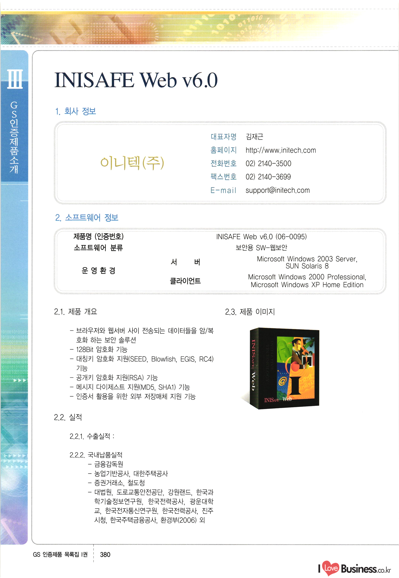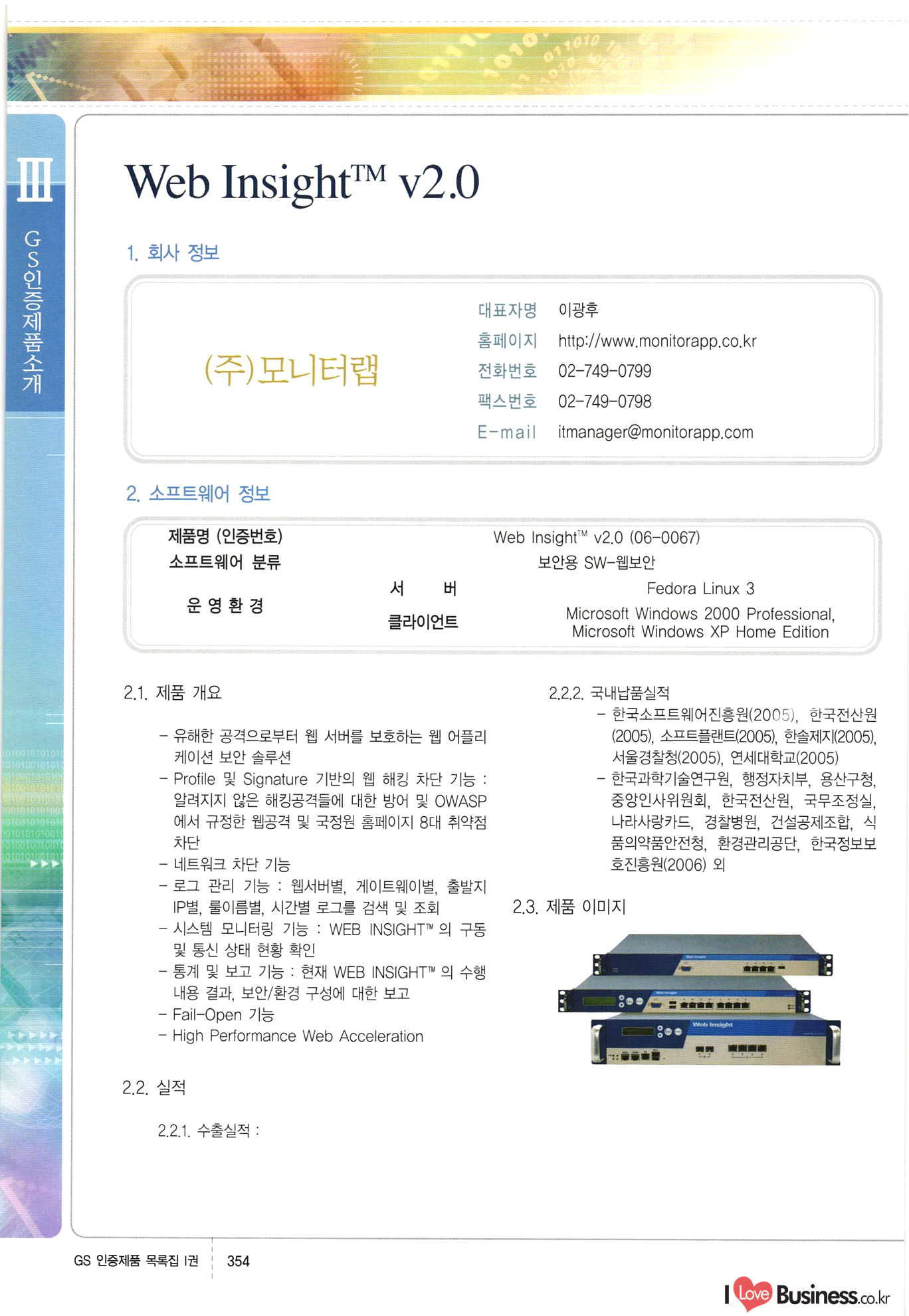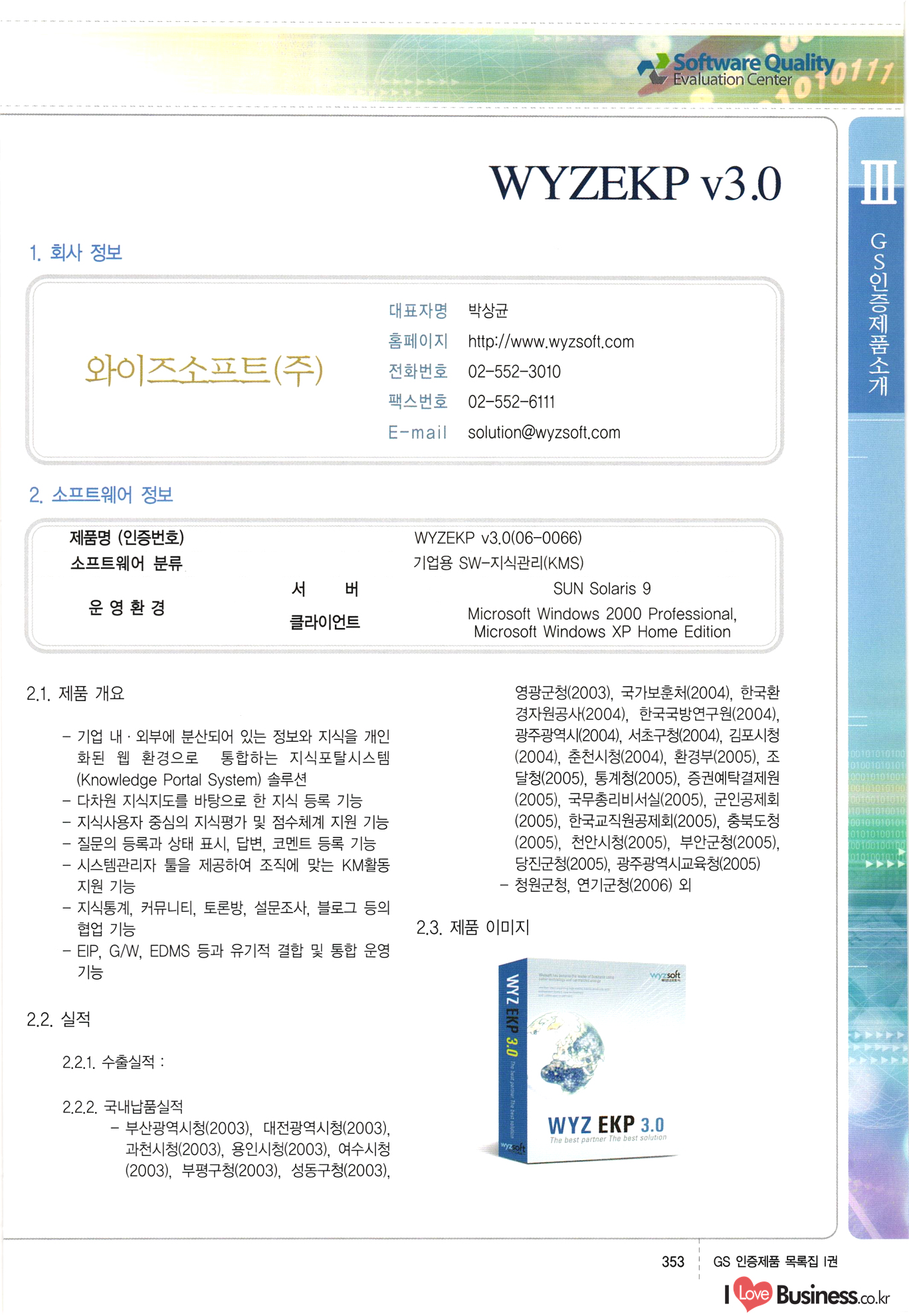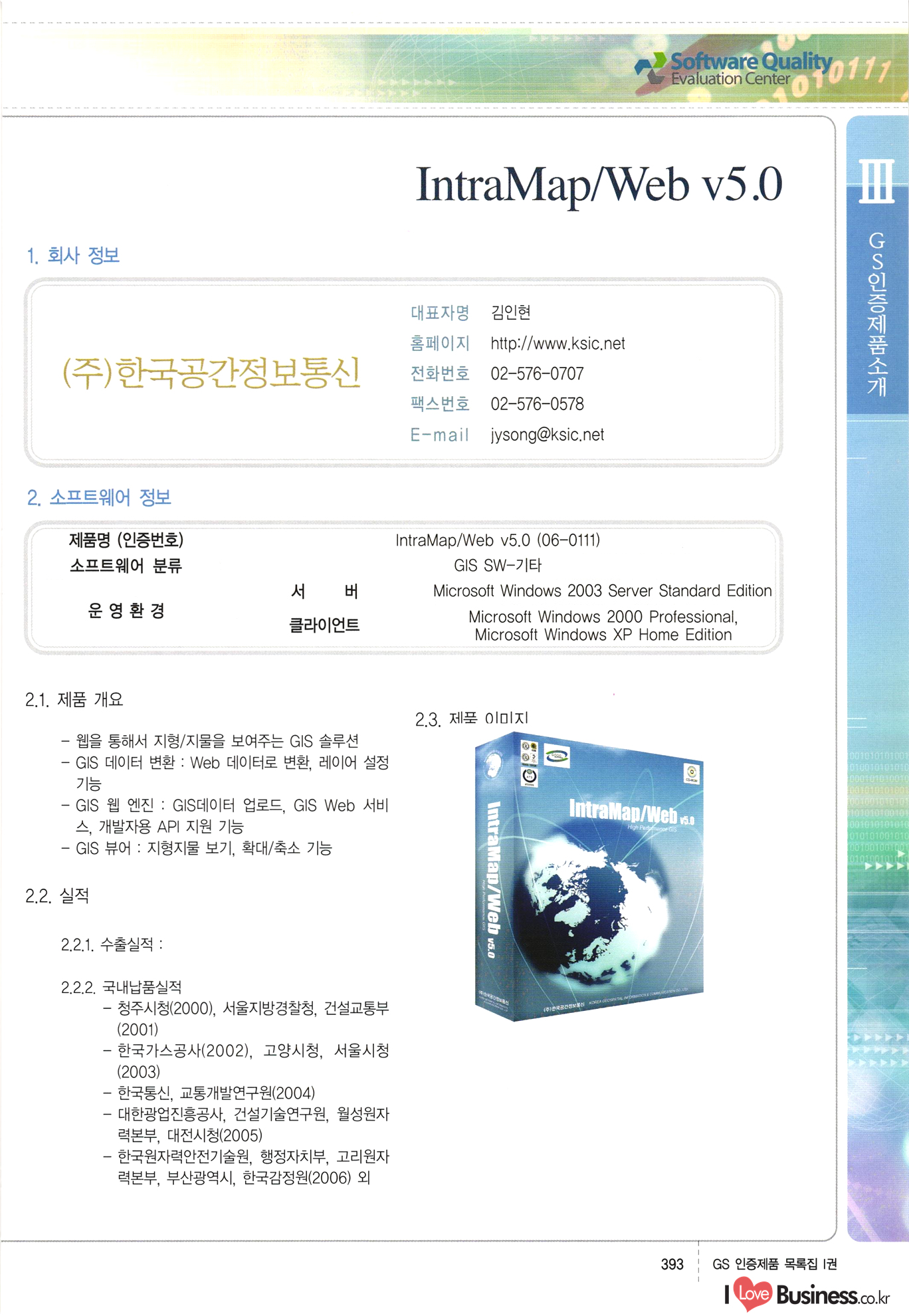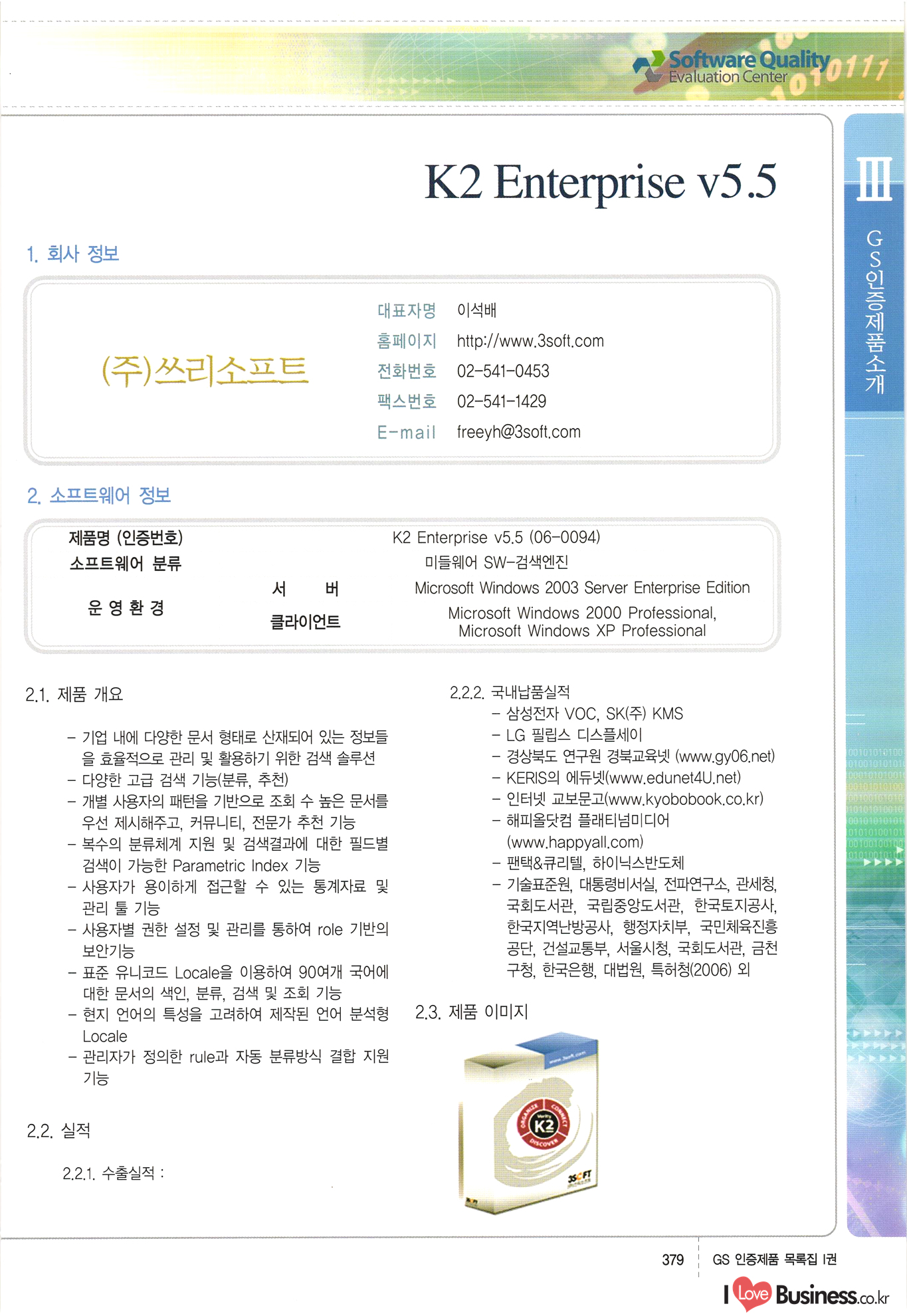 | III. GS 인증제품 목록 | 권-페이지번호 | 권-페이지번호 VT : VeriTest 국제 인증 GS인증제품목록 회사명 삼성에스디에스(주) 제품. EasyBase v4.1 페이지 50 1 제이엔에스 3DM Survey System v1.0 2 | 51 1 (주)싸이웍스 (주)테크다임 (주)다보넷 (주)로지스인포 CyberWALL 2000 v2.16 Jword v1.5 Touchsign v 2.1 키퍼엣홈 v1.0 78 52 (주)미래에듀테크 아이버스 v1.0 53 54 55 56 57 번호 | 인증번호 | 인증일자 01-0001 | 2001.07.25 101-0002 2001.10.22 (02-0027) | 01-0003 | 2001.11.27 | 01-0004 | 2001.11.27 | 01-0005 2001.11.27 5 | 01-0006 | 2001.12.27 02-0001 (02-0029) 2002.01.29 16 | | 02-0002 1 | 2002.02.16 | 02-0003 | 2002.02.16 02-0004 2002.02.27 9 | 02-0005 | 2002.02.27 110 | | 02-0006 | 2002.03.27 11 | || 02-0007 | 2002.03.27 | 02-0008 | 2002.04.30 | 02-0009 | 2002.04.30 | 02-0010 | 2002.04.30 15. | 02-0011 | 2002.04.30 16 102-0012 | 2002.04.30 | 17 | 02-0013 | 2002.05.30 | 18 | 02-0014 | 2002.05.30 | 02-0015 2002.06.28 | 20 | 02-0016 | 2002.06.28 02-0017 1 2002.06.28 | 02-0018 1 | 2002.06.28 23 | 02-0019 | 2002.06.28 24 02-0020 | 2002.07.31 25 | 02-0021 | 2002.07.31 224 58 14 59 118 (주)마크애니 (주)핸디소프트 (주)슈퍼테크놀러지 (주)스펙트라 이래정보시스템(주) (주)컴리빙아이티 | (주)시큐브 (주)케이게이트 (주)소프트4소프트 스페이스인터네셔널(주) (주)컴리빙아이티 (주)그린벨시스템즈 닉스테크(주) 심플소프트 (주)한국데이타비즈네스 (주)테크다임 (주)수세리눅스코리아 (주)한컴리눅스 소프트온넷(주) 와우리눅스(주) 60 61 Document Safer v1.0 | BizFlow Groupware v3.21 | Eg columbus || v1.0 | | eNomix v1.0 Blue Eyes v3.0 i-Class Five v1.05 Secuve TOS WG v1.0 위즈웹3 v3.0 RESORT v1.01 CD Tower v2.0 i-Class One2one v1.05 MANTIS-Professional v1.0 | | SAFEpc v1.5 Simple Gallery v1.00 통합카드발급프로그램 v1.0 Techdigm JCalc v2.0 Suse Linux 7.1K Professional Hancom Linux OS 2.2 Professional | Z!Stream v2.0 와우리눅스 7.1 파란 Secuve TOS WG Agent (Secuve Tos WG Manager) | SMERP v1.1 상하수도범용/ZEUS v1.0 U-Solver v1.0 dDIMS v3.0 DAL v2.5 101010101 1000 101003010101 190 1001010101 21 78. 122 | UL 63 64 65 26 | VT-02-001 | 2002.08.29 (주)시큐브 224 27 1 66 67 | 28 29 130 | 02-0022 | 2002.08.30 | 02-0023 | 2002.10.31 | 02-0024 | 2002.10.31 | 02-0025 | 2002.11.27 | 02-0026 | 2002.11.27 02-0027 (01-0002) 2002.11.27 | 02-0028 (03-0021) 2002.12.09 | 대한상공회의소 한국통신데이타(주) (주)지노시스템 유니온정보시스템(주) (주) 스 68 69 | 70 311 제이엔에스 소프트(구 제이엔에스) 3DM Survey System v1.0 (주)한국지능형정보시스템 한국관(상하수도 범용/TGW) v1.00 92 GS 인증제품 목록집 1권 | 26 I Love Business.co.kr Software Quality, 111 Evaluation Center | 권-페이지번호 II권페이지번호 VT : VeriTest 국제 인증 페이지 회사명 (주)포스데이타 제품 | iSign v2.0 | GS인증제품목록 171 | 34 | 02-0029 (주)제이슨테크(구 미래에듀테크) 아이버스 v1.0 91 72 73. 74 (주)인텔리젼스웨어 (주)하나디에스디 (주)연성정보기술 (주)포스정보 (주)켈코인 (주)포스데이타 스페이스인터내셔널 연희정보통신(주) (주)뉴테크웨이브 c-napse(GSS) v1.0 Life EduBuilder v1.0 | Email+ v3.0 1 책꽃이KDC v3.1 Challenger Webzine Webschool v3.0 1 Biz Binder v1.0 CD-Tower v3.1 상하수도 범용/UFCom v1.0 | | VirusChaser v5.0 | 175 76 118. (주)웨어벨리 Orange for ORACLE v2.2 | 번호 | 인증번호 | 인증일자 | 33 |VT-02-0022002.12.12 | | 2002.12.24 (02-0001) 35 | VT-02-003 | 2002.12.30 | 36 | 03-0001 | 2003.02.28 37. 03-0002 | 2003.02.28 | 38 | 03-0003 | 2003.02.28 | 39 | 03-0004 | 2003.02.28 40 | VT-03-001 | 2003.03.10 41 | VT-03-002) 2003.03.10 1 42 | 03-0005 | 2003.04.07 43 | 03-0006 | 2003.04.07 03-0007 2003.04.30 (03-0026) | 03-0008 | 2003.04.30 45 | 03-0009 | 2003.04.30 | 03-0010 | 2003.04.30 | 47 | 03-0011 | 2003.04.30 | 48 VT-03-003 2003.05.26 49 | 03-0012 | 2003.06.05 | 50 | 03-0013 | 2003.06.05 | 51 | 03-0014 | 2003.06.05 | 52 | 03-0015 | 2003.07.10 | 53 | 03-0016 | 2003.07.10 | 54 | 03-0017 | 2003.07.10 | | 55 | 03-0018 | 2003.07.10 | 56 | 03-0019 | 2003.08.06 57 | | 03-0020 | 2003.08.06 44 1 18 46 80 81 82 83 | (주)테크다임 (주)엔지스테크널러지 삼성에스디에스(주) 삼성에스디에스(주) (주)미디어랜드 인터컴소프트웨어(주) 에스케이씨앤씨(주) 아이티로직스(주) (주)에이씨티소프트 (주)위즈북 (주)에스오엔코리아 (주)아리수미디어 한진정보통신(주) (주)인텔리전스웨어 (주)웨어밸리 (구 (주)오알솔루션즈코리아) Techdigm Office v2.0 | G-Solution Waterworks/Sewerage v1.0 | | 79 UniCITY Standard v1.0 UniCITY Enterprise v1.0 TCO!stream 2002 v4.0 | ServerGuard v3.0 | SK-UPEX v1.0 84 NexWeb v1.2 e-Library Deluxe v4.1.5 86 DL Pro v1.0 SiR v1.01 파워CD뱅크 v4.0 89 InfoMatrix v1.00 190 Bizpus v1.0 91 85 87 88 10010010101.03 1101010100101 1100100100107 58 |VT-03-004 2003.08.12 Orange for ORACLE v2.2 | 111 59 (주)티지더블유 (구 한국지능형정보시스템) 한국관(상하수도 범용/TGW) v1.0 92 93 GIS Free v1.0 DeskPlus v2.0 1 | 94 ArcCITY v1.0 110 03-0021 (02-0028) | 2003.09.04 | 60 | 03-0022 | 2003.09.30 03-0023 | 2003.09.30 03-0024 (04-0011) | 2003.09.30 | 03-0025 | 2003.09.30 03-0026 (03-0007) | 2003.10.07 63 | 03-0027 | 2003.11.12 64 | 03-0028 | 2003.11.12 622 세광정보시스템(주) 제오스페이스(주) (주)선도소프트 (구 (주)캐드랜드) 중앙항업(주) (주)웨어밸리 (구 (주)오알솔루션즈코리아) (주)우암닷컴 (주)오투라인 geoCUBE상하수도 v1.0 95 Orange for ORACLE V2.2 111 96 RAVCOMS Eyecon v4.0 오투스쿨 v2.01 97 GS 인증제품 목록집 1권 I Love Business.co.kr | 권-페이지번호 | 권 - 페이지번호 VT : VeriTest 국제 인증 번호 페이지 회사명 소프트캠프