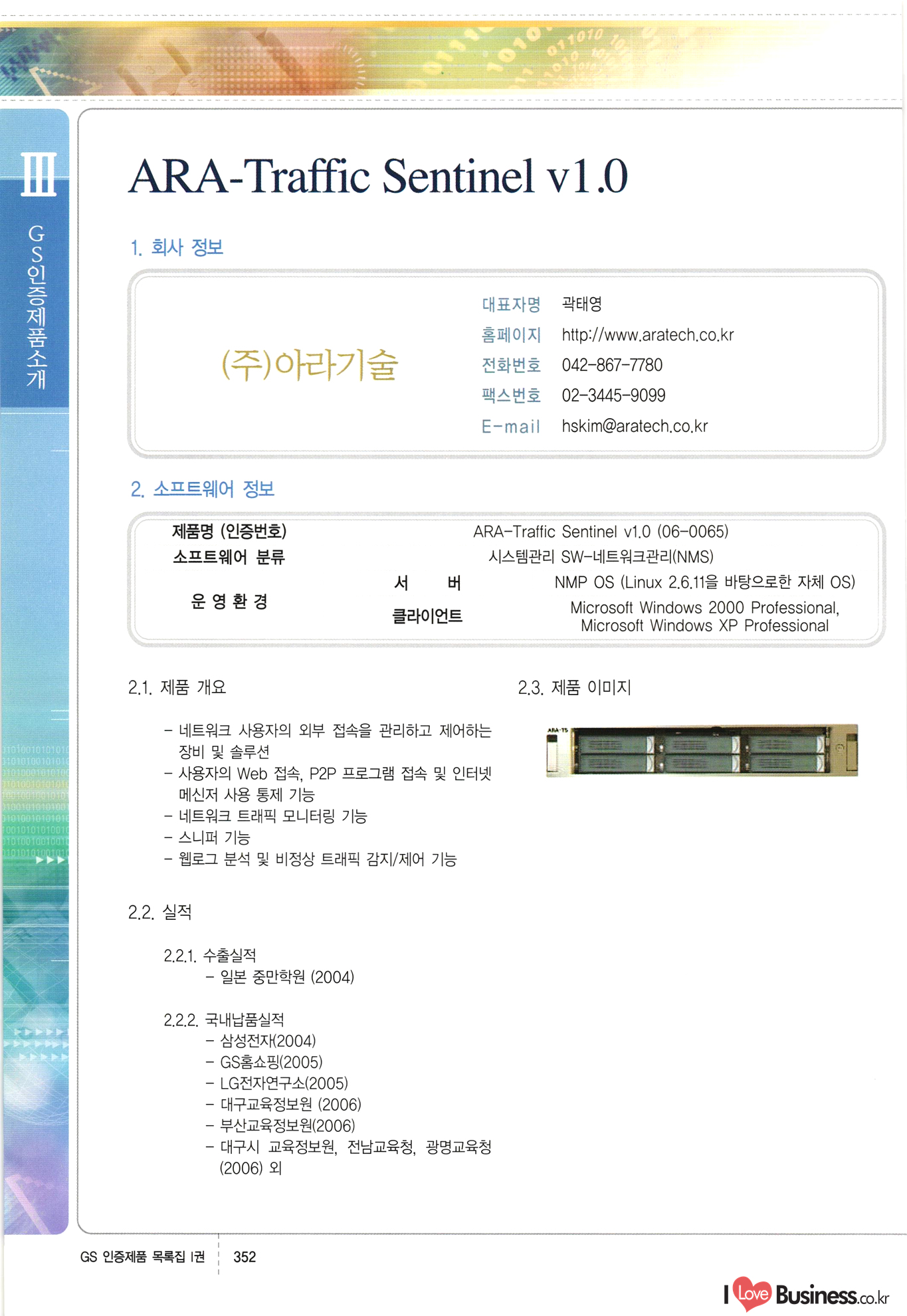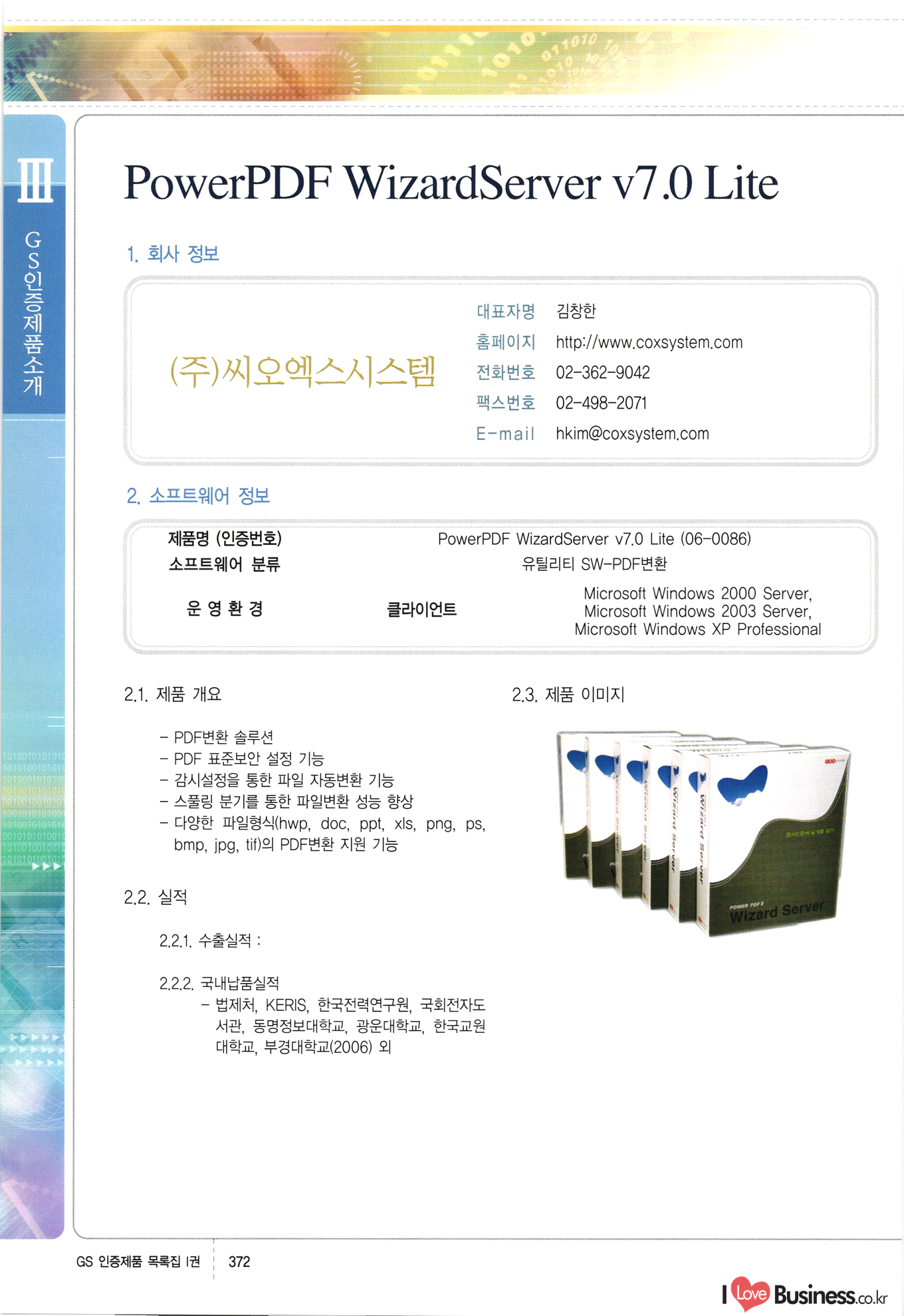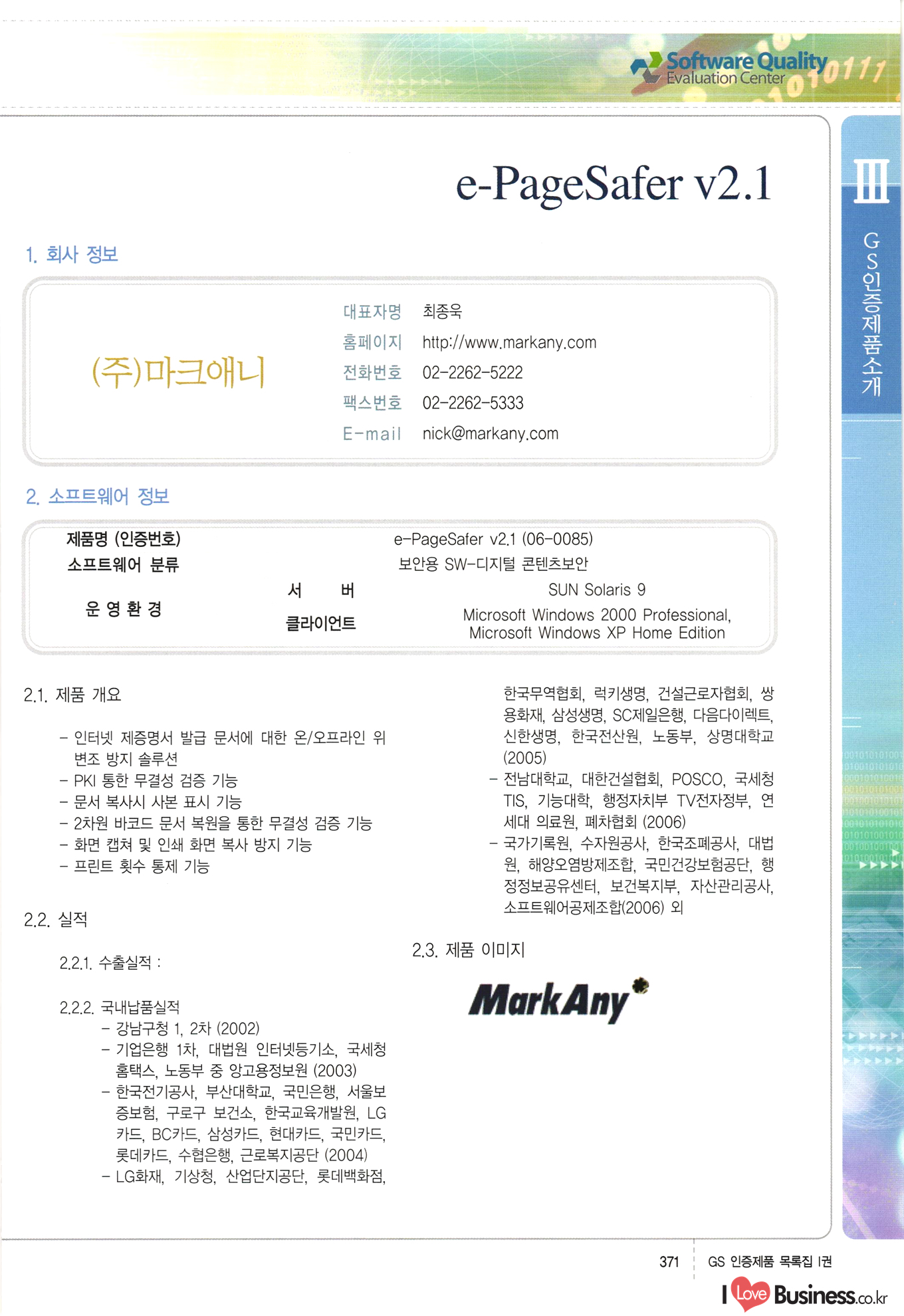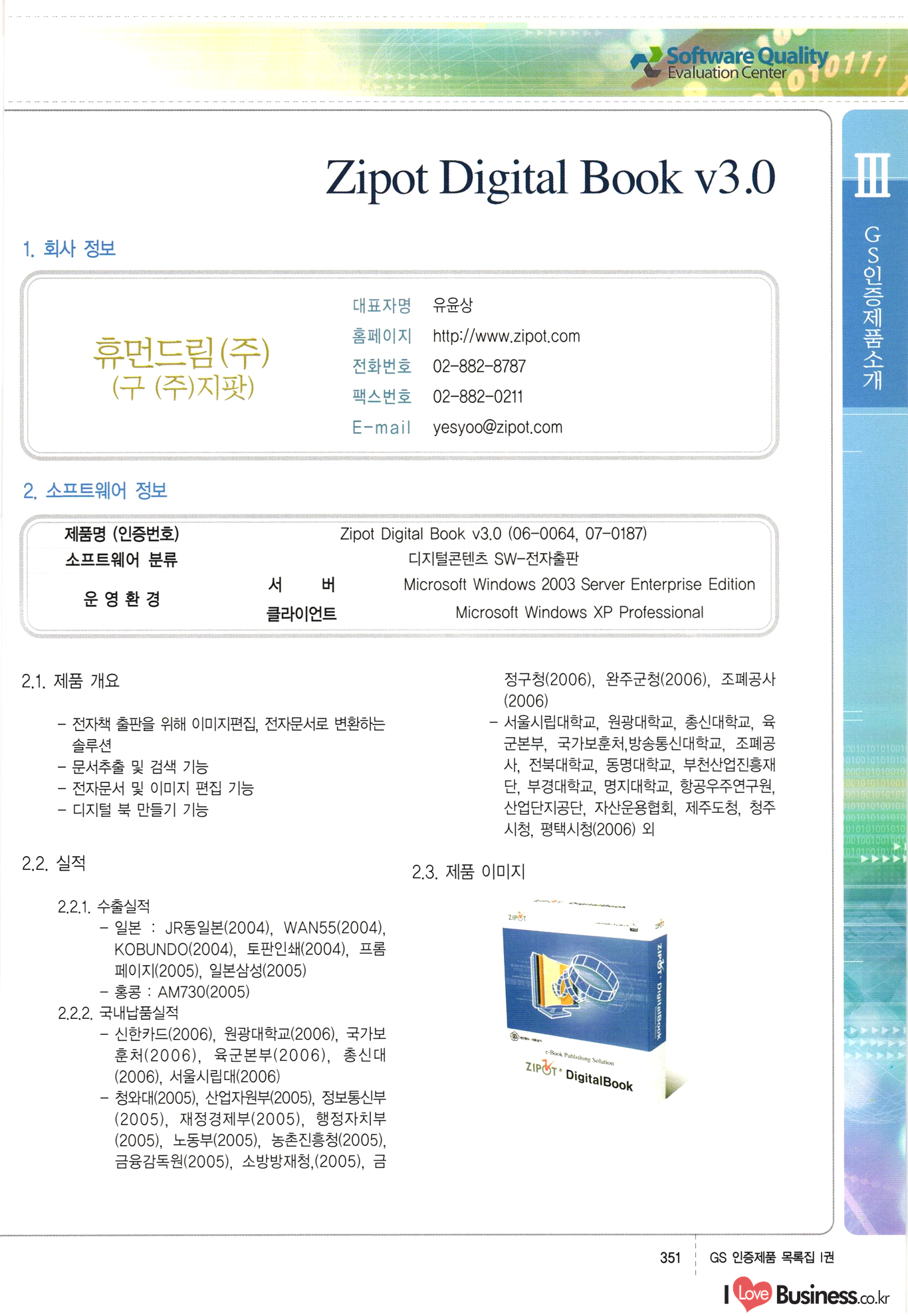 | III. GS 인증제품 목록 | 권-페이지번호 | 권-페이지번호 VT : VeriTest 국제 인증 GS인증제품목록 회사명 삼성에스디에스(주) 제품. EasyBase v4.1 페이지 50 1 제이엔에스 3DM Survey System v1.0 2 | 51 1 (주)싸이웍스 (주)테크다임 (주)다보넷 (주)로지스인포 CyberWALL 2000 v2.16 Jword v1.5 Touchsign v 2.1 키퍼엣홈 v1.0 78 52 (주)미래에듀테크 아이버스 v1.0 53 54 55 56 57 번호 | 인증번호 | 인증일자 01-0001 | 2001.07.25 101-0002 2001.10.22 (02-0027) | 01-0003 | 2001.11.27 | 01-0004 | 2001.11.27 | 01-0005 2001.11.27 5 | 01-0006 | 2001.12.27 02-0001 (02-0029) 2002.01.29 16 | | 02-0002 1 | 2002.02.16 | 02-0003 | 2002.02.16 02-0004 2002.02.27 9 | 02-0005 | 2002.02.27 110 | | 02-0006 | 2002.03.27 11 | || 02-0007 | 2002.03.27 | 02-0008 | 2002.04.30 | 02-0009 | 2002.04.30 | 02-0010 | 2002.04.30 15. | 02-0011 | 2002.04.30 16 102-0012 | 2002.04.30 | 17 | 02-0013 | 2002.05.30 | 18 | 02-0014 | 2002.05.30 | 02-0015 2002.06.28 | 20 | 02-0016 | 2002.06.28 02-0017 1 2002.06.28 | 02-0018 1 | 2002.06.28 23 | 02-0019 | 2002.06.28 24 02-0020 | 2002.07.31 25 | 02-0021 | 2002.07.31 224 58 14 59 118 (주)마크애니 (주)핸디소프트 (주)슈퍼테크놀러지 (주)스펙트라 이래정보시스템(주) (주)컴리빙아이티 | (주)시큐브 (주)케이게이트 (주)소프트4소프트 스페이스인터네셔널(주) (주)컴리빙아이티 (주)그린벨시스템즈 닉스테크(주) 심플소프트 (주)한국데이타비즈네스 (주)테크다임 (주)수세리눅스코리아 (주)한컴리눅스 소프트온넷(주) 와우리눅스(주) 60 61 Document Safer v1.0 | BizFlow Groupware v3.21 | Eg columbus || v1.0 | | eNomix v1.0 Blue Eyes v3.0 i-Class Five v1.05 Secuve TOS WG v1.0 위즈웹3 v3.0 RESORT v1.01 CD Tower v2.0 i-Class One2one v1.05 MANTIS-Professional v1.0 | | SAFEpc v1.5 Simple Gallery v1.00 통합카드발급프로그램 v1.0 Techdigm JCalc v2.0 Suse Linux 7.1K Professional Hancom Linux OS 2.2 Professional | Z!Stream v2.0 와우리눅스 7.1 파란 Secuve TOS WG Agent (Secuve Tos WG Manager) | SMERP v1.1 상하수도범용/ZEUS v1.0 U-Solver v1.0 dDIMS v3.0 DAL v2.5 101010101 1000 101003010101 190 1001010101 21 78. 122 | UL 63 64 65 26 | VT-02-001 | 2002.08.29 (주)시큐브 224 27 1 66 67 | 28 29 130 | 02-0022 | 2002.08.30 | 02-0023 | 2002.10.31 | 02-0024 | 2002.10.31 | 02-0025 | 2002.11.27 | 02-0026 | 2002.11.27 02-0027 (01-0002) 2002.11.27 | 02-0028 (03-0021) 2002.12.09 | 대한상공회의소 한국통신데이타(주) (주)지노시스템 유니온정보시스템(주) (주) 스 68 69 | 70 311 제이엔에스 소프트(구 제이엔에스) 3DM Survey System v1.0 (주)한국지능형정보시스템 한국관(상하수도 범용/TGW) v1.00 92 GS 인증제품 목록집 1권 | 26 I Love Business.co.kr Software Quality, 111 Evaluation Center | 권-페이지번호 II권페이지번호 VT : VeriTest 국제 인증 페이지 회사명 (주)포스데이타 제품 | iSign v2.0 | GS인증제품목록 171 | 34 | 02-0029 (주)제이슨테크(구 미래에듀테크) 아이버스 v1.0 91 72 73. 74 (주)인텔리젼스웨어 (주)하나디에스디 (주)연성정보기술 (주)포스정보 (주)켈코인 (주)포스데이타 스페이스인터내셔널 연희정보통신(주) (주)뉴테크웨이브 c-napse(GSS) v1.0 Life EduBuilder v1.0 | Email+ v3.0 1 책꽃이KDC v3.1 Challenger Webzine Webschool v3.0 1 Biz Binder v1.0 CD-Tower v3.1 상하수도 범용/UFCom v1.0 | | VirusChaser v5.0 | 175 76 118. (주)웨어벨리 Orange for ORACLE v2.2 | 번호 | 인증번호 | 인증일자 | 33 |VT-02-0022002.12.12 | | 2002.12.24 (02-0001) 35 | VT-02-003 | 2002.12.30 | 36 | 03-0001 | 2003.02.28 37. 03-0002 | 2003.02.28 | 38 | 03-0003 | 2003.02.28 | 39 | 03-0004 | 2003.02.28 40 | VT-03-001 | 2003.03.10 41 | VT-03-002) 2003.03.10 1 42 | 03-0005 | 2003.04.07 43 | 03-0006 | 2003.04.07 03-0007 2003.04.30 (03-0026) | 03-0008 | 2003.04.30 45 | 03-0009 | 2003.04.30 | 03-0010 | 2003.04.30 | 47 | 03-0011 | 2003.04.30 | 48 VT-03-003 2003.05.26 49 | 03-0012 | 2003.06.05 | 50 | 03-0013 | 2003.06.05 | 51 | 03-0014 | 2003.06.05 | 52 | 03-0015 | 2003.07.10 | 53 | 03-0016 | 2003.07.10 | 54 | 03-0017 | 2003.07.10 | | 55 | 03-0018 | 2003.07.10 | 56 | 03-0019 | 2003.08.06 57 | | 03-0020 | 2003.08.06 44 1 18 46 80 81 82 83 | (주)테크다임 (주)엔지스테크널러지 삼성에스디에스(주) 삼성에스디에스(주) (주)미디어랜드 인터컴소프트웨어(주) 에스케이씨앤씨(주) 아이티로직스(주) (주)에이씨티소프트 (주)위즈북 (주)에스오엔코리아 (주)아리수미디어 한진정보통신(주) (주)인텔리전스웨어 (주)웨어밸리 (구 (주)오알솔루션즈코리아) Techdigm Office v2.0 | G-Solution Waterworks/Sewerage v1.0 | | 79 UniCITY Standard v1.0 UniCITY Enterprise v1.0 TCO!stream 2002 v4.0 | ServerGuard v3.0 | SK-UPEX v1.0 84 NexWeb v1.2 e-Library Deluxe v4.1.5 86 DL Pro v1.0 SiR v1.01 파워CD뱅크 v4.0 89 InfoMatrix v1.00 190 Bizpus v1.0 91 85 87 88 10010010101.03 1101010100101 1100100100107 58 |VT-03-004 2003.08.12 Orange for ORACLE v2.2 | 111 59 (주)티지더블유 (구 한국지능형정보시스템) 한국관(상하수도 범용/TGW) v1.0 92 93 GIS Free v1.0 DeskPlus v2.0 1 | 94 ArcCITY v1.0 110 03-0021 (02-0028) | 2003.09.04 | 60 | 03-0022 | 2003.09.30 03-0023 | 2003.09.30 03-0024 (04-0011) | 2003.09.30 | 03-0025 | 2003.09.30 03-0026 (03-0007) | 2003.10.07 63 | 03-0027 | 2003.11.12 64 | 03-0028 | 2003.11.12 622 세광정보시스템(주) 제오스페이스(주) (주)선도소프트 (구 (주)캐드랜드) 중앙항업(주) (주)웨어밸리 (구 (주)오알솔루션즈코리아) (주)우암닷컴 (주)오투라인 geoCUBE상하수도 v1.0 95 Orange for ORACLE V2.2 111 96 RAVCOMS Eyecon v4.0 오투스쿨 v2.01 97 GS 인증제품 목록집 1권 I Love Business.co.kr | 권-페이지번호 | 권 - 페이지번호 VT : VeriTest 국제 인증 번호 페이지 회사명 소프트캠프