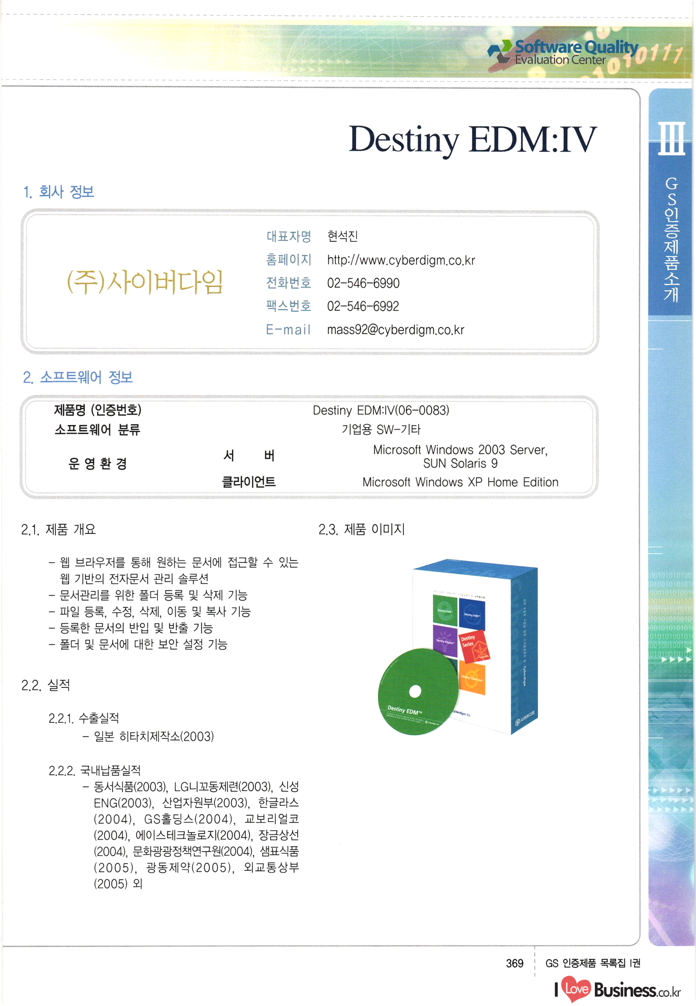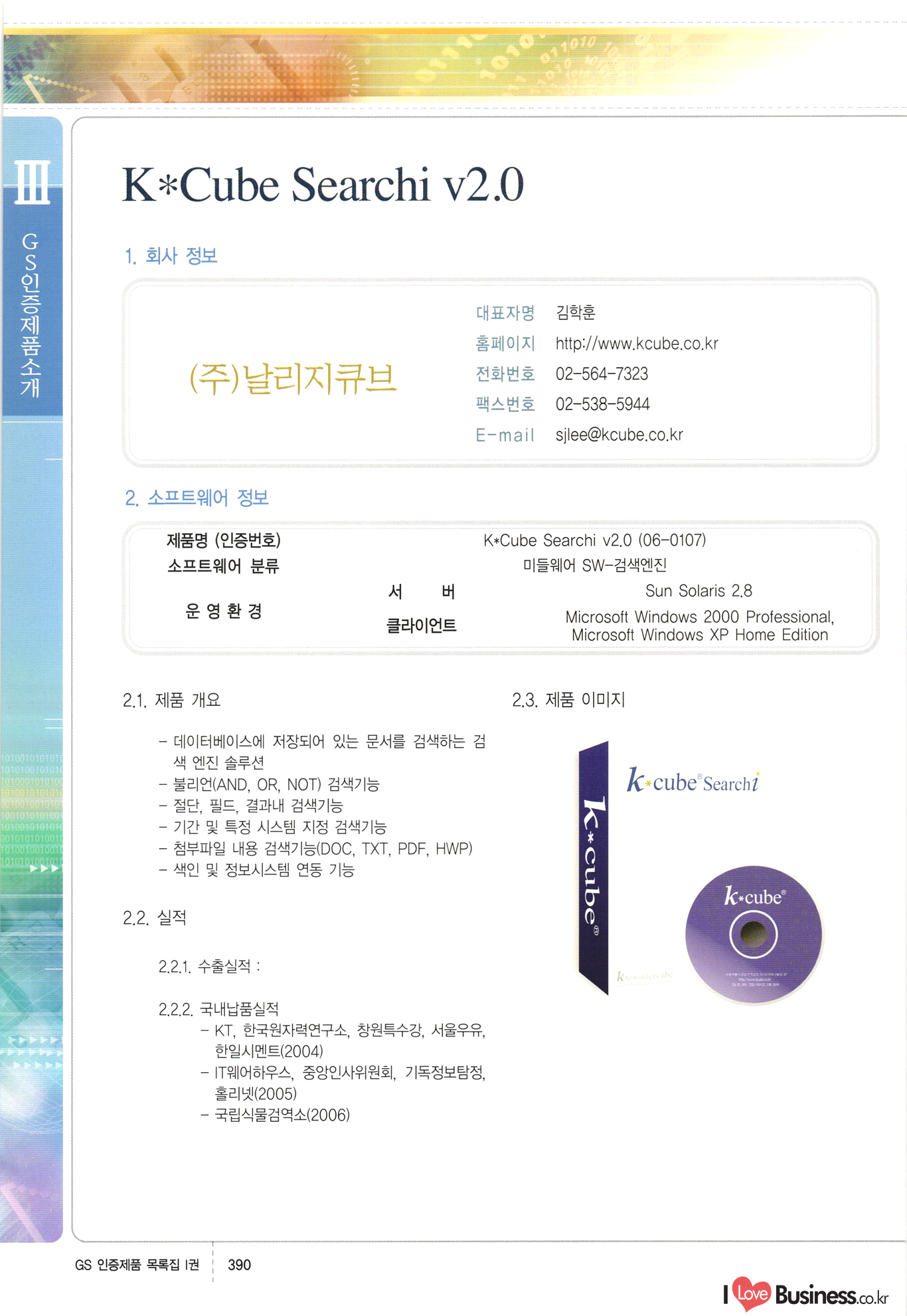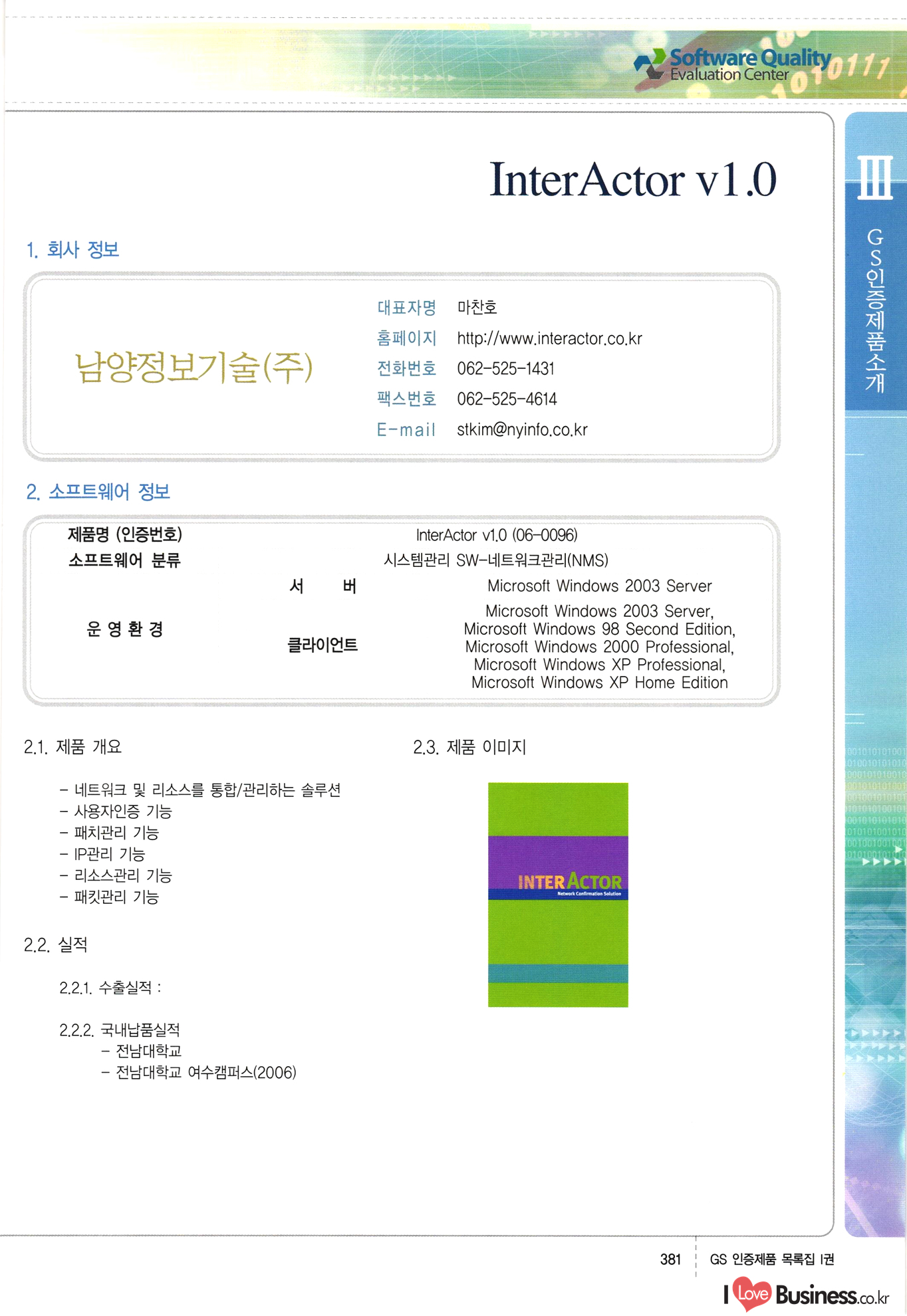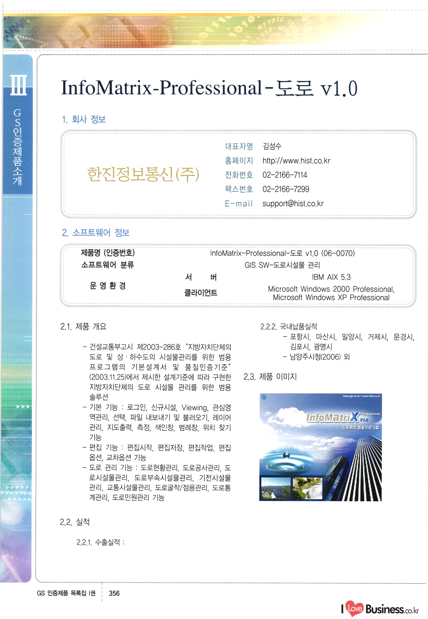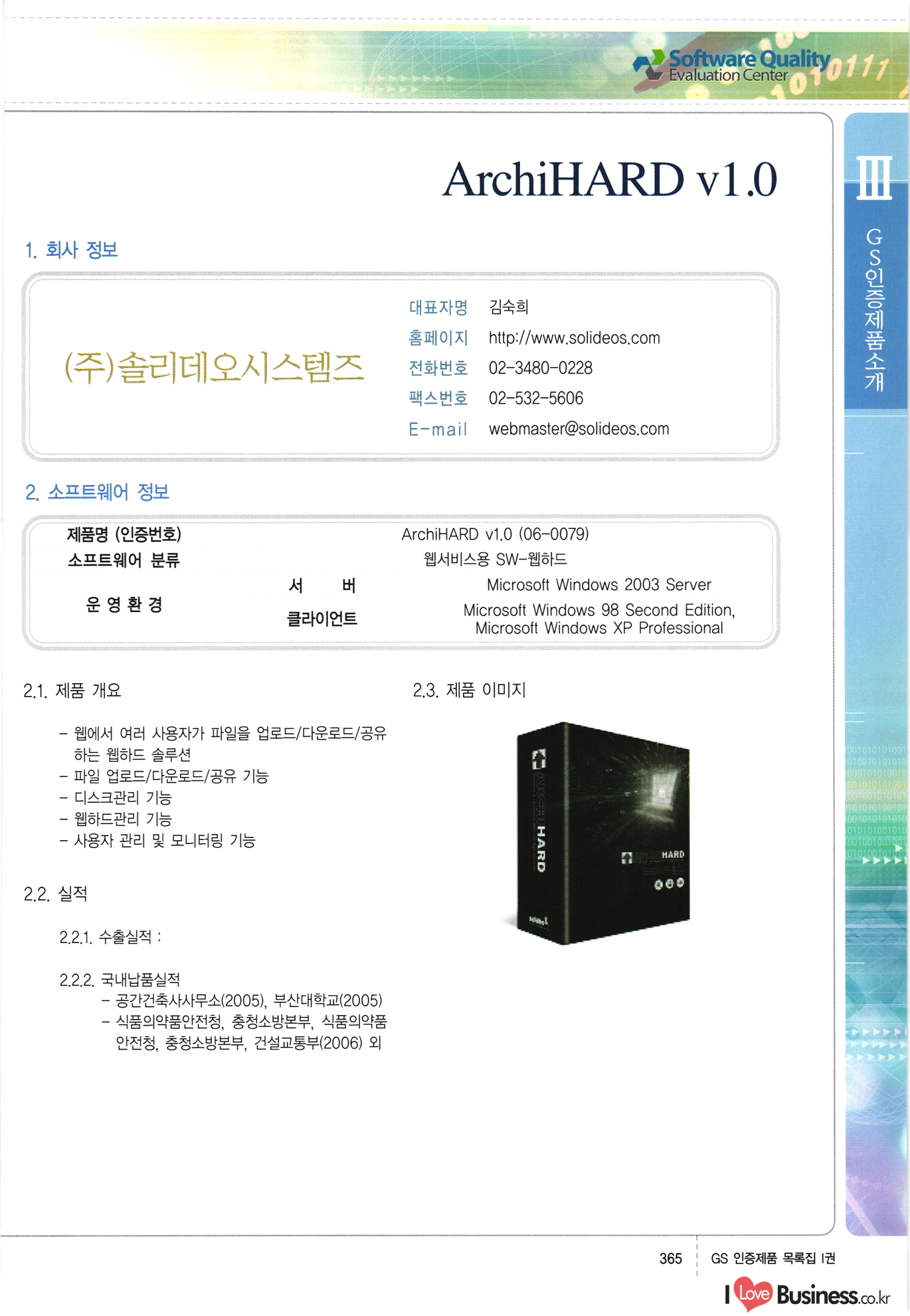 | III. GS 인증제품 목록 | 권-페이지번호 | 권-페이지번호 VT : VeriTest 국제 인증 GS인증제품목록 회사명 삼성에스디에스(주) 제품. EasyBase v4.1 페이지 50 1 제이엔에스 3DM Survey System v1.0 2 | 51 1 (주)싸이웍스 (주)테크다임 (주)다보넷 (주)로지스인포 CyberWALL 2000 v2.16 Jword v1.5 Touchsign v 2.1 키퍼엣홈 v1.0 78 52 (주)미래에듀테크 아이버스 v1.0 53 54 55 56 57 번호 | 인증번호 | 인증일자 01-0001 | 2001.07.25 101-0002 2001.10.22 (02-0027) | 01-0003 | 2001.11.27 | 01-0004 | 2001.11.27 | 01-0005 2001.11.27 5 | 01-0006 | 2001.12.27 02-0001 (02-0029) 2002.01.29 16 | | 02-0002 1 | 2002.02.16 | 02-0003 | 2002.02.16 02-0004 2002.02.27 9 | 02-0005 | 2002.02.27 110 | | 02-0006 | 2002.03.27 11 | || 02-0007 | 2002.03.27 | 02-0008 | 2002.04.30 | 02-0009 | 2002.04.30 | 02-0010 | 2002.04.30 15. | 02-0011 | 2002.04.30 16 102-0012 | 2002.04.30 | 17 | 02-0013 | 2002.05.30 | 18 | 02-0014 | 2002.05.30 | 02-0015 2002.06.28 | 20 | 02-0016 | 2002.06.28 02-0017 1 2002.06.28 | 02-0018 1 | 2002.06.28 23 | 02-0019 | 2002.06.28 24 02-0020 | 2002.07.31 25 | 02-0021 | 2002.07.31 224 58 14 59 118 (주)마크애니 (주)핸디소프트 (주)슈퍼테크놀러지 (주)스펙트라 이래정보시스템(주) (주)컴리빙아이티 | (주)시큐브 (주)케이게이트 (주)소프트4소프트 스페이스인터네셔널(주) (주)컴리빙아이티 (주)그린벨시스템즈 닉스테크(주) 심플소프트 (주)한국데이타비즈네스 (주)테크다임 (주)수세리눅스코리아 (주)한컴리눅스 소프트온넷(주) 와우리눅스(주) 60 61 Document Safer v1.0 | BizFlow Groupware v3.21 | Eg columbus || v1.0 | | eNomix v1.0 Blue Eyes v3.0 i-Class Five v1.05 Secuve TOS WG v1.0 위즈웹3 v3.0 RESORT v1.01 CD Tower v2.0 i-Class One2one v1.05 MANTIS-Professional v1.0 | | SAFEpc v1.5 Simple Gallery v1.00 통합카드발급프로그램 v1.0 Techdigm JCalc v2.0 Suse Linux 7.1K Professional Hancom Linux OS 2.2 Professional | Z!Stream v2.0 와우리눅스 7.1 파란 Secuve TOS WG Agent (Secuve Tos WG Manager) | SMERP v1.1 상하수도범용/ZEUS v1.0 U-Solver v1.0 dDIMS v3.0 DAL v2.5 101010101 1000 101003010101 190 1001010101 21 78. 122 | UL 63 64 65 26 | VT-02-001 | 2002.08.29 (주)시큐브 224 27 1 66 67 | 28 29 130 | 02-0022 | 2002.08.30 | 02-0023 | 2002.10.31 | 02-0024 | 2002.10.31 | 02-0025 | 2002.11.27 | 02-0026 | 2002.11.27 02-0027 (01-0002) 2002.11.27 | 02-0028 (03-0021) 2002.12.09 | 대한상공회의소 한국통신데이타(주) (주)지노시스템 유니온정보시스템(주) (주) 스 68 69 | 70 311 제이엔에스 소프트(구 제이엔에스) 3DM Survey System v1.0 (주)한국지능형정보시스템 한국관(상하수도 범용/TGW) v1.00 92 GS 인증제품 목록집 1권 | 26 I Love Business.co.kr Software Quality, 111 Evaluation Center | 권-페이지번호 II권페이지번호 VT : VeriTest 국제 인증 페이지 회사명 (주)포스데이타 제품 | iSign v2.0 | GS인증제품목록 171 | 34 | 02-0029 (주)제이슨테크(구 미래에듀테크) 아이버스 v1.0 91 72 73. 74 (주)인텔리젼스웨어 (주)하나디에스디 (주)연성정보기술 (주)포스정보 (주)켈코인 (주)포스데이타 스페이스인터내셔널 연희정보통신(주) (주)뉴테크웨이브 c-napse(GSS) v1.0 Life EduBuilder v1.0 | Email+ v3.0 1 책꽃이KDC v3.1 Challenger Webzine Webschool v3.0 1 Biz Binder v1.0 CD-Tower v3.1 상하수도 범용/UFCom v1.0 | | VirusChaser v5.0 | 175 76 118. (주)웨어벨리 Orange for ORACLE v2.2 | 번호 | 인증번호 | 인증일자 | 33 |VT-02-0022002.12.12 | | 2002.12.24 (02-0001) 35 | VT-02-003 | 2002.12.30 | 36 | 03-0001 | 2003.02.28 37. 03-0002 | 2003.02.28 | 38 | 03-0003 | 2003.02.28 | 39 | 03-0004 | 2003.02.28 40 | VT-03-001 | 2003.03.10 41 | VT-03-002) 2003.03.10 1 42 | 03-0005 | 2003.04.07 43 | 03-0006 | 2003.04.07 03-0007 2003.04.30 (03-0026) | 03-0008 | 2003.04.30 45 | 03-0009 | 2003.04.30 | 03-0010 | 2003.04.30 | 47 | 03-0011 | 2003.04.30 | 48 VT-03-003 2003.05.26 49 | 03-0012 | 2003.06.05 | 50 | 03-0013 | 2003.06.05 | 51 | 03-0014 | 2003.06.05 | 52 | 03-0015 | 2003.07.10 | 53 | 03-0016 | 2003.07.10 | 54 | 03-0017 | 2003.07.10 | | 55 | 03-0018 | 2003.07.10 | 56 | 03-0019 | 2003.08.06 57 | | 03-0020 | 2003.08.06 44 1 18 46 80 81 82 83 | (주)테크다임 (주)엔지스테크널러지 삼성에스디에스(주) 삼성에스디에스(주) (주)미디어랜드 인터컴소프트웨어(주) 에스케이씨앤씨(주) 아이티로직스(주) (주)에이씨티소프트 (주)위즈북 (주)에스오엔코리아 (주)아리수미디어 한진정보통신(주) (주)인텔리전스웨어 (주)웨어밸리 (구 (주)오알솔루션즈코리아) Techdigm Office v2.0 | G-Solution Waterworks/Sewerage v1.0 | | 79 UniCITY Standard v1.0 UniCITY Enterprise v1.0 TCO!stream 2002 v4.0 | ServerGuard v3.0 | SK-UPEX v1.0 84 NexWeb v1.2 e-Library Deluxe v4.1.5 86 DL Pro v1.0 SiR v1.01 파워CD뱅크 v4.0 89 InfoMatrix v1.00 190 Bizpus v1.0 91 85 87 88 10010010101.03 1101010100101 1100100100107 58 |VT-03-004 2003.08.12 Orange for ORACLE v2.2 | 111 59 (주)티지더블유 (구 한국지능형정보시스템) 한국관(상하수도 범용/TGW) v1.0 92 93 GIS Free v1.0 DeskPlus v2.0 1 | 94 ArcCITY v1.0 110 03-0021 (02-0028) | 2003.09.04 | 60 | 03-0022 | 2003.09.30 03-0023 | 2003.09.30 03-0024 (04-0011) | 2003.09.30 | 03-0025 | 2003.09.30 03-0026 (03-0007) | 2003.10.07 63 | 03-0027 | 2003.11.12 64 | 03-0028 | 2003.11.12 622 세광정보시스템(주) 제오스페이스(주) (주)선도소프트 (구 (주)캐드랜드) 중앙항업(주) (주)웨어밸리 (구 (주)오알솔루션즈코리아) (주)우암닷컴 (주)오투라인 geoCUBE상하수도 v1.0 95 Orange for ORACLE V2.2 111 96 RAVCOMS Eyecon v4.0 오투스쿨 v2.01 97 GS 인증제품 목록집 1권 I Love Business.co.kr | 권-페이지번호 | 권 - 페이지번호 VT : VeriTest 국제 인증 번호 페이지 회사명 소프트캠프