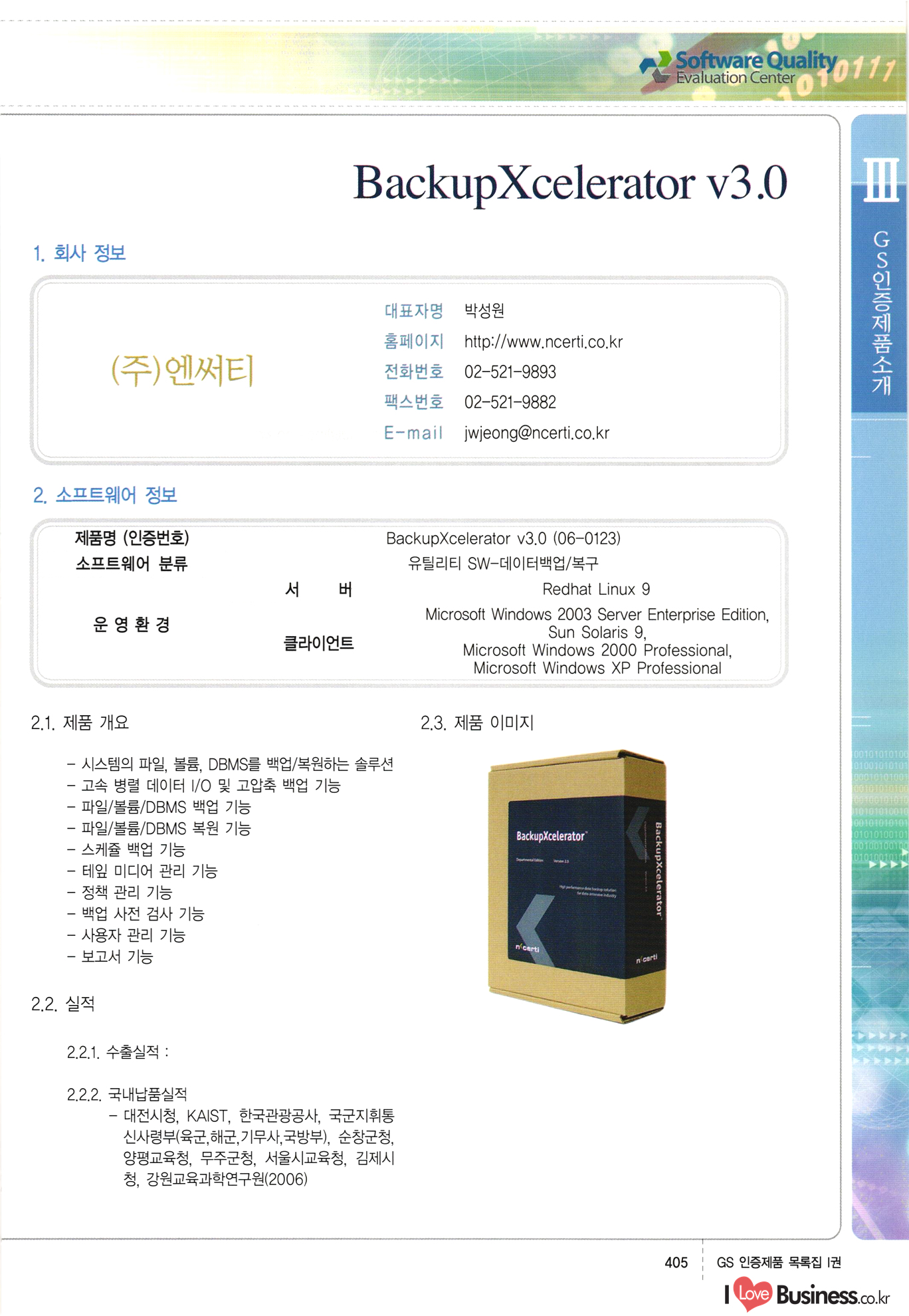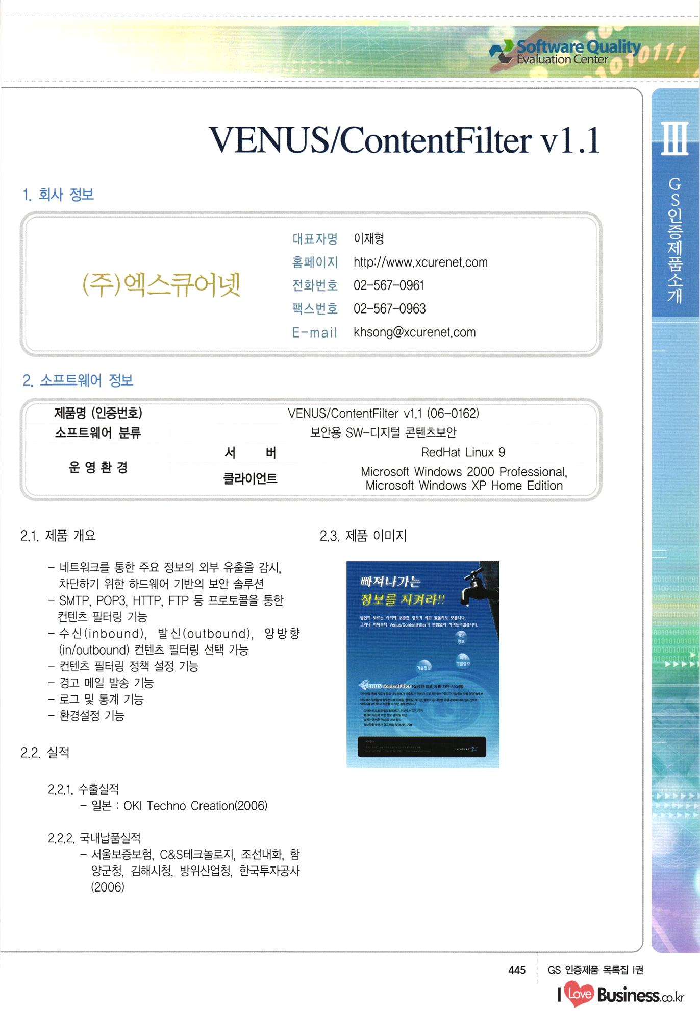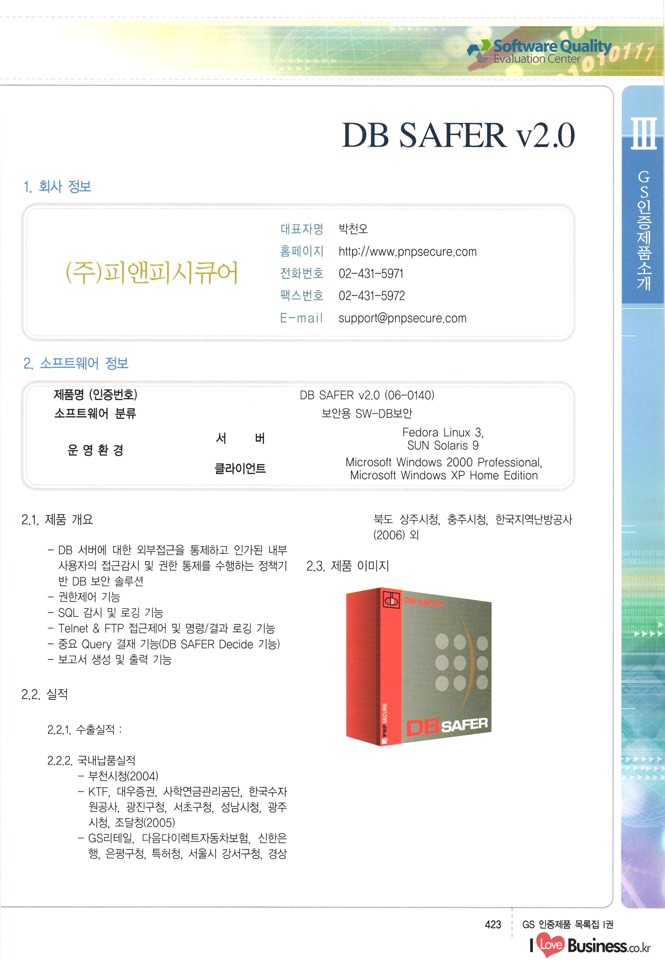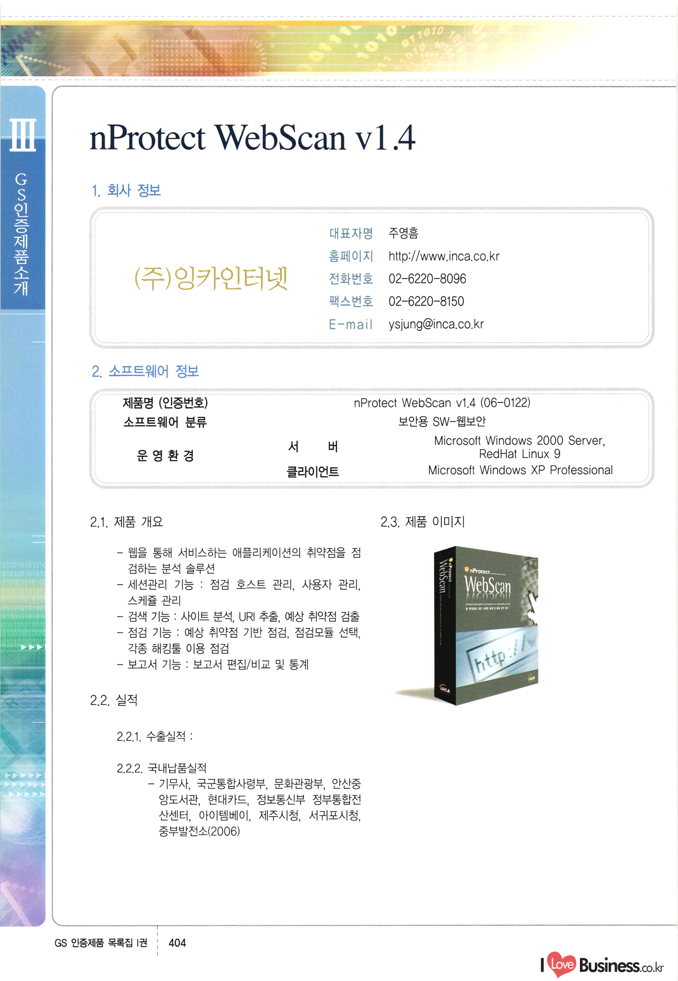 | III. GS 인증제품 목록 | 권-페이지번호 | 권-페이지번호 VT : VeriTest 국제 인증 GS인증제품목록 회사명 삼성에스디에스(주) 제품. EasyBase v4.1 페이지 50 1 제이엔에스 3DM Survey System v1.0 2 | 51 1 (주)싸이웍스 (주)테크다임 (주)다보넷 (주)로지스인포 CyberWALL 2000 v2.16 Jword v1.5 Touchsign v 2.1 키퍼엣홈 v1.0 78 52 (주)미래에듀테크 아이버스 v1.0 53 54 55 56 57 번호 | 인증번호 | 인증일자 01-0001 | 2001.07.25 101-0002 2001.10.22 (02-0027) | 01-0003 | 2001.11.27 | 01-0004 | 2001.11.27 | 01-0005 2001.11.27 5 | 01-0006 | 2001.12.27 02-0001 (02-0029) 2002.01.29 16 | | 02-0002 1 | 2002.02.16 | 02-0003 | 2002.02.16 02-0004 2002.02.27 9 | 02-0005 | 2002.02.27 110 | | 02-0006 | 2002.03.27 11 | || 02-0007 | 2002.03.27 | 02-0008 | 2002.04.30 | 02-0009 | 2002.04.30 | 02-0010 | 2002.04.30 15. | 02-0011 | 2002.04.30 16 102-0012 | 2002.04.30 | 17 | 02-0013 | 2002.05.30 | 18 | 02-0014 | 2002.05.30 | 02-0015 2002.06.28 | 20 | 02-0016 | 2002.06.28 02-0017 1 2002.06.28 | 02-0018 1 | 2002.06.28 23 | 02-0019 | 2002.06.28 24 02-0020 | 2002.07.31 25 | 02-0021 | 2002.07.31 224 58 14 59 118 (주)마크애니 (주)핸디소프트 (주)슈퍼테크놀러지 (주)스펙트라 이래정보시스템(주) (주)컴리빙아이티 | (주)시큐브 (주)케이게이트 (주)소프트4소프트 스페이스인터네셔널(주) (주)컴리빙아이티 (주)그린벨시스템즈 닉스테크(주) 심플소프트 (주)한국데이타비즈네스 (주)테크다임 (주)수세리눅스코리아 (주)한컴리눅스 소프트온넷(주) 와우리눅스(주) 60 61 Document Safer v1.0 | BizFlow Groupware v3.21 | Eg columbus || v1.0 | | eNomix v1.0 Blue Eyes v3.0 i-Class Five v1.05 Secuve TOS WG v1.0 위즈웹3 v3.0 RESORT v1.01 CD Tower v2.0 i-Class One2one v1.05 MANTIS-Professional v1.0 | | SAFEpc v1.5 Simple Gallery v1.00 통합카드발급프로그램 v1.0 Techdigm JCalc v2.0 Suse Linux 7.1K Professional Hancom Linux OS 2.2 Professional | Z!Stream v2.0 와우리눅스 7.1 파란 Secuve TOS WG Agent (Secuve Tos WG Manager) | SMERP v1.1 상하수도범용/ZEUS v1.0 U-Solver v1.0 dDIMS v3.0 DAL v2.5 101010101 1000 101003010101 190 1001010101 21 78. 122 | UL 63 64 65 26 | VT-02-001 | 2002.08.29 (주)시큐브 224 27 1 66 67 | 28 29 130 | 02-0022 | 2002.08.30 | 02-0023 | 2002.10.31 | 02-0024 | 2002.10.31 | 02-0025 | 2002.11.27 | 02-0026 | 2002.11.27 02-0027 (01-0002) 2002.11.27 | 02-0028 (03-0021) 2002.12.09 | 대한상공회의소 한국통신데이타(주) (주)지노시스템 유니온정보시스템(주) (주) 스 68 69 | 70 311 제이엔에스 소프트(구 제이엔에스) 3DM Survey System v1.0 (주)한국지능형정보시스템 한국관(상하수도 범용/TGW) v1.00 92 GS 인증제품 목록집 1권 | 26 I Love Business.co.kr Software Quality, 111 Evaluation Center | 권-페이지번호 II권페이지번호 VT : VeriTest 국제 인증 페이지 회사명 (주)포스데이타 제품 | iSign v2.0 | GS인증제품목록 171 | 34 | 02-0029 (주)제이슨테크(구 미래에듀테크) 아이버스 v1.0 91 72 73. 74 (주)인텔리젼스웨어 (주)하나디에스디 (주)연성정보기술 (주)포스정보 (주)켈코인 (주)포스데이타 스페이스인터내셔널 연희정보통신(주) (주)뉴테크웨이브 c-napse(GSS) v1.0 Life EduBuilder v1.0 | Email+ v3.0 1 책꽃이KDC v3.1 Challenger Webzine Webschool v3.0 1 Biz Binder v1.0 CD-Tower v3.1 상하수도 범용/UFCom v1.0 | | VirusChaser v5.0 | 175 76 118. (주)웨어벨리 Orange for ORACLE v2.2 | 번호 | 인증번호 | 인증일자 | 33 |VT-02-0022002.12.12 | | 2002.12.24 (02-0001) 35 | VT-02-003 | 2002.12.30 | 36 | 03-0001 | 2003.02.28 37. 03-0002 | 2003.02.28 | 38 | 03-0003 | 2003.02.28 | 39 | 03-0004 | 2003.02.28 40 | VT-03-001 | 2003.03.10 41 | VT-03-002) 2003.03.10 1 42 | 03-0005 | 2003.04.07 43 | 03-0006 | 2003.04.07 03-0007 2003.04.30 (03-0026) | 03-0008 | 2003.04.30 45 | 03-0009 | 2003.04.30 | 03-0010 | 2003.04.30 | 47 | 03-0011 | 2003.04.30 | 48 VT-03-003 2003.05.26 49 | 03-0012 | 2003.06.05 | 50 | 03-0013 | 2003.06.05 | 51 | 03-0014 | 2003.06.05 | 52 | 03-0015 | 2003.07.10 | 53 | 03-0016 | 2003.07.10 | 54 | 03-0017 | 2003.07.10 | | 55 | 03-0018 | 2003.07.10 | 56 | 03-0019 | 2003.08.06 57 | | 03-0020 | 2003.08.06 44 1 18 46 80 81 82 83 | (주)테크다임 (주)엔지스테크널러지 삼성에스디에스(주) 삼성에스디에스(주) (주)미디어랜드 인터컴소프트웨어(주) 에스케이씨앤씨(주) 아이티로직스(주) (주)에이씨티소프트 (주)위즈북 (주)에스오엔코리아 (주)아리수미디어 한진정보통신(주) (주)인텔리전스웨어 (주)웨어밸리 (구 (주)오알솔루션즈코리아) Techdigm Office v2.0 | G-Solution Waterworks/Sewerage v1.0 | | 79 UniCITY Standard v1.0 UniCITY Enterprise v1.0 TCO!stream 2002 v4.0 | ServerGuard v3.0 | SK-UPEX v1.0 84 NexWeb v1.2 e-Library Deluxe v4.1.5 86 DL Pro v1.0 SiR v1.01 파워CD뱅크 v4.0 89 InfoMatrix v1.00 190 Bizpus v1.0 91 85 87 88 10010010101.03 1101010100101 1100100100107 58 |VT-03-004 2003.08.12 Orange for ORACLE v2.2 | 111 59 (주)티지더블유 (구 한국지능형정보시스템) 한국관(상하수도 범용/TGW) v1.0 92 93 GIS Free v1.0 DeskPlus v2.0 1 | 94 ArcCITY v1.0 110 03-0021 (02-0028) | 2003.09.04 | 60 | 03-0022 | 2003.09.30 03-0023 | 2003.09.30 03-0024 (04-0011) | 2003.09.30 | 03-0025 | 2003.09.30 03-0026 (03-0007) | 2003.10.07 63 | 03-0027 | 2003.11.12 64 | 03-0028 | 2003.11.12 622 세광정보시스템(주) 제오스페이스(주) (주)선도소프트 (구 (주)캐드랜드) 중앙항업(주) (주)웨어밸리 (구 (주)오알솔루션즈코리아) (주)우암닷컴 (주)오투라인 geoCUBE상하수도 v1.0 95 Orange for ORACLE V2.2 111 96 RAVCOMS Eyecon v4.0 오투스쿨 v2.01 97 GS 인증제품 목록집 1권 I Love Business.co.kr | 권-페이지번호 | 권 - 페이지번호 VT : VeriTest 국제 인증 번호 페이지 회사명 소프트캠프