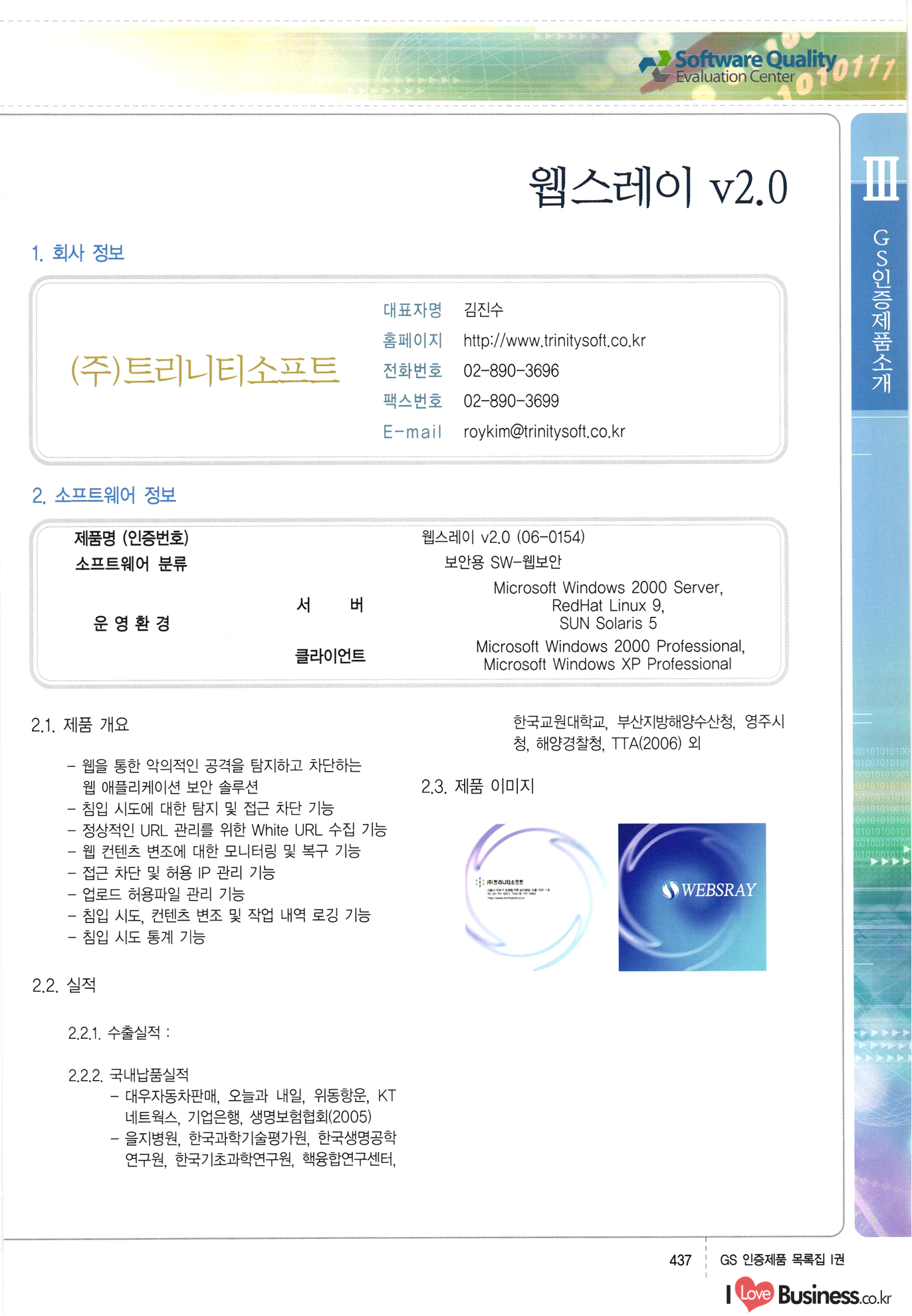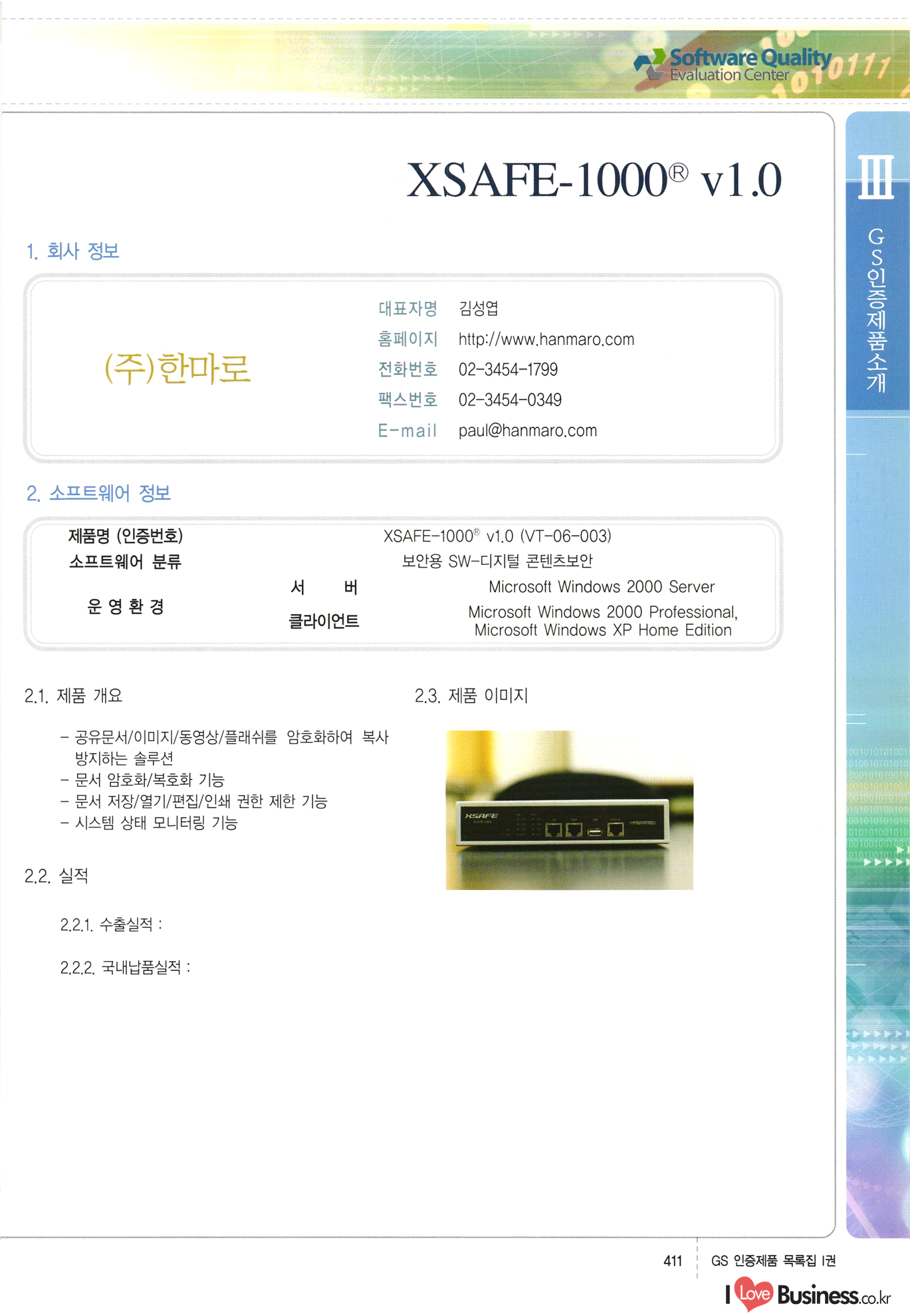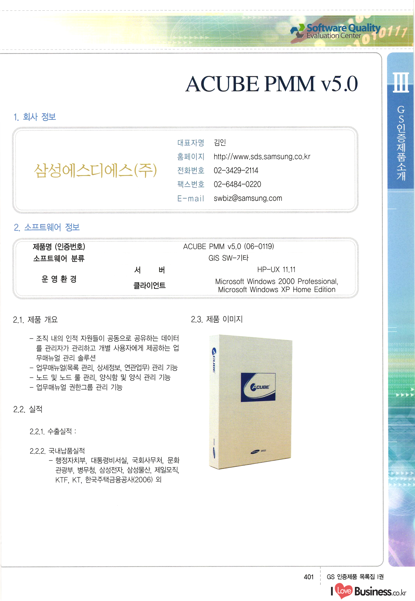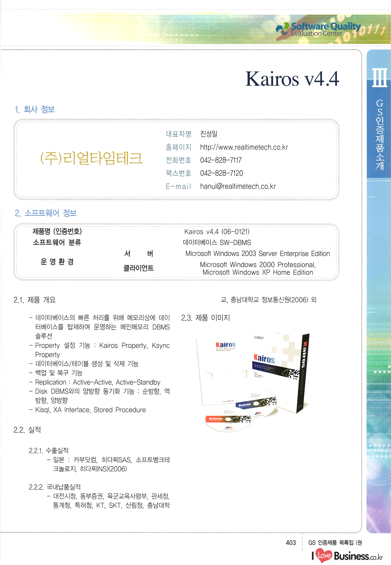 | III. GS 인증제품 목록 | 권-페이지번호 | 권-페이지번호 VT : VeriTest 국제 인증 GS인증제품목록 회사명 삼성에스디에스(주) 제품. EasyBase v4.1 페이지 50 1 제이엔에스 3DM Survey System v1.0 2 | 51 1 (주)싸이웍스 (주)테크다임 (주)다보넷 (주)로지스인포 CyberWALL 2000 v2.16 Jword v1.5 Touchsign v 2.1 키퍼엣홈 v1.0 78 52 (주)미래에듀테크 아이버스 v1.0 53 54 55 56 57 번호 | 인증번호 | 인증일자 01-0001 | 2001.07.25 101-0002 2001.10.22 (02-0027) | 01-0003 | 2001.11.27 | 01-0004 | 2001.11.27 | 01-0005 2001.11.27 5 | 01-0006 | 2001.12.27 02-0001 (02-0029) 2002.01.29 16 | | 02-0002 1 | 2002.02.16 | 02-0003 | 2002.02.16 02-0004 2002.02.27 9 | 02-0005 | 2002.02.27 110 | | 02-0006 | 2002.03.27 11 | || 02-0007 | 2002.03.27 | 02-0008 | 2002.04.30 | 02-0009 | 2002.04.30 | 02-0010 | 2002.04.30 15. | 02-0011 | 2002.04.30 16 102-0012 | 2002.04.30 | 17 | 02-0013 | 2002.05.30 | 18 | 02-0014 | 2002.05.30 | 02-0015 2002.06.28 | 20 | 02-0016 | 2002.06.28 02-0017 1 2002.06.28 | 02-0018 1 | 2002.06.28 23 | 02-0019 | 2002.06.28 24 02-0020 | 2002.07.31 25 | 02-0021 | 2002.07.31 224 58 14 59 118 (주)마크애니 (주)핸디소프트 (주)슈퍼테크놀러지 (주)스펙트라 이래정보시스템(주) (주)컴리빙아이티 | (주)시큐브 (주)케이게이트 (주)소프트4소프트 스페이스인터네셔널(주) (주)컴리빙아이티 (주)그린벨시스템즈 닉스테크(주) 심플소프트 (주)한국데이타비즈네스 (주)테크다임 (주)수세리눅스코리아 (주)한컴리눅스 소프트온넷(주) 와우리눅스(주) 60 61 Document Safer v1.0 | BizFlow Groupware v3.21 | Eg columbus || v1.0 | | eNomix v1.0 Blue Eyes v3.0 i-Class Five v1.05 Secuve TOS WG v1.0 위즈웹3 v3.0 RESORT v1.01 CD Tower v2.0 i-Class One2one v1.05 MANTIS-Professional v1.0 | | SAFEpc v1.5 Simple Gallery v1.00 통합카드발급프로그램 v1.0 Techdigm JCalc v2.0 Suse Linux 7.1K Professional Hancom Linux OS 2.2 Professional | Z!Stream v2.0 와우리눅스 7.1 파란 Secuve TOS WG Agent (Secuve Tos WG Manager) | SMERP v1.1 상하수도범용/ZEUS v1.0 U-Solver v1.0 dDIMS v3.0 DAL v2.5 101010101 1000 101003010101 190 1001010101 21 78. 122 | UL 63 64 65 26 | VT-02-001 | 2002.08.29 (주)시큐브 224 27 1 66 67 | 28 29 130 | 02-0022 | 2002.08.30 | 02-0023 | 2002.10.31 | 02-0024 | 2002.10.31 | 02-0025 | 2002.11.27 | 02-0026 | 2002.11.27 02-0027 (01-0002) 2002.11.27 | 02-0028 (03-0021) 2002.12.09 | 대한상공회의소 한국통신데이타(주) (주)지노시스템 유니온정보시스템(주) (주) 스 68 69 | 70 311 제이엔에스 소프트(구 제이엔에스) 3DM Survey System v1.0 (주)한국지능형정보시스템 한국관(상하수도 범용/TGW) v1.00 92 GS 인증제품 목록집 1권 | 26 I Love Business.co.kr Software Quality, 111 Evaluation Center | 권-페이지번호 II권페이지번호 VT : VeriTest 국제 인증 페이지 회사명 (주)포스데이타 제품 | iSign v2.0 | GS인증제품목록 171 | 34 | 02-0029 (주)제이슨테크(구 미래에듀테크) 아이버스 v1.0 91 72 73. 74 (주)인텔리젼스웨어 (주)하나디에스디 (주)연성정보기술 (주)포스정보 (주)켈코인 (주)포스데이타 스페이스인터내셔널 연희정보통신(주) (주)뉴테크웨이브 c-napse(GSS) v1.0 Life EduBuilder v1.0 | Email+ v3.0 1 책꽃이KDC v3.1 Challenger Webzine Webschool v3.0 1 Biz Binder v1.0 CD-Tower v3.1 상하수도 범용/UFCom v1.0 | | VirusChaser v5.0 | 175 76 118. (주)웨어벨리 Orange for ORACLE v2.2 | 번호 | 인증번호 | 인증일자 | 33 |VT-02-0022002.12.12 | | 2002.12.24 (02-0001) 35 | VT-02-003 | 2002.12.30 | 36 | 03-0001 | 2003.02.28 37. 03-0002 | 2003.02.28 | 38 | 03-0003 | 2003.02.28 | 39 | 03-0004 | 2003.02.28 40 | VT-03-001 | 2003.03.10 41 | VT-03-002) 2003.03.10 1 42 | 03-0005 | 2003.04.07 43 | 03-0006 | 2003.04.07 03-0007 2003.04.30 (03-0026) | 03-0008 | 2003.04.30 45 | 03-0009 | 2003.04.30 | 03-0010 | 2003.04.30 | 47 | 03-0011 | 2003.04.30 | 48 VT-03-003 2003.05.26 49 | 03-0012 | 2003.06.05 | 50 | 03-0013 | 2003.06.05 | 51 | 03-0014 | 2003.06.05 | 52 | 03-0015 | 2003.07.10 | 53 | 03-0016 | 2003.07.10 | 54 | 03-0017 | 2003.07.10 | | 55 | 03-0018 | 2003.07.10 | 56 | 03-0019 | 2003.08.06 57 | | 03-0020 | 2003.08.06 44 1 18 46 80 81 82 83 | (주)테크다임 (주)엔지스테크널러지 삼성에스디에스(주) 삼성에스디에스(주) (주)미디어랜드 인터컴소프트웨어(주) 에스케이씨앤씨(주) 아이티로직스(주) (주)에이씨티소프트 (주)위즈북 (주)에스오엔코리아 (주)아리수미디어 한진정보통신(주) (주)인텔리전스웨어 (주)웨어밸리 (구 (주)오알솔루션즈코리아) Techdigm Office v2.0 | G-Solution Waterworks/Sewerage v1.0 | | 79 UniCITY Standard v1.0 UniCITY Enterprise v1.0 TCO!stream 2002 v4.0 | ServerGuard v3.0 | SK-UPEX v1.0 84 NexWeb v1.2 e-Library Deluxe v4.1.5 86 DL Pro v1.0 SiR v1.01 파워CD뱅크 v4.0 89 InfoMatrix v1.00 190 Bizpus v1.0 91 85 87 88 10010010101.03 1101010100101 1100100100107 58 |VT-03-004 2003.08.12 Orange for ORACLE v2.2 | 111 59 (주)티지더블유 (구 한국지능형정보시스템) 한국관(상하수도 범용/TGW) v1.0 92 93 GIS Free v1.0 DeskPlus v2.0 1 | 94 ArcCITY v1.0 110 03-0021 (02-0028) | 2003.09.04 | 60 | 03-0022 | 2003.09.30 03-0023 | 2003.09.30 03-0024 (04-0011) | 2003.09.30 | 03-0025 | 2003.09.30 03-0026 (03-0007) | 2003.10.07 63 | 03-0027 | 2003.11.12 64 | 03-0028 | 2003.11.12 622 세광정보시스템(주) 제오스페이스(주) (주)선도소프트 (구 (주)캐드랜드) 중앙항업(주) (주)웨어밸리 (구 (주)오알솔루션즈코리아) (주)우암닷컴 (주)오투라인 geoCUBE상하수도 v1.0 95 Orange for ORACLE V2.2 111 96 RAVCOMS Eyecon v4.0 오투스쿨 v2.01 97 GS 인증제품 목록집 1권 I Love Business.co.kr | 권-페이지번호 | 권 - 페이지번호 VT : VeriTest 국제 인증 번호 페이지 회사명 소프트캠프
