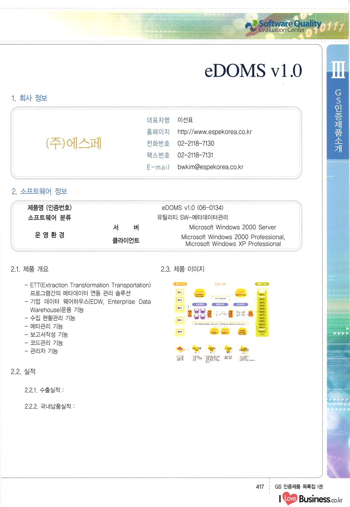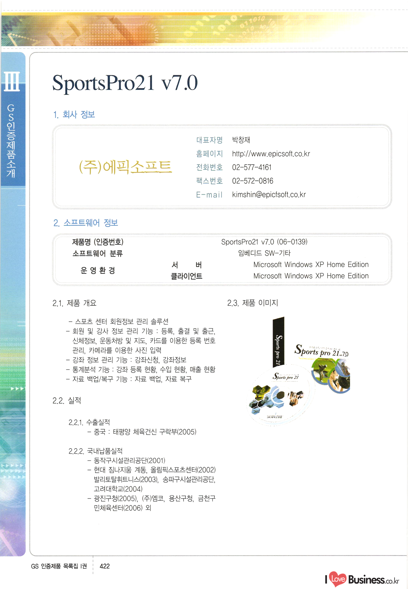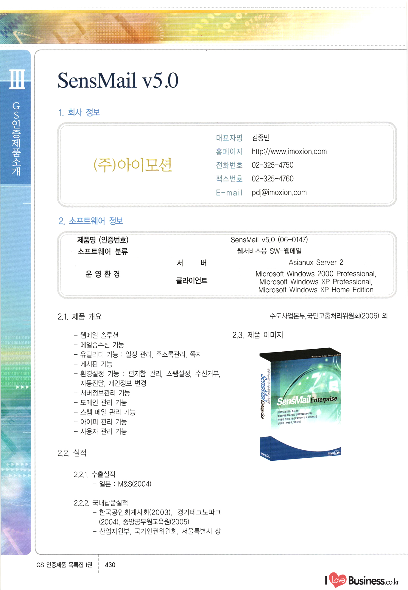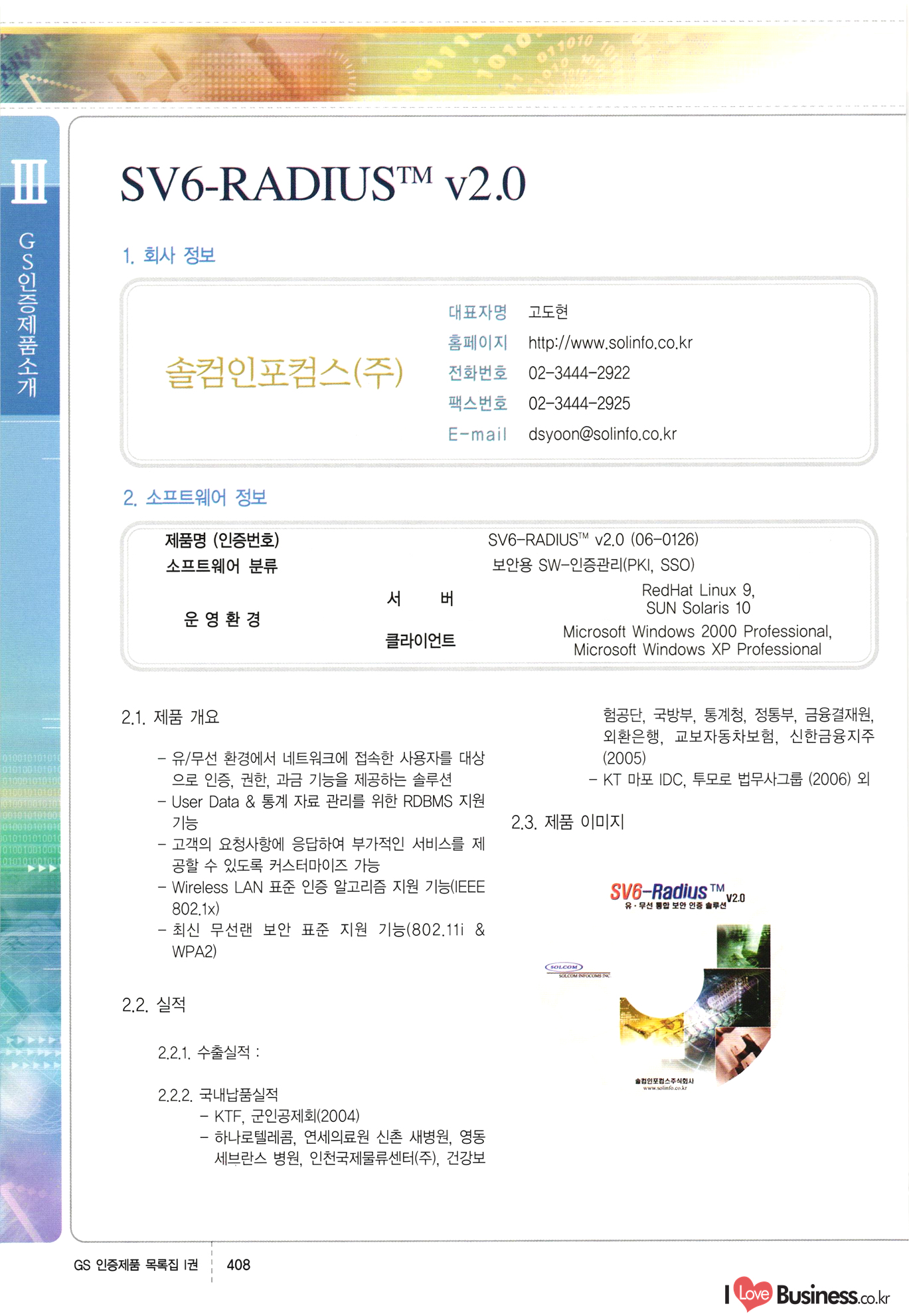 | III. GS 인증제품 목록 | 권-페이지번호 | 권-페이지번호 VT : VeriTest 국제 인증 GS인증제품목록 회사명 삼성에스디에스(주) 제품. EasyBase v4.1 페이지 50 1 제이엔에스 3DM Survey System v1.0 2 | 51 1 (주)싸이웍스 (주)테크다임 (주)다보넷 (주)로지스인포 CyberWALL 2000 v2.16 Jword v1.5 Touchsign v 2.1 키퍼엣홈 v1.0 78 52 (주)미래에듀테크 아이버스 v1.0 53 54 55 56 57 번호 | 인증번호 | 인증일자 01-0001 | 2001.07.25 101-0002 2001.10.22 (02-0027) | 01-0003 | 2001.11.27 | 01-0004 | 2001.11.27 | 01-0005 2001.11.27 5 | 01-0006 | 2001.12.27 02-0001 (02-0029) 2002.01.29 16 | | 02-0002 1 | 2002.02.16 | 02-0003 | 2002.02.16 02-0004 2002.02.27 9 | 02-0005 | 2002.02.27 110 | | 02-0006 | 2002.03.27 11 | || 02-0007 | 2002.03.27 | 02-0008 | 2002.04.30 | 02-0009 | 2002.04.30 | 02-0010 | 2002.04.30 15. | 02-0011 | 2002.04.30 16 102-0012 | 2002.04.30 | 17 | 02-0013 | 2002.05.30 | 18 | 02-0014 | 2002.05.30 | 02-0015 2002.06.28 | 20 | 02-0016 | 2002.06.28 02-0017 1 2002.06.28 | 02-0018 1 | 2002.06.28 23 | 02-0019 | 2002.06.28 24 02-0020 | 2002.07.31 25 | 02-0021 | 2002.07.31 224 58 14 59 118 (주)마크애니 (주)핸디소프트 (주)슈퍼테크놀러지 (주)스펙트라 이래정보시스템(주) (주)컴리빙아이티 | (주)시큐브 (주)케이게이트 (주)소프트4소프트 스페이스인터네셔널(주) (주)컴리빙아이티 (주)그린벨시스템즈 닉스테크(주) 심플소프트 (주)한국데이타비즈네스 (주)테크다임 (주)수세리눅스코리아 (주)한컴리눅스 소프트온넷(주) 와우리눅스(주) 60 61 Document Safer v1.0 | BizFlow Groupware v3.21 | Eg columbus || v1.0 | | eNomix v1.0 Blue Eyes v3.0 i-Class Five v1.05 Secuve TOS WG v1.0 위즈웹3 v3.0 RESORT v1.01 CD Tower v2.0 i-Class One2one v1.05 MANTIS-Professional v1.0 | | SAFEpc v1.5 Simple Gallery v1.00 통합카드발급프로그램 v1.0 Techdigm JCalc v2.0 Suse Linux 7.1K Professional Hancom Linux OS 2.2 Professional | Z!Stream v2.0 와우리눅스 7.1 파란 Secuve TOS WG Agent (Secuve Tos WG Manager) | SMERP v1.1 상하수도범용/ZEUS v1.0 U-Solver v1.0 dDIMS v3.0 DAL v2.5 101010101 1000 101003010101 190 1001010101 21 78. 122 | UL 63 64 65 26 | VT-02-001 | 2002.08.29 (주)시큐브 224 27 1 66 67 | 28 29 130 | 02-0022 | 2002.08.30 | 02-0023 | 2002.10.31 | 02-0024 | 2002.10.31 | 02-0025 | 2002.11.27 | 02-0026 | 2002.11.27 02-0027 (01-0002) 2002.11.27 | 02-0028 (03-0021) 2002.12.09 | 대한상공회의소 한국통신데이타(주) (주)지노시스템 유니온정보시스템(주) (주) 스 68 69 | 70 311 제이엔에스 소프트(구 제이엔에스) 3DM Survey System v1.0 (주)한국지능형정보시스템 한국관(상하수도 범용/TGW) v1.00 92 GS 인증제품 목록집 1권 | 26 I Love Business.co.kr Software Quality, 111 Evaluation Center | 권-페이지번호 II권페이지번호 VT : VeriTest 국제 인증 페이지 회사명 (주)포스데이타 제품 | iSign v2.0 | GS인증제품목록 171 | 34 | 02-0029 (주)제이슨테크(구 미래에듀테크) 아이버스 v1.0 91 72 73. 74 (주)인텔리젼스웨어 (주)하나디에스디 (주)연성정보기술 (주)포스정보 (주)켈코인 (주)포스데이타 스페이스인터내셔널 연희정보통신(주) (주)뉴테크웨이브 c-napse(GSS) v1.0 Life EduBuilder v1.0 | Email+ v3.0 1 책꽃이KDC v3.1 Challenger Webzine Webschool v3.0 1 Biz Binder v1.0 CD-Tower v3.1 상하수도 범용/UFCom v1.0 | | VirusChaser v5.0 | 175 76 118. (주)웨어벨리 Orange for ORACLE v2.2 | 번호 | 인증번호 | 인증일자 | 33 |VT-02-0022002.12.12 | | 2002.12.24 (02-0001) 35 | VT-02-003 | 2002.12.30 | 36 | 03-0001 | 2003.02.28 37. 03-0002 | 2003.02.28 | 38 | 03-0003 | 2003.02.28 | 39 | 03-0004 | 2003.02.28 40 | VT-03-001 | 2003.03.10 41 | VT-03-002) 2003.03.10 1 42 | 03-0005 | 2003.04.07 43 | 03-0006 | 2003.04.07 03-0007 2003.04.30 (03-0026) | 03-0008 | 2003.04.30 45 | 03-0009 | 2003.04.30 | 03-0010 | 2003.04.30 | 47 | 03-0011 | 2003.04.30 | 48 VT-03-003 2003.05.26 49 | 03-0012 | 2003.06.05 | 50 | 03-0013 | 2003.06.05 | 51 | 03-0014 | 2003.06.05 | 52 | 03-0015 | 2003.07.10 | 53 | 03-0016 | 2003.07.10 | 54 | 03-0017 | 2003.07.10 | | 55 | 03-0018 | 2003.07.10 | 56 | 03-0019 | 2003.08.06 57 | | 03-0020 | 2003.08.06 44 1 18 46 80 81 82 83 | (주)테크다임 (주)엔지스테크널러지 삼성에스디에스(주) 삼성에스디에스(주) (주)미디어랜드 인터컴소프트웨어(주) 에스케이씨앤씨(주) 아이티로직스(주) (주)에이씨티소프트 (주)위즈북 (주)에스오엔코리아 (주)아리수미디어 한진정보통신(주) (주)인텔리전스웨어 (주)웨어밸리 (구 (주)오알솔루션즈코리아) Techdigm Office v2.0 | G-Solution Waterworks/Sewerage v1.0 | | 79 UniCITY Standard v1.0 UniCITY Enterprise v1.0 TCO!stream 2002 v4.0 | ServerGuard v3.0 | SK-UPEX v1.0 84 NexWeb v1.2 e-Library Deluxe v4.1.5 86 DL Pro v1.0 SiR v1.01 파워CD뱅크 v4.0 89 InfoMatrix v1.00 190 Bizpus v1.0 91 85 87 88 10010010101.03 1101010100101 1100100100107 58 |VT-03-004 2003.08.12 Orange for ORACLE v2.2 | 111 59 (주)티지더블유 (구 한국지능형정보시스템) 한국관(상하수도 범용/TGW) v1.0 92 93 GIS Free v1.0 DeskPlus v2.0 1 | 94 ArcCITY v1.0 110 03-0021 (02-0028) | 2003.09.04 | 60 | 03-0022 | 2003.09.30 03-0023 | 2003.09.30 03-0024 (04-0011) | 2003.09.30 | 03-0025 | 2003.09.30 03-0026 (03-0007) | 2003.10.07 63 | 03-0027 | 2003.11.12 64 | 03-0028 | 2003.11.12 622 세광정보시스템(주) 제오스페이스(주) (주)선도소프트 (구 (주)캐드랜드) 중앙항업(주) (주)웨어밸리 (구 (주)오알솔루션즈코리아) (주)우암닷컴 (주)오투라인 geoCUBE상하수도 v1.0 95 Orange for ORACLE V2.2 111 96 RAVCOMS Eyecon v4.0 오투스쿨 v2.01 97 GS 인증제품 목록집 1권 I Love Business.co.kr | 권-페이지번호 | 권 - 페이지번호 VT : VeriTest 국제 인증 번호 페이지 회사명 소프트캠프