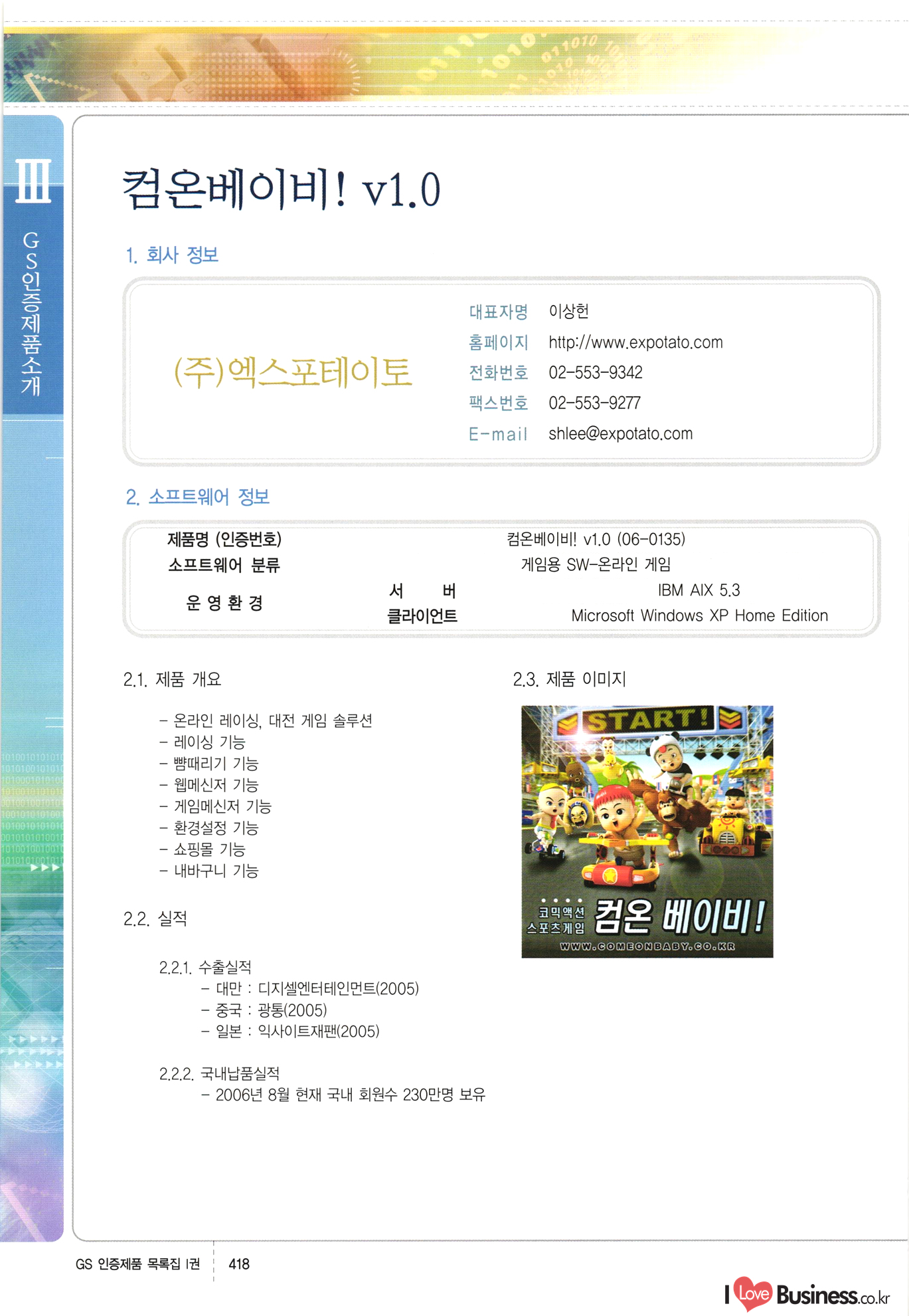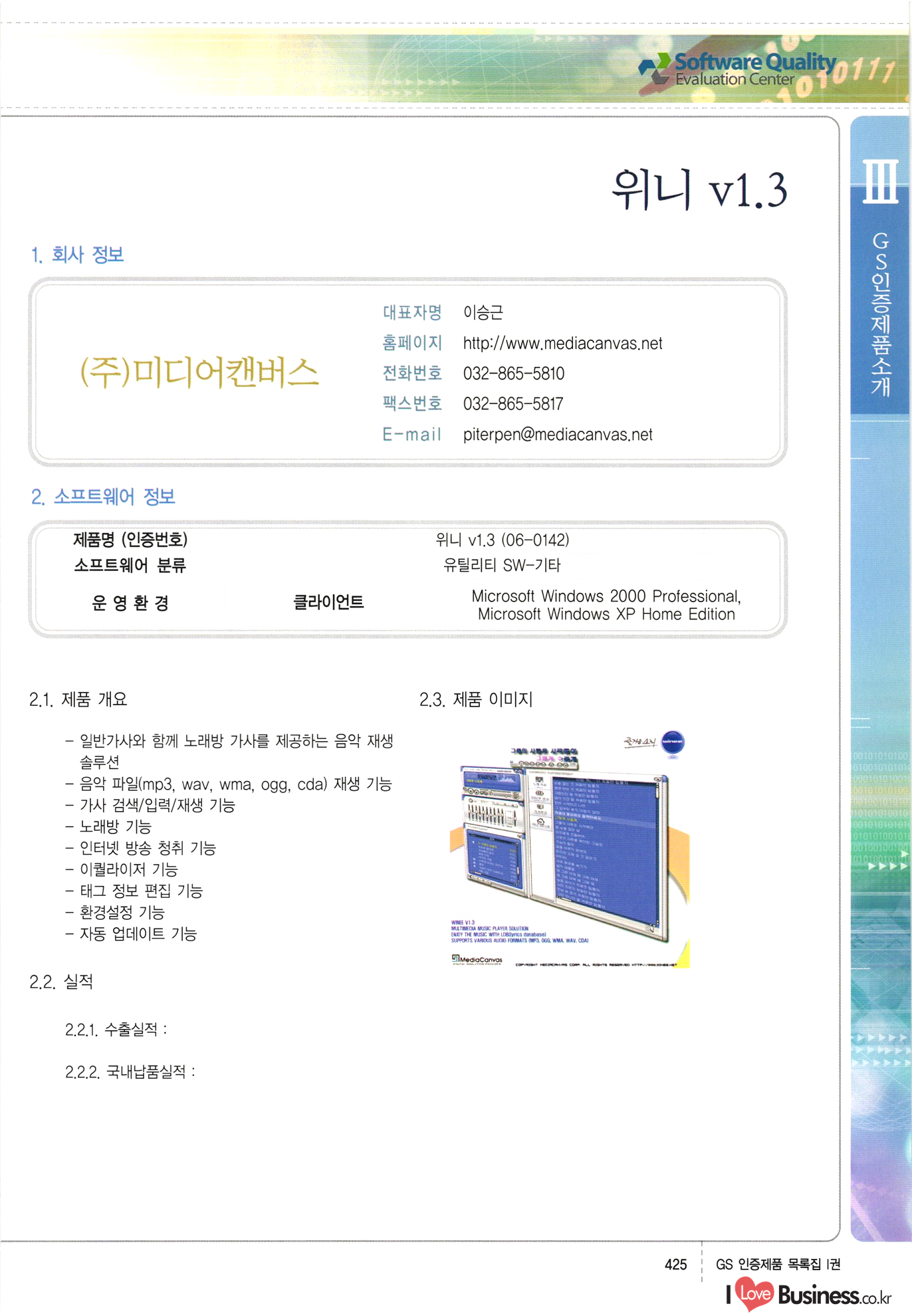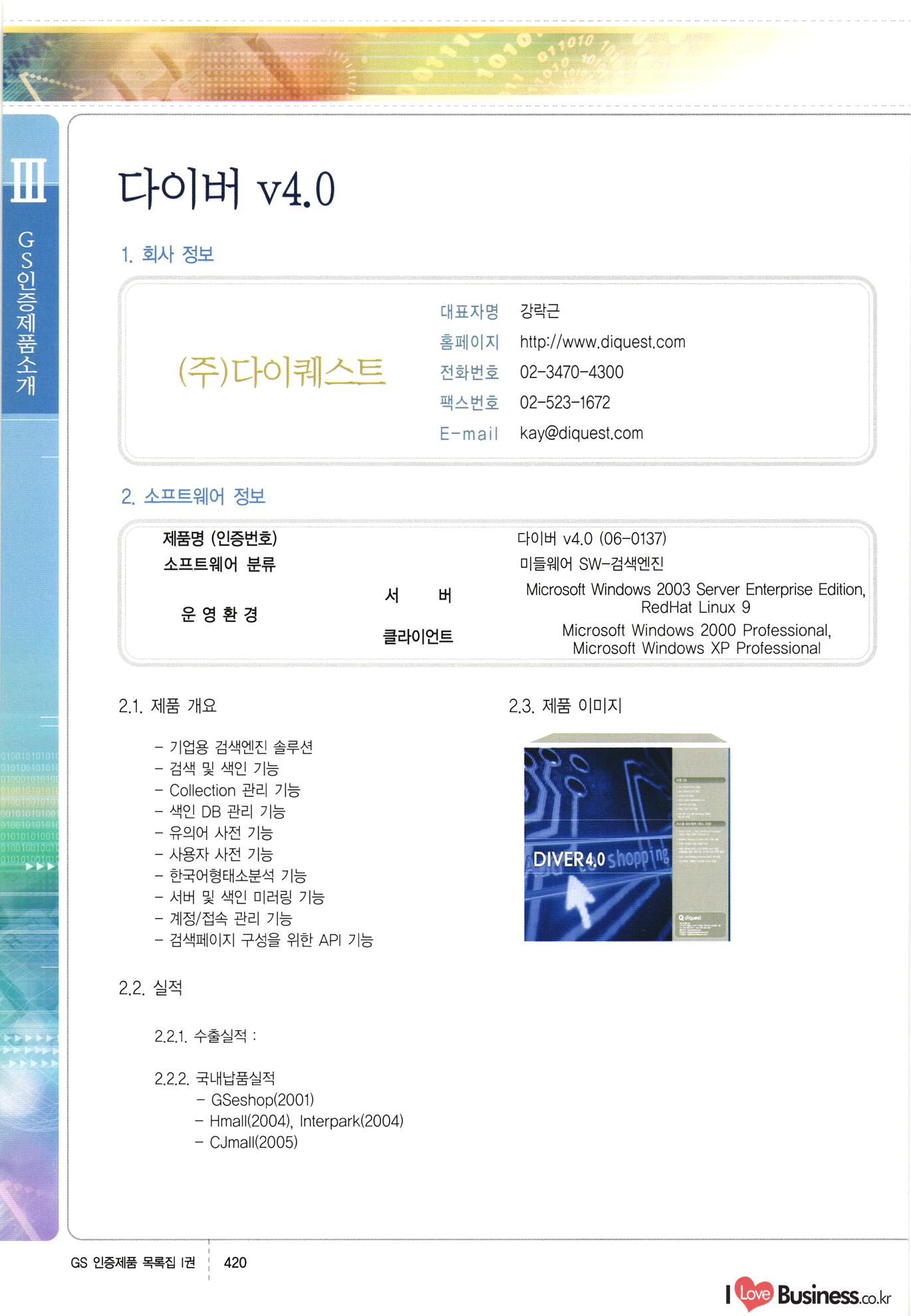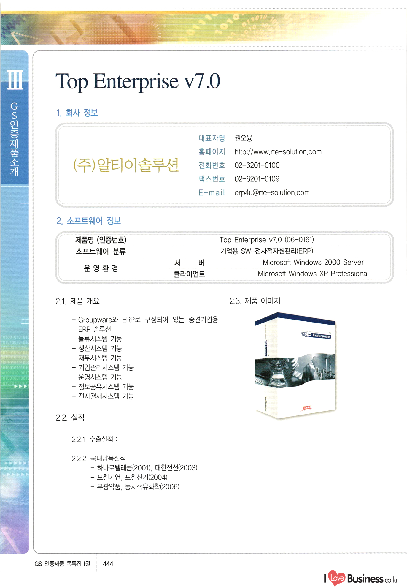 | III. GS 인증제품 목록 | 권-페이지번호 | 권-페이지번호 VT : VeriTest 국제 인증 GS인증제품목록 회사명 삼성에스디에스(주) 제품. EasyBase v4.1 페이지 50 1 제이엔에스 3DM Survey System v1.0 2 | 51 1 (주)싸이웍스 (주)테크다임 (주)다보넷 (주)로지스인포 CyberWALL 2000 v2.16 Jword v1.5 Touchsign v 2.1 키퍼엣홈 v1.0 78 52 (주)미래에듀테크 아이버스 v1.0 53 54 55 56 57 번호 | 인증번호 | 인증일자 01-0001 | 2001.07.25 101-0002 2001.10.22 (02-0027) | 01-0003 | 2001.11.27 | 01-0004 | 2001.11.27 | 01-0005 2001.11.27 5 | 01-0006 | 2001.12.27 02-0001 (02-0029) 2002.01.29 16 | | 02-0002 1 | 2002.02.16 | 02-0003 | 2002.02.16 02-0004 2002.02.27 9 | 02-0005 | 2002.02.27 110 | | 02-0006 | 2002.03.27 11 | || 02-0007 | 2002.03.27 | 02-0008 | 2002.04.30 | 02-0009 | 2002.04.30 | 02-0010 | 2002.04.30 15. | 02-0011 | 2002.04.30 16 102-0012 | 2002.04.30 | 17 | 02-0013 | 2002.05.30 | 18 | 02-0014 | 2002.05.30 | 02-0015 2002.06.28 | 20 | 02-0016 | 2002.06.28 02-0017 1 2002.06.28 | 02-0018 1 | 2002.06.28 23 | 02-0019 | 2002.06.28 24 02-0020 | 2002.07.31 25 | 02-0021 | 2002.07.31 224 58 14 59 118 (주)마크애니 (주)핸디소프트 (주)슈퍼테크놀러지 (주)스펙트라 이래정보시스템(주) (주)컴리빙아이티 | (주)시큐브 (주)케이게이트 (주)소프트4소프트 스페이스인터네셔널(주) (주)컴리빙아이티 (주)그린벨시스템즈 닉스테크(주) 심플소프트 (주)한국데이타비즈네스 (주)테크다임 (주)수세리눅스코리아 (주)한컴리눅스 소프트온넷(주) 와우리눅스(주) 60 61 Document Safer v1.0 | BizFlow Groupware v3.21 | Eg columbus || v1.0 | | eNomix v1.0 Blue Eyes v3.0 i-Class Five v1.05 Secuve TOS WG v1.0 위즈웹3 v3.0 RESORT v1.01 CD Tower v2.0 i-Class One2one v1.05 MANTIS-Professional v1.0 | | SAFEpc v1.5 Simple Gallery v1.00 통합카드발급프로그램 v1.0 Techdigm JCalc v2.0 Suse Linux 7.1K Professional Hancom Linux OS 2.2 Professional | Z!Stream v2.0 와우리눅스 7.1 파란 Secuve TOS WG Agent (Secuve Tos WG Manager) | SMERP v1.1 상하수도범용/ZEUS v1.0 U-Solver v1.0 dDIMS v3.0 DAL v2.5 101010101 1000 101003010101 190 1001010101 21 78. 122 | UL 63 64 65 26 | VT-02-001 | 2002.08.29 (주)시큐브 224 27 1 66 67 | 28 29 130 | 02-0022 | 2002.08.30 | 02-0023 | 2002.10.31 | 02-0024 | 2002.10.31 | 02-0025 | 2002.11.27 | 02-0026 | 2002.11.27 02-0027 (01-0002) 2002.11.27 | 02-0028 (03-0021) 2002.12.09 | 대한상공회의소 한국통신데이타(주) (주)지노시스템 유니온정보시스템(주) (주) 스 68 69 | 70 311 제이엔에스 소프트(구 제이엔에스) 3DM Survey System v1.0 (주)한국지능형정보시스템 한국관(상하수도 범용/TGW) v1.00 92 GS 인증제품 목록집 1권 | 26 I Love Business.co.kr Software Quality, 111 Evaluation Center | 권-페이지번호 II권페이지번호 VT : VeriTest 국제 인증 페이지 회사명 (주)포스데이타 제품 | iSign v2.0 | GS인증제품목록 171 | 34 | 02-0029 (주)제이슨테크(구 미래에듀테크) 아이버스 v1.0 91 72 73. 74 (주)인텔리젼스웨어 (주)하나디에스디 (주)연성정보기술 (주)포스정보 (주)켈코인 (주)포스데이타 스페이스인터내셔널 연희정보통신(주) (주)뉴테크웨이브 c-napse(GSS) v1.0 Life EduBuilder v1.0 | Email+ v3.0 1 책꽃이KDC v3.1 Challenger Webzine Webschool v3.0 1 Biz Binder v1.0 CD-Tower v3.1 상하수도 범용/UFCom v1.0 | | VirusChaser v5.0 | 175 76 118. (주)웨어벨리 Orange for ORACLE v2.2 | 번호 | 인증번호 | 인증일자 | 33 |VT-02-0022002.12.12 | | 2002.12.24 (02-0001) 35 | VT-02-003 | 2002.12.30 | 36 | 03-0001 | 2003.02.28 37. 03-0002 | 2003.02.28 | 38 | 03-0003 | 2003.02.28 | 39 | 03-0004 | 2003.02.28 40 | VT-03-001 | 2003.03.10 41 | VT-03-002) 2003.03.10 1 42 | 03-0005 | 2003.04.07 43 | 03-0006 | 2003.04.07 03-0007 2003.04.30 (03-0026) | 03-0008 | 2003.04.30 45 | 03-0009 | 2003.04.30 | 03-0010 | 2003.04.30 | 47 | 03-0011 | 2003.04.30 | 48 VT-03-003 2003.05.26 49 | 03-0012 | 2003.06.05 | 50 | 03-0013 | 2003.06.05 | 51 | 03-0014 | 2003.06.05 | 52 | 03-0015 | 2003.07.10 | 53 | 03-0016 | 2003.07.10 | 54 | 03-0017 | 2003.07.10 | | 55 | 03-0018 | 2003.07.10 | 56 | 03-0019 | 2003.08.06 57 | | 03-0020 | 2003.08.06 44 1 18 46 80 81 82 83 | (주)테크다임 (주)엔지스테크널러지 삼성에스디에스(주) 삼성에스디에스(주) (주)미디어랜드 인터컴소프트웨어(주) 에스케이씨앤씨(주) 아이티로직스(주) (주)에이씨티소프트 (주)위즈북 (주)에스오엔코리아 (주)아리수미디어 한진정보통신(주) (주)인텔리전스웨어 (주)웨어밸리 (구 (주)오알솔루션즈코리아) Techdigm Office v2.0 | G-Solution Waterworks/Sewerage v1.0 | | 79 UniCITY Standard v1.0 UniCITY Enterprise v1.0 TCO!stream 2002 v4.0 | ServerGuard v3.0 | SK-UPEX v1.0 84 NexWeb v1.2 e-Library Deluxe v4.1.5 86 DL Pro v1.0 SiR v1.01 파워CD뱅크 v4.0 89 InfoMatrix v1.00 190 Bizpus v1.0 91 85 87 88 10010010101.03 1101010100101 1100100100107 58 |VT-03-004 2003.08.12 Orange for ORACLE v2.2 | 111 59 (주)티지더블유 (구 한국지능형정보시스템) 한국관(상하수도 범용/TGW) v1.0 92 93 GIS Free v1.0 DeskPlus v2.0 1 | 94 ArcCITY v1.0 110 03-0021 (02-0028) | 2003.09.04 | 60 | 03-0022 | 2003.09.30 03-0023 | 2003.09.30 03-0024 (04-0011) | 2003.09.30 | 03-0025 | 2003.09.30 03-0026 (03-0007) | 2003.10.07 63 | 03-0027 | 2003.11.12 64 | 03-0028 | 2003.11.12 622 세광정보시스템(주) 제오스페이스(주) (주)선도소프트 (구 (주)캐드랜드) 중앙항업(주) (주)웨어밸리 (구 (주)오알솔루션즈코리아) (주)우암닷컴 (주)오투라인 geoCUBE상하수도 v1.0 95 Orange for ORACLE V2.2 111 96 RAVCOMS Eyecon v4.0 오투스쿨 v2.01 97 GS 인증제품 목록집 1권 I Love Business.co.kr | 권-페이지번호 | 권 - 페이지번호 VT : VeriTest 국제 인증 번호 페이지 회사명 소프트캠프