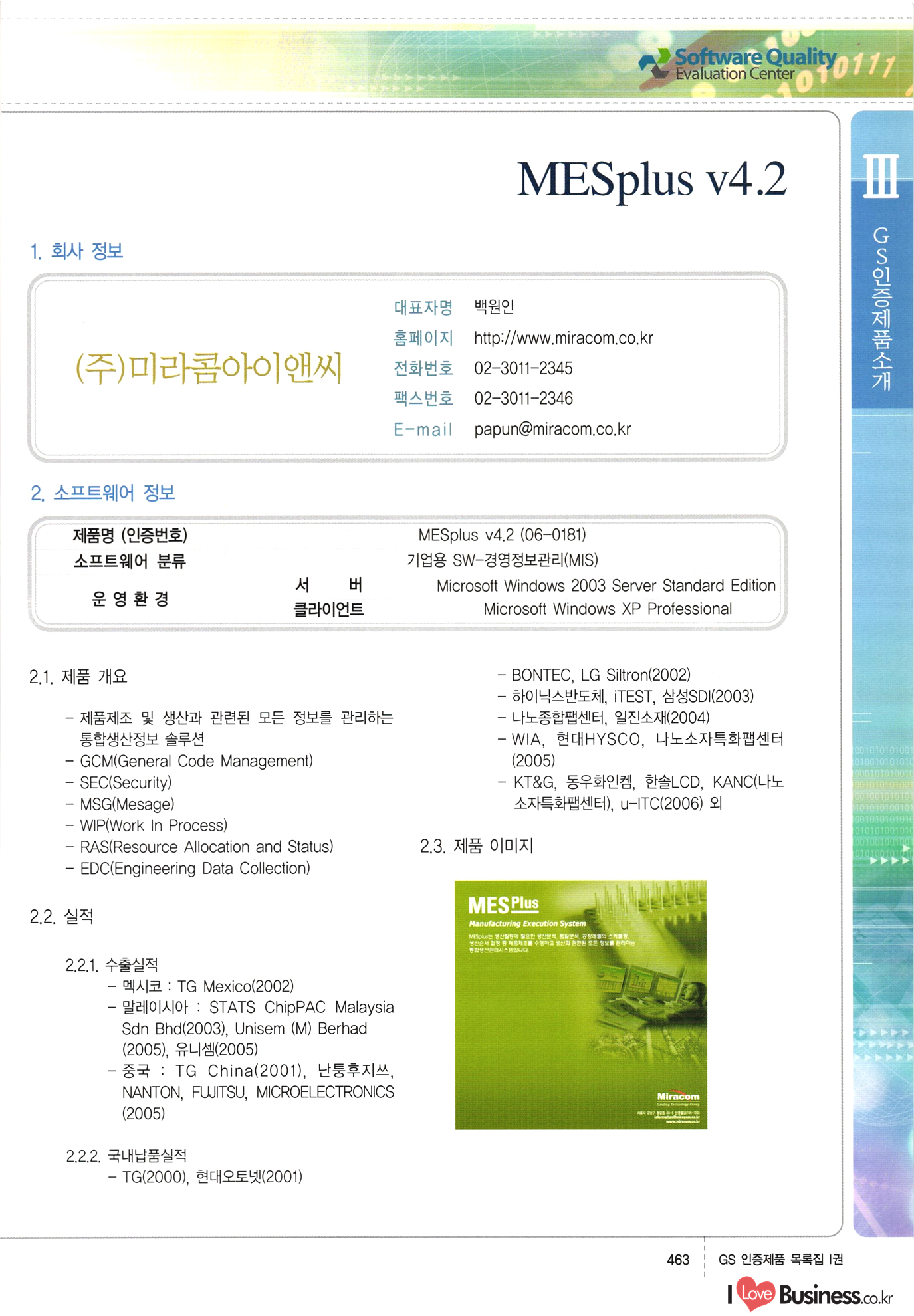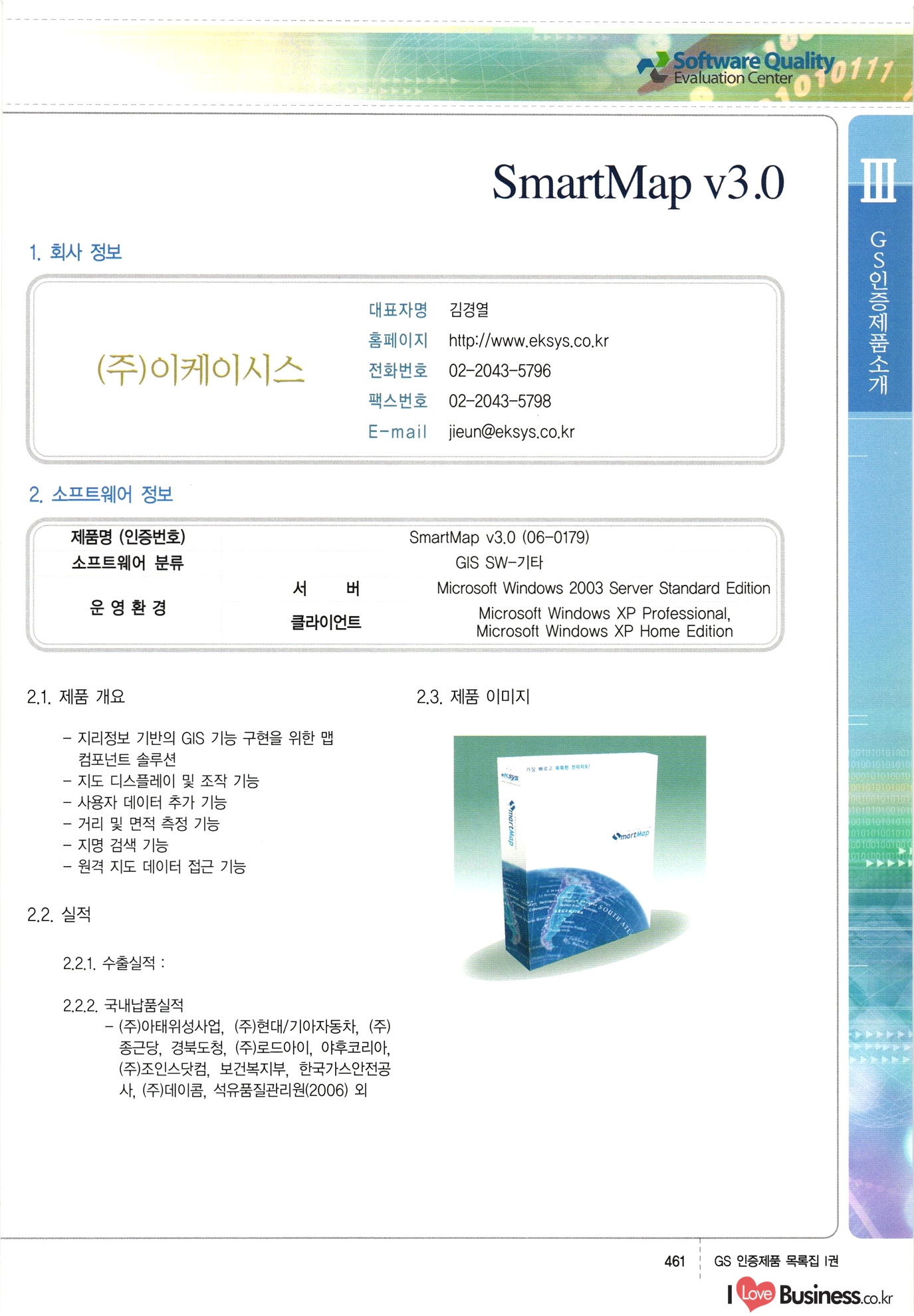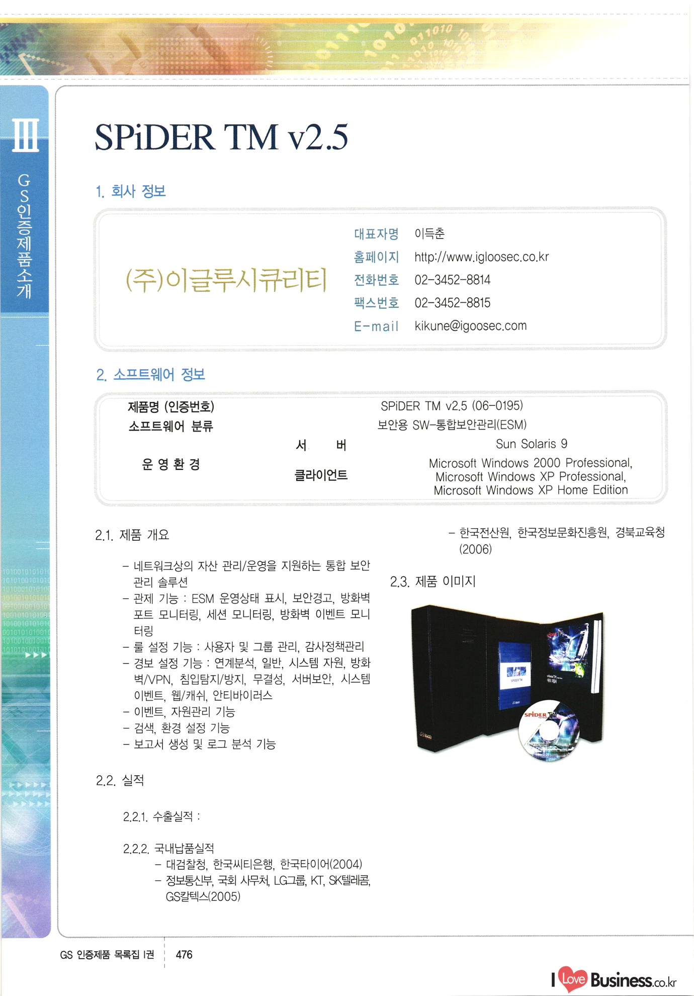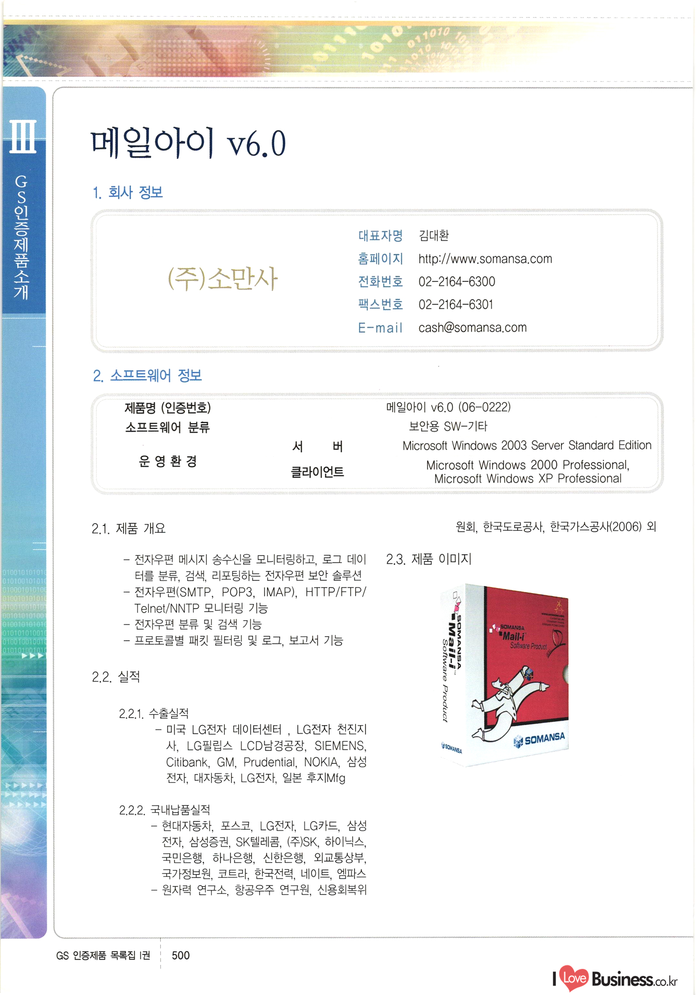 | III. GS 인증제품 목록 | 권-페이지번호 | 권-페이지번호 VT : VeriTest 국제 인증 GS인증제품목록 회사명 삼성에스디에스(주) 제품. EasyBase v4.1 페이지 50 1 제이엔에스 3DM Survey System v1.0 2 | 51 1 (주)싸이웍스 (주)테크다임 (주)다보넷 (주)로지스인포 CyberWALL 2000 v2.16 Jword v1.5 Touchsign v 2.1 키퍼엣홈 v1.0 78 52 (주)미래에듀테크 아이버스 v1.0 53 54 55 56 57 번호 | 인증번호 | 인증일자 01-0001 | 2001.07.25 101-0002 2001.10.22 (02-0027) | 01-0003 | 2001.11.27 | 01-0004 | 2001.11.27 | 01-0005 2001.11.27 5 | 01-0006 | 2001.12.27 02-0001 (02-0029) 2002.01.29 16 | | 02-0002 1 | 2002.02.16 | 02-0003 | 2002.02.16 02-0004 2002.02.27 9 | 02-0005 | 2002.02.27 110 | | 02-0006 | 2002.03.27 11 | || 02-0007 | 2002.03.27 | 02-0008 | 2002.04.30 | 02-0009 | 2002.04.30 | 02-0010 | 2002.04.30 15. | 02-0011 | 2002.04.30 16 102-0012 | 2002.04.30 | 17 | 02-0013 | 2002.05.30 | 18 | 02-0014 | 2002.05.30 | 02-0015 2002.06.28 | 20 | 02-0016 | 2002.06.28 02-0017 1 2002.06.28 | 02-0018 1 | 2002.06.28 23 | 02-0019 | 2002.06.28 24 02-0020 | 2002.07.31 25 | 02-0021 | 2002.07.31 224 58 14 59 118 (주)마크애니 (주)핸디소프트 (주)슈퍼테크놀러지 (주)스펙트라 이래정보시스템(주) (주)컴리빙아이티 | (주)시큐브 (주)케이게이트 (주)소프트4소프트 스페이스인터네셔널(주) (주)컴리빙아이티 (주)그린벨시스템즈 닉스테크(주) 심플소프트 (주)한국데이타비즈네스 (주)테크다임 (주)수세리눅스코리아 (주)한컴리눅스 소프트온넷(주) 와우리눅스(주) 60 61 Document Safer v1.0 | BizFlow Groupware v3.21 | Eg columbus || v1.0 | | eNomix v1.0 Blue Eyes v3.0 i-Class Five v1.05 Secuve TOS WG v1.0 위즈웹3 v3.0 RESORT v1.01 CD Tower v2.0 i-Class One2one v1.05 MANTIS-Professional v1.0 | | SAFEpc v1.5 Simple Gallery v1.00 통합카드발급프로그램 v1.0 Techdigm JCalc v2.0 Suse Linux 7.1K Professional Hancom Linux OS 2.2 Professional | Z!Stream v2.0 와우리눅스 7.1 파란 Secuve TOS WG Agent (Secuve Tos WG Manager) | SMERP v1.1 상하수도범용/ZEUS v1.0 U-Solver v1.0 dDIMS v3.0 DAL v2.5 101010101 1000 101003010101 190 1001010101 21 78. 122 | UL 63 64 65 26 | VT-02-001 | 2002.08.29 (주)시큐브 224 27 1 66 67 | 28 29 130 | 02-0022 | 2002.08.30 | 02-0023 | 2002.10.31 | 02-0024 | 2002.10.31 | 02-0025 | 2002.11.27 | 02-0026 | 2002.11.27 02-0027 (01-0002) 2002.11.27 | 02-0028 (03-0021) 2002.12.09 | 대한상공회의소 한국통신데이타(주) (주)지노시스템 유니온정보시스템(주) (주) 스 68 69 | 70 311 제이엔에스 소프트(구 제이엔에스) 3DM Survey System v1.0 (주)한국지능형정보시스템 한국관(상하수도 범용/TGW) v1.00 92 GS 인증제품 목록집 1권 | 26 I Love Business.co.kr Software Quality, 111 Evaluation Center | 권-페이지번호 II권페이지번호 VT : VeriTest 국제 인증 페이지 회사명 (주)포스데이타 제품 | iSign v2.0 | GS인증제품목록 171 | 34 | 02-0029 (주)제이슨테크(구 미래에듀테크) 아이버스 v1.0 91 72 73. 74 (주)인텔리젼스웨어 (주)하나디에스디 (주)연성정보기술 (주)포스정보 (주)켈코인 (주)포스데이타 스페이스인터내셔널 연희정보통신(주) (주)뉴테크웨이브 c-napse(GSS) v1.0 Life EduBuilder v1.0 | Email+ v3.0 1 책꽃이KDC v3.1 Challenger Webzine Webschool v3.0 1 Biz Binder v1.0 CD-Tower v3.1 상하수도 범용/UFCom v1.0 | | VirusChaser v5.0 | 175 76 118. (주)웨어벨리 Orange for ORACLE v2.2 | 번호 | 인증번호 | 인증일자 | 33 |VT-02-0022002.12.12 | | 2002.12.24 (02-0001) 35 | VT-02-003 | 2002.12.30 | 36 | 03-0001 | 2003.02.28 37. 03-0002 | 2003.02.28 | 38 | 03-0003 | 2003.02.28 | 39 | 03-0004 | 2003.02.28 40 | VT-03-001 | 2003.03.10 41 | VT-03-002) 2003.03.10 1 42 | 03-0005 | 2003.04.07 43 | 03-0006 | 2003.04.07 03-0007 2003.04.30 (03-0026) | 03-0008 | 2003.04.30 45 | 03-0009 | 2003.04.30 | 03-0010 | 2003.04.30 | 47 | 03-0011 | 2003.04.30 | 48 VT-03-003 2003.05.26 49 | 03-0012 | 2003.06.05 | 50 | 03-0013 | 2003.06.05 | 51 | 03-0014 | 2003.06.05 | 52 | 03-0015 | 2003.07.10 | 53 | 03-0016 | 2003.07.10 | 54 | 03-0017 | 2003.07.10 | | 55 | 03-0018 | 2003.07.10 | 56 | 03-0019 | 2003.08.06 57 | | 03-0020 | 2003.08.06 44 1 18 46 80 81 82 83 | (주)테크다임 (주)엔지스테크널러지 삼성에스디에스(주) 삼성에스디에스(주) (주)미디어랜드 인터컴소프트웨어(주) 에스케이씨앤씨(주) 아이티로직스(주) (주)에이씨티소프트 (주)위즈북 (주)에스오엔코리아 (주)아리수미디어 한진정보통신(주) (주)인텔리전스웨어 (주)웨어밸리 (구 (주)오알솔루션즈코리아) Techdigm Office v2.0 | G-Solution Waterworks/Sewerage v1.0 | | 79 UniCITY Standard v1.0 UniCITY Enterprise v1.0 TCO!stream 2002 v4.0 | ServerGuard v3.0 | SK-UPEX v1.0 84 NexWeb v1.2 e-Library Deluxe v4.1.5 86 DL Pro v1.0 SiR v1.01 파워CD뱅크 v4.0 89 InfoMatrix v1.00 190 Bizpus v1.0 91 85 87 88 10010010101.03 1101010100101 1100100100107 58 |VT-03-004 2003.08.12 Orange for ORACLE v2.2 | 111 59 (주)티지더블유 (구 한국지능형정보시스템) 한국관(상하수도 범용/TGW) v1.0 92 93 GIS Free v1.0 DeskPlus v2.0 1 | 94 ArcCITY v1.0 110 03-0021 (02-0028) | 2003.09.04 | 60 | 03-0022 | 2003.09.30 03-0023 | 2003.09.30 03-0024 (04-0011) | 2003.09.30 | 03-0025 | 2003.09.30 03-0026 (03-0007) | 2003.10.07 63 | 03-0027 | 2003.11.12 64 | 03-0028 | 2003.11.12 622 세광정보시스템(주) 제오스페이스(주) (주)선도소프트 (구 (주)캐드랜드) 중앙항업(주) (주)웨어밸리 (구 (주)오알솔루션즈코리아) (주)우암닷컴 (주)오투라인 geoCUBE상하수도 v1.0 95 Orange for ORACLE V2.2 111 96 RAVCOMS Eyecon v4.0 오투스쿨 v2.01 97 GS 인증제품 목록집 1권 I Love Business.co.kr | 권-페이지번호 | 권 - 페이지번호 VT : VeriTest 국제 인증 번호 페이지 회사명 소프트캠프