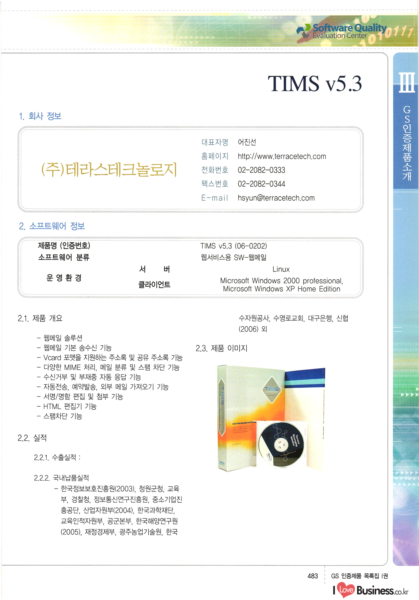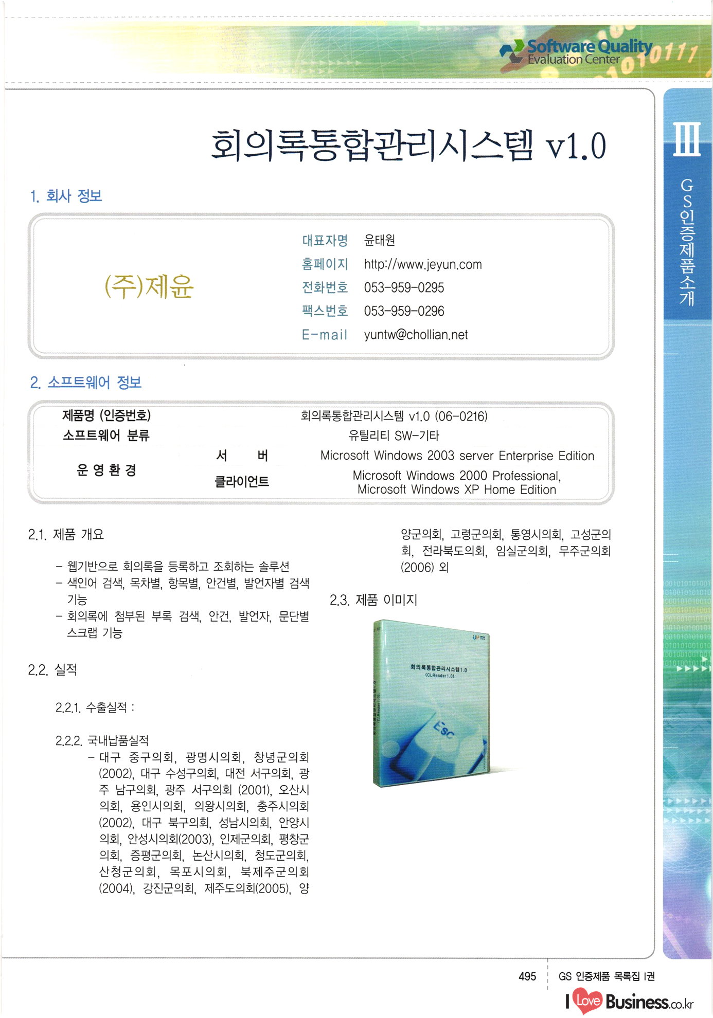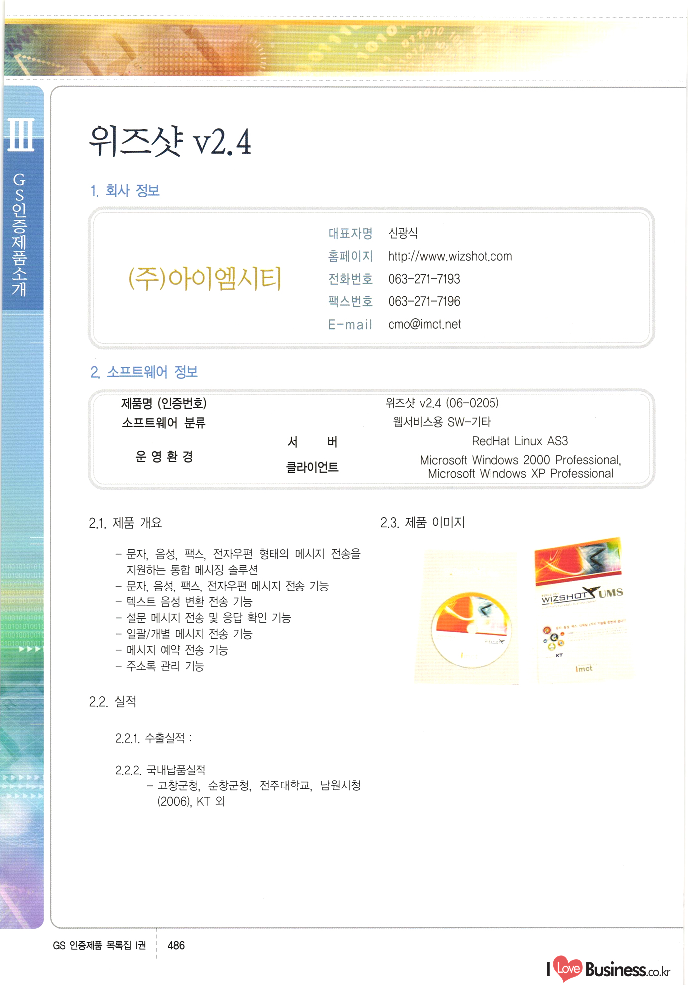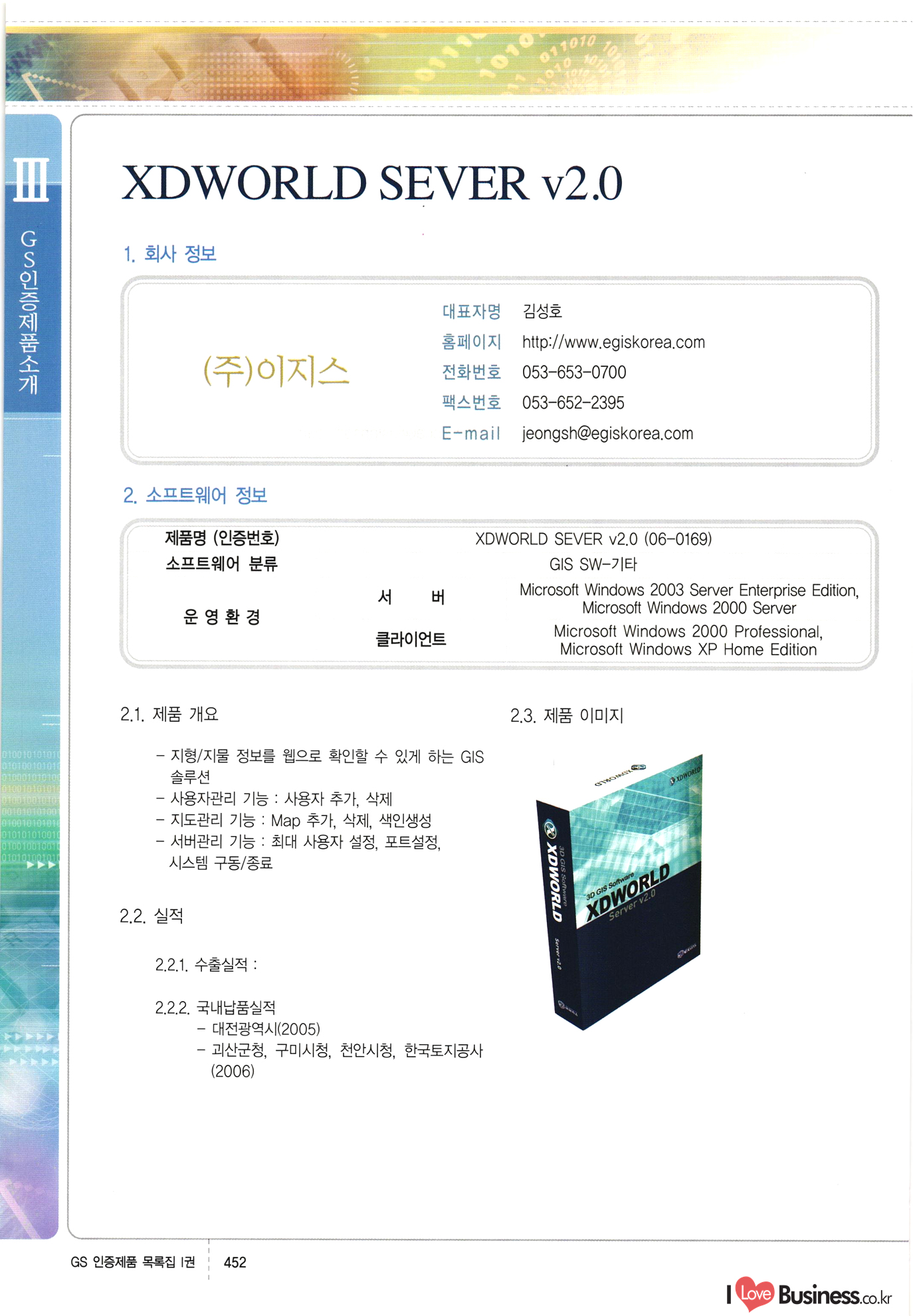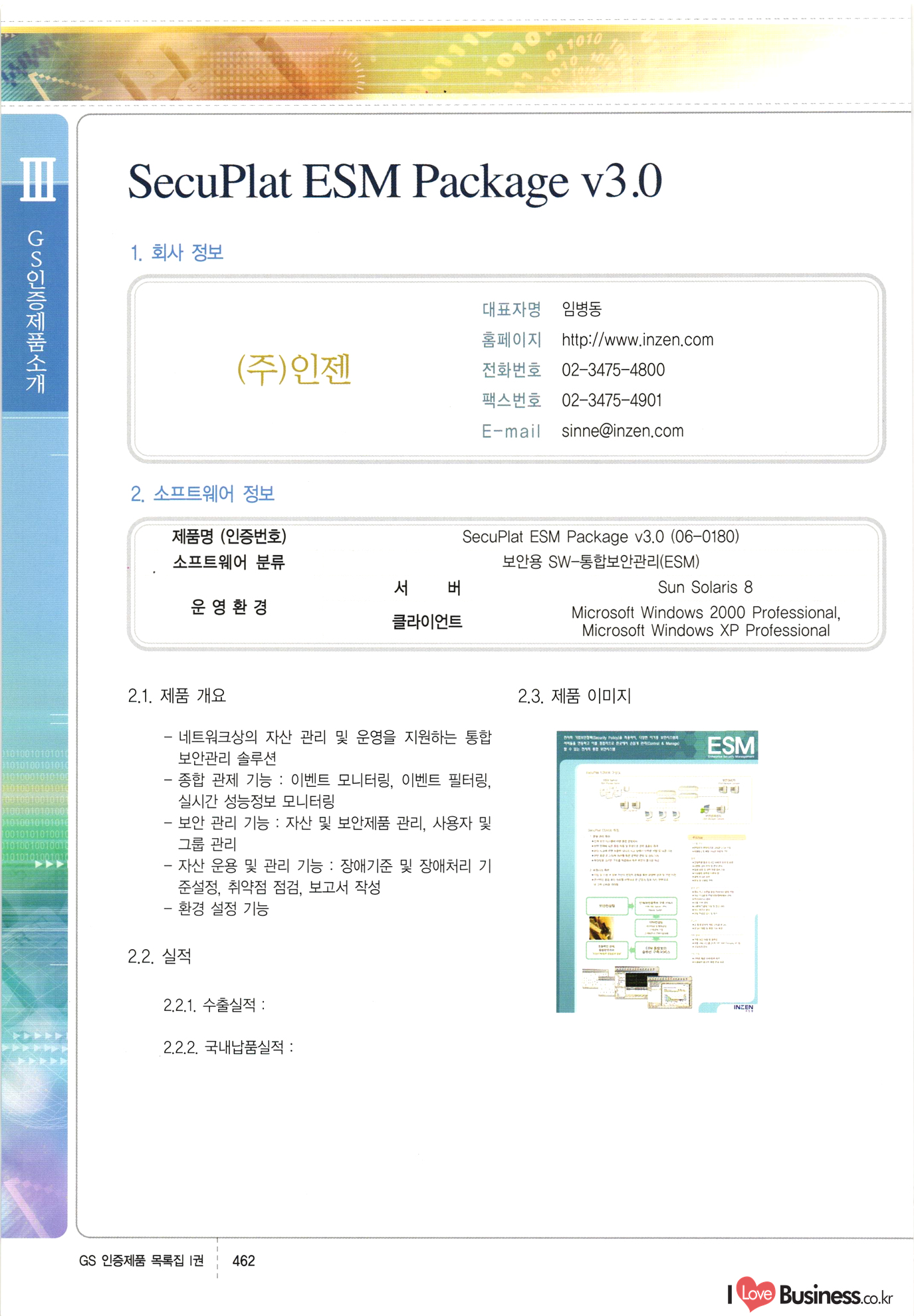 | III. GS 인증제품 목록 | 권-페이지번호 | 권-페이지번호 VT : VeriTest 국제 인증 GS인증제품목록 회사명 삼성에스디에스(주) 제품. EasyBase v4.1 페이지 50 1 제이엔에스 3DM Survey System v1.0 2 | 51 1 (주)싸이웍스 (주)테크다임 (주)다보넷 (주)로지스인포 CyberWALL 2000 v2.16 Jword v1.5 Touchsign v 2.1 키퍼엣홈 v1.0 78 52 (주)미래에듀테크 아이버스 v1.0 53 54 55 56 57 번호 | 인증번호 | 인증일자 01-0001 | 2001.07.25 101-0002 2001.10.22 (02-0027) | 01-0003 | 2001.11.27 | 01-0004 | 2001.11.27 | 01-0005 2001.11.27 5 | 01-0006 | 2001.12.27 02-0001 (02-0029) 2002.01.29 16 | | 02-0002 1 | 2002.02.16 | 02-0003 | 2002.02.16 02-0004 2002.02.27 9 | 02-0005 | 2002.02.27 110 | | 02-0006 | 2002.03.27 11 | || 02-0007 | 2002.03.27 | 02-0008 | 2002.04.30 | 02-0009 | 2002.04.30 | 02-0010 | 2002.04.30 15. | 02-0011 | 2002.04.30 16 102-0012 | 2002.04.30 | 17 | 02-0013 | 2002.05.30 | 18 | 02-0014 | 2002.05.30 | 02-0015 2002.06.28 | 20 | 02-0016 | 2002.06.28 02-0017 1 2002.06.28 | 02-0018 1 | 2002.06.28 23 | 02-0019 | 2002.06.28 24 02-0020 | 2002.07.31 25 | 02-0021 | 2002.07.31 224 58 14 59 118 (주)마크애니 (주)핸디소프트 (주)슈퍼테크놀러지 (주)스펙트라 이래정보시스템(주) (주)컴리빙아이티 | (주)시큐브 (주)케이게이트 (주)소프트4소프트 스페이스인터네셔널(주) (주)컴리빙아이티 (주)그린벨시스템즈 닉스테크(주) 심플소프트 (주)한국데이타비즈네스 (주)테크다임 (주)수세리눅스코리아 (주)한컴리눅스 소프트온넷(주) 와우리눅스(주) 60 61 Document Safer v1.0 | BizFlow Groupware v3.21 | Eg columbus || v1.0 | | eNomix v1.0 Blue Eyes v3.0 i-Class Five v1.05 Secuve TOS WG v1.0 위즈웹3 v3.0 RESORT v1.01 CD Tower v2.0 i-Class One2one v1.05 MANTIS-Professional v1.0 | | SAFEpc v1.5 Simple Gallery v1.00 통합카드발급프로그램 v1.0 Techdigm JCalc v2.0 Suse Linux 7.1K Professional Hancom Linux OS 2.2 Professional | Z!Stream v2.0 와우리눅스 7.1 파란 Secuve TOS WG Agent (Secuve Tos WG Manager) | SMERP v1.1 상하수도범용/ZEUS v1.0 U-Solver v1.0 dDIMS v3.0 DAL v2.5 101010101 1000 101003010101 190 1001010101 21 78. 122 | UL 63 64 65 26 | VT-02-001 | 2002.08.29 (주)시큐브 224 27 1 66 67 | 28 29 130 | 02-0022 | 2002.08.30 | 02-0023 | 2002.10.31 | 02-0024 | 2002.10.31 | 02-0025 | 2002.11.27 | 02-0026 | 2002.11.27 02-0027 (01-0002) 2002.11.27 | 02-0028 (03-0021) 2002.12.09 | 대한상공회의소 한국통신데이타(주) (주)지노시스템 유니온정보시스템(주) (주) 스 68 69 | 70 311 제이엔에스 소프트(구 제이엔에스) 3DM Survey System v1.0 (주)한국지능형정보시스템 한국관(상하수도 범용/TGW) v1.00 92 GS 인증제품 목록집 1권 | 26 I Love Business.co.kr Software Quality, 111 Evaluation Center | 권-페이지번호 II권페이지번호 VT : VeriTest 국제 인증 페이지 회사명 (주)포스데이타 제품 | iSign v2.0 | GS인증제품목록 171 | 34 | 02-0029 (주)제이슨테크(구 미래에듀테크) 아이버스 v1.0 91 72 73. 74 (주)인텔리젼스웨어 (주)하나디에스디 (주)연성정보기술 (주)포스정보 (주)켈코인 (주)포스데이타 스페이스인터내셔널 연희정보통신(주) (주)뉴테크웨이브 c-napse(GSS) v1.0 Life EduBuilder v1.0 | Email+ v3.0 1 책꽃이KDC v3.1 Challenger Webzine Webschool v3.0 1 Biz Binder v1.0 CD-Tower v3.1 상하수도 범용/UFCom v1.0 | | VirusChaser v5.0 | 175 76 118. (주)웨어벨리 Orange for ORACLE v2.2 | 번호 | 인증번호 | 인증일자 | 33 |VT-02-0022002.12.12 | | 2002.12.24 (02-0001) 35 | VT-02-003 | 2002.12.30 | 36 | 03-0001 | 2003.02.28 37. 03-0002 | 2003.02.28 | 38 | 03-0003 | 2003.02.28 | 39 | 03-0004 | 2003.02.28 40 | VT-03-001 | 2003.03.10 41 | VT-03-002) 2003.03.10 1 42 | 03-0005 | 2003.04.07 43 | 03-0006 | 2003.04.07 03-0007 2003.04.30 (03-0026) | 03-0008 | 2003.04.30 45 | 03-0009 | 2003.04.30 | 03-0010 | 2003.04.30 | 47 | 03-0011 | 2003.04.30 | 48 VT-03-003 2003.05.26 49 | 03-0012 | 2003.06.05 | 50 | 03-0013 | 2003.06.05 | 51 | 03-0014 | 2003.06.05 | 52 | 03-0015 | 2003.07.10 | 53 | 03-0016 | 2003.07.10 | 54 | 03-0017 | 2003.07.10 | | 55 | 03-0018 | 2003.07.10 | 56 | 03-0019 | 2003.08.06 57 | | 03-0020 | 2003.08.06 44 1 18 46 80 81 82 83 | (주)테크다임 (주)엔지스테크널러지 삼성에스디에스(주) 삼성에스디에스(주) (주)미디어랜드 인터컴소프트웨어(주) 에스케이씨앤씨(주) 아이티로직스(주) (주)에이씨티소프트 (주)위즈북 (주)에스오엔코리아 (주)아리수미디어 한진정보통신(주) (주)인텔리전스웨어 (주)웨어밸리 (구 (주)오알솔루션즈코리아) Techdigm Office v2.0 | G-Solution Waterworks/Sewerage v1.0 | | 79 UniCITY Standard v1.0 UniCITY Enterprise v1.0 TCO!stream 2002 v4.0 | ServerGuard v3.0 | SK-UPEX v1.0 84 NexWeb v1.2 e-Library Deluxe v4.1.5 86 DL Pro v1.0 SiR v1.01 파워CD뱅크 v4.0 89 InfoMatrix v1.00 190 Bizpus v1.0 91 85 87 88 10010010101.03 1101010100101 1100100100107 58 |VT-03-004 2003.08.12 Orange for ORACLE v2.2 | 111 59 (주)티지더블유 (구 한국지능형정보시스템) 한국관(상하수도 범용/TGW) v1.0 92 93 GIS Free v1.0 DeskPlus v2.0 1 | 94 ArcCITY v1.0 110 03-0021 (02-0028) | 2003.09.04 | 60 | 03-0022 | 2003.09.30 03-0023 | 2003.09.30 03-0024 (04-0011) | 2003.09.30 | 03-0025 | 2003.09.30 03-0026 (03-0007) | 2003.10.07 63 | 03-0027 | 2003.11.12 64 | 03-0028 | 2003.11.12 622 세광정보시스템(주) 제오스페이스(주) (주)선도소프트 (구 (주)캐드랜드) 중앙항업(주) (주)웨어밸리 (구 (주)오알솔루션즈코리아) (주)우암닷컴 (주)오투라인 geoCUBE상하수도 v1.0 95 Orange for ORACLE V2.2 111 96 RAVCOMS Eyecon v4.0 오투스쿨 v2.01 97 GS 인증제품 목록집 1권 I Love Business.co.kr | 권-페이지번호 | 권 - 페이지번호 VT : VeriTest 국제 인증 번호 페이지 회사명 소프트캠프