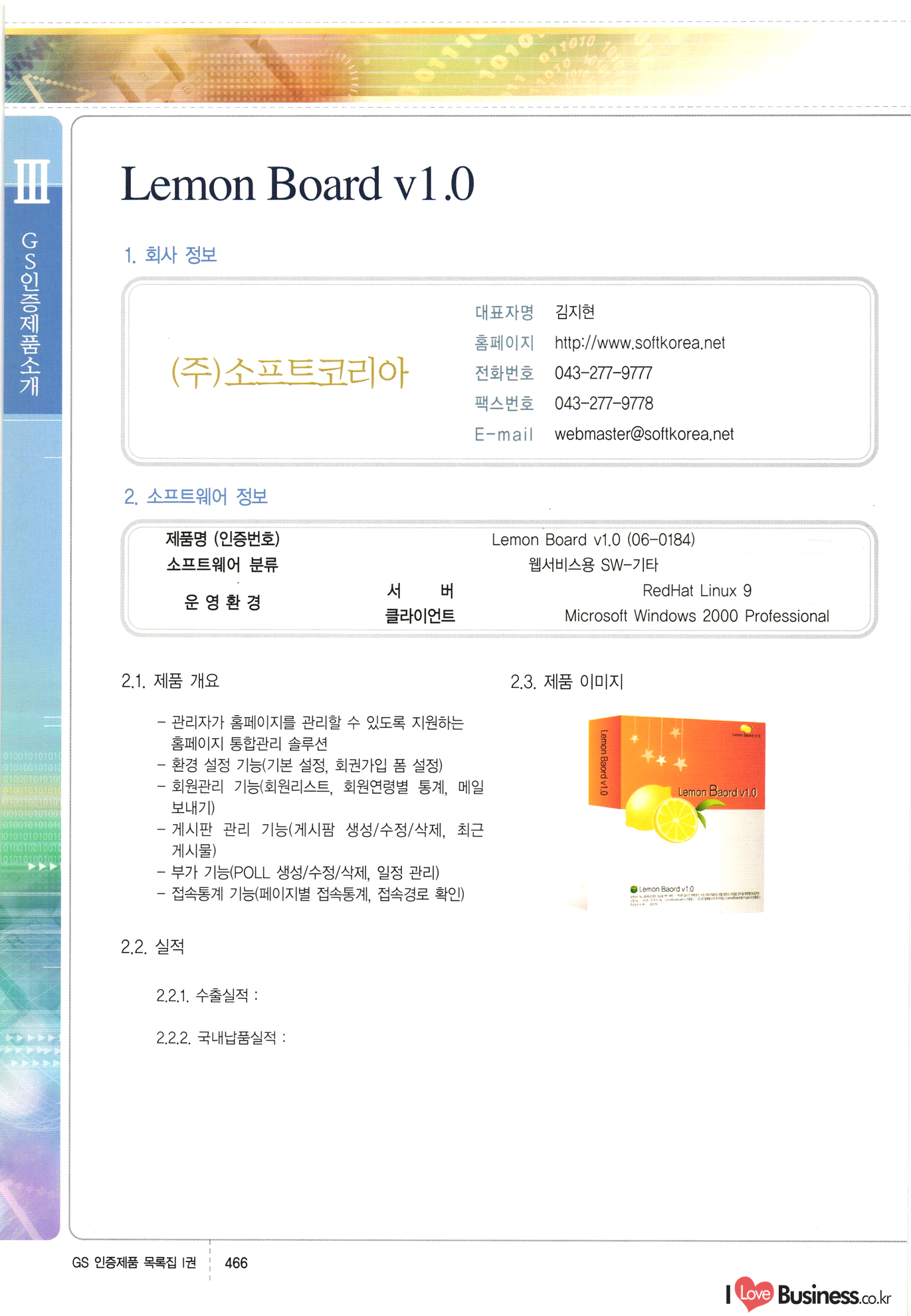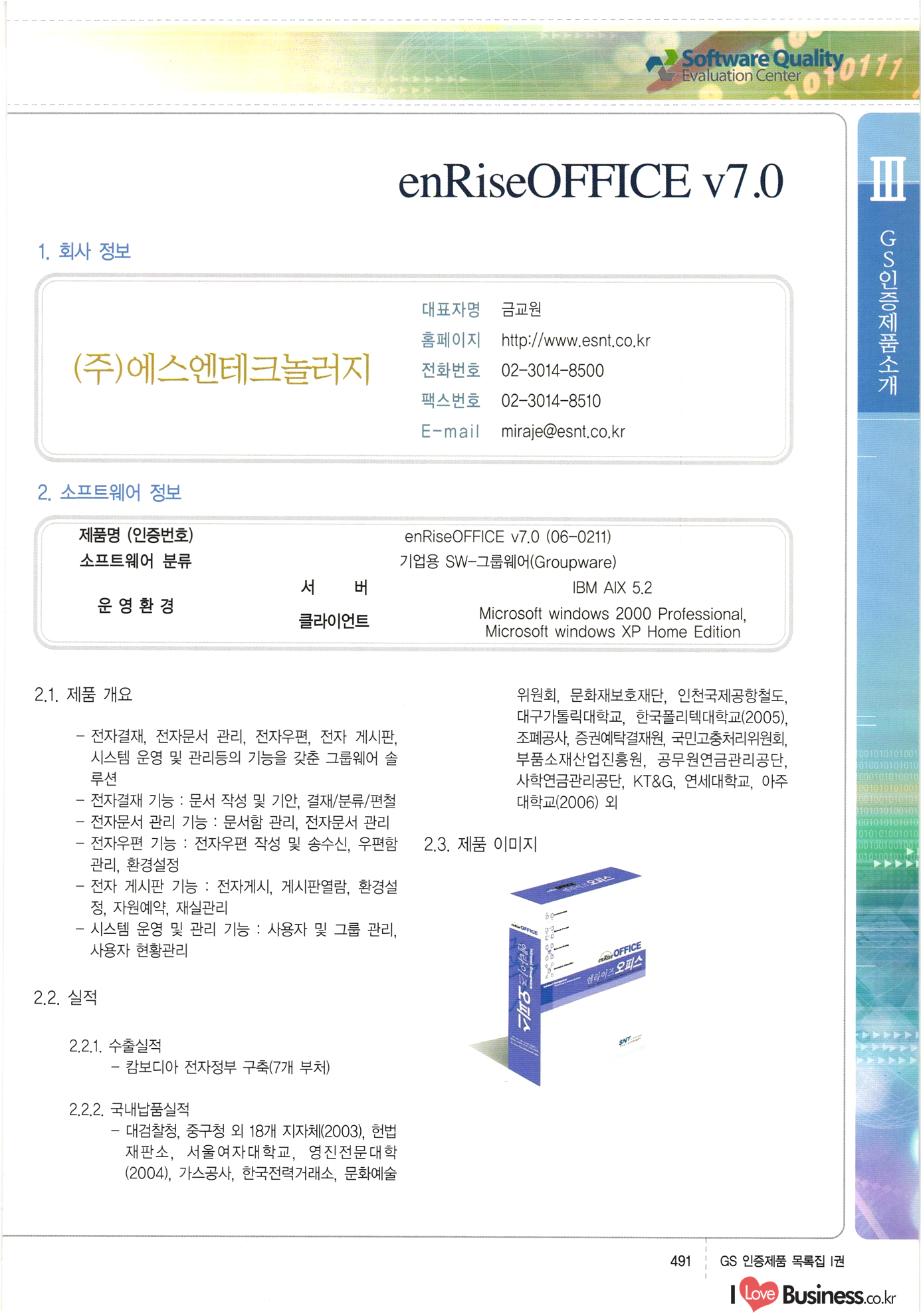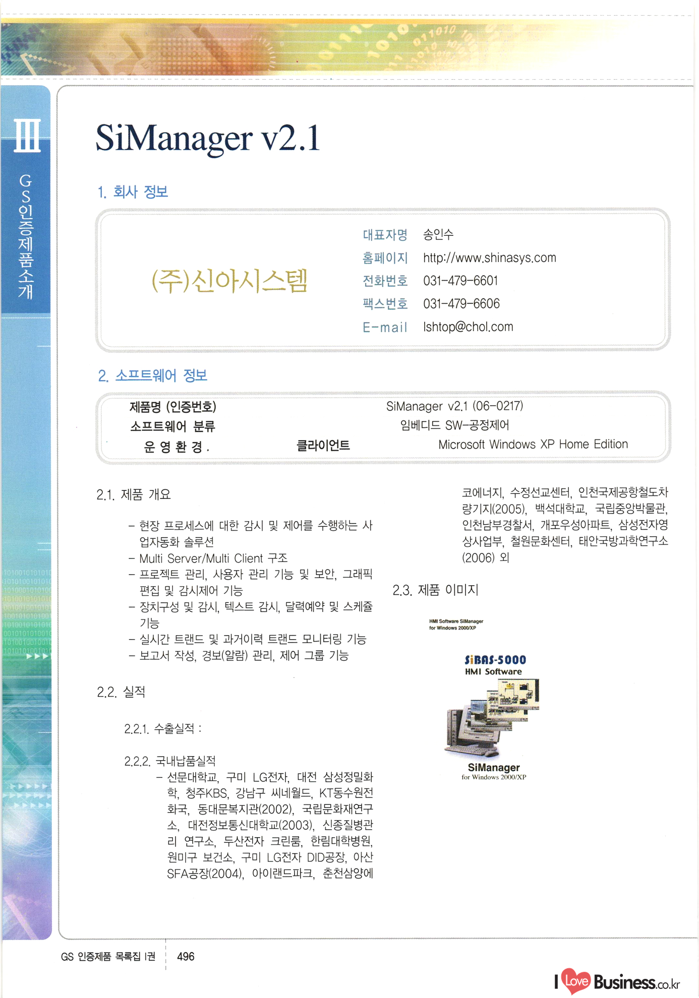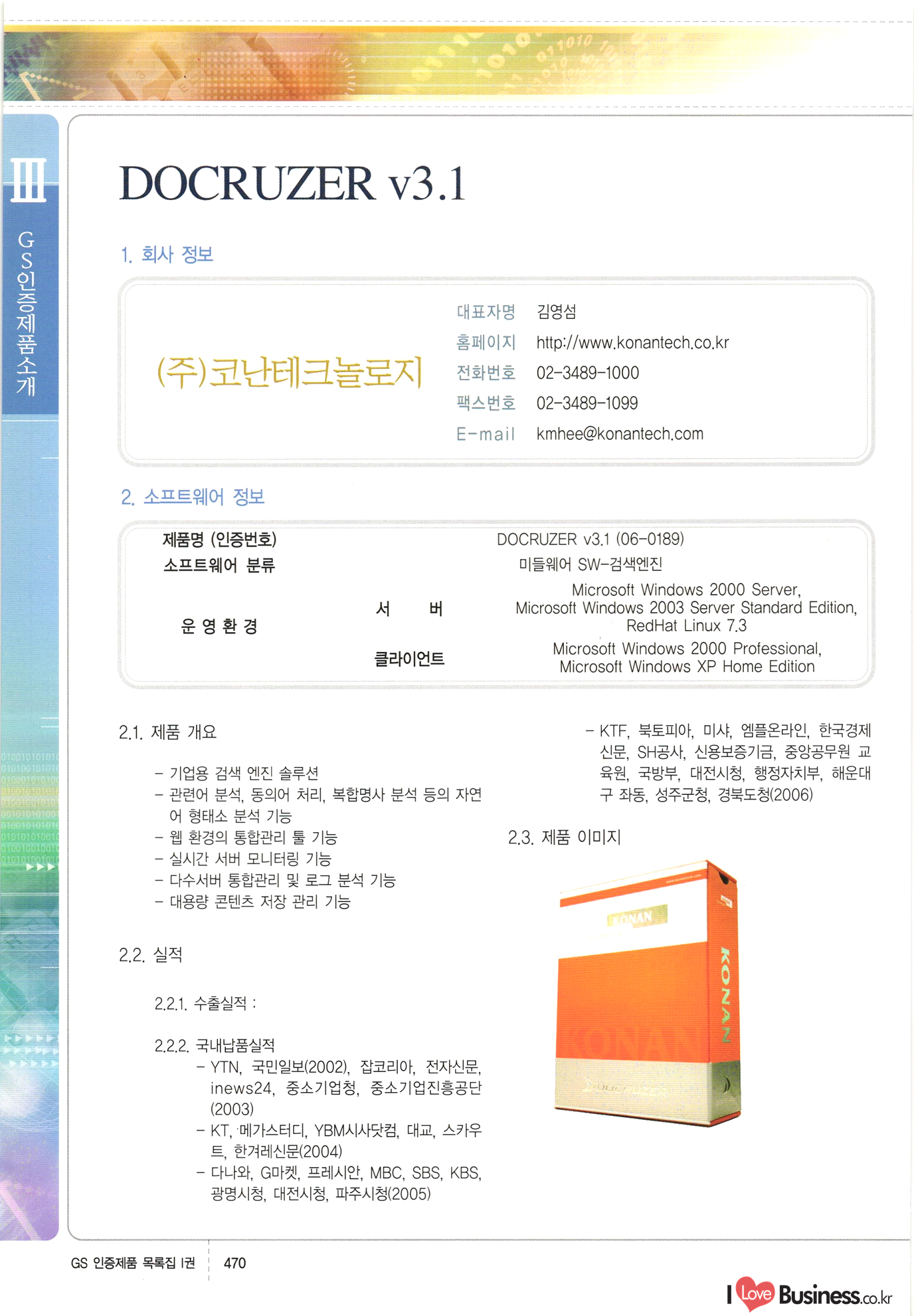 | III. GS 인증제품 목록 | 권-페이지번호 | 권-페이지번호 VT : VeriTest 국제 인증 GS인증제품목록 회사명 삼성에스디에스(주) 제품. EasyBase v4.1 페이지 50 1 제이엔에스 3DM Survey System v1.0 2 | 51 1 (주)싸이웍스 (주)테크다임 (주)다보넷 (주)로지스인포 CyberWALL 2000 v2.16 Jword v1.5 Touchsign v 2.1 키퍼엣홈 v1.0 78 52 (주)미래에듀테크 아이버스 v1.0 53 54 55 56 57 번호 | 인증번호 | 인증일자 01-0001 | 2001.07.25 101-0002 2001.10.22 (02-0027) | 01-0003 | 2001.11.27 | 01-0004 | 2001.11.27 | 01-0005 2001.11.27 5 | 01-0006 | 2001.12.27 02-0001 (02-0029) 2002.01.29 16 | | 02-0002 1 | 2002.02.16 | 02-0003 | 2002.02.16 02-0004 2002.02.27 9 | 02-0005 | 2002.02.27 110 | | 02-0006 | 2002.03.27 11 | || 02-0007 | 2002.03.27 | 02-0008 | 2002.04.30 | 02-0009 | 2002.04.30 | 02-0010 | 2002.04.30 15. | 02-0011 | 2002.04.30 16 102-0012 | 2002.04.30 | 17 | 02-0013 | 2002.05.30 | 18 | 02-0014 | 2002.05.30 | 02-0015 2002.06.28 | 20 | 02-0016 | 2002.06.28 02-0017 1 2002.06.28 | 02-0018 1 | 2002.06.28 23 | 02-0019 | 2002.06.28 24 02-0020 | 2002.07.31 25 | 02-0021 | 2002.07.31 224 58 14 59 118 (주)마크애니 (주)핸디소프트 (주)슈퍼테크놀러지 (주)스펙트라 이래정보시스템(주) (주)컴리빙아이티 | (주)시큐브 (주)케이게이트 (주)소프트4소프트 스페이스인터네셔널(주) (주)컴리빙아이티 (주)그린벨시스템즈 닉스테크(주) 심플소프트 (주)한국데이타비즈네스 (주)테크다임 (주)수세리눅스코리아 (주)한컴리눅스 소프트온넷(주) 와우리눅스(주) 60 61 Document Safer v1.0 | BizFlow Groupware v3.21 | Eg columbus || v1.0 | | eNomix v1.0 Blue Eyes v3.0 i-Class Five v1.05 Secuve TOS WG v1.0 위즈웹3 v3.0 RESORT v1.01 CD Tower v2.0 i-Class One2one v1.05 MANTIS-Professional v1.0 | | SAFEpc v1.5 Simple Gallery v1.00 통합카드발급프로그램 v1.0 Techdigm JCalc v2.0 Suse Linux 7.1K Professional Hancom Linux OS 2.2 Professional | Z!Stream v2.0 와우리눅스 7.1 파란 Secuve TOS WG Agent (Secuve Tos WG Manager) | SMERP v1.1 상하수도범용/ZEUS v1.0 U-Solver v1.0 dDIMS v3.0 DAL v2.5 101010101 1000 101003010101 190 1001010101 21 78. 122 | UL 63 64 65 26 | VT-02-001 | 2002.08.29 (주)시큐브 224 27 1 66 67 | 28 29 130 | 02-0022 | 2002.08.30 | 02-0023 | 2002.10.31 | 02-0024 | 2002.10.31 | 02-0025 | 2002.11.27 | 02-0026 | 2002.11.27 02-0027 (01-0002) 2002.11.27 | 02-0028 (03-0021) 2002.12.09 | 대한상공회의소 한국통신데이타(주) (주)지노시스템 유니온정보시스템(주) (주) 스 68 69 | 70 311 제이엔에스 소프트(구 제이엔에스) 3DM Survey System v1.0 (주)한국지능형정보시스템 한국관(상하수도 범용/TGW) v1.00 92 GS 인증제품 목록집 1권 | 26 I Love Business.co.kr Software Quality, 111 Evaluation Center | 권-페이지번호 II권페이지번호 VT : VeriTest 국제 인증 페이지 회사명 (주)포스데이타 제품 | iSign v2.0 | GS인증제품목록 171 | 34 | 02-0029 (주)제이슨테크(구 미래에듀테크) 아이버스 v1.0 91 72 73. 74 (주)인텔리젼스웨어 (주)하나디에스디 (주)연성정보기술 (주)포스정보 (주)켈코인 (주)포스데이타 스페이스인터내셔널 연희정보통신(주) (주)뉴테크웨이브 c-napse(GSS) v1.0 Life EduBuilder v1.0 | Email+ v3.0 1 책꽃이KDC v3.1 Challenger Webzine Webschool v3.0 1 Biz Binder v1.0 CD-Tower v3.1 상하수도 범용/UFCom v1.0 | | VirusChaser v5.0 | 175 76 118. (주)웨어벨리 Orange for ORACLE v2.2 | 번호 | 인증번호 | 인증일자 | 33 |VT-02-0022002.12.12 | | 2002.12.24 (02-0001) 35 | VT-02-003 | 2002.12.30 | 36 | 03-0001 | 2003.02.28 37. 03-0002 | 2003.02.28 | 38 | 03-0003 | 2003.02.28 | 39 | 03-0004 | 2003.02.28 40 | VT-03-001 | 2003.03.10 41 | VT-03-002) 2003.03.10 1 42 | 03-0005 | 2003.04.07 43 | 03-0006 | 2003.04.07 03-0007 2003.04.30 (03-0026) | 03-0008 | 2003.04.30 45 | 03-0009 | 2003.04.30 | 03-0010 | 2003.04.30 | 47 | 03-0011 | 2003.04.30 | 48 VT-03-003 2003.05.26 49 | 03-0012 | 2003.06.05 | 50 | 03-0013 | 2003.06.05 | 51 | 03-0014 | 2003.06.05 | 52 | 03-0015 | 2003.07.10 | 53 | 03-0016 | 2003.07.10 | 54 | 03-0017 | 2003.07.10 | | 55 | 03-0018 | 2003.07.10 | 56 | 03-0019 | 2003.08.06 57 | | 03-0020 | 2003.08.06 44 1 18 46 80 81 82 83 | (주)테크다임 (주)엔지스테크널러지 삼성에스디에스(주) 삼성에스디에스(주) (주)미디어랜드 인터컴소프트웨어(주) 에스케이씨앤씨(주) 아이티로직스(주) (주)에이씨티소프트 (주)위즈북 (주)에스오엔코리아 (주)아리수미디어 한진정보통신(주) (주)인텔리전스웨어 (주)웨어밸리 (구 (주)오알솔루션즈코리아) Techdigm Office v2.0 | G-Solution Waterworks/Sewerage v1.0 | | 79 UniCITY Standard v1.0 UniCITY Enterprise v1.0 TCO!stream 2002 v4.0 | ServerGuard v3.0 | SK-UPEX v1.0 84 NexWeb v1.2 e-Library Deluxe v4.1.5 86 DL Pro v1.0 SiR v1.01 파워CD뱅크 v4.0 89 InfoMatrix v1.00 190 Bizpus v1.0 91 85 87 88 10010010101.03 1101010100101 1100100100107 58 |VT-03-004 2003.08.12 Orange for ORACLE v2.2 | 111 59 (주)티지더블유 (구 한국지능형정보시스템) 한국관(상하수도 범용/TGW) v1.0 92 93 GIS Free v1.0 DeskPlus v2.0 1 | 94 ArcCITY v1.0 110 03-0021 (02-0028) | 2003.09.04 | 60 | 03-0022 | 2003.09.30 03-0023 | 2003.09.30 03-0024 (04-0011) | 2003.09.30 | 03-0025 | 2003.09.30 03-0026 (03-0007) | 2003.10.07 63 | 03-0027 | 2003.11.12 64 | 03-0028 | 2003.11.12 622 세광정보시스템(주) 제오스페이스(주) (주)선도소프트 (구 (주)캐드랜드) 중앙항업(주) (주)웨어밸리 (구 (주)오알솔루션즈코리아) (주)우암닷컴 (주)오투라인 geoCUBE상하수도 v1.0 95 Orange for ORACLE V2.2 111 96 RAVCOMS Eyecon v4.0 오투스쿨 v2.01 97 GS 인증제품 목록집 1권 I Love Business.co.kr | 권-페이지번호 | 권 - 페이지번호 VT : VeriTest 국제 인증 번호 페이지 회사명 소프트캠프
