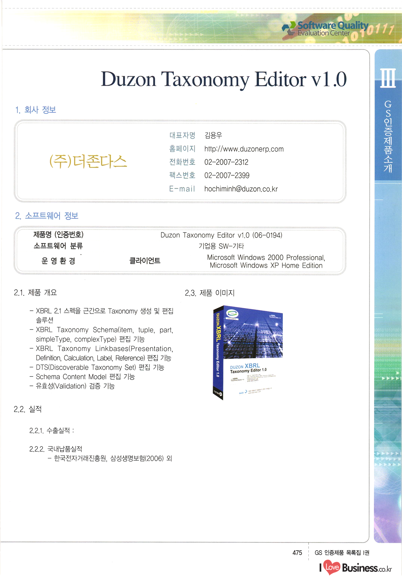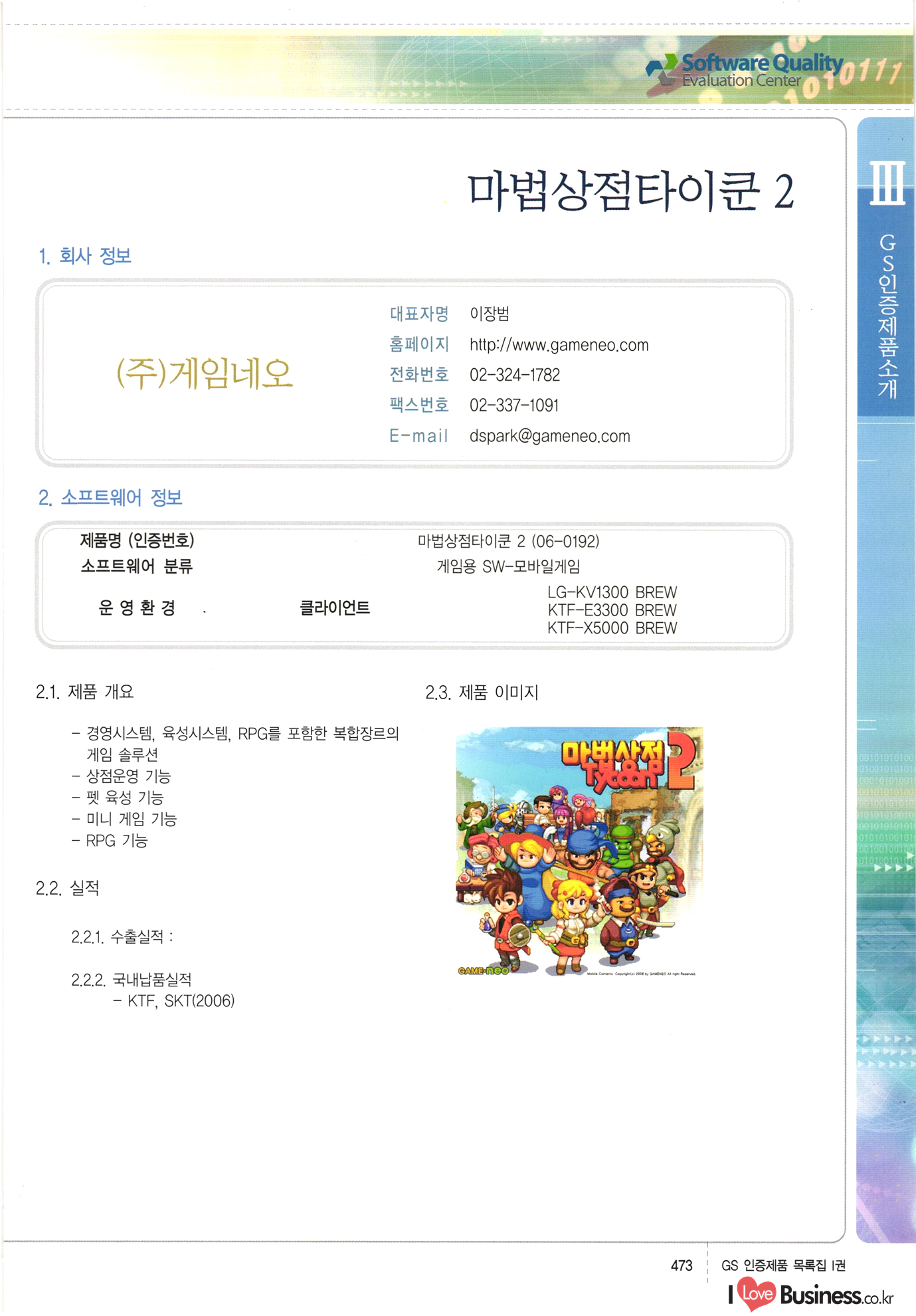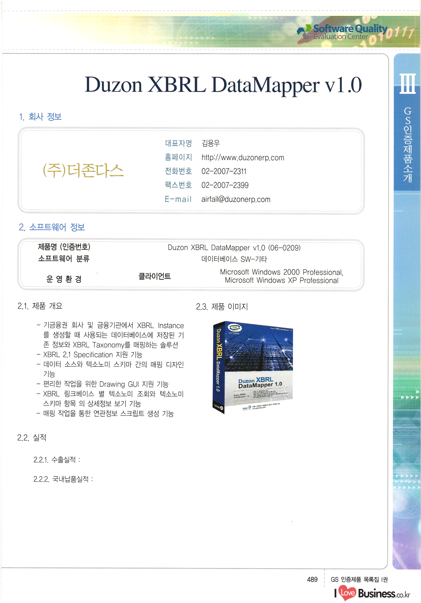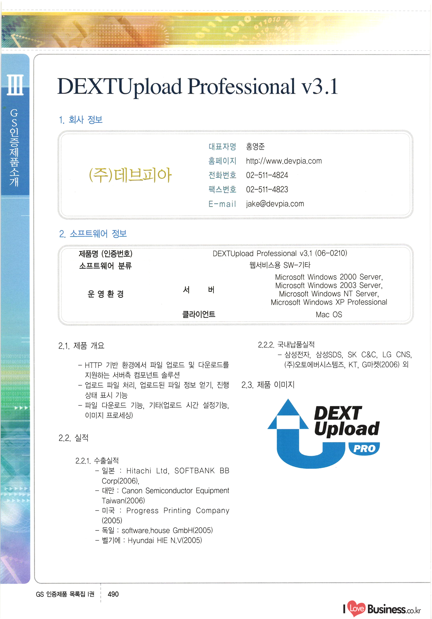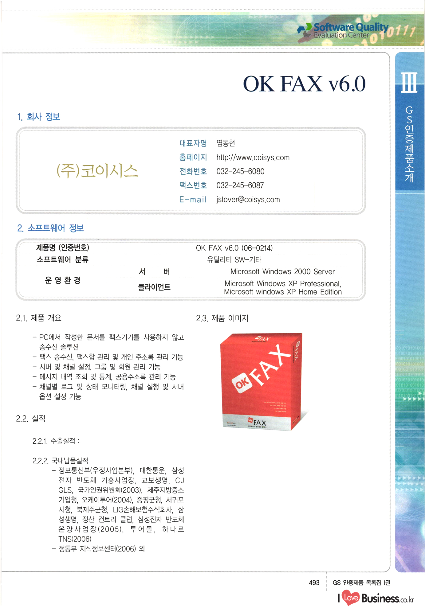 | III. GS 인증제품 목록 | 권-페이지번호 | 권-페이지번호 VT : VeriTest 국제 인증 GS인증제품목록 회사명 삼성에스디에스(주) 제품. EasyBase v4.1 페이지 50 1 제이엔에스 3DM Survey System v1.0 2 | 51 1 (주)싸이웍스 (주)테크다임 (주)다보넷 (주)로지스인포 CyberWALL 2000 v2.16 Jword v1.5 Touchsign v 2.1 키퍼엣홈 v1.0 78 52 (주)미래에듀테크 아이버스 v1.0 53 54 55 56 57 번호 | 인증번호 | 인증일자 01-0001 | 2001.07.25 101-0002 2001.10.22 (02-0027) | 01-0003 | 2001.11.27 | 01-0004 | 2001.11.27 | 01-0005 2001.11.27 5 | 01-0006 | 2001.12.27 02-0001 (02-0029) 2002.01.29 16 | | 02-0002 1 | 2002.02.16 | 02-0003 | 2002.02.16 02-0004 2002.02.27 9 | 02-0005 | 2002.02.27 110 | | 02-0006 | 2002.03.27 11 | || 02-0007 | 2002.03.27 | 02-0008 | 2002.04.30 | 02-0009 | 2002.04.30 | 02-0010 | 2002.04.30 15. | 02-0011 | 2002.04.30 16 102-0012 | 2002.04.30 | 17 | 02-0013 | 2002.05.30 | 18 | 02-0014 | 2002.05.30 | 02-0015 2002.06.28 | 20 | 02-0016 | 2002.06.28 02-0017 1 2002.06.28 | 02-0018 1 | 2002.06.28 23 | 02-0019 | 2002.06.28 24 02-0020 | 2002.07.31 25 | 02-0021 | 2002.07.31 224 58 14 59 118 (주)마크애니 (주)핸디소프트 (주)슈퍼테크놀러지 (주)스펙트라 이래정보시스템(주) (주)컴리빙아이티 | (주)시큐브 (주)케이게이트 (주)소프트4소프트 스페이스인터네셔널(주) (주)컴리빙아이티 (주)그린벨시스템즈 닉스테크(주) 심플소프트 (주)한국데이타비즈네스 (주)테크다임 (주)수세리눅스코리아 (주)한컴리눅스 소프트온넷(주) 와우리눅스(주) 60 61 Document Safer v1.0 | BizFlow Groupware v3.21 | Eg columbus || v1.0 | | eNomix v1.0 Blue Eyes v3.0 i-Class Five v1.05 Secuve TOS WG v1.0 위즈웹3 v3.0 RESORT v1.01 CD Tower v2.0 i-Class One2one v1.05 MANTIS-Professional v1.0 | | SAFEpc v1.5 Simple Gallery v1.00 통합카드발급프로그램 v1.0 Techdigm JCalc v2.0 Suse Linux 7.1K Professional Hancom Linux OS 2.2 Professional | Z!Stream v2.0 와우리눅스 7.1 파란 Secuve TOS WG Agent (Secuve Tos WG Manager) | SMERP v1.1 상하수도범용/ZEUS v1.0 U-Solver v1.0 dDIMS v3.0 DAL v2.5 101010101 1000 101003010101 190 1001010101 21 78. 122 | UL 63 64 65 26 | VT-02-001 | 2002.08.29 (주)시큐브 224 27 1 66 67 | 28 29 130 | 02-0022 | 2002.08.30 | 02-0023 | 2002.10.31 | 02-0024 | 2002.10.31 | 02-0025 | 2002.11.27 | 02-0026 | 2002.11.27 02-0027 (01-0002) 2002.11.27 | 02-0028 (03-0021) 2002.12.09 | 대한상공회의소 한국통신데이타(주) (주)지노시스템 유니온정보시스템(주) (주) 스 68 69 | 70 311 제이엔에스 소프트(구 제이엔에스) 3DM Survey System v1.0 (주)한국지능형정보시스템 한국관(상하수도 범용/TGW) v1.00 92 GS 인증제품 목록집 1권 | 26 I Love Business.co.kr Software Quality, 111 Evaluation Center | 권-페이지번호 II권페이지번호 VT : VeriTest 국제 인증 페이지 회사명 (주)포스데이타 제품 | iSign v2.0 | GS인증제품목록 171 | 34 | 02-0029 (주)제이슨테크(구 미래에듀테크) 아이버스 v1.0 91 72 73. 74 (주)인텔리젼스웨어 (주)하나디에스디 (주)연성정보기술 (주)포스정보 (주)켈코인 (주)포스데이타 스페이스인터내셔널 연희정보통신(주) (주)뉴테크웨이브 c-napse(GSS) v1.0 Life EduBuilder v1.0 | Email+ v3.0 1 책꽃이KDC v3.1 Challenger Webzine Webschool v3.0 1 Biz Binder v1.0 CD-Tower v3.1 상하수도 범용/UFCom v1.0 | | VirusChaser v5.0 | 175 76 118. (주)웨어벨리 Orange for ORACLE v2.2 | 번호 | 인증번호 | 인증일자 | 33 |VT-02-0022002.12.12 | | 2002.12.24 (02-0001) 35 | VT-02-003 | 2002.12.30 | 36 | 03-0001 | 2003.02.28 37. 03-0002 | 2003.02.28 | 38 | 03-0003 | 2003.02.28 | 39 | 03-0004 | 2003.02.28 40 | VT-03-001 | 2003.03.10 41 | VT-03-002) 2003.03.10 1 42 | 03-0005 | 2003.04.07 43 | 03-0006 | 2003.04.07 03-0007 2003.04.30 (03-0026) | 03-0008 | 2003.04.30 45 | 03-0009 | 2003.04.30 | 03-0010 | 2003.04.30 | 47 | 03-0011 | 2003.04.30 | 48 VT-03-003 2003.05.26 49 | 03-0012 | 2003.06.05 | 50 | 03-0013 | 2003.06.05 | 51 | 03-0014 | 2003.06.05 | 52 | 03-0015 | 2003.07.10 | 53 | 03-0016 | 2003.07.10 | 54 | 03-0017 | 2003.07.10 | | 55 | 03-0018 | 2003.07.10 | 56 | 03-0019 | 2003.08.06 57 | | 03-0020 | 2003.08.06 44 1 18 46 80 81 82 83 | (주)테크다임 (주)엔지스테크널러지 삼성에스디에스(주) 삼성에스디에스(주) (주)미디어랜드 인터컴소프트웨어(주) 에스케이씨앤씨(주) 아이티로직스(주) (주)에이씨티소프트 (주)위즈북 (주)에스오엔코리아 (주)아리수미디어 한진정보통신(주) (주)인텔리전스웨어 (주)웨어밸리 (구 (주)오알솔루션즈코리아) Techdigm Office v2.0 | G-Solution Waterworks/Sewerage v1.0 | | 79 UniCITY Standard v1.0 UniCITY Enterprise v1.0 TCO!stream 2002 v4.0 | ServerGuard v3.0 | SK-UPEX v1.0 84 NexWeb v1.2 e-Library Deluxe v4.1.5 86 DL Pro v1.0 SiR v1.01 파워CD뱅크 v4.0 89 InfoMatrix v1.00 190 Bizpus v1.0 91 85 87 88 10010010101.03 1101010100101 1100100100107 58 |VT-03-004 2003.08.12 Orange for ORACLE v2.2 | 111 59 (주)티지더블유 (구 한국지능형정보시스템) 한국관(상하수도 범용/TGW) v1.0 92 93 GIS Free v1.0 DeskPlus v2.0 1 | 94 ArcCITY v1.0 110 03-0021 (02-0028) | 2003.09.04 | 60 | 03-0022 | 2003.09.30 03-0023 | 2003.09.30 03-0024 (04-0011) | 2003.09.30 | 03-0025 | 2003.09.30 03-0026 (03-0007) | 2003.10.07 63 | 03-0027 | 2003.11.12 64 | 03-0028 | 2003.11.12 622 세광정보시스템(주) 제오스페이스(주) (주)선도소프트 (구 (주)캐드랜드) 중앙항업(주) (주)웨어밸리 (구 (주)오알솔루션즈코리아) (주)우암닷컴 (주)오투라인 geoCUBE상하수도 v1.0 95 Orange for ORACLE V2.2 111 96 RAVCOMS Eyecon v4.0 오투스쿨 v2.01 97 GS 인증제품 목록집 1권 I Love Business.co.kr | 권-페이지번호 | 권 - 페이지번호 VT : VeriTest 국제 인증 번호 페이지 회사명 소프트캠프