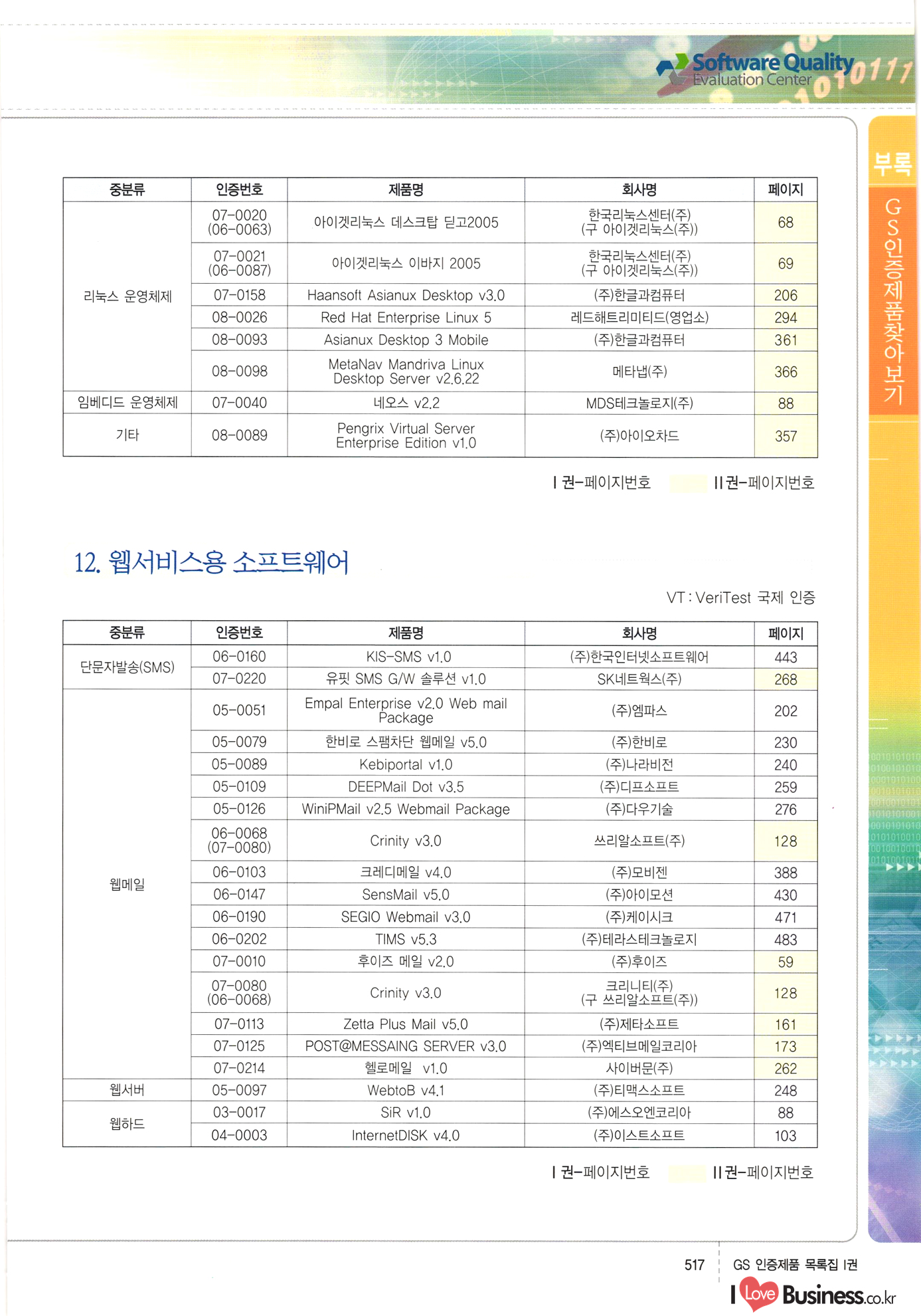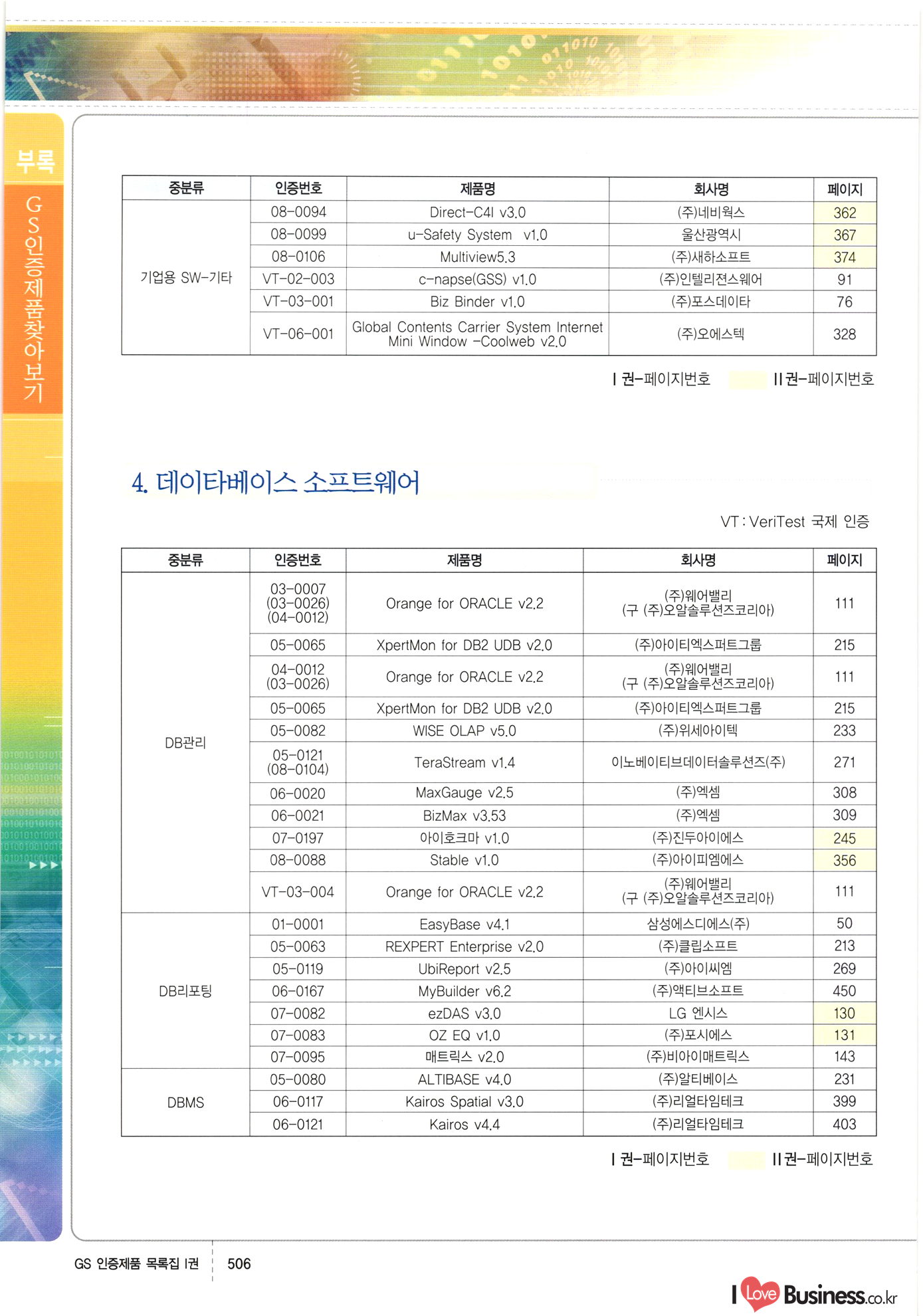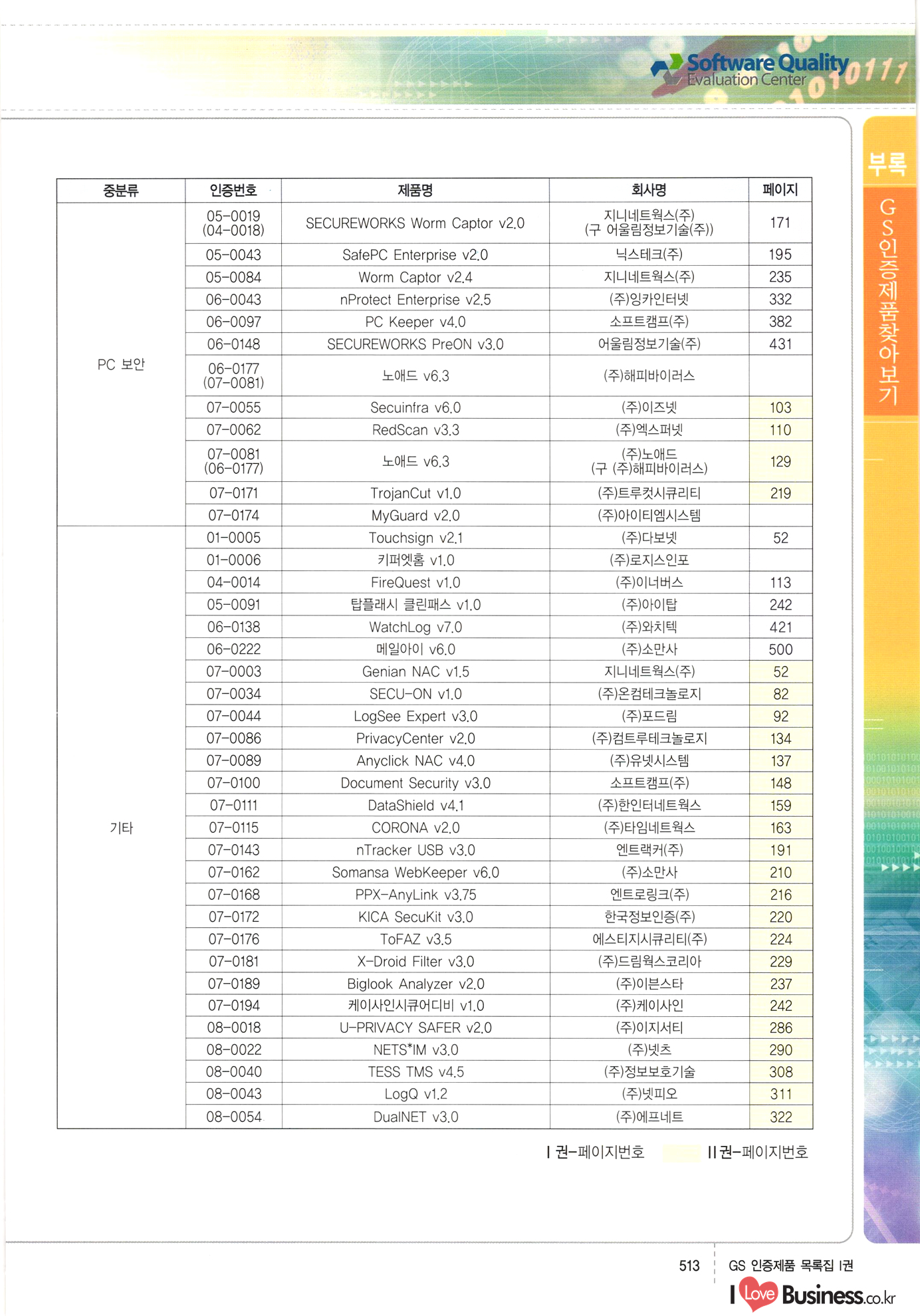 | III. GS 인증제품 목록 | 권-페이지번호 | 권-페이지번호 VT : VeriTest 국제 인증 GS인증제품목록 회사명 삼성에스디에스(주) 제품. EasyBase v4.1 페이지 50 1 제이엔에스 3DM Survey System v1.0 2 | 51 1 (주)싸이웍스 (주)테크다임 (주)다보넷 (주)로지스인포 CyberWALL 2000 v2.16 Jword v1.5 Touchsign v 2.1 키퍼엣홈 v1.0 78 52 (주)미래에듀테크 아이버스 v1.0 53 54 55 56 57 번호 | 인증번호 | 인증일자 01-0001 | 2001.07.25 101-0002 2001.10.22 (02-0027) | 01-0003 | 2001.11.27 | 01-0004 | 2001.11.27 | 01-0005 2001.11.27 5 | 01-0006 | 2001.12.27 02-0001 (02-0029) 2002.01.29 16 | | 02-0002 1 | 2002.02.16 | 02-0003 | 2002.02.16 02-0004 2002.02.27 9 | 02-0005 | 2002.02.27 110 | | 02-0006 | 2002.03.27 11 | || 02-0007 | 2002.03.27 | 02-0008 | 2002.04.30 | 02-0009 | 2002.04.30 | 02-0010 | 2002.04.30 15. | 02-0011 | 2002.04.30 16 102-0012 | 2002.04.30 | 17 | 02-0013 | 2002.05.30 | 18 | 02-0014 | 2002.05.30 | 02-0015 2002.06.28 | 20 | 02-0016 | 2002.06.28 02-0017 1 2002.06.28 | 02-0018 1 | 2002.06.28 23 | 02-0019 | 2002.06.28 24 02-0020 | 2002.07.31 25 | 02-0021 | 2002.07.31 224 58 14 59 118 (주)마크애니 (주)핸디소프트 (주)슈퍼테크놀러지 (주)스펙트라 이래정보시스템(주) (주)컴리빙아이티 | (주)시큐브 (주)케이게이트 (주)소프트4소프트 스페이스인터네셔널(주) (주)컴리빙아이티 (주)그린벨시스템즈 닉스테크(주) 심플소프트 (주)한국데이타비즈네스 (주)테크다임 (주)수세리눅스코리아 (주)한컴리눅스 소프트온넷(주) 와우리눅스(주) 60 61 Document Safer v1.0 | BizFlow Groupware v3.21 | Eg columbus || v1.0 | | eNomix v1.0 Blue Eyes v3.0 i-Class Five v1.05 Secuve TOS WG v1.0 위즈웹3 v3.0 RESORT v1.01 CD Tower v2.0 i-Class One2one v1.05 MANTIS-Professional v1.0 | | SAFEpc v1.5 Simple Gallery v1.00 통합카드발급프로그램 v1.0 Techdigm JCalc v2.0 Suse Linux 7.1K Professional Hancom Linux OS 2.2 Professional | Z!Stream v2.0 와우리눅스 7.1 파란 Secuve TOS WG Agent (Secuve Tos WG Manager) | SMERP v1.1 상하수도범용/ZEUS v1.0 U-Solver v1.0 dDIMS v3.0 DAL v2.5 101010101 1000 101003010101 190 1001010101 21 78. 122 | UL 63 64 65 26 | VT-02-001 | 2002.08.29 (주)시큐브 224 27 1 66 67 | 28 29 130 | 02-0022 | 2002.08.30 | 02-0023 | 2002.10.31 | 02-0024 | 2002.10.31 | 02-0025 | 2002.11.27 | 02-0026 | 2002.11.27 02-0027 (01-0002) 2002.11.27 | 02-0028 (03-0021) 2002.12.09 | 대한상공회의소 한국통신데이타(주) (주)지노시스템 유니온정보시스템(주) (주) 스 68 69 | 70 311 제이엔에스 소프트(구 제이엔에스) 3DM Survey System v1.0 (주)한국지능형정보시스템 한국관(상하수도 범용/TGW) v1.00 92 GS 인증제품 목록집 1권 | 26 I Love Business.co.kr Software Quality, 111 Evaluation Center | 권-페이지번호 II권페이지번호 VT : VeriTest 국제 인증 페이지 회사명 (주)포스데이타 제품 | iSign v2.0 | GS인증제품목록 171 | 34 | 02-0029 (주)제이슨테크(구 미래에듀테크) 아이버스 v1.0 91 72 73. 74 (주)인텔리젼스웨어 (주)하나디에스디 (주)연성정보기술 (주)포스정보 (주)켈코인 (주)포스데이타 스페이스인터내셔널 연희정보통신(주) (주)뉴테크웨이브 c-napse(GSS) v1.0 Life EduBuilder v1.0 | Email+ v3.0 1 책꽃이KDC v3.1 Challenger Webzine Webschool v3.0 1 Biz Binder v1.0 CD-Tower v3.1 상하수도 범용/UFCom v1.0 | | VirusChaser v5.0 | 175 76 118. (주)웨어벨리 Orange for ORACLE v2.2 | 번호 | 인증번호 | 인증일자 | 33 |VT-02-0022002.12.12 | | 2002.12.24 (02-0001) 35 | VT-02-003 | 2002.12.30 | 36 | 03-0001 | 2003.02.28 37. 03-0002 | 2003.02.28 | 38 | 03-0003 | 2003.02.28 | 39 | 03-0004 | 2003.02.28 40 | VT-03-001 | 2003.03.10 41 | VT-03-002) 2003.03.10 1 42 | 03-0005 | 2003.04.07 43 | 03-0006 | 2003.04.07 03-0007 2003.04.30 (03-0026) | 03-0008 | 2003.04.30 45 | 03-0009 | 2003.04.30 | 03-0010 | 2003.04.30 | 47 | 03-0011 | 2003.04.30 | 48 VT-03-003 2003.05.26 49 | 03-0012 | 2003.06.05 | 50 | 03-0013 | 2003.06.05 | 51 | 03-0014 | 2003.06.05 | 52 | 03-0015 | 2003.07.10 | 53 | 03-0016 | 2003.07.10 | 54 | 03-0017 | 2003.07.10 | | 55 | 03-0018 | 2003.07.10 | 56 | 03-0019 | 2003.08.06 57 | | 03-0020 | 2003.08.06 44 1 18 46 80 81 82 83 | (주)테크다임 (주)엔지스테크널러지 삼성에스디에스(주) 삼성에스디에스(주) (주)미디어랜드 인터컴소프트웨어(주) 에스케이씨앤씨(주) 아이티로직스(주) (주)에이씨티소프트 (주)위즈북 (주)에스오엔코리아 (주)아리수미디어 한진정보통신(주) (주)인텔리전스웨어 (주)웨어밸리 (구 (주)오알솔루션즈코리아) Techdigm Office v2.0 | G-Solution Waterworks/Sewerage v1.0 | | 79 UniCITY Standard v1.0 UniCITY Enterprise v1.0 TCO!stream 2002 v4.0 | ServerGuard v3.0 | SK-UPEX v1.0 84 NexWeb v1.2 e-Library Deluxe v4.1.5 86 DL Pro v1.0 SiR v1.01 파워CD뱅크 v4.0 89 InfoMatrix v1.00 190 Bizpus v1.0 91 85 87 88 10010010101.03 1101010100101 1100100100107 58 |VT-03-004 2003.08.12 Orange for ORACLE v2.2 | 111 59 (주)티지더블유 (구 한국지능형정보시스템) 한국관(상하수도 범용/TGW) v1.0 92 93 GIS Free v1.0 DeskPlus v2.0 1 | 94 ArcCITY v1.0 110 03-0021 (02-0028) | 2003.09.04 | 60 | 03-0022 | 2003.09.30 03-0023 | 2003.09.30 03-0024 (04-0011) | 2003.09.30 | 03-0025 | 2003.09.30 03-0026 (03-0007) | 2003.10.07 63 | 03-0027 | 2003.11.12 64 | 03-0028 | 2003.11.12 622 세광정보시스템(주) 제오스페이스(주) (주)선도소프트 (구 (주)캐드랜드) 중앙항업(주) (주)웨어밸리 (구 (주)오알솔루션즈코리아) (주)우암닷컴 (주)오투라인 geoCUBE상하수도 v1.0 95 Orange for ORACLE V2.2 111 96 RAVCOMS Eyecon v4.0 오투스쿨 v2.01 97 GS 인증제품 목록집 1권 I Love Business.co.kr | 권-페이지번호 | 권 - 페이지번호 VT : VeriTest 국제 인증 번호 페이지 회사명 소프트캠프