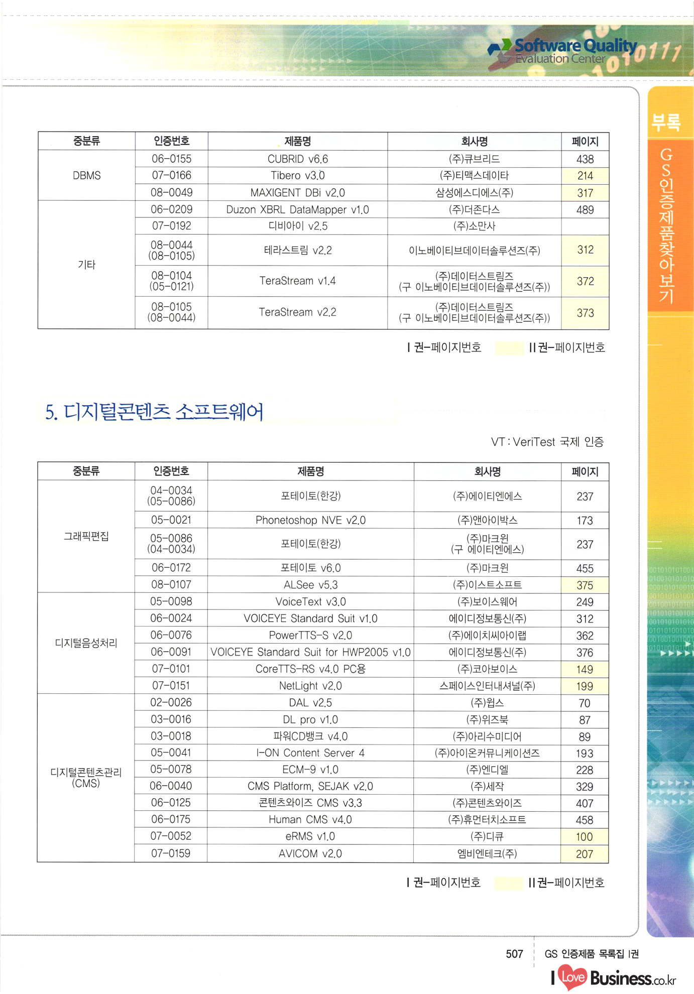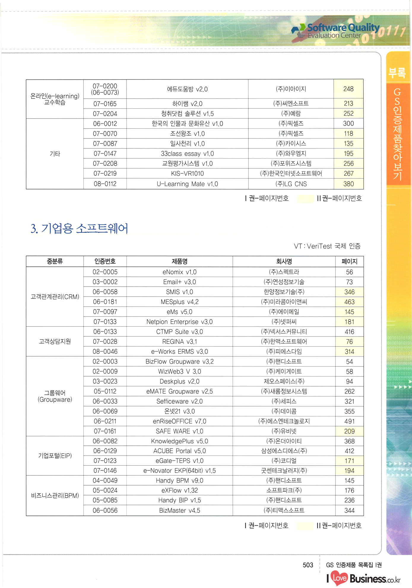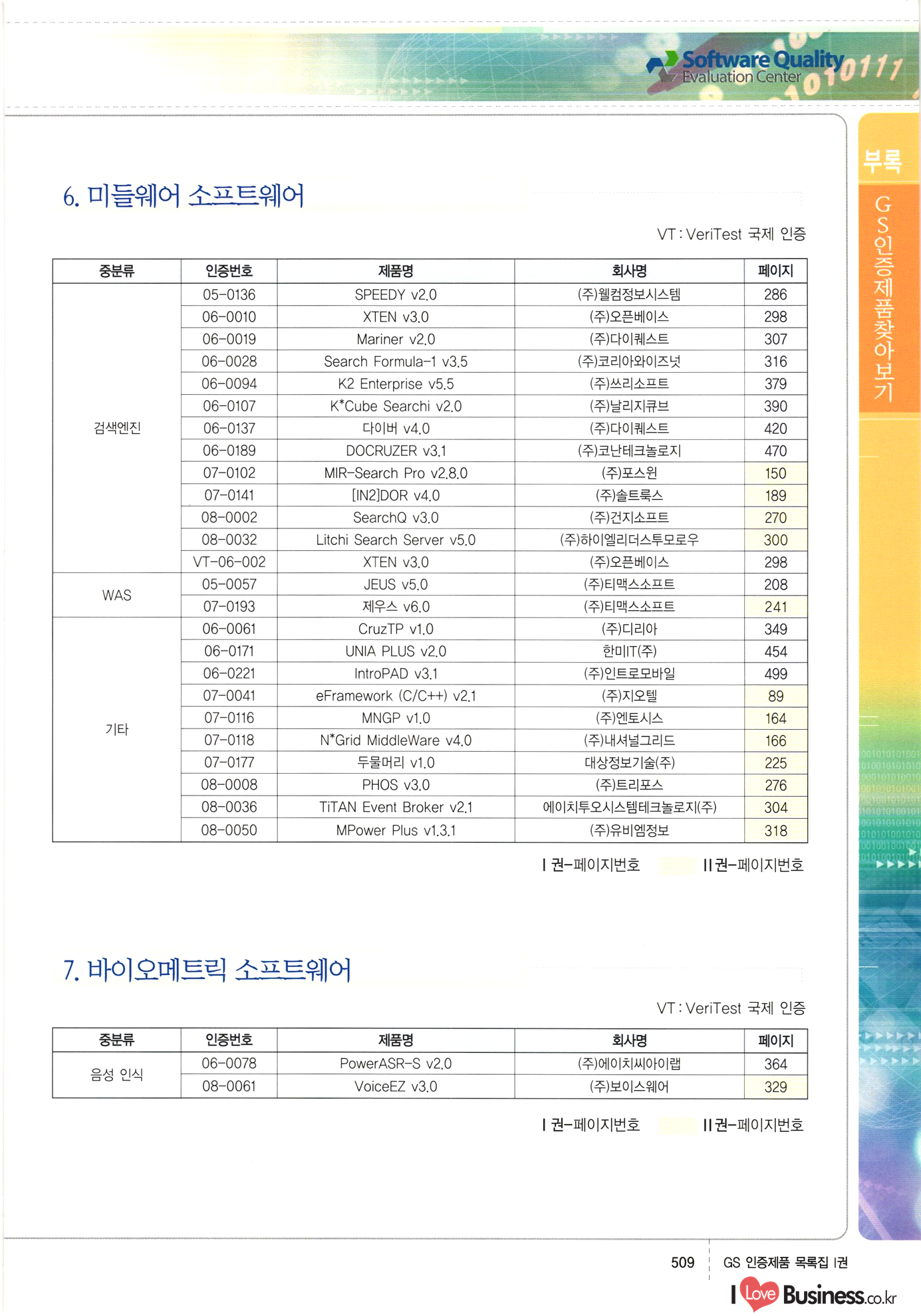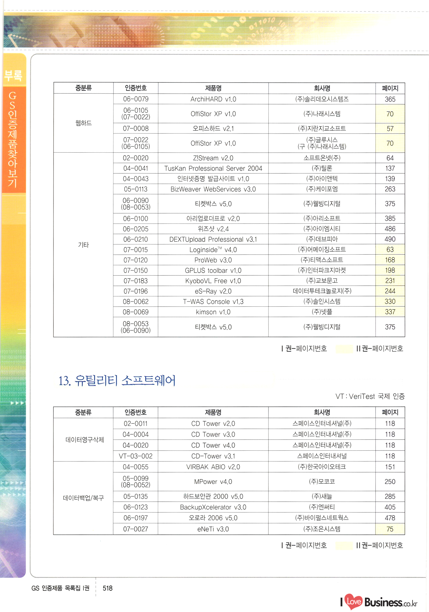 | III. GS 인증제품 목록 | 권-페이지번호 | 권-페이지번호 VT : VeriTest 국제 인증 GS인증제품목록 회사명 삼성에스디에스(주) 제품. EasyBase v4.1 페이지 50 1 제이엔에스 3DM Survey System v1.0 2 | 51 1 (주)싸이웍스 (주)테크다임 (주)다보넷 (주)로지스인포 CyberWALL 2000 v2.16 Jword v1.5 Touchsign v 2.1 키퍼엣홈 v1.0 78 52 (주)미래에듀테크 아이버스 v1.0 53 54 55 56 57 번호 | 인증번호 | 인증일자 01-0001 | 2001.07.25 101-0002 2001.10.22 (02-0027) | 01-0003 | 2001.11.27 | 01-0004 | 2001.11.27 | 01-0005 2001.11.27 5 | 01-0006 | 2001.12.27 02-0001 (02-0029) 2002.01.29 16 | | 02-0002 1 | 2002.02.16 | 02-0003 | 2002.02.16 02-0004 2002.02.27 9 | 02-0005 | 2002.02.27 110 | | 02-0006 | 2002.03.27 11 | || 02-0007 | 2002.03.27 | 02-0008 | 2002.04.30 | 02-0009 | 2002.04.30 | 02-0010 | 2002.04.30 15. | 02-0011 | 2002.04.30 16 102-0012 | 2002.04.30 | 17 | 02-0013 | 2002.05.30 | 18 | 02-0014 | 2002.05.30 | 02-0015 2002.06.28 | 20 | 02-0016 | 2002.06.28 02-0017 1 2002.06.28 | 02-0018 1 | 2002.06.28 23 | 02-0019 | 2002.06.28 24 02-0020 | 2002.07.31 25 | 02-0021 | 2002.07.31 224 58 14 59 118 (주)마크애니 (주)핸디소프트 (주)슈퍼테크놀러지 (주)스펙트라 이래정보시스템(주) (주)컴리빙아이티 | (주)시큐브 (주)케이게이트 (주)소프트4소프트 스페이스인터네셔널(주) (주)컴리빙아이티 (주)그린벨시스템즈 닉스테크(주) 심플소프트 (주)한국데이타비즈네스 (주)테크다임 (주)수세리눅스코리아 (주)한컴리눅스 소프트온넷(주) 와우리눅스(주) 60 61 Document Safer v1.0 | BizFlow Groupware v3.21 | Eg columbus || v1.0 | | eNomix v1.0 Blue Eyes v3.0 i-Class Five v1.05 Secuve TOS WG v1.0 위즈웹3 v3.0 RESORT v1.01 CD Tower v2.0 i-Class One2one v1.05 MANTIS-Professional v1.0 | | SAFEpc v1.5 Simple Gallery v1.00 통합카드발급프로그램 v1.0 Techdigm JCalc v2.0 Suse Linux 7.1K Professional Hancom Linux OS 2.2 Professional | Z!Stream v2.0 와우리눅스 7.1 파란 Secuve TOS WG Agent (Secuve Tos WG Manager) | SMERP v1.1 상하수도범용/ZEUS v1.0 U-Solver v1.0 dDIMS v3.0 DAL v2.5 101010101 1000 101003010101 190 1001010101 21 78. 122 | UL 63 64 65 26 | VT-02-001 | 2002.08.29 (주)시큐브 224 27 1 66 67 | 28 29 130 | 02-0022 | 2002.08.30 | 02-0023 | 2002.10.31 | 02-0024 | 2002.10.31 | 02-0025 | 2002.11.27 | 02-0026 | 2002.11.27 02-0027 (01-0002) 2002.11.27 | 02-0028 (03-0021) 2002.12.09 | 대한상공회의소 한국통신데이타(주) (주)지노시스템 유니온정보시스템(주) (주) 스 68 69 | 70 311 제이엔에스 소프트(구 제이엔에스) 3DM Survey System v1.0 (주)한국지능형정보시스템 한국관(상하수도 범용/TGW) v1.00 92 GS 인증제품 목록집 1권 | 26 I Love Business.co.kr Software Quality, 111 Evaluation Center | 권-페이지번호 II권페이지번호 VT : VeriTest 국제 인증 페이지 회사명 (주)포스데이타 제품 | iSign v2.0 | GS인증제품목록 171 | 34 | 02-0029 (주)제이슨테크(구 미래에듀테크) 아이버스 v1.0 91 72 73. 74 (주)인텔리젼스웨어 (주)하나디에스디 (주)연성정보기술 (주)포스정보 (주)켈코인 (주)포스데이타 스페이스인터내셔널 연희정보통신(주) (주)뉴테크웨이브 c-napse(GSS) v1.0 Life EduBuilder v1.0 | Email+ v3.0 1 책꽃이KDC v3.1 Challenger Webzine Webschool v3.0 1 Biz Binder v1.0 CD-Tower v3.1 상하수도 범용/UFCom v1.0 | | VirusChaser v5.0 | 175 76 118. (주)웨어벨리 Orange for ORACLE v2.2 | 번호 | 인증번호 | 인증일자 | 33 |VT-02-0022002.12.12 | | 2002.12.24 (02-0001) 35 | VT-02-003 | 2002.12.30 | 36 | 03-0001 | 2003.02.28 37. 03-0002 | 2003.02.28 | 38 | 03-0003 | 2003.02.28 | 39 | 03-0004 | 2003.02.28 40 | VT-03-001 | 2003.03.10 41 | VT-03-002) 2003.03.10 1 42 | 03-0005 | 2003.04.07 43 | 03-0006 | 2003.04.07 03-0007 2003.04.30 (03-0026) | 03-0008 | 2003.04.30 45 | 03-0009 | 2003.04.30 | 03-0010 | 2003.04.30 | 47 | 03-0011 | 2003.04.30 | 48 VT-03-003 2003.05.26 49 | 03-0012 | 2003.06.05 | 50 | 03-0013 | 2003.06.05 | 51 | 03-0014 | 2003.06.05 | 52 | 03-0015 | 2003.07.10 | 53 | 03-0016 | 2003.07.10 | 54 | 03-0017 | 2003.07.10 | | 55 | 03-0018 | 2003.07.10 | 56 | 03-0019 | 2003.08.06 57 | | 03-0020 | 2003.08.06 44 1 18 46 80 81 82 83 | (주)테크다임 (주)엔지스테크널러지 삼성에스디에스(주) 삼성에스디에스(주) (주)미디어랜드 인터컴소프트웨어(주) 에스케이씨앤씨(주) 아이티로직스(주) (주)에이씨티소프트 (주)위즈북 (주)에스오엔코리아 (주)아리수미디어 한진정보통신(주) (주)인텔리전스웨어 (주)웨어밸리 (구 (주)오알솔루션즈코리아) Techdigm Office v2.0 | G-Solution Waterworks/Sewerage v1.0 | | 79 UniCITY Standard v1.0 UniCITY Enterprise v1.0 TCO!stream 2002 v4.0 | ServerGuard v3.0 | SK-UPEX v1.0 84 NexWeb v1.2 e-Library Deluxe v4.1.5 86 DL Pro v1.0 SiR v1.01 파워CD뱅크 v4.0 89 InfoMatrix v1.00 190 Bizpus v1.0 91 85 87 88 10010010101.03 1101010100101 1100100100107 58 |VT-03-004 2003.08.12 Orange for ORACLE v2.2 | 111 59 (주)티지더블유 (구 한국지능형정보시스템) 한국관(상하수도 범용/TGW) v1.0 92 93 GIS Free v1.0 DeskPlus v2.0 1 | 94 ArcCITY v1.0 110 03-0021 (02-0028) | 2003.09.04 | 60 | 03-0022 | 2003.09.30 03-0023 | 2003.09.30 03-0024 (04-0011) | 2003.09.30 | 03-0025 | 2003.09.30 03-0026 (03-0007) | 2003.10.07 63 | 03-0027 | 2003.11.12 64 | 03-0028 | 2003.11.12 622 세광정보시스템(주) 제오스페이스(주) (주)선도소프트 (구 (주)캐드랜드) 중앙항업(주) (주)웨어밸리 (구 (주)오알솔루션즈코리아) (주)우암닷컴 (주)오투라인 geoCUBE상하수도 v1.0 95 Orange for ORACLE V2.2 111 96 RAVCOMS Eyecon v4.0 오투스쿨 v2.01 97 GS 인증제품 목록집 1권 I Love Business.co.kr | 권-페이지번호 | 권 - 페이지번호 VT : VeriTest 국제 인증 번호 페이지 회사명 소프트캠프