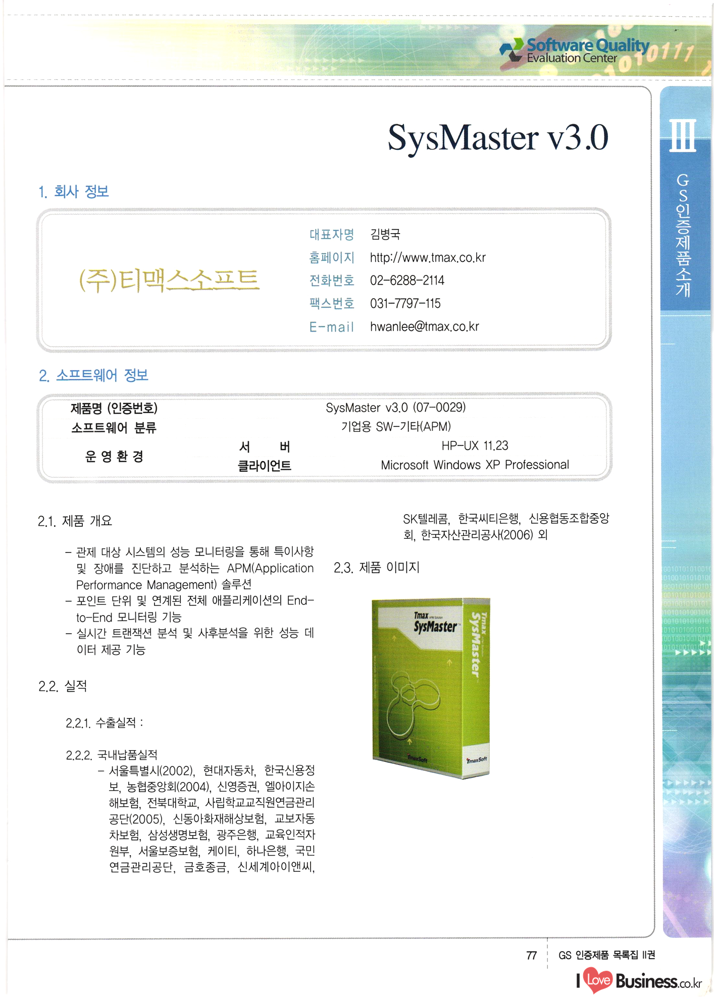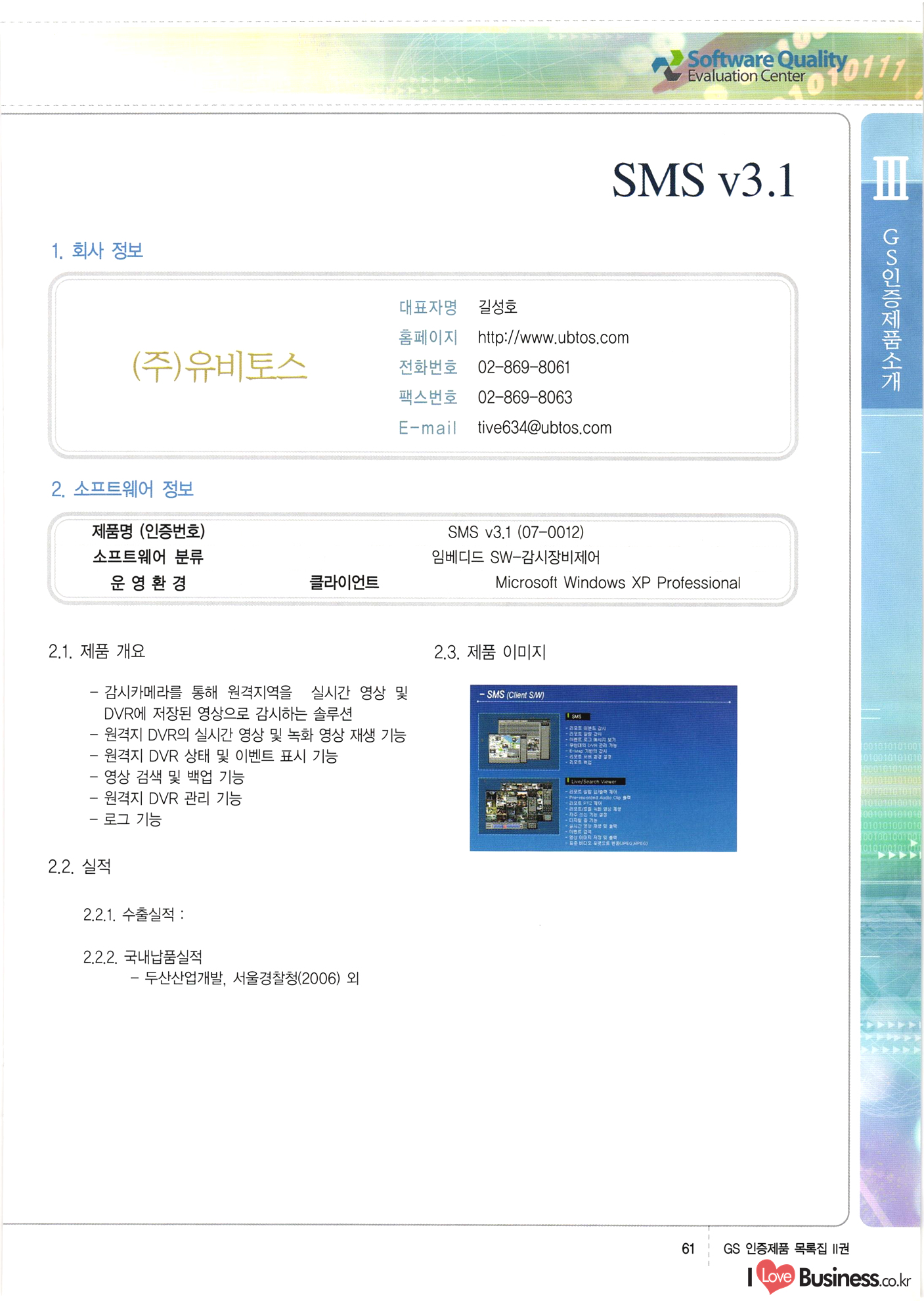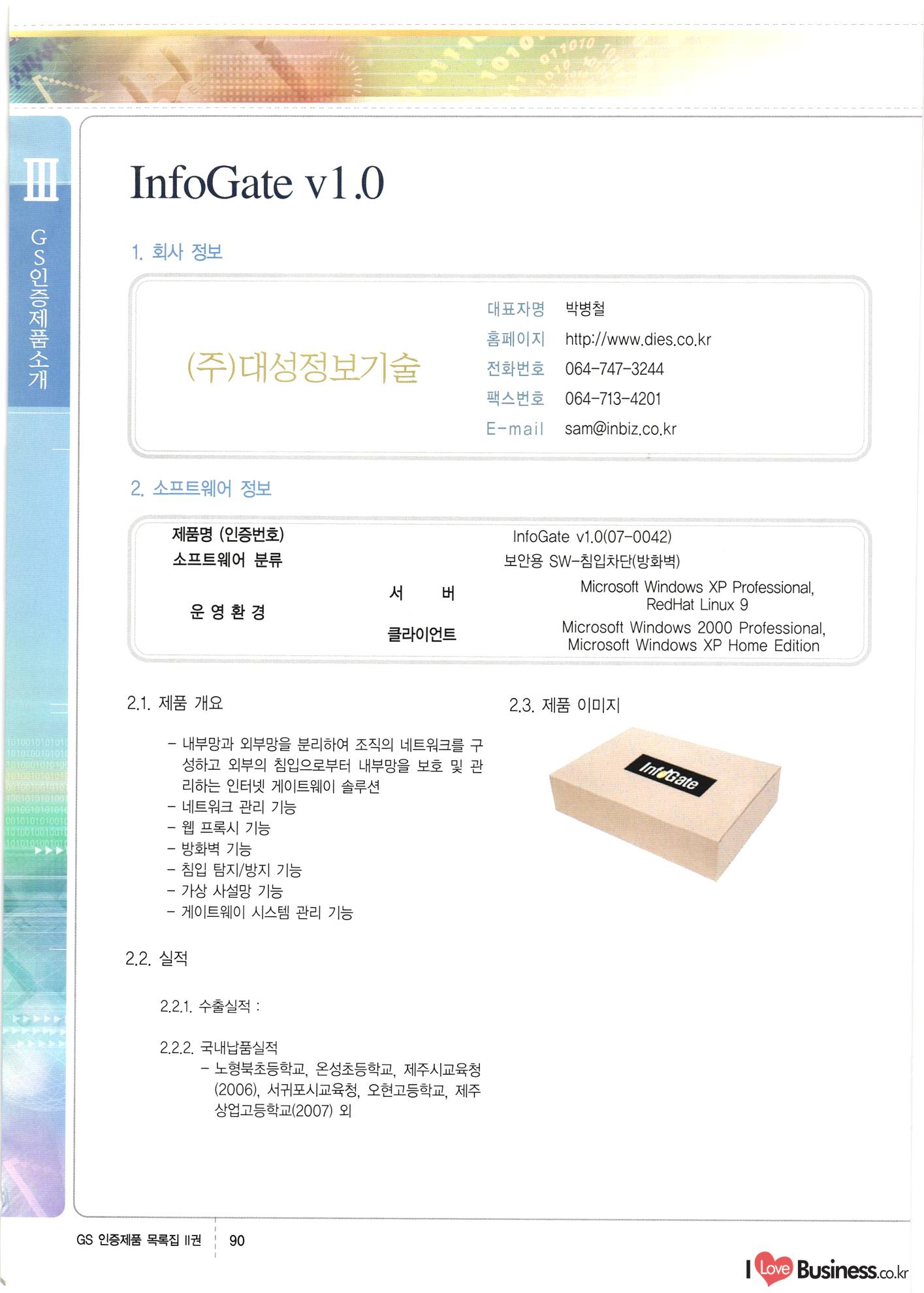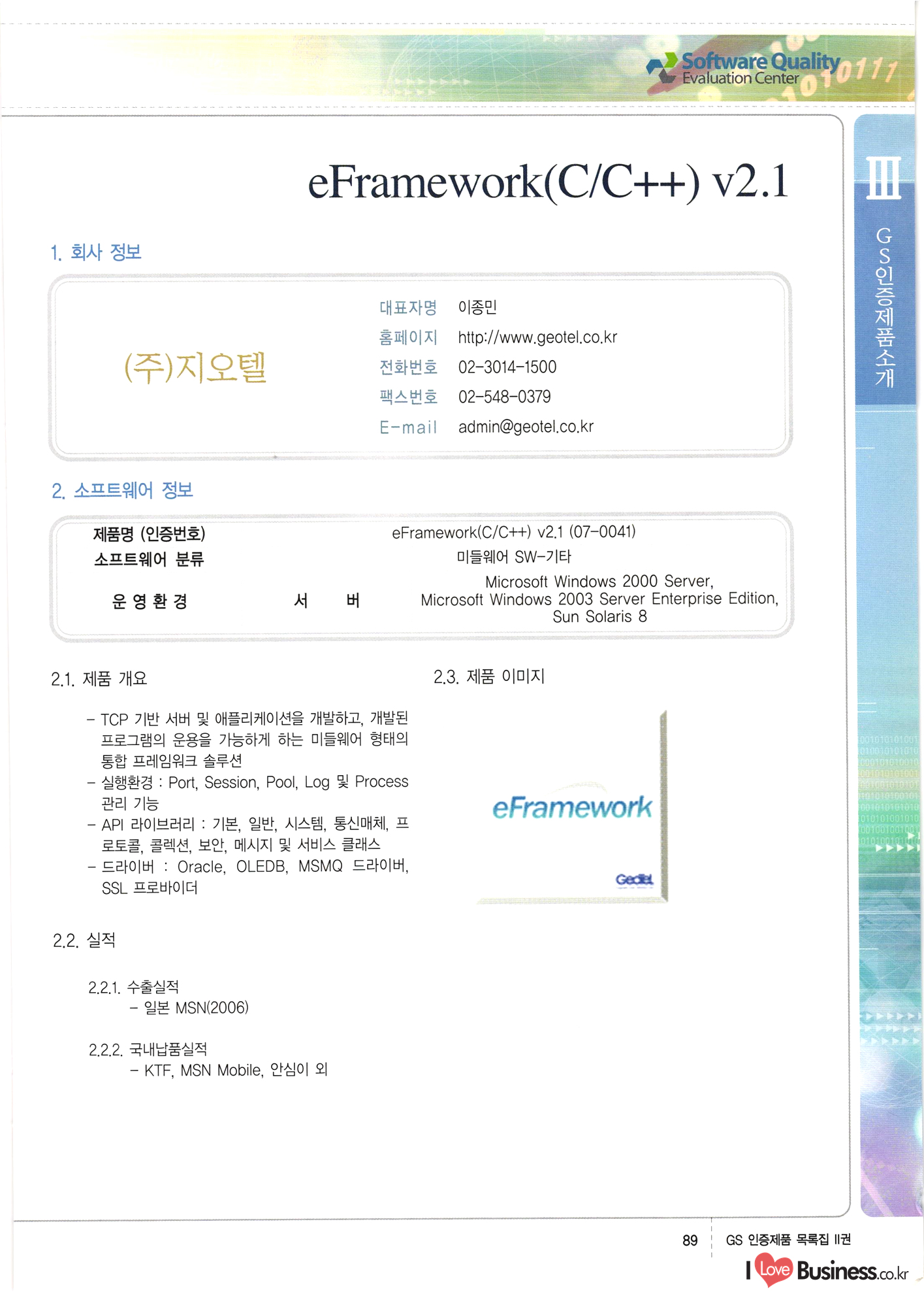| III. GS 인증제품 목록 | 권-페이지번호 | 권-페이지번호 VT : VeriTest 국제 인증 GS인증제품목록 회사명 삼성에스디에스(주) 제품. EasyBase v4.1 페이지 50 1 제이엔에스 3DM Survey System v1.0 2 | 51 1 (주)싸이웍스 (주)테크다임 (주)다보넷 (주)로지스인포 CyberWALL 2000 v2.16 Jword v1.5 Touchsign v 2.1 키퍼엣홈 v1.0 78 52 (주)미래에듀테크 아이버스 v1.0 53 54 55 56 57 번호 | 인증번호 | 인증일자 01-0001 | 2001.07.25 101-0002 2001.10.22 (02-0027) | 01-0003 | 2001.11.27 | 01-0004 | 2001.11.27 | 01-0005 2001.11.27 5 | 01-0006 | 2001.12.27 02-0001 (02-0029) 2002.01.29 16 | | 02-0002 1 | 2002.02.16 | 02-0003 | 2002.02.16 02-0004 2002.02.27 9 | 02-0005 | 2002.02.27 110 | | 02-0006 | 2002.03.27 11 | || 02-0007 | 2002.03.27 | 02-0008 | 2002.04.30 | 02-0009 | 2002.04.30 | 02-0010 | 2002.04.30 15. | 02-0011 | 2002.04.30 16 102-0012 | 2002.04.30 | 17 | 02-0013 | 2002.05.30 | 18 | 02-0014 | 2002.05.30 | 02-0015 2002.06.28 | 20 | 02-0016 | 2002.06.28 02-0017 1 2002.06.28 | 02-0018 1 | 2002.06.28 23 | 02-0019 | 2002.06.28 24 02-0020 | 2002.07.31 25 | 02-0021 | 2002.07.31 224 58 14 59 118 (주)마크애니 (주)핸디소프트 (주)슈퍼테크놀러지 (주)스펙트라 이래정보시스템(주) (주)컴리빙아이티 | (주)시큐브 (주)케이게이트 (주)소프트4소프트 스페이스인터네셔널(주) (주)컴리빙아이티 (주)그린벨시스템즈 닉스테크(주) 심플소프트 (주)한국데이타비즈네스 (주)테크다임 (주)수세리눅스코리아 (주)한컴리눅스 소프트온넷(주) 와우리눅스(주) 60 61 Document Safer v1.0 | BizFlow Groupware v3.21 | Eg columbus || v1.0 | | eNomix v1.0 Blue Eyes v3.0 i-Class Five v1.05 Secuve TOS WG v1.0 위즈웹3 v3.0 RESORT v1.01 CD Tower v2.0 i-Class One2one v1.05 MANTIS-Professional v1.0 | | SAFEpc v1.5 Simple Gallery v1.00 통합카드발급프로그램 v1.0 Techdigm JCalc v2.0 Suse Linux 7.1K Professional Hancom Linux OS 2.2 Professional | Z!Stream v2.0 와우리눅스 7.1 파란 Secuve TOS WG Agent (Secuve Tos WG Manager) | SMERP v1.1 상하수도범용/ZEUS v1.0 U-Solver v1.0 dDIMS v3.0 DAL v2.5 101010101 1000 101003010101 190 1001010101 21 78. 122 | UL 63 64 65 26 | VT-02-001 | 2002.08.29 (주)시큐브 224 27 1 66 67 | 28 29 130 | 02-0022 | 2002.08.30 | 02-0023 | 2002.10.31 | 02-0024 | 2002.10.31 | 02-0025 | 2002.11.27 | 02-0026 | 2002.11.27 02-0027 (01-0002) 2002.11.27 | 02-0028 (03-0021) 2002.12.09 | 대한상공회의소 한국통신데이타(주) (주)지노시스템 유니온정보시스템(주) (주) 스 68 69 | 70 311 제이엔에스 소프트(구 제이엔에스) 3DM Survey System v1.0 (주)한국지능형정보시스템 한국관(상하수도 범용/TGW) v1.00 92 GS 인증제품 목록집 1권 | 26 I Love Business.co.kr Software Quality, 111 Evaluation Center | 권-페이지번호 II권페이지번호 VT : VeriTest 국제 인증 페이지 회사명 (주)포스데이타 제품 | iSign v2.0 | GS인증제품목록 171 | 34 | 02-0029 (주)제이슨테크(구 미래에듀테크) 아이버스 v1.0 91 72 73. 74 (주)인텔리젼스웨어 (주)하나디에스디 (주)연성정보기술 (주)포스정보 (주)켈코인 (주)포스데이타 스페이스인터내셔널 연희정보통신(주) (주)뉴테크웨이브 c-napse(GSS) v1.0 Life EduBuilder v1.0 | Email+ v3.0 1 책꽃이KDC v3.1 Challenger Webzine Webschool v3.0 1 Biz Binder v1.0 CD-Tower v3.1 상하수도 범용/UFCom v1.0 | | VirusChaser v5.0 | 175 76 118. (주)웨어벨리 Orange for ORACLE v2.2 | 번호 | 인증번호 | 인증일자 | 33 |VT-02-0022002.12.12 | | 2002.12.24 (02-0001) 35 | VT-02-003 | 2002.12.30 | 36 | 03-0001 | 2003.02.28 37. 03-0002 | 2003.02.28 | 38 | 03-0003 | 2003.02.28 | 39 | 03-0004 | 2003.02.28 40 | VT-03-001 | 2003.03.10 41 | VT-03-002) 2003.03.10 1 42 | 03-0005 | 2003.04.07 43 | 03-0006 | 2003.04.07 03-0007 2003.04.30 (03-0026) | 03-0008 | 2003.04.30 45 | 03-0009 | 2003.04.30 | 03-0010 | 2003.04.30 | 47 | 03-0011 | 2003.04.30 | 48 VT-03-003 2003.05.26 49 | 03-0012 | 2003.06.05 | 50 | 03-0013 | 2003.06.05 | 51 | 03-0014 | 2003.06.05 | 52 | 03-0015 | 2003.07.10 | 53 | 03-0016 | 2003.07.10 | 54 | 03-0017 | 2003.07.10 | | 55 | 03-0018 | 2003.07.10 | 56 | 03-0019 | 2003.08.06 57 | | 03-0020 | 2003.08.06 44 1 18 46 80 81 82 83 | (주)테크다임 (주)엔지스테크널러지 삼성에스디에스(주) 삼성에스디에스(주) (주)미디어랜드 인터컴소프트웨어(주) 에스케이씨앤씨(주) 아이티로직스(주) (주)에이씨티소프트 (주)위즈북 (주)에스오엔코리아 (주)아리수미디어 한진정보통신(주) (주)인텔리전스웨어 (주)웨어밸리 (구 (주)오알솔루션즈코리아) Techdigm Office v2.0 | G-Solution Waterworks/Sewerage v1.0 | | 79 UniCITY Standard v1.0 UniCITY Enterprise v1.0 TCO!stream 2002 v4.0 | ServerGuard v3.0 | SK-UPEX v1.0 84 NexWeb v1.2 e-Library Deluxe v4.1.5 86 DL Pro v1.0 SiR v1.01 파워CD뱅크 v4.0 89 InfoMatrix v1.00 190 Bizpus v1.0 91 85 87 88 10010010101.03 1101010100101 1100100100107 58 |VT-03-004 2003.08.12 Orange for ORACLE v2.2 | 111 59 (주)티지더블유 (구 한국지능형정보시스템) 한국관(상하수도 범용/TGW) v1.0 92 93 GIS Free v1.0 DeskPlus v2.0 1 | 94 ArcCITY v1.0 110 03-0021 (02-0028) | 2003.09.04 | 60 | 03-0022 | 2003.09.30 03-0023 | 2003.09.30 03-0024 (04-0011) | 2003.09.30 | 03-0025 | 2003.09.30 03-0026 (03-0007) | 2003.10.07 63 | 03-0027 | 2003.11.12 64 | 03-0028 | 2003.11.12 622 세광정보시스템(주) 제오스페이스(주) (주)선도소프트 (구 (주)캐드랜드) 중앙항업(주) (주)웨어밸리 (구 (주)오알솔루션즈코리아) (주)우암닷컴 (주)오투라인 geoCUBE상하수도 v1.0 95 Orange for ORACLE V2.2 111 96 RAVCOMS Eyecon v4.0 오투스쿨 v2.01 97 GS 인증제품 목록집 1권 I Love Business.co.kr | 권-페이지번호 | 권 - 페이지번호 VT : VeriTest 국제 인증 번호 페이지 회사명 소프트캠프