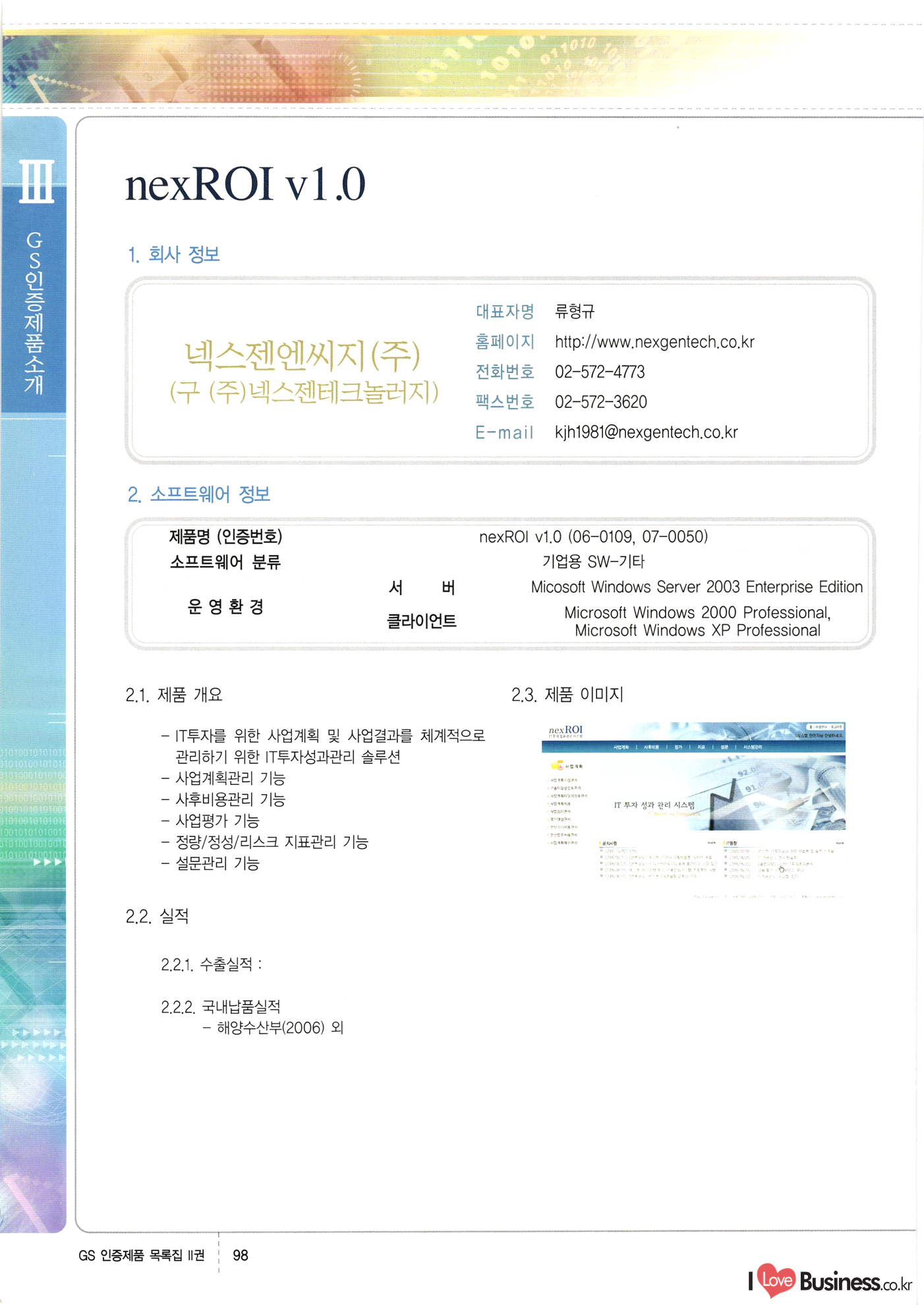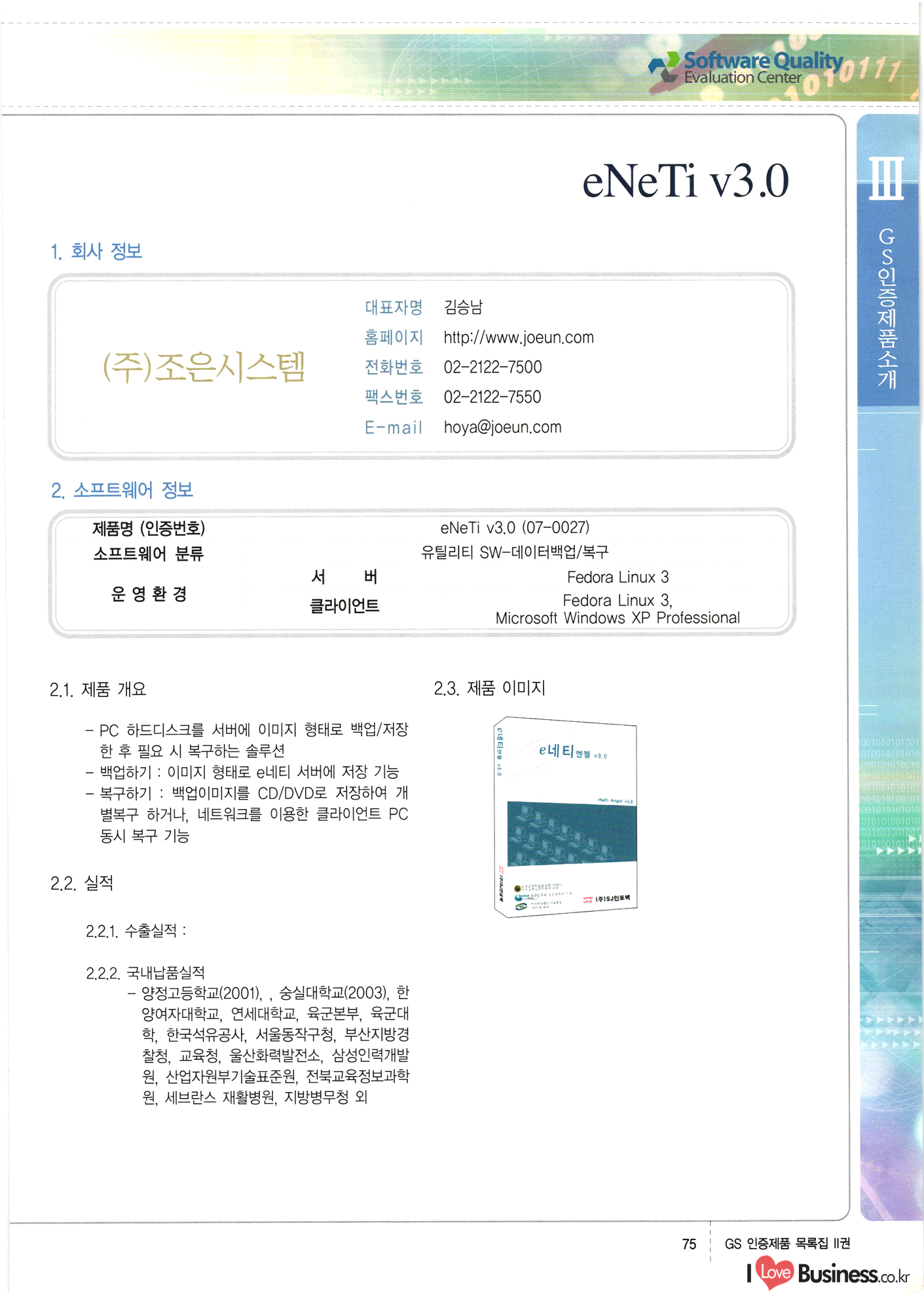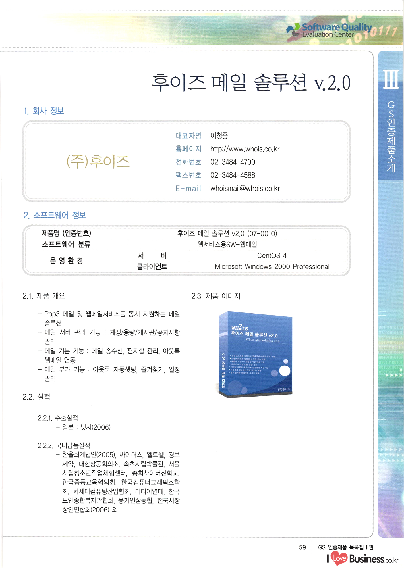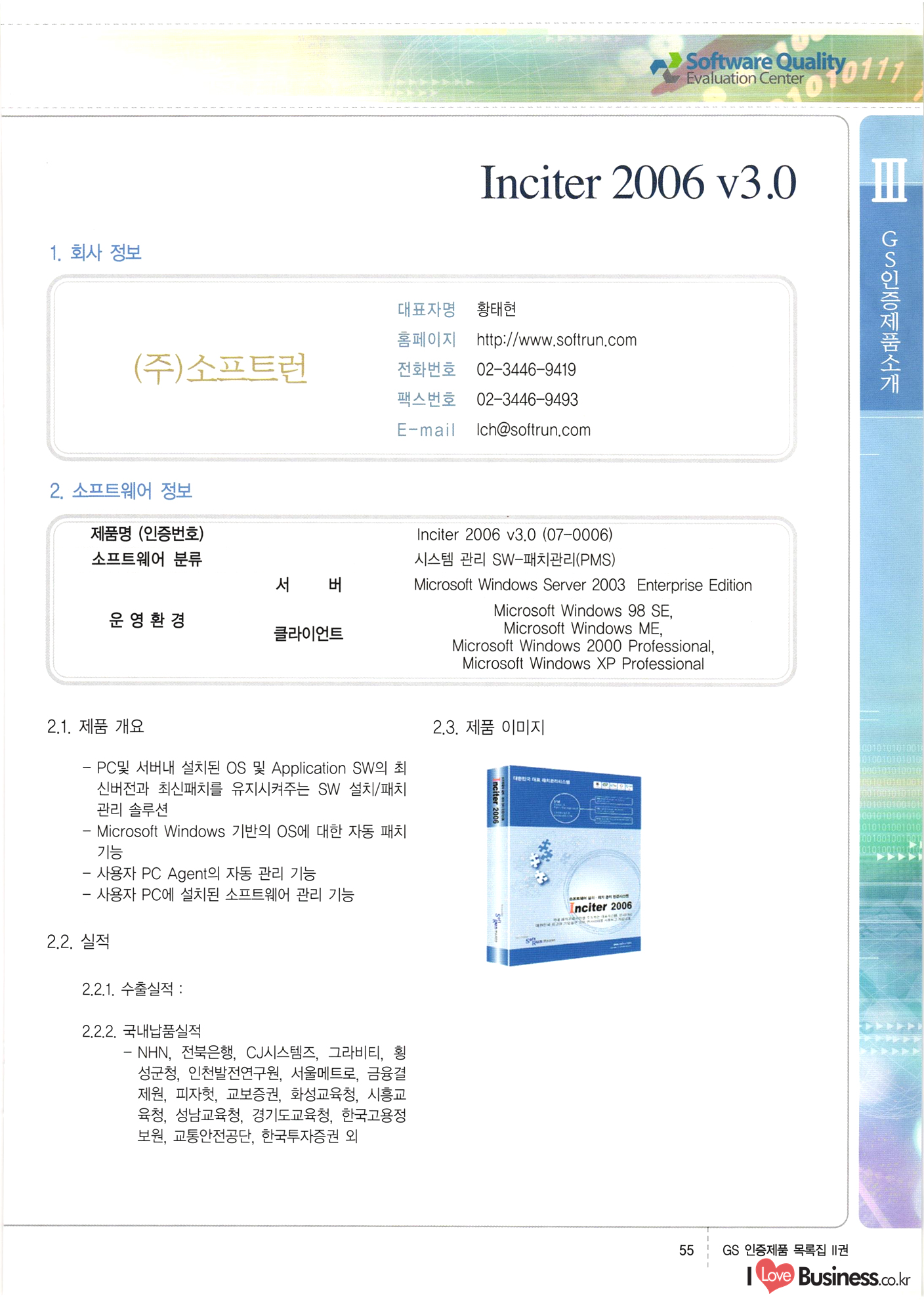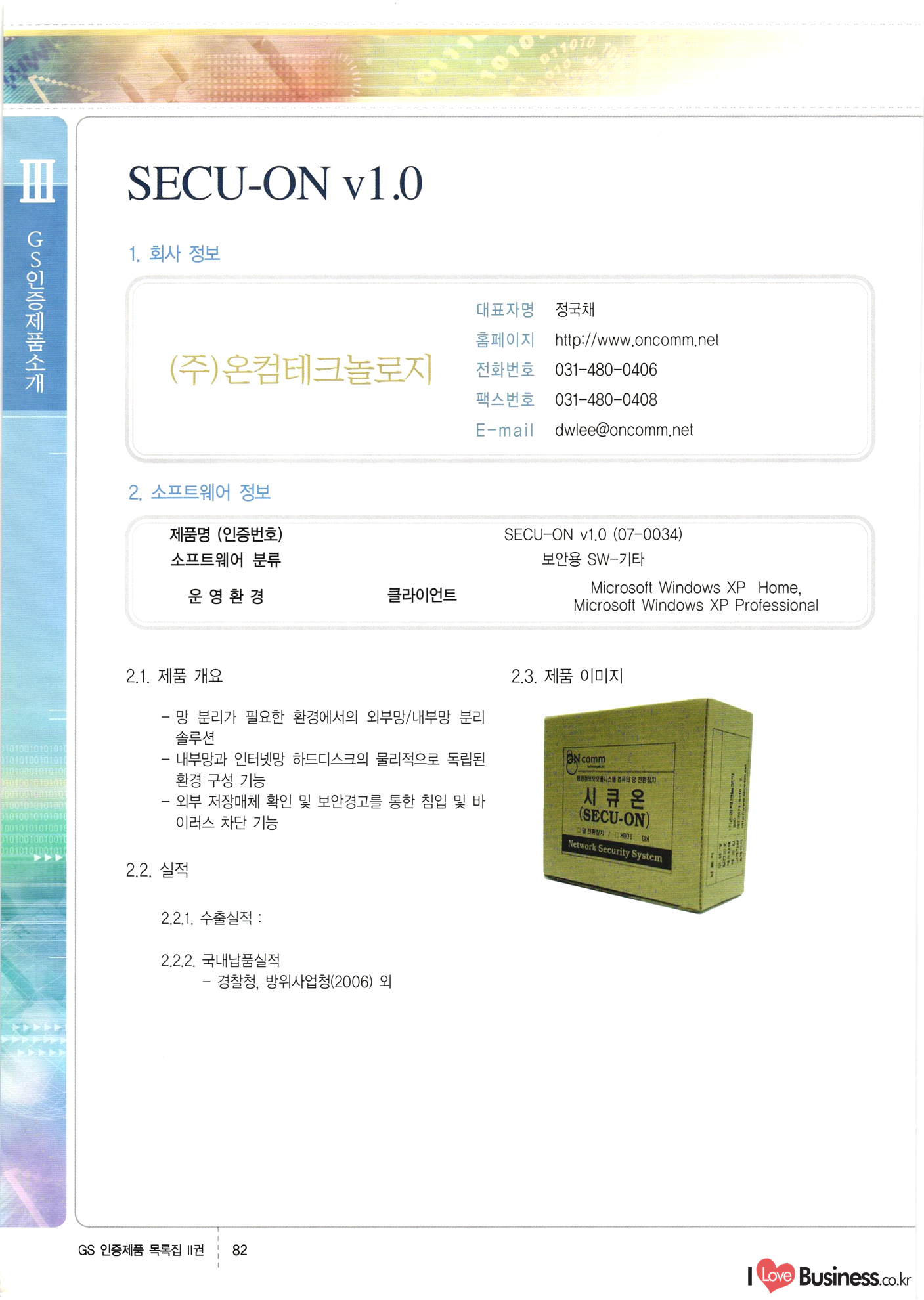 | III. GS 인증제품 목록 | 권-페이지번호 | 권-페이지번호 VT : VeriTest 국제 인증 GS인증제품목록 회사명 삼성에스디에스(주) 제품. EasyBase v4.1 페이지 50 1 제이엔에스 3DM Survey System v1.0 2 | 51 1 (주)싸이웍스 (주)테크다임 (주)다보넷 (주)로지스인포 CyberWALL 2000 v2.16 Jword v1.5 Touchsign v 2.1 키퍼엣홈 v1.0 78 52 (주)미래에듀테크 아이버스 v1.0 53 54 55 56 57 번호 | 인증번호 | 인증일자 01-0001 | 2001.07.25 101-0002 2001.10.22 (02-0027) | 01-0003 | 2001.11.27 | 01-0004 | 2001.11.27 | 01-0005 2001.11.27 5 | 01-0006 | 2001.12.27 02-0001 (02-0029) 2002.01.29 16 | | 02-0002 1 | 2002.02.16 | 02-0003 | 2002.02.16 02-0004 2002.02.27 9 | 02-0005 | 2002.02.27 110 | | 02-0006 | 2002.03.27 11 | || 02-0007 | 2002.03.27 | 02-0008 | 2002.04.30 | 02-0009 | 2002.04.30 | 02-0010 | 2002.04.30 15. | 02-0011 | 2002.04.30 16 102-0012 | 2002.04.30 | 17 | 02-0013 | 2002.05.30 | 18 | 02-0014 | 2002.05.30 | 02-0015 2002.06.28 | 20 | 02-0016 | 2002.06.28 02-0017 1 2002.06.28 | 02-0018 1 | 2002.06.28 23 | 02-0019 | 2002.06.28 24 02-0020 | 2002.07.31 25 | 02-0021 | 2002.07.31 224 58 14 59 118 (주)마크애니 (주)핸디소프트 (주)슈퍼테크놀러지 (주)스펙트라 이래정보시스템(주) (주)컴리빙아이티 | (주)시큐브 (주)케이게이트 (주)소프트4소프트 스페이스인터네셔널(주) (주)컴리빙아이티 (주)그린벨시스템즈 닉스테크(주) 심플소프트 (주)한국데이타비즈네스 (주)테크다임 (주)수세리눅스코리아 (주)한컴리눅스 소프트온넷(주) 와우리눅스(주) 60 61 Document Safer v1.0 | BizFlow Groupware v3.21 | Eg columbus || v1.0 | | eNomix v1.0 Blue Eyes v3.0 i-Class Five v1.05 Secuve TOS WG v1.0 위즈웹3 v3.0 RESORT v1.01 CD Tower v2.0 i-Class One2one v1.05 MANTIS-Professional v1.0 | | SAFEpc v1.5 Simple Gallery v1.00 통합카드발급프로그램 v1.0 Techdigm JCalc v2.0 Suse Linux 7.1K Professional Hancom Linux OS 2.2 Professional | Z!Stream v2.0 와우리눅스 7.1 파란 Secuve TOS WG Agent (Secuve Tos WG Manager) | SMERP v1.1 상하수도범용/ZEUS v1.0 U-Solver v1.0 dDIMS v3.0 DAL v2.5 101010101 1000 101003010101 190 1001010101 21 78. 122 | UL 63 64 65 26 | VT-02-001 | 2002.08.29 (주)시큐브 224 27 1 66 67 | 28 29 130 | 02-0022 | 2002.08.30 | 02-0023 | 2002.10.31 | 02-0024 | 2002.10.31 | 02-0025 | 2002.11.27 | 02-0026 | 2002.11.27 02-0027 (01-0002) 2002.11.27 | 02-0028 (03-0021) 2002.12.09 | 대한상공회의소 한국통신데이타(주) (주)지노시스템 유니온정보시스템(주) (주) 스 68 69 | 70 311 제이엔에스 소프트(구 제이엔에스) 3DM Survey System v1.0 (주)한국지능형정보시스템 한국관(상하수도 범용/TGW) v1.00 92 GS 인증제품 목록집 1권 | 26 I Love Business.co.kr Software Quality, 111 Evaluation Center | 권-페이지번호 II권페이지번호 VT : VeriTest 국제 인증 페이지 회사명 (주)포스데이타 제품 | iSign v2.0 | GS인증제품목록 171 | 34 | 02-0029 (주)제이슨테크(구 미래에듀테크) 아이버스 v1.0 91 72 73. 74 (주)인텔리젼스웨어 (주)하나디에스디 (주)연성정보기술 (주)포스정보 (주)켈코인 (주)포스데이타 스페이스인터내셔널 연희정보통신(주) (주)뉴테크웨이브 c-napse(GSS) v1.0 Life EduBuilder v1.0 | Email+ v3.0 1 책꽃이KDC v3.1 Challenger Webzine Webschool v3.0 1 Biz Binder v1.0 CD-Tower v3.1 상하수도 범용/UFCom v1.0 | | VirusChaser v5.0 | 175 76 118. (주)웨어벨리 Orange for ORACLE v2.2 | 번호 | 인증번호 | 인증일자 | 33 |VT-02-0022002.12.12 | | 2002.12.24 (02-0001) 35 | VT-02-003 | 2002.12.30 | 36 | 03-0001 | 2003.02.28 37. 03-0002 | 2003.02.28 | 38 | 03-0003 | 2003.02.28 | 39 | 03-0004 | 2003.02.28 40 | VT-03-001 | 2003.03.10 41 | VT-03-002) 2003.03.10 1 42 | 03-0005 | 2003.04.07 43 | 03-0006 | 2003.04.07 03-0007 2003.04.30 (03-0026) | 03-0008 | 2003.04.30 45 | 03-0009 | 2003.04.30 | 03-0010 | 2003.04.30 | 47 | 03-0011 | 2003.04.30 | 48 VT-03-003 2003.05.26 49 | 03-0012 | 2003.06.05 | 50 | 03-0013 | 2003.06.05 | 51 | 03-0014 | 2003.06.05 | 52 | 03-0015 | 2003.07.10 | 53 | 03-0016 | 2003.07.10 | 54 | 03-0017 | 2003.07.10 | | 55 | 03-0018 | 2003.07.10 | 56 | 03-0019 | 2003.08.06 57 | | 03-0020 | 2003.08.06 44 1 18 46 80 81 82 83 | (주)테크다임 (주)엔지스테크널러지 삼성에스디에스(주) 삼성에스디에스(주) (주)미디어랜드 인터컴소프트웨어(주) 에스케이씨앤씨(주) 아이티로직스(주) (주)에이씨티소프트 (주)위즈북 (주)에스오엔코리아 (주)아리수미디어 한진정보통신(주) (주)인텔리전스웨어 (주)웨어밸리 (구 (주)오알솔루션즈코리아) Techdigm Office v2.0 | G-Solution Waterworks/Sewerage v1.0 | | 79 UniCITY Standard v1.0 UniCITY Enterprise v1.0 TCO!stream 2002 v4.0 | ServerGuard v3.0 | SK-UPEX v1.0 84 NexWeb v1.2 e-Library Deluxe v4.1.5 86 DL Pro v1.0 SiR v1.01 파워CD뱅크 v4.0 89 InfoMatrix v1.00 190 Bizpus v1.0 91 85 87 88 10010010101.03 1101010100101 1100100100107 58 |VT-03-004 2003.08.12 Orange for ORACLE v2.2 | 111 59 (주)티지더블유 (구 한국지능형정보시스템) 한국관(상하수도 범용/TGW) v1.0 92 93 GIS Free v1.0 DeskPlus v2.0 1 | 94 ArcCITY v1.0 110 03-0021 (02-0028) | 2003.09.04 | 60 | 03-0022 | 2003.09.30 03-0023 | 2003.09.30 03-0024 (04-0011) | 2003.09.30 | 03-0025 | 2003.09.30 03-0026 (03-0007) | 2003.10.07 63 | 03-0027 | 2003.11.12 64 | 03-0028 | 2003.11.12 622 세광정보시스템(주) 제오스페이스(주) (주)선도소프트 (구 (주)캐드랜드) 중앙항업(주) (주)웨어밸리 (구 (주)오알솔루션즈코리아) (주)우암닷컴 (주)오투라인 geoCUBE상하수도 v1.0 95 Orange for ORACLE V2.2 111 96 RAVCOMS Eyecon v4.0 오투스쿨 v2.01 97 GS 인증제품 목록집 1권 I Love Business.co.kr | 권-페이지번호 | 권 - 페이지번호 VT : VeriTest 국제 인증 번호 페이지 회사명 소프트캠프