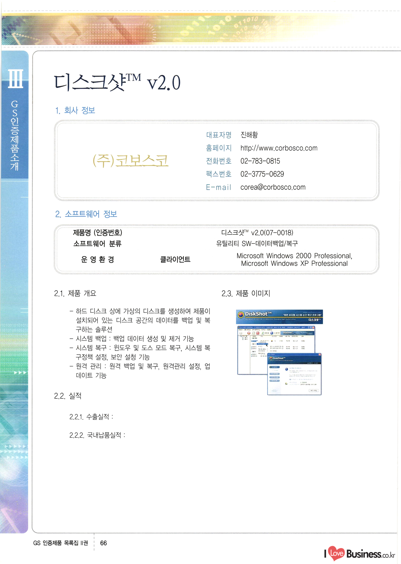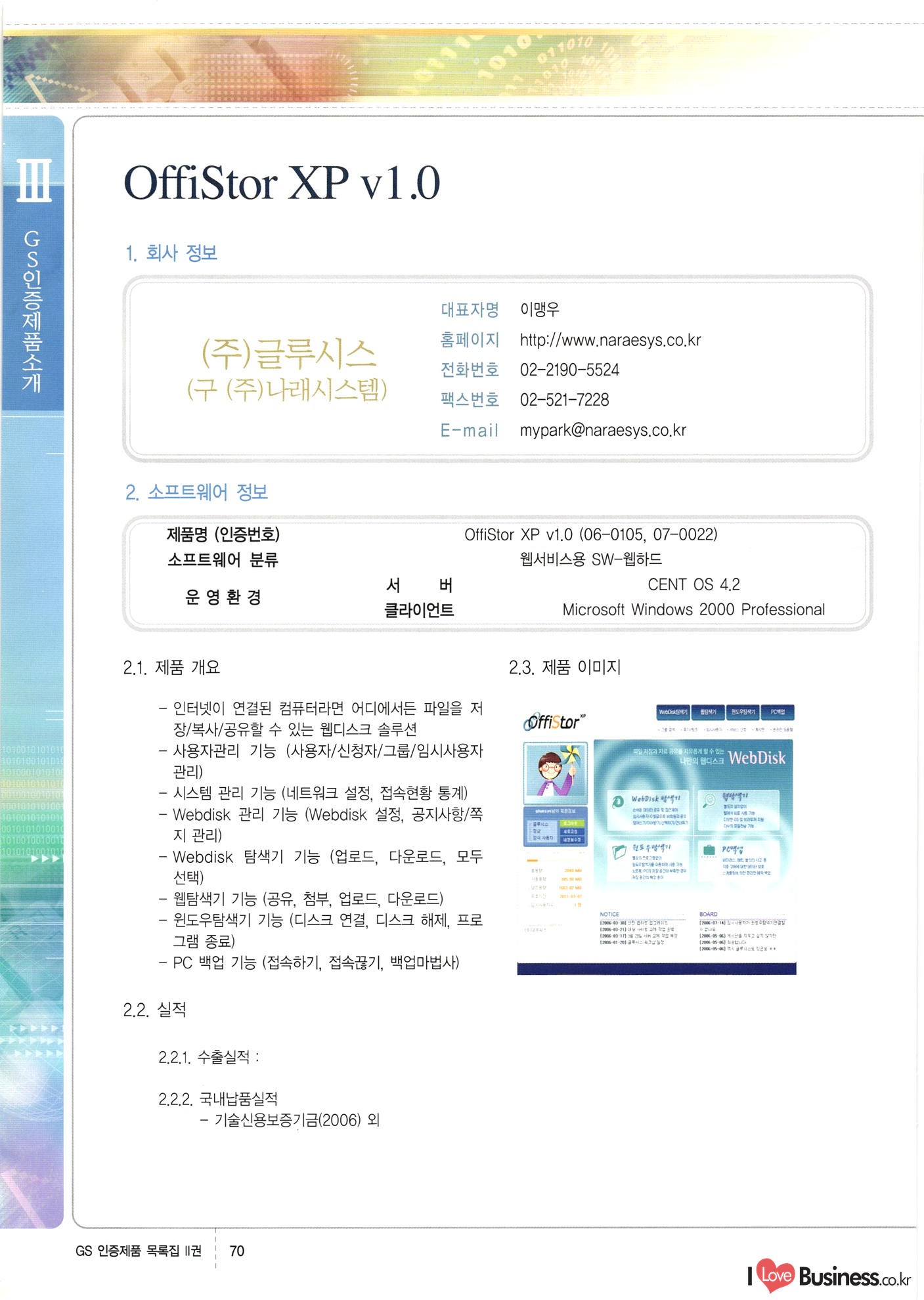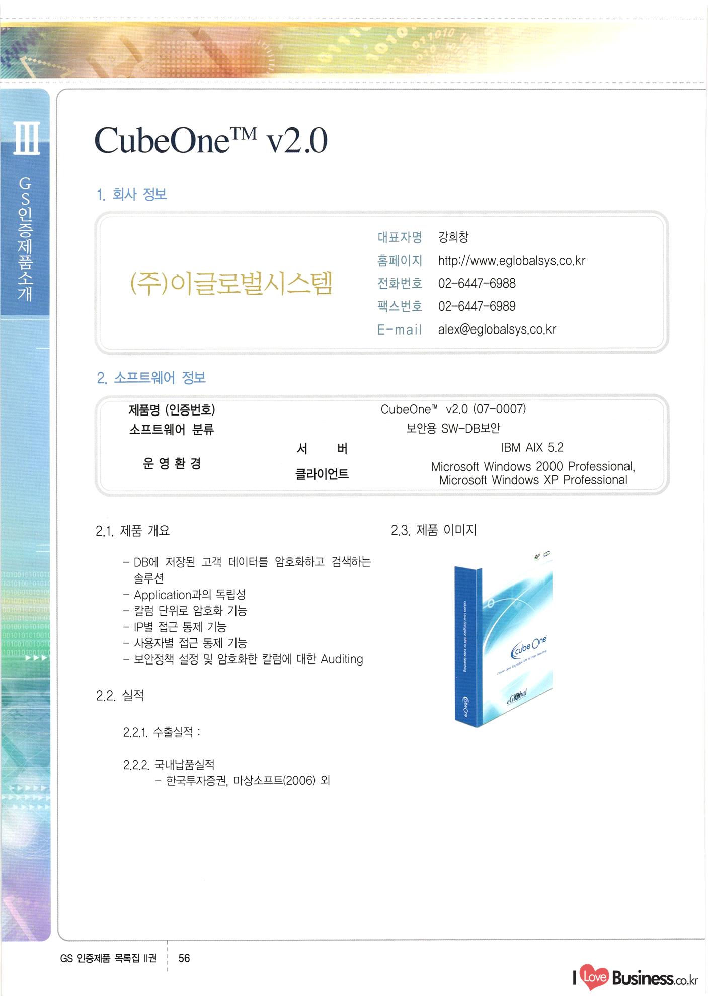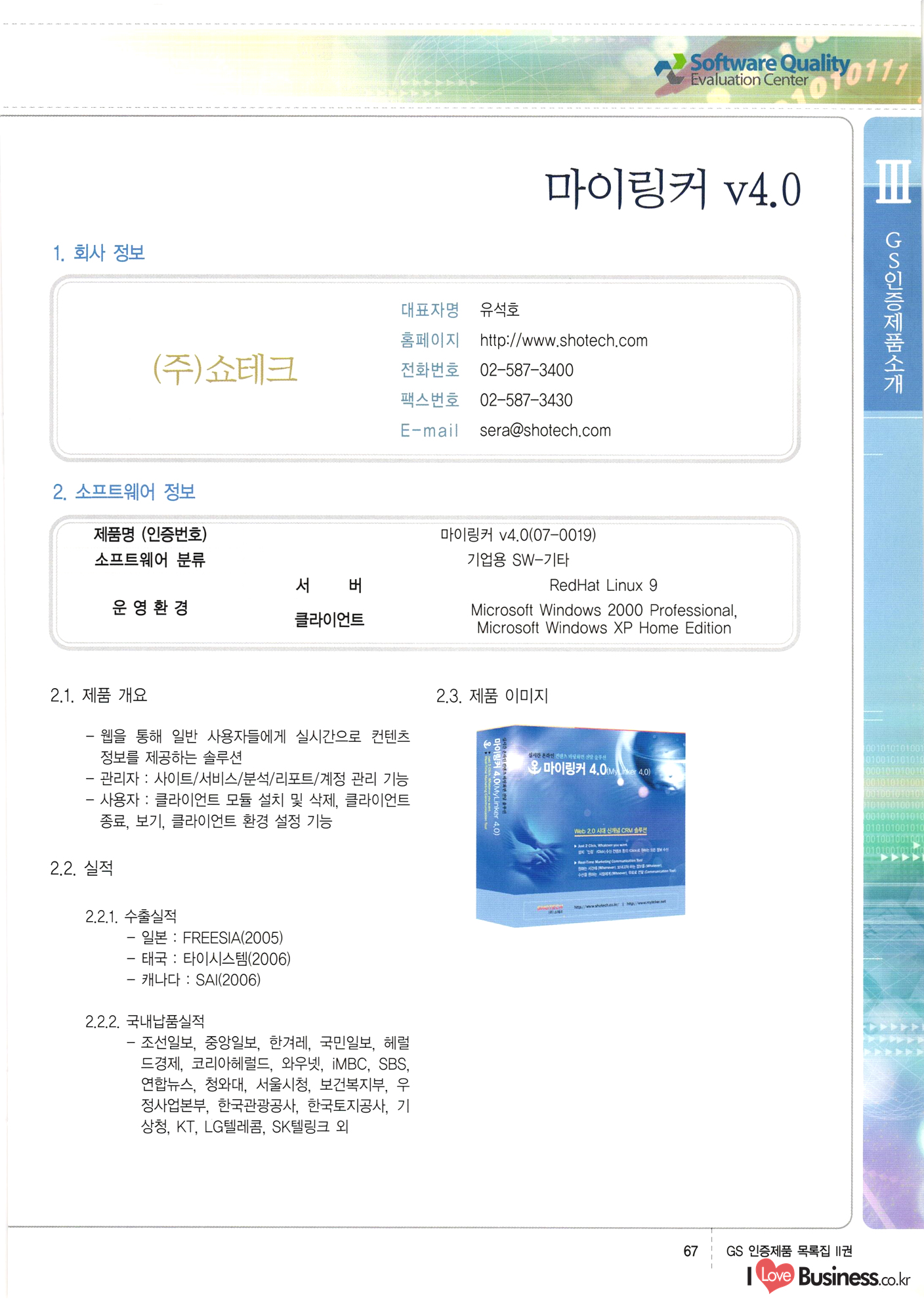 | III. GS 인증제품 목록 | 권-페이지번호 | 권-페이지번호 VT : VeriTest 국제 인증 GS인증제품목록 회사명 삼성에스디에스(주) 제품. EasyBase v4.1 페이지 50 1 제이엔에스 3DM Survey System v1.0 2 | 51 1 (주)싸이웍스 (주)테크다임 (주)다보넷 (주)로지스인포 CyberWALL 2000 v2.16 Jword v1.5 Touchsign v 2.1 키퍼엣홈 v1.0 78 52 (주)미래에듀테크 아이버스 v1.0 53 54 55 56 57 번호 | 인증번호 | 인증일자 01-0001 | 2001.07.25 101-0002 2001.10.22 (02-0027) | 01-0003 | 2001.11.27 | 01-0004 | 2001.11.27 | 01-0005 2001.11.27 5 | 01-0006 | 2001.12.27 02-0001 (02-0029) 2002.01.29 16 | | 02-0002 1 | 2002.02.16 | 02-0003 | 2002.02.16 02-0004 2002.02.27 9 | 02-0005 | 2002.02.27 110 | | 02-0006 | 2002.03.27 11 | || 02-0007 | 2002.03.27 | 02-0008 | 2002.04.30 | 02-0009 | 2002.04.30 | 02-0010 | 2002.04.30 15. | 02-0011 | 2002.04.30 16 102-0012 | 2002.04.30 | 17 | 02-0013 | 2002.05.30 | 18 | 02-0014 | 2002.05.30 | 02-0015 2002.06.28 | 20 | 02-0016 | 2002.06.28 02-0017 1 2002.06.28 | 02-0018 1 | 2002.06.28 23 | 02-0019 | 2002.06.28 24 02-0020 | 2002.07.31 25 | 02-0021 | 2002.07.31 224 58 14 59 118 (주)마크애니 (주)핸디소프트 (주)슈퍼테크놀러지 (주)스펙트라 이래정보시스템(주) (주)컴리빙아이티 | (주)시큐브 (주)케이게이트 (주)소프트4소프트 스페이스인터네셔널(주) (주)컴리빙아이티 (주)그린벨시스템즈 닉스테크(주) 심플소프트 (주)한국데이타비즈네스 (주)테크다임 (주)수세리눅스코리아 (주)한컴리눅스 소프트온넷(주) 와우리눅스(주) 60 61 Document Safer v1.0 | BizFlow Groupware v3.21 | Eg columbus || v1.0 | | eNomix v1.0 Blue Eyes v3.0 i-Class Five v1.05 Secuve TOS WG v1.0 위즈웹3 v3.0 RESORT v1.01 CD Tower v2.0 i-Class One2one v1.05 MANTIS-Professional v1.0 | | SAFEpc v1.5 Simple Gallery v1.00 통합카드발급프로그램 v1.0 Techdigm JCalc v2.0 Suse Linux 7.1K Professional Hancom Linux OS 2.2 Professional | Z!Stream v2.0 와우리눅스 7.1 파란 Secuve TOS WG Agent (Secuve Tos WG Manager) | SMERP v1.1 상하수도범용/ZEUS v1.0 U-Solver v1.0 dDIMS v3.0 DAL v2.5 101010101 1000 101003010101 190 1001010101 21 78. 122 | UL 63 64 65 26 | VT-02-001 | 2002.08.29 (주)시큐브 224 27 1 66 67 | 28 29 130 | 02-0022 | 2002.08.30 | 02-0023 | 2002.10.31 | 02-0024 | 2002.10.31 | 02-0025 | 2002.11.27 | 02-0026 | 2002.11.27 02-0027 (01-0002) 2002.11.27 | 02-0028 (03-0021) 2002.12.09 | 대한상공회의소 한국통신데이타(주) (주)지노시스템 유니온정보시스템(주) (주) 스 68 69 | 70 311 제이엔에스 소프트(구 제이엔에스) 3DM Survey System v1.0 (주)한국지능형정보시스템 한국관(상하수도 범용/TGW) v1.00 92 GS 인증제품 목록집 1권 | 26 I Love Business.co.kr Software Quality, 111 Evaluation Center | 권-페이지번호 II권페이지번호 VT : VeriTest 국제 인증 페이지 회사명 (주)포스데이타 제품 | iSign v2.0 | GS인증제품목록 171 | 34 | 02-0029 (주)제이슨테크(구 미래에듀테크) 아이버스 v1.0 91 72 73. 74 (주)인텔리젼스웨어 (주)하나디에스디 (주)연성정보기술 (주)포스정보 (주)켈코인 (주)포스데이타 스페이스인터내셔널 연희정보통신(주) (주)뉴테크웨이브 c-napse(GSS) v1.0 Life EduBuilder v1.0 | Email+ v3.0 1 책꽃이KDC v3.1 Challenger Webzine Webschool v3.0 1 Biz Binder v1.0 CD-Tower v3.1 상하수도 범용/UFCom v1.0 | | VirusChaser v5.0 | 175 76 118. (주)웨어벨리 Orange for ORACLE v2.2 | 번호 | 인증번호 | 인증일자 | 33 |VT-02-0022002.12.12 | | 2002.12.24 (02-0001) 35 | VT-02-003 | 2002.12.30 | 36 | 03-0001 | 2003.02.28 37. 03-0002 | 2003.02.28 | 38 | 03-0003 | 2003.02.28 | 39 | 03-0004 | 2003.02.28 40 | VT-03-001 | 2003.03.10 41 | VT-03-002) 2003.03.10 1 42 | 03-0005 | 2003.04.07 43 | 03-0006 | 2003.04.07 03-0007 2003.04.30 (03-0026) | 03-0008 | 2003.04.30 45 | 03-0009 | 2003.04.30 | 03-0010 | 2003.04.30 | 47 | 03-0011 | 2003.04.30 | 48 VT-03-003 2003.05.26 49 | 03-0012 | 2003.06.05 | 50 | 03-0013 | 2003.06.05 | 51 | 03-0014 | 2003.06.05 | 52 | 03-0015 | 2003.07.10 | 53 | 03-0016 | 2003.07.10 | 54 | 03-0017 | 2003.07.10 | | 55 | 03-0018 | 2003.07.10 | 56 | 03-0019 | 2003.08.06 57 | | 03-0020 | 2003.08.06 44 1 18 46 80 81 82 83 | (주)테크다임 (주)엔지스테크널러지 삼성에스디에스(주) 삼성에스디에스(주) (주)미디어랜드 인터컴소프트웨어(주) 에스케이씨앤씨(주) 아이티로직스(주) (주)에이씨티소프트 (주)위즈북 (주)에스오엔코리아 (주)아리수미디어 한진정보통신(주) (주)인텔리전스웨어 (주)웨어밸리 (구 (주)오알솔루션즈코리아) Techdigm Office v2.0 | G-Solution Waterworks/Sewerage v1.0 | | 79 UniCITY Standard v1.0 UniCITY Enterprise v1.0 TCO!stream 2002 v4.0 | ServerGuard v3.0 | SK-UPEX v1.0 84 NexWeb v1.2 e-Library Deluxe v4.1.5 86 DL Pro v1.0 SiR v1.01 파워CD뱅크 v4.0 89 InfoMatrix v1.00 190 Bizpus v1.0 91 85 87 88 10010010101.03 1101010100101 1100100100107 58 |VT-03-004 2003.08.12 Orange for ORACLE v2.2 | 111 59 (주)티지더블유 (구 한국지능형정보시스템) 한국관(상하수도 범용/TGW) v1.0 92 93 GIS Free v1.0 DeskPlus v2.0 1 | 94 ArcCITY v1.0 110 03-0021 (02-0028) | 2003.09.04 | 60 | 03-0022 | 2003.09.30 03-0023 | 2003.09.30 03-0024 (04-0011) | 2003.09.30 | 03-0025 | 2003.09.30 03-0026 (03-0007) | 2003.10.07 63 | 03-0027 | 2003.11.12 64 | 03-0028 | 2003.11.12 622 세광정보시스템(주) 제오스페이스(주) (주)선도소프트 (구 (주)캐드랜드) 중앙항업(주) (주)웨어밸리 (구 (주)오알솔루션즈코리아) (주)우암닷컴 (주)오투라인 geoCUBE상하수도 v1.0 95 Orange for ORACLE V2.2 111 96 RAVCOMS Eyecon v4.0 오투스쿨 v2.01 97 GS 인증제품 목록집 1권 I Love Business.co.kr | 권-페이지번호 | 권 - 페이지번호 VT : VeriTest 국제 인증 번호 페이지 회사명 소프트캠프