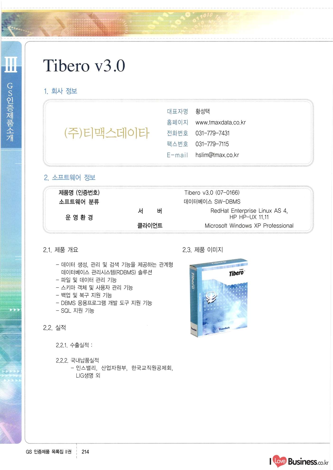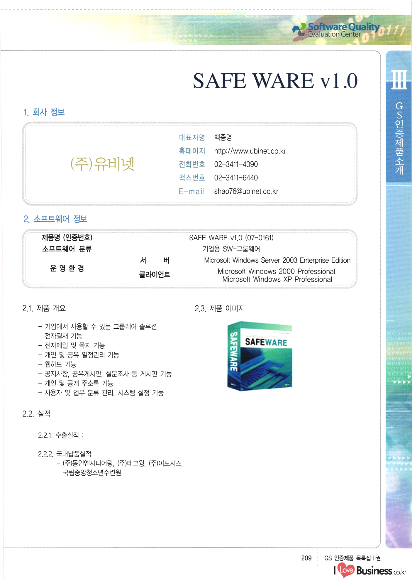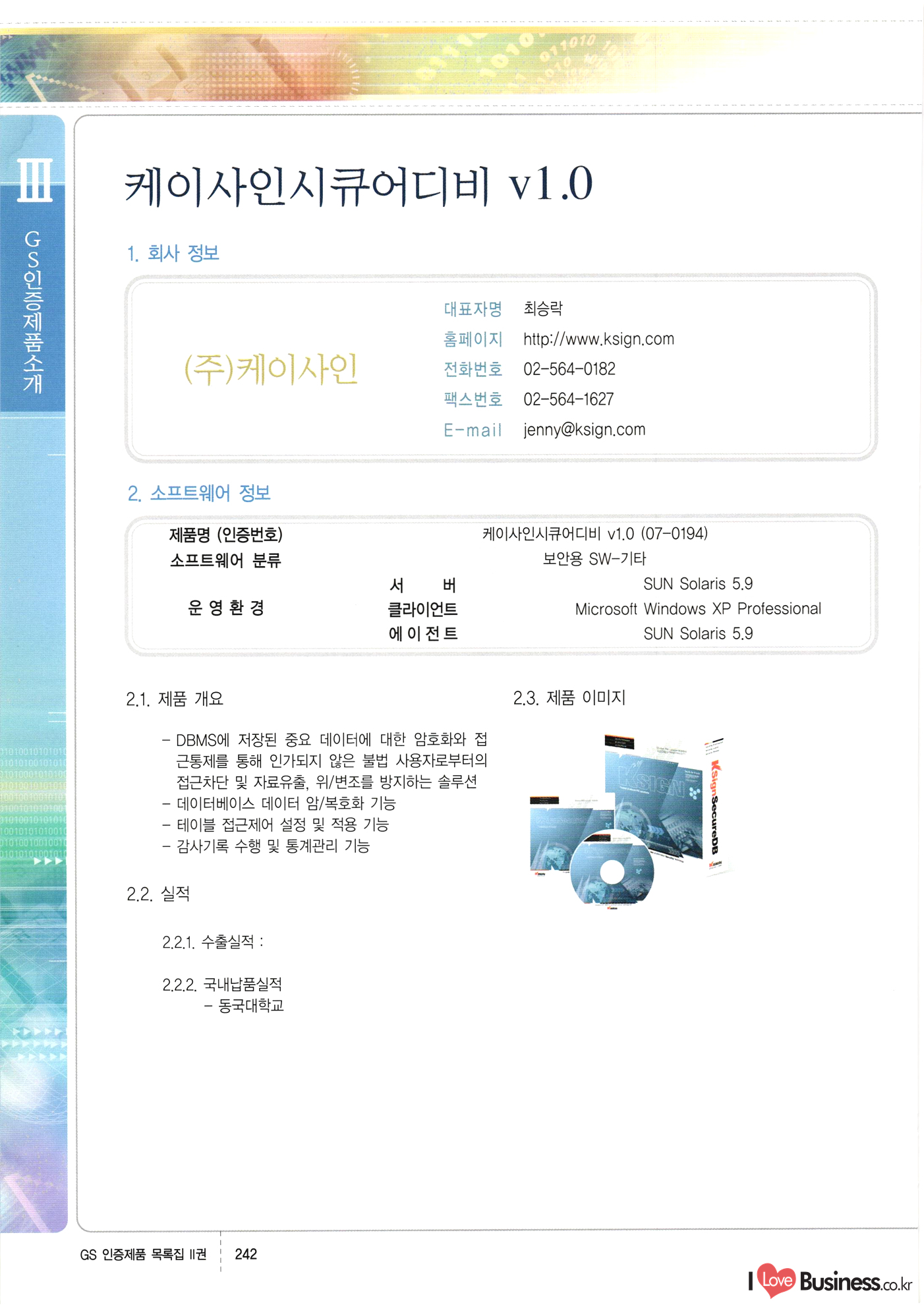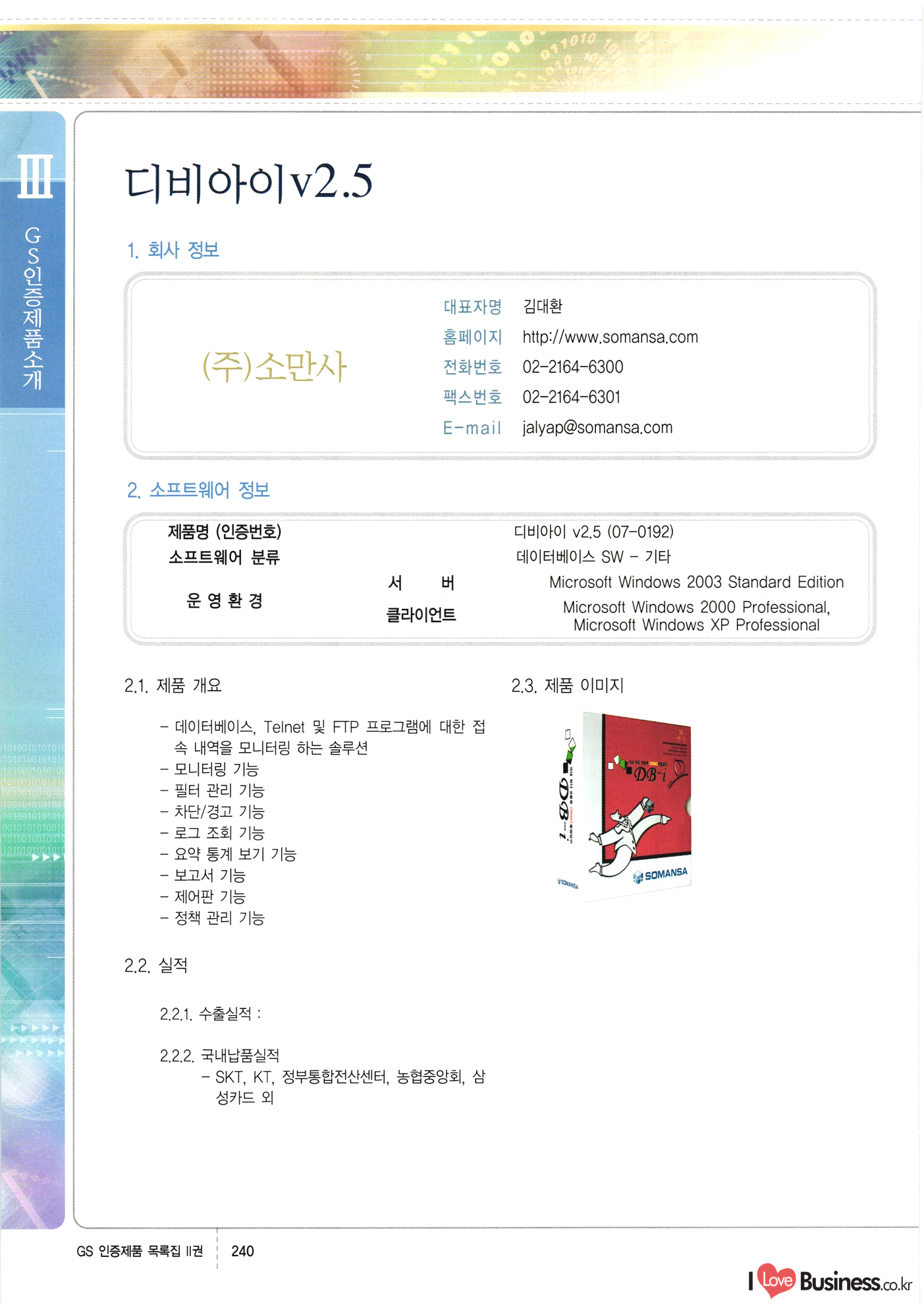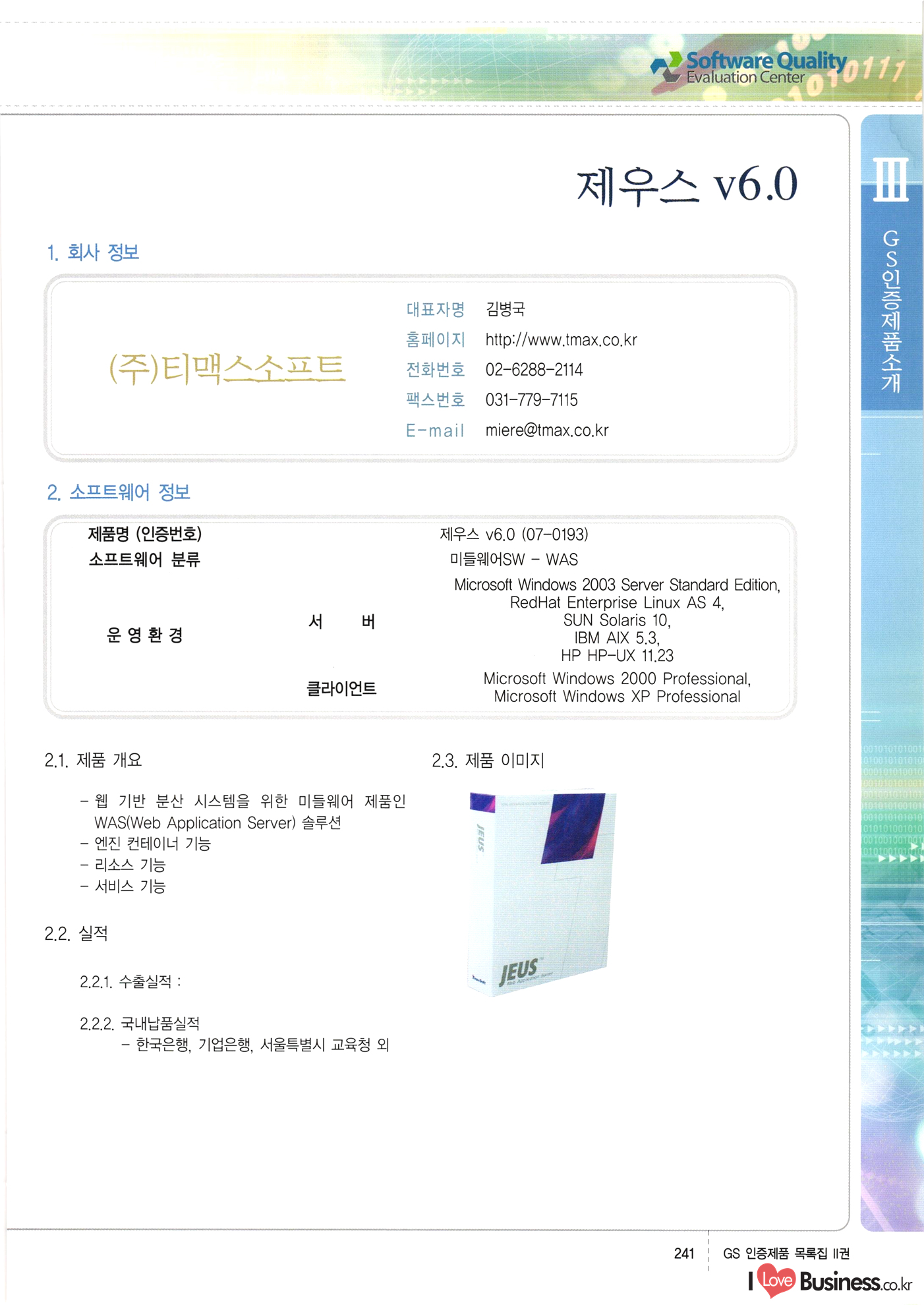 | III. GS 인증제품 목록 | 권-페이지번호 | 권-페이지번호 VT : VeriTest 국제 인증 GS인증제품목록 회사명 삼성에스디에스(주) 제품. EasyBase v4.1 페이지 50 1 제이엔에스 3DM Survey System v1.0 2 | 51 1 (주)싸이웍스 (주)테크다임 (주)다보넷 (주)로지스인포 CyberWALL 2000 v2.16 Jword v1.5 Touchsign v 2.1 키퍼엣홈 v1.0 78 52 (주)미래에듀테크 아이버스 v1.0 53 54 55 56 57 번호 | 인증번호 | 인증일자 01-0001 | 2001.07.25 101-0002 2001.10.22 (02-0027) | 01-0003 | 2001.11.27 | 01-0004 | 2001.11.27 | 01-0005 2001.11.27 5 | 01-0006 | 2001.12.27 02-0001 (02-0029) 2002.01.29 16 | | 02-0002 1 | 2002.02.16 | 02-0003 | 2002.02.16 02-0004 2002.02.27 9 | 02-0005 | 2002.02.27 110 | | 02-0006 | 2002.03.27 11 | || 02-0007 | 2002.03.27 | 02-0008 | 2002.04.30 | 02-0009 | 2002.04.30 | 02-0010 | 2002.04.30 15. | 02-0011 | 2002.04.30 16 102-0012 | 2002.04.30 | 17 | 02-0013 | 2002.05.30 | 18 | 02-0014 | 2002.05.30 | 02-0015 2002.06.28 | 20 | 02-0016 | 2002.06.28 02-0017 1 2002.06.28 | 02-0018 1 | 2002.06.28 23 | 02-0019 | 2002.06.28 24 02-0020 | 2002.07.31 25 | 02-0021 | 2002.07.31 224 58 14 59 118 (주)마크애니 (주)핸디소프트 (주)슈퍼테크놀러지 (주)스펙트라 이래정보시스템(주) (주)컴리빙아이티 | (주)시큐브 (주)케이게이트 (주)소프트4소프트 스페이스인터네셔널(주) (주)컴리빙아이티 (주)그린벨시스템즈 닉스테크(주) 심플소프트 (주)한국데이타비즈네스 (주)테크다임 (주)수세리눅스코리아 (주)한컴리눅스 소프트온넷(주) 와우리눅스(주) 60 61 Document Safer v1.0 | BizFlow Groupware v3.21 | Eg columbus || v1.0 | | eNomix v1.0 Blue Eyes v3.0 i-Class Five v1.05 Secuve TOS WG v1.0 위즈웹3 v3.0 RESORT v1.01 CD Tower v2.0 i-Class One2one v1.05 MANTIS-Professional v1.0 | | SAFEpc v1.5 Simple Gallery v1.00 통합카드발급프로그램 v1.0 Techdigm JCalc v2.0 Suse Linux 7.1K Professional Hancom Linux OS 2.2 Professional | Z!Stream v2.0 와우리눅스 7.1 파란 Secuve TOS WG Agent (Secuve Tos WG Manager) | SMERP v1.1 상하수도범용/ZEUS v1.0 U-Solver v1.0 dDIMS v3.0 DAL v2.5 101010101 1000 101003010101 190 1001010101 21 78. 122 | UL 63 64 65 26 | VT-02-001 | 2002.08.29 (주)시큐브 224 27 1 66 67 | 28 29 130 | 02-0022 | 2002.08.30 | 02-0023 | 2002.10.31 | 02-0024 | 2002.10.31 | 02-0025 | 2002.11.27 | 02-0026 | 2002.11.27 02-0027 (01-0002) 2002.11.27 | 02-0028 (03-0021) 2002.12.09 | 대한상공회의소 한국통신데이타(주) (주)지노시스템 유니온정보시스템(주) (주) 스 68 69 | 70 311 제이엔에스 소프트(구 제이엔에스) 3DM Survey System v1.0 (주)한국지능형정보시스템 한국관(상하수도 범용/TGW) v1.00 92 GS 인증제품 목록집 1권 | 26 I Love Business.co.kr Software Quality, 111 Evaluation Center | 권-페이지번호 II권페이지번호 VT : VeriTest 국제 인증 페이지 회사명 (주)포스데이타 제품 | iSign v2.0 | GS인증제품목록 171 | 34 | 02-0029 (주)제이슨테크(구 미래에듀테크) 아이버스 v1.0 91 72 73. 74 (주)인텔리젼스웨어 (주)하나디에스디 (주)연성정보기술 (주)포스정보 (주)켈코인 (주)포스데이타 스페이스인터내셔널 연희정보통신(주) (주)뉴테크웨이브 c-napse(GSS) v1.0 Life EduBuilder v1.0 | Email+ v3.0 1 책꽃이KDC v3.1 Challenger Webzine Webschool v3.0 1 Biz Binder v1.0 CD-Tower v3.1 상하수도 범용/UFCom v1.0 | | VirusChaser v5.0 | 175 76 118. (주)웨어벨리 Orange for ORACLE v2.2 | 번호 | 인증번호 | 인증일자 | 33 |VT-02-0022002.12.12 | | 2002.12.24 (02-0001) 35 | VT-02-003 | 2002.12.30 | 36 | 03-0001 | 2003.02.28 37. 03-0002 | 2003.02.28 | 38 | 03-0003 | 2003.02.28 | 39 | 03-0004 | 2003.02.28 40 | VT-03-001 | 2003.03.10 41 | VT-03-002) 2003.03.10 1 42 | 03-0005 | 2003.04.07 43 | 03-0006 | 2003.04.07 03-0007 2003.04.30 (03-0026) | 03-0008 | 2003.04.30 45 | 03-0009 | 2003.04.30 | 03-0010 | 2003.04.30 | 47 | 03-0011 | 2003.04.30 | 48 VT-03-003 2003.05.26 49 | 03-0012 | 2003.06.05 | 50 | 03-0013 | 2003.06.05 | 51 | 03-0014 | 2003.06.05 | 52 | 03-0015 | 2003.07.10 | 53 | 03-0016 | 2003.07.10 | 54 | 03-0017 | 2003.07.10 | | 55 | 03-0018 | 2003.07.10 | 56 | 03-0019 | 2003.08.06 57 | | 03-0020 | 2003.08.06 44 1 18 46 80 81 82 83 | (주)테크다임 (주)엔지스테크널러지 삼성에스디에스(주) 삼성에스디에스(주) (주)미디어랜드 인터컴소프트웨어(주) 에스케이씨앤씨(주) 아이티로직스(주) (주)에이씨티소프트 (주)위즈북 (주)에스오엔코리아 (주)아리수미디어 한진정보통신(주) (주)인텔리전스웨어 (주)웨어밸리 (구 (주)오알솔루션즈코리아) Techdigm Office v2.0 | G-Solution Waterworks/Sewerage v1.0 | | 79 UniCITY Standard v1.0 UniCITY Enterprise v1.0 TCO!stream 2002 v4.0 | ServerGuard v3.0 | SK-UPEX v1.0 84 NexWeb v1.2 e-Library Deluxe v4.1.5 86 DL Pro v1.0 SiR v1.01 파워CD뱅크 v4.0 89 InfoMatrix v1.00 190 Bizpus v1.0 91 85 87 88 10010010101.03 1101010100101 1100100100107 58 |VT-03-004 2003.08.12 Orange for ORACLE v2.2 | 111 59 (주)티지더블유 (구 한국지능형정보시스템) 한국관(상하수도 범용/TGW) v1.0 92 93 GIS Free v1.0 DeskPlus v2.0 1 | 94 ArcCITY v1.0 110 03-0021 (02-0028) | 2003.09.04 | 60 | 03-0022 | 2003.09.30 03-0023 | 2003.09.30 03-0024 (04-0011) | 2003.09.30 | 03-0025 | 2003.09.30 03-0026 (03-0007) | 2003.10.07 63 | 03-0027 | 2003.11.12 64 | 03-0028 | 2003.11.12 622 세광정보시스템(주) 제오스페이스(주) (주)선도소프트 (구 (주)캐드랜드) 중앙항업(주) (주)웨어밸리 (구 (주)오알솔루션즈코리아) (주)우암닷컴 (주)오투라인 geoCUBE상하수도 v1.0 95 Orange for ORACLE V2.2 111 96 RAVCOMS Eyecon v4.0 오투스쿨 v2.01 97 GS 인증제품 목록집 1권 I Love Business.co.kr | 권-페이지번호 | 권 - 페이지번호 VT : VeriTest 국제 인증 번호 페이지 회사명 소프트캠프