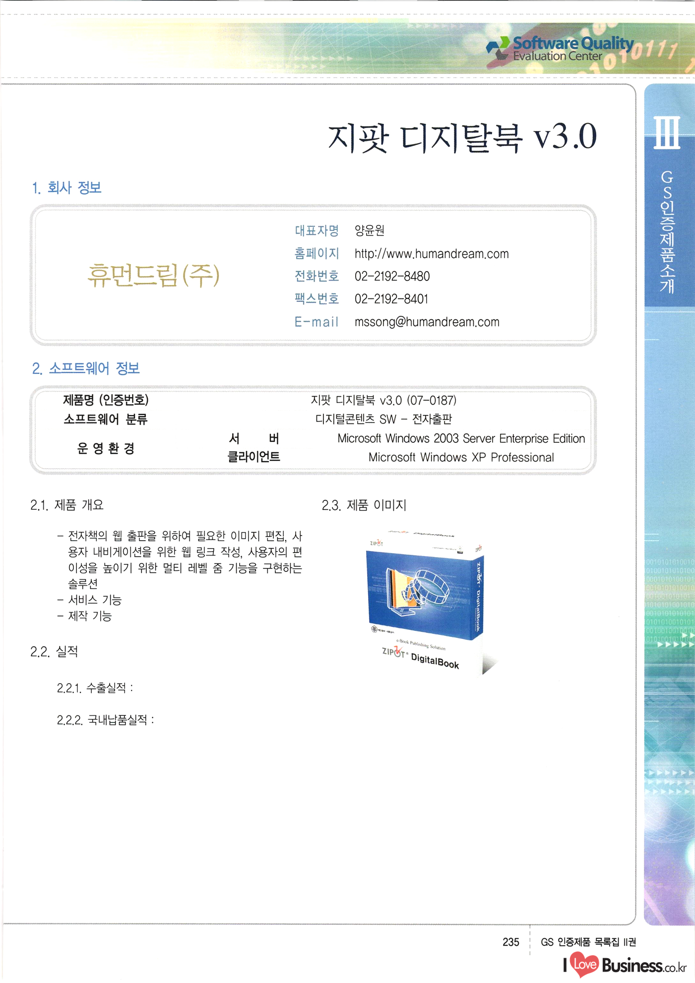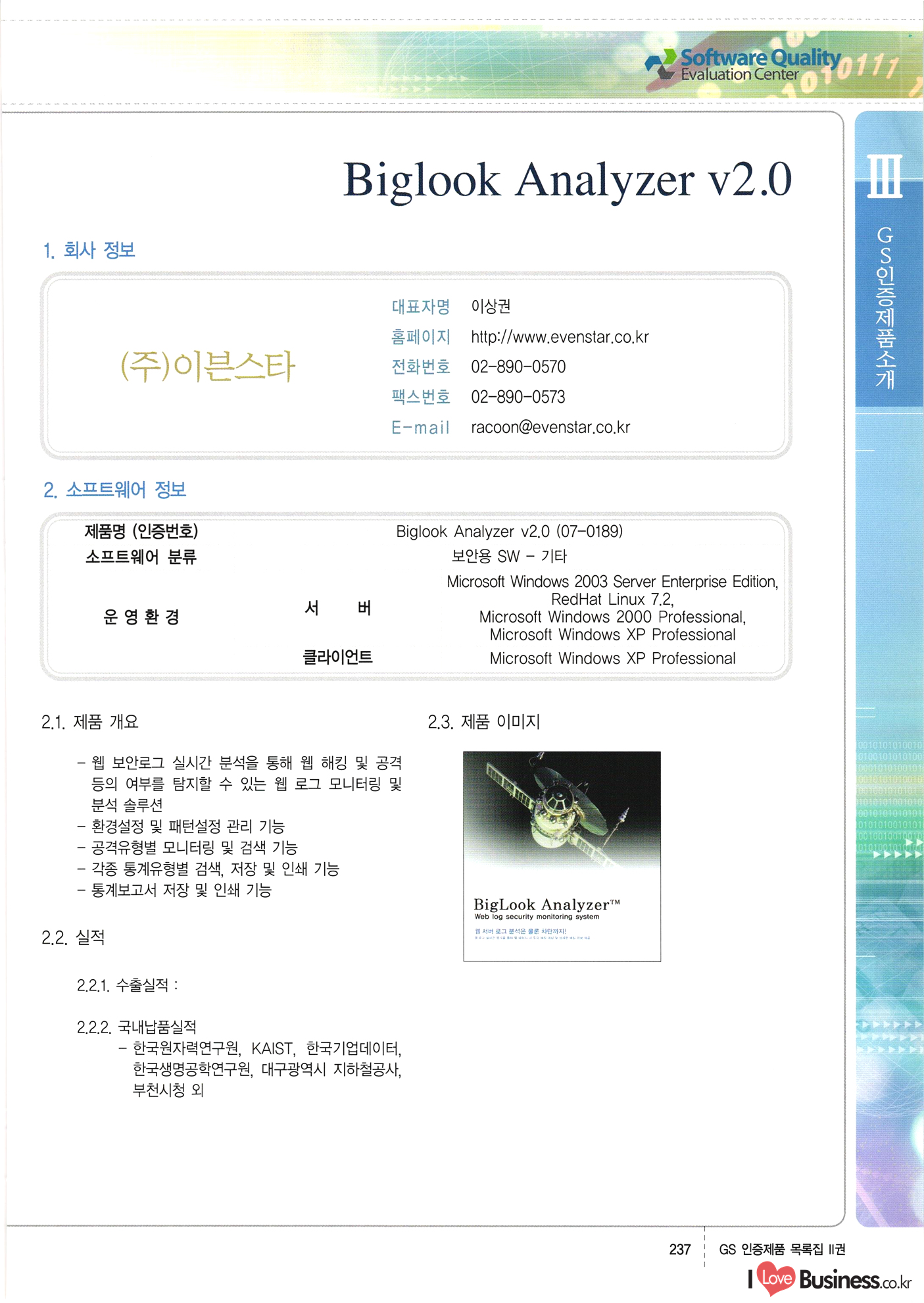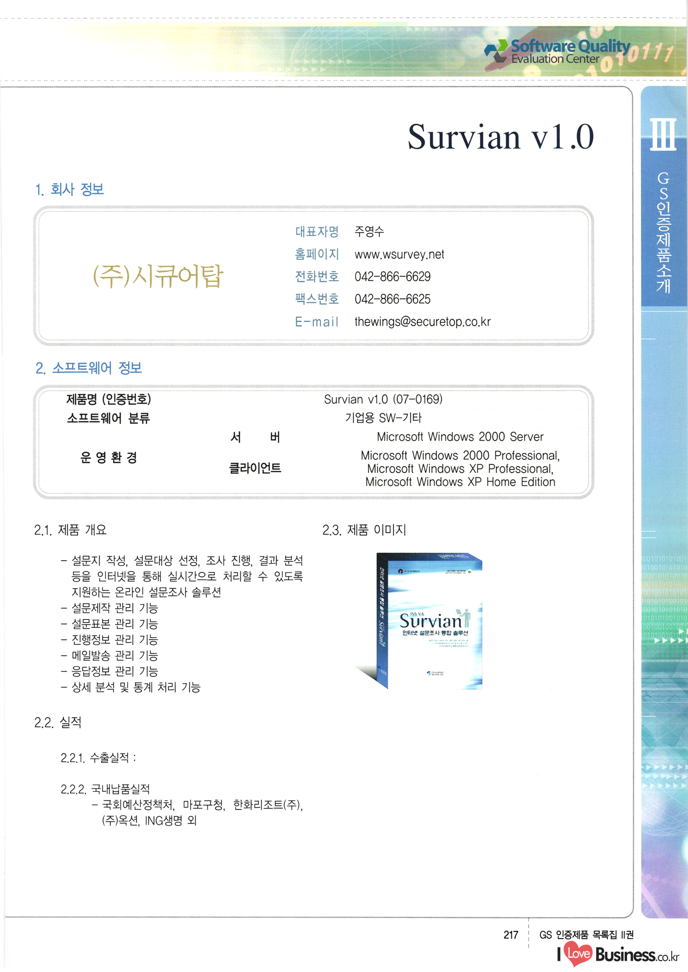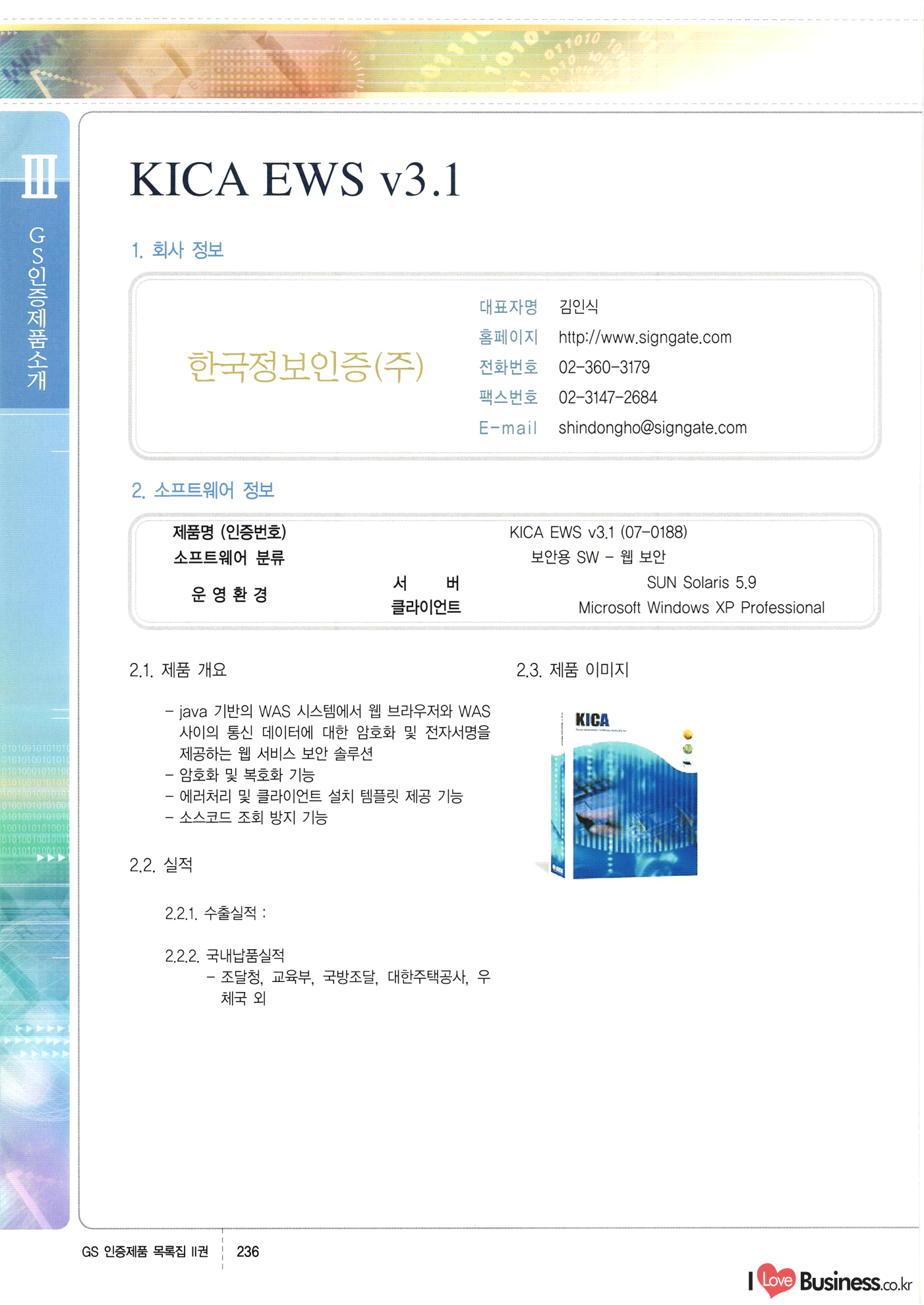 | III. GS 인증제품 목록 | 권-페이지번호 | 권-페이지번호 VT : VeriTest 국제 인증 GS인증제품목록 회사명 삼성에스디에스(주) 제품. EasyBase v4.1 페이지 50 1 제이엔에스 3DM Survey System v1.0 2 | 51 1 (주)싸이웍스 (주)테크다임 (주)다보넷 (주)로지스인포 CyberWALL 2000 v2.16 Jword v1.5 Touchsign v 2.1 키퍼엣홈 v1.0 78 52 (주)미래에듀테크 아이버스 v1.0 53 54 55 56 57 번호 | 인증번호 | 인증일자 01-0001 | 2001.07.25 101-0002 2001.10.22 (02-0027) | 01-0003 | 2001.11.27 | 01-0004 | 2001.11.27 | 01-0005 2001.11.27 5 | 01-0006 | 2001.12.27 02-0001 (02-0029) 2002.01.29 16 | | 02-0002 1 | 2002.02.16 | 02-0003 | 2002.02.16 02-0004 2002.02.27 9 | 02-0005 | 2002.02.27 110 | | 02-0006 | 2002.03.27 11 | || 02-0007 | 2002.03.27 | 02-0008 | 2002.04.30 | 02-0009 | 2002.04.30 | 02-0010 | 2002.04.30 15. | 02-0011 | 2002.04.30 16 102-0012 | 2002.04.30 | 17 | 02-0013 | 2002.05.30 | 18 | 02-0014 | 2002.05.30 | 02-0015 2002.06.28 | 20 | 02-0016 | 2002.06.28 02-0017 1 2002.06.28 | 02-0018 1 | 2002.06.28 23 | 02-0019 | 2002.06.28 24 02-0020 | 2002.07.31 25 | 02-0021 | 2002.07.31 224 58 14 59 118 (주)마크애니 (주)핸디소프트 (주)슈퍼테크놀러지 (주)스펙트라 이래정보시스템(주) (주)컴리빙아이티 | (주)시큐브 (주)케이게이트 (주)소프트4소프트 스페이스인터네셔널(주) (주)컴리빙아이티 (주)그린벨시스템즈 닉스테크(주) 심플소프트 (주)한국데이타비즈네스 (주)테크다임 (주)수세리눅스코리아 (주)한컴리눅스 소프트온넷(주) 와우리눅스(주) 60 61 Document Safer v1.0 | BizFlow Groupware v3.21 | Eg columbus || v1.0 | | eNomix v1.0 Blue Eyes v3.0 i-Class Five v1.05 Secuve TOS WG v1.0 위즈웹3 v3.0 RESORT v1.01 CD Tower v2.0 i-Class One2one v1.05 MANTIS-Professional v1.0 | | SAFEpc v1.5 Simple Gallery v1.00 통합카드발급프로그램 v1.0 Techdigm JCalc v2.0 Suse Linux 7.1K Professional Hancom Linux OS 2.2 Professional | Z!Stream v2.0 와우리눅스 7.1 파란 Secuve TOS WG Agent (Secuve Tos WG Manager) | SMERP v1.1 상하수도범용/ZEUS v1.0 U-Solver v1.0 dDIMS v3.0 DAL v2.5 101010101 1000 101003010101 190 1001010101 21 78. 122 | UL 63 64 65 26 | VT-02-001 | 2002.08.29 (주)시큐브 224 27 1 66 67 | 28 29 130 | 02-0022 | 2002.08.30 | 02-0023 | 2002.10.31 | 02-0024 | 2002.10.31 | 02-0025 | 2002.11.27 | 02-0026 | 2002.11.27 02-0027 (01-0002) 2002.11.27 | 02-0028 (03-0021) 2002.12.09 | 대한상공회의소 한국통신데이타(주) (주)지노시스템 유니온정보시스템(주) (주) 스 68 69 | 70 311 제이엔에스 소프트(구 제이엔에스) 3DM Survey System v1.0 (주)한국지능형정보시스템 한국관(상하수도 범용/TGW) v1.00 92 GS 인증제품 목록집 1권 | 26 I Love Business.co.kr Software Quality, 111 Evaluation Center | 권-페이지번호 II권페이지번호 VT : VeriTest 국제 인증 페이지 회사명 (주)포스데이타 제품 | iSign v2.0 | GS인증제품목록 171 | 34 | 02-0029 (주)제이슨테크(구 미래에듀테크) 아이버스 v1.0 91 72 73. 74 (주)인텔리젼스웨어 (주)하나디에스디 (주)연성정보기술 (주)포스정보 (주)켈코인 (주)포스데이타 스페이스인터내셔널 연희정보통신(주) (주)뉴테크웨이브 c-napse(GSS) v1.0 Life EduBuilder v1.0 | Email+ v3.0 1 책꽃이KDC v3.1 Challenger Webzine Webschool v3.0 1 Biz Binder v1.0 CD-Tower v3.1 상하수도 범용/UFCom v1.0 | | VirusChaser v5.0 | 175 76 118. (주)웨어벨리 Orange for ORACLE v2.2 | 번호 | 인증번호 | 인증일자 | 33 |VT-02-0022002.12.12 | | 2002.12.24 (02-0001) 35 | VT-02-003 | 2002.12.30 | 36 | 03-0001 | 2003.02.28 37. 03-0002 | 2003.02.28 | 38 | 03-0003 | 2003.02.28 | 39 | 03-0004 | 2003.02.28 40 | VT-03-001 | 2003.03.10 41 | VT-03-002) 2003.03.10 1 42 | 03-0005 | 2003.04.07 43 | 03-0006 | 2003.04.07 03-0007 2003.04.30 (03-0026) | 03-0008 | 2003.04.30 45 | 03-0009 | 2003.04.30 | 03-0010 | 2003.04.30 | 47 | 03-0011 | 2003.04.30 | 48 VT-03-003 2003.05.26 49 | 03-0012 | 2003.06.05 | 50 | 03-0013 | 2003.06.05 | 51 | 03-0014 | 2003.06.05 | 52 | 03-0015 | 2003.07.10 | 53 | 03-0016 | 2003.07.10 | 54 | 03-0017 | 2003.07.10 | | 55 | 03-0018 | 2003.07.10 | 56 | 03-0019 | 2003.08.06 57 | | 03-0020 | 2003.08.06 44 1 18 46 80 81 82 83 | (주)테크다임 (주)엔지스테크널러지 삼성에스디에스(주) 삼성에스디에스(주) (주)미디어랜드 인터컴소프트웨어(주) 에스케이씨앤씨(주) 아이티로직스(주) (주)에이씨티소프트 (주)위즈북 (주)에스오엔코리아 (주)아리수미디어 한진정보통신(주) (주)인텔리전스웨어 (주)웨어밸리 (구 (주)오알솔루션즈코리아) Techdigm Office v2.0 | G-Solution Waterworks/Sewerage v1.0 | | 79 UniCITY Standard v1.0 UniCITY Enterprise v1.0 TCO!stream 2002 v4.0 | ServerGuard v3.0 | SK-UPEX v1.0 84 NexWeb v1.2 e-Library Deluxe v4.1.5 86 DL Pro v1.0 SiR v1.01 파워CD뱅크 v4.0 89 InfoMatrix v1.00 190 Bizpus v1.0 91 85 87 88 10010010101.03 1101010100101 1100100100107 58 |VT-03-004 2003.08.12 Orange for ORACLE v2.2 | 111 59 (주)티지더블유 (구 한국지능형정보시스템) 한국관(상하수도 범용/TGW) v1.0 92 93 GIS Free v1.0 DeskPlus v2.0 1 | 94 ArcCITY v1.0 110 03-0021 (02-0028) | 2003.09.04 | 60 | 03-0022 | 2003.09.30 03-0023 | 2003.09.30 03-0024 (04-0011) | 2003.09.30 | 03-0025 | 2003.09.30 03-0026 (03-0007) | 2003.10.07 63 | 03-0027 | 2003.11.12 64 | 03-0028 | 2003.11.12 622 세광정보시스템(주) 제오스페이스(주) (주)선도소프트 (구 (주)캐드랜드) 중앙항업(주) (주)웨어밸리 (구 (주)오알솔루션즈코리아) (주)우암닷컴 (주)오투라인 geoCUBE상하수도 v1.0 95 Orange for ORACLE V2.2 111 96 RAVCOMS Eyecon v4.0 오투스쿨 v2.01 97 GS 인증제품 목록집 1권 I Love Business.co.kr | 권-페이지번호 | 권 - 페이지번호 VT : VeriTest 국제 인증 번호 페이지 회사명 소프트캠프