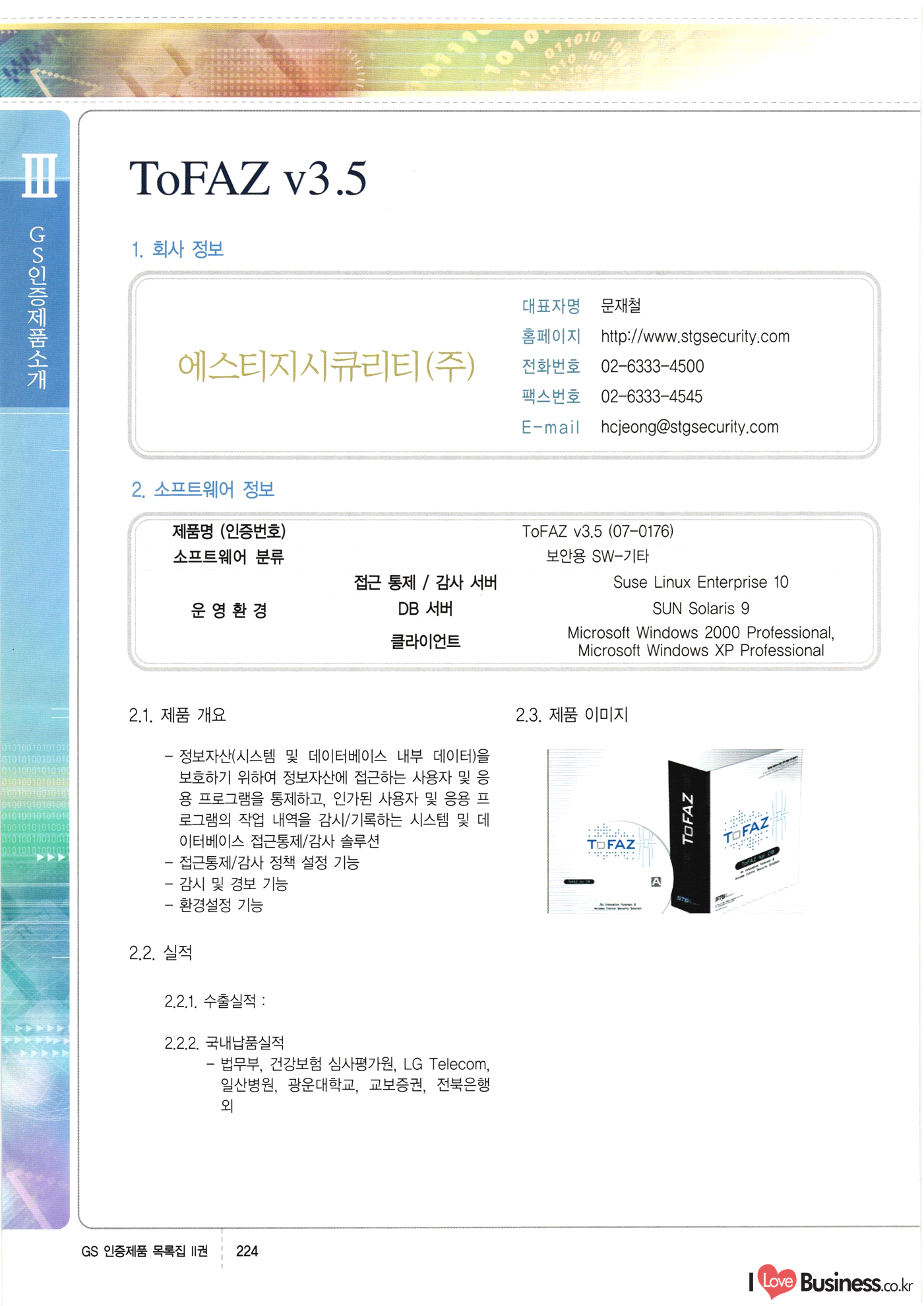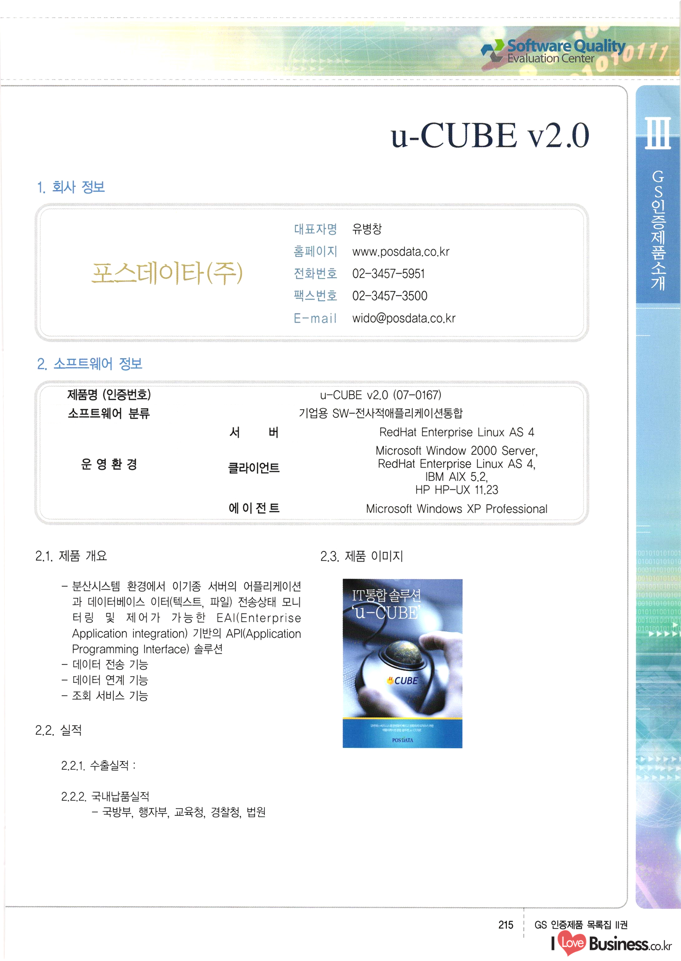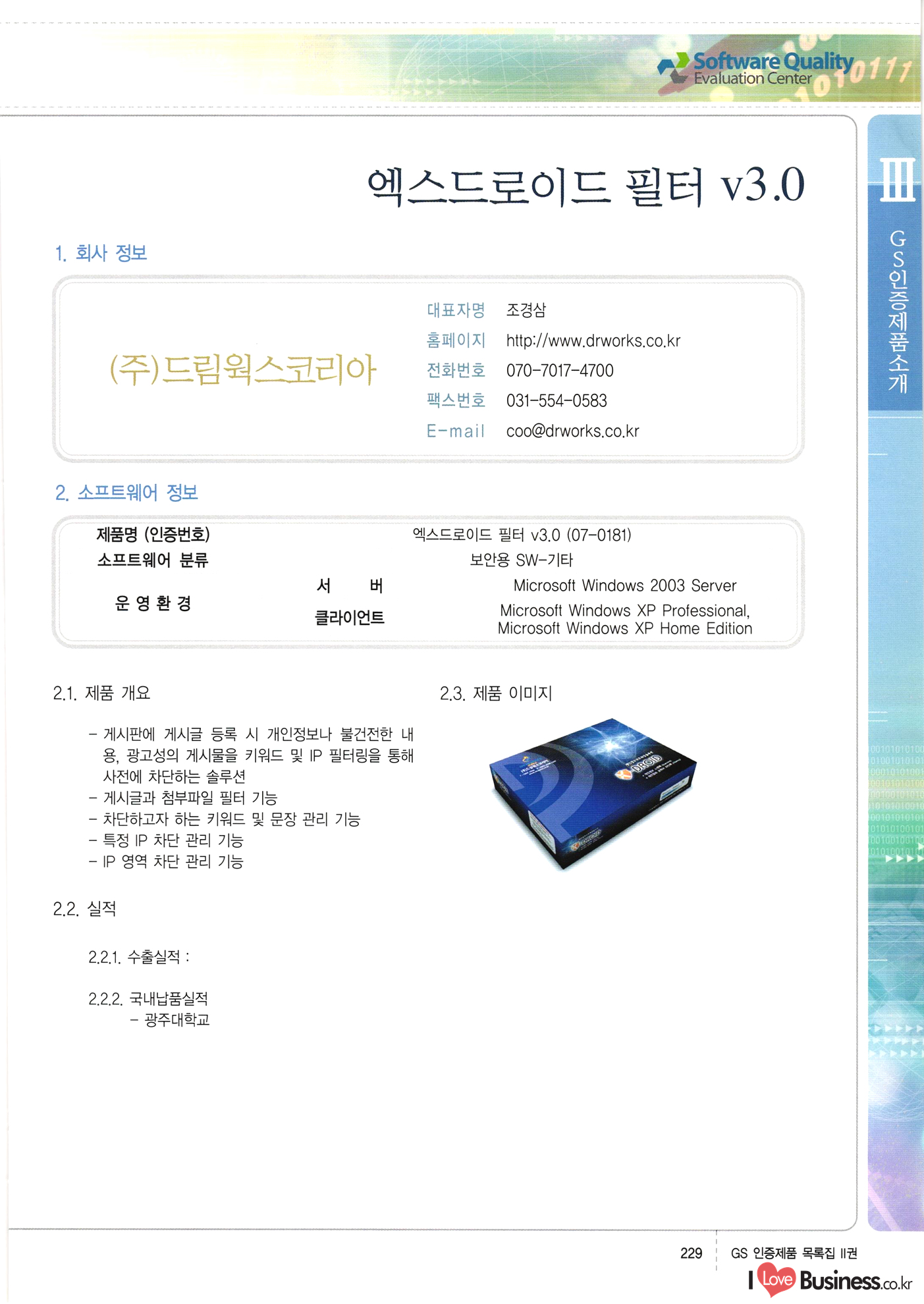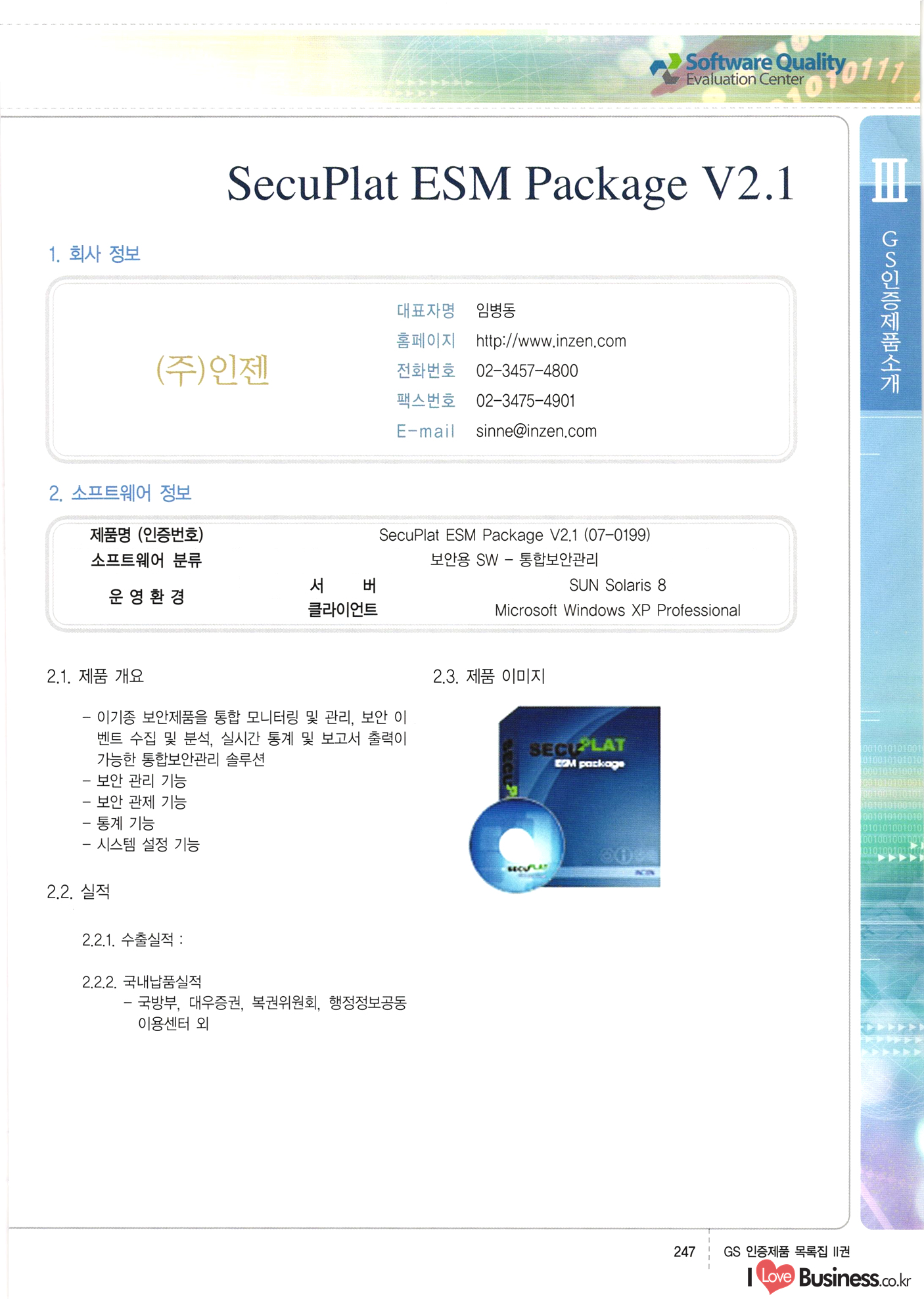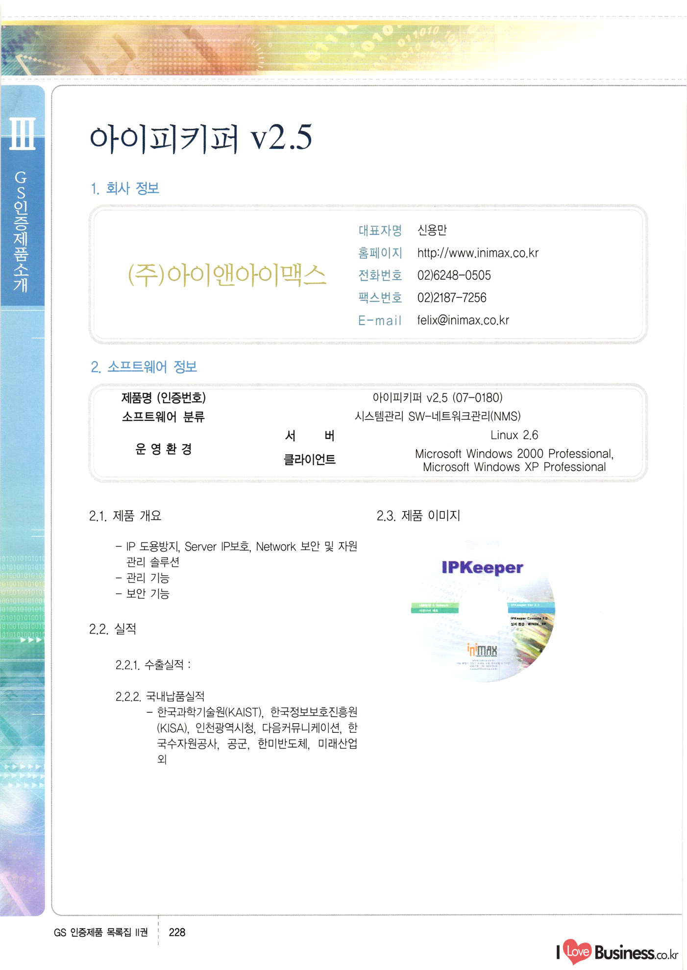 | III. GS 인증제품 목록 | 권-페이지번호 | 권-페이지번호 VT : VeriTest 국제 인증 GS인증제품목록 회사명 삼성에스디에스(주) 제품. EasyBase v4.1 페이지 50 1 제이엔에스 3DM Survey System v1.0 2 | 51 1 (주)싸이웍스 (주)테크다임 (주)다보넷 (주)로지스인포 CyberWALL 2000 v2.16 Jword v1.5 Touchsign v 2.1 키퍼엣홈 v1.0 78 52 (주)미래에듀테크 아이버스 v1.0 53 54 55 56 57 번호 | 인증번호 | 인증일자 01-0001 | 2001.07.25 101-0002 2001.10.22 (02-0027) | 01-0003 | 2001.11.27 | 01-0004 | 2001.11.27 | 01-0005 2001.11.27 5 | 01-0006 | 2001.12.27 02-0001 (02-0029) 2002.01.29 16 | | 02-0002 1 | 2002.02.16 | 02-0003 | 2002.02.16 02-0004 2002.02.27 9 | 02-0005 | 2002.02.27 110 | | 02-0006 | 2002.03.27 11 | || 02-0007 | 2002.03.27 | 02-0008 | 2002.04.30 | 02-0009 | 2002.04.30 | 02-0010 | 2002.04.30 15. | 02-0011 | 2002.04.30 16 102-0012 | 2002.04.30 | 17 | 02-0013 | 2002.05.30 | 18 | 02-0014 | 2002.05.30 | 02-0015 2002.06.28 | 20 | 02-0016 | 2002.06.28 02-0017 1 2002.06.28 | 02-0018 1 | 2002.06.28 23 | 02-0019 | 2002.06.28 24 02-0020 | 2002.07.31 25 | 02-0021 | 2002.07.31 224 58 14 59 118 (주)마크애니 (주)핸디소프트 (주)슈퍼테크놀러지 (주)스펙트라 이래정보시스템(주) (주)컴리빙아이티 | (주)시큐브 (주)케이게이트 (주)소프트4소프트 스페이스인터네셔널(주) (주)컴리빙아이티 (주)그린벨시스템즈 닉스테크(주) 심플소프트 (주)한국데이타비즈네스 (주)테크다임 (주)수세리눅스코리아 (주)한컴리눅스 소프트온넷(주) 와우리눅스(주) 60 61 Document Safer v1.0 | BizFlow Groupware v3.21 | Eg columbus || v1.0 | | eNomix v1.0 Blue Eyes v3.0 i-Class Five v1.05 Secuve TOS WG v1.0 위즈웹3 v3.0 RESORT v1.01 CD Tower v2.0 i-Class One2one v1.05 MANTIS-Professional v1.0 | | SAFEpc v1.5 Simple Gallery v1.00 통합카드발급프로그램 v1.0 Techdigm JCalc v2.0 Suse Linux 7.1K Professional Hancom Linux OS 2.2 Professional | Z!Stream v2.0 와우리눅스 7.1 파란 Secuve TOS WG Agent (Secuve Tos WG Manager) | SMERP v1.1 상하수도범용/ZEUS v1.0 U-Solver v1.0 dDIMS v3.0 DAL v2.5 101010101 1000 101003010101 190 1001010101 21 78. 122 | UL 63 64 65 26 | VT-02-001 | 2002.08.29 (주)시큐브 224 27 1 66 67 | 28 29 130 | 02-0022 | 2002.08.30 | 02-0023 | 2002.10.31 | 02-0024 | 2002.10.31 | 02-0025 | 2002.11.27 | 02-0026 | 2002.11.27 02-0027 (01-0002) 2002.11.27 | 02-0028 (03-0021) 2002.12.09 | 대한상공회의소 한국통신데이타(주) (주)지노시스템 유니온정보시스템(주) (주) 스 68 69 | 70 311 제이엔에스 소프트(구 제이엔에스) 3DM Survey System v1.0 (주)한국지능형정보시스템 한국관(상하수도 범용/TGW) v1.00 92 GS 인증제품 목록집 1권 | 26 I Love Business.co.kr Software Quality, 111 Evaluation Center | 권-페이지번호 II권페이지번호 VT : VeriTest 국제 인증 페이지 회사명 (주)포스데이타 제품 | iSign v2.0 | GS인증제품목록 171 | 34 | 02-0029 (주)제이슨테크(구 미래에듀테크) 아이버스 v1.0 91 72 73. 74 (주)인텔리젼스웨어 (주)하나디에스디 (주)연성정보기술 (주)포스정보 (주)켈코인 (주)포스데이타 스페이스인터내셔널 연희정보통신(주) (주)뉴테크웨이브 c-napse(GSS) v1.0 Life EduBuilder v1.0 | Email+ v3.0 1 책꽃이KDC v3.1 Challenger Webzine Webschool v3.0 1 Biz Binder v1.0 CD-Tower v3.1 상하수도 범용/UFCom v1.0 | | VirusChaser v5.0 | 175 76 118. (주)웨어벨리 Orange for ORACLE v2.2 | 번호 | 인증번호 | 인증일자 | 33 |VT-02-0022002.12.12 | | 2002.12.24 (02-0001) 35 | VT-02-003 | 2002.12.30 | 36 | 03-0001 | 2003.02.28 37. 03-0002 | 2003.02.28 | 38 | 03-0003 | 2003.02.28 | 39 | 03-0004 | 2003.02.28 40 | VT-03-001 | 2003.03.10 41 | VT-03-002) 2003.03.10 1 42 | 03-0005 | 2003.04.07 43 | 03-0006 | 2003.04.07 03-0007 2003.04.30 (03-0026) | 03-0008 | 2003.04.30 45 | 03-0009 | 2003.04.30 | 03-0010 | 2003.04.30 | 47 | 03-0011 | 2003.04.30 | 48 VT-03-003 2003.05.26 49 | 03-0012 | 2003.06.05 | 50 | 03-0013 | 2003.06.05 | 51 | 03-0014 | 2003.06.05 | 52 | 03-0015 | 2003.07.10 | 53 | 03-0016 | 2003.07.10 | 54 | 03-0017 | 2003.07.10 | | 55 | 03-0018 | 2003.07.10 | 56 | 03-0019 | 2003.08.06 57 | | 03-0020 | 2003.08.06 44 1 18 46 80 81 82 83 | (주)테크다임 (주)엔지스테크널러지 삼성에스디에스(주) 삼성에스디에스(주) (주)미디어랜드 인터컴소프트웨어(주) 에스케이씨앤씨(주) 아이티로직스(주) (주)에이씨티소프트 (주)위즈북 (주)에스오엔코리아 (주)아리수미디어 한진정보통신(주) (주)인텔리전스웨어 (주)웨어밸리 (구 (주)오알솔루션즈코리아) Techdigm Office v2.0 | G-Solution Waterworks/Sewerage v1.0 | | 79 UniCITY Standard v1.0 UniCITY Enterprise v1.0 TCO!stream 2002 v4.0 | ServerGuard v3.0 | SK-UPEX v1.0 84 NexWeb v1.2 e-Library Deluxe v4.1.5 86 DL Pro v1.0 SiR v1.01 파워CD뱅크 v4.0 89 InfoMatrix v1.00 190 Bizpus v1.0 91 85 87 88 10010010101.03 1101010100101 1100100100107 58 |VT-03-004 2003.08.12 Orange for ORACLE v2.2 | 111 59 (주)티지더블유 (구 한국지능형정보시스템) 한국관(상하수도 범용/TGW) v1.0 92 93 GIS Free v1.0 DeskPlus v2.0 1 | 94 ArcCITY v1.0 110 03-0021 (02-0028) | 2003.09.04 | 60 | 03-0022 | 2003.09.30 03-0023 | 2003.09.30 03-0024 (04-0011) | 2003.09.30 | 03-0025 | 2003.09.30 03-0026 (03-0007) | 2003.10.07 63 | 03-0027 | 2003.11.12 64 | 03-0028 | 2003.11.12 622 세광정보시스템(주) 제오스페이스(주) (주)선도소프트 (구 (주)캐드랜드) 중앙항업(주) (주)웨어밸리 (구 (주)오알솔루션즈코리아) (주)우암닷컴 (주)오투라인 geoCUBE상하수도 v1.0 95 Orange for ORACLE V2.2 111 96 RAVCOMS Eyecon v4.0 오투스쿨 v2.01 97 GS 인증제품 목록집 1권 I Love Business.co.kr | 권-페이지번호 | 권 - 페이지번호 VT : VeriTest 국제 인증 번호 페이지 회사명 소프트캠프