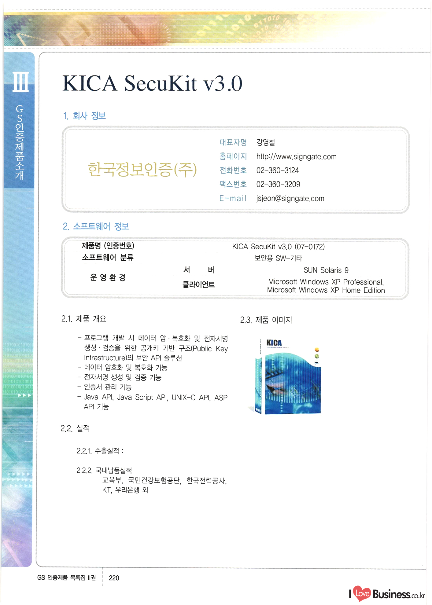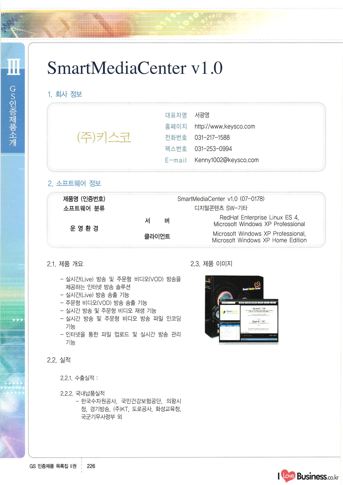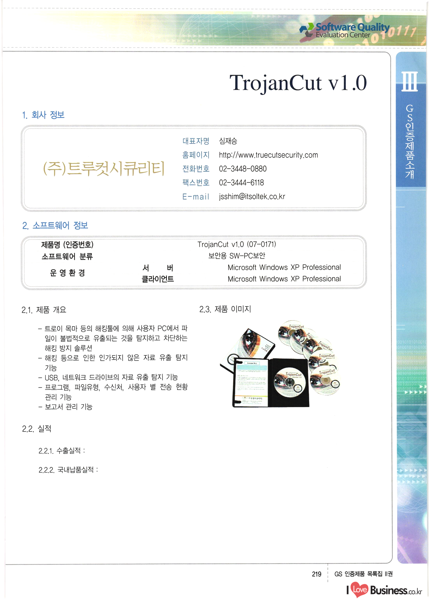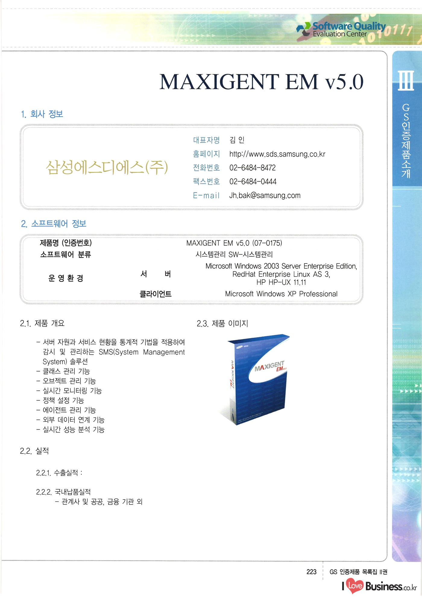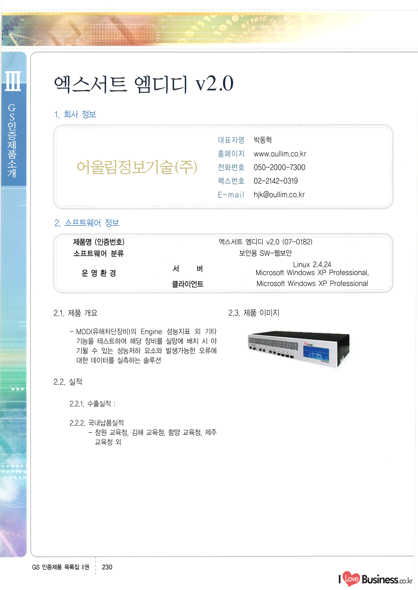 | III. GS 인증제품 목록 | 권-페이지번호 | 권-페이지번호 VT : VeriTest 국제 인증 GS인증제품목록 회사명 삼성에스디에스(주) 제품. EasyBase v4.1 페이지 50 1 제이엔에스 3DM Survey System v1.0 2 | 51 1 (주)싸이웍스 (주)테크다임 (주)다보넷 (주)로지스인포 CyberWALL 2000 v2.16 Jword v1.5 Touchsign v 2.1 키퍼엣홈 v1.0 78 52 (주)미래에듀테크 아이버스 v1.0 53 54 55 56 57 번호 | 인증번호 | 인증일자 01-0001 | 2001.07.25 101-0002 2001.10.22 (02-0027) | 01-0003 | 2001.11.27 | 01-0004 | 2001.11.27 | 01-0005 2001.11.27 5 | 01-0006 | 2001.12.27 02-0001 (02-0029) 2002.01.29 16 | | 02-0002 1 | 2002.02.16 | 02-0003 | 2002.02.16 02-0004 2002.02.27 9 | 02-0005 | 2002.02.27 110 | | 02-0006 | 2002.03.27 11 | || 02-0007 | 2002.03.27 | 02-0008 | 2002.04.30 | 02-0009 | 2002.04.30 | 02-0010 | 2002.04.30 15. | 02-0011 | 2002.04.30 16 102-0012 | 2002.04.30 | 17 | 02-0013 | 2002.05.30 | 18 | 02-0014 | 2002.05.30 | 02-0015 2002.06.28 | 20 | 02-0016 | 2002.06.28 02-0017 1 2002.06.28 | 02-0018 1 | 2002.06.28 23 | 02-0019 | 2002.06.28 24 02-0020 | 2002.07.31 25 | 02-0021 | 2002.07.31 224 58 14 59 118 (주)마크애니 (주)핸디소프트 (주)슈퍼테크놀러지 (주)스펙트라 이래정보시스템(주) (주)컴리빙아이티 | (주)시큐브 (주)케이게이트 (주)소프트4소프트 스페이스인터네셔널(주) (주)컴리빙아이티 (주)그린벨시스템즈 닉스테크(주) 심플소프트 (주)한국데이타비즈네스 (주)테크다임 (주)수세리눅스코리아 (주)한컴리눅스 소프트온넷(주) 와우리눅스(주) 60 61 Document Safer v1.0 | BizFlow Groupware v3.21 | Eg columbus || v1.0 | | eNomix v1.0 Blue Eyes v3.0 i-Class Five v1.05 Secuve TOS WG v1.0 위즈웹3 v3.0 RESORT v1.01 CD Tower v2.0 i-Class One2one v1.05 MANTIS-Professional v1.0 | | SAFEpc v1.5 Simple Gallery v1.00 통합카드발급프로그램 v1.0 Techdigm JCalc v2.0 Suse Linux 7.1K Professional Hancom Linux OS 2.2 Professional | Z!Stream v2.0 와우리눅스 7.1 파란 Secuve TOS WG Agent (Secuve Tos WG Manager) | SMERP v1.1 상하수도범용/ZEUS v1.0 U-Solver v1.0 dDIMS v3.0 DAL v2.5 101010101 1000 101003010101 190 1001010101 21 78. 122 | UL 63 64 65 26 | VT-02-001 | 2002.08.29 (주)시큐브 224 27 1 66 67 | 28 29 130 | 02-0022 | 2002.08.30 | 02-0023 | 2002.10.31 | 02-0024 | 2002.10.31 | 02-0025 | 2002.11.27 | 02-0026 | 2002.11.27 02-0027 (01-0002) 2002.11.27 | 02-0028 (03-0021) 2002.12.09 | 대한상공회의소 한국통신데이타(주) (주)지노시스템 유니온정보시스템(주) (주) 스 68 69 | 70 311 제이엔에스 소프트(구 제이엔에스) 3DM Survey System v1.0 (주)한국지능형정보시스템 한국관(상하수도 범용/TGW) v1.00 92 GS 인증제품 목록집 1권 | 26 I Love Business.co.kr Software Quality, 111 Evaluation Center | 권-페이지번호 II권페이지번호 VT : VeriTest 국제 인증 페이지 회사명 (주)포스데이타 제품 | iSign v2.0 | GS인증제품목록 171 | 34 | 02-0029 (주)제이슨테크(구 미래에듀테크) 아이버스 v1.0 91 72 73. 74 (주)인텔리젼스웨어 (주)하나디에스디 (주)연성정보기술 (주)포스정보 (주)켈코인 (주)포스데이타 스페이스인터내셔널 연희정보통신(주) (주)뉴테크웨이브 c-napse(GSS) v1.0 Life EduBuilder v1.0 | Email+ v3.0 1 책꽃이KDC v3.1 Challenger Webzine Webschool v3.0 1 Biz Binder v1.0 CD-Tower v3.1 상하수도 범용/UFCom v1.0 | | VirusChaser v5.0 | 175 76 118. (주)웨어벨리 Orange for ORACLE v2.2 | 번호 | 인증번호 | 인증일자 | 33 |VT-02-0022002.12.12 | | 2002.12.24 (02-0001) 35 | VT-02-003 | 2002.12.30 | 36 | 03-0001 | 2003.02.28 37. 03-0002 | 2003.02.28 | 38 | 03-0003 | 2003.02.28 | 39 | 03-0004 | 2003.02.28 40 | VT-03-001 | 2003.03.10 41 | VT-03-002) 2003.03.10 1 42 | 03-0005 | 2003.04.07 43 | 03-0006 | 2003.04.07 03-0007 2003.04.30 (03-0026) | 03-0008 | 2003.04.30 45 | 03-0009 | 2003.04.30 | 03-0010 | 2003.04.30 | 47 | 03-0011 | 2003.04.30 | 48 VT-03-003 2003.05.26 49 | 03-0012 | 2003.06.05 | 50 | 03-0013 | 2003.06.05 | 51 | 03-0014 | 2003.06.05 | 52 | 03-0015 | 2003.07.10 | 53 | 03-0016 | 2003.07.10 | 54 | 03-0017 | 2003.07.10 | | 55 | 03-0018 | 2003.07.10 | 56 | 03-0019 | 2003.08.06 57 | | 03-0020 | 2003.08.06 44 1 18 46 80 81 82 83 | (주)테크다임 (주)엔지스테크널러지 삼성에스디에스(주) 삼성에스디에스(주) (주)미디어랜드 인터컴소프트웨어(주) 에스케이씨앤씨(주) 아이티로직스(주) (주)에이씨티소프트 (주)위즈북 (주)에스오엔코리아 (주)아리수미디어 한진정보통신(주) (주)인텔리전스웨어 (주)웨어밸리 (구 (주)오알솔루션즈코리아) Techdigm Office v2.0 | G-Solution Waterworks/Sewerage v1.0 | | 79 UniCITY Standard v1.0 UniCITY Enterprise v1.0 TCO!stream 2002 v4.0 | ServerGuard v3.0 | SK-UPEX v1.0 84 NexWeb v1.2 e-Library Deluxe v4.1.5 86 DL Pro v1.0 SiR v1.01 파워CD뱅크 v4.0 89 InfoMatrix v1.00 190 Bizpus v1.0 91 85 87 88 10010010101.03 1101010100101 1100100100107 58 |VT-03-004 2003.08.12 Orange for ORACLE v2.2 | 111 59 (주)티지더블유 (구 한국지능형정보시스템) 한국관(상하수도 범용/TGW) v1.0 92 93 GIS Free v1.0 DeskPlus v2.0 1 | 94 ArcCITY v1.0 110 03-0021 (02-0028) | 2003.09.04 | 60 | 03-0022 | 2003.09.30 03-0023 | 2003.09.30 03-0024 (04-0011) | 2003.09.30 | 03-0025 | 2003.09.30 03-0026 (03-0007) | 2003.10.07 63 | 03-0027 | 2003.11.12 64 | 03-0028 | 2003.11.12 622 세광정보시스템(주) 제오스페이스(주) (주)선도소프트 (구 (주)캐드랜드) 중앙항업(주) (주)웨어밸리 (구 (주)오알솔루션즈코리아) (주)우암닷컴 (주)오투라인 geoCUBE상하수도 v1.0 95 Orange for ORACLE V2.2 111 96 RAVCOMS Eyecon v4.0 오투스쿨 v2.01 97 GS 인증제품 목록집 1권 I Love Business.co.kr | 권-페이지번호 | 권 - 페이지번호 VT : VeriTest 국제 인증 번호 페이지 회사명 소프트캠프