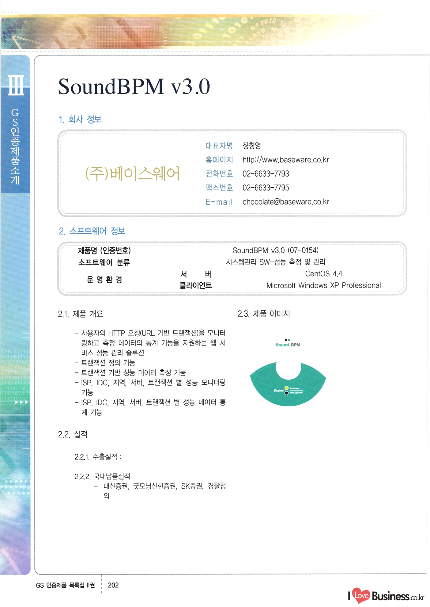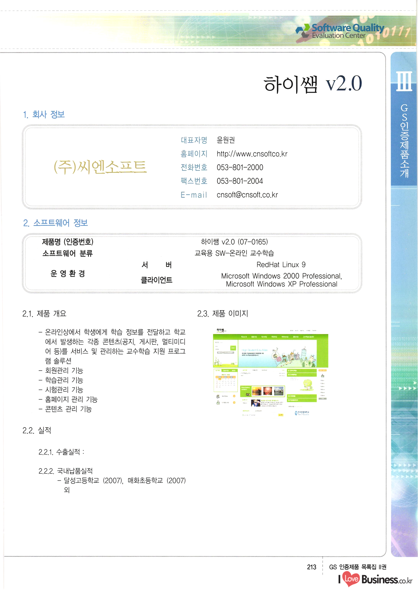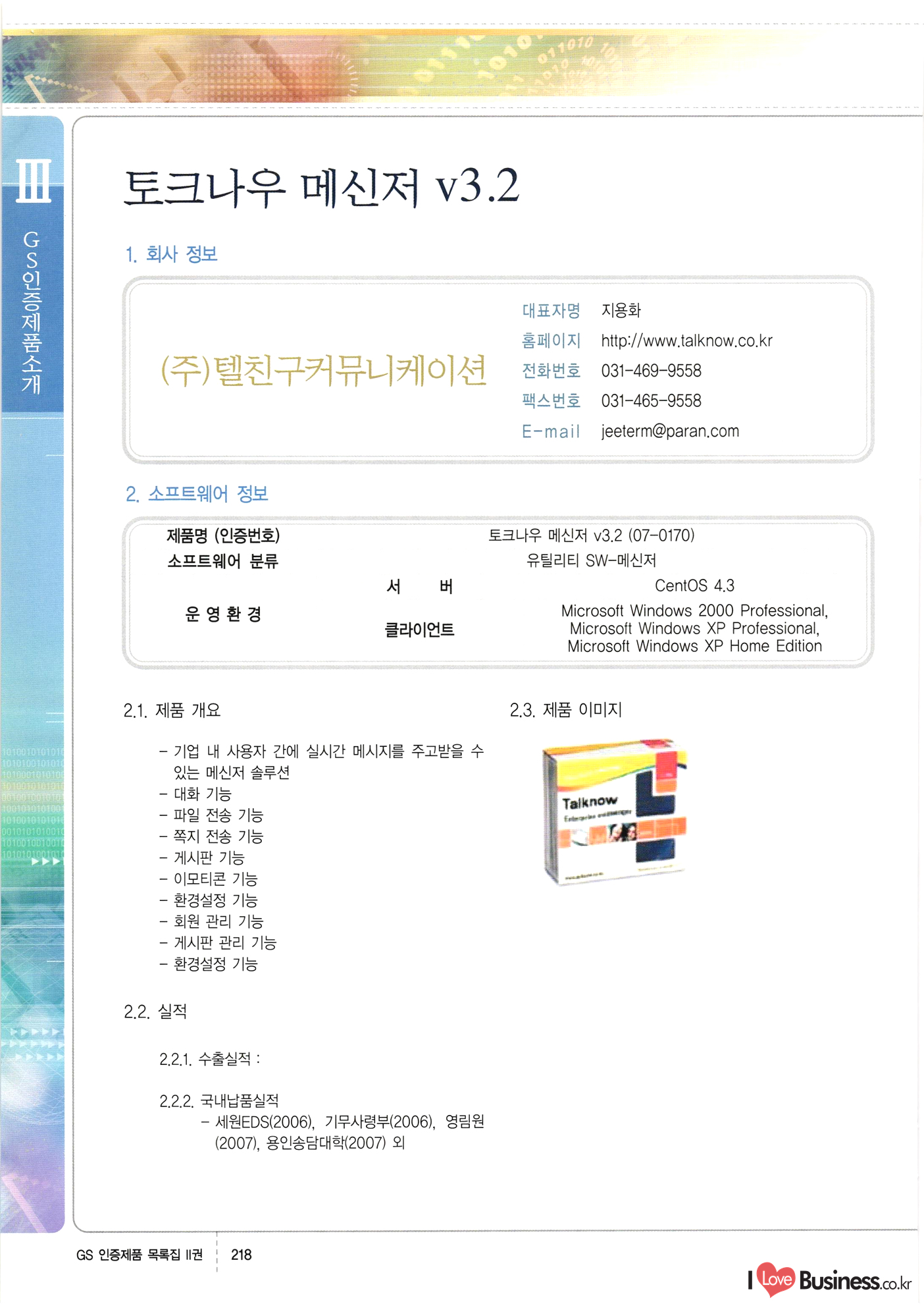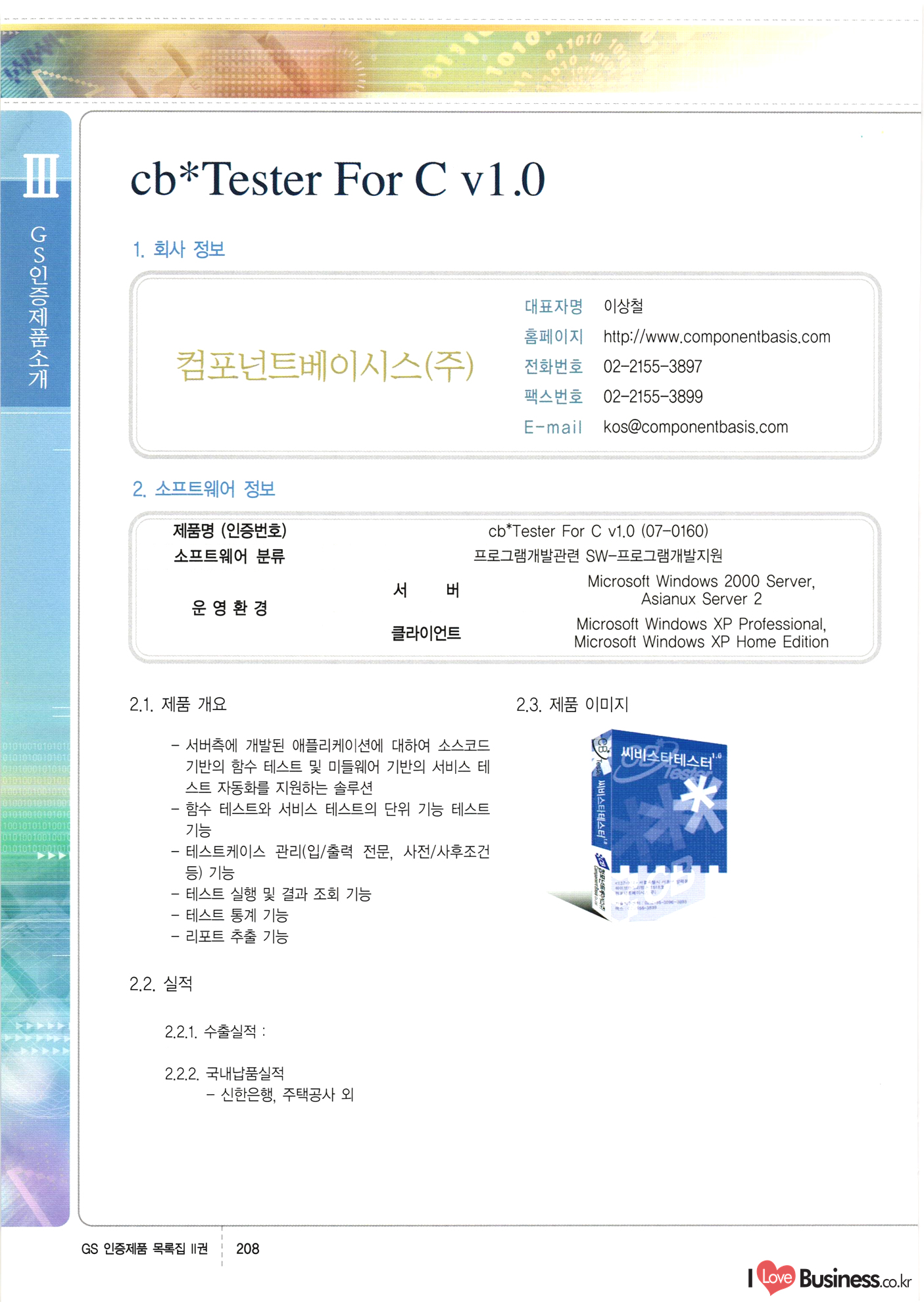 | III. GS 인증제품 목록 | 권-페이지번호 | 권-페이지번호 VT : VeriTest 국제 인증 GS인증제품목록 회사명 삼성에스디에스(주) 제품. EasyBase v4.1 페이지 50 1 제이엔에스 3DM Survey System v1.0 2 | 51 1 (주)싸이웍스 (주)테크다임 (주)다보넷 (주)로지스인포 CyberWALL 2000 v2.16 Jword v1.5 Touchsign v 2.1 키퍼엣홈 v1.0 78 52 (주)미래에듀테크 아이버스 v1.0 53 54 55 56 57 번호 | 인증번호 | 인증일자 01-0001 | 2001.07.25 101-0002 2001.10.22 (02-0027) | 01-0003 | 2001.11.27 | 01-0004 | 2001.11.27 | 01-0005 2001.11.27 5 | 01-0006 | 2001.12.27 02-0001 (02-0029) 2002.01.29 16 | | 02-0002 1 | 2002.02.16 | 02-0003 | 2002.02.16 02-0004 2002.02.27 9 | 02-0005 | 2002.02.27 110 | | 02-0006 | 2002.03.27 11 | || 02-0007 | 2002.03.27 | 02-0008 | 2002.04.30 | 02-0009 | 2002.04.30 | 02-0010 | 2002.04.30 15. | 02-0011 | 2002.04.30 16 102-0012 | 2002.04.30 | 17 | 02-0013 | 2002.05.30 | 18 | 02-0014 | 2002.05.30 | 02-0015 2002.06.28 | 20 | 02-0016 | 2002.06.28 02-0017 1 2002.06.28 | 02-0018 1 | 2002.06.28 23 | 02-0019 | 2002.06.28 24 02-0020 | 2002.07.31 25 | 02-0021 | 2002.07.31 224 58 14 59 118 (주)마크애니 (주)핸디소프트 (주)슈퍼테크놀러지 (주)스펙트라 이래정보시스템(주) (주)컴리빙아이티 | (주)시큐브 (주)케이게이트 (주)소프트4소프트 스페이스인터네셔널(주) (주)컴리빙아이티 (주)그린벨시스템즈 닉스테크(주) 심플소프트 (주)한국데이타비즈네스 (주)테크다임 (주)수세리눅스코리아 (주)한컴리눅스 소프트온넷(주) 와우리눅스(주) 60 61 Document Safer v1.0 | BizFlow Groupware v3.21 | Eg columbus || v1.0 | | eNomix v1.0 Blue Eyes v3.0 i-Class Five v1.05 Secuve TOS WG v1.0 위즈웹3 v3.0 RESORT v1.01 CD Tower v2.0 i-Class One2one v1.05 MANTIS-Professional v1.0 | | SAFEpc v1.5 Simple Gallery v1.00 통합카드발급프로그램 v1.0 Techdigm JCalc v2.0 Suse Linux 7.1K Professional Hancom Linux OS 2.2 Professional | Z!Stream v2.0 와우리눅스 7.1 파란 Secuve TOS WG Agent (Secuve Tos WG Manager) | SMERP v1.1 상하수도범용/ZEUS v1.0 U-Solver v1.0 dDIMS v3.0 DAL v2.5 101010101 1000 101003010101 190 1001010101 21 78. 122 | UL 63 64 65 26 | VT-02-001 | 2002.08.29 (주)시큐브 224 27 1 66 67 | 28 29 130 | 02-0022 | 2002.08.30 | 02-0023 | 2002.10.31 | 02-0024 | 2002.10.31 | 02-0025 | 2002.11.27 | 02-0026 | 2002.11.27 02-0027 (01-0002) 2002.11.27 | 02-0028 (03-0021) 2002.12.09 | 대한상공회의소 한국통신데이타(주) (주)지노시스템 유니온정보시스템(주) (주) 스 68 69 | 70 311 제이엔에스 소프트(구 제이엔에스) 3DM Survey System v1.0 (주)한국지능형정보시스템 한국관(상하수도 범용/TGW) v1.00 92 GS 인증제품 목록집 1권 | 26 I Love Business.co.kr Software Quality, 111 Evaluation Center | 권-페이지번호 II권페이지번호 VT : VeriTest 국제 인증 페이지 회사명 (주)포스데이타 제품 | iSign v2.0 | GS인증제품목록 171 | 34 | 02-0029 (주)제이슨테크(구 미래에듀테크) 아이버스 v1.0 91 72 73. 74 (주)인텔리젼스웨어 (주)하나디에스디 (주)연성정보기술 (주)포스정보 (주)켈코인 (주)포스데이타 스페이스인터내셔널 연희정보통신(주) (주)뉴테크웨이브 c-napse(GSS) v1.0 Life EduBuilder v1.0 | Email+ v3.0 1 책꽃이KDC v3.1 Challenger Webzine Webschool v3.0 1 Biz Binder v1.0 CD-Tower v3.1 상하수도 범용/UFCom v1.0 | | VirusChaser v5.0 | 175 76 118. (주)웨어벨리 Orange for ORACLE v2.2 | 번호 | 인증번호 | 인증일자 | 33 |VT-02-0022002.12.12 | | 2002.12.24 (02-0001) 35 | VT-02-003 | 2002.12.30 | 36 | 03-0001 | 2003.02.28 37. 03-0002 | 2003.02.28 | 38 | 03-0003 | 2003.02.28 | 39 | 03-0004 | 2003.02.28 40 | VT-03-001 | 2003.03.10 41 | VT-03-002) 2003.03.10 1 42 | 03-0005 | 2003.04.07 43 | 03-0006 | 2003.04.07 03-0007 2003.04.30 (03-0026) | 03-0008 | 2003.04.30 45 | 03-0009 | 2003.04.30 | 03-0010 | 2003.04.30 | 47 | 03-0011 | 2003.04.30 | 48 VT-03-003 2003.05.26 49 | 03-0012 | 2003.06.05 | 50 | 03-0013 | 2003.06.05 | 51 | 03-0014 | 2003.06.05 | 52 | 03-0015 | 2003.07.10 | 53 | 03-0016 | 2003.07.10 | 54 | 03-0017 | 2003.07.10 | | 55 | 03-0018 | 2003.07.10 | 56 | 03-0019 | 2003.08.06 57 | | 03-0020 | 2003.08.06 44 1 18 46 80 81 82 83 | (주)테크다임 (주)엔지스테크널러지 삼성에스디에스(주) 삼성에스디에스(주) (주)미디어랜드 인터컴소프트웨어(주) 에스케이씨앤씨(주) 아이티로직스(주) (주)에이씨티소프트 (주)위즈북 (주)에스오엔코리아 (주)아리수미디어 한진정보통신(주) (주)인텔리전스웨어 (주)웨어밸리 (구 (주)오알솔루션즈코리아) Techdigm Office v2.0 | G-Solution Waterworks/Sewerage v1.0 | | 79 UniCITY Standard v1.0 UniCITY Enterprise v1.0 TCO!stream 2002 v4.0 | ServerGuard v3.0 | SK-UPEX v1.0 84 NexWeb v1.2 e-Library Deluxe v4.1.5 86 DL Pro v1.0 SiR v1.01 파워CD뱅크 v4.0 89 InfoMatrix v1.00 190 Bizpus v1.0 91 85 87 88 10010010101.03 1101010100101 1100100100107 58 |VT-03-004 2003.08.12 Orange for ORACLE v2.2 | 111 59 (주)티지더블유 (구 한국지능형정보시스템) 한국관(상하수도 범용/TGW) v1.0 92 93 GIS Free v1.0 DeskPlus v2.0 1 | 94 ArcCITY v1.0 110 03-0021 (02-0028) | 2003.09.04 | 60 | 03-0022 | 2003.09.30 03-0023 | 2003.09.30 03-0024 (04-0011) | 2003.09.30 | 03-0025 | 2003.09.30 03-0026 (03-0007) | 2003.10.07 63 | 03-0027 | 2003.11.12 64 | 03-0028 | 2003.11.12 622 세광정보시스템(주) 제오스페이스(주) (주)선도소프트 (구 (주)캐드랜드) 중앙항업(주) (주)웨어밸리 (구 (주)오알솔루션즈코리아) (주)우암닷컴 (주)오투라인 geoCUBE상하수도 v1.0 95 Orange for ORACLE V2.2 111 96 RAVCOMS Eyecon v4.0 오투스쿨 v2.01 97 GS 인증제품 목록집 1권 I Love Business.co.kr | 권-페이지번호 | 권 - 페이지번호 VT : VeriTest 국제 인증 번호 페이지 회사명 소프트캠프