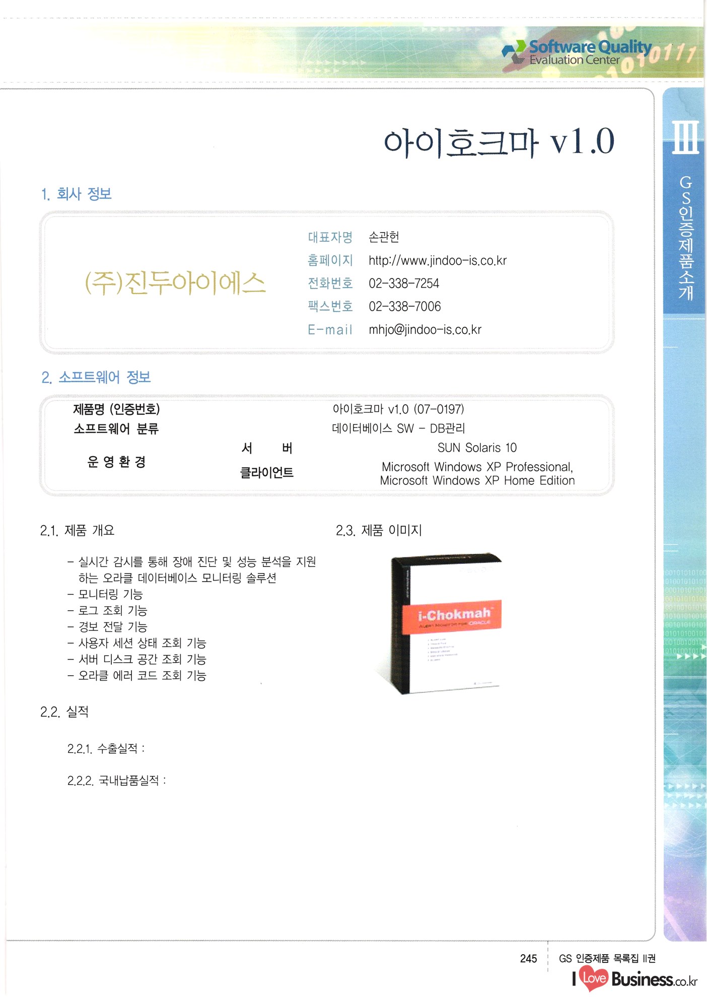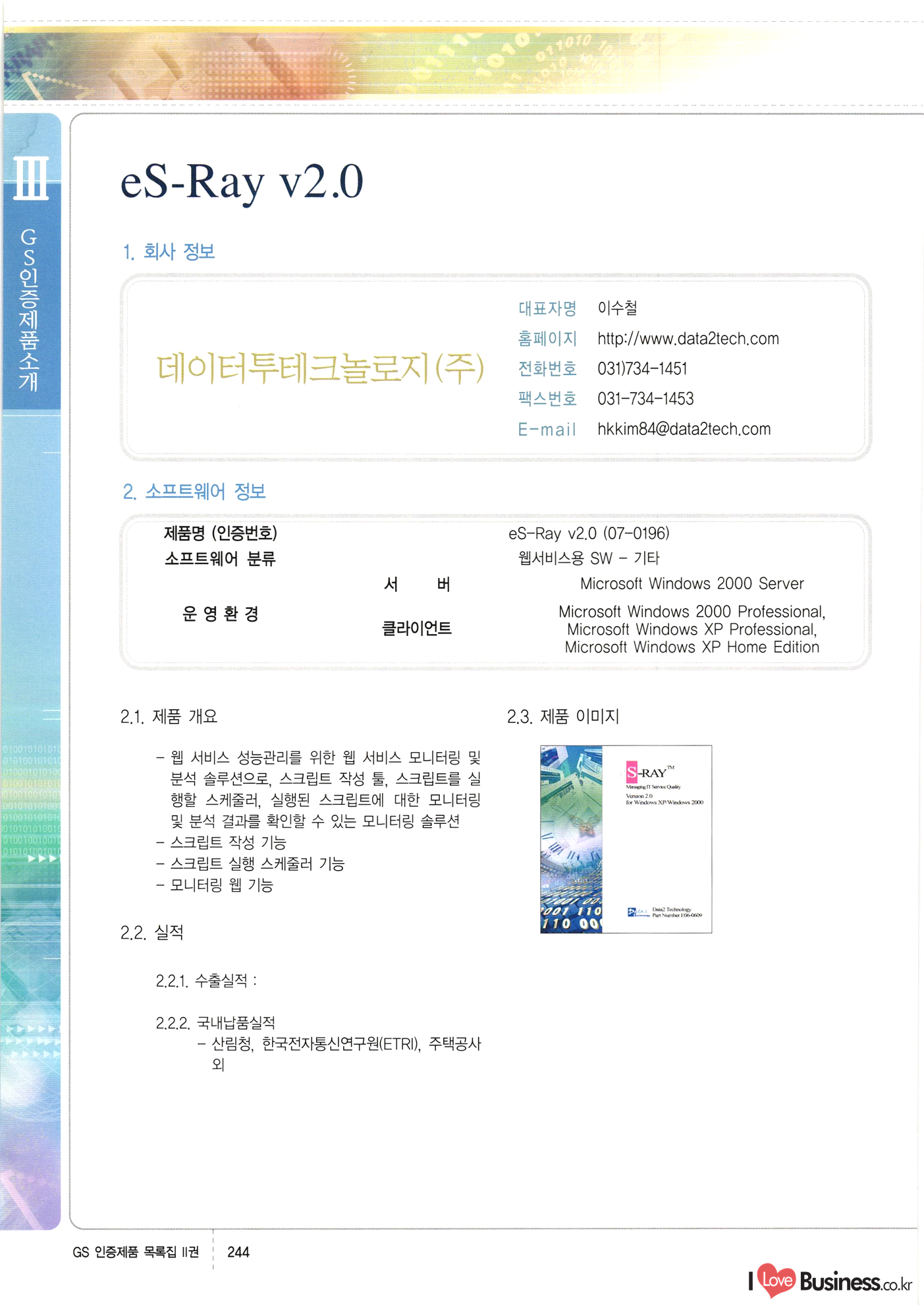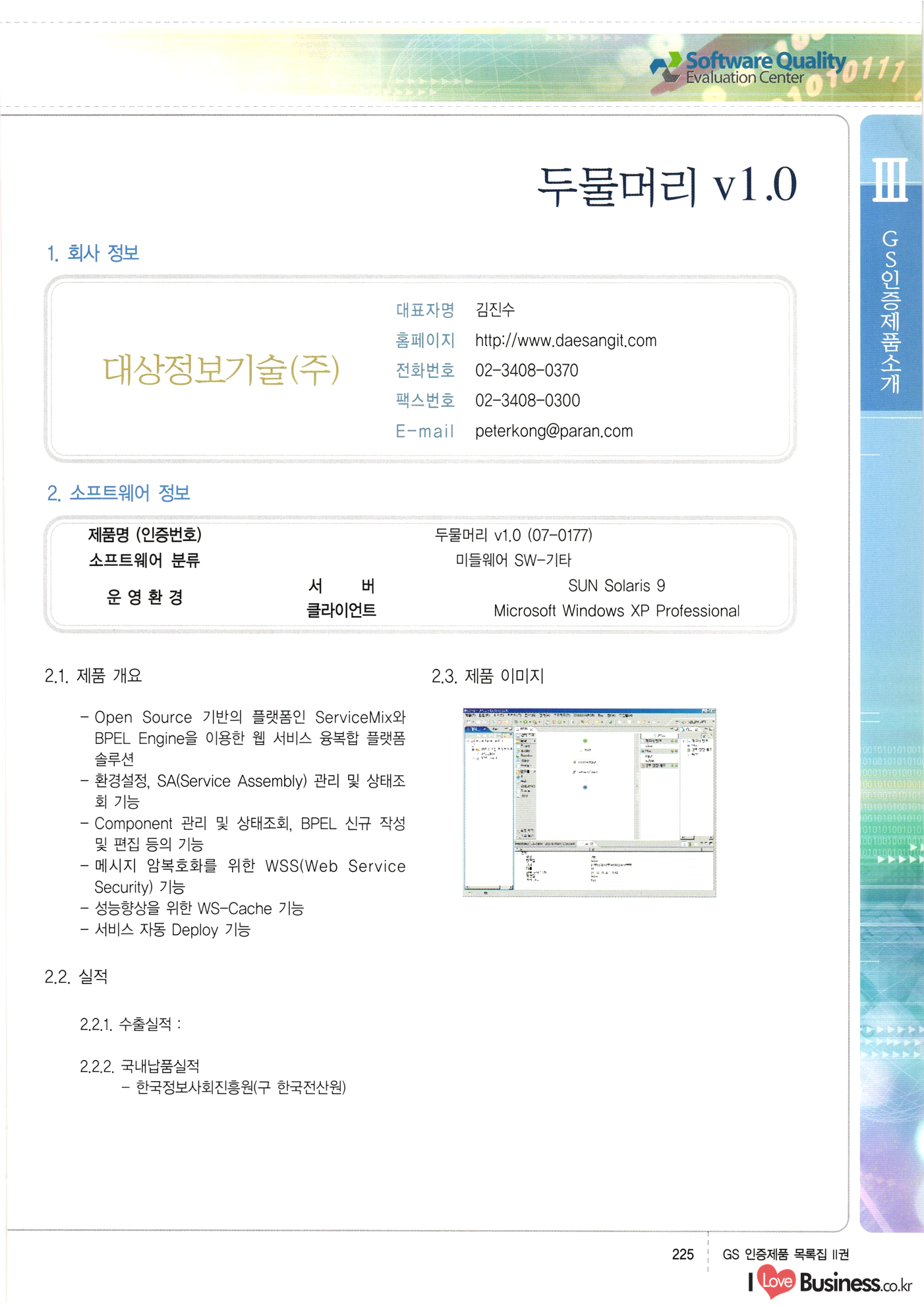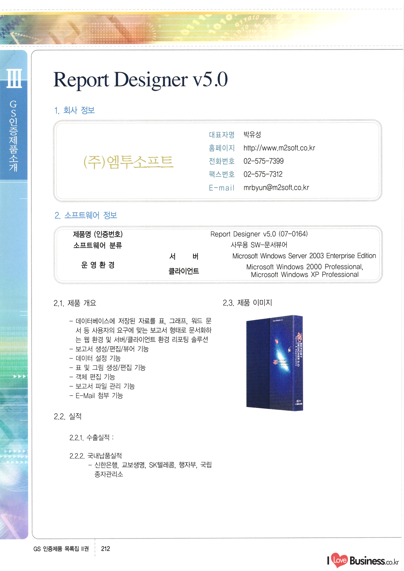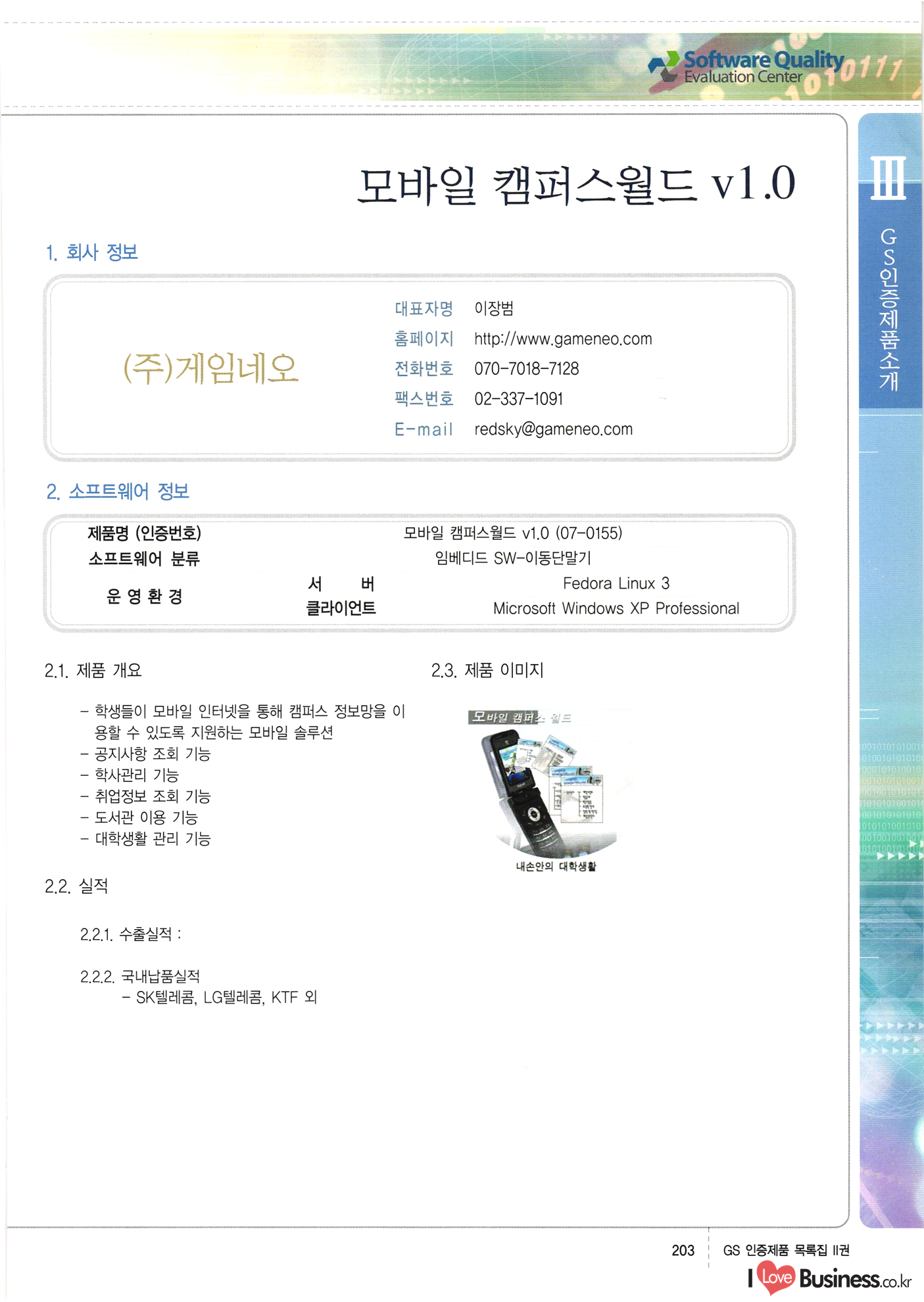 | III. GS 인증제품 목록 | 권-페이지번호 | 권-페이지번호 VT : VeriTest 국제 인증 GS인증제품목록 회사명 삼성에스디에스(주) 제품. EasyBase v4.1 페이지 50 1 제이엔에스 3DM Survey System v1.0 2 | 51 1 (주)싸이웍스 (주)테크다임 (주)다보넷 (주)로지스인포 CyberWALL 2000 v2.16 Jword v1.5 Touchsign v 2.1 키퍼엣홈 v1.0 78 52 (주)미래에듀테크 아이버스 v1.0 53 54 55 56 57 번호 | 인증번호 | 인증일자 01-0001 | 2001.07.25 101-0002 2001.10.22 (02-0027) | 01-0003 | 2001.11.27 | 01-0004 | 2001.11.27 | 01-0005 2001.11.27 5 | 01-0006 | 2001.12.27 02-0001 (02-0029) 2002.01.29 16 | | 02-0002 1 | 2002.02.16 | 02-0003 | 2002.02.16 02-0004 2002.02.27 9 | 02-0005 | 2002.02.27 110 | | 02-0006 | 2002.03.27 11 | || 02-0007 | 2002.03.27 | 02-0008 | 2002.04.30 | 02-0009 | 2002.04.30 | 02-0010 | 2002.04.30 15. | 02-0011 | 2002.04.30 16 102-0012 | 2002.04.30 | 17 | 02-0013 | 2002.05.30 | 18 | 02-0014 | 2002.05.30 | 02-0015 2002.06.28 | 20 | 02-0016 | 2002.06.28 02-0017 1 2002.06.28 | 02-0018 1 | 2002.06.28 23 | 02-0019 | 2002.06.28 24 02-0020 | 2002.07.31 25 | 02-0021 | 2002.07.31 224 58 14 59 118 (주)마크애니 (주)핸디소프트 (주)슈퍼테크놀러지 (주)스펙트라 이래정보시스템(주) (주)컴리빙아이티 | (주)시큐브 (주)케이게이트 (주)소프트4소프트 스페이스인터네셔널(주) (주)컴리빙아이티 (주)그린벨시스템즈 닉스테크(주) 심플소프트 (주)한국데이타비즈네스 (주)테크다임 (주)수세리눅스코리아 (주)한컴리눅스 소프트온넷(주) 와우리눅스(주) 60 61 Document Safer v1.0 | BizFlow Groupware v3.21 | Eg columbus || v1.0 | | eNomix v1.0 Blue Eyes v3.0 i-Class Five v1.05 Secuve TOS WG v1.0 위즈웹3 v3.0 RESORT v1.01 CD Tower v2.0 i-Class One2one v1.05 MANTIS-Professional v1.0 | | SAFEpc v1.5 Simple Gallery v1.00 통합카드발급프로그램 v1.0 Techdigm JCalc v2.0 Suse Linux 7.1K Professional Hancom Linux OS 2.2 Professional | Z!Stream v2.0 와우리눅스 7.1 파란 Secuve TOS WG Agent (Secuve Tos WG Manager) | SMERP v1.1 상하수도범용/ZEUS v1.0 U-Solver v1.0 dDIMS v3.0 DAL v2.5 101010101 1000 101003010101 190 1001010101 21 78. 122 | UL 63 64 65 26 | VT-02-001 | 2002.08.29 (주)시큐브 224 27 1 66 67 | 28 29 130 | 02-0022 | 2002.08.30 | 02-0023 | 2002.10.31 | 02-0024 | 2002.10.31 | 02-0025 | 2002.11.27 | 02-0026 | 2002.11.27 02-0027 (01-0002) 2002.11.27 | 02-0028 (03-0021) 2002.12.09 | 대한상공회의소 한국통신데이타(주) (주)지노시스템 유니온정보시스템(주) (주) 스 68 69 | 70 311 제이엔에스 소프트(구 제이엔에스) 3DM Survey System v1.0 (주)한국지능형정보시스템 한국관(상하수도 범용/TGW) v1.00 92 GS 인증제품 목록집 1권 | 26 I Love Business.co.kr Software Quality, 111 Evaluation Center | 권-페이지번호 II권페이지번호 VT : VeriTest 국제 인증 페이지 회사명 (주)포스데이타 제품 | iSign v2.0 | GS인증제품목록 171 | 34 | 02-0029 (주)제이슨테크(구 미래에듀테크) 아이버스 v1.0 91 72 73. 74 (주)인텔리젼스웨어 (주)하나디에스디 (주)연성정보기술 (주)포스정보 (주)켈코인 (주)포스데이타 스페이스인터내셔널 연희정보통신(주) (주)뉴테크웨이브 c-napse(GSS) v1.0 Life EduBuilder v1.0 | Email+ v3.0 1 책꽃이KDC v3.1 Challenger Webzine Webschool v3.0 1 Biz Binder v1.0 CD-Tower v3.1 상하수도 범용/UFCom v1.0 | | VirusChaser v5.0 | 175 76 118. (주)웨어벨리 Orange for ORACLE v2.2 | 번호 | 인증번호 | 인증일자 | 33 |VT-02-0022002.12.12 | | 2002.12.24 (02-0001) 35 | VT-02-003 | 2002.12.30 | 36 | 03-0001 | 2003.02.28 37. 03-0002 | 2003.02.28 | 38 | 03-0003 | 2003.02.28 | 39 | 03-0004 | 2003.02.28 40 | VT-03-001 | 2003.03.10 41 | VT-03-002) 2003.03.10 1 42 | 03-0005 | 2003.04.07 43 | 03-0006 | 2003.04.07 03-0007 2003.04.30 (03-0026) | 03-0008 | 2003.04.30 45 | 03-0009 | 2003.04.30 | 03-0010 | 2003.04.30 | 47 | 03-0011 | 2003.04.30 | 48 VT-03-003 2003.05.26 49 | 03-0012 | 2003.06.05 | 50 | 03-0013 | 2003.06.05 | 51 | 03-0014 | 2003.06.05 | 52 | 03-0015 | 2003.07.10 | 53 | 03-0016 | 2003.07.10 | 54 | 03-0017 | 2003.07.10 | | 55 | 03-0018 | 2003.07.10 | 56 | 03-0019 | 2003.08.06 57 | | 03-0020 | 2003.08.06 44 1 18 46 80 81 82 83 | (주)테크다임 (주)엔지스테크널러지 삼성에스디에스(주) 삼성에스디에스(주) (주)미디어랜드 인터컴소프트웨어(주) 에스케이씨앤씨(주) 아이티로직스(주) (주)에이씨티소프트 (주)위즈북 (주)에스오엔코리아 (주)아리수미디어 한진정보통신(주) (주)인텔리전스웨어 (주)웨어밸리 (구 (주)오알솔루션즈코리아) Techdigm Office v2.0 | G-Solution Waterworks/Sewerage v1.0 | | 79 UniCITY Standard v1.0 UniCITY Enterprise v1.0 TCO!stream 2002 v4.0 | ServerGuard v3.0 | SK-UPEX v1.0 84 NexWeb v1.2 e-Library Deluxe v4.1.5 86 DL Pro v1.0 SiR v1.01 파워CD뱅크 v4.0 89 InfoMatrix v1.00 190 Bizpus v1.0 91 85 87 88 10010010101.03 1101010100101 1100100100107 58 |VT-03-004 2003.08.12 Orange for ORACLE v2.2 | 111 59 (주)티지더블유 (구 한국지능형정보시스템) 한국관(상하수도 범용/TGW) v1.0 92 93 GIS Free v1.0 DeskPlus v2.0 1 | 94 ArcCITY v1.0 110 03-0021 (02-0028) | 2003.09.04 | 60 | 03-0022 | 2003.09.30 03-0023 | 2003.09.30 03-0024 (04-0011) | 2003.09.30 | 03-0025 | 2003.09.30 03-0026 (03-0007) | 2003.10.07 63 | 03-0027 | 2003.11.12 64 | 03-0028 | 2003.11.12 622 세광정보시스템(주) 제오스페이스(주) (주)선도소프트 (구 (주)캐드랜드) 중앙항업(주) (주)웨어밸리 (구 (주)오알솔루션즈코리아) (주)우암닷컴 (주)오투라인 geoCUBE상하수도 v1.0 95 Orange for ORACLE V2.2 111 96 RAVCOMS Eyecon v4.0 오투스쿨 v2.01 97 GS 인증제품 목록집 1권 I Love Business.co.kr | 권-페이지번호 | 권 - 페이지번호 VT : VeriTest 국제 인증 번호 페이지 회사명 소프트캠프