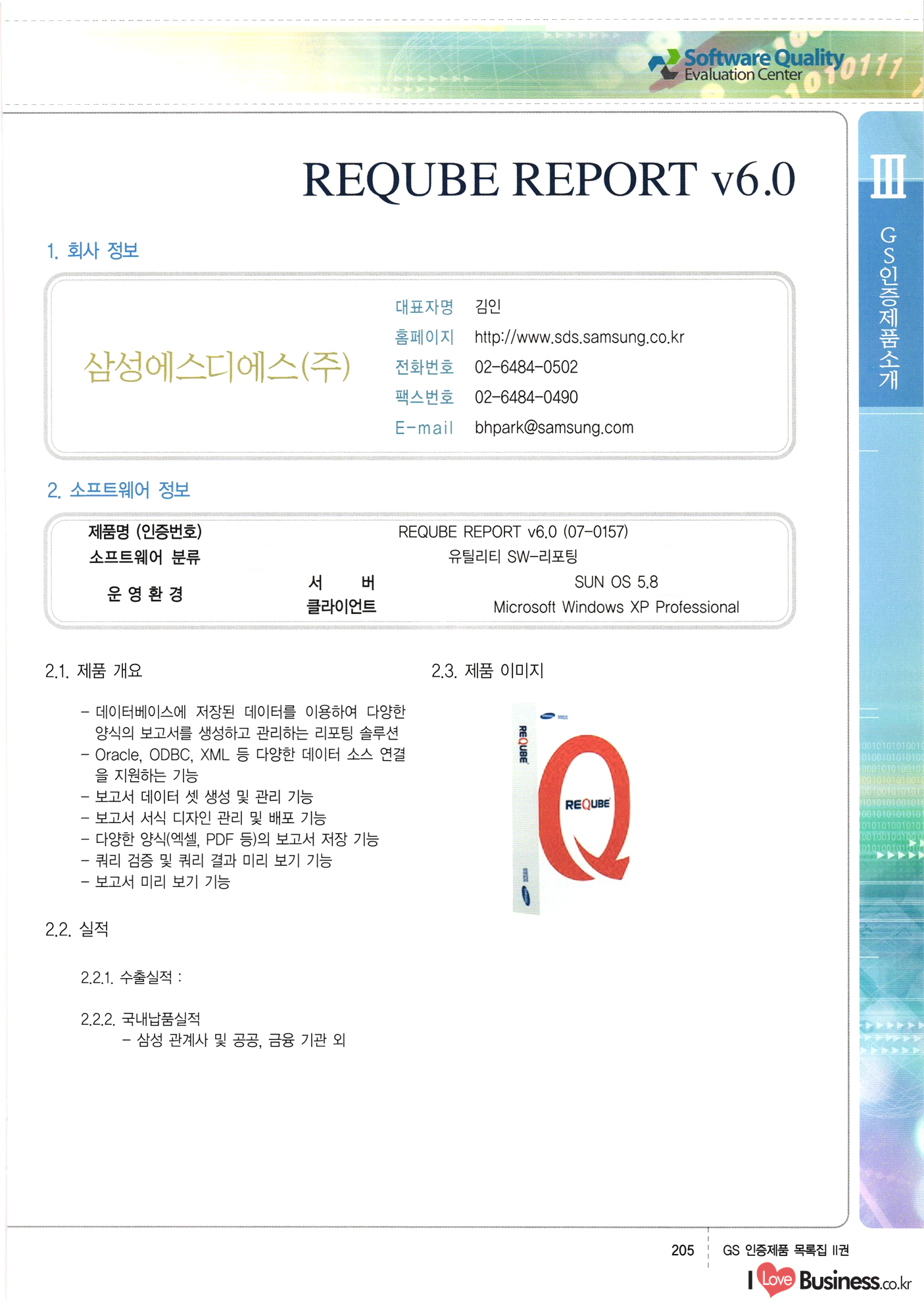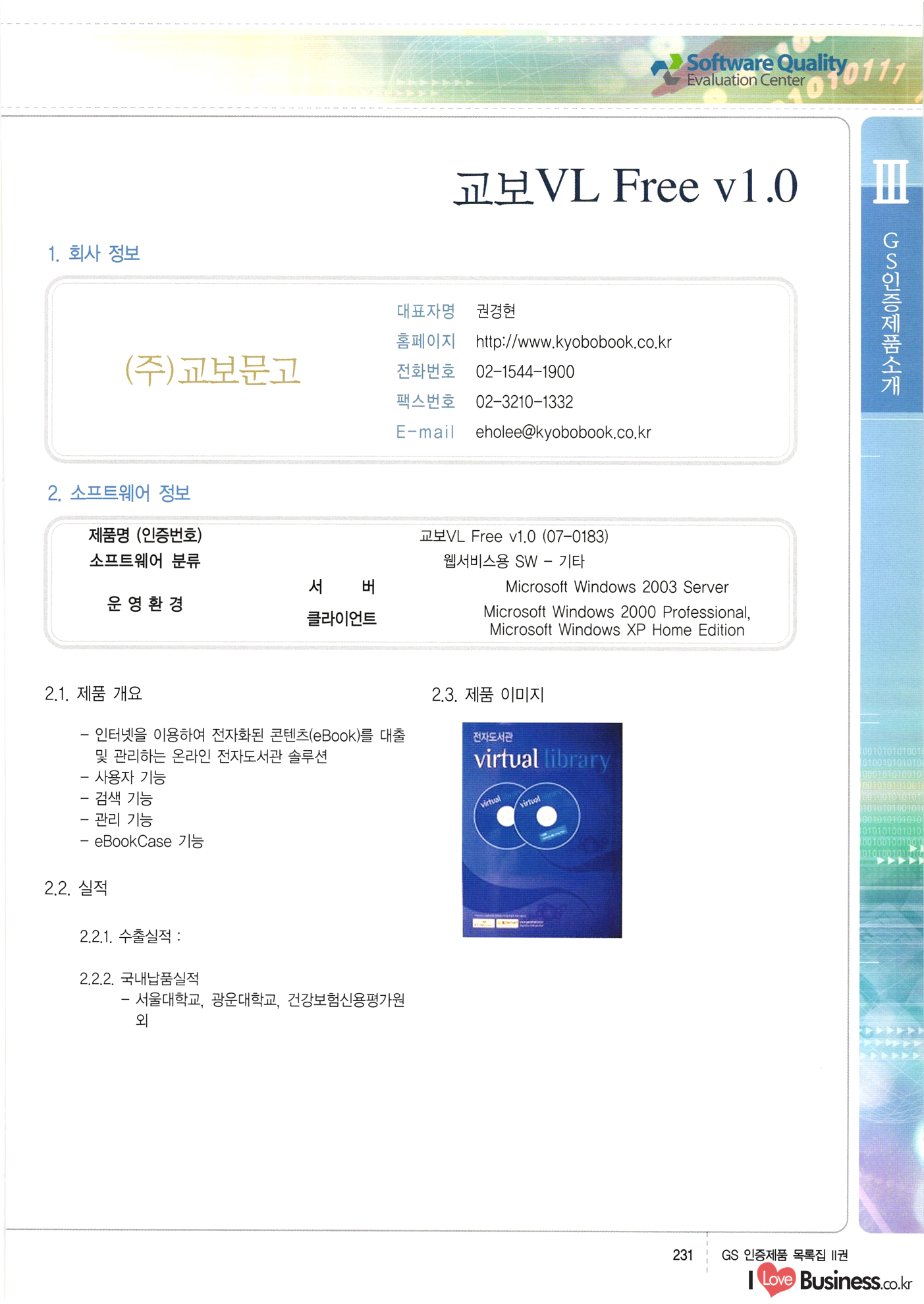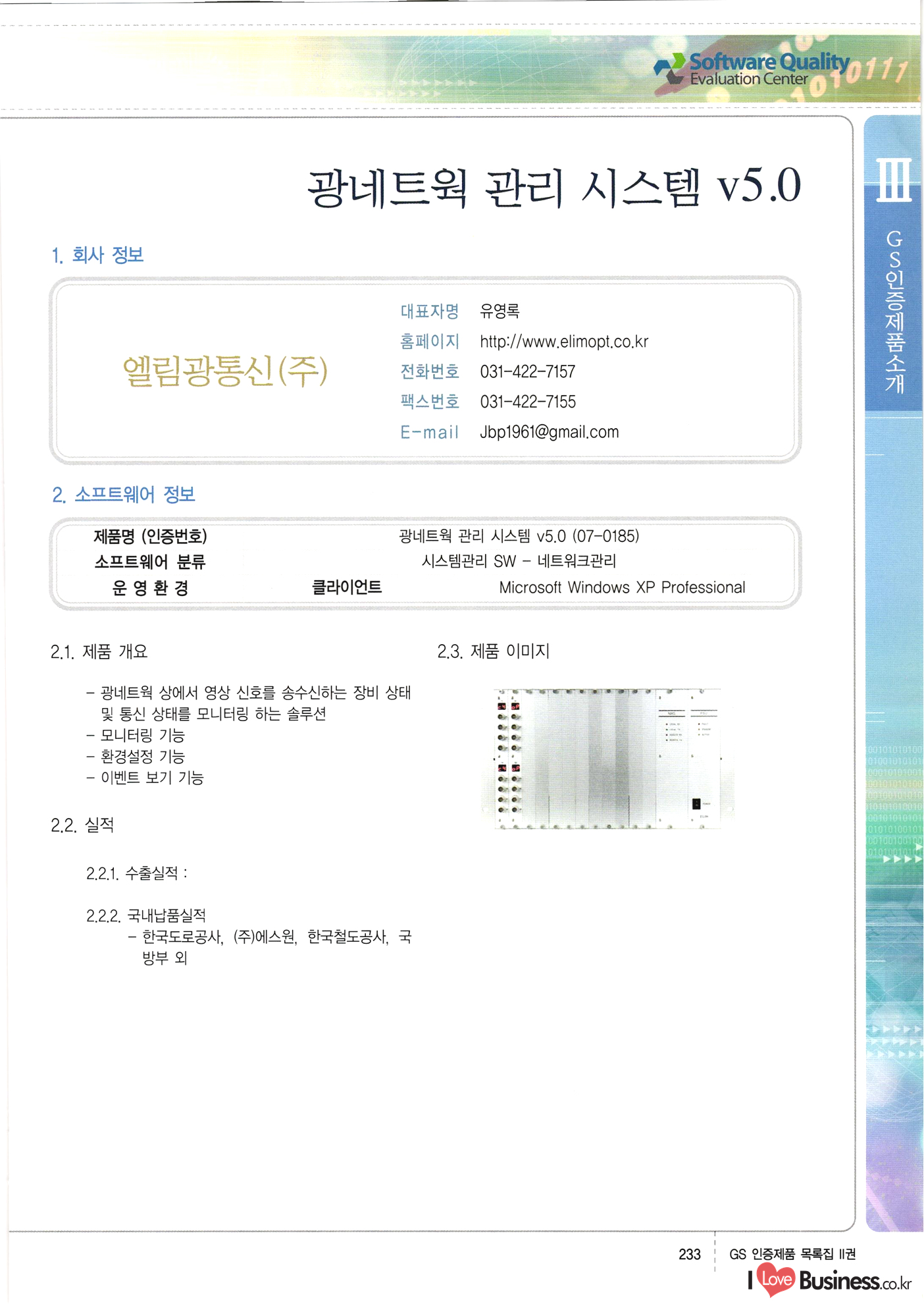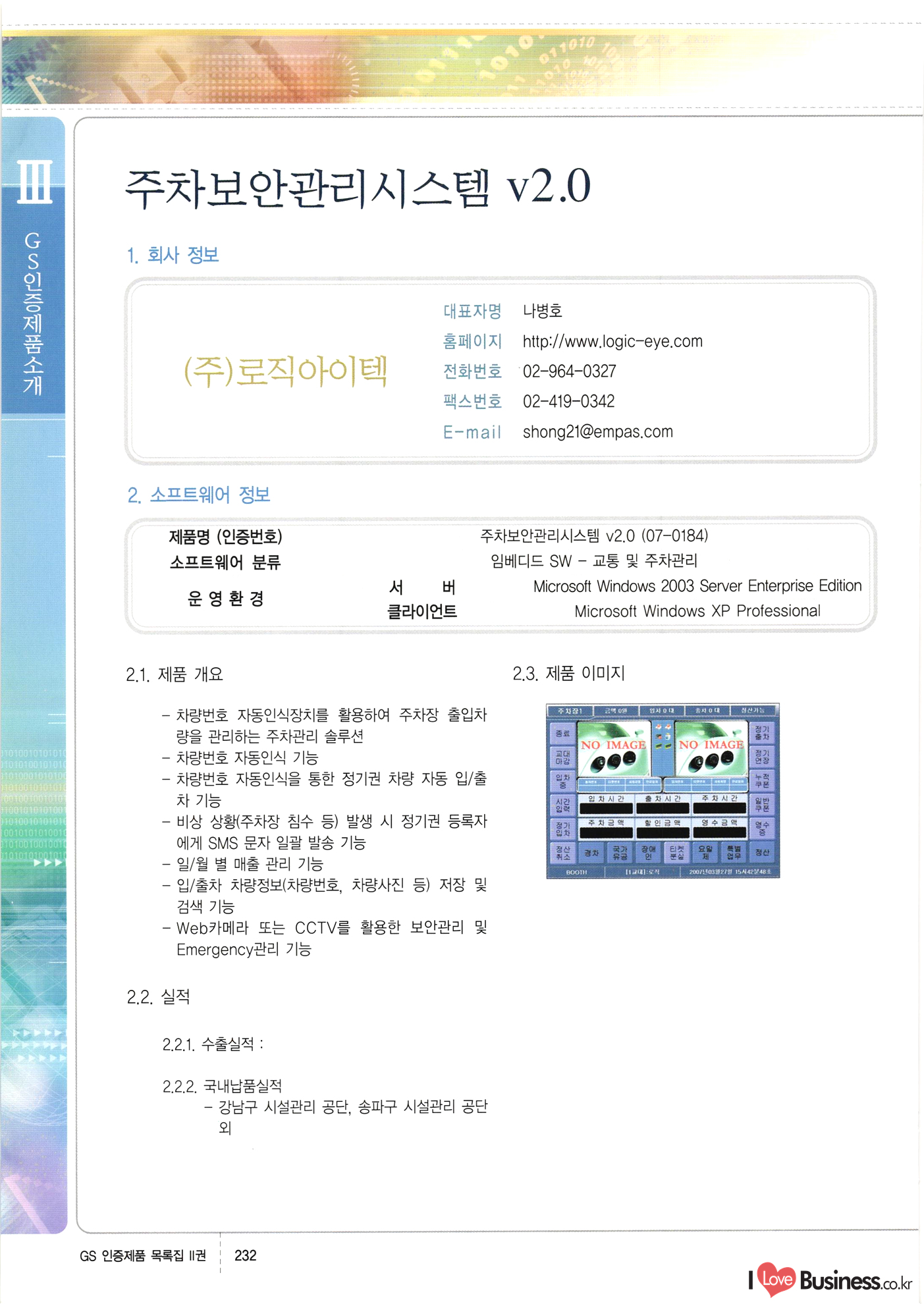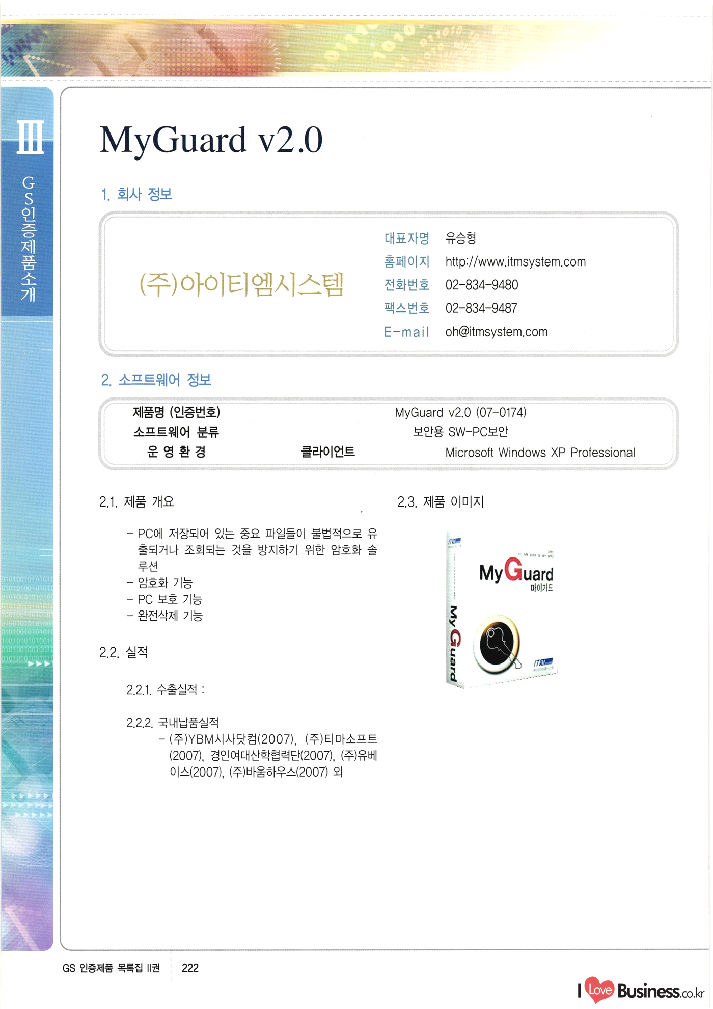 | III. GS 인증제품 목록 | 권-페이지번호 | 권-페이지번호 VT : VeriTest 국제 인증 GS인증제품목록 회사명 삼성에스디에스(주) 제품. EasyBase v4.1 페이지 50 1 제이엔에스 3DM Survey System v1.0 2 | 51 1 (주)싸이웍스 (주)테크다임 (주)다보넷 (주)로지스인포 CyberWALL 2000 v2.16 Jword v1.5 Touchsign v 2.1 키퍼엣홈 v1.0 78 52 (주)미래에듀테크 아이버스 v1.0 53 54 55 56 57 번호 | 인증번호 | 인증일자 01-0001 | 2001.07.25 101-0002 2001.10.22 (02-0027) | 01-0003 | 2001.11.27 | 01-0004 | 2001.11.27 | 01-0005 2001.11.27 5 | 01-0006 | 2001.12.27 02-0001 (02-0029) 2002.01.29 16 | | 02-0002 1 | 2002.02.16 | 02-0003 | 2002.02.16 02-0004 2002.02.27 9 | 02-0005 | 2002.02.27 110 | | 02-0006 | 2002.03.27 11 | || 02-0007 | 2002.03.27 | 02-0008 | 2002.04.30 | 02-0009 | 2002.04.30 | 02-0010 | 2002.04.30 15. | 02-0011 | 2002.04.30 16 102-0012 | 2002.04.30 | 17 | 02-0013 | 2002.05.30 | 18 | 02-0014 | 2002.05.30 | 02-0015 2002.06.28 | 20 | 02-0016 | 2002.06.28 02-0017 1 2002.06.28 | 02-0018 1 | 2002.06.28 23 | 02-0019 | 2002.06.28 24 02-0020 | 2002.07.31 25 | 02-0021 | 2002.07.31 224 58 14 59 118 (주)마크애니 (주)핸디소프트 (주)슈퍼테크놀러지 (주)스펙트라 이래정보시스템(주) (주)컴리빙아이티 | (주)시큐브 (주)케이게이트 (주)소프트4소프트 스페이스인터네셔널(주) (주)컴리빙아이티 (주)그린벨시스템즈 닉스테크(주) 심플소프트 (주)한국데이타비즈네스 (주)테크다임 (주)수세리눅스코리아 (주)한컴리눅스 소프트온넷(주) 와우리눅스(주) 60 61 Document Safer v1.0 | BizFlow Groupware v3.21 | Eg columbus || v1.0 | | eNomix v1.0 Blue Eyes v3.0 i-Class Five v1.05 Secuve TOS WG v1.0 위즈웹3 v3.0 RESORT v1.01 CD Tower v2.0 i-Class One2one v1.05 MANTIS-Professional v1.0 | | SAFEpc v1.5 Simple Gallery v1.00 통합카드발급프로그램 v1.0 Techdigm JCalc v2.0 Suse Linux 7.1K Professional Hancom Linux OS 2.2 Professional | Z!Stream v2.0 와우리눅스 7.1 파란 Secuve TOS WG Agent (Secuve Tos WG Manager) | SMERP v1.1 상하수도범용/ZEUS v1.0 U-Solver v1.0 dDIMS v3.0 DAL v2.5 101010101 1000 101003010101 190 1001010101 21 78. 122 | UL 63 64 65 26 | VT-02-001 | 2002.08.29 (주)시큐브 224 27 1 66 67 | 28 29 130 | 02-0022 | 2002.08.30 | 02-0023 | 2002.10.31 | 02-0024 | 2002.10.31 | 02-0025 | 2002.11.27 | 02-0026 | 2002.11.27 02-0027 (01-0002) 2002.11.27 | 02-0028 (03-0021) 2002.12.09 | 대한상공회의소 한국통신데이타(주) (주)지노시스템 유니온정보시스템(주) (주) 스 68 69 | 70 311 제이엔에스 소프트(구 제이엔에스) 3DM Survey System v1.0 (주)한국지능형정보시스템 한국관(상하수도 범용/TGW) v1.00 92 GS 인증제품 목록집 1권 | 26 I Love Business.co.kr Software Quality, 111 Evaluation Center | 권-페이지번호 II권페이지번호 VT : VeriTest 국제 인증 페이지 회사명 (주)포스데이타 제품 | iSign v2.0 | GS인증제품목록 171 | 34 | 02-0029 (주)제이슨테크(구 미래에듀테크) 아이버스 v1.0 91 72 73. 74 (주)인텔리젼스웨어 (주)하나디에스디 (주)연성정보기술 (주)포스정보 (주)켈코인 (주)포스데이타 스페이스인터내셔널 연희정보통신(주) (주)뉴테크웨이브 c-napse(GSS) v1.0 Life EduBuilder v1.0 | Email+ v3.0 1 책꽃이KDC v3.1 Challenger Webzine Webschool v3.0 1 Biz Binder v1.0 CD-Tower v3.1 상하수도 범용/UFCom v1.0 | | VirusChaser v5.0 | 175 76 118. (주)웨어벨리 Orange for ORACLE v2.2 | 번호 | 인증번호 | 인증일자 | 33 |VT-02-0022002.12.12 | | 2002.12.24 (02-0001) 35 | VT-02-003 | 2002.12.30 | 36 | 03-0001 | 2003.02.28 37. 03-0002 | 2003.02.28 | 38 | 03-0003 | 2003.02.28 | 39 | 03-0004 | 2003.02.28 40 | VT-03-001 | 2003.03.10 41 | VT-03-002) 2003.03.10 1 42 | 03-0005 | 2003.04.07 43 | 03-0006 | 2003.04.07 03-0007 2003.04.30 (03-0026) | 03-0008 | 2003.04.30 45 | 03-0009 | 2003.04.30 | 03-0010 | 2003.04.30 | 47 | 03-0011 | 2003.04.30 | 48 VT-03-003 2003.05.26 49 | 03-0012 | 2003.06.05 | 50 | 03-0013 | 2003.06.05 | 51 | 03-0014 | 2003.06.05 | 52 | 03-0015 | 2003.07.10 | 53 | 03-0016 | 2003.07.10 | 54 | 03-0017 | 2003.07.10 | | 55 | 03-0018 | 2003.07.10 | 56 | 03-0019 | 2003.08.06 57 | | 03-0020 | 2003.08.06 44 1 18 46 80 81 82 83 | (주)테크다임 (주)엔지스테크널러지 삼성에스디에스(주) 삼성에스디에스(주) (주)미디어랜드 인터컴소프트웨어(주) 에스케이씨앤씨(주) 아이티로직스(주) (주)에이씨티소프트 (주)위즈북 (주)에스오엔코리아 (주)아리수미디어 한진정보통신(주) (주)인텔리전스웨어 (주)웨어밸리 (구 (주)오알솔루션즈코리아) Techdigm Office v2.0 | G-Solution Waterworks/Sewerage v1.0 | | 79 UniCITY Standard v1.0 UniCITY Enterprise v1.0 TCO!stream 2002 v4.0 | ServerGuard v3.0 | SK-UPEX v1.0 84 NexWeb v1.2 e-Library Deluxe v4.1.5 86 DL Pro v1.0 SiR v1.01 파워CD뱅크 v4.0 89 InfoMatrix v1.00 190 Bizpus v1.0 91 85 87 88 10010010101.03 1101010100101 1100100100107 58 |VT-03-004 2003.08.12 Orange for ORACLE v2.2 | 111 59 (주)티지더블유 (구 한국지능형정보시스템) 한국관(상하수도 범용/TGW) v1.0 92 93 GIS Free v1.0 DeskPlus v2.0 1 | 94 ArcCITY v1.0 110 03-0021 (02-0028) | 2003.09.04 | 60 | 03-0022 | 2003.09.30 03-0023 | 2003.09.30 03-0024 (04-0011) | 2003.09.30 | 03-0025 | 2003.09.30 03-0026 (03-0007) | 2003.10.07 63 | 03-0027 | 2003.11.12 64 | 03-0028 | 2003.11.12 622 세광정보시스템(주) 제오스페이스(주) (주)선도소프트 (구 (주)캐드랜드) 중앙항업(주) (주)웨어밸리 (구 (주)오알솔루션즈코리아) (주)우암닷컴 (주)오투라인 geoCUBE상하수도 v1.0 95 Orange for ORACLE V2.2 111 96 RAVCOMS Eyecon v4.0 오투스쿨 v2.01 97 GS 인증제품 목록집 1권 I Love Business.co.kr | 권-페이지번호 | 권 - 페이지번호 VT : VeriTest 국제 인증 번호 페이지 회사명 소프트캠프