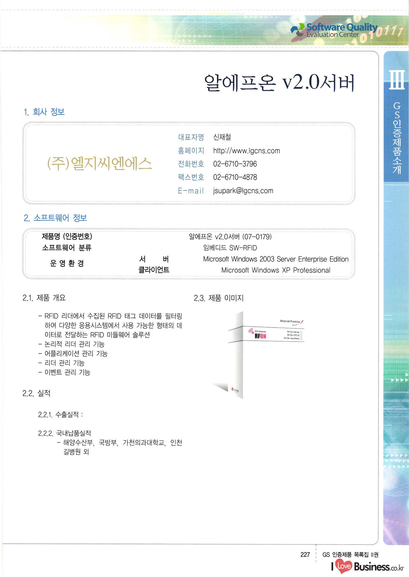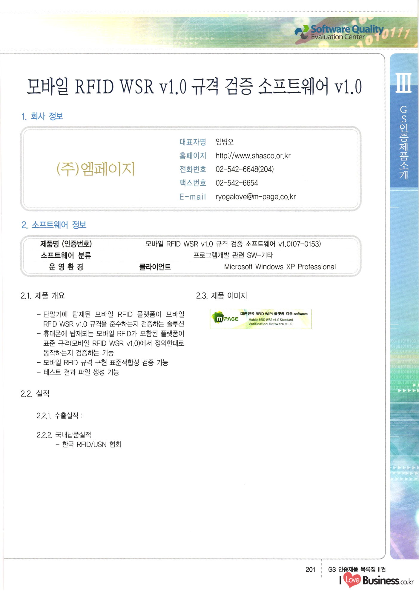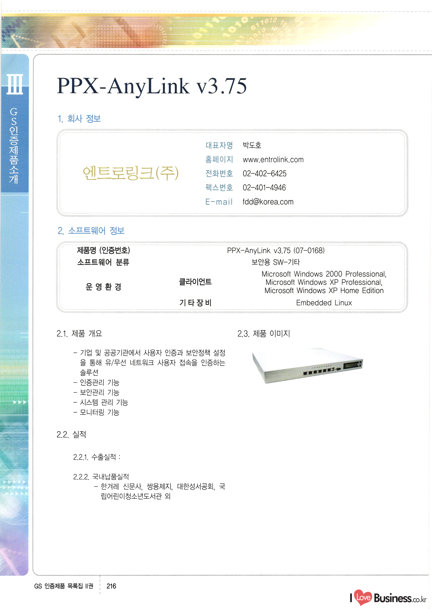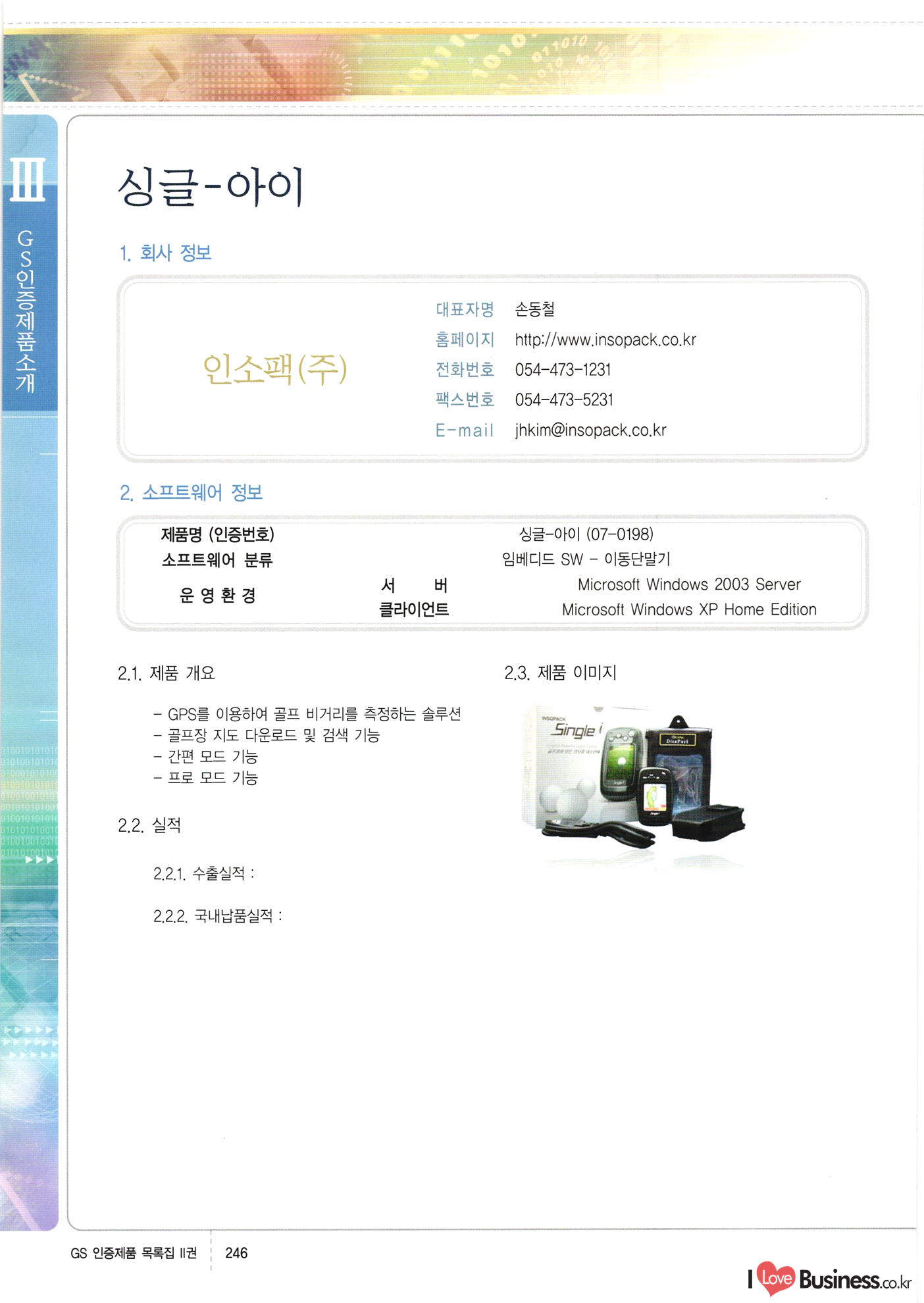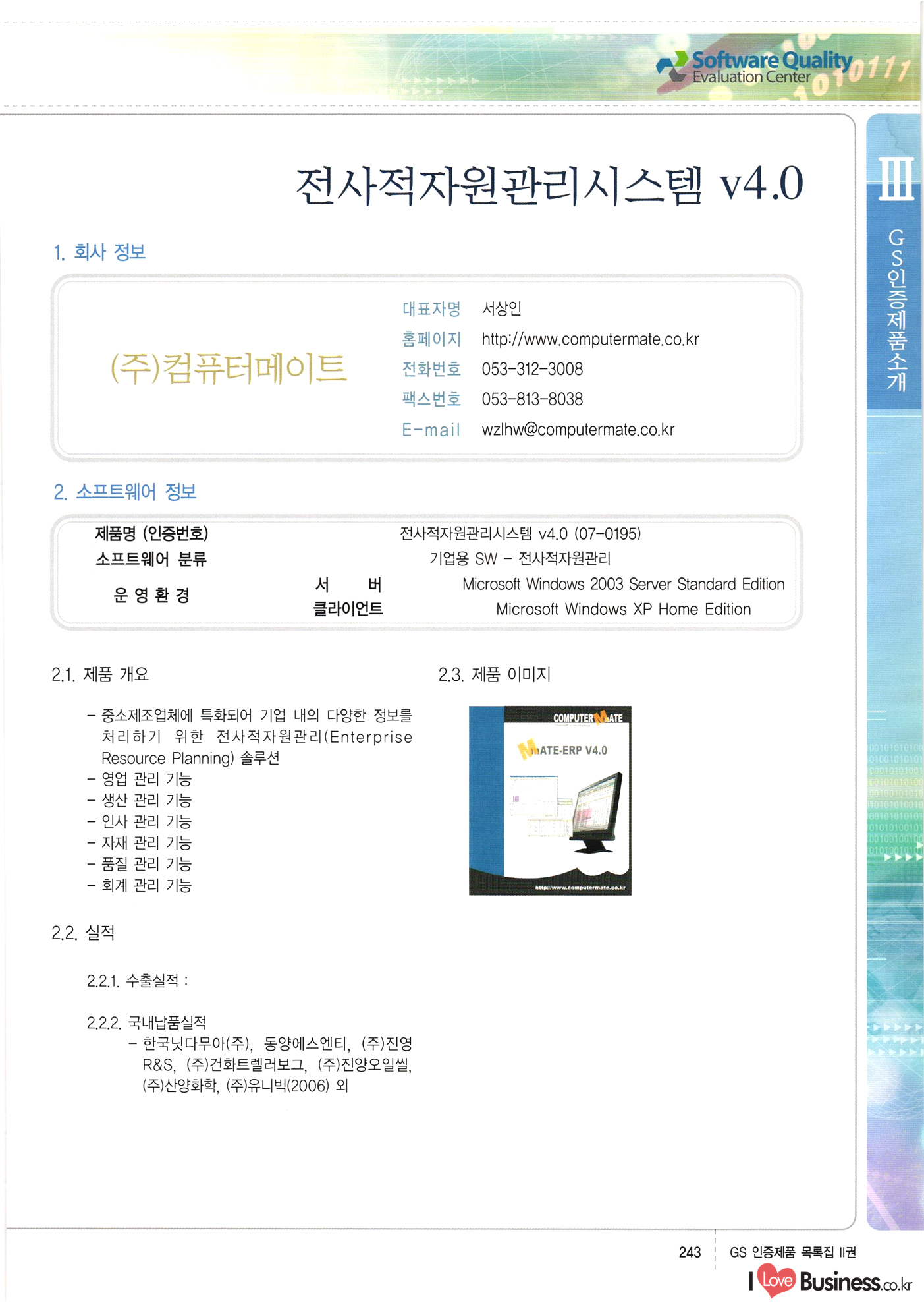 | III. GS 인증제품 목록 | 권-페이지번호 | 권-페이지번호 VT : VeriTest 국제 인증 GS인증제품목록 회사명 삼성에스디에스(주) 제품. EasyBase v4.1 페이지 50 1 제이엔에스 3DM Survey System v1.0 2 | 51 1 (주)싸이웍스 (주)테크다임 (주)다보넷 (주)로지스인포 CyberWALL 2000 v2.16 Jword v1.5 Touchsign v 2.1 키퍼엣홈 v1.0 78 52 (주)미래에듀테크 아이버스 v1.0 53 54 55 56 57 번호 | 인증번호 | 인증일자 01-0001 | 2001.07.25 101-0002 2001.10.22 (02-0027) | 01-0003 | 2001.11.27 | 01-0004 | 2001.11.27 | 01-0005 2001.11.27 5 | 01-0006 | 2001.12.27 02-0001 (02-0029) 2002.01.29 16 | | 02-0002 1 | 2002.02.16 | 02-0003 | 2002.02.16 02-0004 2002.02.27 9 | 02-0005 | 2002.02.27 110 | | 02-0006 | 2002.03.27 11 | || 02-0007 | 2002.03.27 | 02-0008 | 2002.04.30 | 02-0009 | 2002.04.30 | 02-0010 | 2002.04.30 15. | 02-0011 | 2002.04.30 16 102-0012 | 2002.04.30 | 17 | 02-0013 | 2002.05.30 | 18 | 02-0014 | 2002.05.30 | 02-0015 2002.06.28 | 20 | 02-0016 | 2002.06.28 02-0017 1 2002.06.28 | 02-0018 1 | 2002.06.28 23 | 02-0019 | 2002.06.28 24 02-0020 | 2002.07.31 25 | 02-0021 | 2002.07.31 224 58 14 59 118 (주)마크애니 (주)핸디소프트 (주)슈퍼테크놀러지 (주)스펙트라 이래정보시스템(주) (주)컴리빙아이티 | (주)시큐브 (주)케이게이트 (주)소프트4소프트 스페이스인터네셔널(주) (주)컴리빙아이티 (주)그린벨시스템즈 닉스테크(주) 심플소프트 (주)한국데이타비즈네스 (주)테크다임 (주)수세리눅스코리아 (주)한컴리눅스 소프트온넷(주) 와우리눅스(주) 60 61 Document Safer v1.0 | BizFlow Groupware v3.21 | Eg columbus || v1.0 | | eNomix v1.0 Blue Eyes v3.0 i-Class Five v1.05 Secuve TOS WG v1.0 위즈웹3 v3.0 RESORT v1.01 CD Tower v2.0 i-Class One2one v1.05 MANTIS-Professional v1.0 | | SAFEpc v1.5 Simple Gallery v1.00 통합카드발급프로그램 v1.0 Techdigm JCalc v2.0 Suse Linux 7.1K Professional Hancom Linux OS 2.2 Professional | Z!Stream v2.0 와우리눅스 7.1 파란 Secuve TOS WG Agent (Secuve Tos WG Manager) | SMERP v1.1 상하수도범용/ZEUS v1.0 U-Solver v1.0 dDIMS v3.0 DAL v2.5 101010101 1000 101003010101 190 1001010101 21 78. 122 | UL 63 64 65 26 | VT-02-001 | 2002.08.29 (주)시큐브 224 27 1 66 67 | 28 29 130 | 02-0022 | 2002.08.30 | 02-0023 | 2002.10.31 | 02-0024 | 2002.10.31 | 02-0025 | 2002.11.27 | 02-0026 | 2002.11.27 02-0027 (01-0002) 2002.11.27 | 02-0028 (03-0021) 2002.12.09 | 대한상공회의소 한국통신데이타(주) (주)지노시스템 유니온정보시스템(주) (주) 스 68 69 | 70 311 제이엔에스 소프트(구 제이엔에스) 3DM Survey System v1.0 (주)한국지능형정보시스템 한국관(상하수도 범용/TGW) v1.00 92 GS 인증제품 목록집 1권 | 26 I Love Business.co.kr Software Quality, 111 Evaluation Center | 권-페이지번호 II권페이지번호 VT : VeriTest 국제 인증 페이지 회사명 (주)포스데이타 제품 | iSign v2.0 | GS인증제품목록 171 | 34 | 02-0029 (주)제이슨테크(구 미래에듀테크) 아이버스 v1.0 91 72 73. 74 (주)인텔리젼스웨어 (주)하나디에스디 (주)연성정보기술 (주)포스정보 (주)켈코인 (주)포스데이타 스페이스인터내셔널 연희정보통신(주) (주)뉴테크웨이브 c-napse(GSS) v1.0 Life EduBuilder v1.0 | Email+ v3.0 1 책꽃이KDC v3.1 Challenger Webzine Webschool v3.0 1 Biz Binder v1.0 CD-Tower v3.1 상하수도 범용/UFCom v1.0 | | VirusChaser v5.0 | 175 76 118. (주)웨어벨리 Orange for ORACLE v2.2 | 번호 | 인증번호 | 인증일자 | 33 |VT-02-0022002.12.12 | | 2002.12.24 (02-0001) 35 | VT-02-003 | 2002.12.30 | 36 | 03-0001 | 2003.02.28 37. 03-0002 | 2003.02.28 | 38 | 03-0003 | 2003.02.28 | 39 | 03-0004 | 2003.02.28 40 | VT-03-001 | 2003.03.10 41 | VT-03-002) 2003.03.10 1 42 | 03-0005 | 2003.04.07 43 | 03-0006 | 2003.04.07 03-0007 2003.04.30 (03-0026) | 03-0008 | 2003.04.30 45 | 03-0009 | 2003.04.30 | 03-0010 | 2003.04.30 | 47 | 03-0011 | 2003.04.30 | 48 VT-03-003 2003.05.26 49 | 03-0012 | 2003.06.05 | 50 | 03-0013 | 2003.06.05 | 51 | 03-0014 | 2003.06.05 | 52 | 03-0015 | 2003.07.10 | 53 | 03-0016 | 2003.07.10 | 54 | 03-0017 | 2003.07.10 | | 55 | 03-0018 | 2003.07.10 | 56 | 03-0019 | 2003.08.06 57 | | 03-0020 | 2003.08.06 44 1 18 46 80 81 82 83 | (주)테크다임 (주)엔지스테크널러지 삼성에스디에스(주) 삼성에스디에스(주) (주)미디어랜드 인터컴소프트웨어(주) 에스케이씨앤씨(주) 아이티로직스(주) (주)에이씨티소프트 (주)위즈북 (주)에스오엔코리아 (주)아리수미디어 한진정보통신(주) (주)인텔리전스웨어 (주)웨어밸리 (구 (주)오알솔루션즈코리아) Techdigm Office v2.0 | G-Solution Waterworks/Sewerage v1.0 | | 79 UniCITY Standard v1.0 UniCITY Enterprise v1.0 TCO!stream 2002 v4.0 | ServerGuard v3.0 | SK-UPEX v1.0 84 NexWeb v1.2 e-Library Deluxe v4.1.5 86 DL Pro v1.0 SiR v1.01 파워CD뱅크 v4.0 89 InfoMatrix v1.00 190 Bizpus v1.0 91 85 87 88 10010010101.03 1101010100101 1100100100107 58 |VT-03-004 2003.08.12 Orange for ORACLE v2.2 | 111 59 (주)티지더블유 (구 한국지능형정보시스템) 한국관(상하수도 범용/TGW) v1.0 92 93 GIS Free v1.0 DeskPlus v2.0 1 | 94 ArcCITY v1.0 110 03-0021 (02-0028) | 2003.09.04 | 60 | 03-0022 | 2003.09.30 03-0023 | 2003.09.30 03-0024 (04-0011) | 2003.09.30 | 03-0025 | 2003.09.30 03-0026 (03-0007) | 2003.10.07 63 | 03-0027 | 2003.11.12 64 | 03-0028 | 2003.11.12 622 세광정보시스템(주) 제오스페이스(주) (주)선도소프트 (구 (주)캐드랜드) 중앙항업(주) (주)웨어밸리 (구 (주)오알솔루션즈코리아) (주)우암닷컴 (주)오투라인 geoCUBE상하수도 v1.0 95 Orange for ORACLE V2.2 111 96 RAVCOMS Eyecon v4.0 오투스쿨 v2.01 97 GS 인증제품 목록집 1권 I Love Business.co.kr | 권-페이지번호 | 권 - 페이지번호 VT : VeriTest 국제 인증 번호 페이지 회사명 소프트캠프