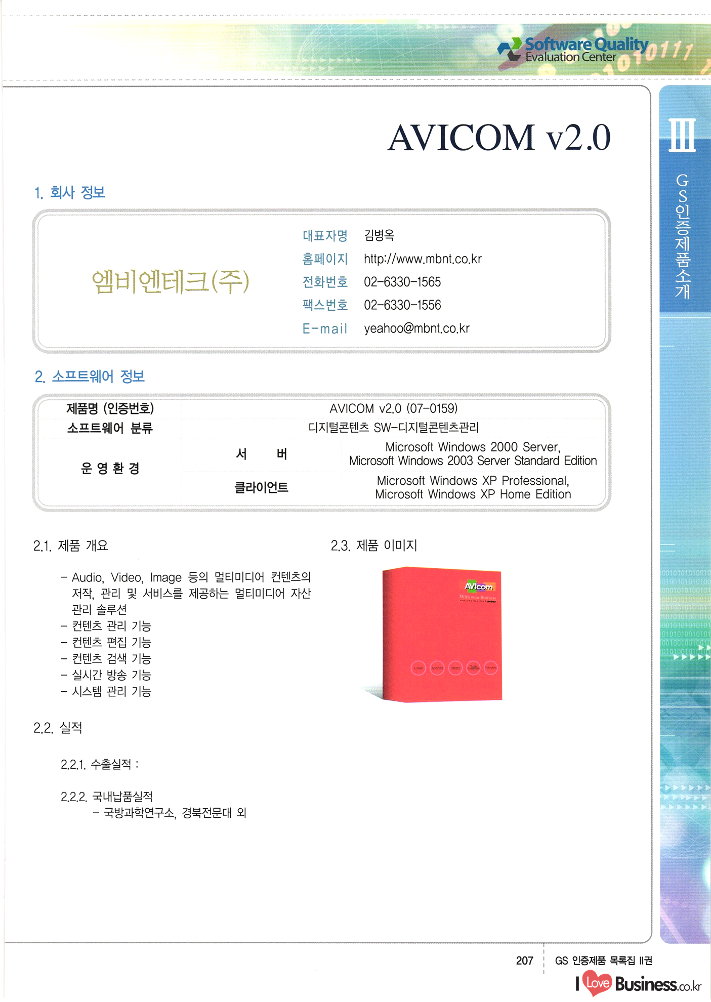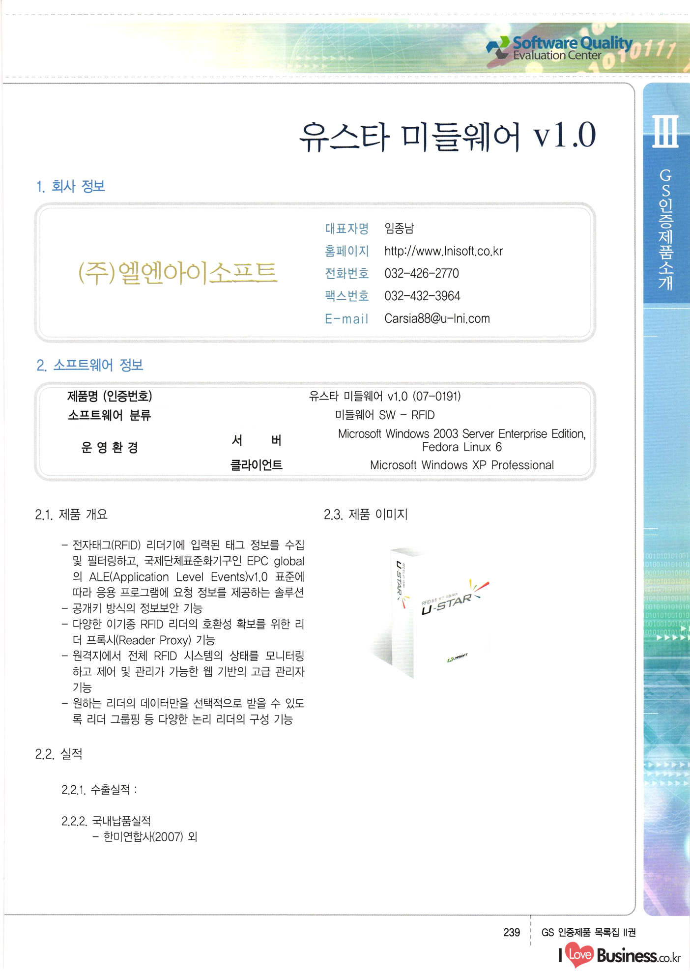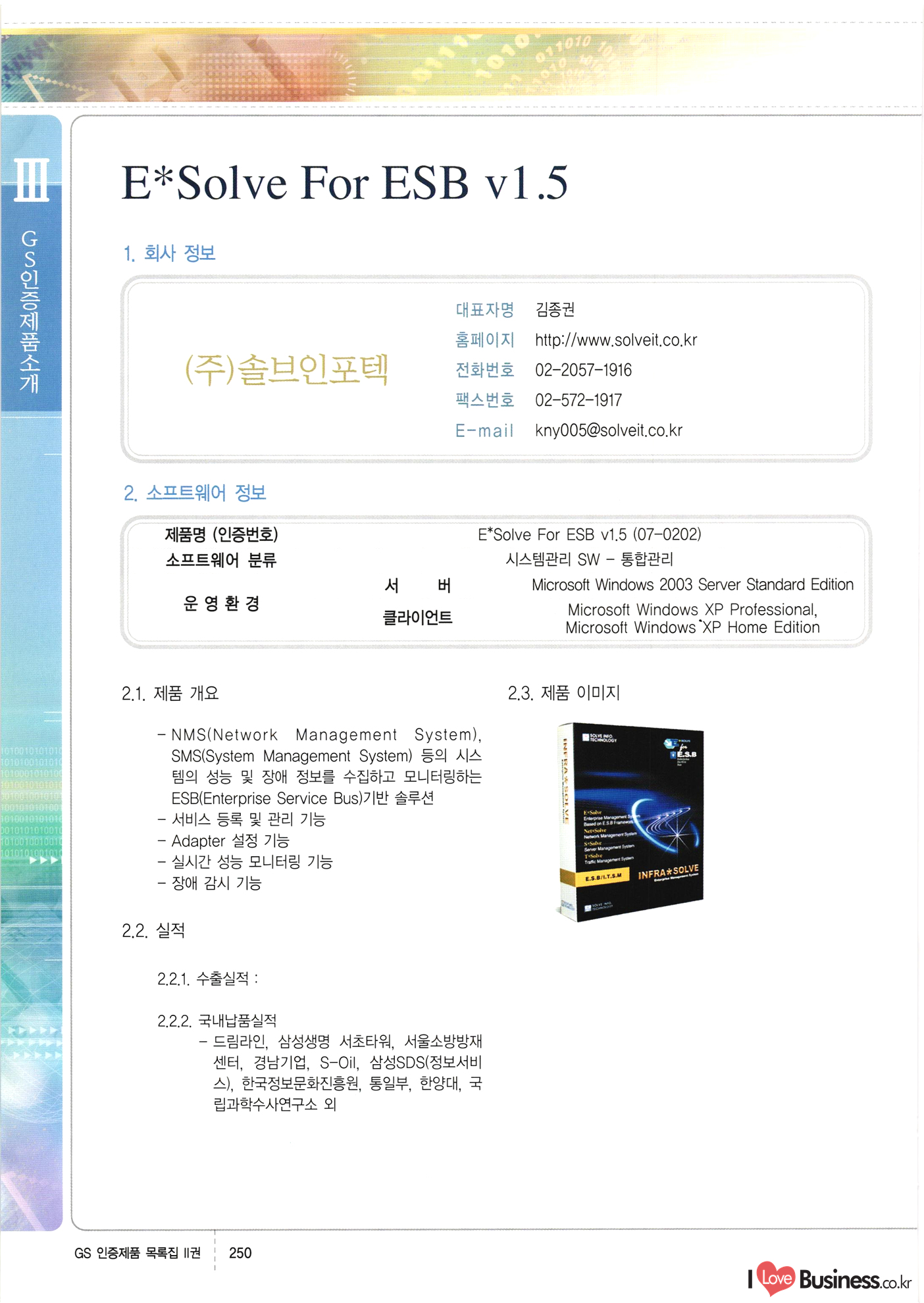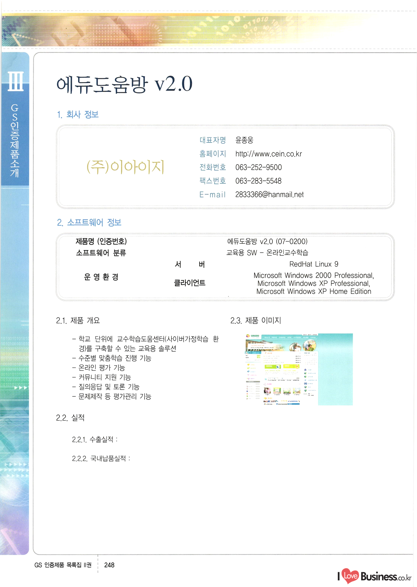 | III. GS 인증제품 목록 | 권-페이지번호 | 권-페이지번호 VT : VeriTest 국제 인증 GS인증제품목록 회사명 삼성에스디에스(주) 제품. EasyBase v4.1 페이지 50 1 제이엔에스 3DM Survey System v1.0 2 | 51 1 (주)싸이웍스 (주)테크다임 (주)다보넷 (주)로지스인포 CyberWALL 2000 v2.16 Jword v1.5 Touchsign v 2.1 키퍼엣홈 v1.0 78 52 (주)미래에듀테크 아이버스 v1.0 53 54 55 56 57 번호 | 인증번호 | 인증일자 01-0001 | 2001.07.25 101-0002 2001.10.22 (02-0027) | 01-0003 | 2001.11.27 | 01-0004 | 2001.11.27 | 01-0005 2001.11.27 5 | 01-0006 | 2001.12.27 02-0001 (02-0029) 2002.01.29 16 | | 02-0002 1 | 2002.02.16 | 02-0003 | 2002.02.16 02-0004 2002.02.27 9 | 02-0005 | 2002.02.27 110 | | 02-0006 | 2002.03.27 11 | || 02-0007 | 2002.03.27 | 02-0008 | 2002.04.30 | 02-0009 | 2002.04.30 | 02-0010 | 2002.04.30 15. | 02-0011 | 2002.04.30 16 102-0012 | 2002.04.30 | 17 | 02-0013 | 2002.05.30 | 18 | 02-0014 | 2002.05.30 | 02-0015 2002.06.28 | 20 | 02-0016 | 2002.06.28 02-0017 1 2002.06.28 | 02-0018 1 | 2002.06.28 23 | 02-0019 | 2002.06.28 24 02-0020 | 2002.07.31 25 | 02-0021 | 2002.07.31 224 58 14 59 118 (주)마크애니 (주)핸디소프트 (주)슈퍼테크놀러지 (주)스펙트라 이래정보시스템(주) (주)컴리빙아이티 | (주)시큐브 (주)케이게이트 (주)소프트4소프트 스페이스인터네셔널(주) (주)컴리빙아이티 (주)그린벨시스템즈 닉스테크(주) 심플소프트 (주)한국데이타비즈네스 (주)테크다임 (주)수세리눅스코리아 (주)한컴리눅스 소프트온넷(주) 와우리눅스(주) 60 61 Document Safer v1.0 | BizFlow Groupware v3.21 | Eg columbus || v1.0 | | eNomix v1.0 Blue Eyes v3.0 i-Class Five v1.05 Secuve TOS WG v1.0 위즈웹3 v3.0 RESORT v1.01 CD Tower v2.0 i-Class One2one v1.05 MANTIS-Professional v1.0 | | SAFEpc v1.5 Simple Gallery v1.00 통합카드발급프로그램 v1.0 Techdigm JCalc v2.0 Suse Linux 7.1K Professional Hancom Linux OS 2.2 Professional | Z!Stream v2.0 와우리눅스 7.1 파란 Secuve TOS WG Agent (Secuve Tos WG Manager) | SMERP v1.1 상하수도범용/ZEUS v1.0 U-Solver v1.0 dDIMS v3.0 DAL v2.5 101010101 1000 101003010101 190 1001010101 21 78. 122 | UL 63 64 65 26 | VT-02-001 | 2002.08.29 (주)시큐브 224 27 1 66 67 | 28 29 130 | 02-0022 | 2002.08.30 | 02-0023 | 2002.10.31 | 02-0024 | 2002.10.31 | 02-0025 | 2002.11.27 | 02-0026 | 2002.11.27 02-0027 (01-0002) 2002.11.27 | 02-0028 (03-0021) 2002.12.09 | 대한상공회의소 한국통신데이타(주) (주)지노시스템 유니온정보시스템(주) (주) 스 68 69 | 70 311 제이엔에스 소프트(구 제이엔에스) 3DM Survey System v1.0 (주)한국지능형정보시스템 한국관(상하수도 범용/TGW) v1.00 92 GS 인증제품 목록집 1권 | 26 I Love Business.co.kr Software Quality, 111 Evaluation Center | 권-페이지번호 II권페이지번호 VT : VeriTest 국제 인증 페이지 회사명 (주)포스데이타 제품 | iSign v2.0 | GS인증제품목록 171 | 34 | 02-0029 (주)제이슨테크(구 미래에듀테크) 아이버스 v1.0 91 72 73. 74 (주)인텔리젼스웨어 (주)하나디에스디 (주)연성정보기술 (주)포스정보 (주)켈코인 (주)포스데이타 스페이스인터내셔널 연희정보통신(주) (주)뉴테크웨이브 c-napse(GSS) v1.0 Life EduBuilder v1.0 | Email+ v3.0 1 책꽃이KDC v3.1 Challenger Webzine Webschool v3.0 1 Biz Binder v1.0 CD-Tower v3.1 상하수도 범용/UFCom v1.0 | | VirusChaser v5.0 | 175 76 118. (주)웨어벨리 Orange for ORACLE v2.2 | 번호 | 인증번호 | 인증일자 | 33 |VT-02-0022002.12.12 | | 2002.12.24 (02-0001) 35 | VT-02-003 | 2002.12.30 | 36 | 03-0001 | 2003.02.28 37. 03-0002 | 2003.02.28 | 38 | 03-0003 | 2003.02.28 | 39 | 03-0004 | 2003.02.28 40 | VT-03-001 | 2003.03.10 41 | VT-03-002) 2003.03.10 1 42 | 03-0005 | 2003.04.07 43 | 03-0006 | 2003.04.07 03-0007 2003.04.30 (03-0026) | 03-0008 | 2003.04.30 45 | 03-0009 | 2003.04.30 | 03-0010 | 2003.04.30 | 47 | 03-0011 | 2003.04.30 | 48 VT-03-003 2003.05.26 49 | 03-0012 | 2003.06.05 | 50 | 03-0013 | 2003.06.05 | 51 | 03-0014 | 2003.06.05 | 52 | 03-0015 | 2003.07.10 | 53 | 03-0016 | 2003.07.10 | 54 | 03-0017 | 2003.07.10 | | 55 | 03-0018 | 2003.07.10 | 56 | 03-0019 | 2003.08.06 57 | | 03-0020 | 2003.08.06 44 1 18 46 80 81 82 83 | (주)테크다임 (주)엔지스테크널러지 삼성에스디에스(주) 삼성에스디에스(주) (주)미디어랜드 인터컴소프트웨어(주) 에스케이씨앤씨(주) 아이티로직스(주) (주)에이씨티소프트 (주)위즈북 (주)에스오엔코리아 (주)아리수미디어 한진정보통신(주) (주)인텔리전스웨어 (주)웨어밸리 (구 (주)오알솔루션즈코리아) Techdigm Office v2.0 | G-Solution Waterworks/Sewerage v1.0 | | 79 UniCITY Standard v1.0 UniCITY Enterprise v1.0 TCO!stream 2002 v4.0 | ServerGuard v3.0 | SK-UPEX v1.0 84 NexWeb v1.2 e-Library Deluxe v4.1.5 86 DL Pro v1.0 SiR v1.01 파워CD뱅크 v4.0 89 InfoMatrix v1.00 190 Bizpus v1.0 91 85 87 88 10010010101.03 1101010100101 1100100100107 58 |VT-03-004 2003.08.12 Orange for ORACLE v2.2 | 111 59 (주)티지더블유 (구 한국지능형정보시스템) 한국관(상하수도 범용/TGW) v1.0 92 93 GIS Free v1.0 DeskPlus v2.0 1 | 94 ArcCITY v1.0 110 03-0021 (02-0028) | 2003.09.04 | 60 | 03-0022 | 2003.09.30 03-0023 | 2003.09.30 03-0024 (04-0011) | 2003.09.30 | 03-0025 | 2003.09.30 03-0026 (03-0007) | 2003.10.07 63 | 03-0027 | 2003.11.12 64 | 03-0028 | 2003.11.12 622 세광정보시스템(주) 제오스페이스(주) (주)선도소프트 (구 (주)캐드랜드) 중앙항업(주) (주)웨어밸리 (구 (주)오알솔루션즈코리아) (주)우암닷컴 (주)오투라인 geoCUBE상하수도 v1.0 95 Orange for ORACLE V2.2 111 96 RAVCOMS Eyecon v4.0 오투스쿨 v2.01 97 GS 인증제품 목록집 1권 I Love Business.co.kr | 권-페이지번호 | 권 - 페이지번호 VT : VeriTest 국제 인증 번호 페이지 회사명 소프트캠프
