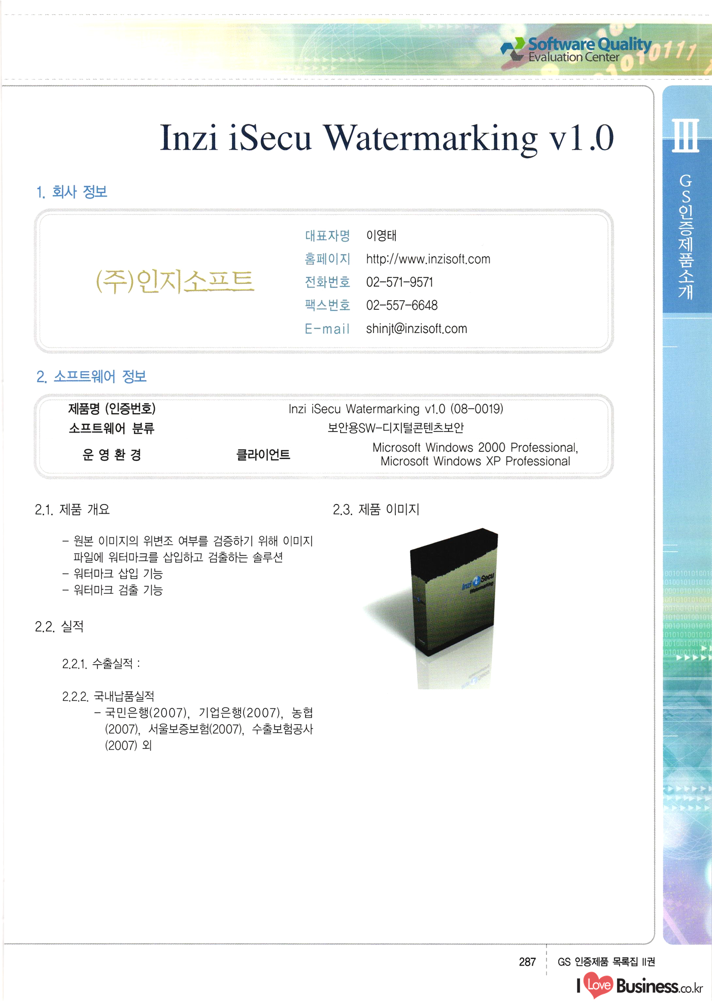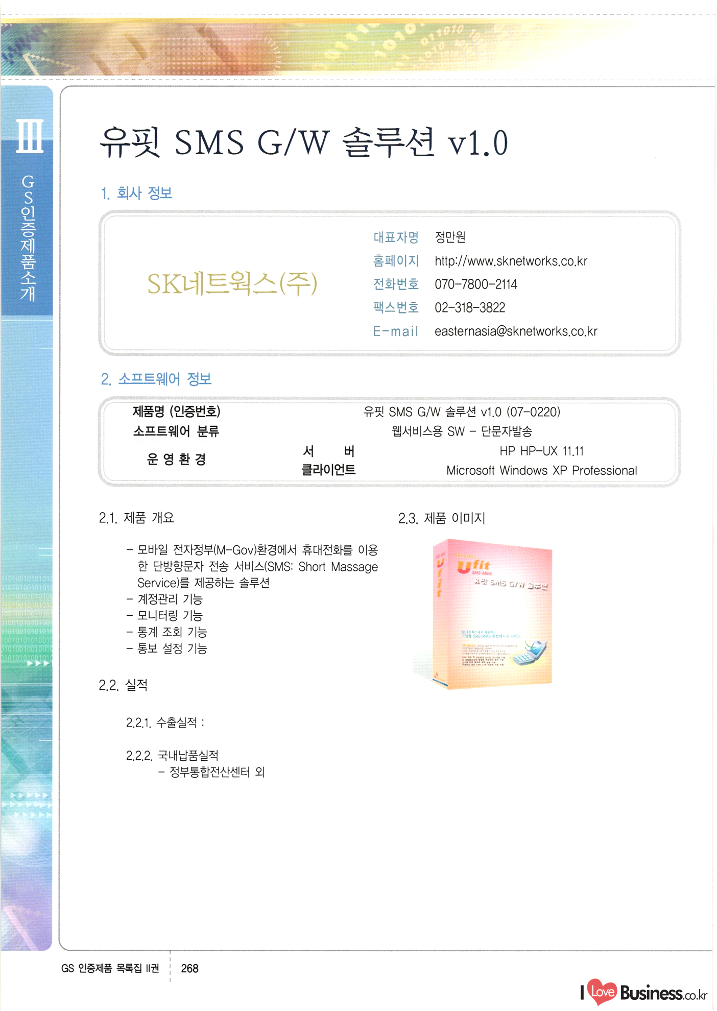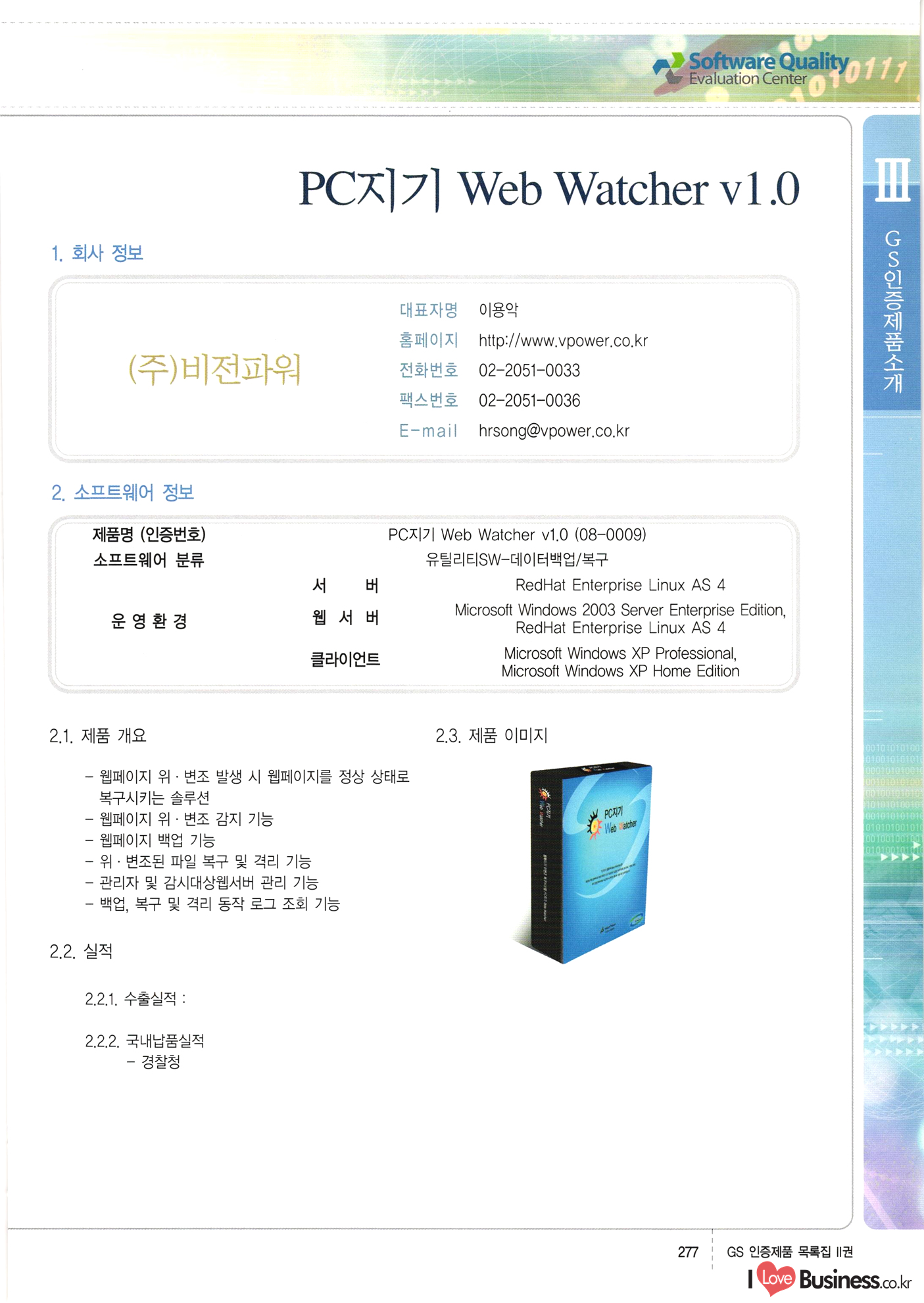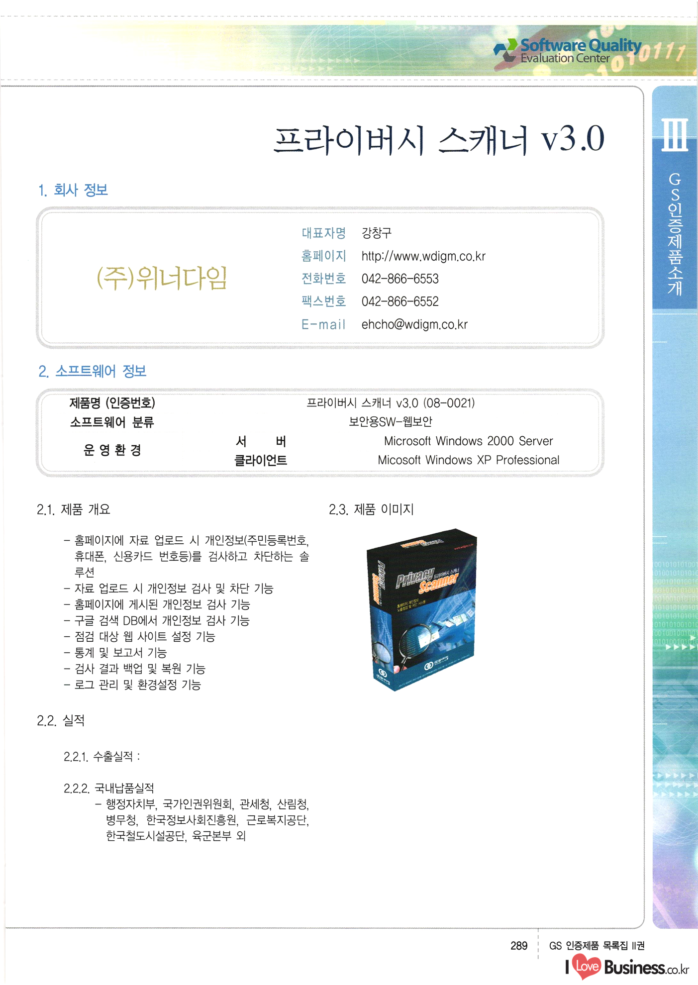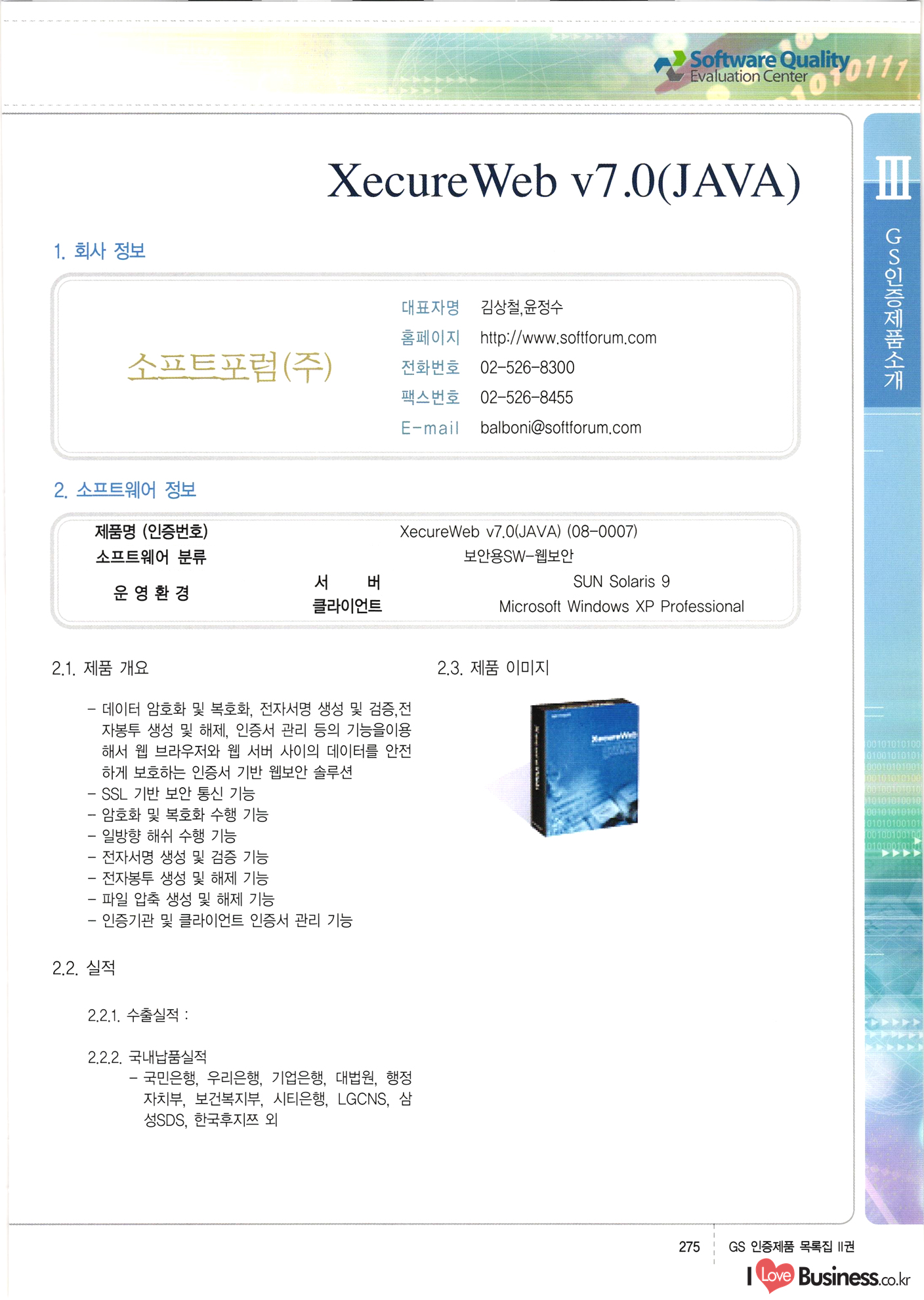 | III. GS 인증제품 목록 | 권-페이지번호 | 권-페이지번호 VT : VeriTest 국제 인증 GS인증제품목록 회사명 삼성에스디에스(주) 제품. EasyBase v4.1 페이지 50 1 제이엔에스 3DM Survey System v1.0 2 | 51 1 (주)싸이웍스 (주)테크다임 (주)다보넷 (주)로지스인포 CyberWALL 2000 v2.16 Jword v1.5 Touchsign v 2.1 키퍼엣홈 v1.0 78 52 (주)미래에듀테크 아이버스 v1.0 53 54 55 56 57 번호 | 인증번호 | 인증일자 01-0001 | 2001.07.25 101-0002 2001.10.22 (02-0027) | 01-0003 | 2001.11.27 | 01-0004 | 2001.11.27 | 01-0005 2001.11.27 5 | 01-0006 | 2001.12.27 02-0001 (02-0029) 2002.01.29 16 | | 02-0002 1 | 2002.02.16 | 02-0003 | 2002.02.16 02-0004 2002.02.27 9 | 02-0005 | 2002.02.27 110 | | 02-0006 | 2002.03.27 11 | || 02-0007 | 2002.03.27 | 02-0008 | 2002.04.30 | 02-0009 | 2002.04.30 | 02-0010 | 2002.04.30 15. | 02-0011 | 2002.04.30 16 102-0012 | 2002.04.30 | 17 | 02-0013 | 2002.05.30 | 18 | 02-0014 | 2002.05.30 | 02-0015 2002.06.28 | 20 | 02-0016 | 2002.06.28 02-0017 1 2002.06.28 | 02-0018 1 | 2002.06.28 23 | 02-0019 | 2002.06.28 24 02-0020 | 2002.07.31 25 | 02-0021 | 2002.07.31 224 58 14 59 118 (주)마크애니 (주)핸디소프트 (주)슈퍼테크놀러지 (주)스펙트라 이래정보시스템(주) (주)컴리빙아이티 | (주)시큐브 (주)케이게이트 (주)소프트4소프트 스페이스인터네셔널(주) (주)컴리빙아이티 (주)그린벨시스템즈 닉스테크(주) 심플소프트 (주)한국데이타비즈네스 (주)테크다임 (주)수세리눅스코리아 (주)한컴리눅스 소프트온넷(주) 와우리눅스(주) 60 61 Document Safer v1.0 | BizFlow Groupware v3.21 | Eg columbus || v1.0 | | eNomix v1.0 Blue Eyes v3.0 i-Class Five v1.05 Secuve TOS WG v1.0 위즈웹3 v3.0 RESORT v1.01 CD Tower v2.0 i-Class One2one v1.05 MANTIS-Professional v1.0 | | SAFEpc v1.5 Simple Gallery v1.00 통합카드발급프로그램 v1.0 Techdigm JCalc v2.0 Suse Linux 7.1K Professional Hancom Linux OS 2.2 Professional | Z!Stream v2.0 와우리눅스 7.1 파란 Secuve TOS WG Agent (Secuve Tos WG Manager) | SMERP v1.1 상하수도범용/ZEUS v1.0 U-Solver v1.0 dDIMS v3.0 DAL v2.5 101010101 1000 101003010101 190 1001010101 21 78. 122 | UL 63 64 65 26 | VT-02-001 | 2002.08.29 (주)시큐브 224 27 1 66 67 | 28 29 130 | 02-0022 | 2002.08.30 | 02-0023 | 2002.10.31 | 02-0024 | 2002.10.31 | 02-0025 | 2002.11.27 | 02-0026 | 2002.11.27 02-0027 (01-0002) 2002.11.27 | 02-0028 (03-0021) 2002.12.09 | 대한상공회의소 한국통신데이타(주) (주)지노시스템 유니온정보시스템(주) (주) 스 68 69 | 70 311 제이엔에스 소프트(구 제이엔에스) 3DM Survey System v1.0 (주)한국지능형정보시스템 한국관(상하수도 범용/TGW) v1.00 92 GS 인증제품 목록집 1권 | 26 I Love Business.co.kr Software Quality, 111 Evaluation Center | 권-페이지번호 II권페이지번호 VT : VeriTest 국제 인증 페이지 회사명 (주)포스데이타 제품 | iSign v2.0 | GS인증제품목록 171 | 34 | 02-0029 (주)제이슨테크(구 미래에듀테크) 아이버스 v1.0 91 72 73. 74 (주)인텔리젼스웨어 (주)하나디에스디 (주)연성정보기술 (주)포스정보 (주)켈코인 (주)포스데이타 스페이스인터내셔널 연희정보통신(주) (주)뉴테크웨이브 c-napse(GSS) v1.0 Life EduBuilder v1.0 | Email+ v3.0 1 책꽃이KDC v3.1 Challenger Webzine Webschool v3.0 1 Biz Binder v1.0 CD-Tower v3.1 상하수도 범용/UFCom v1.0 | | VirusChaser v5.0 | 175 76 118. (주)웨어벨리 Orange for ORACLE v2.2 | 번호 | 인증번호 | 인증일자 | 33 |VT-02-0022002.12.12 | | 2002.12.24 (02-0001) 35 | VT-02-003 | 2002.12.30 | 36 | 03-0001 | 2003.02.28 37. 03-0002 | 2003.02.28 | 38 | 03-0003 | 2003.02.28 | 39 | 03-0004 | 2003.02.28 40 | VT-03-001 | 2003.03.10 41 | VT-03-002) 2003.03.10 1 42 | 03-0005 | 2003.04.07 43 | 03-0006 | 2003.04.07 03-0007 2003.04.30 (03-0026) | 03-0008 | 2003.04.30 45 | 03-0009 | 2003.04.30 | 03-0010 | 2003.04.30 | 47 | 03-0011 | 2003.04.30 | 48 VT-03-003 2003.05.26 49 | 03-0012 | 2003.06.05 | 50 | 03-0013 | 2003.06.05 | 51 | 03-0014 | 2003.06.05 | 52 | 03-0015 | 2003.07.10 | 53 | 03-0016 | 2003.07.10 | 54 | 03-0017 | 2003.07.10 | | 55 | 03-0018 | 2003.07.10 | 56 | 03-0019 | 2003.08.06 57 | | 03-0020 | 2003.08.06 44 1 18 46 80 81 82 83 | (주)테크다임 (주)엔지스테크널러지 삼성에스디에스(주) 삼성에스디에스(주) (주)미디어랜드 인터컴소프트웨어(주) 에스케이씨앤씨(주) 아이티로직스(주) (주)에이씨티소프트 (주)위즈북 (주)에스오엔코리아 (주)아리수미디어 한진정보통신(주) (주)인텔리전스웨어 (주)웨어밸리 (구 (주)오알솔루션즈코리아) Techdigm Office v2.0 | G-Solution Waterworks/Sewerage v1.0 | | 79 UniCITY Standard v1.0 UniCITY Enterprise v1.0 TCO!stream 2002 v4.0 | ServerGuard v3.0 | SK-UPEX v1.0 84 NexWeb v1.2 e-Library Deluxe v4.1.5 86 DL Pro v1.0 SiR v1.01 파워CD뱅크 v4.0 89 InfoMatrix v1.00 190 Bizpus v1.0 91 85 87 88 10010010101.03 1101010100101 1100100100107 58 |VT-03-004 2003.08.12 Orange for ORACLE v2.2 | 111 59 (주)티지더블유 (구 한국지능형정보시스템) 한국관(상하수도 범용/TGW) v1.0 92 93 GIS Free v1.0 DeskPlus v2.0 1 | 94 ArcCITY v1.0 110 03-0021 (02-0028) | 2003.09.04 | 60 | 03-0022 | 2003.09.30 03-0023 | 2003.09.30 03-0024 (04-0011) | 2003.09.30 | 03-0025 | 2003.09.30 03-0026 (03-0007) | 2003.10.07 63 | 03-0027 | 2003.11.12 64 | 03-0028 | 2003.11.12 622 세광정보시스템(주) 제오스페이스(주) (주)선도소프트 (구 (주)캐드랜드) 중앙항업(주) (주)웨어밸리 (구 (주)오알솔루션즈코리아) (주)우암닷컴 (주)오투라인 geoCUBE상하수도 v1.0 95 Orange for ORACLE V2.2 111 96 RAVCOMS Eyecon v4.0 오투스쿨 v2.01 97 GS 인증제품 목록집 1권 I Love Business.co.kr | 권-페이지번호 | 권 - 페이지번호 VT : VeriTest 국제 인증 번호 페이지 회사명 소프트캠프