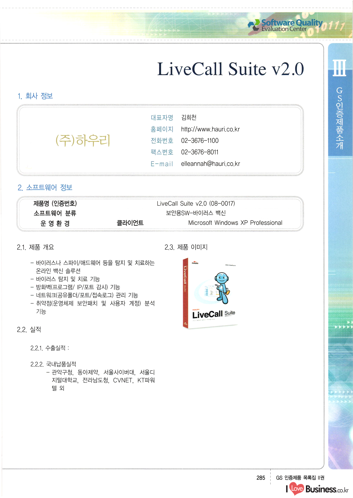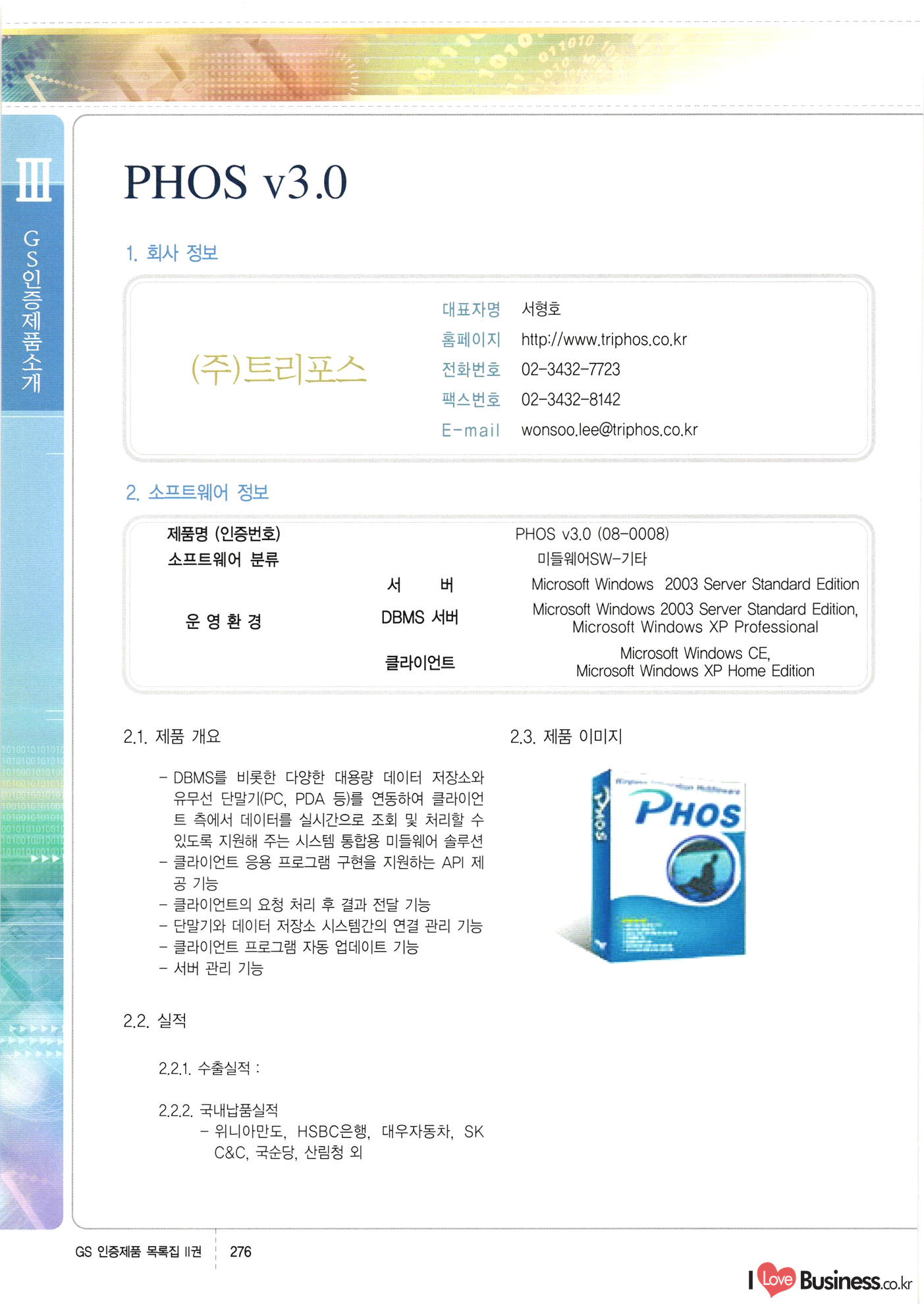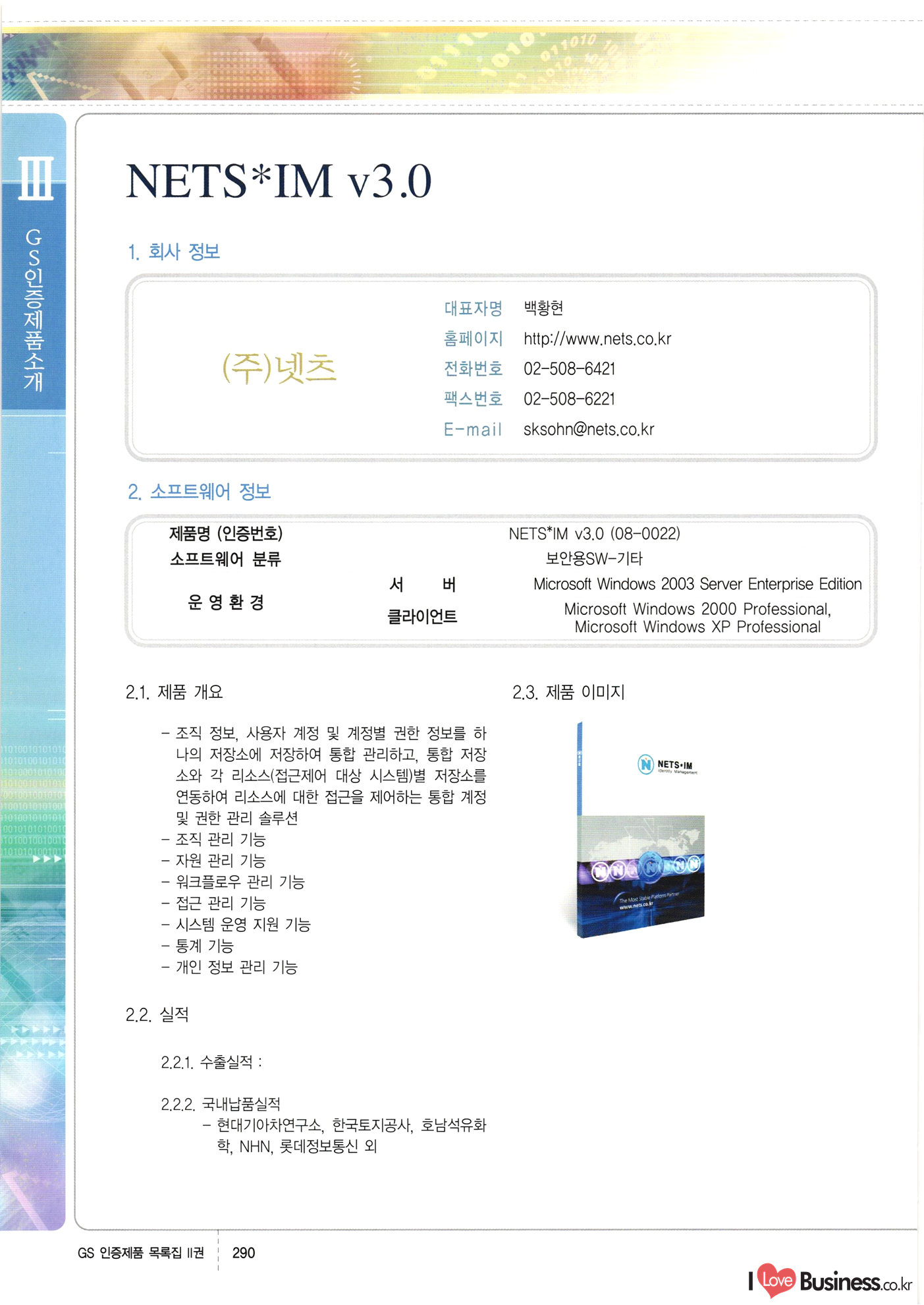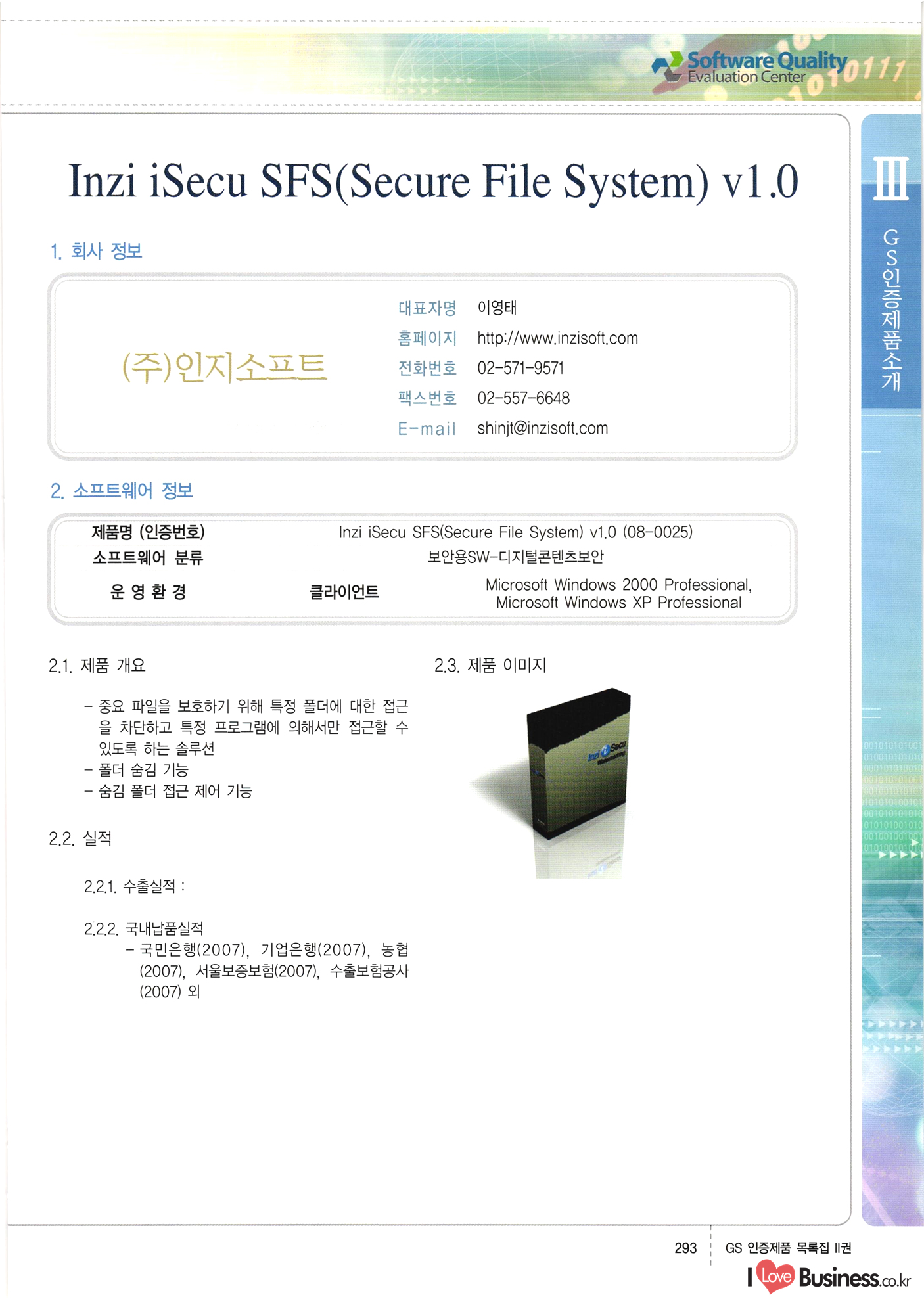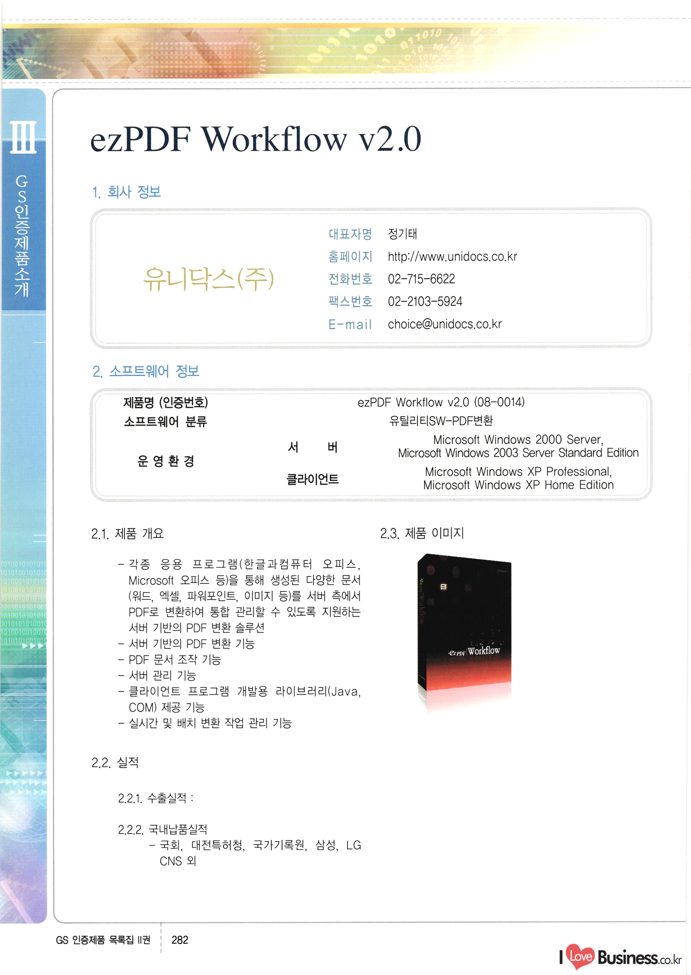 | III. GS 인증제품 목록 | 권-페이지번호 | 권-페이지번호 VT : VeriTest 국제 인증 GS인증제품목록 회사명 삼성에스디에스(주) 제품. EasyBase v4.1 페이지 50 1 제이엔에스 3DM Survey System v1.0 2 | 51 1 (주)싸이웍스 (주)테크다임 (주)다보넷 (주)로지스인포 CyberWALL 2000 v2.16 Jword v1.5 Touchsign v 2.1 키퍼엣홈 v1.0 78 52 (주)미래에듀테크 아이버스 v1.0 53 54 55 56 57 번호 | 인증번호 | 인증일자 01-0001 | 2001.07.25 101-0002 2001.10.22 (02-0027) | 01-0003 | 2001.11.27 | 01-0004 | 2001.11.27 | 01-0005 2001.11.27 5 | 01-0006 | 2001.12.27 02-0001 (02-0029) 2002.01.29 16 | | 02-0002 1 | 2002.02.16 | 02-0003 | 2002.02.16 02-0004 2002.02.27 9 | 02-0005 | 2002.02.27 110 | | 02-0006 | 2002.03.27 11 | || 02-0007 | 2002.03.27 | 02-0008 | 2002.04.30 | 02-0009 | 2002.04.30 | 02-0010 | 2002.04.30 15. | 02-0011 | 2002.04.30 16 102-0012 | 2002.04.30 | 17 | 02-0013 | 2002.05.30 | 18 | 02-0014 | 2002.05.30 | 02-0015 2002.06.28 | 20 | 02-0016 | 2002.06.28 02-0017 1 2002.06.28 | 02-0018 1 | 2002.06.28 23 | 02-0019 | 2002.06.28 24 02-0020 | 2002.07.31 25 | 02-0021 | 2002.07.31 224 58 14 59 118 (주)마크애니 (주)핸디소프트 (주)슈퍼테크놀러지 (주)스펙트라 이래정보시스템(주) (주)컴리빙아이티 | (주)시큐브 (주)케이게이트 (주)소프트4소프트 스페이스인터네셔널(주) (주)컴리빙아이티 (주)그린벨시스템즈 닉스테크(주) 심플소프트 (주)한국데이타비즈네스 (주)테크다임 (주)수세리눅스코리아 (주)한컴리눅스 소프트온넷(주) 와우리눅스(주) 60 61 Document Safer v1.0 | BizFlow Groupware v3.21 | Eg columbus || v1.0 | | eNomix v1.0 Blue Eyes v3.0 i-Class Five v1.05 Secuve TOS WG v1.0 위즈웹3 v3.0 RESORT v1.01 CD Tower v2.0 i-Class One2one v1.05 MANTIS-Professional v1.0 | | SAFEpc v1.5 Simple Gallery v1.00 통합카드발급프로그램 v1.0 Techdigm JCalc v2.0 Suse Linux 7.1K Professional Hancom Linux OS 2.2 Professional | Z!Stream v2.0 와우리눅스 7.1 파란 Secuve TOS WG Agent (Secuve Tos WG Manager) | SMERP v1.1 상하수도범용/ZEUS v1.0 U-Solver v1.0 dDIMS v3.0 DAL v2.5 101010101 1000 101003010101 190 1001010101 21 78. 122 | UL 63 64 65 26 | VT-02-001 | 2002.08.29 (주)시큐브 224 27 1 66 67 | 28 29 130 | 02-0022 | 2002.08.30 | 02-0023 | 2002.10.31 | 02-0024 | 2002.10.31 | 02-0025 | 2002.11.27 | 02-0026 | 2002.11.27 02-0027 (01-0002) 2002.11.27 | 02-0028 (03-0021) 2002.12.09 | 대한상공회의소 한국통신데이타(주) (주)지노시스템 유니온정보시스템(주) (주) 스 68 69 | 70 311 제이엔에스 소프트(구 제이엔에스) 3DM Survey System v1.0 (주)한국지능형정보시스템 한국관(상하수도 범용/TGW) v1.00 92 GS 인증제품 목록집 1권 | 26 I Love Business.co.kr Software Quality, 111 Evaluation Center | 권-페이지번호 II권페이지번호 VT : VeriTest 국제 인증 페이지 회사명 (주)포스데이타 제품 | iSign v2.0 | GS인증제품목록 171 | 34 | 02-0029 (주)제이슨테크(구 미래에듀테크) 아이버스 v1.0 91 72 73. 74 (주)인텔리젼스웨어 (주)하나디에스디 (주)연성정보기술 (주)포스정보 (주)켈코인 (주)포스데이타 스페이스인터내셔널 연희정보통신(주) (주)뉴테크웨이브 c-napse(GSS) v1.0 Life EduBuilder v1.0 | Email+ v3.0 1 책꽃이KDC v3.1 Challenger Webzine Webschool v3.0 1 Biz Binder v1.0 CD-Tower v3.1 상하수도 범용/UFCom v1.0 | | VirusChaser v5.0 | 175 76 118. (주)웨어벨리 Orange for ORACLE v2.2 | 번호 | 인증번호 | 인증일자 | 33 |VT-02-0022002.12.12 | | 2002.12.24 (02-0001) 35 | VT-02-003 | 2002.12.30 | 36 | 03-0001 | 2003.02.28 37. 03-0002 | 2003.02.28 | 38 | 03-0003 | 2003.02.28 | 39 | 03-0004 | 2003.02.28 40 | VT-03-001 | 2003.03.10 41 | VT-03-002) 2003.03.10 1 42 | 03-0005 | 2003.04.07 43 | 03-0006 | 2003.04.07 03-0007 2003.04.30 (03-0026) | 03-0008 | 2003.04.30 45 | 03-0009 | 2003.04.30 | 03-0010 | 2003.04.30 | 47 | 03-0011 | 2003.04.30 | 48 VT-03-003 2003.05.26 49 | 03-0012 | 2003.06.05 | 50 | 03-0013 | 2003.06.05 | 51 | 03-0014 | 2003.06.05 | 52 | 03-0015 | 2003.07.10 | 53 | 03-0016 | 2003.07.10 | 54 | 03-0017 | 2003.07.10 | | 55 | 03-0018 | 2003.07.10 | 56 | 03-0019 | 2003.08.06 57 | | 03-0020 | 2003.08.06 44 1 18 46 80 81 82 83 | (주)테크다임 (주)엔지스테크널러지 삼성에스디에스(주) 삼성에스디에스(주) (주)미디어랜드 인터컴소프트웨어(주) 에스케이씨앤씨(주) 아이티로직스(주) (주)에이씨티소프트 (주)위즈북 (주)에스오엔코리아 (주)아리수미디어 한진정보통신(주) (주)인텔리전스웨어 (주)웨어밸리 (구 (주)오알솔루션즈코리아) Techdigm Office v2.0 | G-Solution Waterworks/Sewerage v1.0 | | 79 UniCITY Standard v1.0 UniCITY Enterprise v1.0 TCO!stream 2002 v4.0 | ServerGuard v3.0 | SK-UPEX v1.0 84 NexWeb v1.2 e-Library Deluxe v4.1.5 86 DL Pro v1.0 SiR v1.01 파워CD뱅크 v4.0 89 InfoMatrix v1.00 190 Bizpus v1.0 91 85 87 88 10010010101.03 1101010100101 1100100100107 58 |VT-03-004 2003.08.12 Orange for ORACLE v2.2 | 111 59 (주)티지더블유 (구 한국지능형정보시스템) 한국관(상하수도 범용/TGW) v1.0 92 93 GIS Free v1.0 DeskPlus v2.0 1 | 94 ArcCITY v1.0 110 03-0021 (02-0028) | 2003.09.04 | 60 | 03-0022 | 2003.09.30 03-0023 | 2003.09.30 03-0024 (04-0011) | 2003.09.30 | 03-0025 | 2003.09.30 03-0026 (03-0007) | 2003.10.07 63 | 03-0027 | 2003.11.12 64 | 03-0028 | 2003.11.12 622 세광정보시스템(주) 제오스페이스(주) (주)선도소프트 (구 (주)캐드랜드) 중앙항업(주) (주)웨어밸리 (구 (주)오알솔루션즈코리아) (주)우암닷컴 (주)오투라인 geoCUBE상하수도 v1.0 95 Orange for ORACLE V2.2 111 96 RAVCOMS Eyecon v4.0 오투스쿨 v2.01 97 GS 인증제품 목록집 1권 I Love Business.co.kr | 권-페이지번호 | 권 - 페이지번호 VT : VeriTest 국제 인증 번호 페이지 회사명 소프트캠프