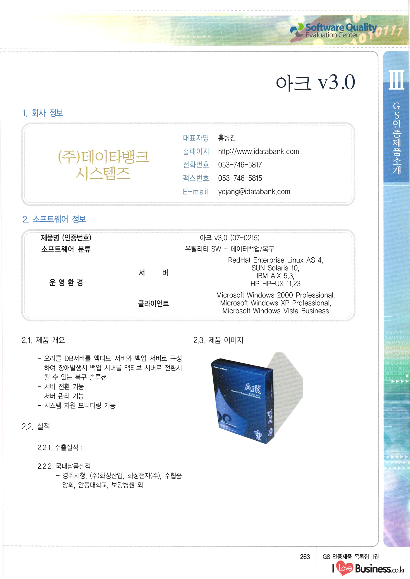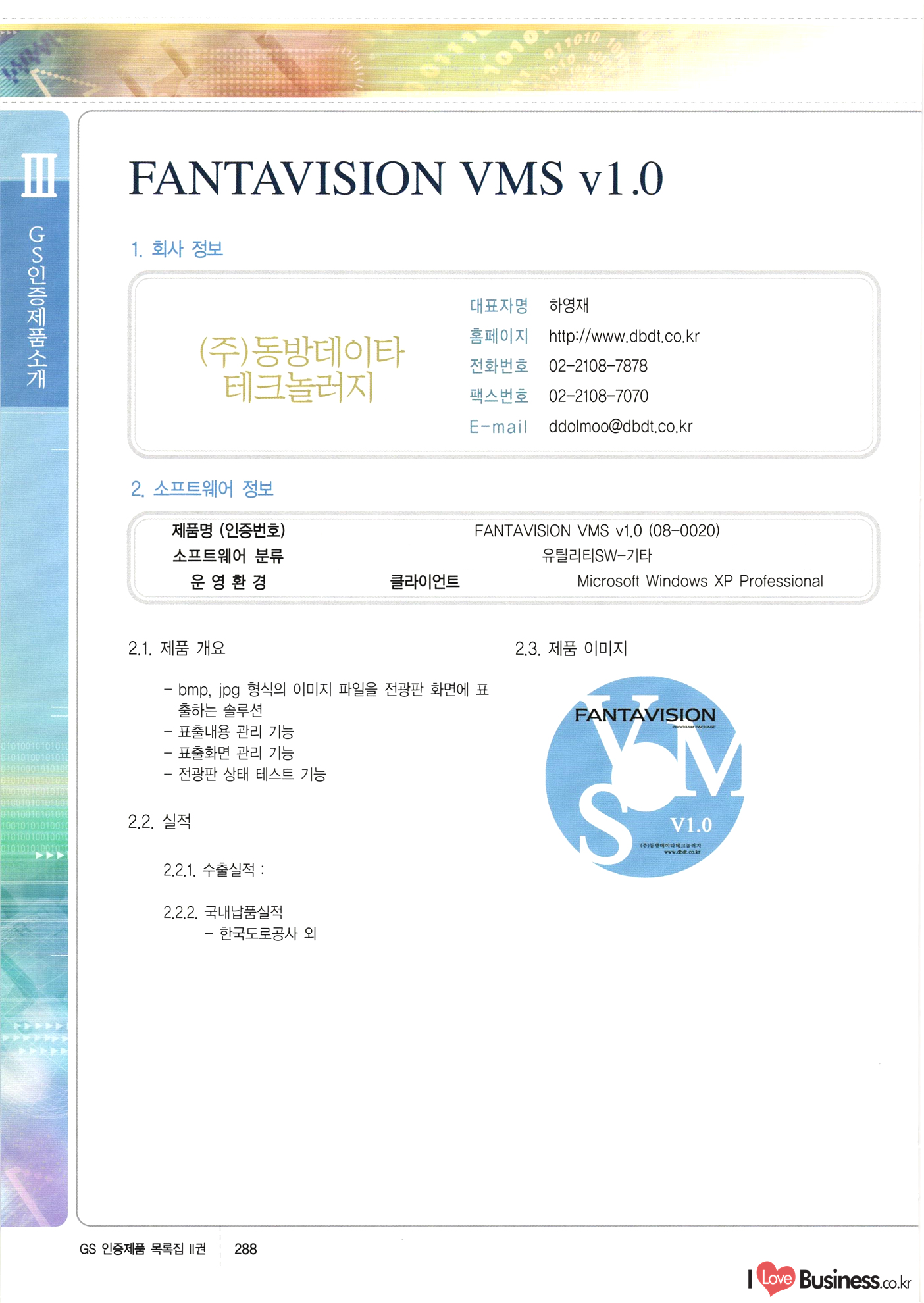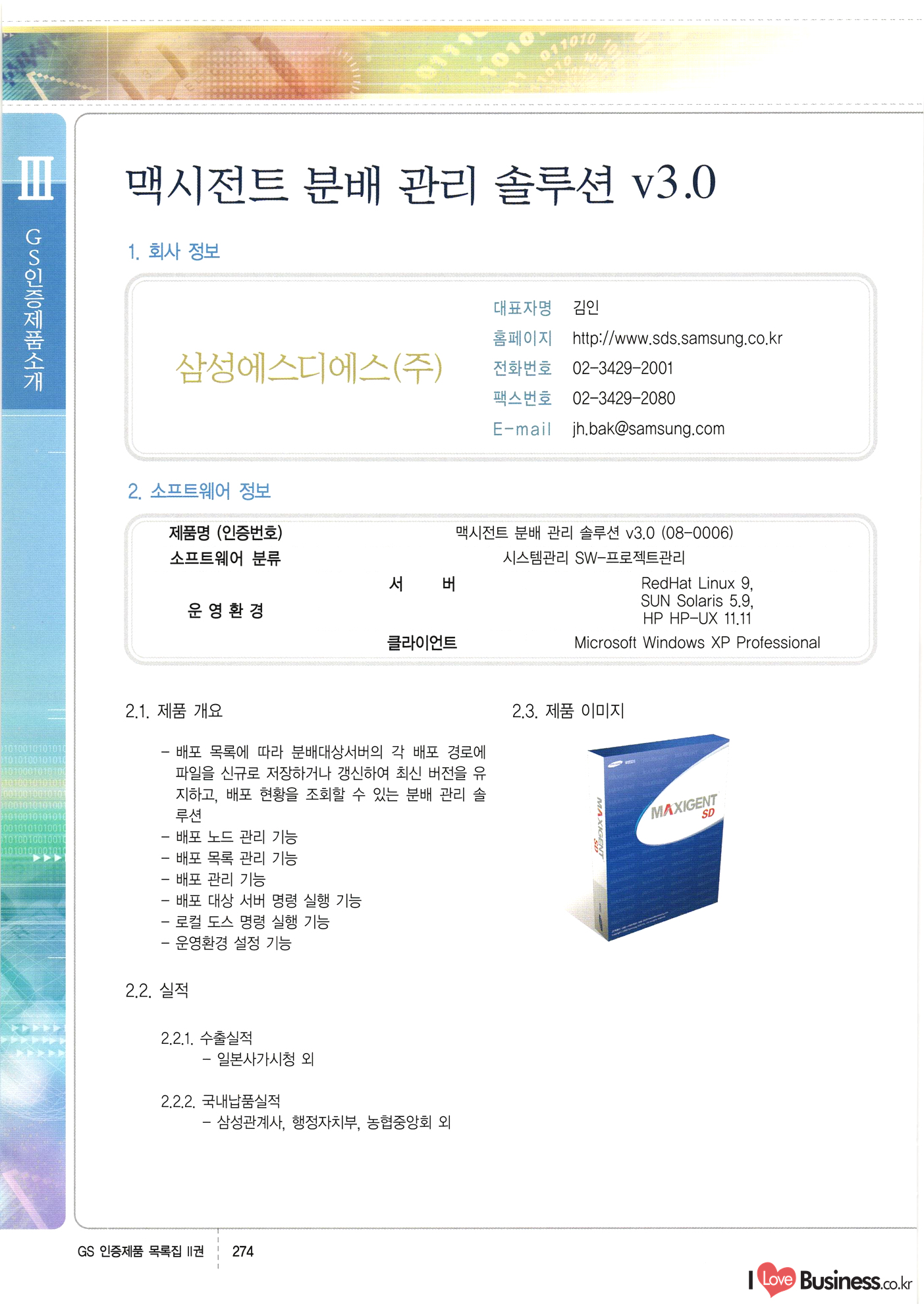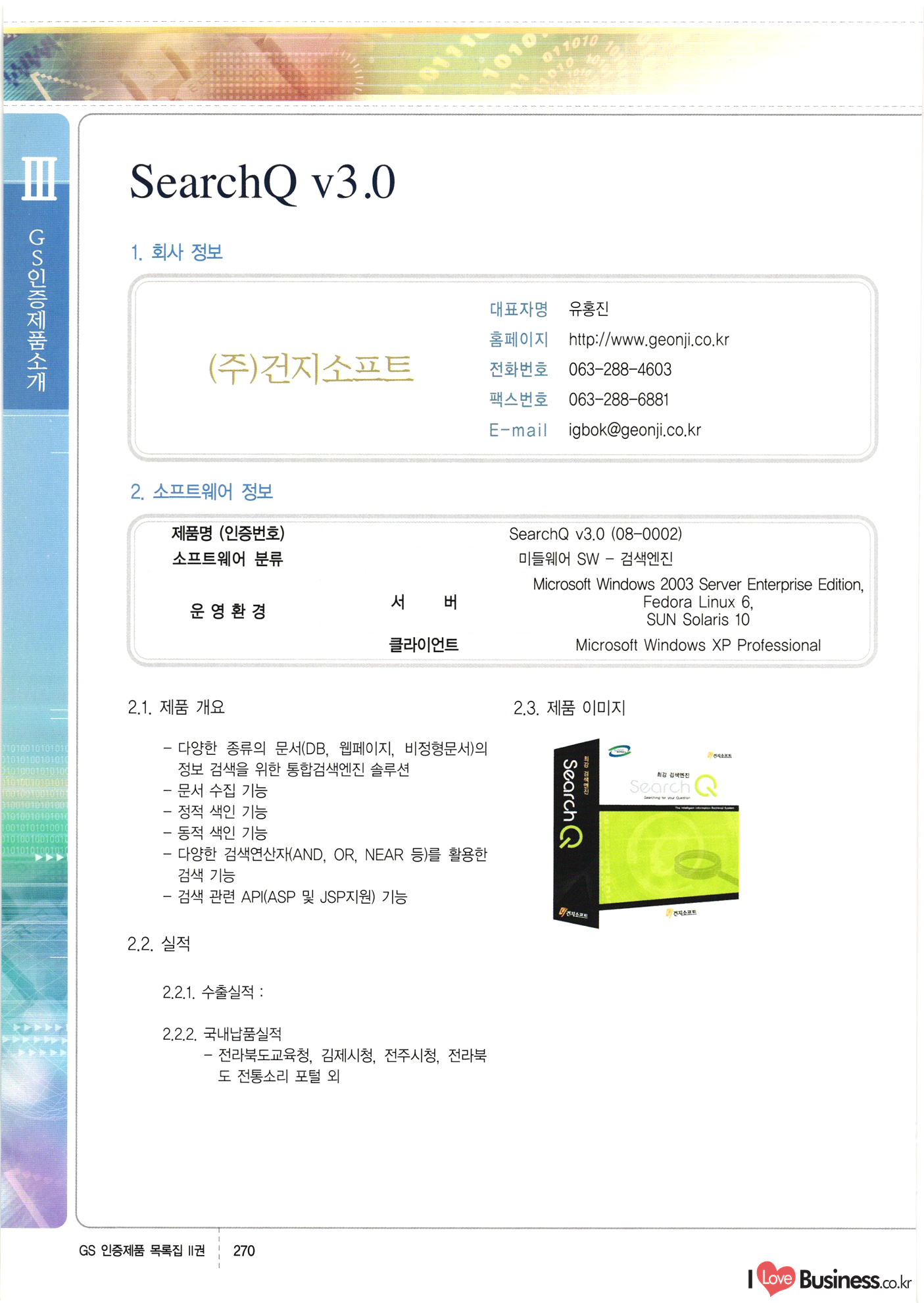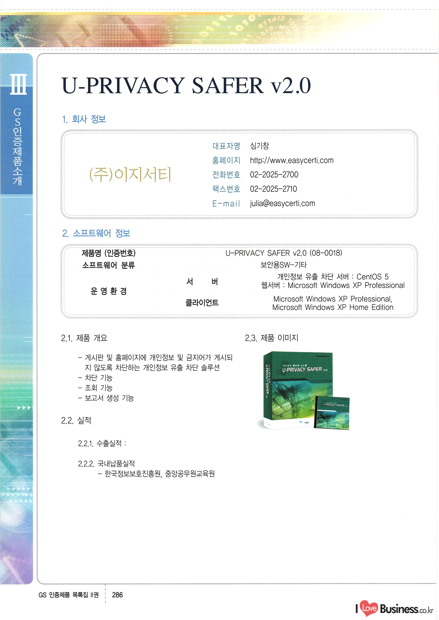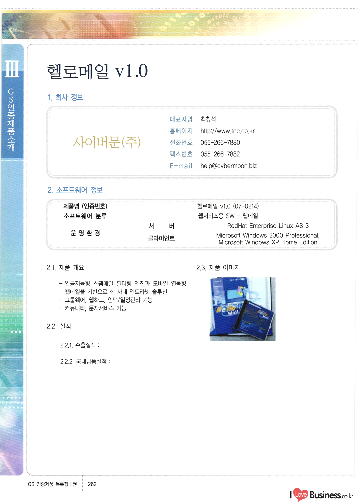 | III. GS 인증제품 목록 | 권-페이지번호 | 권-페이지번호 VT : VeriTest 국제 인증 GS인증제품목록 회사명 삼성에스디에스(주) 제품. EasyBase v4.1 페이지 50 1 제이엔에스 3DM Survey System v1.0 2 | 51 1 (주)싸이웍스 (주)테크다임 (주)다보넷 (주)로지스인포 CyberWALL 2000 v2.16 Jword v1.5 Touchsign v 2.1 키퍼엣홈 v1.0 78 52 (주)미래에듀테크 아이버스 v1.0 53 54 55 56 57 번호 | 인증번호 | 인증일자 01-0001 | 2001.07.25 101-0002 2001.10.22 (02-0027) | 01-0003 | 2001.11.27 | 01-0004 | 2001.11.27 | 01-0005 2001.11.27 5 | 01-0006 | 2001.12.27 02-0001 (02-0029) 2002.01.29 16 | | 02-0002 1 | 2002.02.16 | 02-0003 | 2002.02.16 02-0004 2002.02.27 9 | 02-0005 | 2002.02.27 110 | | 02-0006 | 2002.03.27 11 | || 02-0007 | 2002.03.27 | 02-0008 | 2002.04.30 | 02-0009 | 2002.04.30 | 02-0010 | 2002.04.30 15. | 02-0011 | 2002.04.30 16 102-0012 | 2002.04.30 | 17 | 02-0013 | 2002.05.30 | 18 | 02-0014 | 2002.05.30 | 02-0015 2002.06.28 | 20 | 02-0016 | 2002.06.28 02-0017 1 2002.06.28 | 02-0018 1 | 2002.06.28 23 | 02-0019 | 2002.06.28 24 02-0020 | 2002.07.31 25 | 02-0021 | 2002.07.31 224 58 14 59 118 (주)마크애니 (주)핸디소프트 (주)슈퍼테크놀러지 (주)스펙트라 이래정보시스템(주) (주)컴리빙아이티 | (주)시큐브 (주)케이게이트 (주)소프트4소프트 스페이스인터네셔널(주) (주)컴리빙아이티 (주)그린벨시스템즈 닉스테크(주) 심플소프트 (주)한국데이타비즈네스 (주)테크다임 (주)수세리눅스코리아 (주)한컴리눅스 소프트온넷(주) 와우리눅스(주) 60 61 Document Safer v1.0 | BizFlow Groupware v3.21 | Eg columbus || v1.0 | | eNomix v1.0 Blue Eyes v3.0 i-Class Five v1.05 Secuve TOS WG v1.0 위즈웹3 v3.0 RESORT v1.01 CD Tower v2.0 i-Class One2one v1.05 MANTIS-Professional v1.0 | | SAFEpc v1.5 Simple Gallery v1.00 통합카드발급프로그램 v1.0 Techdigm JCalc v2.0 Suse Linux 7.1K Professional Hancom Linux OS 2.2 Professional | Z!Stream v2.0 와우리눅스 7.1 파란 Secuve TOS WG Agent (Secuve Tos WG Manager) | SMERP v1.1 상하수도범용/ZEUS v1.0 U-Solver v1.0 dDIMS v3.0 DAL v2.5 101010101 1000 101003010101 190 1001010101 21 78. 122 | UL 63 64 65 26 | VT-02-001 | 2002.08.29 (주)시큐브 224 27 1 66 67 | 28 29 130 | 02-0022 | 2002.08.30 | 02-0023 | 2002.10.31 | 02-0024 | 2002.10.31 | 02-0025 | 2002.11.27 | 02-0026 | 2002.11.27 02-0027 (01-0002) 2002.11.27 | 02-0028 (03-0021) 2002.12.09 | 대한상공회의소 한국통신데이타(주) (주)지노시스템 유니온정보시스템(주) (주) 스 68 69 | 70 311 제이엔에스 소프트(구 제이엔에스) 3DM Survey System v1.0 (주)한국지능형정보시스템 한국관(상하수도 범용/TGW) v1.00 92 GS 인증제품 목록집 1권 | 26 I Love Business.co.kr Software Quality, 111 Evaluation Center | 권-페이지번호 II권페이지번호 VT : VeriTest 국제 인증 페이지 회사명 (주)포스데이타 제품 | iSign v2.0 | GS인증제품목록 171 | 34 | 02-0029 (주)제이슨테크(구 미래에듀테크) 아이버스 v1.0 91 72 73. 74 (주)인텔리젼스웨어 (주)하나디에스디 (주)연성정보기술 (주)포스정보 (주)켈코인 (주)포스데이타 스페이스인터내셔널 연희정보통신(주) (주)뉴테크웨이브 c-napse(GSS) v1.0 Life EduBuilder v1.0 | Email+ v3.0 1 책꽃이KDC v3.1 Challenger Webzine Webschool v3.0 1 Biz Binder v1.0 CD-Tower v3.1 상하수도 범용/UFCom v1.0 | | VirusChaser v5.0 | 175 76 118. (주)웨어벨리 Orange for ORACLE v2.2 | 번호 | 인증번호 | 인증일자 | 33 |VT-02-0022002.12.12 | | 2002.12.24 (02-0001) 35 | VT-02-003 | 2002.12.30 | 36 | 03-0001 | 2003.02.28 37. 03-0002 | 2003.02.28 | 38 | 03-0003 | 2003.02.28 | 39 | 03-0004 | 2003.02.28 40 | VT-03-001 | 2003.03.10 41 | VT-03-002) 2003.03.10 1 42 | 03-0005 | 2003.04.07 43 | 03-0006 | 2003.04.07 03-0007 2003.04.30 (03-0026) | 03-0008 | 2003.04.30 45 | 03-0009 | 2003.04.30 | 03-0010 | 2003.04.30 | 47 | 03-0011 | 2003.04.30 | 48 VT-03-003 2003.05.26 49 | 03-0012 | 2003.06.05 | 50 | 03-0013 | 2003.06.05 | 51 | 03-0014 | 2003.06.05 | 52 | 03-0015 | 2003.07.10 | 53 | 03-0016 | 2003.07.10 | 54 | 03-0017 | 2003.07.10 | | 55 | 03-0018 | 2003.07.10 | 56 | 03-0019 | 2003.08.06 57 | | 03-0020 | 2003.08.06 44 1 18 46 80 81 82 83 | (주)테크다임 (주)엔지스테크널러지 삼성에스디에스(주) 삼성에스디에스(주) (주)미디어랜드 인터컴소프트웨어(주) 에스케이씨앤씨(주) 아이티로직스(주) (주)에이씨티소프트 (주)위즈북 (주)에스오엔코리아 (주)아리수미디어 한진정보통신(주) (주)인텔리전스웨어 (주)웨어밸리 (구 (주)오알솔루션즈코리아) Techdigm Office v2.0 | G-Solution Waterworks/Sewerage v1.0 | | 79 UniCITY Standard v1.0 UniCITY Enterprise v1.0 TCO!stream 2002 v4.0 | ServerGuard v3.0 | SK-UPEX v1.0 84 NexWeb v1.2 e-Library Deluxe v4.1.5 86 DL Pro v1.0 SiR v1.01 파워CD뱅크 v4.0 89 InfoMatrix v1.00 190 Bizpus v1.0 91 85 87 88 10010010101.03 1101010100101 1100100100107 58 |VT-03-004 2003.08.12 Orange for ORACLE v2.2 | 111 59 (주)티지더블유 (구 한국지능형정보시스템) 한국관(상하수도 범용/TGW) v1.0 92 93 GIS Free v1.0 DeskPlus v2.0 1 | 94 ArcCITY v1.0 110 03-0021 (02-0028) | 2003.09.04 | 60 | 03-0022 | 2003.09.30 03-0023 | 2003.09.30 03-0024 (04-0011) | 2003.09.30 | 03-0025 | 2003.09.30 03-0026 (03-0007) | 2003.10.07 63 | 03-0027 | 2003.11.12 64 | 03-0028 | 2003.11.12 622 세광정보시스템(주) 제오스페이스(주) (주)선도소프트 (구 (주)캐드랜드) 중앙항업(주) (주)웨어밸리 (구 (주)오알솔루션즈코리아) (주)우암닷컴 (주)오투라인 geoCUBE상하수도 v1.0 95 Orange for ORACLE V2.2 111 96 RAVCOMS Eyecon v4.0 오투스쿨 v2.01 97 GS 인증제품 목록집 1권 I Love Business.co.kr | 권-페이지번호 | 권 - 페이지번호 VT : VeriTest 국제 인증 번호 페이지 회사명 소프트캠프