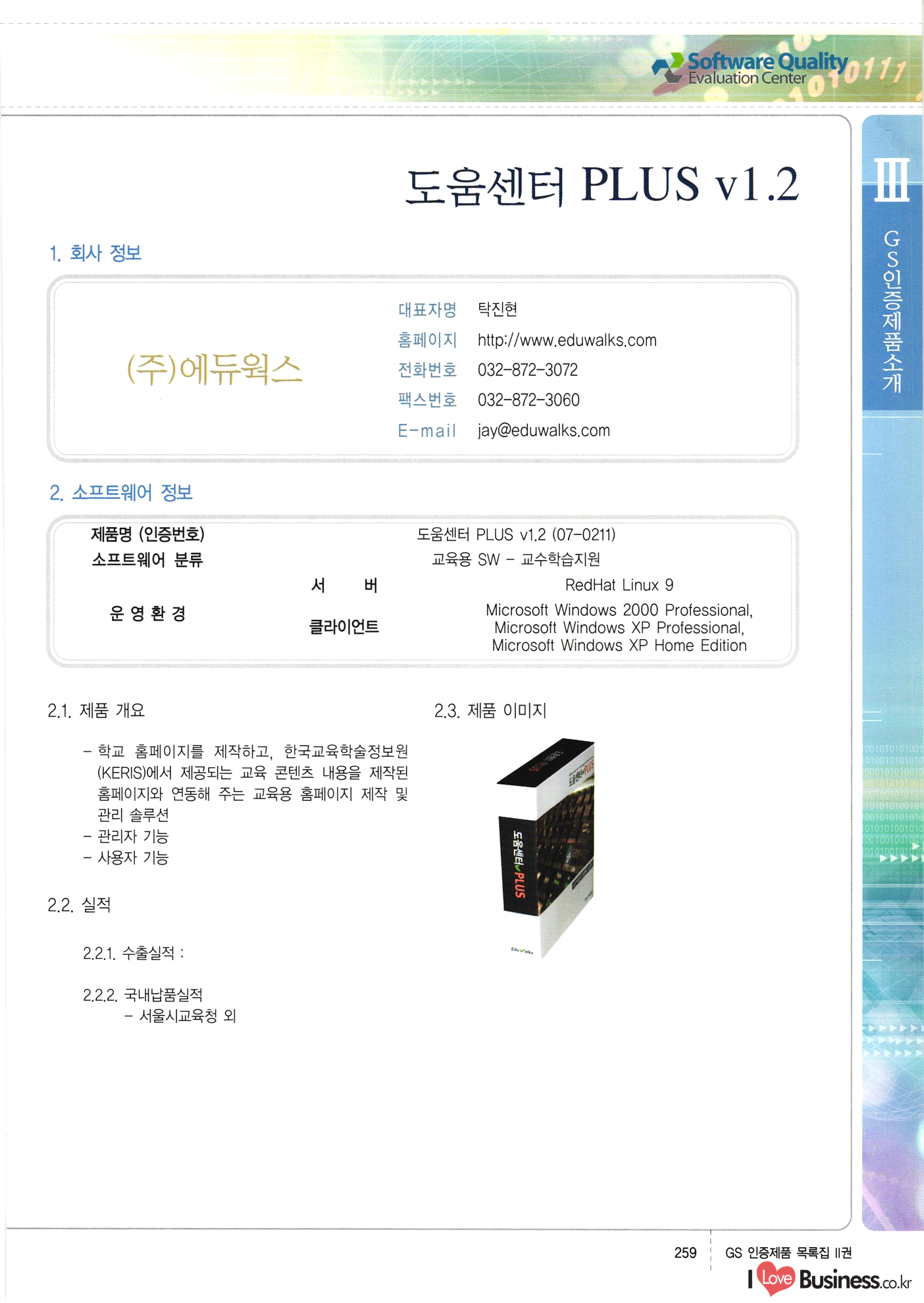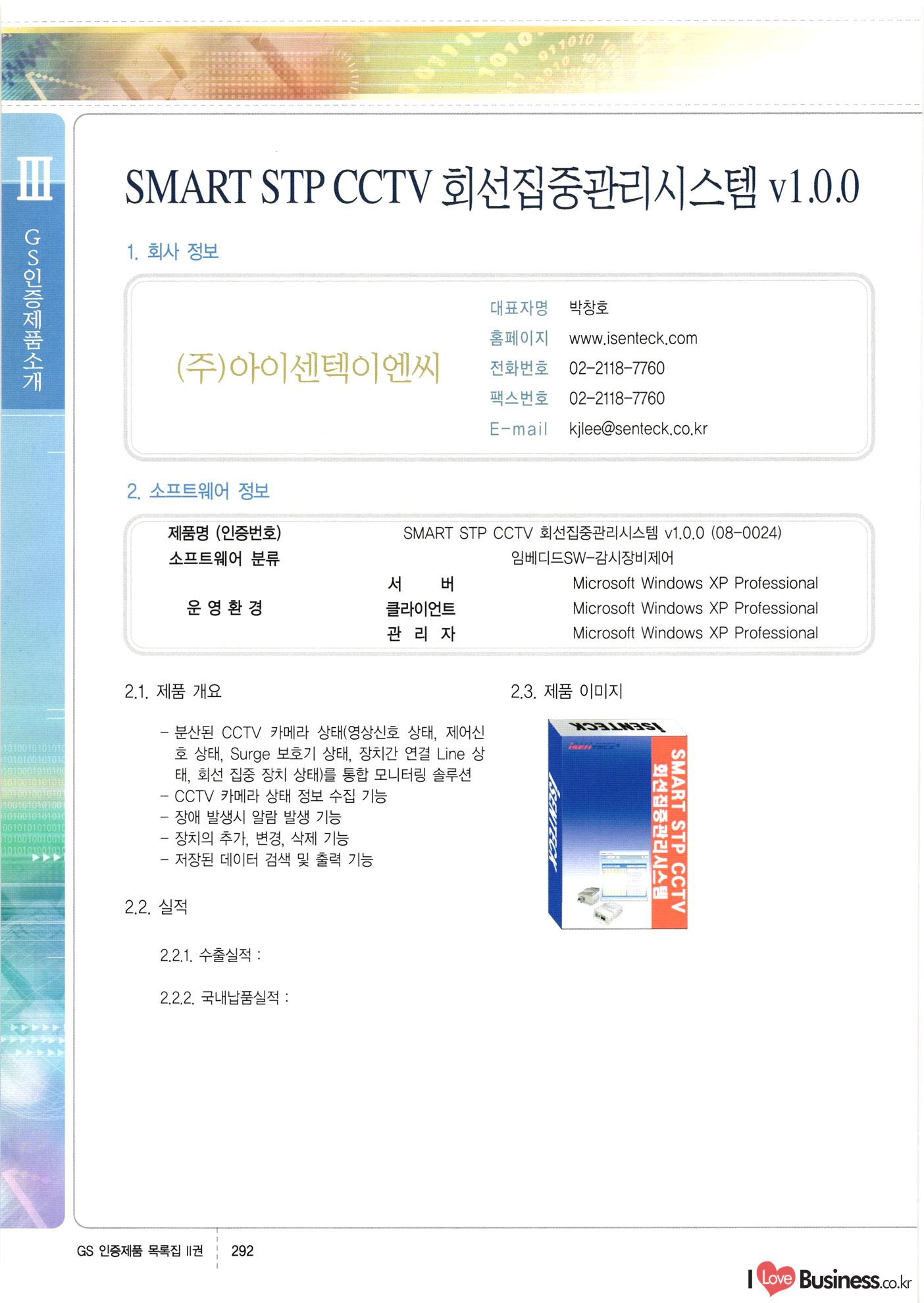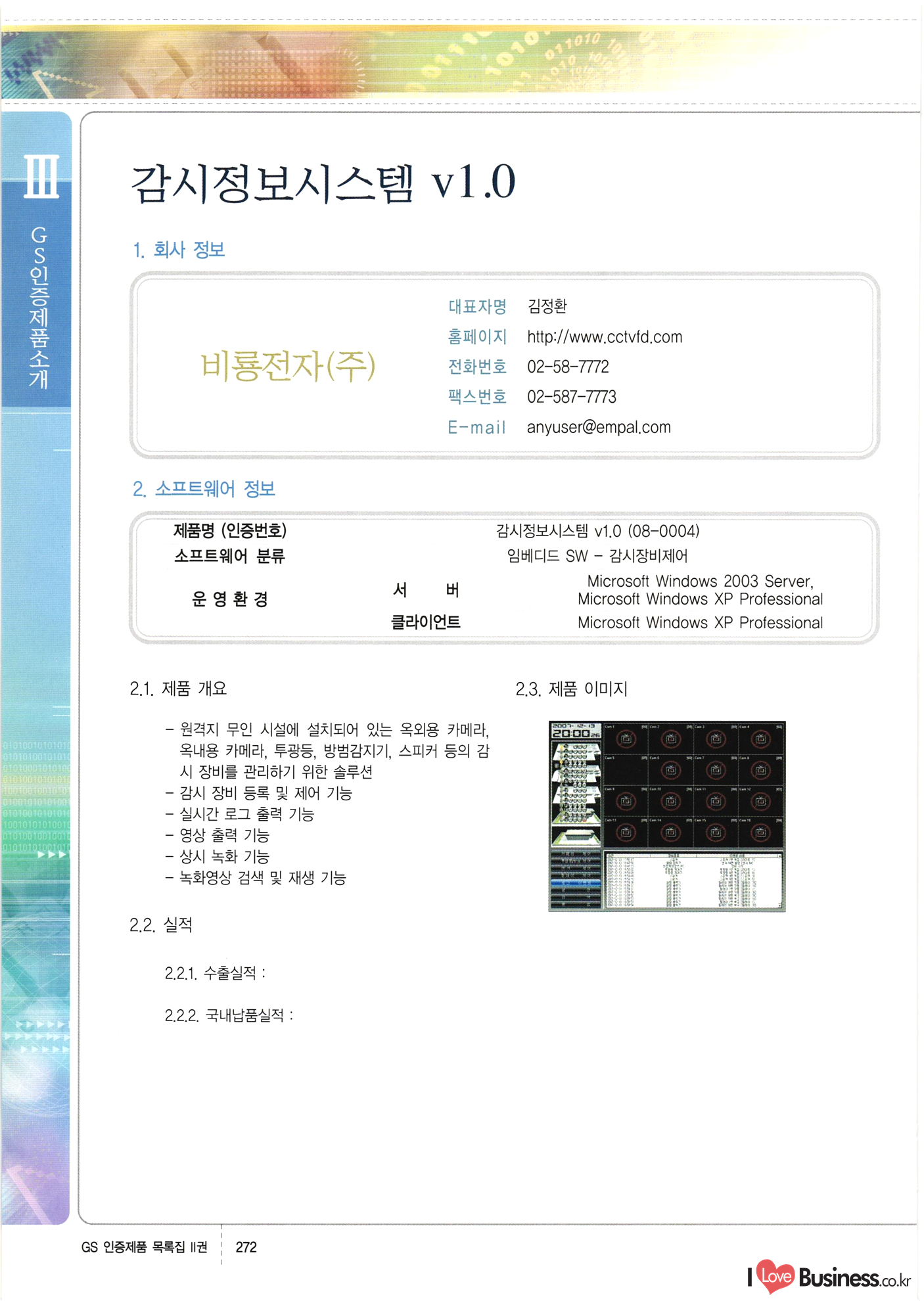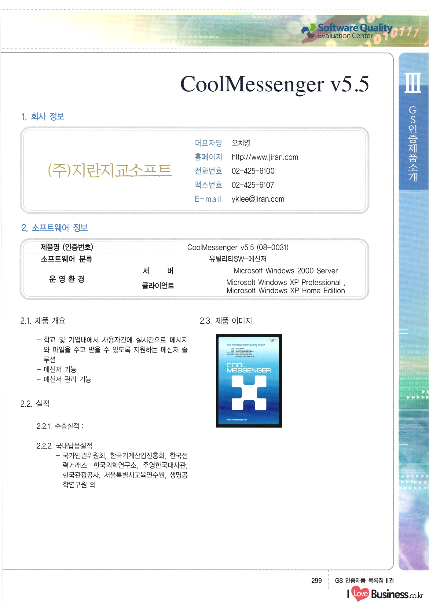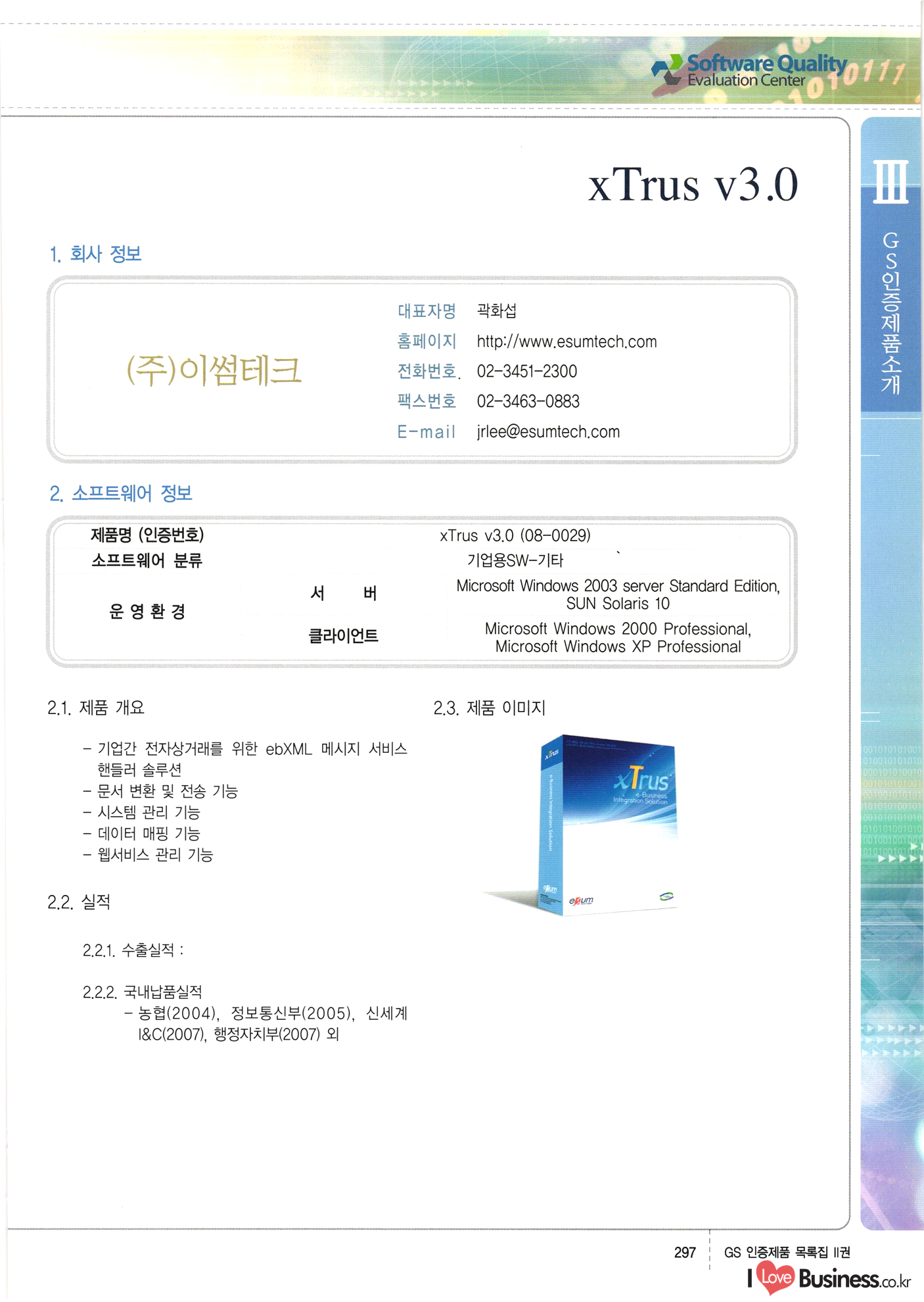 | III. GS 인증제품 목록 | 권-페이지번호 | 권-페이지번호 VT : VeriTest 국제 인증 GS인증제품목록 회사명 삼성에스디에스(주) 제품. EasyBase v4.1 페이지 50 1 제이엔에스 3DM Survey System v1.0 2 | 51 1 (주)싸이웍스 (주)테크다임 (주)다보넷 (주)로지스인포 CyberWALL 2000 v2.16 Jword v1.5 Touchsign v 2.1 키퍼엣홈 v1.0 78 52 (주)미래에듀테크 아이버스 v1.0 53 54 55 56 57 번호 | 인증번호 | 인증일자 01-0001 | 2001.07.25 101-0002 2001.10.22 (02-0027) | 01-0003 | 2001.11.27 | 01-0004 | 2001.11.27 | 01-0005 2001.11.27 5 | 01-0006 | 2001.12.27 02-0001 (02-0029) 2002.01.29 16 | | 02-0002 1 | 2002.02.16 | 02-0003 | 2002.02.16 02-0004 2002.02.27 9 | 02-0005 | 2002.02.27 110 | | 02-0006 | 2002.03.27 11 | || 02-0007 | 2002.03.27 | 02-0008 | 2002.04.30 | 02-0009 | 2002.04.30 | 02-0010 | 2002.04.30 15. | 02-0011 | 2002.04.30 16 102-0012 | 2002.04.30 | 17 | 02-0013 | 2002.05.30 | 18 | 02-0014 | 2002.05.30 | 02-0015 2002.06.28 | 20 | 02-0016 | 2002.06.28 02-0017 1 2002.06.28 | 02-0018 1 | 2002.06.28 23 | 02-0019 | 2002.06.28 24 02-0020 | 2002.07.31 25 | 02-0021 | 2002.07.31 224 58 14 59 118 (주)마크애니 (주)핸디소프트 (주)슈퍼테크놀러지 (주)스펙트라 이래정보시스템(주) (주)컴리빙아이티 | (주)시큐브 (주)케이게이트 (주)소프트4소프트 스페이스인터네셔널(주) (주)컴리빙아이티 (주)그린벨시스템즈 닉스테크(주) 심플소프트 (주)한국데이타비즈네스 (주)테크다임 (주)수세리눅스코리아 (주)한컴리눅스 소프트온넷(주) 와우리눅스(주) 60 61 Document Safer v1.0 | BizFlow Groupware v3.21 | Eg columbus || v1.0 | | eNomix v1.0 Blue Eyes v3.0 i-Class Five v1.05 Secuve TOS WG v1.0 위즈웹3 v3.0 RESORT v1.01 CD Tower v2.0 i-Class One2one v1.05 MANTIS-Professional v1.0 | | SAFEpc v1.5 Simple Gallery v1.00 통합카드발급프로그램 v1.0 Techdigm JCalc v2.0 Suse Linux 7.1K Professional Hancom Linux OS 2.2 Professional | Z!Stream v2.0 와우리눅스 7.1 파란 Secuve TOS WG Agent (Secuve Tos WG Manager) | SMERP v1.1 상하수도범용/ZEUS v1.0 U-Solver v1.0 dDIMS v3.0 DAL v2.5 101010101 1000 101003010101 190 1001010101 21 78. 122 | UL 63 64 65 26 | VT-02-001 | 2002.08.29 (주)시큐브 224 27 1 66 67 | 28 29 130 | 02-0022 | 2002.08.30 | 02-0023 | 2002.10.31 | 02-0024 | 2002.10.31 | 02-0025 | 2002.11.27 | 02-0026 | 2002.11.27 02-0027 (01-0002) 2002.11.27 | 02-0028 (03-0021) 2002.12.09 | 대한상공회의소 한국통신데이타(주) (주)지노시스템 유니온정보시스템(주) (주) 스 68 69 | 70 311 제이엔에스 소프트(구 제이엔에스) 3DM Survey System v1.0 (주)한국지능형정보시스템 한국관(상하수도 범용/TGW) v1.00 92 GS 인증제품 목록집 1권 | 26 I Love Business.co.kr Software Quality, 111 Evaluation Center | 권-페이지번호 II권페이지번호 VT : VeriTest 국제 인증 페이지 회사명 (주)포스데이타 제품 | iSign v2.0 | GS인증제품목록 171 | 34 | 02-0029 (주)제이슨테크(구 미래에듀테크) 아이버스 v1.0 91 72 73. 74 (주)인텔리젼스웨어 (주)하나디에스디 (주)연성정보기술 (주)포스정보 (주)켈코인 (주)포스데이타 스페이스인터내셔널 연희정보통신(주) (주)뉴테크웨이브 c-napse(GSS) v1.0 Life EduBuilder v1.0 | Email+ v3.0 1 책꽃이KDC v3.1 Challenger Webzine Webschool v3.0 1 Biz Binder v1.0 CD-Tower v3.1 상하수도 범용/UFCom v1.0 | | VirusChaser v5.0 | 175 76 118. (주)웨어벨리 Orange for ORACLE v2.2 | 번호 | 인증번호 | 인증일자 | 33 |VT-02-0022002.12.12 | | 2002.12.24 (02-0001) 35 | VT-02-003 | 2002.12.30 | 36 | 03-0001 | 2003.02.28 37. 03-0002 | 2003.02.28 | 38 | 03-0003 | 2003.02.28 | 39 | 03-0004 | 2003.02.28 40 | VT-03-001 | 2003.03.10 41 | VT-03-002) 2003.03.10 1 42 | 03-0005 | 2003.04.07 43 | 03-0006 | 2003.04.07 03-0007 2003.04.30 (03-0026) | 03-0008 | 2003.04.30 45 | 03-0009 | 2003.04.30 | 03-0010 | 2003.04.30 | 47 | 03-0011 | 2003.04.30 | 48 VT-03-003 2003.05.26 49 | 03-0012 | 2003.06.05 | 50 | 03-0013 | 2003.06.05 | 51 | 03-0014 | 2003.06.05 | 52 | 03-0015 | 2003.07.10 | 53 | 03-0016 | 2003.07.10 | 54 | 03-0017 | 2003.07.10 | | 55 | 03-0018 | 2003.07.10 | 56 | 03-0019 | 2003.08.06 57 | | 03-0020 | 2003.08.06 44 1 18 46 80 81 82 83 | (주)테크다임 (주)엔지스테크널러지 삼성에스디에스(주) 삼성에스디에스(주) (주)미디어랜드 인터컴소프트웨어(주) 에스케이씨앤씨(주) 아이티로직스(주) (주)에이씨티소프트 (주)위즈북 (주)에스오엔코리아 (주)아리수미디어 한진정보통신(주) (주)인텔리전스웨어 (주)웨어밸리 (구 (주)오알솔루션즈코리아) Techdigm Office v2.0 | G-Solution Waterworks/Sewerage v1.0 | | 79 UniCITY Standard v1.0 UniCITY Enterprise v1.0 TCO!stream 2002 v4.0 | ServerGuard v3.0 | SK-UPEX v1.0 84 NexWeb v1.2 e-Library Deluxe v4.1.5 86 DL Pro v1.0 SiR v1.01 파워CD뱅크 v4.0 89 InfoMatrix v1.00 190 Bizpus v1.0 91 85 87 88 10010010101.03 1101010100101 1100100100107 58 |VT-03-004 2003.08.12 Orange for ORACLE v2.2 | 111 59 (주)티지더블유 (구 한국지능형정보시스템) 한국관(상하수도 범용/TGW) v1.0 92 93 GIS Free v1.0 DeskPlus v2.0 1 | 94 ArcCITY v1.0 110 03-0021 (02-0028) | 2003.09.04 | 60 | 03-0022 | 2003.09.30 03-0023 | 2003.09.30 03-0024 (04-0011) | 2003.09.30 | 03-0025 | 2003.09.30 03-0026 (03-0007) | 2003.10.07 63 | 03-0027 | 2003.11.12 64 | 03-0028 | 2003.11.12 622 세광정보시스템(주) 제오스페이스(주) (주)선도소프트 (구 (주)캐드랜드) 중앙항업(주) (주)웨어밸리 (구 (주)오알솔루션즈코리아) (주)우암닷컴 (주)오투라인 geoCUBE상하수도 v1.0 95 Orange for ORACLE V2.2 111 96 RAVCOMS Eyecon v4.0 오투스쿨 v2.01 97 GS 인증제품 목록집 1권 I Love Business.co.kr | 권-페이지번호 | 권 - 페이지번호 VT : VeriTest 국제 인증 번호 페이지 회사명 소프트캠프