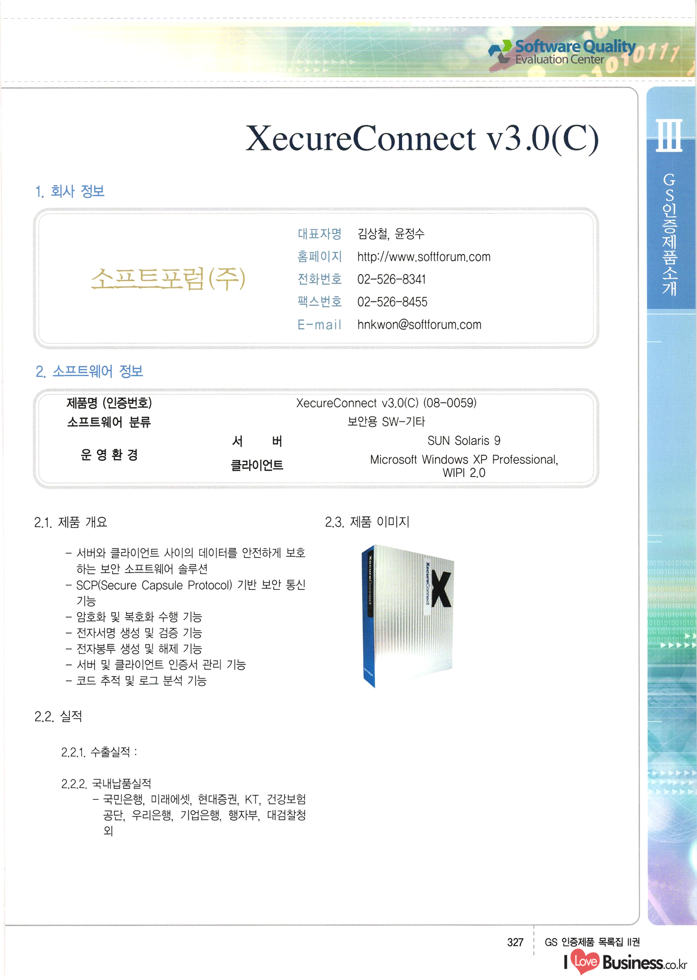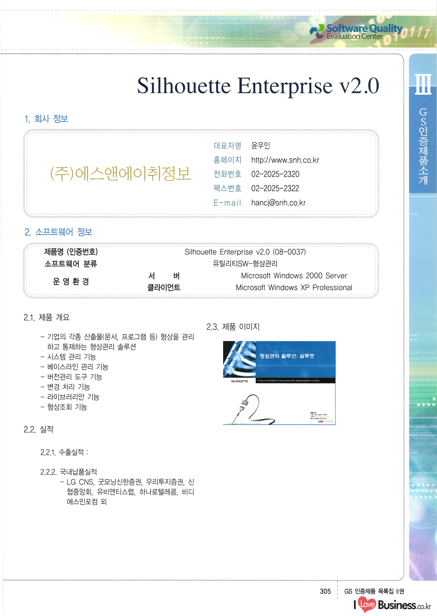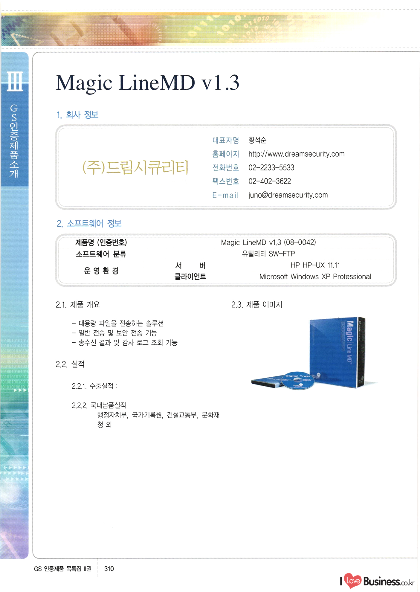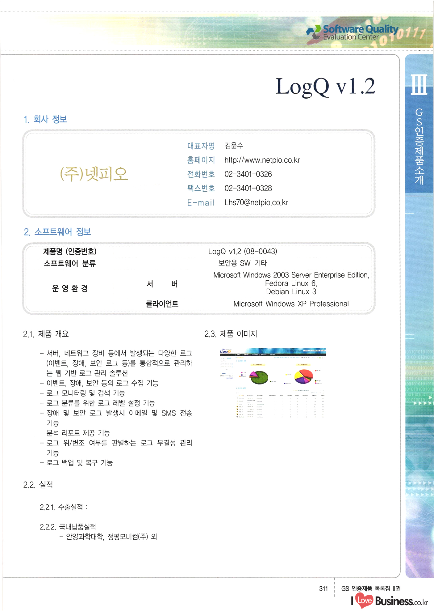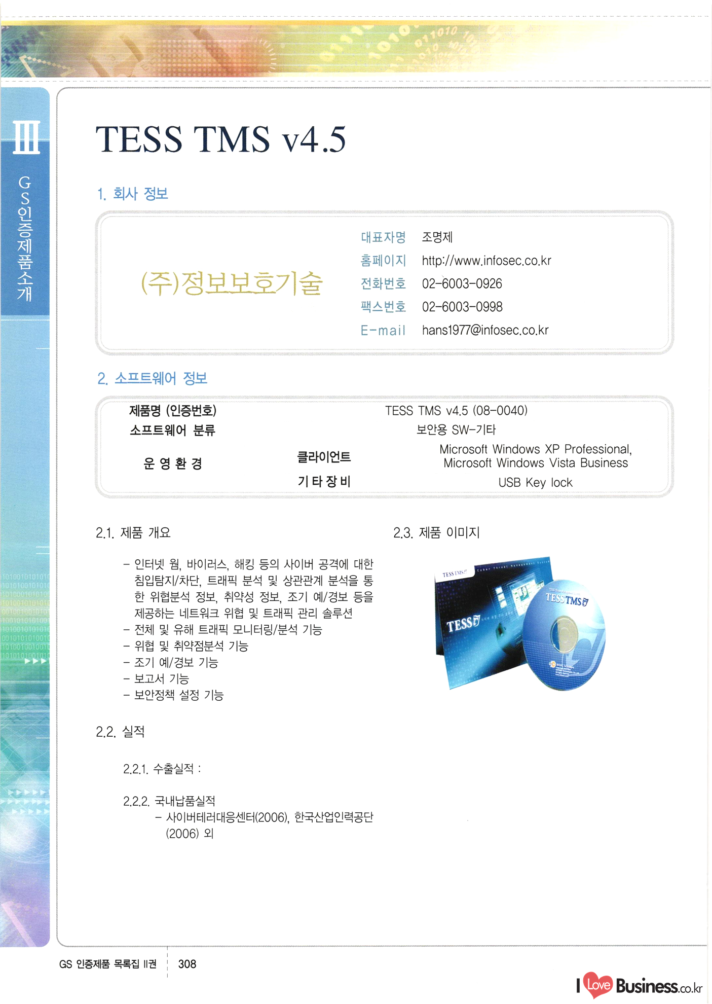 | III. GS 인증제품 목록 | 권-페이지번호 | 권-페이지번호 VT : VeriTest 국제 인증 GS인증제품목록 회사명 삼성에스디에스(주) 제품. EasyBase v4.1 페이지 50 1 제이엔에스 3DM Survey System v1.0 2 | 51 1 (주)싸이웍스 (주)테크다임 (주)다보넷 (주)로지스인포 CyberWALL 2000 v2.16 Jword v1.5 Touchsign v 2.1 키퍼엣홈 v1.0 78 52 (주)미래에듀테크 아이버스 v1.0 53 54 55 56 57 번호 | 인증번호 | 인증일자 01-0001 | 2001.07.25 101-0002 2001.10.22 (02-0027) | 01-0003 | 2001.11.27 | 01-0004 | 2001.11.27 | 01-0005 2001.11.27 5 | 01-0006 | 2001.12.27 02-0001 (02-0029) 2002.01.29 16 | | 02-0002 1 | 2002.02.16 | 02-0003 | 2002.02.16 02-0004 2002.02.27 9 | 02-0005 | 2002.02.27 110 | | 02-0006 | 2002.03.27 11 | || 02-0007 | 2002.03.27 | 02-0008 | 2002.04.30 | 02-0009 | 2002.04.30 | 02-0010 | 2002.04.30 15. | 02-0011 | 2002.04.30 16 102-0012 | 2002.04.30 | 17 | 02-0013 | 2002.05.30 | 18 | 02-0014 | 2002.05.30 | 02-0015 2002.06.28 | 20 | 02-0016 | 2002.06.28 02-0017 1 2002.06.28 | 02-0018 1 | 2002.06.28 23 | 02-0019 | 2002.06.28 24 02-0020 | 2002.07.31 25 | 02-0021 | 2002.07.31 224 58 14 59 118 (주)마크애니 (주)핸디소프트 (주)슈퍼테크놀러지 (주)스펙트라 이래정보시스템(주) (주)컴리빙아이티 | (주)시큐브 (주)케이게이트 (주)소프트4소프트 스페이스인터네셔널(주) (주)컴리빙아이티 (주)그린벨시스템즈 닉스테크(주) 심플소프트 (주)한국데이타비즈네스 (주)테크다임 (주)수세리눅스코리아 (주)한컴리눅스 소프트온넷(주) 와우리눅스(주) 60 61 Document Safer v1.0 | BizFlow Groupware v3.21 | Eg columbus || v1.0 | | eNomix v1.0 Blue Eyes v3.0 i-Class Five v1.05 Secuve TOS WG v1.0 위즈웹3 v3.0 RESORT v1.01 CD Tower v2.0 i-Class One2one v1.05 MANTIS-Professional v1.0 | | SAFEpc v1.5 Simple Gallery v1.00 통합카드발급프로그램 v1.0 Techdigm JCalc v2.0 Suse Linux 7.1K Professional Hancom Linux OS 2.2 Professional | Z!Stream v2.0 와우리눅스 7.1 파란 Secuve TOS WG Agent (Secuve Tos WG Manager) | SMERP v1.1 상하수도범용/ZEUS v1.0 U-Solver v1.0 dDIMS v3.0 DAL v2.5 101010101 1000 101003010101 190 1001010101 21 78. 122 | UL 63 64 65 26 | VT-02-001 | 2002.08.29 (주)시큐브 224 27 1 66 67 | 28 29 130 | 02-0022 | 2002.08.30 | 02-0023 | 2002.10.31 | 02-0024 | 2002.10.31 | 02-0025 | 2002.11.27 | 02-0026 | 2002.11.27 02-0027 (01-0002) 2002.11.27 | 02-0028 (03-0021) 2002.12.09 | 대한상공회의소 한국통신데이타(주) (주)지노시스템 유니온정보시스템(주) (주) 스 68 69 | 70 311 제이엔에스 소프트(구 제이엔에스) 3DM Survey System v1.0 (주)한국지능형정보시스템 한국관(상하수도 범용/TGW) v1.00 92 GS 인증제품 목록집 1권 | 26 I Love Business.co.kr Software Quality, 111 Evaluation Center | 권-페이지번호 II권페이지번호 VT : VeriTest 국제 인증 페이지 회사명 (주)포스데이타 제품 | iSign v2.0 | GS인증제품목록 171 | 34 | 02-0029 (주)제이슨테크(구 미래에듀테크) 아이버스 v1.0 91 72 73. 74 (주)인텔리젼스웨어 (주)하나디에스디 (주)연성정보기술 (주)포스정보 (주)켈코인 (주)포스데이타 스페이스인터내셔널 연희정보통신(주) (주)뉴테크웨이브 c-napse(GSS) v1.0 Life EduBuilder v1.0 | Email+ v3.0 1 책꽃이KDC v3.1 Challenger Webzine Webschool v3.0 1 Biz Binder v1.0 CD-Tower v3.1 상하수도 범용/UFCom v1.0 | | VirusChaser v5.0 | 175 76 118. (주)웨어벨리 Orange for ORACLE v2.2 | 번호 | 인증번호 | 인증일자 | 33 |VT-02-0022002.12.12 | | 2002.12.24 (02-0001) 35 | VT-02-003 | 2002.12.30 | 36 | 03-0001 | 2003.02.28 37. 03-0002 | 2003.02.28 | 38 | 03-0003 | 2003.02.28 | 39 | 03-0004 | 2003.02.28 40 | VT-03-001 | 2003.03.10 41 | VT-03-002) 2003.03.10 1 42 | 03-0005 | 2003.04.07 43 | 03-0006 | 2003.04.07 03-0007 2003.04.30 (03-0026) | 03-0008 | 2003.04.30 45 | 03-0009 | 2003.04.30 | 03-0010 | 2003.04.30 | 47 | 03-0011 | 2003.04.30 | 48 VT-03-003 2003.05.26 49 | 03-0012 | 2003.06.05 | 50 | 03-0013 | 2003.06.05 | 51 | 03-0014 | 2003.06.05 | 52 | 03-0015 | 2003.07.10 | 53 | 03-0016 | 2003.07.10 | 54 | 03-0017 | 2003.07.10 | | 55 | 03-0018 | 2003.07.10 | 56 | 03-0019 | 2003.08.06 57 | | 03-0020 | 2003.08.06 44 1 18 46 80 81 82 83 | (주)테크다임 (주)엔지스테크널러지 삼성에스디에스(주) 삼성에스디에스(주) (주)미디어랜드 인터컴소프트웨어(주) 에스케이씨앤씨(주) 아이티로직스(주) (주)에이씨티소프트 (주)위즈북 (주)에스오엔코리아 (주)아리수미디어 한진정보통신(주) (주)인텔리전스웨어 (주)웨어밸리 (구 (주)오알솔루션즈코리아) Techdigm Office v2.0 | G-Solution Waterworks/Sewerage v1.0 | | 79 UniCITY Standard v1.0 UniCITY Enterprise v1.0 TCO!stream 2002 v4.0 | ServerGuard v3.0 | SK-UPEX v1.0 84 NexWeb v1.2 e-Library Deluxe v4.1.5 86 DL Pro v1.0 SiR v1.01 파워CD뱅크 v4.0 89 InfoMatrix v1.00 190 Bizpus v1.0 91 85 87 88 10010010101.03 1101010100101 1100100100107 58 |VT-03-004 2003.08.12 Orange for ORACLE v2.2 | 111 59 (주)티지더블유 (구 한국지능형정보시스템) 한국관(상하수도 범용/TGW) v1.0 92 93 GIS Free v1.0 DeskPlus v2.0 1 | 94 ArcCITY v1.0 110 03-0021 (02-0028) | 2003.09.04 | 60 | 03-0022 | 2003.09.30 03-0023 | 2003.09.30 03-0024 (04-0011) | 2003.09.30 | 03-0025 | 2003.09.30 03-0026 (03-0007) | 2003.10.07 63 | 03-0027 | 2003.11.12 64 | 03-0028 | 2003.11.12 622 세광정보시스템(주) 제오스페이스(주) (주)선도소프트 (구 (주)캐드랜드) 중앙항업(주) (주)웨어밸리 (구 (주)오알솔루션즈코리아) (주)우암닷컴 (주)오투라인 geoCUBE상하수도 v1.0 95 Orange for ORACLE V2.2 111 96 RAVCOMS Eyecon v4.0 오투스쿨 v2.01 97 GS 인증제품 목록집 1권 I Love Business.co.kr | 권-페이지번호 | 권 - 페이지번호 VT : VeriTest 국제 인증 번호 페이지 회사명 소프트캠프