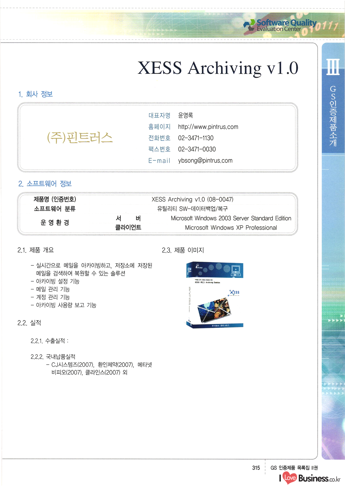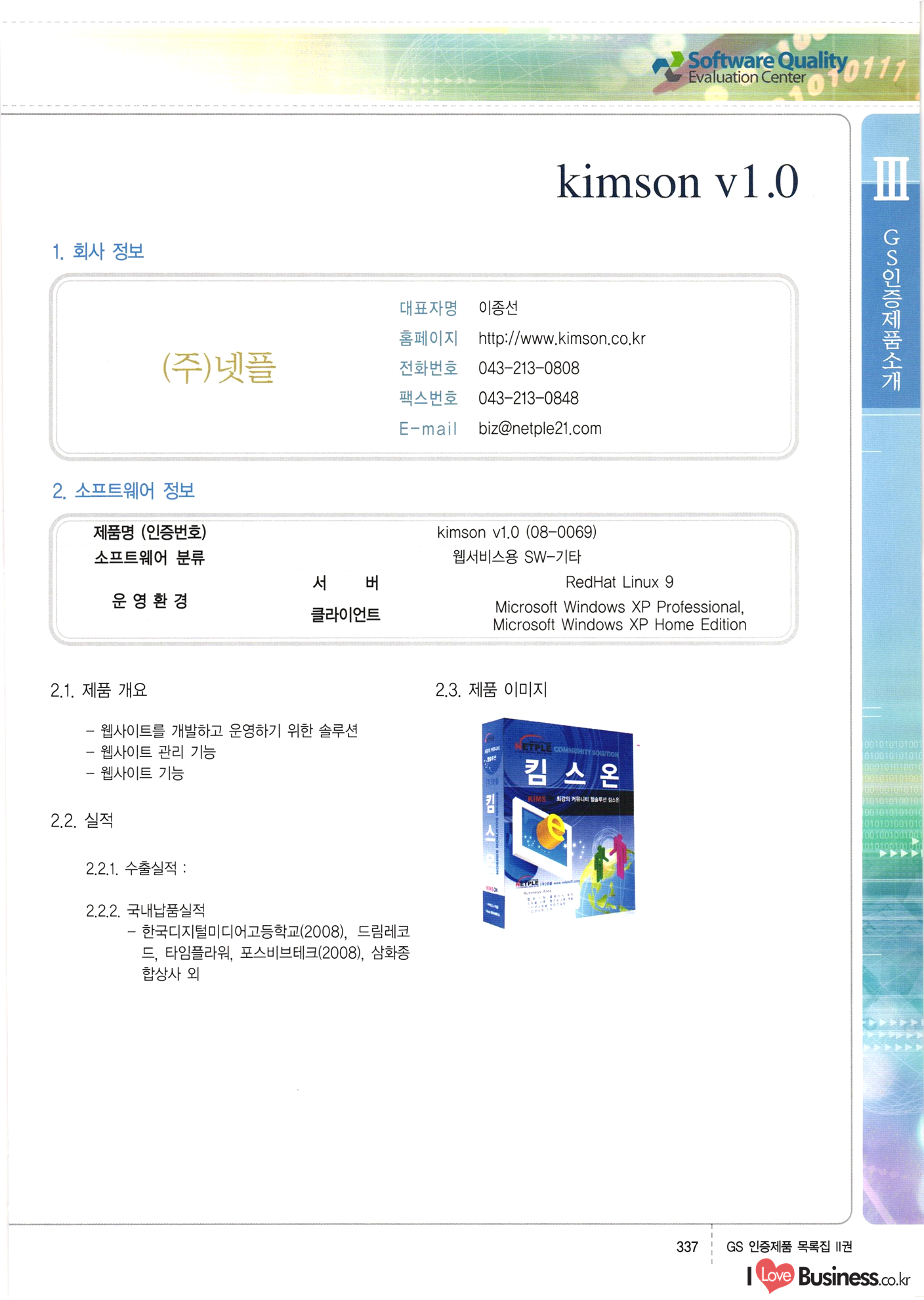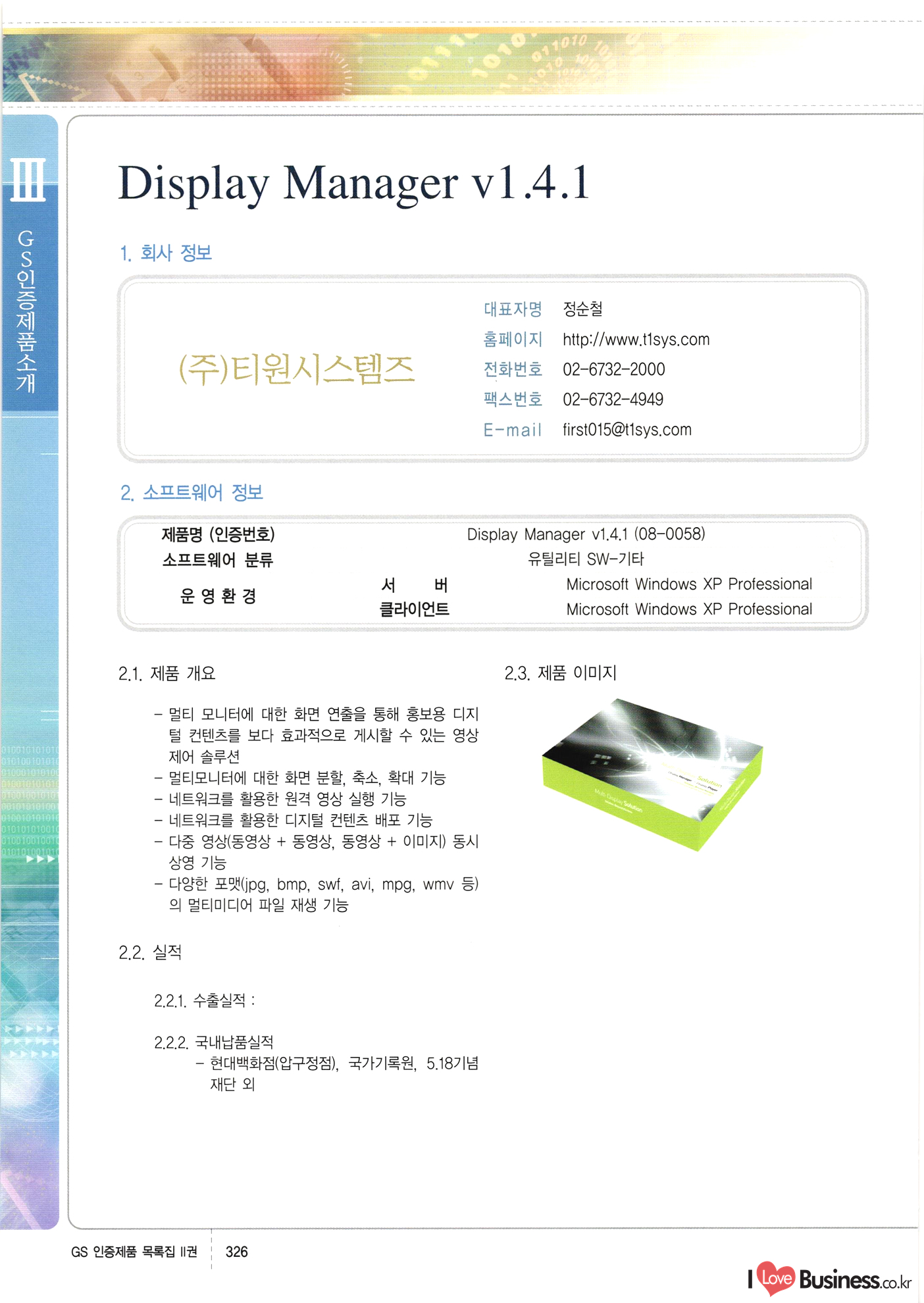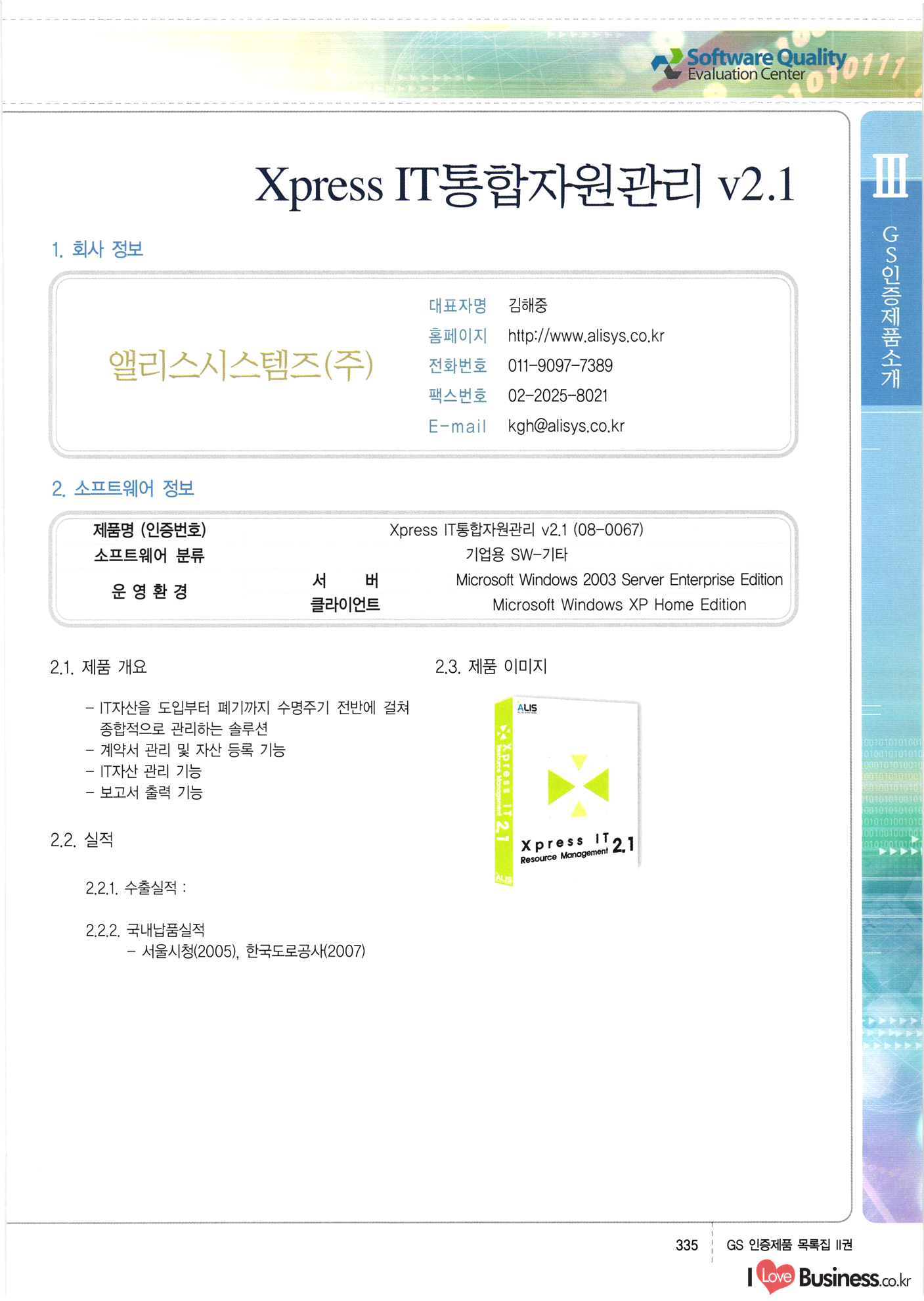 | III. GS 인증제품 목록 | 권-페이지번호 | 권-페이지번호 VT : VeriTest 국제 인증 GS인증제품목록 회사명 삼성에스디에스(주) 제품. EasyBase v4.1 페이지 50 1 제이엔에스 3DM Survey System v1.0 2 | 51 1 (주)싸이웍스 (주)테크다임 (주)다보넷 (주)로지스인포 CyberWALL 2000 v2.16 Jword v1.5 Touchsign v 2.1 키퍼엣홈 v1.0 78 52 (주)미래에듀테크 아이버스 v1.0 53 54 55 56 57 번호 | 인증번호 | 인증일자 01-0001 | 2001.07.25 101-0002 2001.10.22 (02-0027) | 01-0003 | 2001.11.27 | 01-0004 | 2001.11.27 | 01-0005 2001.11.27 5 | 01-0006 | 2001.12.27 02-0001 (02-0029) 2002.01.29 16 | | 02-0002 1 | 2002.02.16 | 02-0003 | 2002.02.16 02-0004 2002.02.27 9 | 02-0005 | 2002.02.27 110 | | 02-0006 | 2002.03.27 11 | || 02-0007 | 2002.03.27 | 02-0008 | 2002.04.30 | 02-0009 | 2002.04.30 | 02-0010 | 2002.04.30 15. | 02-0011 | 2002.04.30 16 102-0012 | 2002.04.30 | 17 | 02-0013 | 2002.05.30 | 18 | 02-0014 | 2002.05.30 | 02-0015 2002.06.28 | 20 | 02-0016 | 2002.06.28 02-0017 1 2002.06.28 | 02-0018 1 | 2002.06.28 23 | 02-0019 | 2002.06.28 24 02-0020 | 2002.07.31 25 | 02-0021 | 2002.07.31 224 58 14 59 118 (주)마크애니 (주)핸디소프트 (주)슈퍼테크놀러지 (주)스펙트라 이래정보시스템(주) (주)컴리빙아이티 | (주)시큐브 (주)케이게이트 (주)소프트4소프트 스페이스인터네셔널(주) (주)컴리빙아이티 (주)그린벨시스템즈 닉스테크(주) 심플소프트 (주)한국데이타비즈네스 (주)테크다임 (주)수세리눅스코리아 (주)한컴리눅스 소프트온넷(주) 와우리눅스(주) 60 61 Document Safer v1.0 | BizFlow Groupware v3.21 | Eg columbus || v1.0 | | eNomix v1.0 Blue Eyes v3.0 i-Class Five v1.05 Secuve TOS WG v1.0 위즈웹3 v3.0 RESORT v1.01 CD Tower v2.0 i-Class One2one v1.05 MANTIS-Professional v1.0 | | SAFEpc v1.5 Simple Gallery v1.00 통합카드발급프로그램 v1.0 Techdigm JCalc v2.0 Suse Linux 7.1K Professional Hancom Linux OS 2.2 Professional | Z!Stream v2.0 와우리눅스 7.1 파란 Secuve TOS WG Agent (Secuve Tos WG Manager) | SMERP v1.1 상하수도범용/ZEUS v1.0 U-Solver v1.0 dDIMS v3.0 DAL v2.5 101010101 1000 101003010101 190 1001010101 21 78. 122 | UL 63 64 65 26 | VT-02-001 | 2002.08.29 (주)시큐브 224 27 1 66 67 | 28 29 130 | 02-0022 | 2002.08.30 | 02-0023 | 2002.10.31 | 02-0024 | 2002.10.31 | 02-0025 | 2002.11.27 | 02-0026 | 2002.11.27 02-0027 (01-0002) 2002.11.27 | 02-0028 (03-0021) 2002.12.09 | 대한상공회의소 한국통신데이타(주) (주)지노시스템 유니온정보시스템(주) (주) 스 68 69 | 70 311 제이엔에스 소프트(구 제이엔에스) 3DM Survey System v1.0 (주)한국지능형정보시스템 한국관(상하수도 범용/TGW) v1.00 92 GS 인증제품 목록집 1권 | 26 I Love Business.co.kr Software Quality, 111 Evaluation Center | 권-페이지번호 II권페이지번호 VT : VeriTest 국제 인증 페이지 회사명 (주)포스데이타 제품 | iSign v2.0 | GS인증제품목록 171 | 34 | 02-0029 (주)제이슨테크(구 미래에듀테크) 아이버스 v1.0 91 72 73. 74 (주)인텔리젼스웨어 (주)하나디에스디 (주)연성정보기술 (주)포스정보 (주)켈코인 (주)포스데이타 스페이스인터내셔널 연희정보통신(주) (주)뉴테크웨이브 c-napse(GSS) v1.0 Life EduBuilder v1.0 | Email+ v3.0 1 책꽃이KDC v3.1 Challenger Webzine Webschool v3.0 1 Biz Binder v1.0 CD-Tower v3.1 상하수도 범용/UFCom v1.0 | | VirusChaser v5.0 | 175 76 118. (주)웨어벨리 Orange for ORACLE v2.2 | 번호 | 인증번호 | 인증일자 | 33 |VT-02-0022002.12.12 | | 2002.12.24 (02-0001) 35 | VT-02-003 | 2002.12.30 | 36 | 03-0001 | 2003.02.28 37. 03-0002 | 2003.02.28 | 38 | 03-0003 | 2003.02.28 | 39 | 03-0004 | 2003.02.28 40 | VT-03-001 | 2003.03.10 41 | VT-03-002) 2003.03.10 1 42 | 03-0005 | 2003.04.07 43 | 03-0006 | 2003.04.07 03-0007 2003.04.30 (03-0026) | 03-0008 | 2003.04.30 45 | 03-0009 | 2003.04.30 | 03-0010 | 2003.04.30 | 47 | 03-0011 | 2003.04.30 | 48 VT-03-003 2003.05.26 49 | 03-0012 | 2003.06.05 | 50 | 03-0013 | 2003.06.05 | 51 | 03-0014 | 2003.06.05 | 52 | 03-0015 | 2003.07.10 | 53 | 03-0016 | 2003.07.10 | 54 | 03-0017 | 2003.07.10 | | 55 | 03-0018 | 2003.07.10 | 56 | 03-0019 | 2003.08.06 57 | | 03-0020 | 2003.08.06 44 1 18 46 80 81 82 83 | (주)테크다임 (주)엔지스테크널러지 삼성에스디에스(주) 삼성에스디에스(주) (주)미디어랜드 인터컴소프트웨어(주) 에스케이씨앤씨(주) 아이티로직스(주) (주)에이씨티소프트 (주)위즈북 (주)에스오엔코리아 (주)아리수미디어 한진정보통신(주) (주)인텔리전스웨어 (주)웨어밸리 (구 (주)오알솔루션즈코리아) Techdigm Office v2.0 | G-Solution Waterworks/Sewerage v1.0 | | 79 UniCITY Standard v1.0 UniCITY Enterprise v1.0 TCO!stream 2002 v4.0 | ServerGuard v3.0 | SK-UPEX v1.0 84 NexWeb v1.2 e-Library Deluxe v4.1.5 86 DL Pro v1.0 SiR v1.01 파워CD뱅크 v4.0 89 InfoMatrix v1.00 190 Bizpus v1.0 91 85 87 88 10010010101.03 1101010100101 1100100100107 58 |VT-03-004 2003.08.12 Orange for ORACLE v2.2 | 111 59 (주)티지더블유 (구 한국지능형정보시스템) 한국관(상하수도 범용/TGW) v1.0 92 93 GIS Free v1.0 DeskPlus v2.0 1 | 94 ArcCITY v1.0 110 03-0021 (02-0028) | 2003.09.04 | 60 | 03-0022 | 2003.09.30 03-0023 | 2003.09.30 03-0024 (04-0011) | 2003.09.30 | 03-0025 | 2003.09.30 03-0026 (03-0007) | 2003.10.07 63 | 03-0027 | 2003.11.12 64 | 03-0028 | 2003.11.12 622 세광정보시스템(주) 제오스페이스(주) (주)선도소프트 (구 (주)캐드랜드) 중앙항업(주) (주)웨어밸리 (구 (주)오알솔루션즈코리아) (주)우암닷컴 (주)오투라인 geoCUBE상하수도 v1.0 95 Orange for ORACLE V2.2 111 96 RAVCOMS Eyecon v4.0 오투스쿨 v2.01 97 GS 인증제품 목록집 1권 I Love Business.co.kr | 권-페이지번호 | 권 - 페이지번호 VT : VeriTest 국제 인증 번호 페이지 회사명 소프트캠프