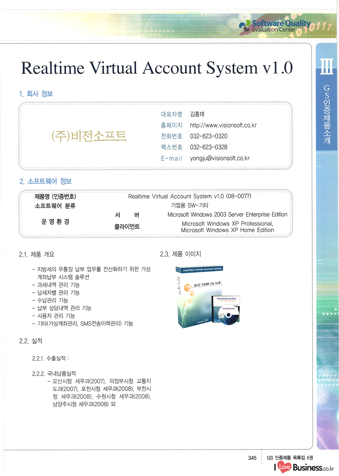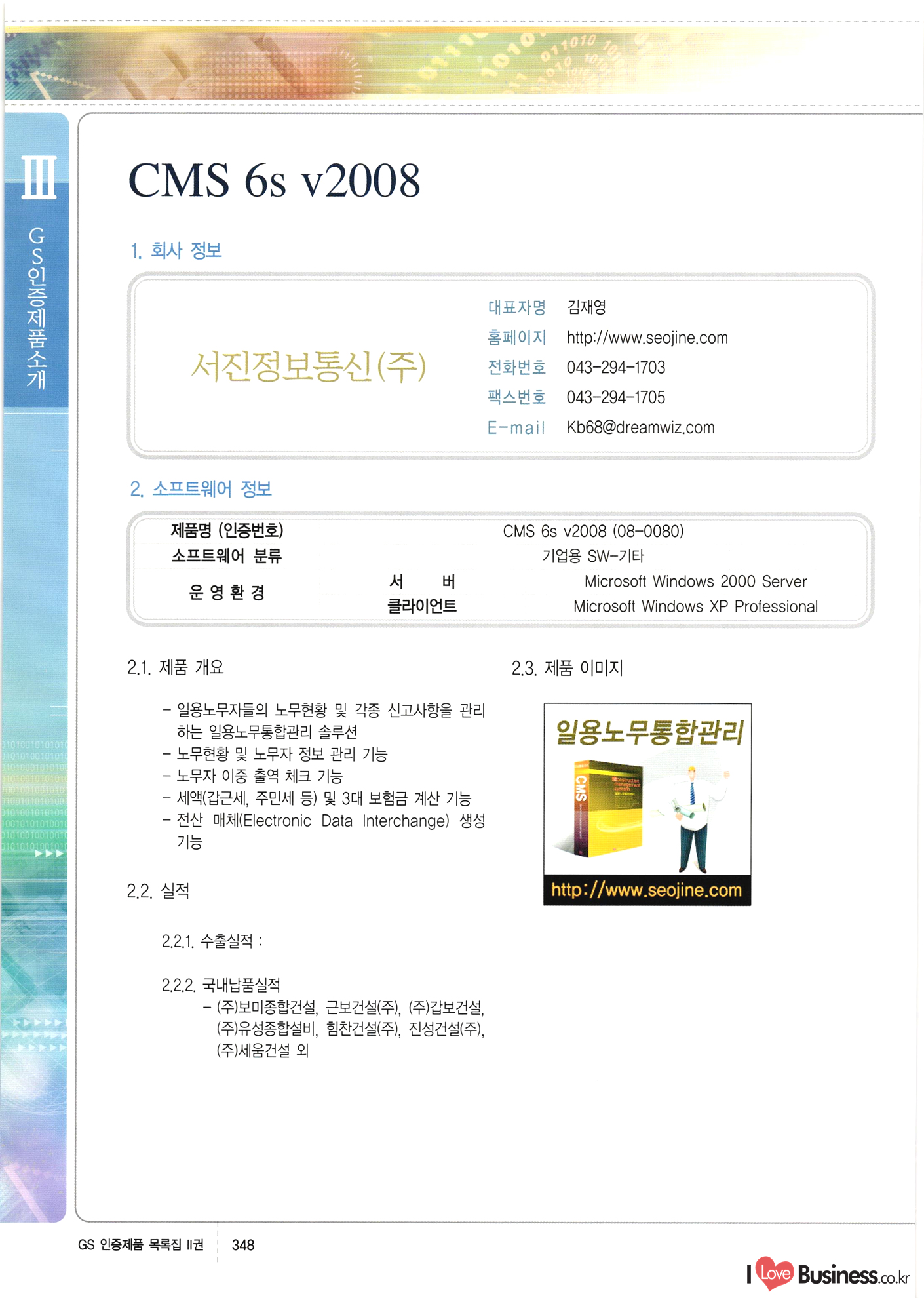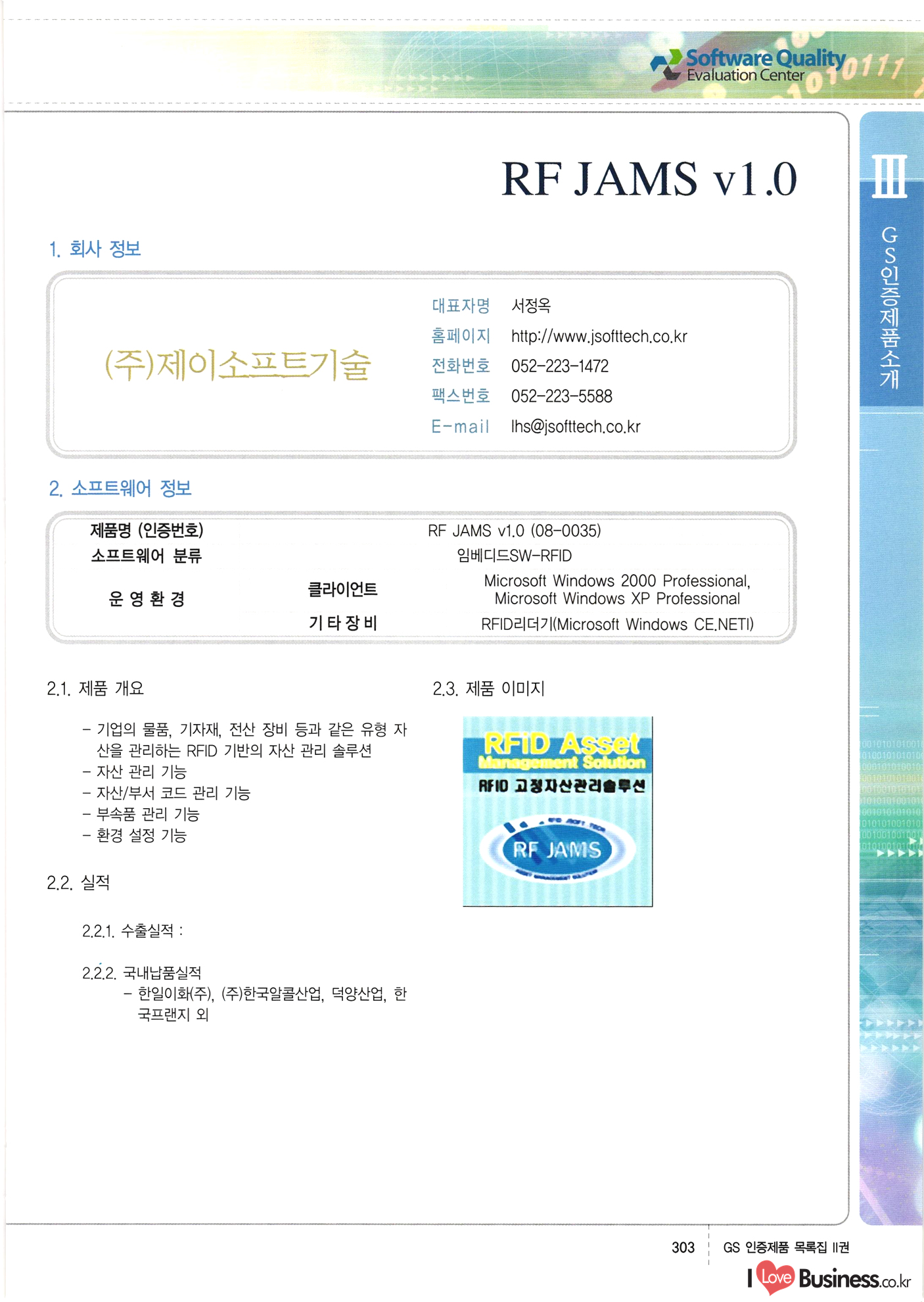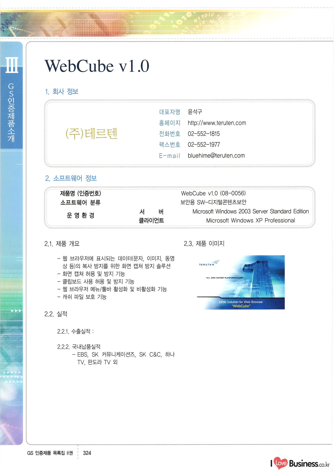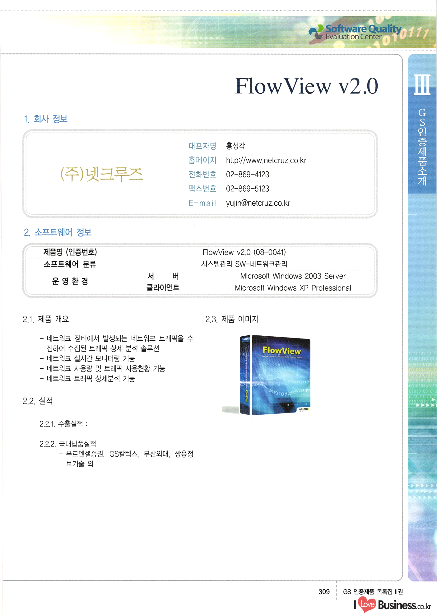 | III. GS 인증제품 목록 | 권-페이지번호 | 권-페이지번호 VT : VeriTest 국제 인증 GS인증제품목록 회사명 삼성에스디에스(주) 제품. EasyBase v4.1 페이지 50 1 제이엔에스 3DM Survey System v1.0 2 | 51 1 (주)싸이웍스 (주)테크다임 (주)다보넷 (주)로지스인포 CyberWALL 2000 v2.16 Jword v1.5 Touchsign v 2.1 키퍼엣홈 v1.0 78 52 (주)미래에듀테크 아이버스 v1.0 53 54 55 56 57 번호 | 인증번호 | 인증일자 01-0001 | 2001.07.25 101-0002 2001.10.22 (02-0027) | 01-0003 | 2001.11.27 | 01-0004 | 2001.11.27 | 01-0005 2001.11.27 5 | 01-0006 | 2001.12.27 02-0001 (02-0029) 2002.01.29 16 | | 02-0002 1 | 2002.02.16 | 02-0003 | 2002.02.16 02-0004 2002.02.27 9 | 02-0005 | 2002.02.27 110 | | 02-0006 | 2002.03.27 11 | || 02-0007 | 2002.03.27 | 02-0008 | 2002.04.30 | 02-0009 | 2002.04.30 | 02-0010 | 2002.04.30 15. | 02-0011 | 2002.04.30 16 102-0012 | 2002.04.30 | 17 | 02-0013 | 2002.05.30 | 18 | 02-0014 | 2002.05.30 | 02-0015 2002.06.28 | 20 | 02-0016 | 2002.06.28 02-0017 1 2002.06.28 | 02-0018 1 | 2002.06.28 23 | 02-0019 | 2002.06.28 24 02-0020 | 2002.07.31 25 | 02-0021 | 2002.07.31 224 58 14 59 118 (주)마크애니 (주)핸디소프트 (주)슈퍼테크놀러지 (주)스펙트라 이래정보시스템(주) (주)컴리빙아이티 | (주)시큐브 (주)케이게이트 (주)소프트4소프트 스페이스인터네셔널(주) (주)컴리빙아이티 (주)그린벨시스템즈 닉스테크(주) 심플소프트 (주)한국데이타비즈네스 (주)테크다임 (주)수세리눅스코리아 (주)한컴리눅스 소프트온넷(주) 와우리눅스(주) 60 61 Document Safer v1.0 | BizFlow Groupware v3.21 | Eg columbus || v1.0 | | eNomix v1.0 Blue Eyes v3.0 i-Class Five v1.05 Secuve TOS WG v1.0 위즈웹3 v3.0 RESORT v1.01 CD Tower v2.0 i-Class One2one v1.05 MANTIS-Professional v1.0 | | SAFEpc v1.5 Simple Gallery v1.00 통합카드발급프로그램 v1.0 Techdigm JCalc v2.0 Suse Linux 7.1K Professional Hancom Linux OS 2.2 Professional | Z!Stream v2.0 와우리눅스 7.1 파란 Secuve TOS WG Agent (Secuve Tos WG Manager) | SMERP v1.1 상하수도범용/ZEUS v1.0 U-Solver v1.0 dDIMS v3.0 DAL v2.5 101010101 1000 101003010101 190 1001010101 21 78. 122 | UL 63 64 65 26 | VT-02-001 | 2002.08.29 (주)시큐브 224 27 1 66 67 | 28 29 130 | 02-0022 | 2002.08.30 | 02-0023 | 2002.10.31 | 02-0024 | 2002.10.31 | 02-0025 | 2002.11.27 | 02-0026 | 2002.11.27 02-0027 (01-0002) 2002.11.27 | 02-0028 (03-0021) 2002.12.09 | 대한상공회의소 한국통신데이타(주) (주)지노시스템 유니온정보시스템(주) (주) 스 68 69 | 70 311 제이엔에스 소프트(구 제이엔에스) 3DM Survey System v1.0 (주)한국지능형정보시스템 한국관(상하수도 범용/TGW) v1.00 92 GS 인증제품 목록집 1권 | 26 I Love Business.co.kr Software Quality, 111 Evaluation Center | 권-페이지번호 II권페이지번호 VT : VeriTest 국제 인증 페이지 회사명 (주)포스데이타 제품 | iSign v2.0 | GS인증제품목록 171 | 34 | 02-0029 (주)제이슨테크(구 미래에듀테크) 아이버스 v1.0 91 72 73. 74 (주)인텔리젼스웨어 (주)하나디에스디 (주)연성정보기술 (주)포스정보 (주)켈코인 (주)포스데이타 스페이스인터내셔널 연희정보통신(주) (주)뉴테크웨이브 c-napse(GSS) v1.0 Life EduBuilder v1.0 | Email+ v3.0 1 책꽃이KDC v3.1 Challenger Webzine Webschool v3.0 1 Biz Binder v1.0 CD-Tower v3.1 상하수도 범용/UFCom v1.0 | | VirusChaser v5.0 | 175 76 118. (주)웨어벨리 Orange for ORACLE v2.2 | 번호 | 인증번호 | 인증일자 | 33 |VT-02-0022002.12.12 | | 2002.12.24 (02-0001) 35 | VT-02-003 | 2002.12.30 | 36 | 03-0001 | 2003.02.28 37. 03-0002 | 2003.02.28 | 38 | 03-0003 | 2003.02.28 | 39 | 03-0004 | 2003.02.28 40 | VT-03-001 | 2003.03.10 41 | VT-03-002) 2003.03.10 1 42 | 03-0005 | 2003.04.07 43 | 03-0006 | 2003.04.07 03-0007 2003.04.30 (03-0026) | 03-0008 | 2003.04.30 45 | 03-0009 | 2003.04.30 | 03-0010 | 2003.04.30 | 47 | 03-0011 | 2003.04.30 | 48 VT-03-003 2003.05.26 49 | 03-0012 | 2003.06.05 | 50 | 03-0013 | 2003.06.05 | 51 | 03-0014 | 2003.06.05 | 52 | 03-0015 | 2003.07.10 | 53 | 03-0016 | 2003.07.10 | 54 | 03-0017 | 2003.07.10 | | 55 | 03-0018 | 2003.07.10 | 56 | 03-0019 | 2003.08.06 57 | | 03-0020 | 2003.08.06 44 1 18 46 80 81 82 83 | (주)테크다임 (주)엔지스테크널러지 삼성에스디에스(주) 삼성에스디에스(주) (주)미디어랜드 인터컴소프트웨어(주) 에스케이씨앤씨(주) 아이티로직스(주) (주)에이씨티소프트 (주)위즈북 (주)에스오엔코리아 (주)아리수미디어 한진정보통신(주) (주)인텔리전스웨어 (주)웨어밸리 (구 (주)오알솔루션즈코리아) Techdigm Office v2.0 | G-Solution Waterworks/Sewerage v1.0 | | 79 UniCITY Standard v1.0 UniCITY Enterprise v1.0 TCO!stream 2002 v4.0 | ServerGuard v3.0 | SK-UPEX v1.0 84 NexWeb v1.2 e-Library Deluxe v4.1.5 86 DL Pro v1.0 SiR v1.01 파워CD뱅크 v4.0 89 InfoMatrix v1.00 190 Bizpus v1.0 91 85 87 88 10010010101.03 1101010100101 1100100100107 58 |VT-03-004 2003.08.12 Orange for ORACLE v2.2 | 111 59 (주)티지더블유 (구 한국지능형정보시스템) 한국관(상하수도 범용/TGW) v1.0 92 93 GIS Free v1.0 DeskPlus v2.0 1 | 94 ArcCITY v1.0 110 03-0021 (02-0028) | 2003.09.04 | 60 | 03-0022 | 2003.09.30 03-0023 | 2003.09.30 03-0024 (04-0011) | 2003.09.30 | 03-0025 | 2003.09.30 03-0026 (03-0007) | 2003.10.07 63 | 03-0027 | 2003.11.12 64 | 03-0028 | 2003.11.12 622 세광정보시스템(주) 제오스페이스(주) (주)선도소프트 (구 (주)캐드랜드) 중앙항업(주) (주)웨어밸리 (구 (주)오알솔루션즈코리아) (주)우암닷컴 (주)오투라인 geoCUBE상하수도 v1.0 95 Orange for ORACLE V2.2 111 96 RAVCOMS Eyecon v4.0 오투스쿨 v2.01 97 GS 인증제품 목록집 1권 I Love Business.co.kr | 권-페이지번호 | 권 - 페이지번호 VT : VeriTest 국제 인증 번호 페이지 회사명 소프트캠프