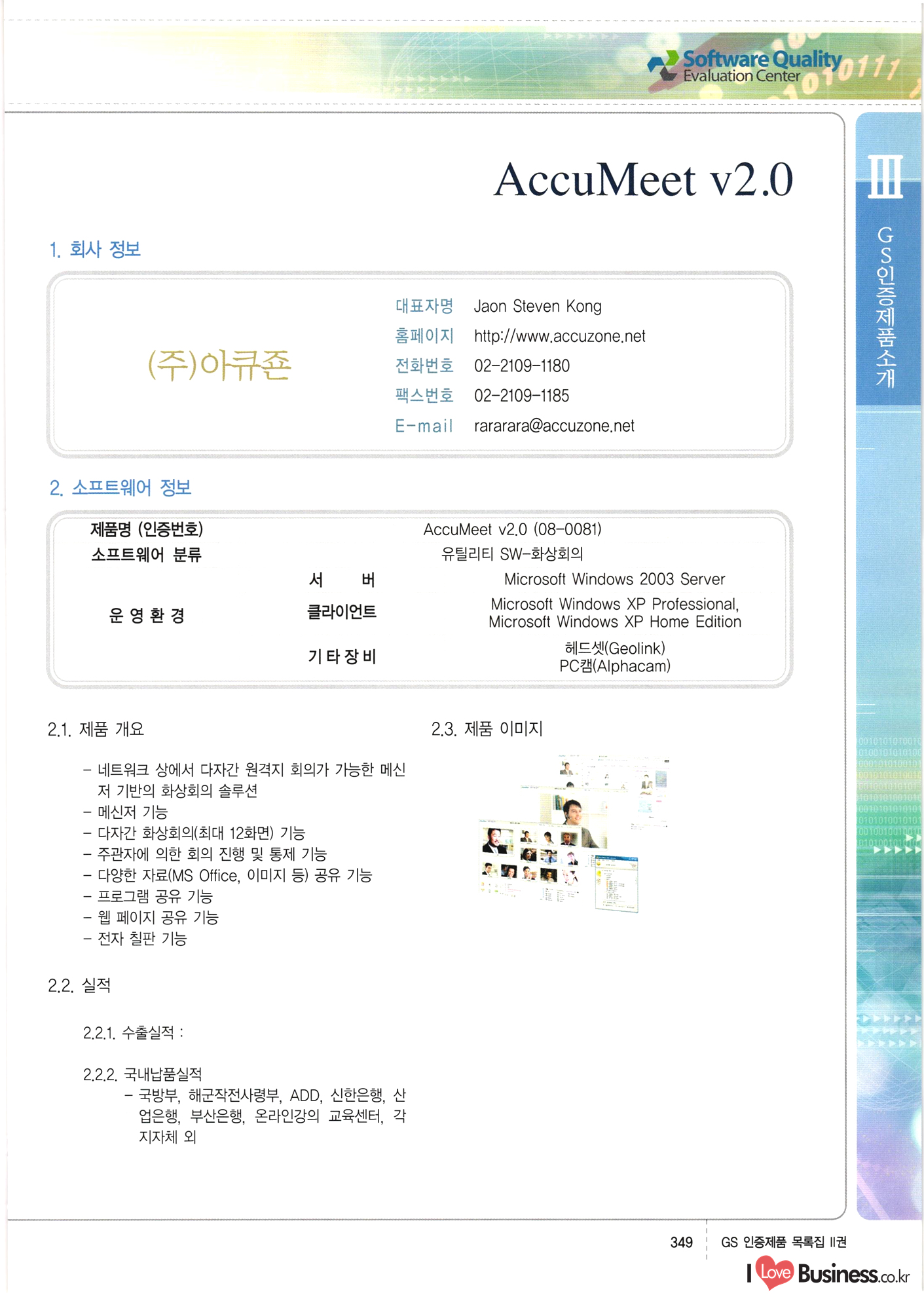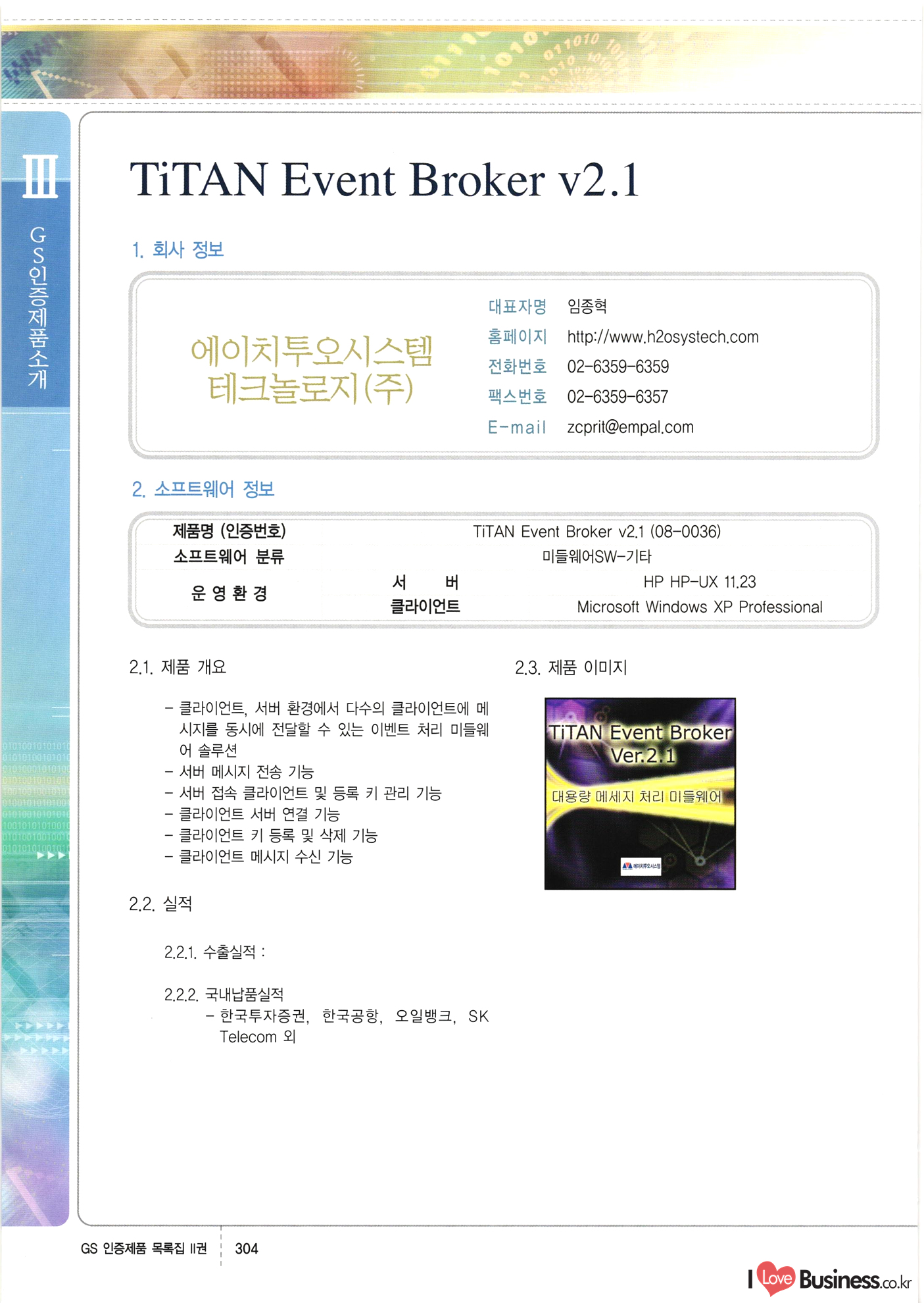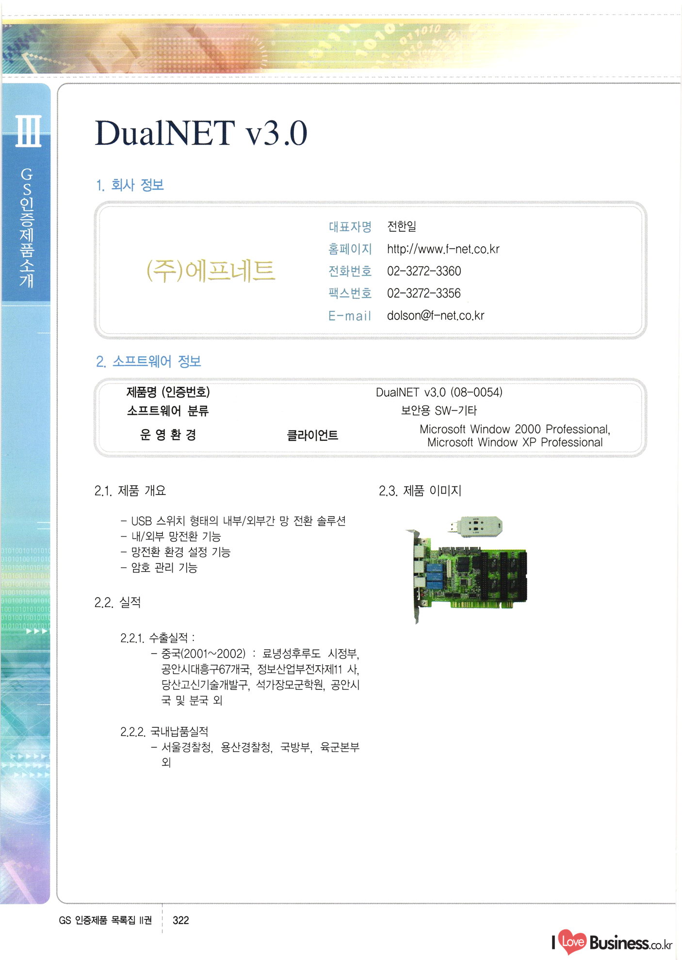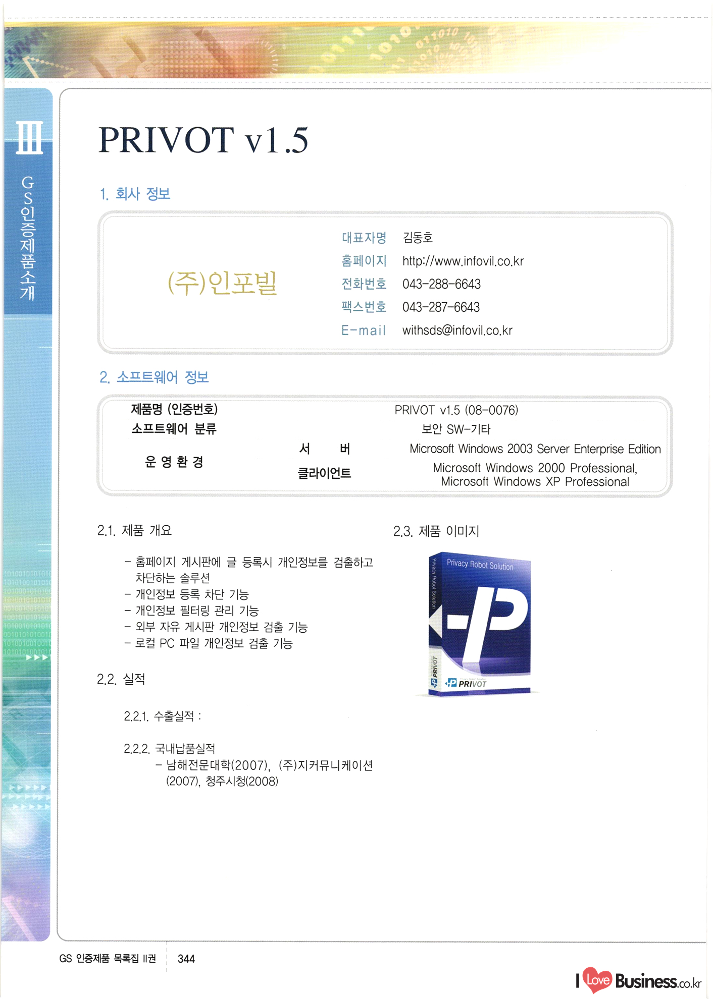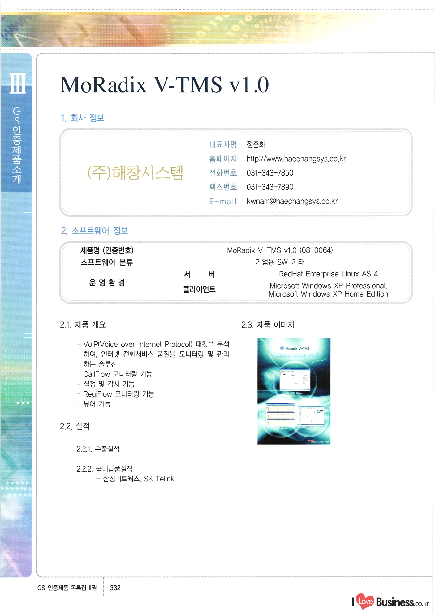 | III. GS 인증제품 목록 | 권-페이지번호 | 권-페이지번호 VT : VeriTest 국제 인증 GS인증제품목록 회사명 삼성에스디에스(주) 제품. EasyBase v4.1 페이지 50 1 제이엔에스 3DM Survey System v1.0 2 | 51 1 (주)싸이웍스 (주)테크다임 (주)다보넷 (주)로지스인포 CyberWALL 2000 v2.16 Jword v1.5 Touchsign v 2.1 키퍼엣홈 v1.0 78 52 (주)미래에듀테크 아이버스 v1.0 53 54 55 56 57 번호 | 인증번호 | 인증일자 01-0001 | 2001.07.25 101-0002 2001.10.22 (02-0027) | 01-0003 | 2001.11.27 | 01-0004 | 2001.11.27 | 01-0005 2001.11.27 5 | 01-0006 | 2001.12.27 02-0001 (02-0029) 2002.01.29 16 | | 02-0002 1 | 2002.02.16 | 02-0003 | 2002.02.16 02-0004 2002.02.27 9 | 02-0005 | 2002.02.27 110 | | 02-0006 | 2002.03.27 11 | || 02-0007 | 2002.03.27 | 02-0008 | 2002.04.30 | 02-0009 | 2002.04.30 | 02-0010 | 2002.04.30 15. | 02-0011 | 2002.04.30 16 102-0012 | 2002.04.30 | 17 | 02-0013 | 2002.05.30 | 18 | 02-0014 | 2002.05.30 | 02-0015 2002.06.28 | 20 | 02-0016 | 2002.06.28 02-0017 1 2002.06.28 | 02-0018 1 | 2002.06.28 23 | 02-0019 | 2002.06.28 24 02-0020 | 2002.07.31 25 | 02-0021 | 2002.07.31 224 58 14 59 118 (주)마크애니 (주)핸디소프트 (주)슈퍼테크놀러지 (주)스펙트라 이래정보시스템(주) (주)컴리빙아이티 | (주)시큐브 (주)케이게이트 (주)소프트4소프트 스페이스인터네셔널(주) (주)컴리빙아이티 (주)그린벨시스템즈 닉스테크(주) 심플소프트 (주)한국데이타비즈네스 (주)테크다임 (주)수세리눅스코리아 (주)한컴리눅스 소프트온넷(주) 와우리눅스(주) 60 61 Document Safer v1.0 | BizFlow Groupware v3.21 | Eg columbus || v1.0 | | eNomix v1.0 Blue Eyes v3.0 i-Class Five v1.05 Secuve TOS WG v1.0 위즈웹3 v3.0 RESORT v1.01 CD Tower v2.0 i-Class One2one v1.05 MANTIS-Professional v1.0 | | SAFEpc v1.5 Simple Gallery v1.00 통합카드발급프로그램 v1.0 Techdigm JCalc v2.0 Suse Linux 7.1K Professional Hancom Linux OS 2.2 Professional | Z!Stream v2.0 와우리눅스 7.1 파란 Secuve TOS WG Agent (Secuve Tos WG Manager) | SMERP v1.1 상하수도범용/ZEUS v1.0 U-Solver v1.0 dDIMS v3.0 DAL v2.5 101010101 1000 101003010101 190 1001010101 21 78. 122 | UL 63 64 65 26 | VT-02-001 | 2002.08.29 (주)시큐브 224 27 1 66 67 | 28 29 130 | 02-0022 | 2002.08.30 | 02-0023 | 2002.10.31 | 02-0024 | 2002.10.31 | 02-0025 | 2002.11.27 | 02-0026 | 2002.11.27 02-0027 (01-0002) 2002.11.27 | 02-0028 (03-0021) 2002.12.09 | 대한상공회의소 한국통신데이타(주) (주)지노시스템 유니온정보시스템(주) (주) 스 68 69 | 70 311 제이엔에스 소프트(구 제이엔에스) 3DM Survey System v1.0 (주)한국지능형정보시스템 한국관(상하수도 범용/TGW) v1.00 92 GS 인증제품 목록집 1권 | 26 I Love Business.co.kr Software Quality, 111 Evaluation Center | 권-페이지번호 II권페이지번호 VT : VeriTest 국제 인증 페이지 회사명 (주)포스데이타 제품 | iSign v2.0 | GS인증제품목록 171 | 34 | 02-0029 (주)제이슨테크(구 미래에듀테크) 아이버스 v1.0 91 72 73. 74 (주)인텔리젼스웨어 (주)하나디에스디 (주)연성정보기술 (주)포스정보 (주)켈코인 (주)포스데이타 스페이스인터내셔널 연희정보통신(주) (주)뉴테크웨이브 c-napse(GSS) v1.0 Life EduBuilder v1.0 | Email+ v3.0 1 책꽃이KDC v3.1 Challenger Webzine Webschool v3.0 1 Biz Binder v1.0 CD-Tower v3.1 상하수도 범용/UFCom v1.0 | | VirusChaser v5.0 | 175 76 118. (주)웨어벨리 Orange for ORACLE v2.2 | 번호 | 인증번호 | 인증일자 | 33 |VT-02-0022002.12.12 | | 2002.12.24 (02-0001) 35 | VT-02-003 | 2002.12.30 | 36 | 03-0001 | 2003.02.28 37. 03-0002 | 2003.02.28 | 38 | 03-0003 | 2003.02.28 | 39 | 03-0004 | 2003.02.28 40 | VT-03-001 | 2003.03.10 41 | VT-03-002) 2003.03.10 1 42 | 03-0005 | 2003.04.07 43 | 03-0006 | 2003.04.07 03-0007 2003.04.30 (03-0026) | 03-0008 | 2003.04.30 45 | 03-0009 | 2003.04.30 | 03-0010 | 2003.04.30 | 47 | 03-0011 | 2003.04.30 | 48 VT-03-003 2003.05.26 49 | 03-0012 | 2003.06.05 | 50 | 03-0013 | 2003.06.05 | 51 | 03-0014 | 2003.06.05 | 52 | 03-0015 | 2003.07.10 | 53 | 03-0016 | 2003.07.10 | 54 | 03-0017 | 2003.07.10 | | 55 | 03-0018 | 2003.07.10 | 56 | 03-0019 | 2003.08.06 57 | | 03-0020 | 2003.08.06 44 1 18 46 80 81 82 83 | (주)테크다임 (주)엔지스테크널러지 삼성에스디에스(주) 삼성에스디에스(주) (주)미디어랜드 인터컴소프트웨어(주) 에스케이씨앤씨(주) 아이티로직스(주) (주)에이씨티소프트 (주)위즈북 (주)에스오엔코리아 (주)아리수미디어 한진정보통신(주) (주)인텔리전스웨어 (주)웨어밸리 (구 (주)오알솔루션즈코리아) Techdigm Office v2.0 | G-Solution Waterworks/Sewerage v1.0 | | 79 UniCITY Standard v1.0 UniCITY Enterprise v1.0 TCO!stream 2002 v4.0 | ServerGuard v3.0 | SK-UPEX v1.0 84 NexWeb v1.2 e-Library Deluxe v4.1.5 86 DL Pro v1.0 SiR v1.01 파워CD뱅크 v4.0 89 InfoMatrix v1.00 190 Bizpus v1.0 91 85 87 88 10010010101.03 1101010100101 1100100100107 58 |VT-03-004 2003.08.12 Orange for ORACLE v2.2 | 111 59 (주)티지더블유 (구 한국지능형정보시스템) 한국관(상하수도 범용/TGW) v1.0 92 93 GIS Free v1.0 DeskPlus v2.0 1 | 94 ArcCITY v1.0 110 03-0021 (02-0028) | 2003.09.04 | 60 | 03-0022 | 2003.09.30 03-0023 | 2003.09.30 03-0024 (04-0011) | 2003.09.30 | 03-0025 | 2003.09.30 03-0026 (03-0007) | 2003.10.07 63 | 03-0027 | 2003.11.12 64 | 03-0028 | 2003.11.12 622 세광정보시스템(주) 제오스페이스(주) (주)선도소프트 (구 (주)캐드랜드) 중앙항업(주) (주)웨어밸리 (구 (주)오알솔루션즈코리아) (주)우암닷컴 (주)오투라인 geoCUBE상하수도 v1.0 95 Orange for ORACLE V2.2 111 96 RAVCOMS Eyecon v4.0 오투스쿨 v2.01 97 GS 인증제품 목록집 1권 I Love Business.co.kr | 권-페이지번호 | 권 - 페이지번호 VT : VeriTest 국제 인증 번호 페이지 회사명 소프트캠프