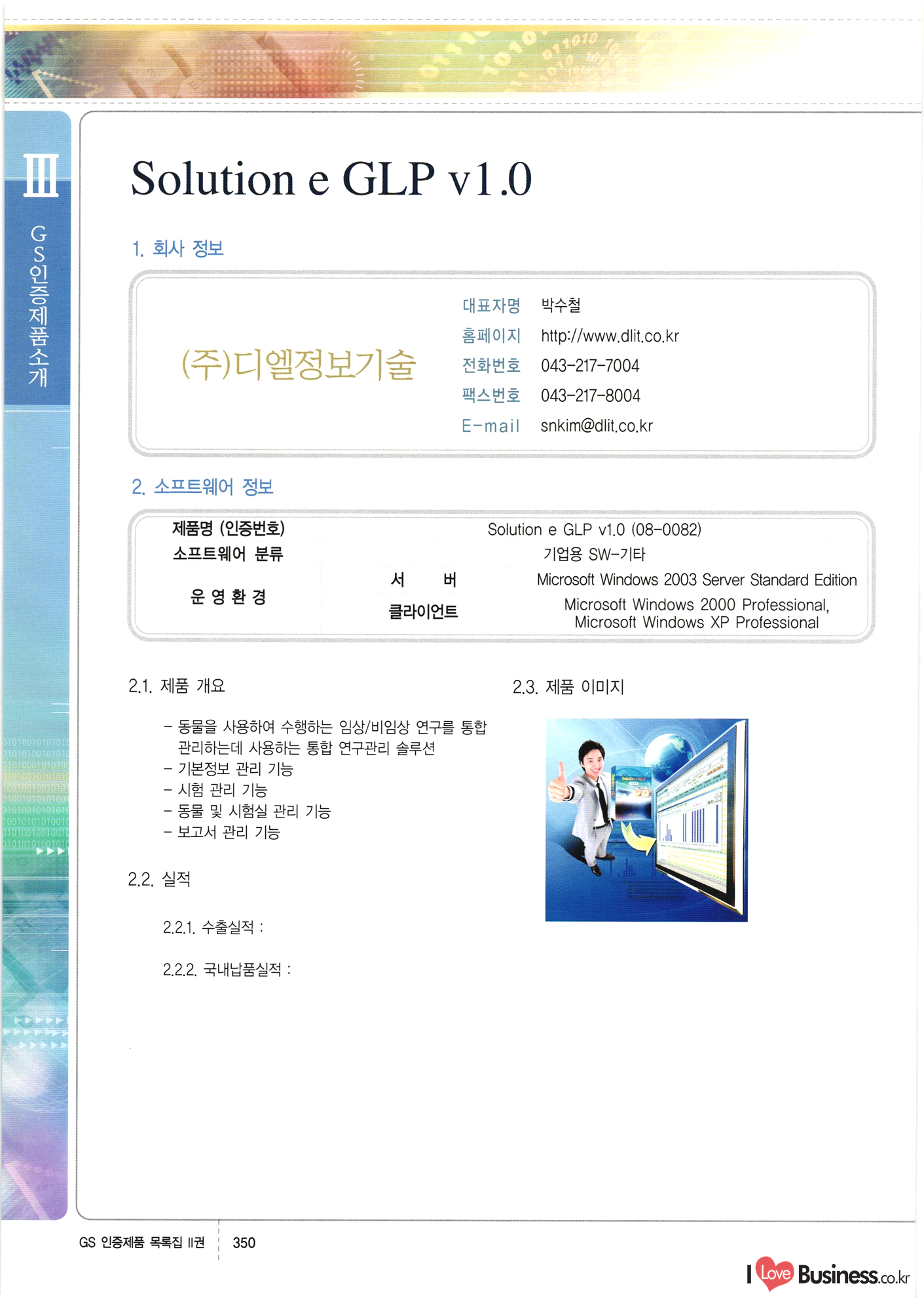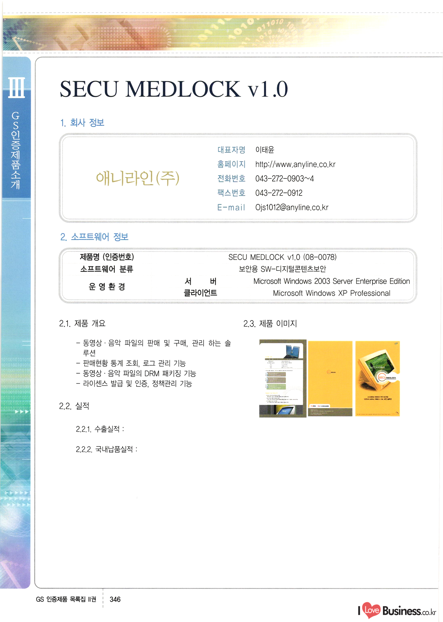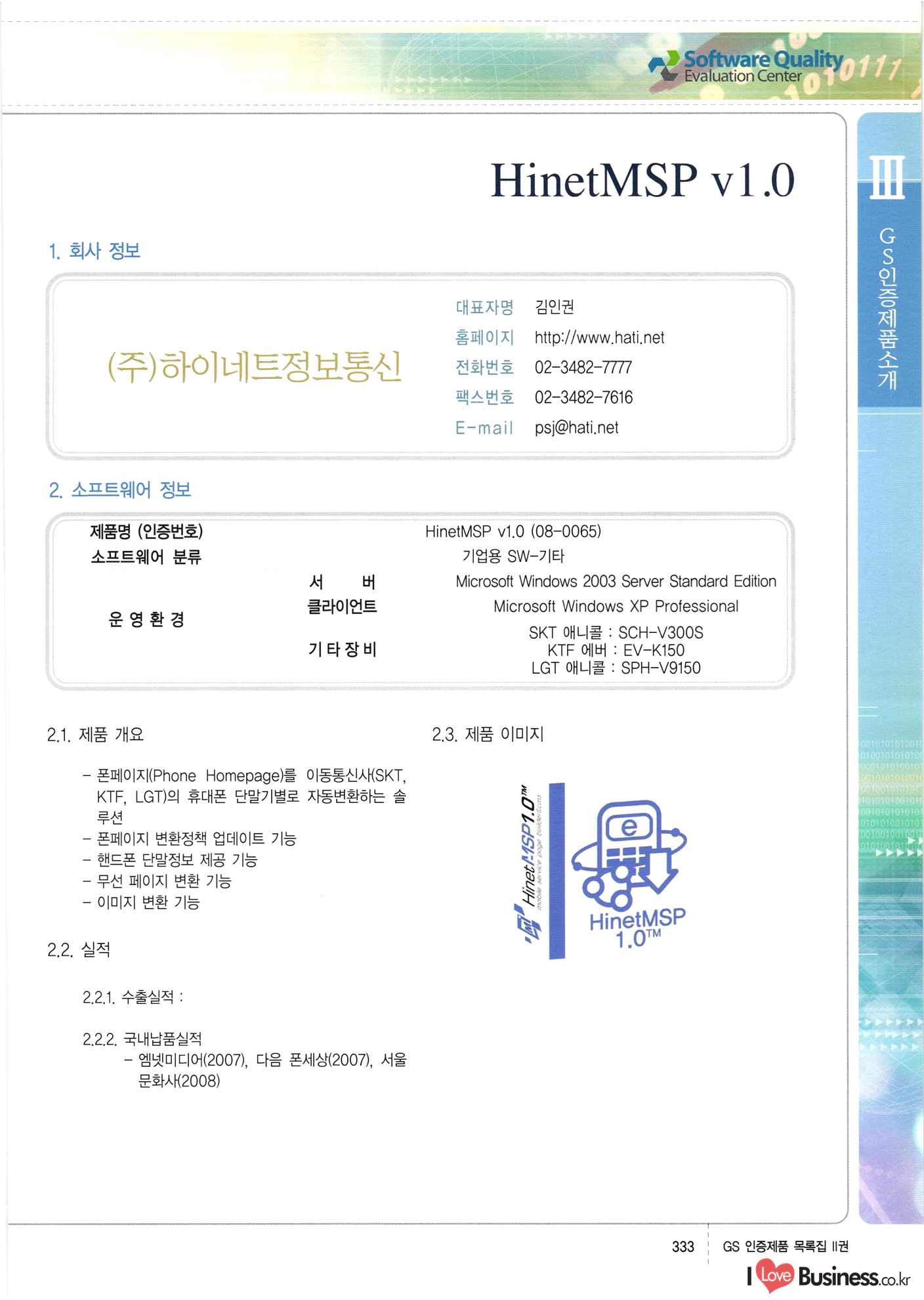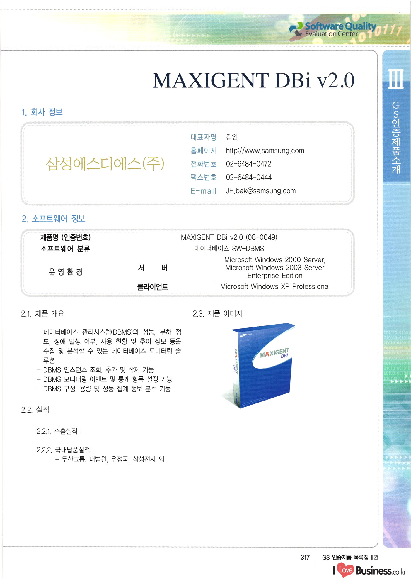 | III. GS 인증제품 목록 | 권-페이지번호 | 권-페이지번호 VT : VeriTest 국제 인증 GS인증제품목록 회사명 삼성에스디에스(주) 제품. EasyBase v4.1 페이지 50 1 제이엔에스 3DM Survey System v1.0 2 | 51 1 (주)싸이웍스 (주)테크다임 (주)다보넷 (주)로지스인포 CyberWALL 2000 v2.16 Jword v1.5 Touchsign v 2.1 키퍼엣홈 v1.0 78 52 (주)미래에듀테크 아이버스 v1.0 53 54 55 56 57 번호 | 인증번호 | 인증일자 01-0001 | 2001.07.25 101-0002 2001.10.22 (02-0027) | 01-0003 | 2001.11.27 | 01-0004 | 2001.11.27 | 01-0005 2001.11.27 5 | 01-0006 | 2001.12.27 02-0001 (02-0029) 2002.01.29 16 | | 02-0002 1 | 2002.02.16 | 02-0003 | 2002.02.16 02-0004 2002.02.27 9 | 02-0005 | 2002.02.27 110 | | 02-0006 | 2002.03.27 11 | || 02-0007 | 2002.03.27 | 02-0008 | 2002.04.30 | 02-0009 | 2002.04.30 | 02-0010 | 2002.04.30 15. | 02-0011 | 2002.04.30 16 102-0012 | 2002.04.30 | 17 | 02-0013 | 2002.05.30 | 18 | 02-0014 | 2002.05.30 | 02-0015 2002.06.28 | 20 | 02-0016 | 2002.06.28 02-0017 1 2002.06.28 | 02-0018 1 | 2002.06.28 23 | 02-0019 | 2002.06.28 24 02-0020 | 2002.07.31 25 | 02-0021 | 2002.07.31 224 58 14 59 118 (주)마크애니 (주)핸디소프트 (주)슈퍼테크놀러지 (주)스펙트라 이래정보시스템(주) (주)컴리빙아이티 | (주)시큐브 (주)케이게이트 (주)소프트4소프트 스페이스인터네셔널(주) (주)컴리빙아이티 (주)그린벨시스템즈 닉스테크(주) 심플소프트 (주)한국데이타비즈네스 (주)테크다임 (주)수세리눅스코리아 (주)한컴리눅스 소프트온넷(주) 와우리눅스(주) 60 61 Document Safer v1.0 | BizFlow Groupware v3.21 | Eg columbus || v1.0 | | eNomix v1.0 Blue Eyes v3.0 i-Class Five v1.05 Secuve TOS WG v1.0 위즈웹3 v3.0 RESORT v1.01 CD Tower v2.0 i-Class One2one v1.05 MANTIS-Professional v1.0 | | SAFEpc v1.5 Simple Gallery v1.00 통합카드발급프로그램 v1.0 Techdigm JCalc v2.0 Suse Linux 7.1K Professional Hancom Linux OS 2.2 Professional | Z!Stream v2.0 와우리눅스 7.1 파란 Secuve TOS WG Agent (Secuve Tos WG Manager) | SMERP v1.1 상하수도범용/ZEUS v1.0 U-Solver v1.0 dDIMS v3.0 DAL v2.5 101010101 1000 101003010101 190 1001010101 21 78. 122 | UL 63 64 65 26 | VT-02-001 | 2002.08.29 (주)시큐브 224 27 1 66 67 | 28 29 130 | 02-0022 | 2002.08.30 | 02-0023 | 2002.10.31 | 02-0024 | 2002.10.31 | 02-0025 | 2002.11.27 | 02-0026 | 2002.11.27 02-0027 (01-0002) 2002.11.27 | 02-0028 (03-0021) 2002.12.09 | 대한상공회의소 한국통신데이타(주) (주)지노시스템 유니온정보시스템(주) (주) 스 68 69 | 70 311 제이엔에스 소프트(구 제이엔에스) 3DM Survey System v1.0 (주)한국지능형정보시스템 한국관(상하수도 범용/TGW) v1.00 92 GS 인증제품 목록집 1권 | 26 I Love Business.co.kr Software Quality, 111 Evaluation Center | 권-페이지번호 II권페이지번호 VT : VeriTest 국제 인증 페이지 회사명 (주)포스데이타 제품 | iSign v2.0 | GS인증제품목록 171 | 34 | 02-0029 (주)제이슨테크(구 미래에듀테크) 아이버스 v1.0 91 72 73. 74 (주)인텔리젼스웨어 (주)하나디에스디 (주)연성정보기술 (주)포스정보 (주)켈코인 (주)포스데이타 스페이스인터내셔널 연희정보통신(주) (주)뉴테크웨이브 c-napse(GSS) v1.0 Life EduBuilder v1.0 | Email+ v3.0 1 책꽃이KDC v3.1 Challenger Webzine Webschool v3.0 1 Biz Binder v1.0 CD-Tower v3.1 상하수도 범용/UFCom v1.0 | | VirusChaser v5.0 | 175 76 118. (주)웨어벨리 Orange for ORACLE v2.2 | 번호 | 인증번호 | 인증일자 | 33 |VT-02-0022002.12.12 | | 2002.12.24 (02-0001) 35 | VT-02-003 | 2002.12.30 | 36 | 03-0001 | 2003.02.28 37. 03-0002 | 2003.02.28 | 38 | 03-0003 | 2003.02.28 | 39 | 03-0004 | 2003.02.28 40 | VT-03-001 | 2003.03.10 41 | VT-03-002) 2003.03.10 1 42 | 03-0005 | 2003.04.07 43 | 03-0006 | 2003.04.07 03-0007 2003.04.30 (03-0026) | 03-0008 | 2003.04.30 45 | 03-0009 | 2003.04.30 | 03-0010 | 2003.04.30 | 47 | 03-0011 | 2003.04.30 | 48 VT-03-003 2003.05.26 49 | 03-0012 | 2003.06.05 | 50 | 03-0013 | 2003.06.05 | 51 | 03-0014 | 2003.06.05 | 52 | 03-0015 | 2003.07.10 | 53 | 03-0016 | 2003.07.10 | 54 | 03-0017 | 2003.07.10 | | 55 | 03-0018 | 2003.07.10 | 56 | 03-0019 | 2003.08.06 57 | | 03-0020 | 2003.08.06 44 1 18 46 80 81 82 83 | (주)테크다임 (주)엔지스테크널러지 삼성에스디에스(주) 삼성에스디에스(주) (주)미디어랜드 인터컴소프트웨어(주) 에스케이씨앤씨(주) 아이티로직스(주) (주)에이씨티소프트 (주)위즈북 (주)에스오엔코리아 (주)아리수미디어 한진정보통신(주) (주)인텔리전스웨어 (주)웨어밸리 (구 (주)오알솔루션즈코리아) Techdigm Office v2.0 | G-Solution Waterworks/Sewerage v1.0 | | 79 UniCITY Standard v1.0 UniCITY Enterprise v1.0 TCO!stream 2002 v4.0 | ServerGuard v3.0 | SK-UPEX v1.0 84 NexWeb v1.2 e-Library Deluxe v4.1.5 86 DL Pro v1.0 SiR v1.01 파워CD뱅크 v4.0 89 InfoMatrix v1.00 190 Bizpus v1.0 91 85 87 88 10010010101.03 1101010100101 1100100100107 58 |VT-03-004 2003.08.12 Orange for ORACLE v2.2 | 111 59 (주)티지더블유 (구 한국지능형정보시스템) 한국관(상하수도 범용/TGW) v1.0 92 93 GIS Free v1.0 DeskPlus v2.0 1 | 94 ArcCITY v1.0 110 03-0021 (02-0028) | 2003.09.04 | 60 | 03-0022 | 2003.09.30 03-0023 | 2003.09.30 03-0024 (04-0011) | 2003.09.30 | 03-0025 | 2003.09.30 03-0026 (03-0007) | 2003.10.07 63 | 03-0027 | 2003.11.12 64 | 03-0028 | 2003.11.12 622 세광정보시스템(주) 제오스페이스(주) (주)선도소프트 (구 (주)캐드랜드) 중앙항업(주) (주)웨어밸리 (구 (주)오알솔루션즈코리아) (주)우암닷컴 (주)오투라인 geoCUBE상하수도 v1.0 95 Orange for ORACLE V2.2 111 96 RAVCOMS Eyecon v4.0 오투스쿨 v2.01 97 GS 인증제품 목록집 1권 I Love Business.co.kr | 권-페이지번호 | 권 - 페이지번호 VT : VeriTest 국제 인증 번호 페이지 회사명 소프트캠프