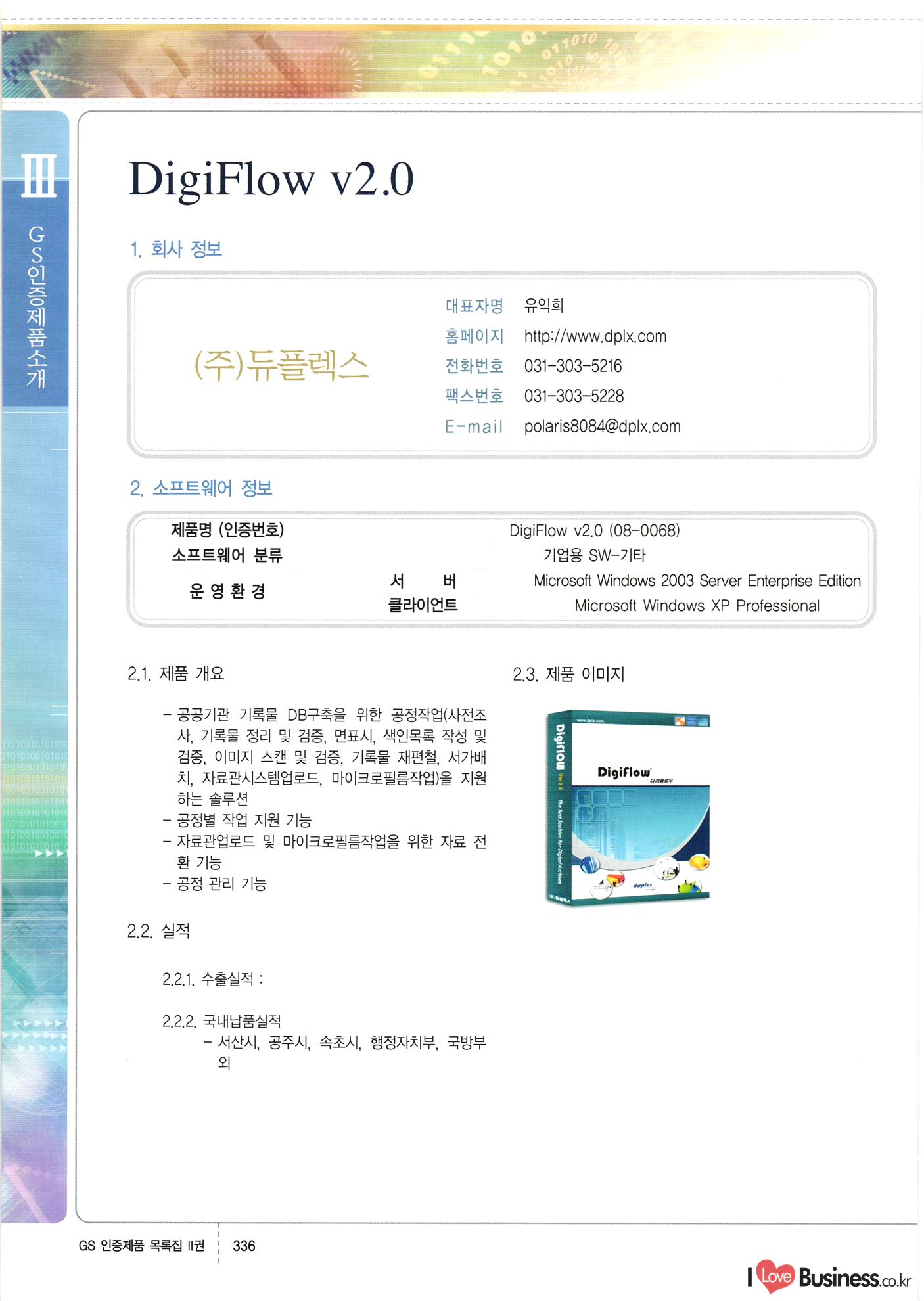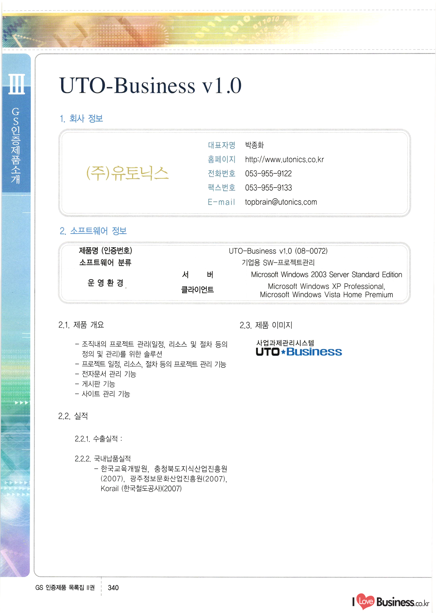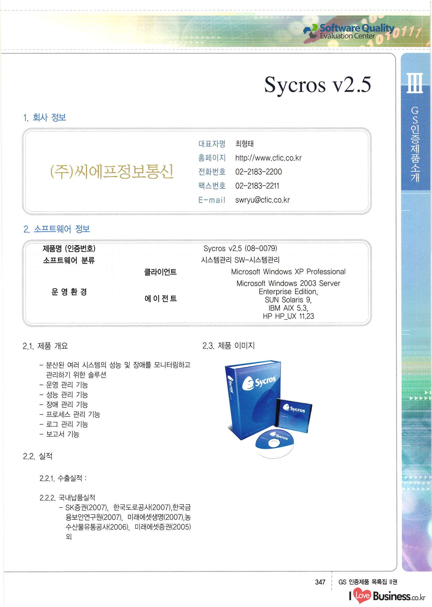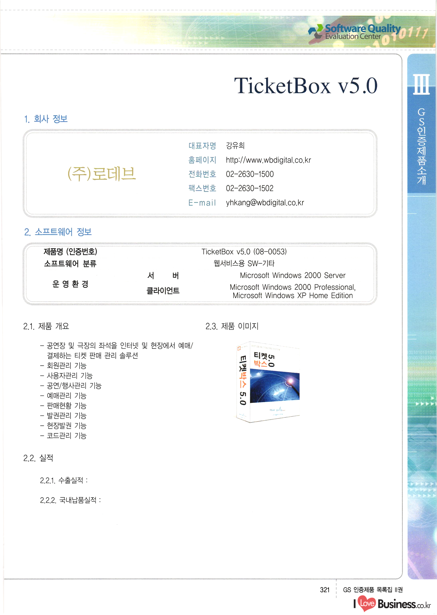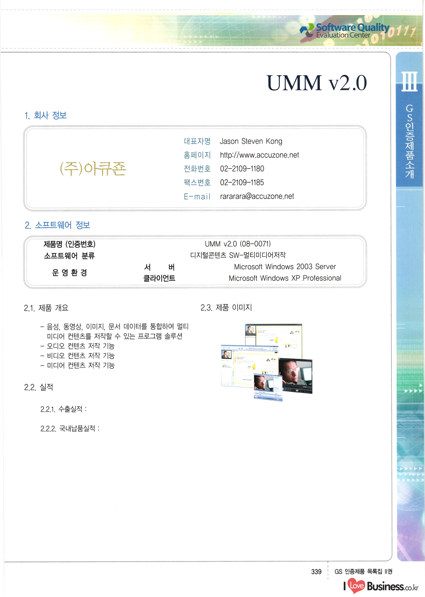 | III. GS 인증제품 목록 | 권-페이지번호 | 권-페이지번호 VT : VeriTest 국제 인증 GS인증제품목록 회사명 삼성에스디에스(주) 제품. EasyBase v4.1 페이지 50 1 제이엔에스 3DM Survey System v1.0 2 | 51 1 (주)싸이웍스 (주)테크다임 (주)다보넷 (주)로지스인포 CyberWALL 2000 v2.16 Jword v1.5 Touchsign v 2.1 키퍼엣홈 v1.0 78 52 (주)미래에듀테크 아이버스 v1.0 53 54 55 56 57 번호 | 인증번호 | 인증일자 01-0001 | 2001.07.25 101-0002 2001.10.22 (02-0027) | 01-0003 | 2001.11.27 | 01-0004 | 2001.11.27 | 01-0005 2001.11.27 5 | 01-0006 | 2001.12.27 02-0001 (02-0029) 2002.01.29 16 | | 02-0002 1 | 2002.02.16 | 02-0003 | 2002.02.16 02-0004 2002.02.27 9 | 02-0005 | 2002.02.27 110 | | 02-0006 | 2002.03.27 11 | || 02-0007 | 2002.03.27 | 02-0008 | 2002.04.30 | 02-0009 | 2002.04.30 | 02-0010 | 2002.04.30 15. | 02-0011 | 2002.04.30 16 102-0012 | 2002.04.30 | 17 | 02-0013 | 2002.05.30 | 18 | 02-0014 | 2002.05.30 | 02-0015 2002.06.28 | 20 | 02-0016 | 2002.06.28 02-0017 1 2002.06.28 | 02-0018 1 | 2002.06.28 23 | 02-0019 | 2002.06.28 24 02-0020 | 2002.07.31 25 | 02-0021 | 2002.07.31 224 58 14 59 118 (주)마크애니 (주)핸디소프트 (주)슈퍼테크놀러지 (주)스펙트라 이래정보시스템(주) (주)컴리빙아이티 | (주)시큐브 (주)케이게이트 (주)소프트4소프트 스페이스인터네셔널(주) (주)컴리빙아이티 (주)그린벨시스템즈 닉스테크(주) 심플소프트 (주)한국데이타비즈네스 (주)테크다임 (주)수세리눅스코리아 (주)한컴리눅스 소프트온넷(주) 와우리눅스(주) 60 61 Document Safer v1.0 | BizFlow Groupware v3.21 | Eg columbus || v1.0 | | eNomix v1.0 Blue Eyes v3.0 i-Class Five v1.05 Secuve TOS WG v1.0 위즈웹3 v3.0 RESORT v1.01 CD Tower v2.0 i-Class One2one v1.05 MANTIS-Professional v1.0 | | SAFEpc v1.5 Simple Gallery v1.00 통합카드발급프로그램 v1.0 Techdigm JCalc v2.0 Suse Linux 7.1K Professional Hancom Linux OS 2.2 Professional | Z!Stream v2.0 와우리눅스 7.1 파란 Secuve TOS WG Agent (Secuve Tos WG Manager) | SMERP v1.1 상하수도범용/ZEUS v1.0 U-Solver v1.0 dDIMS v3.0 DAL v2.5 101010101 1000 101003010101 190 1001010101 21 78. 122 | UL 63 64 65 26 | VT-02-001 | 2002.08.29 (주)시큐브 224 27 1 66 67 | 28 29 130 | 02-0022 | 2002.08.30 | 02-0023 | 2002.10.31 | 02-0024 | 2002.10.31 | 02-0025 | 2002.11.27 | 02-0026 | 2002.11.27 02-0027 (01-0002) 2002.11.27 | 02-0028 (03-0021) 2002.12.09 | 대한상공회의소 한국통신데이타(주) (주)지노시스템 유니온정보시스템(주) (주) 스 68 69 | 70 311 제이엔에스 소프트(구 제이엔에스) 3DM Survey System v1.0 (주)한국지능형정보시스템 한국관(상하수도 범용/TGW) v1.00 92 GS 인증제품 목록집 1권 | 26 I Love Business.co.kr Software Quality, 111 Evaluation Center | 권-페이지번호 II권페이지번호 VT : VeriTest 국제 인증 페이지 회사명 (주)포스데이타 제품 | iSign v2.0 | GS인증제품목록 171 | 34 | 02-0029 (주)제이슨테크(구 미래에듀테크) 아이버스 v1.0 91 72 73. 74 (주)인텔리젼스웨어 (주)하나디에스디 (주)연성정보기술 (주)포스정보 (주)켈코인 (주)포스데이타 스페이스인터내셔널 연희정보통신(주) (주)뉴테크웨이브 c-napse(GSS) v1.0 Life EduBuilder v1.0 | Email+ v3.0 1 책꽃이KDC v3.1 Challenger Webzine Webschool v3.0 1 Biz Binder v1.0 CD-Tower v3.1 상하수도 범용/UFCom v1.0 | | VirusChaser v5.0 | 175 76 118. (주)웨어벨리 Orange for ORACLE v2.2 | 번호 | 인증번호 | 인증일자 | 33 |VT-02-0022002.12.12 | | 2002.12.24 (02-0001) 35 | VT-02-003 | 2002.12.30 | 36 | 03-0001 | 2003.02.28 37. 03-0002 | 2003.02.28 | 38 | 03-0003 | 2003.02.28 | 39 | 03-0004 | 2003.02.28 40 | VT-03-001 | 2003.03.10 41 | VT-03-002) 2003.03.10 1 42 | 03-0005 | 2003.04.07 43 | 03-0006 | 2003.04.07 03-0007 2003.04.30 (03-0026) | 03-0008 | 2003.04.30 45 | 03-0009 | 2003.04.30 | 03-0010 | 2003.04.30 | 47 | 03-0011 | 2003.04.30 | 48 VT-03-003 2003.05.26 49 | 03-0012 | 2003.06.05 | 50 | 03-0013 | 2003.06.05 | 51 | 03-0014 | 2003.06.05 | 52 | 03-0015 | 2003.07.10 | 53 | 03-0016 | 2003.07.10 | 54 | 03-0017 | 2003.07.10 | | 55 | 03-0018 | 2003.07.10 | 56 | 03-0019 | 2003.08.06 57 | | 03-0020 | 2003.08.06 44 1 18 46 80 81 82 83 | (주)테크다임 (주)엔지스테크널러지 삼성에스디에스(주) 삼성에스디에스(주) (주)미디어랜드 인터컴소프트웨어(주) 에스케이씨앤씨(주) 아이티로직스(주) (주)에이씨티소프트 (주)위즈북 (주)에스오엔코리아 (주)아리수미디어 한진정보통신(주) (주)인텔리전스웨어 (주)웨어밸리 (구 (주)오알솔루션즈코리아) Techdigm Office v2.0 | G-Solution Waterworks/Sewerage v1.0 | | 79 UniCITY Standard v1.0 UniCITY Enterprise v1.0 TCO!stream 2002 v4.0 | ServerGuard v3.0 | SK-UPEX v1.0 84 NexWeb v1.2 e-Library Deluxe v4.1.5 86 DL Pro v1.0 SiR v1.01 파워CD뱅크 v4.0 89 InfoMatrix v1.00 190 Bizpus v1.0 91 85 87 88 10010010101.03 1101010100101 1100100100107 58 |VT-03-004 2003.08.12 Orange for ORACLE v2.2 | 111 59 (주)티지더블유 (구 한국지능형정보시스템) 한국관(상하수도 범용/TGW) v1.0 92 93 GIS Free v1.0 DeskPlus v2.0 1 | 94 ArcCITY v1.0 110 03-0021 (02-0028) | 2003.09.04 | 60 | 03-0022 | 2003.09.30 03-0023 | 2003.09.30 03-0024 (04-0011) | 2003.09.30 | 03-0025 | 2003.09.30 03-0026 (03-0007) | 2003.10.07 63 | 03-0027 | 2003.11.12 64 | 03-0028 | 2003.11.12 622 세광정보시스템(주) 제오스페이스(주) (주)선도소프트 (구 (주)캐드랜드) 중앙항업(주) (주)웨어밸리 (구 (주)오알솔루션즈코리아) (주)우암닷컴 (주)오투라인 geoCUBE상하수도 v1.0 95 Orange for ORACLE V2.2 111 96 RAVCOMS Eyecon v4.0 오투스쿨 v2.01 97 GS 인증제품 목록집 1권 I Love Business.co.kr | 권-페이지번호 | 권 - 페이지번호 VT : VeriTest 국제 인증 번호 페이지 회사명 소프트캠프