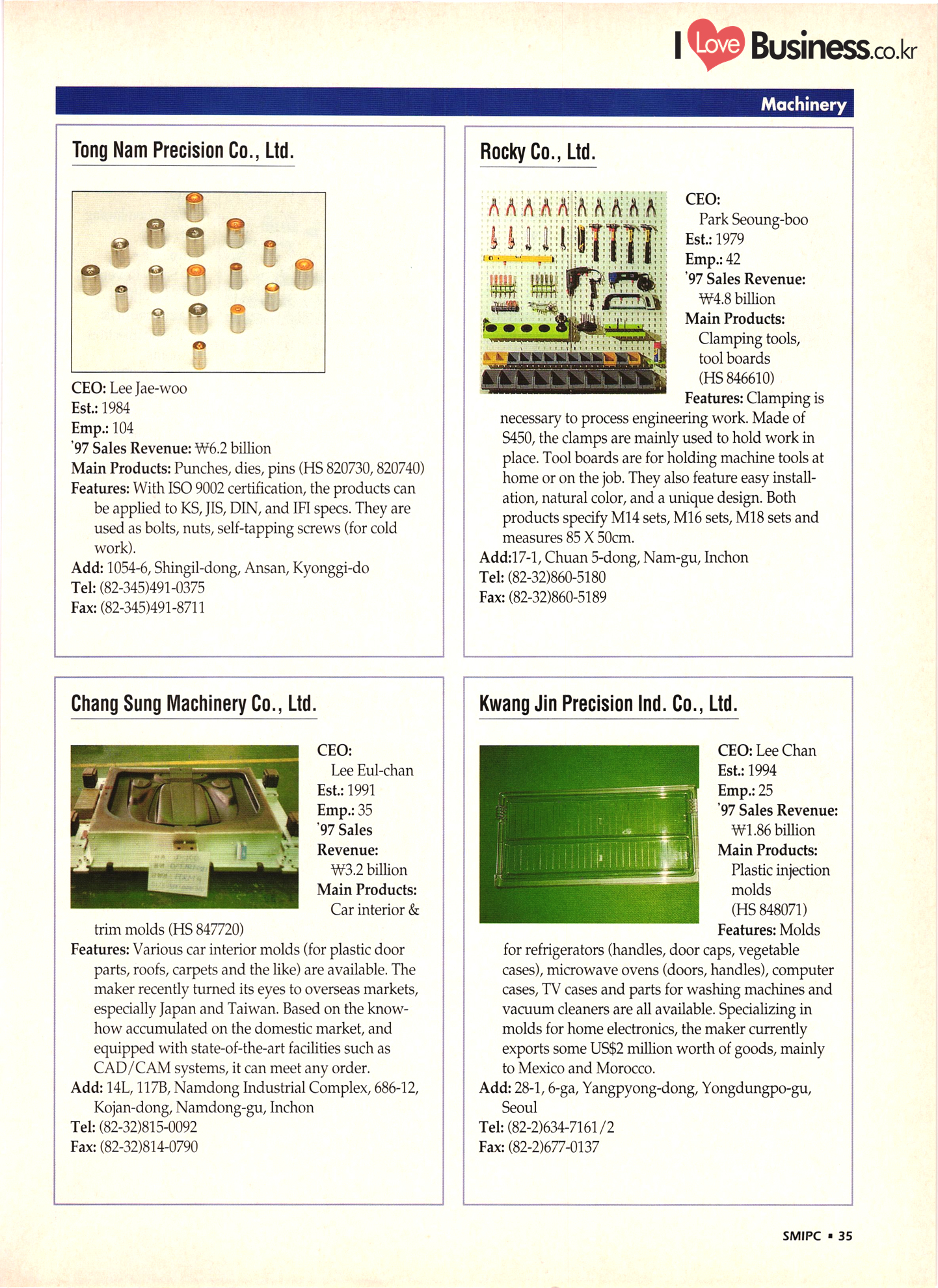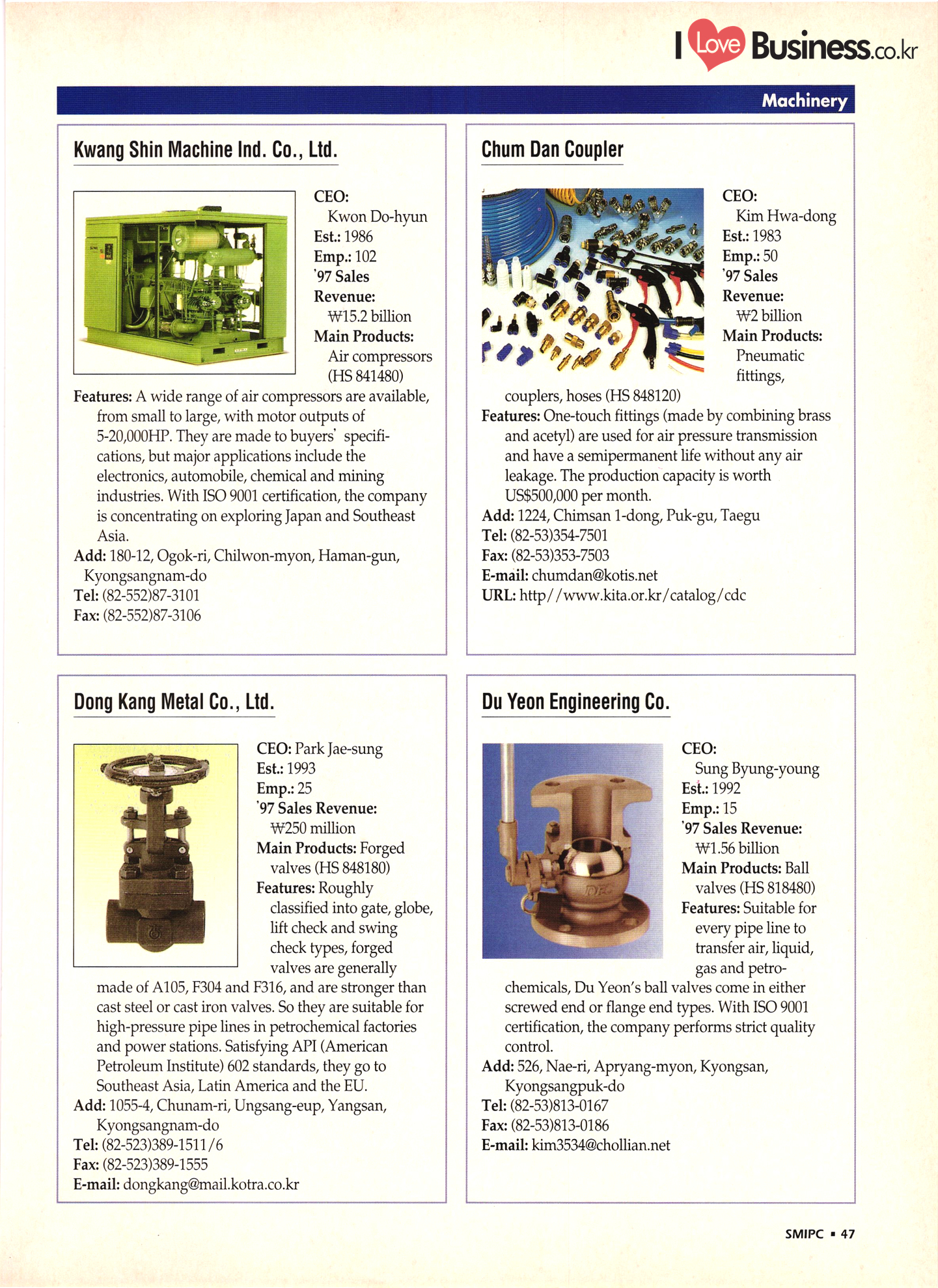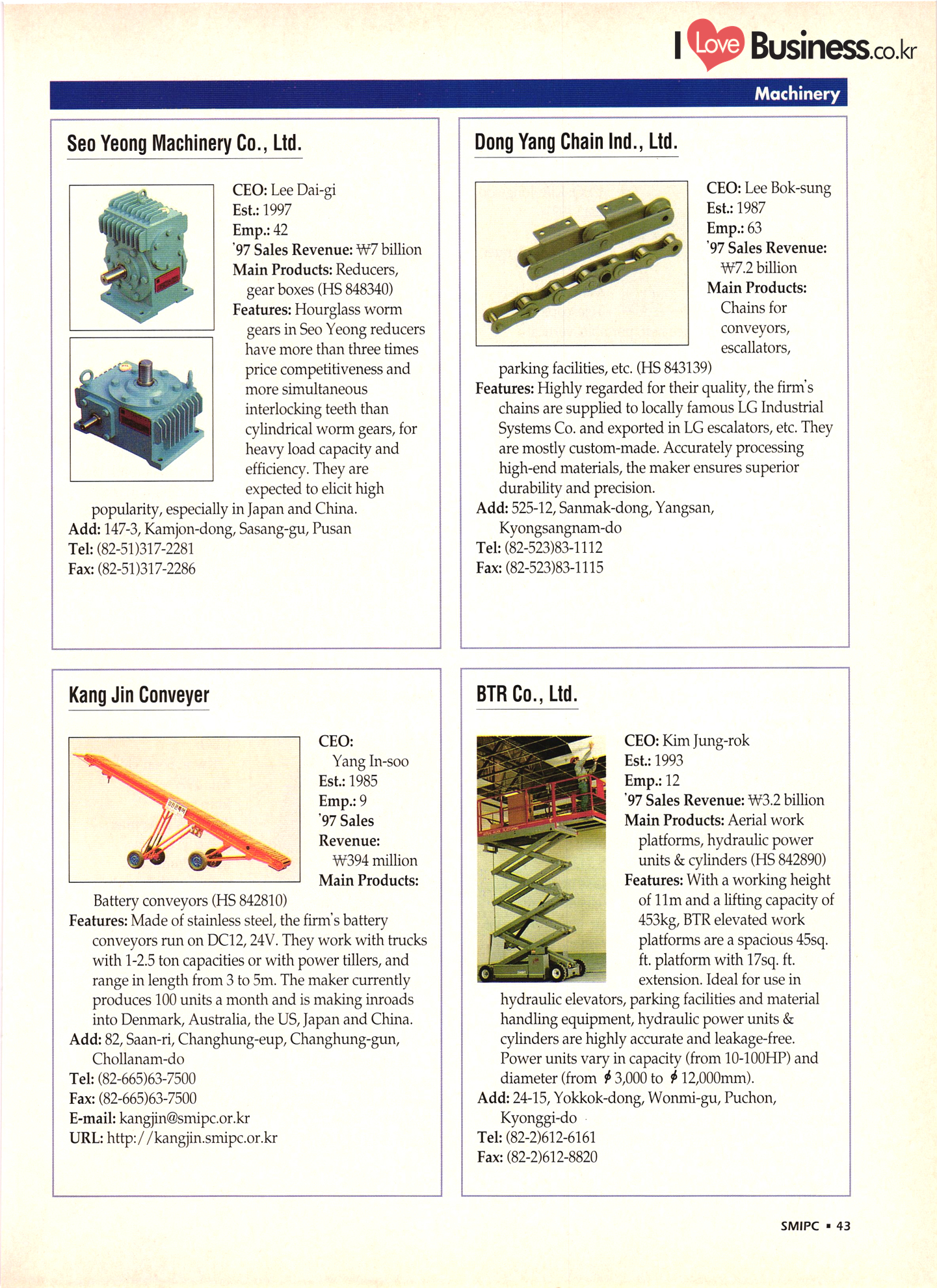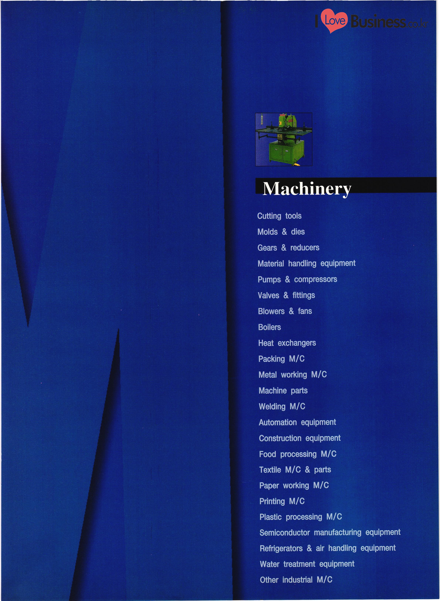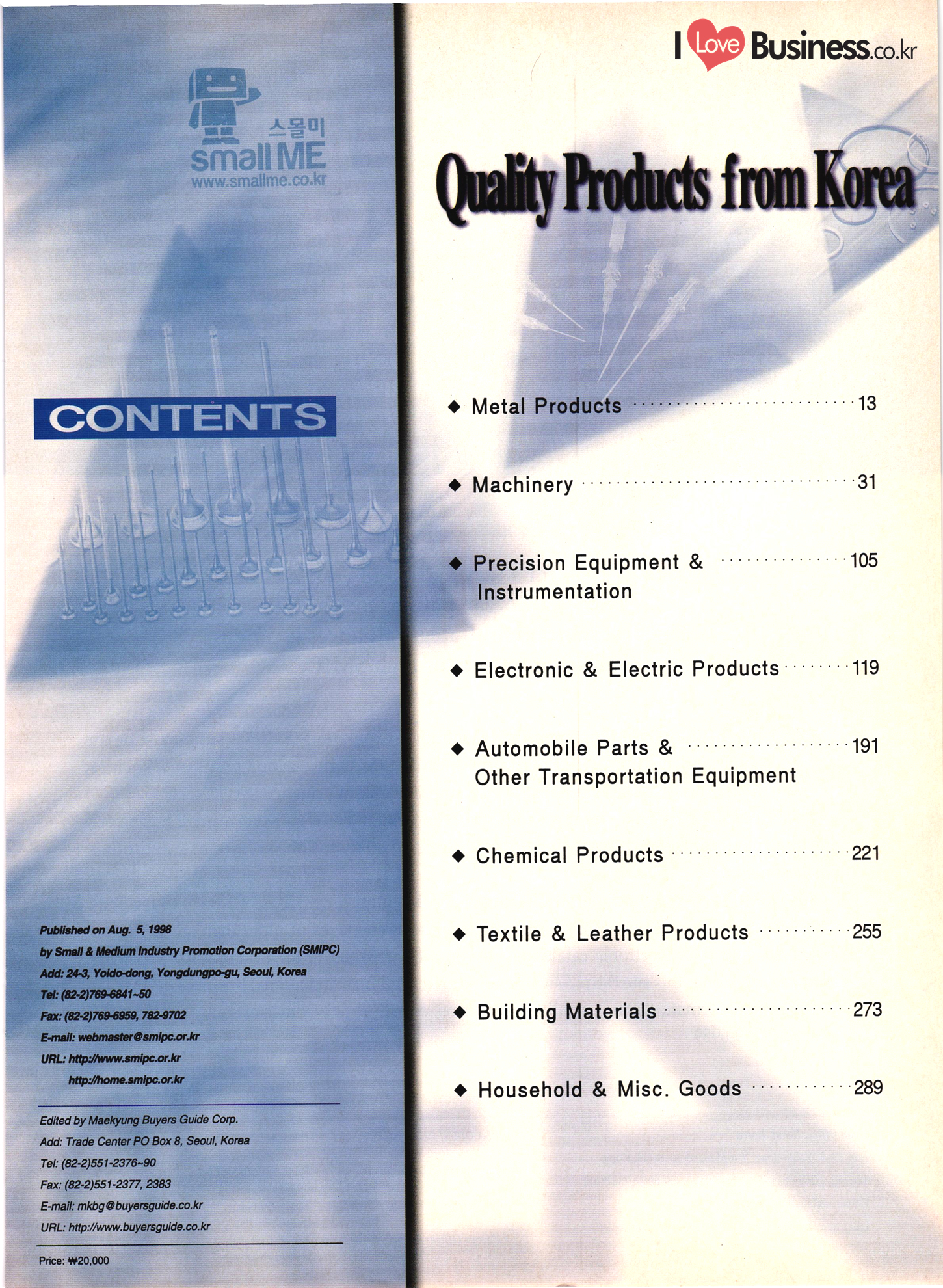 | I Love Business.co.kr small ME www.smallme.co.kr Quality Products from Korea CONTENTS • Metal Products • Machinery ..... Precision Equipment & Instrumentation • Electronic & Electric Products ........ 119 • Automobile Parts & ................... 191 Other Transportation Equipment • Chemical Products • Textile & Leather Products ......... Published on Aug. 5, 1998 by Small & Medium Industry Promotion Corporation (SMIPC) Add: 24-3, Yoido-dong, Yongdungpo-gu, Seoul, Korea Tel: (82-2)769-6841-50 Fax: (82-2)769-6959, 782-9702 E-mail: webmaster@smipc.or.kr URL: http://www.smipc.or.kr http://home.smipc.or.kr • Building Materials · • Household & Misc. Goods ........... Edited by Maekyung Buyers Guide Corp. Add: Trade Center PO Box 8, Seoul, Korea Tel: (82-2)551-2376-90 Fax: (82-2)551-2377, 2383 E-mail: mkbg@buyersguide.co.kr URL: http://www.buyersguide.co.kr Price: W20,000 Love Business Machinery Cutting tools Molds & dies Gears & reducers Material handling equipment Pumps & compressors Valves & fittings Blowers & fans Boilers Heat exchangers Packing M/C Metal working M/C Machine parts Welding M/C Automation equipment Construction equipment Food processing M/C Textile M/C & parts Paper working M/C Printing M/C Plastic processing M/C Semiconductor manufacturing equipment Refrigerators & air handling equipment 'Water treatment equipment Other industrial M/C |