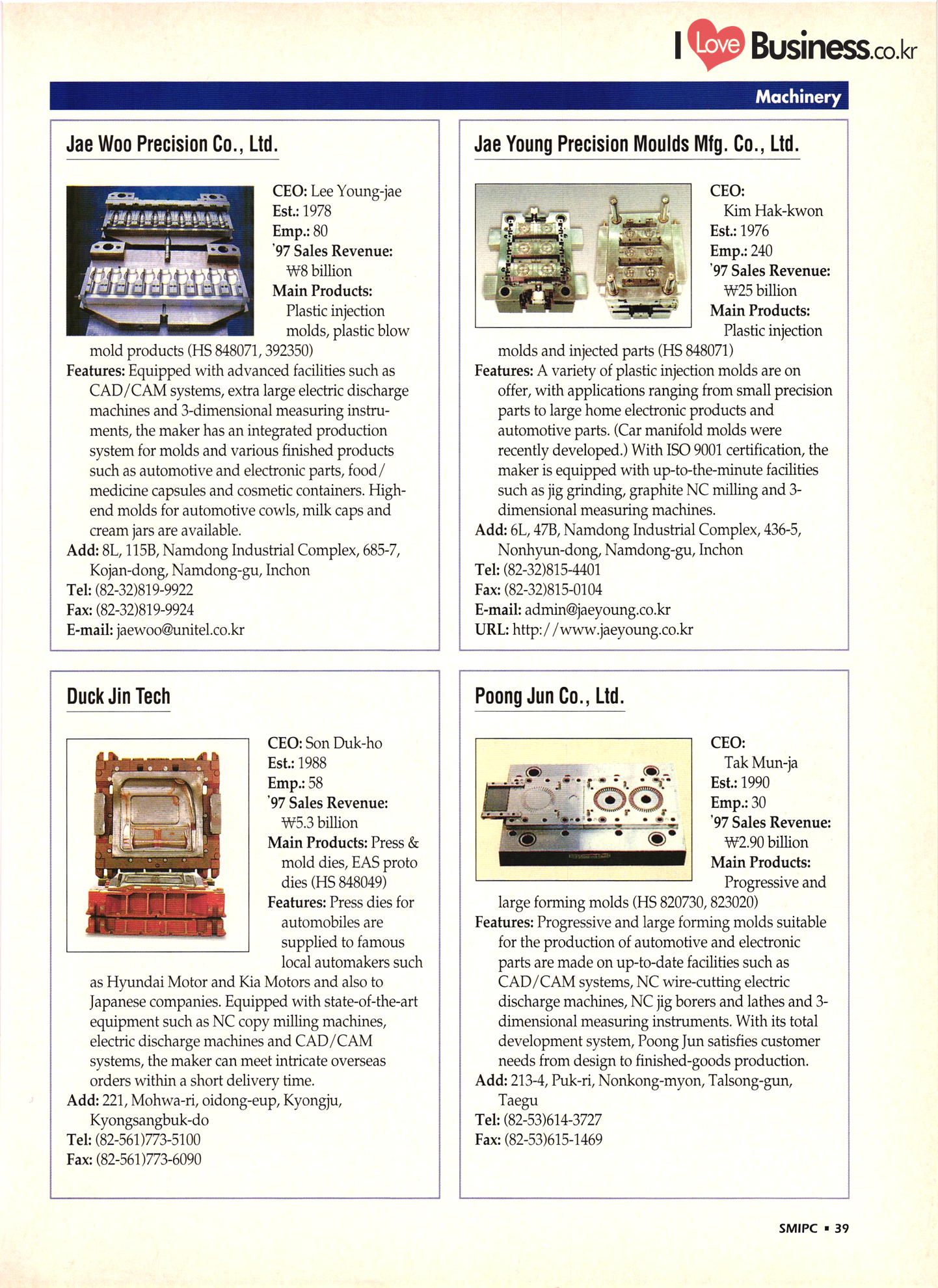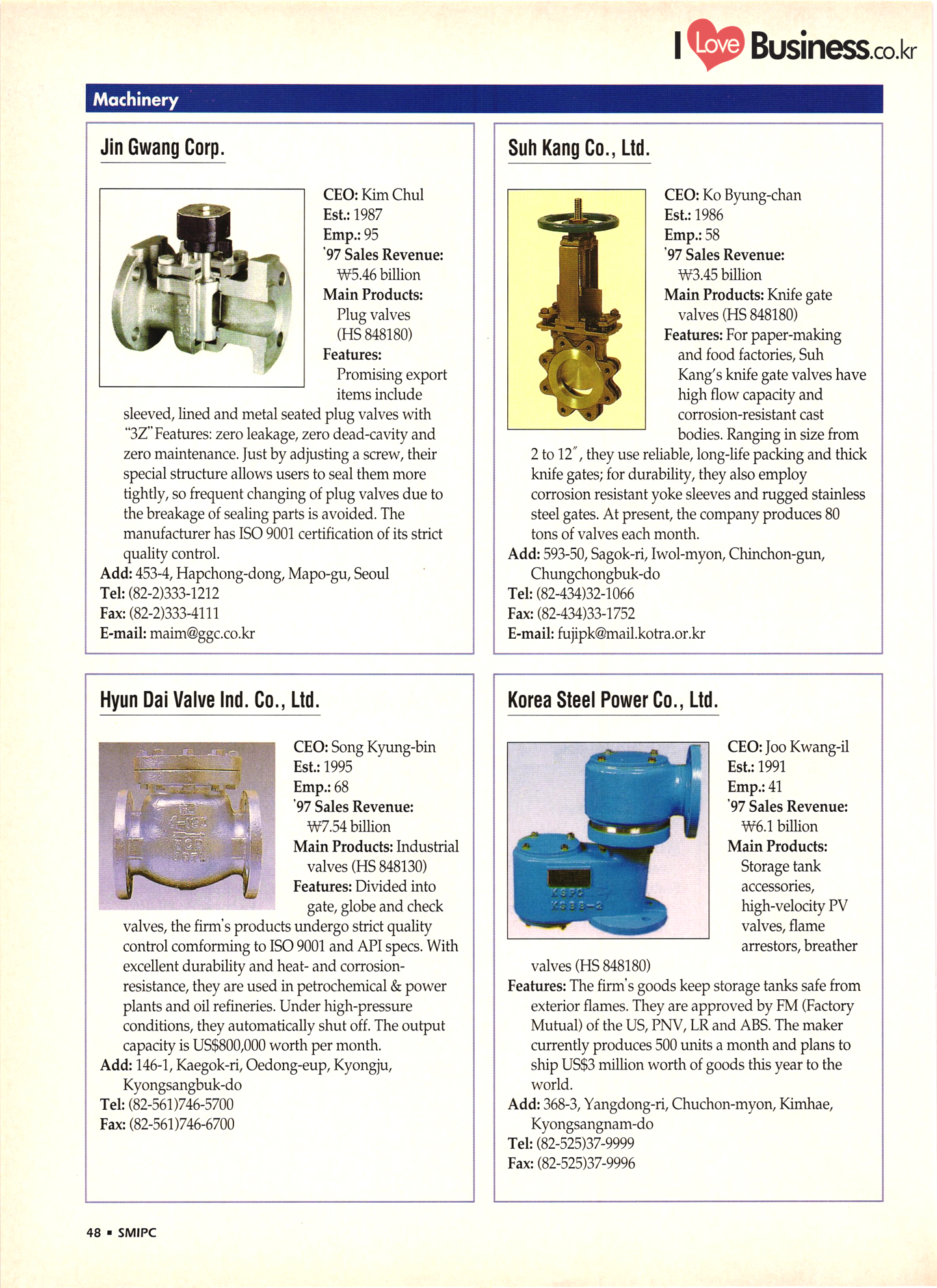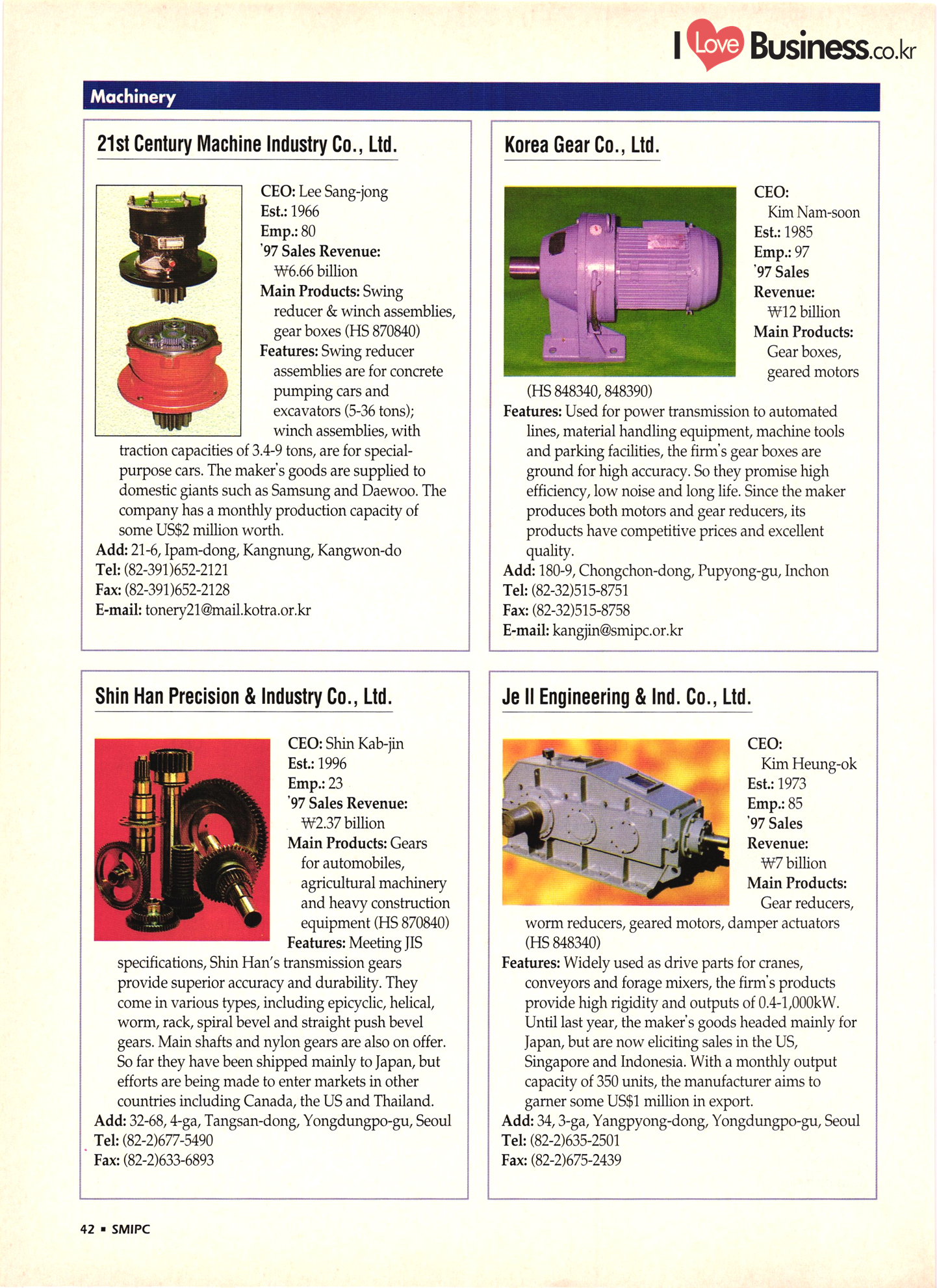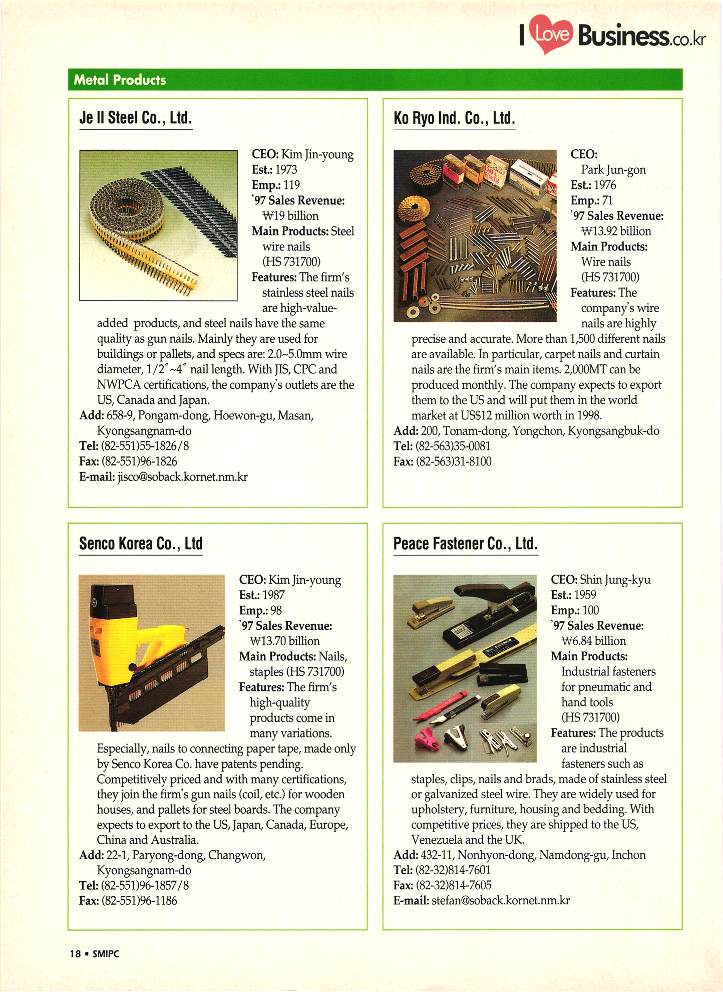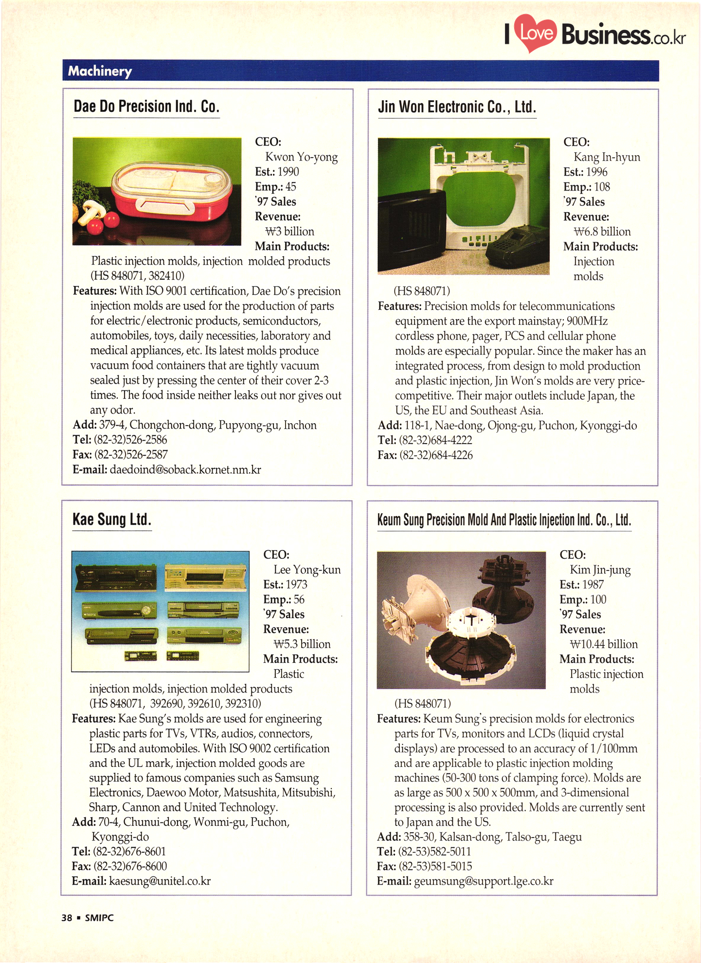 | I Love Business.co.kr small ME www.smallme.co.kr Quality Products from Korea CONTENTS • Metal Products • Machinery ..... Precision Equipment & Instrumentation • Electronic & Electric Products ........ 119 • Automobile Parts & ................... 191 Other Transportation Equipment • Chemical Products • Textile & Leather Products ......... Published on Aug. 5, 1998 by Small & Medium Industry Promotion Corporation (SMIPC) Add: 24-3, Yoido-dong, Yongdungpo-gu, Seoul, Korea Tel: (82-2)769-6841-50 Fax: (82-2)769-6959, 782-9702 E-mail: webmaster@smipc.or.kr URL: http://www.smipc.or.kr http://home.smipc.or.kr • Building Materials · • Household & Misc. Goods ........... Edited by Maekyung Buyers Guide Corp. Add: Trade Center PO Box 8, Seoul, Korea Tel: (82-2)551-2376-90 Fax: (82-2)551-2377, 2383 E-mail: mkbg@buyersguide.co.kr URL: http://www.buyersguide.co.kr Price: W20,000 Love Business Machinery Cutting tools Molds & dies Gears & reducers Material handling equipment Pumps & compressors Valves & fittings Blowers & fans Boilers Heat exchangers Packing M/C Metal working M/C Machine parts Welding M/C Automation equipment Construction equipment Food processing M/C Textile M/C & parts Paper working M/C Printing M/C Plastic processing M/C Semiconductor manufacturing equipment Refrigerators & air handling equipment 'Water treatment equipment Other industrial M/C |
