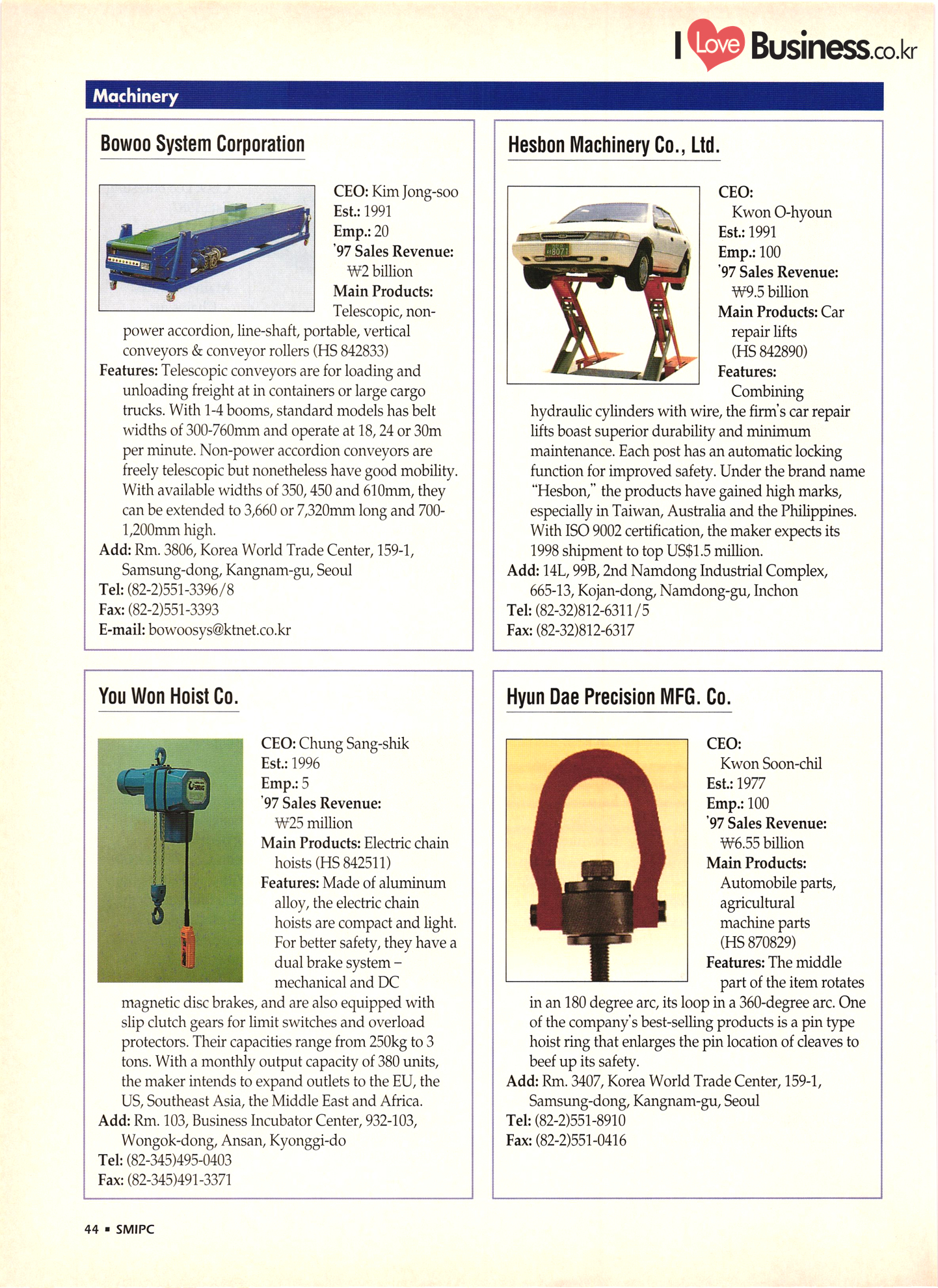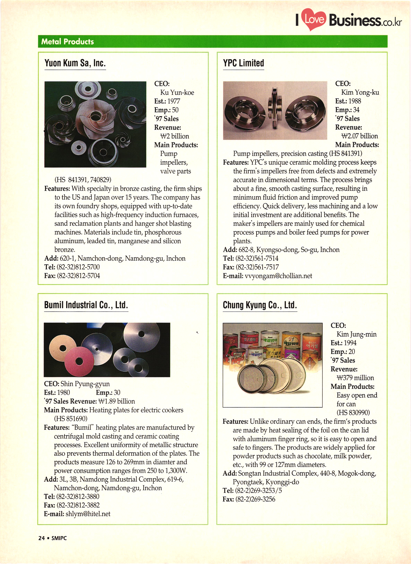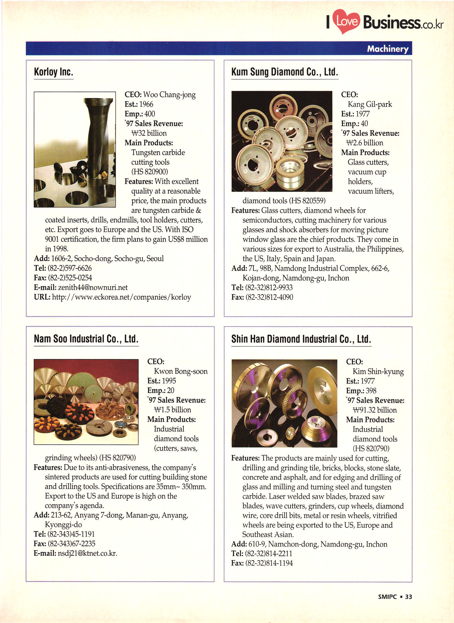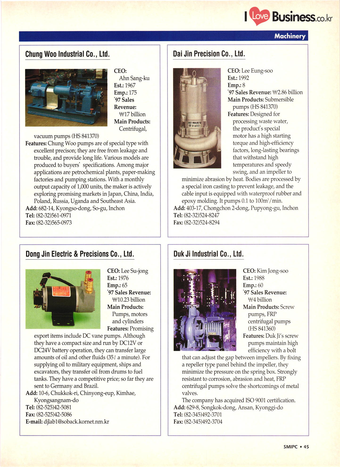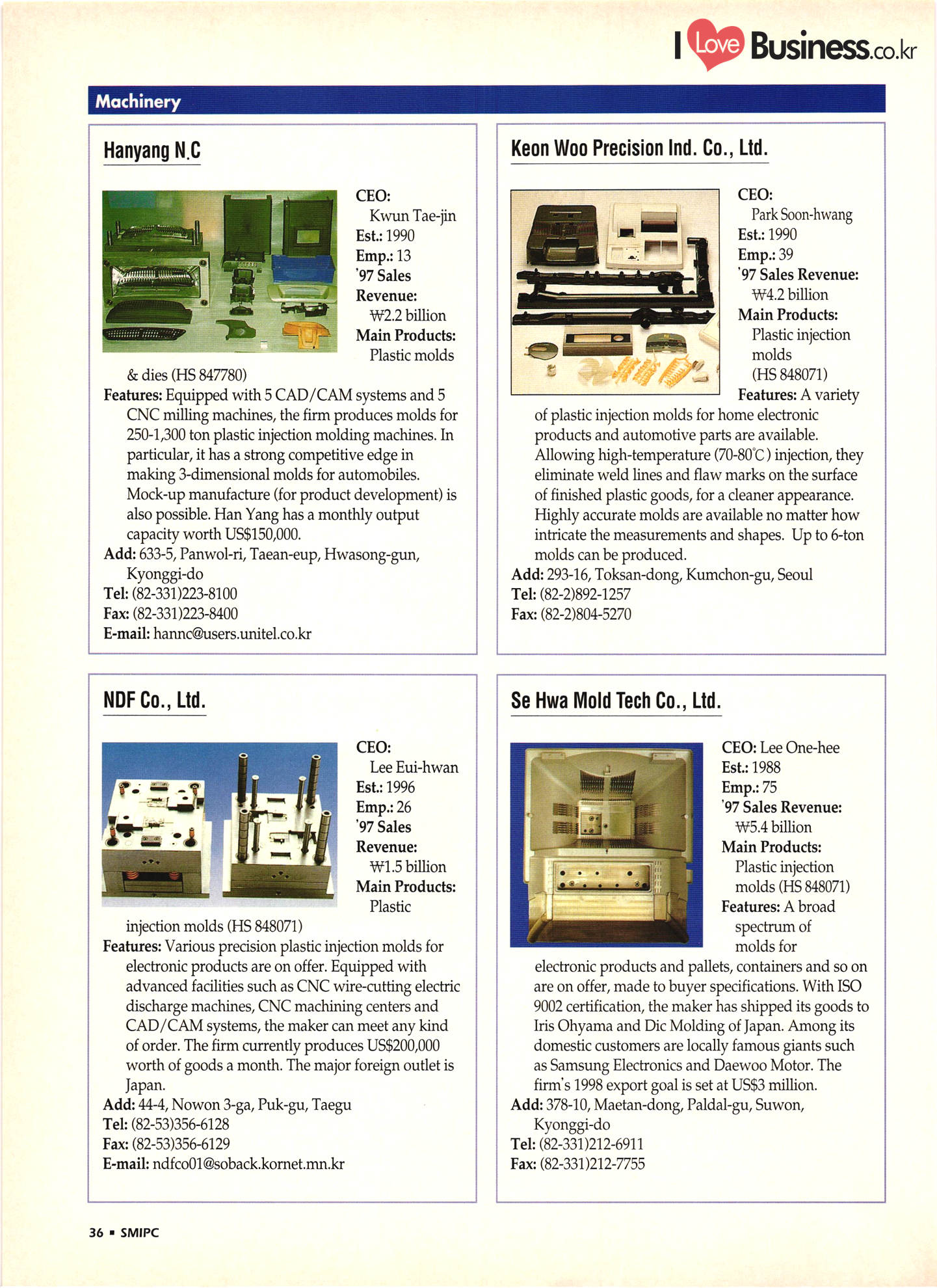 | I Love Business.co.kr small ME www.smallme.co.kr Quality Products from Korea CONTENTS • Metal Products • Machinery ..... Precision Equipment & Instrumentation • Electronic & Electric Products ........ 119 • Automobile Parts & ................... 191 Other Transportation Equipment • Chemical Products • Textile & Leather Products ......... Published on Aug. 5, 1998 by Small & Medium Industry Promotion Corporation (SMIPC) Add: 24-3, Yoido-dong, Yongdungpo-gu, Seoul, Korea Tel: (82-2)769-6841-50 Fax: (82-2)769-6959, 782-9702 E-mail: webmaster@smipc.or.kr URL: http://www.smipc.or.kr http://home.smipc.or.kr • Building Materials · • Household & Misc. Goods ........... Edited by Maekyung Buyers Guide Corp. Add: Trade Center PO Box 8, Seoul, Korea Tel: (82-2)551-2376-90 Fax: (82-2)551-2377, 2383 E-mail: mkbg@buyersguide.co.kr URL: http://www.buyersguide.co.kr Price: W20,000 Love Business Machinery Cutting tools Molds & dies Gears & reducers Material handling equipment Pumps & compressors Valves & fittings Blowers & fans Boilers Heat exchangers Packing M/C Metal working M/C Machine parts Welding M/C Automation equipment Construction equipment Food processing M/C Textile M/C & parts Paper working M/C Printing M/C Plastic processing M/C Semiconductor manufacturing equipment Refrigerators & air handling equipment 'Water treatment equipment Other industrial M/C |