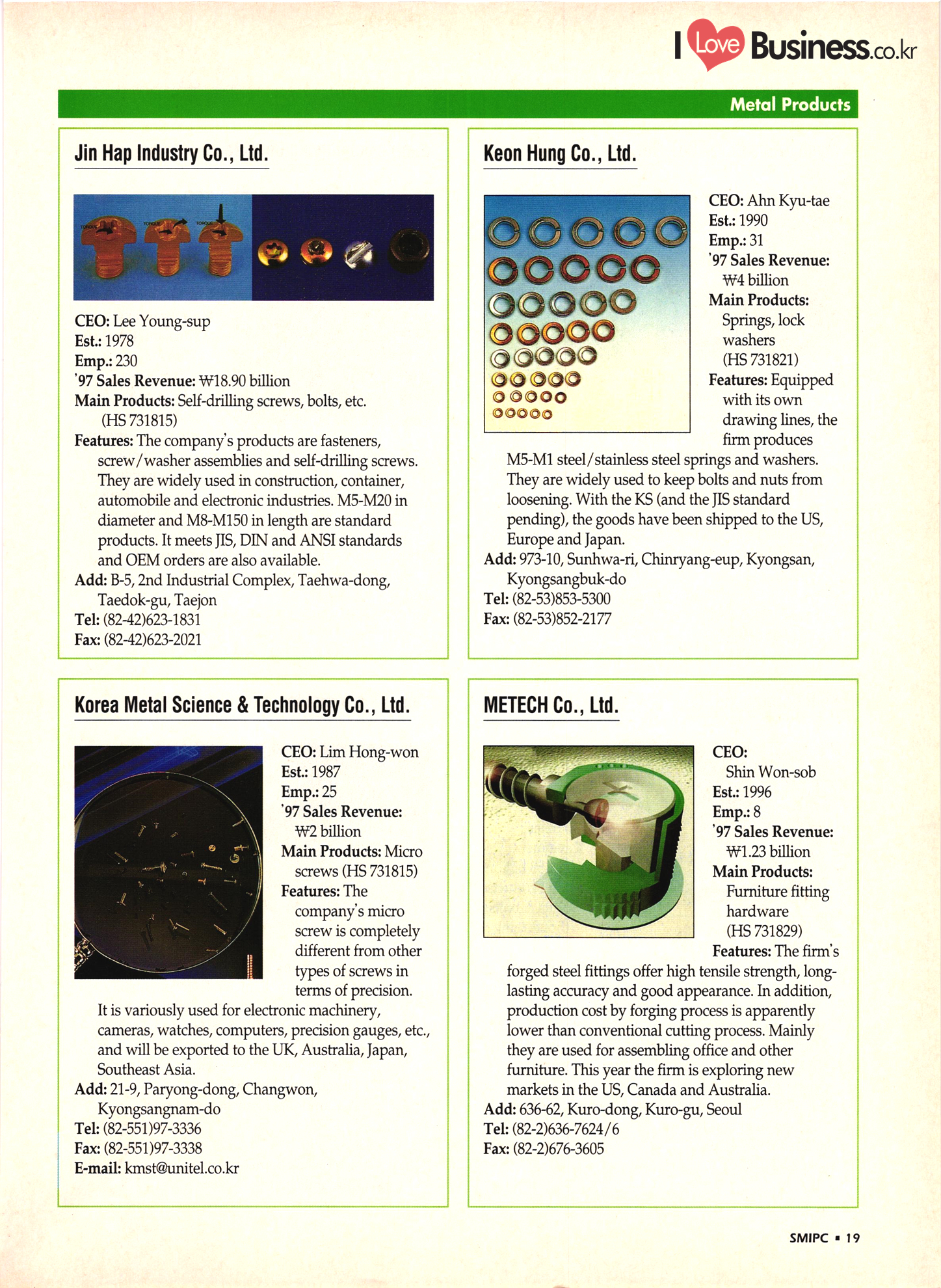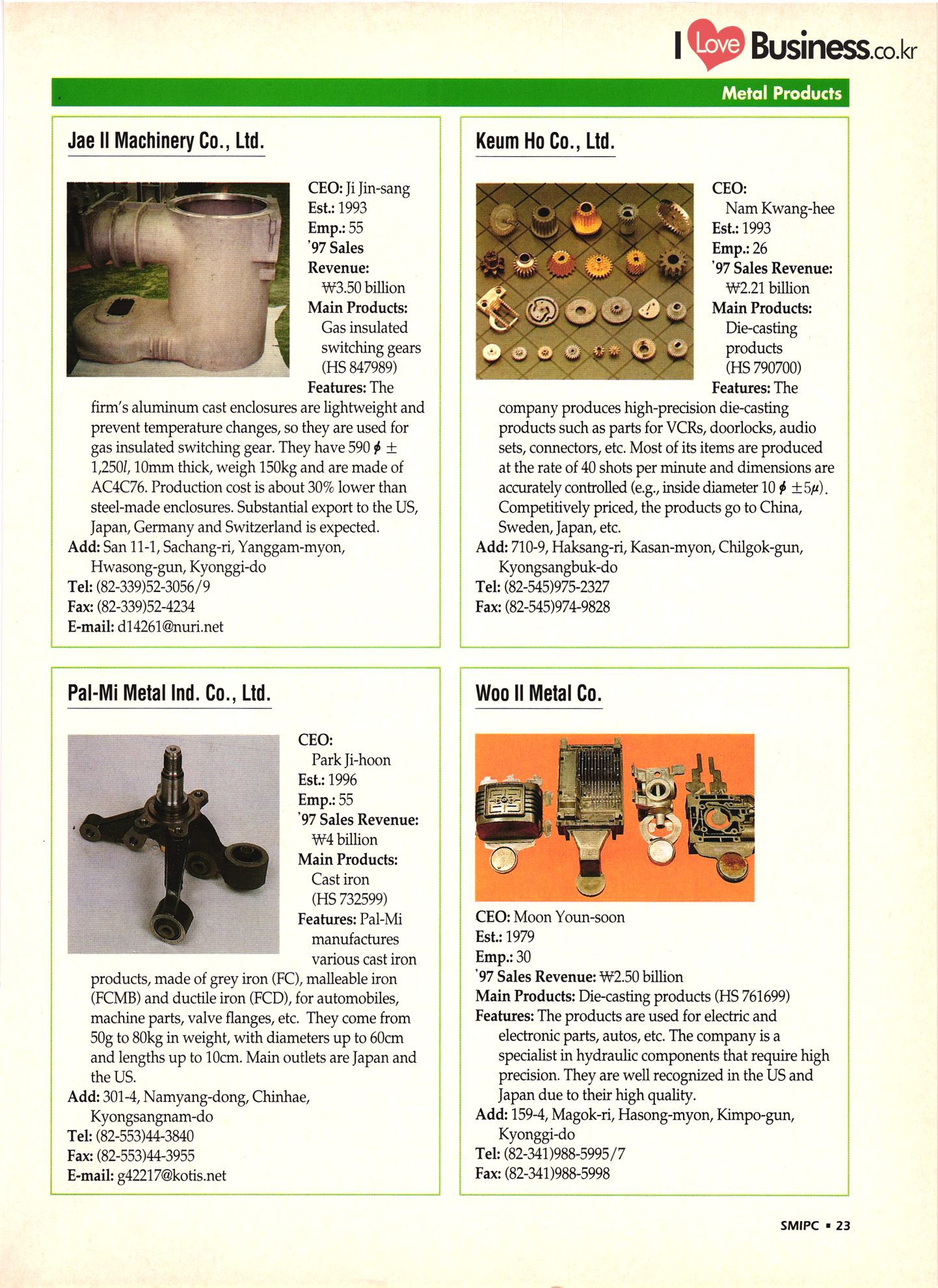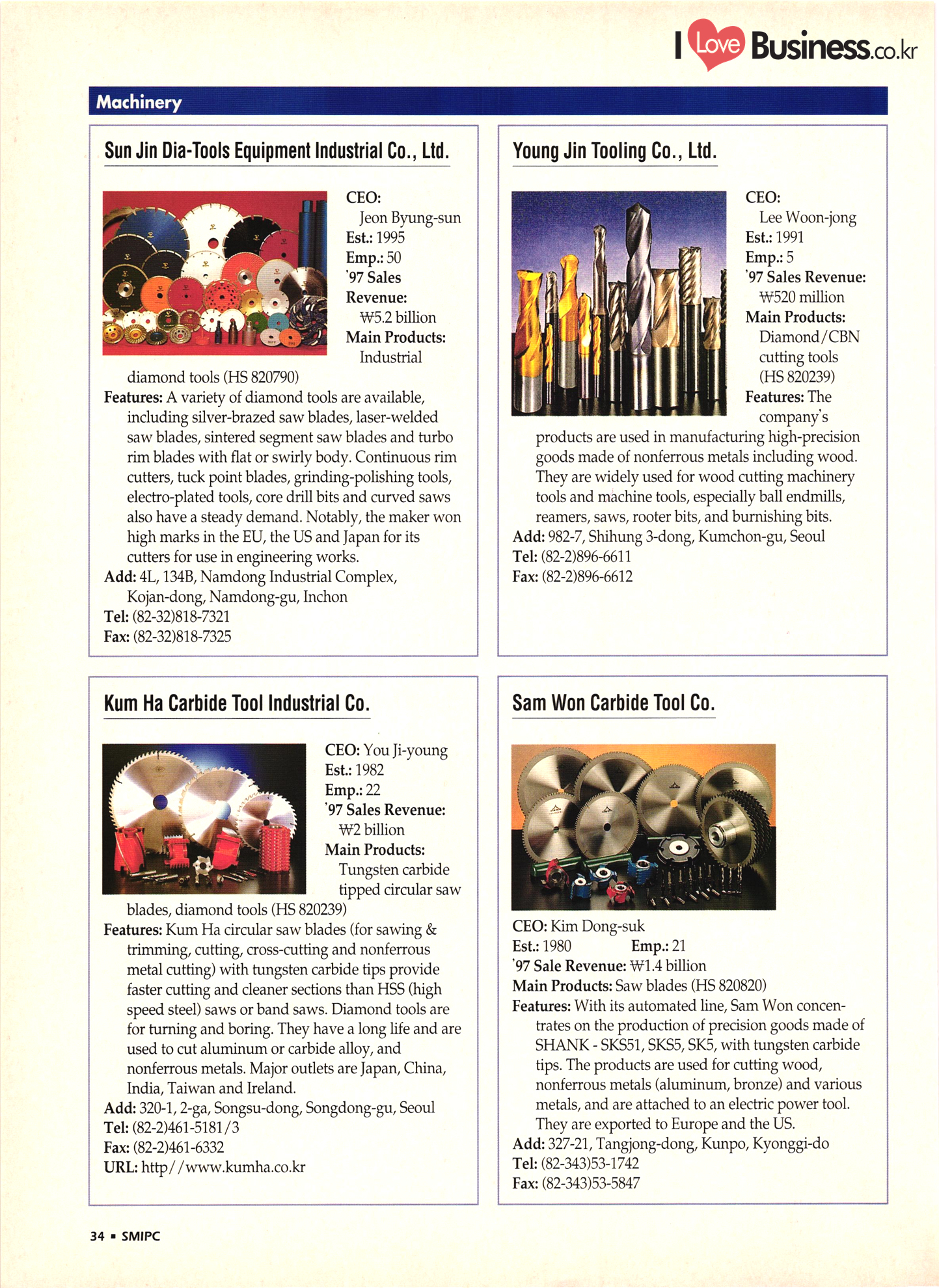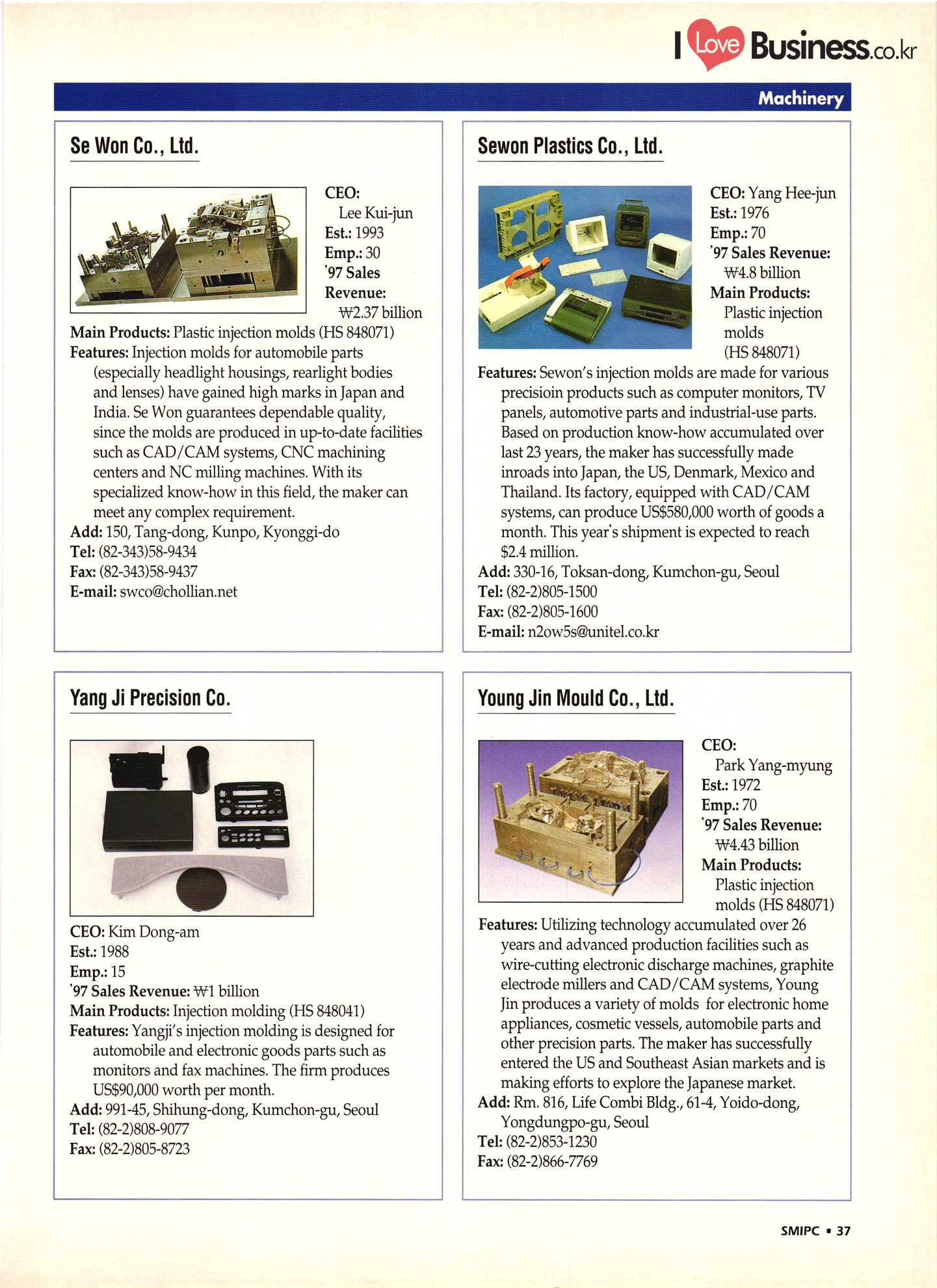 | I Love Business.co.kr small ME www.smallme.co.kr Quality Products from Korea CONTENTS • Metal Products • Machinery ..... Precision Equipment & Instrumentation • Electronic & Electric Products ........ 119 • Automobile Parts & ................... 191 Other Transportation Equipment • Chemical Products • Textile & Leather Products ......... Published on Aug. 5, 1998 by Small & Medium Industry Promotion Corporation (SMIPC) Add: 24-3, Yoido-dong, Yongdungpo-gu, Seoul, Korea Tel: (82-2)769-6841-50 Fax: (82-2)769-6959, 782-9702 E-mail: webmaster@smipc.or.kr URL: http://www.smipc.or.kr http://home.smipc.or.kr • Building Materials · • Household & Misc. Goods ........... Edited by Maekyung Buyers Guide Corp. Add: Trade Center PO Box 8, Seoul, Korea Tel: (82-2)551-2376-90 Fax: (82-2)551-2377, 2383 E-mail: mkbg@buyersguide.co.kr URL: http://www.buyersguide.co.kr Price: W20,000 Love Business Machinery Cutting tools Molds & dies Gears & reducers Material handling equipment Pumps & compressors Valves & fittings Blowers & fans Boilers Heat exchangers Packing M/C Metal working M/C Machine parts Welding M/C Automation equipment Construction equipment Food processing M/C Textile M/C & parts Paper working M/C Printing M/C Plastic processing M/C Semiconductor manufacturing equipment Refrigerators & air handling equipment 'Water treatment equipment Other industrial M/C |
