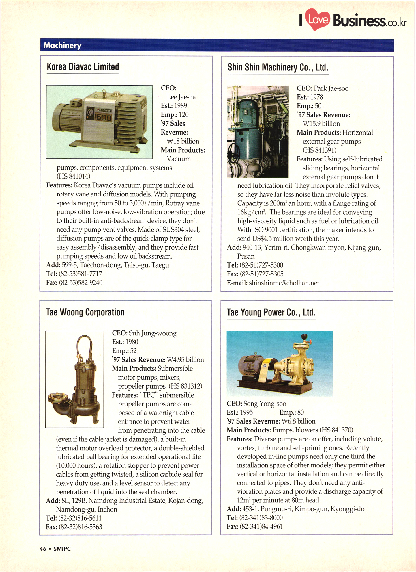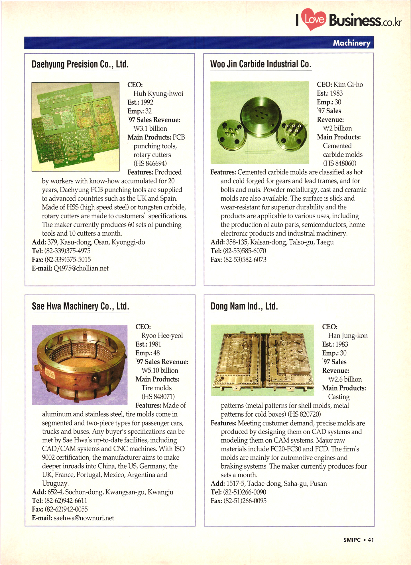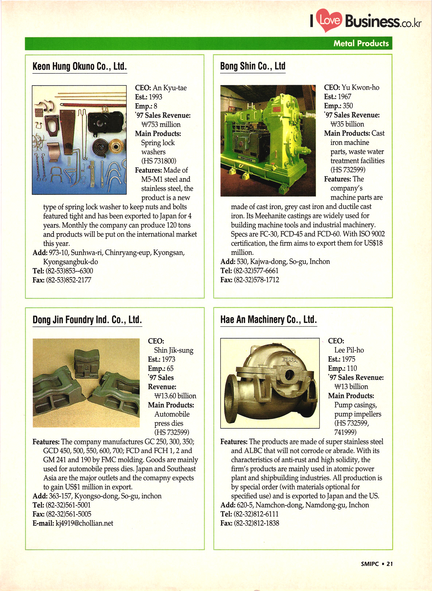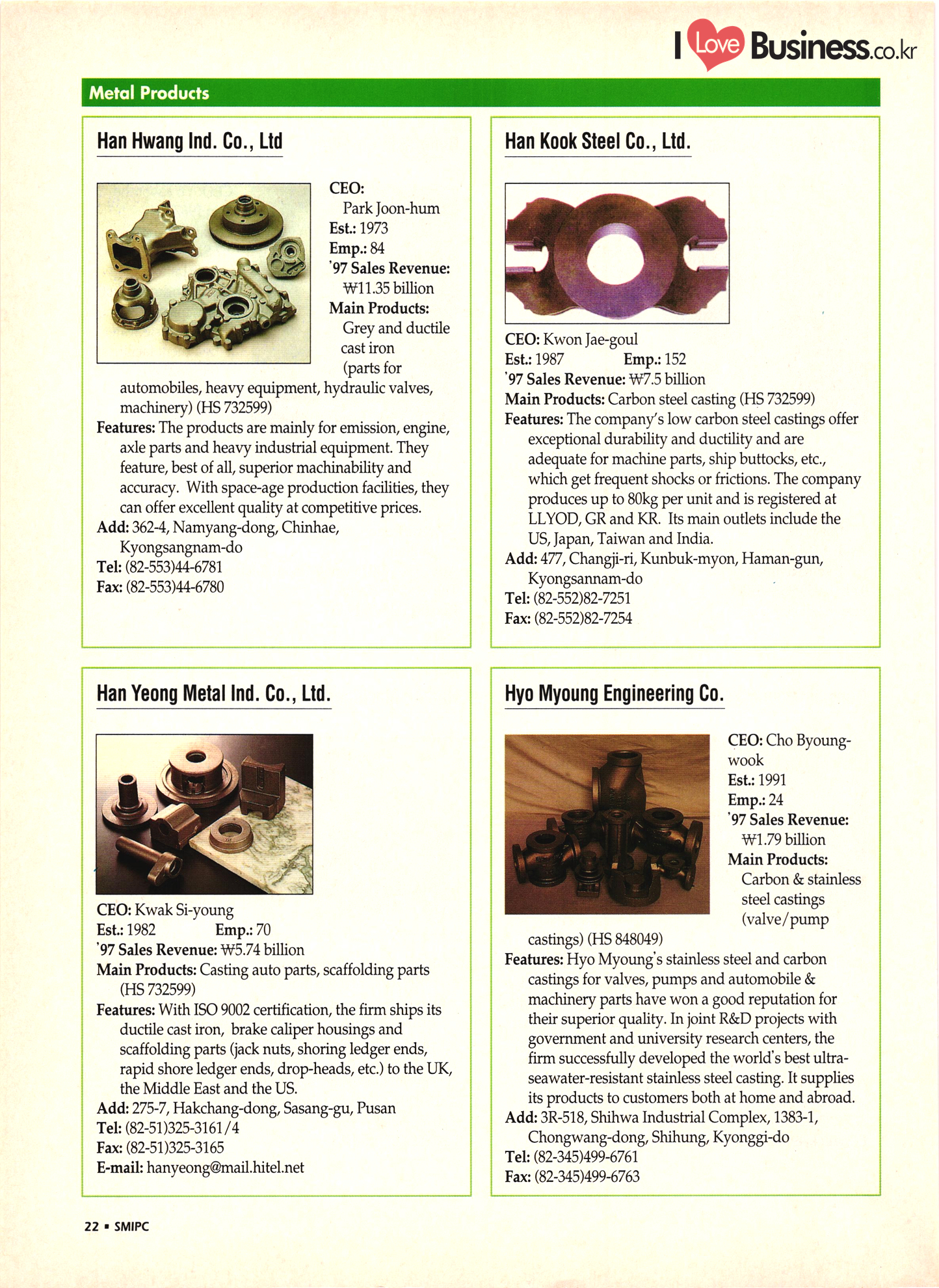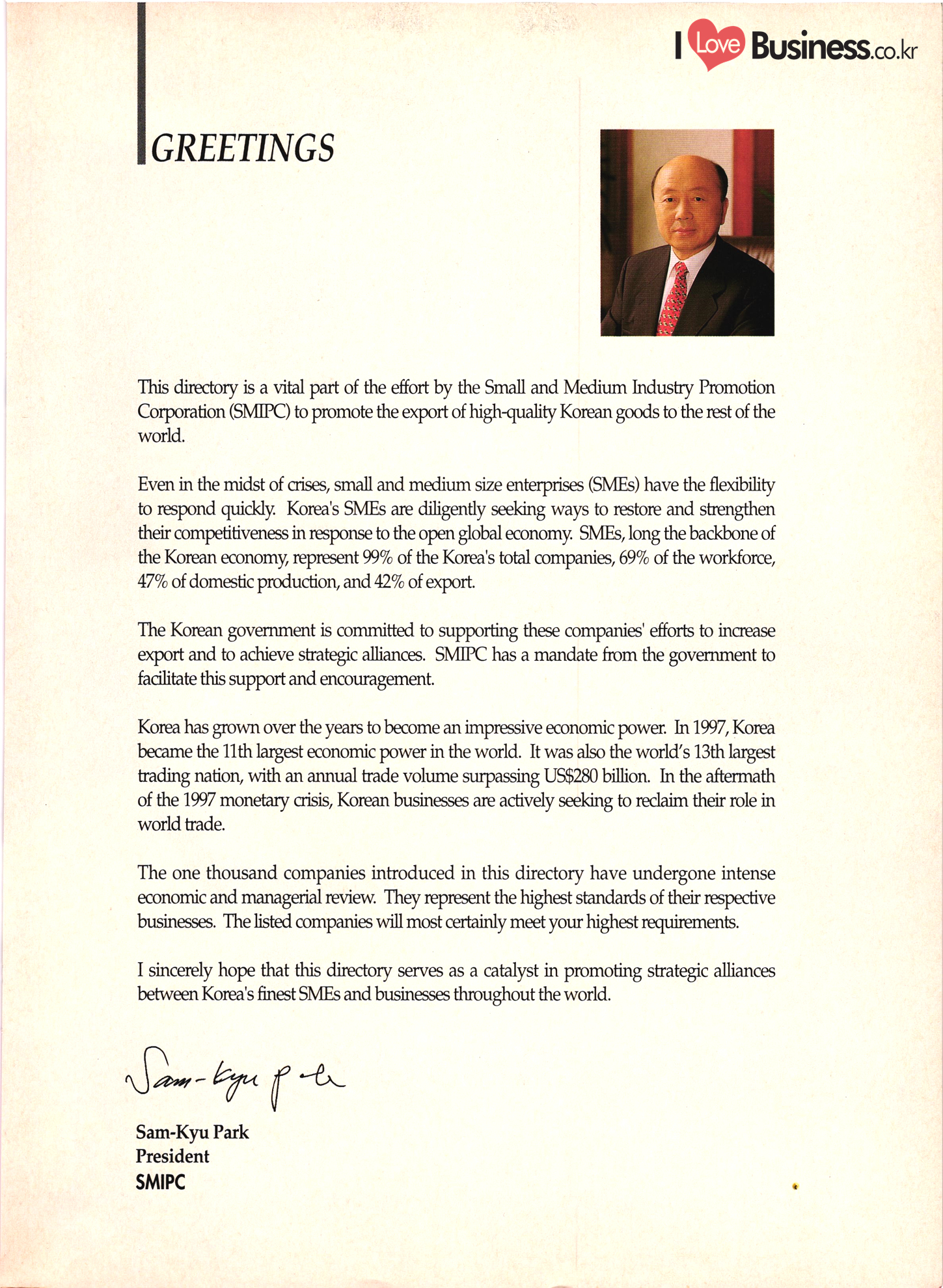 | I Love Business.co.kr small ME www.smallme.co.kr Quality Products from Korea CONTENTS • Metal Products • Machinery ..... Precision Equipment & Instrumentation • Electronic & Electric Products ........ 119 • Automobile Parts & ................... 191 Other Transportation Equipment • Chemical Products • Textile & Leather Products ......... Published on Aug. 5, 1998 by Small & Medium Industry Promotion Corporation (SMIPC) Add: 24-3, Yoido-dong, Yongdungpo-gu, Seoul, Korea Tel: (82-2)769-6841-50 Fax: (82-2)769-6959, 782-9702 E-mail: webmaster@smipc.or.kr URL: http://www.smipc.or.kr http://home.smipc.or.kr • Building Materials · • Household & Misc. Goods ........... Edited by Maekyung Buyers Guide Corp. Add: Trade Center PO Box 8, Seoul, Korea Tel: (82-2)551-2376-90 Fax: (82-2)551-2377, 2383 E-mail: mkbg@buyersguide.co.kr URL: http://www.buyersguide.co.kr Price: W20,000 Love Business Machinery Cutting tools Molds & dies Gears & reducers Material handling equipment Pumps & compressors Valves & fittings Blowers & fans Boilers Heat exchangers Packing M/C Metal working M/C Machine parts Welding M/C Automation equipment Construction equipment Food processing M/C Textile M/C & parts Paper working M/C Printing M/C Plastic processing M/C Semiconductor manufacturing equipment Refrigerators & air handling equipment 'Water treatment equipment Other industrial M/C |