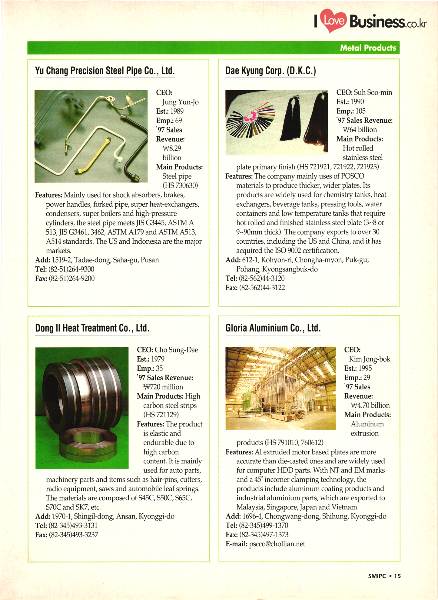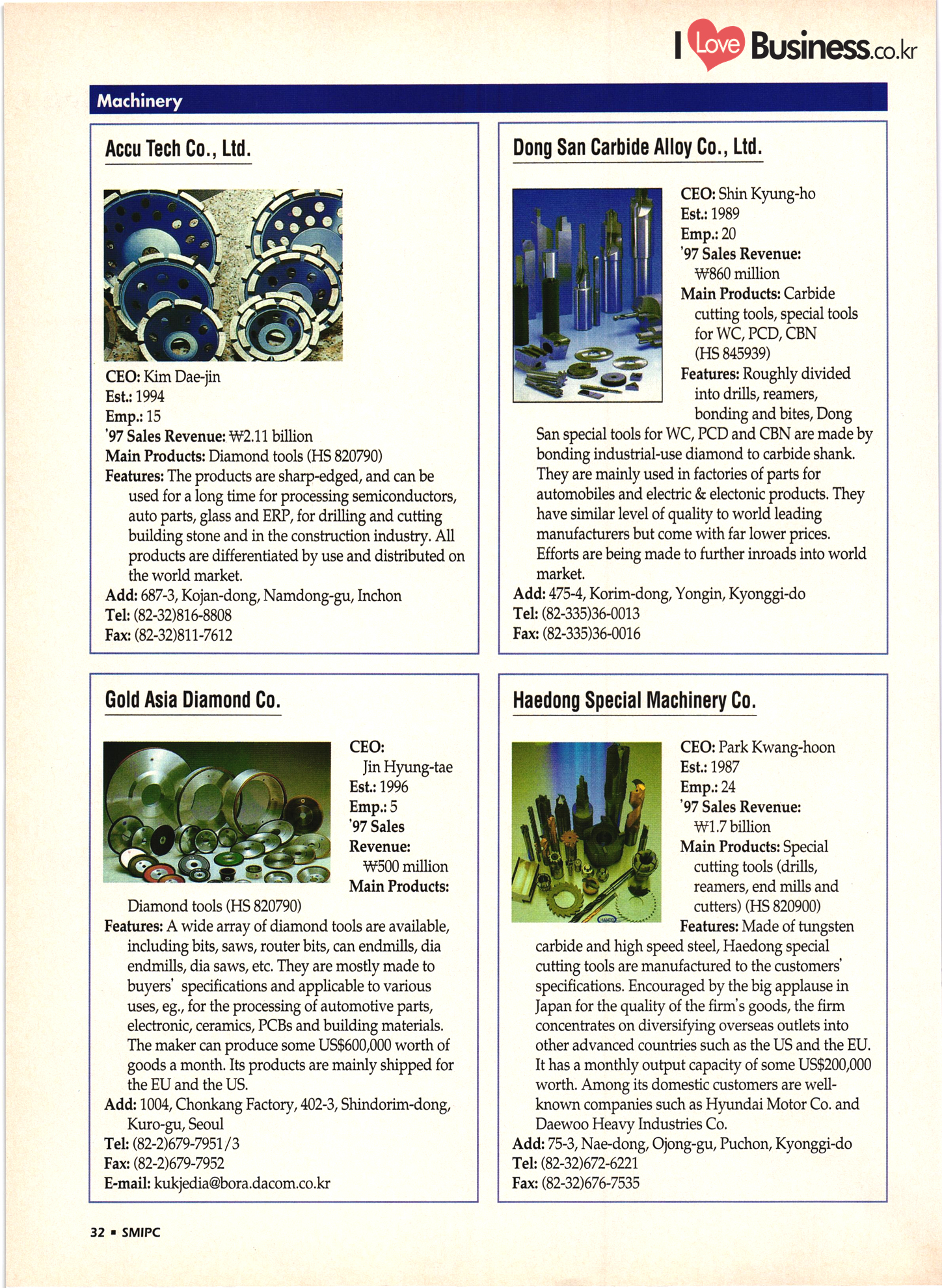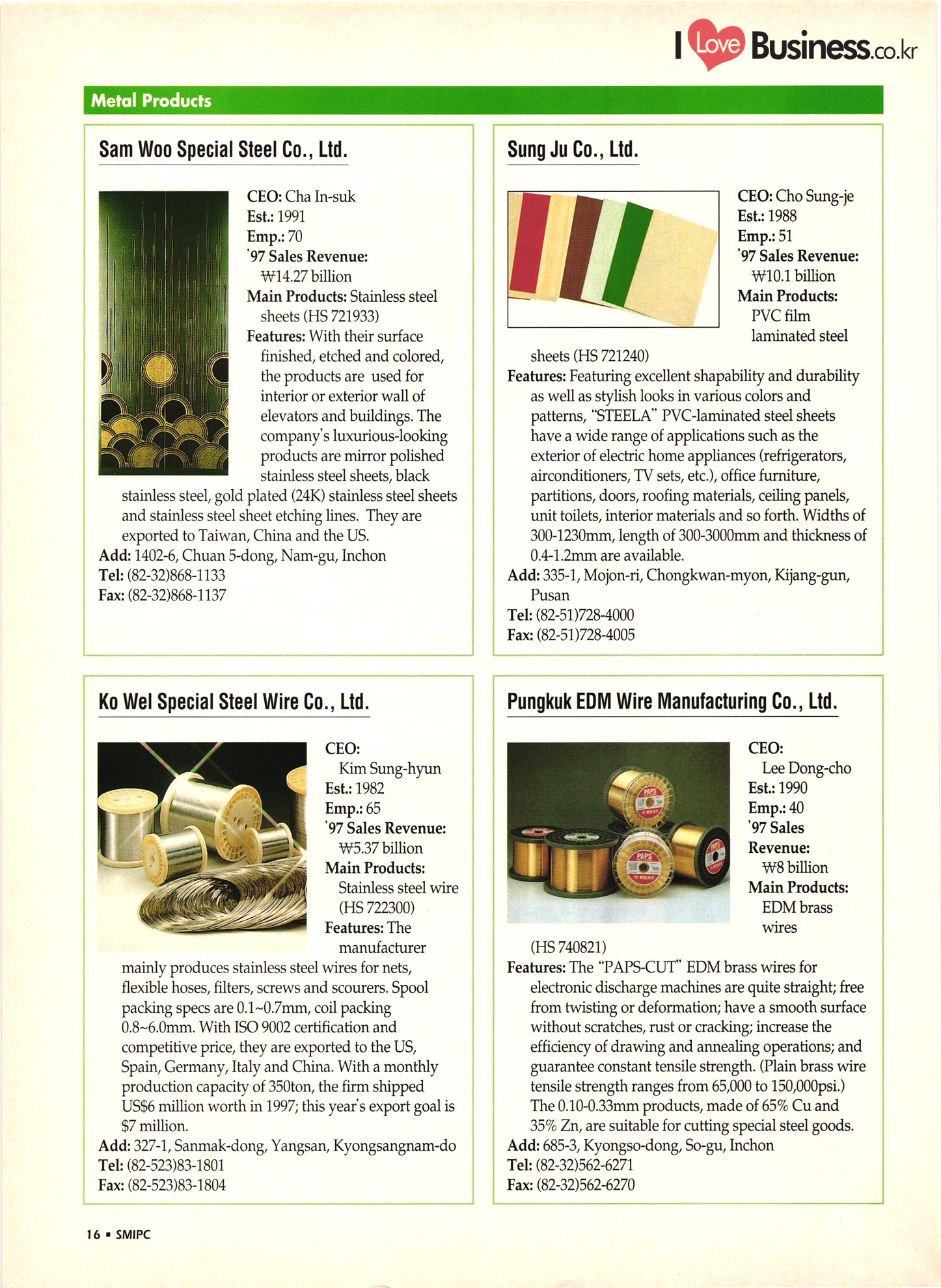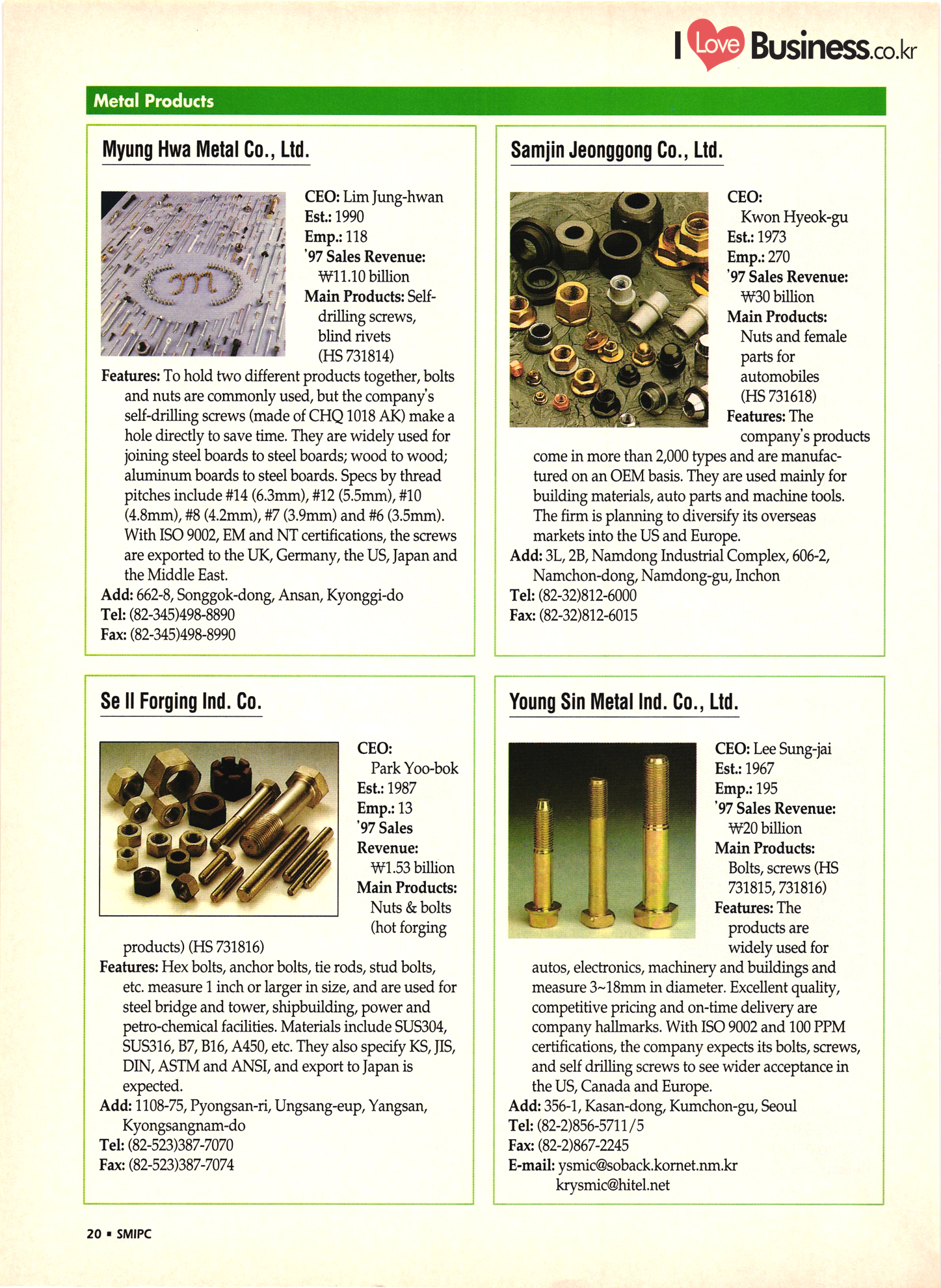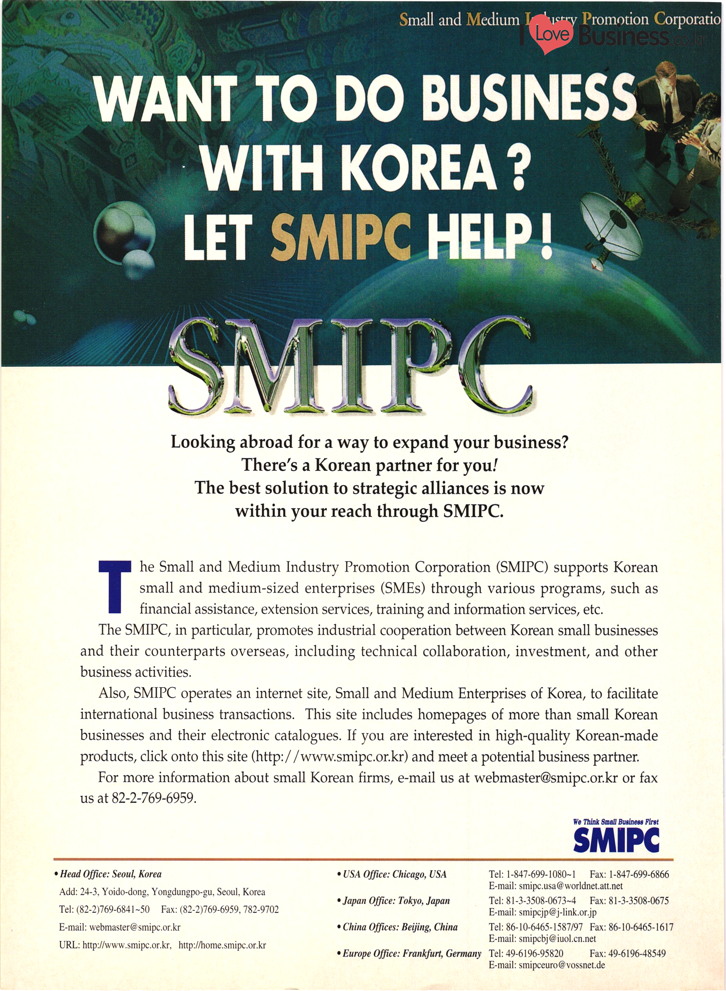 | I Love Business.co.kr small ME www.smallme.co.kr Quality Products from Korea CONTENTS • Metal Products • Machinery ..... Precision Equipment & Instrumentation • Electronic & Electric Products ........ 119 • Automobile Parts & ................... 191 Other Transportation Equipment • Chemical Products • Textile & Leather Products ......... Published on Aug. 5, 1998 by Small & Medium Industry Promotion Corporation (SMIPC) Add: 24-3, Yoido-dong, Yongdungpo-gu, Seoul, Korea Tel: (82-2)769-6841-50 Fax: (82-2)769-6959, 782-9702 E-mail: webmaster@smipc.or.kr URL: http://www.smipc.or.kr http://home.smipc.or.kr • Building Materials · • Household & Misc. Goods ........... Edited by Maekyung Buyers Guide Corp. Add: Trade Center PO Box 8, Seoul, Korea Tel: (82-2)551-2376-90 Fax: (82-2)551-2377, 2383 E-mail: mkbg@buyersguide.co.kr URL: http://www.buyersguide.co.kr Price: W20,000 Love Business Machinery Cutting tools Molds & dies Gears & reducers Material handling equipment Pumps & compressors Valves & fittings Blowers & fans Boilers Heat exchangers Packing M/C Metal working M/C Machine parts Welding M/C Automation equipment Construction equipment Food processing M/C Textile M/C & parts Paper working M/C Printing M/C Plastic processing M/C Semiconductor manufacturing equipment Refrigerators & air handling equipment 'Water treatment equipment Other industrial M/C |