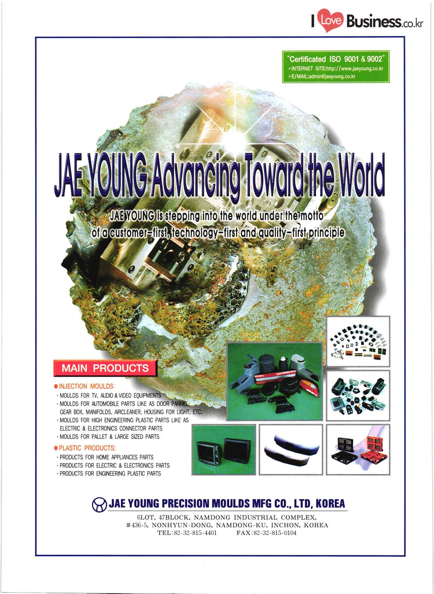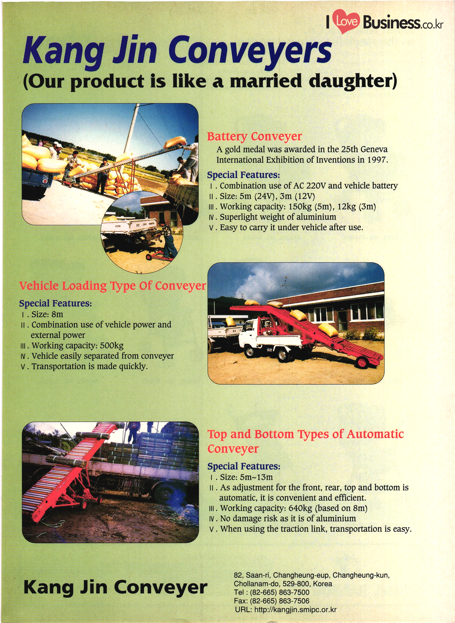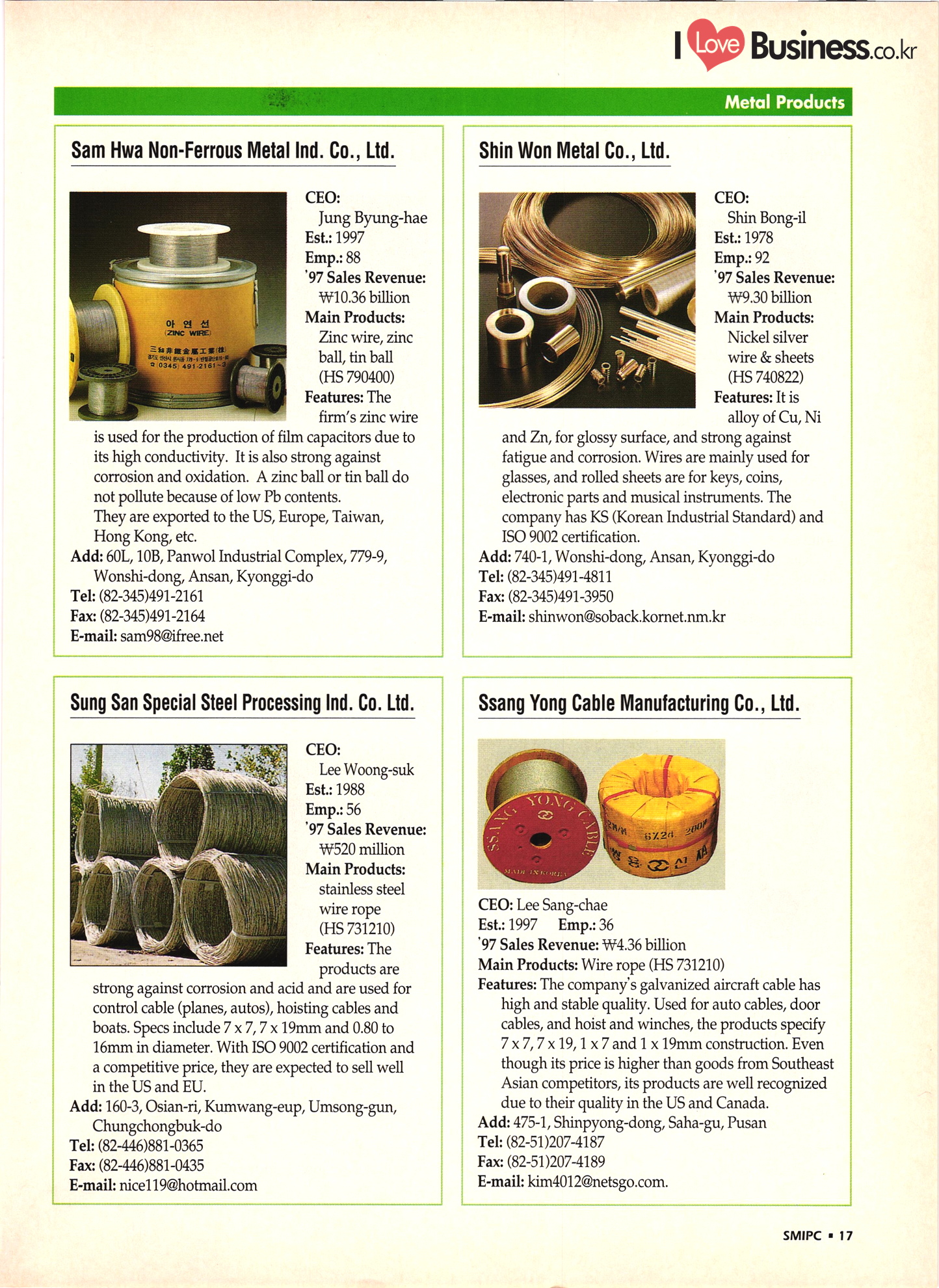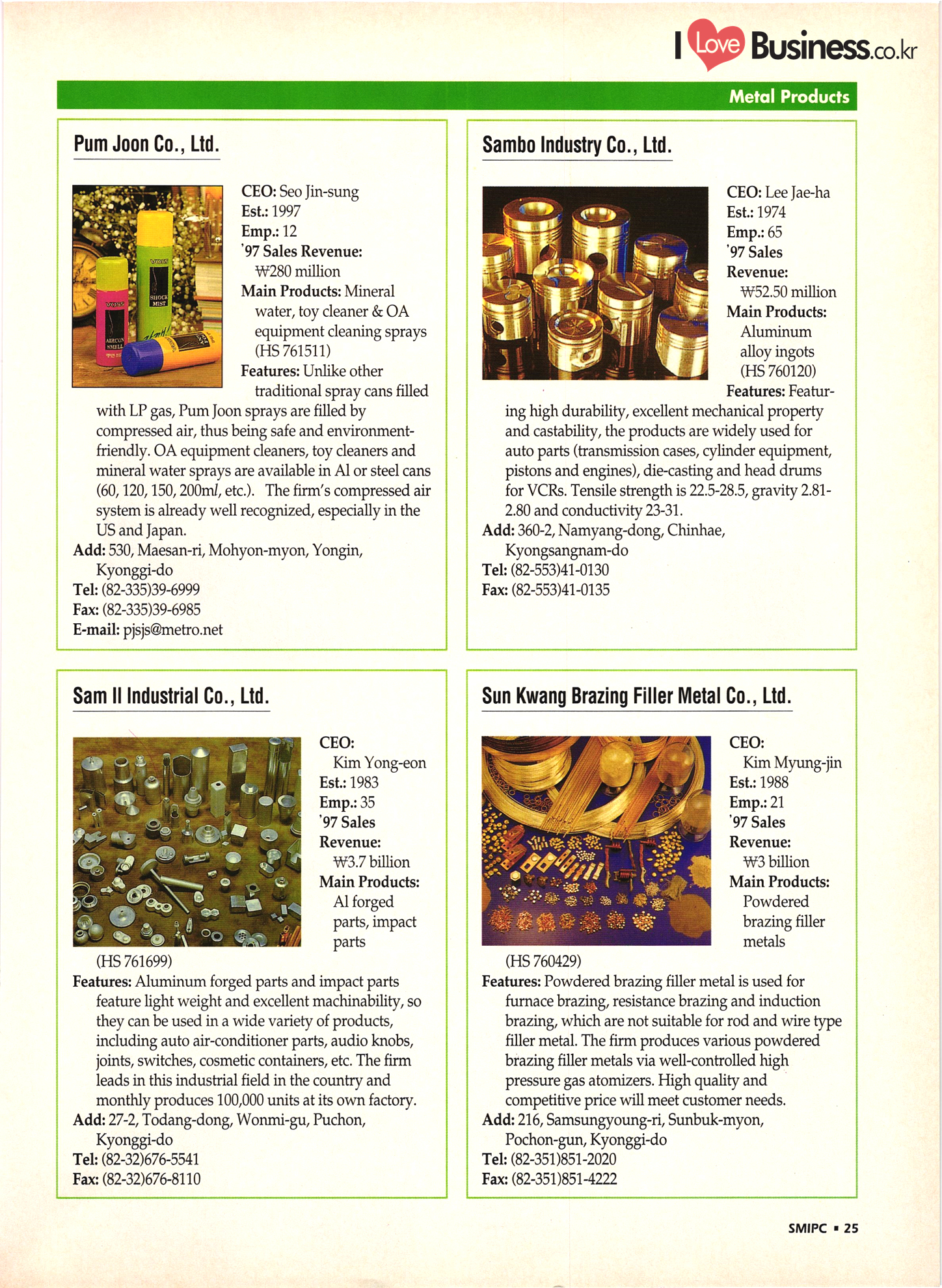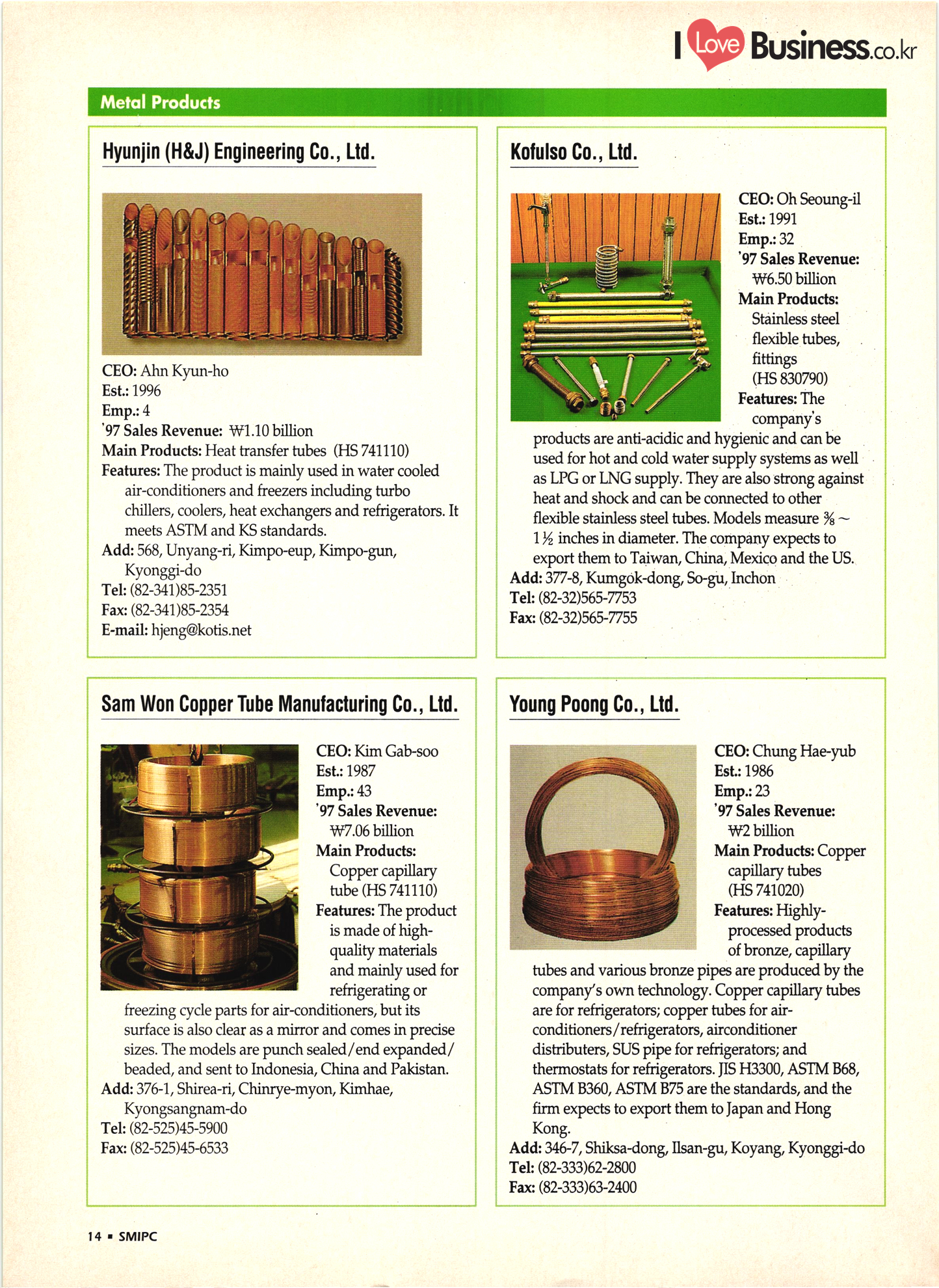 | I Love Business.co.kr small ME www.smallme.co.kr Quality Products from Korea CONTENTS • Metal Products • Machinery ..... Precision Equipment & Instrumentation • Electronic & Electric Products ........ 119 • Automobile Parts & ................... 191 Other Transportation Equipment • Chemical Products • Textile & Leather Products ......... Published on Aug. 5, 1998 by Small & Medium Industry Promotion Corporation (SMIPC) Add: 24-3, Yoido-dong, Yongdungpo-gu, Seoul, Korea Tel: (82-2)769-6841-50 Fax: (82-2)769-6959, 782-9702 E-mail: webmaster@smipc.or.kr URL: http://www.smipc.or.kr http://home.smipc.or.kr • Building Materials · • Household & Misc. Goods ........... Edited by Maekyung Buyers Guide Corp. Add: Trade Center PO Box 8, Seoul, Korea Tel: (82-2)551-2376-90 Fax: (82-2)551-2377, 2383 E-mail: mkbg@buyersguide.co.kr URL: http://www.buyersguide.co.kr Price: W20,000 Love Business Machinery Cutting tools Molds & dies Gears & reducers Material handling equipment Pumps & compressors Valves & fittings Blowers & fans Boilers Heat exchangers Packing M/C Metal working M/C Machine parts Welding M/C Automation equipment Construction equipment Food processing M/C Textile M/C & parts Paper working M/C Printing M/C Plastic processing M/C Semiconductor manufacturing equipment Refrigerators & air handling equipment 'Water treatment equipment Other industrial M/C |