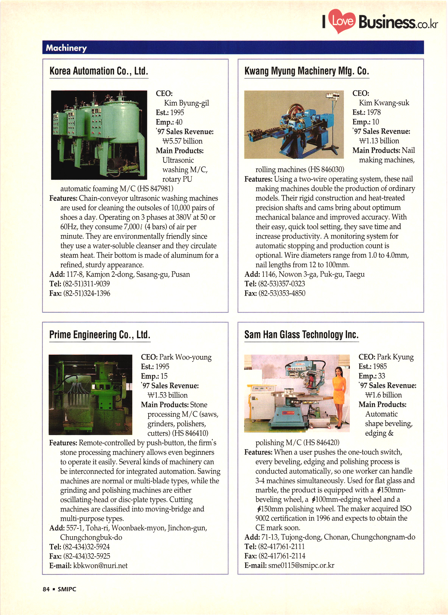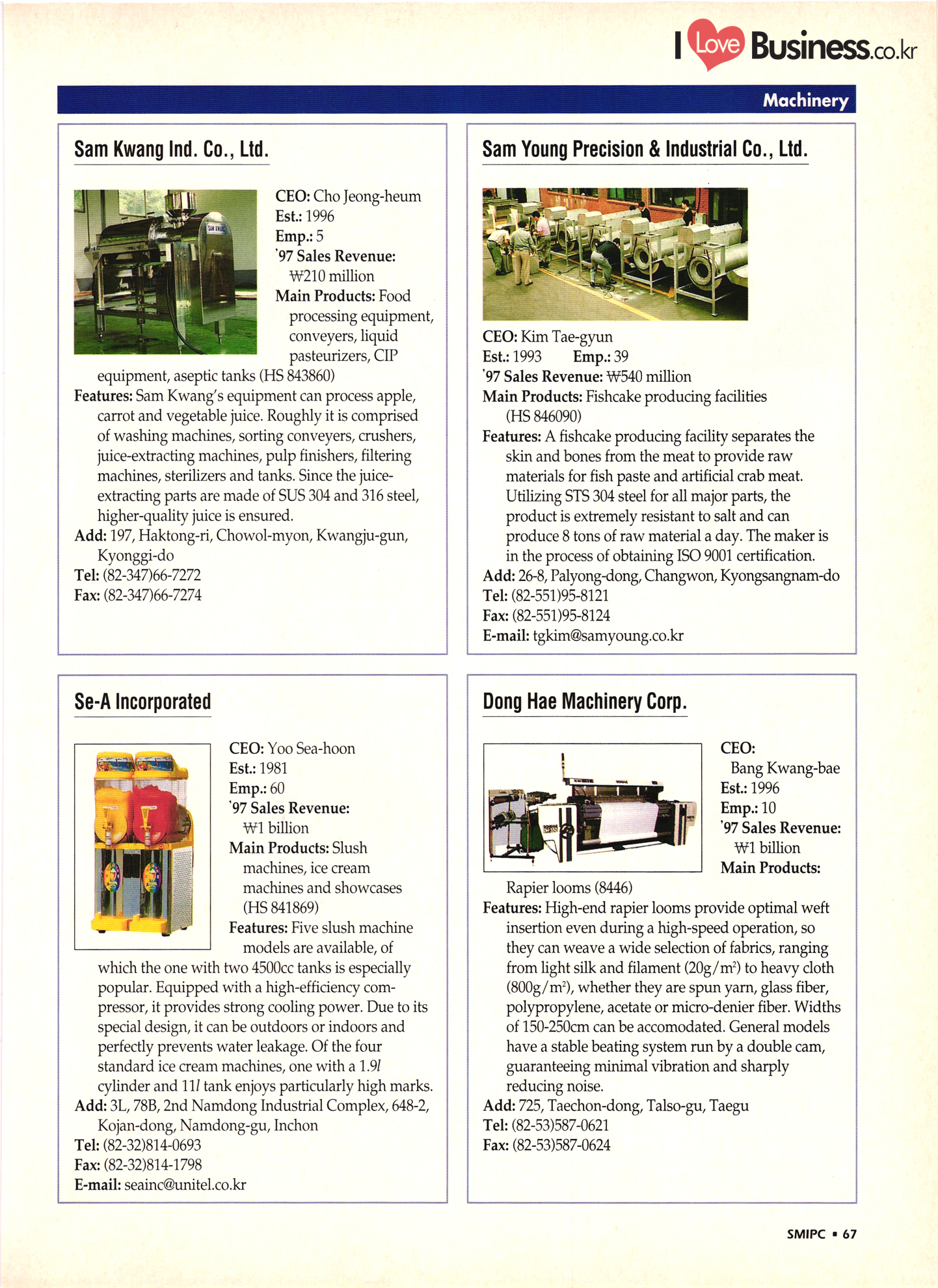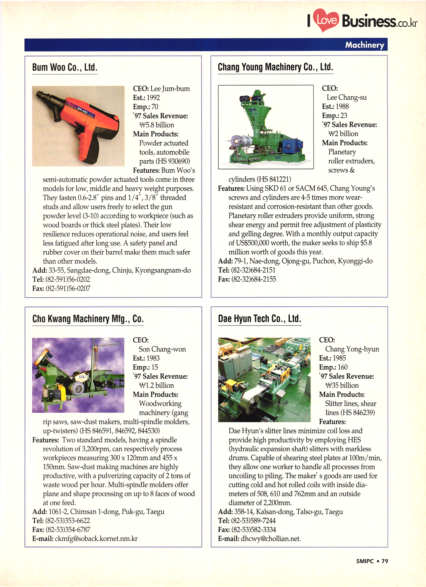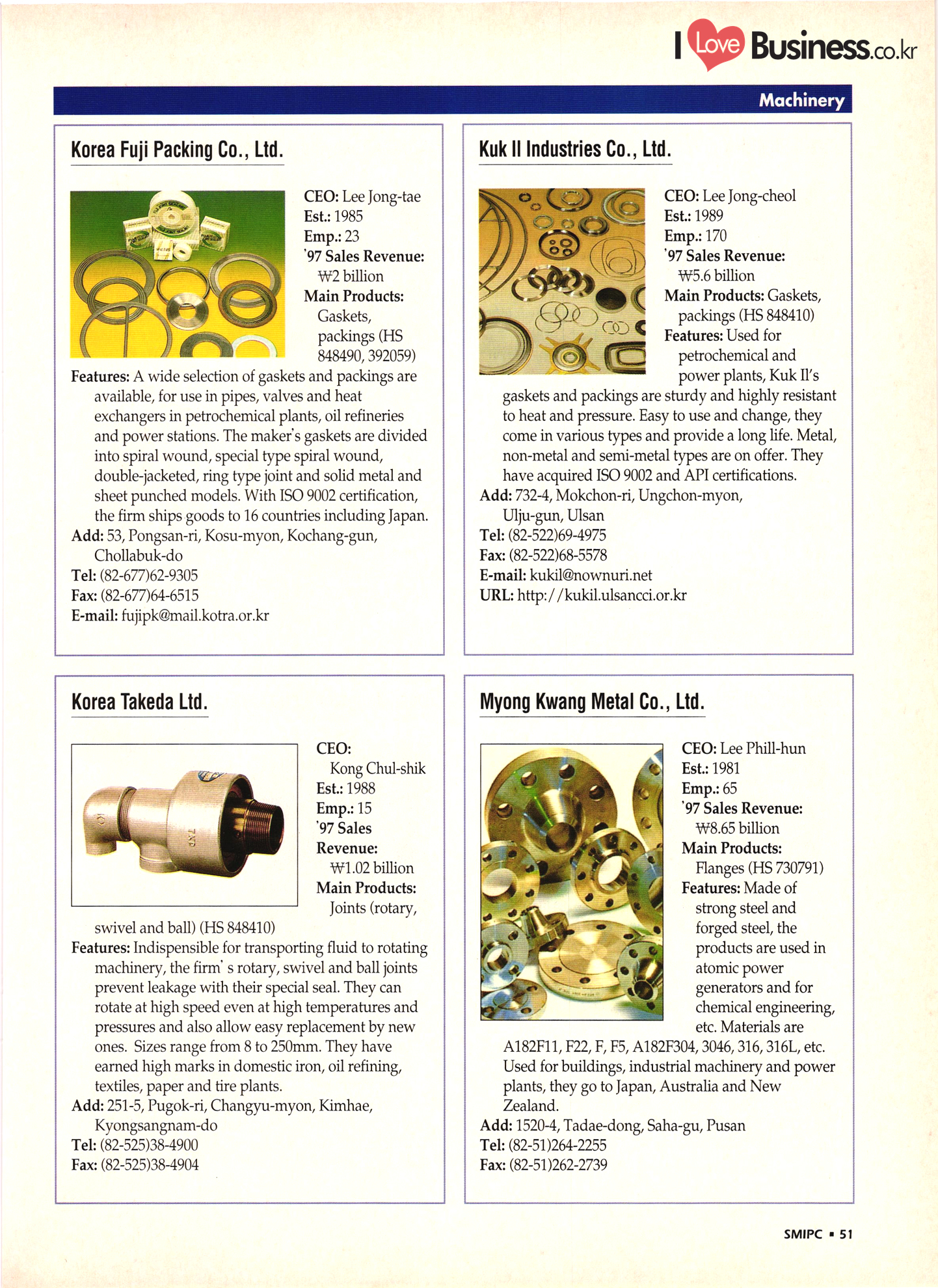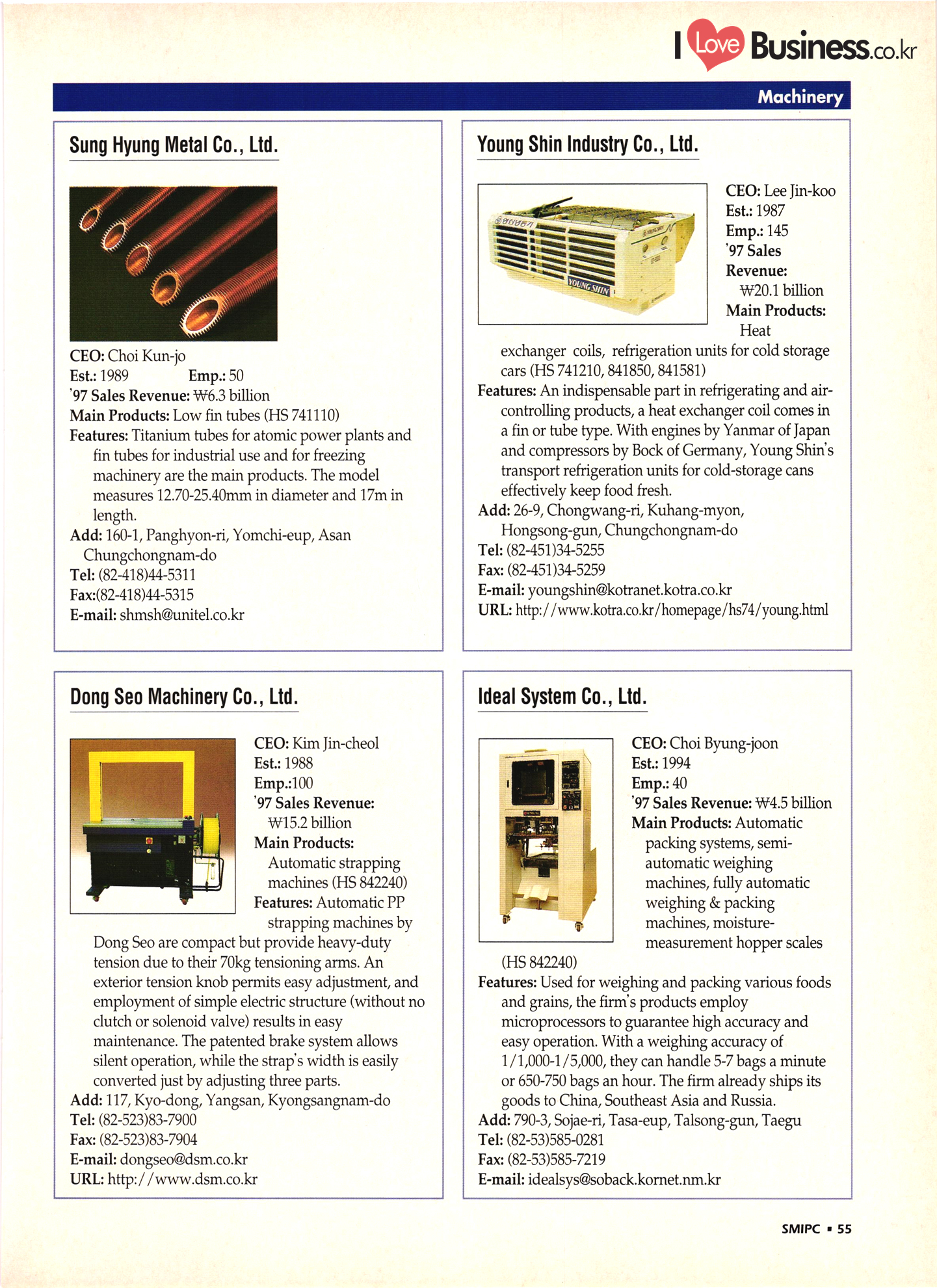 | I Love Business.co.kr small ME www.smallme.co.kr Quality Products from Korea CONTENTS • Metal Products • Machinery ..... Precision Equipment & Instrumentation • Electronic & Electric Products ........ 119 • Automobile Parts & ................... 191 Other Transportation Equipment • Chemical Products • Textile & Leather Products ......... Published on Aug. 5, 1998 by Small & Medium Industry Promotion Corporation (SMIPC) Add: 24-3, Yoido-dong, Yongdungpo-gu, Seoul, Korea Tel: (82-2)769-6841-50 Fax: (82-2)769-6959, 782-9702 E-mail: webmaster@smipc.or.kr URL: http://www.smipc.or.kr http://home.smipc.or.kr • Building Materials · • Household & Misc. Goods ........... Edited by Maekyung Buyers Guide Corp. Add: Trade Center PO Box 8, Seoul, Korea Tel: (82-2)551-2376-90 Fax: (82-2)551-2377, 2383 E-mail: mkbg@buyersguide.co.kr URL: http://www.buyersguide.co.kr Price: W20,000 Love Business Machinery Cutting tools Molds & dies Gears & reducers Material handling equipment Pumps & compressors Valves & fittings Blowers & fans Boilers Heat exchangers Packing M/C Metal working M/C Machine parts Welding M/C Automation equipment Construction equipment Food processing M/C Textile M/C & parts Paper working M/C Printing M/C Plastic processing M/C Semiconductor manufacturing equipment Refrigerators & air handling equipment 'Water treatment equipment Other industrial M/C |