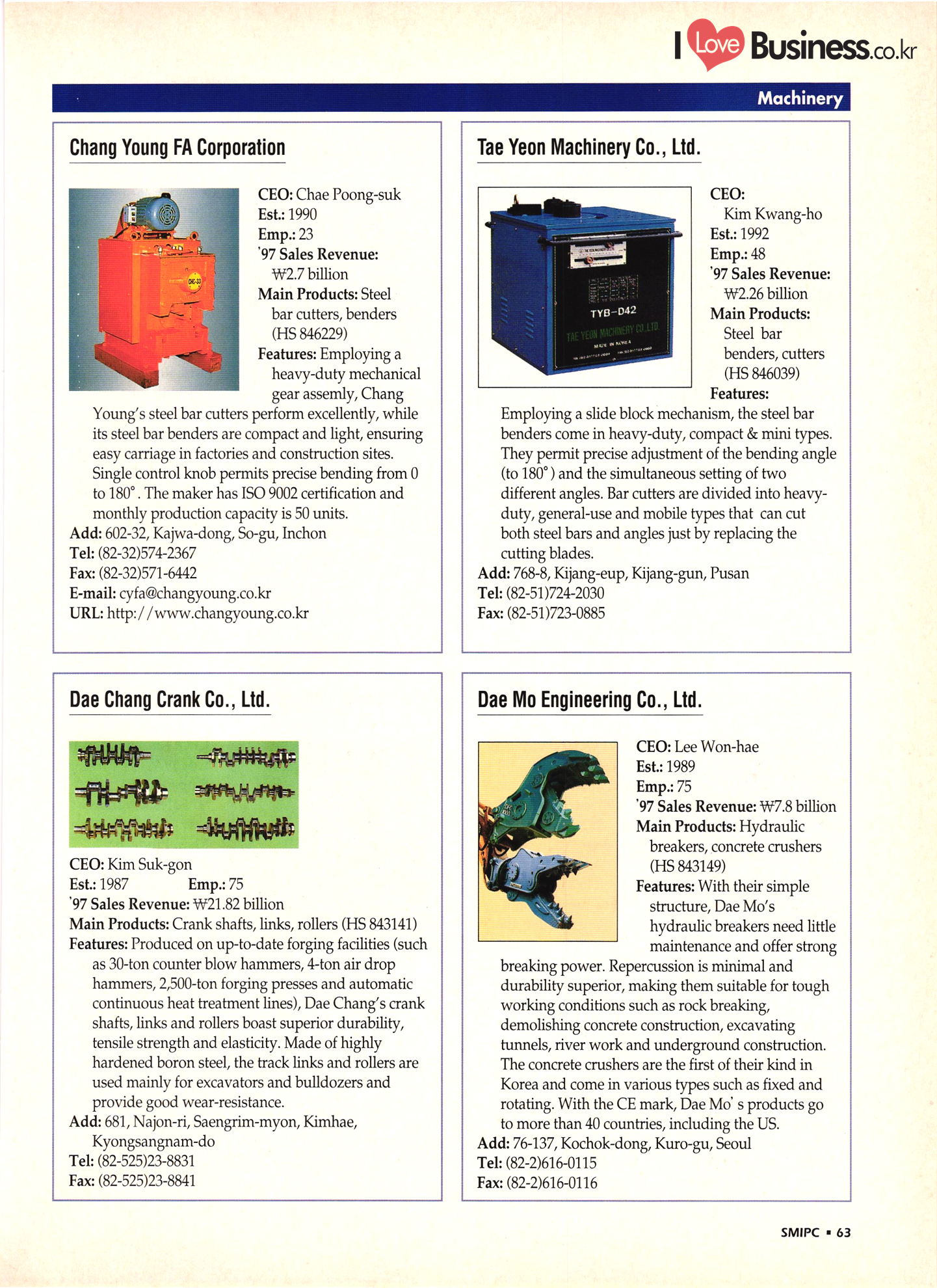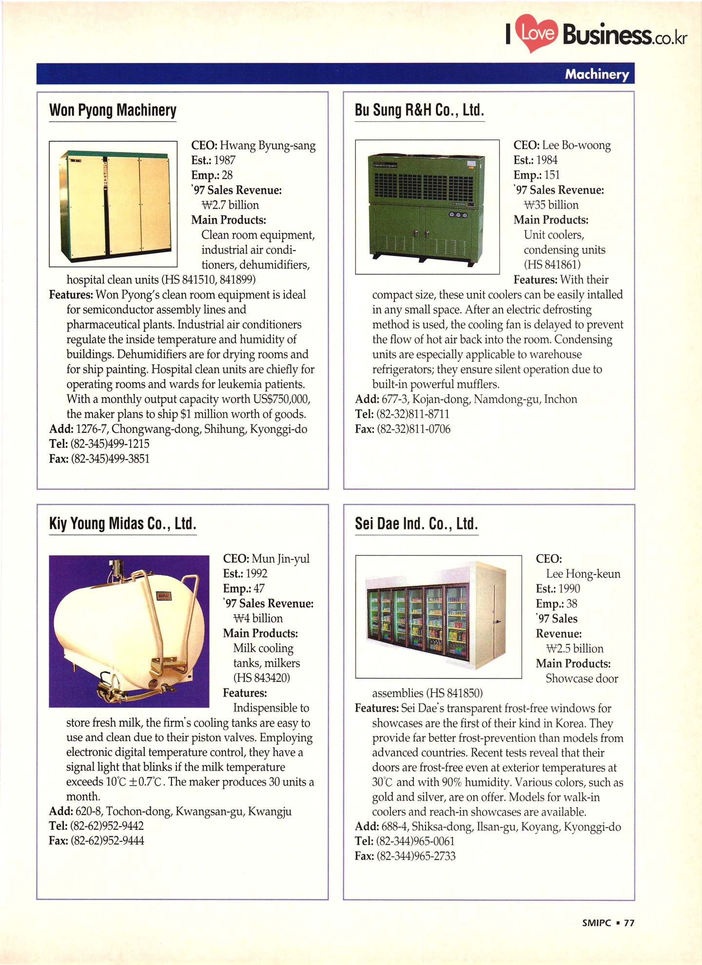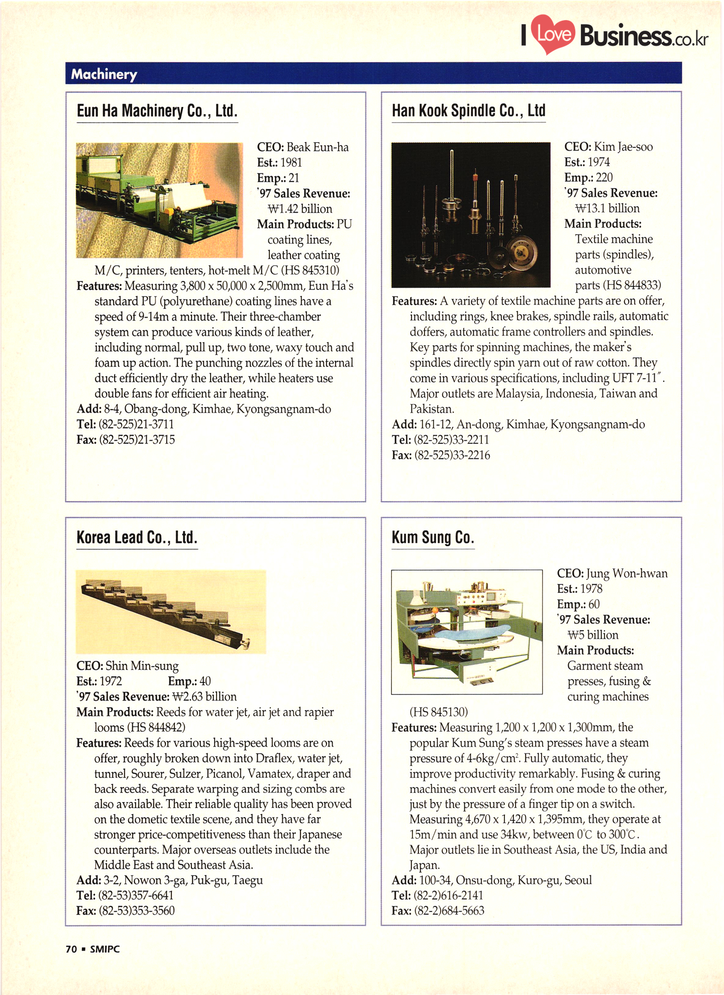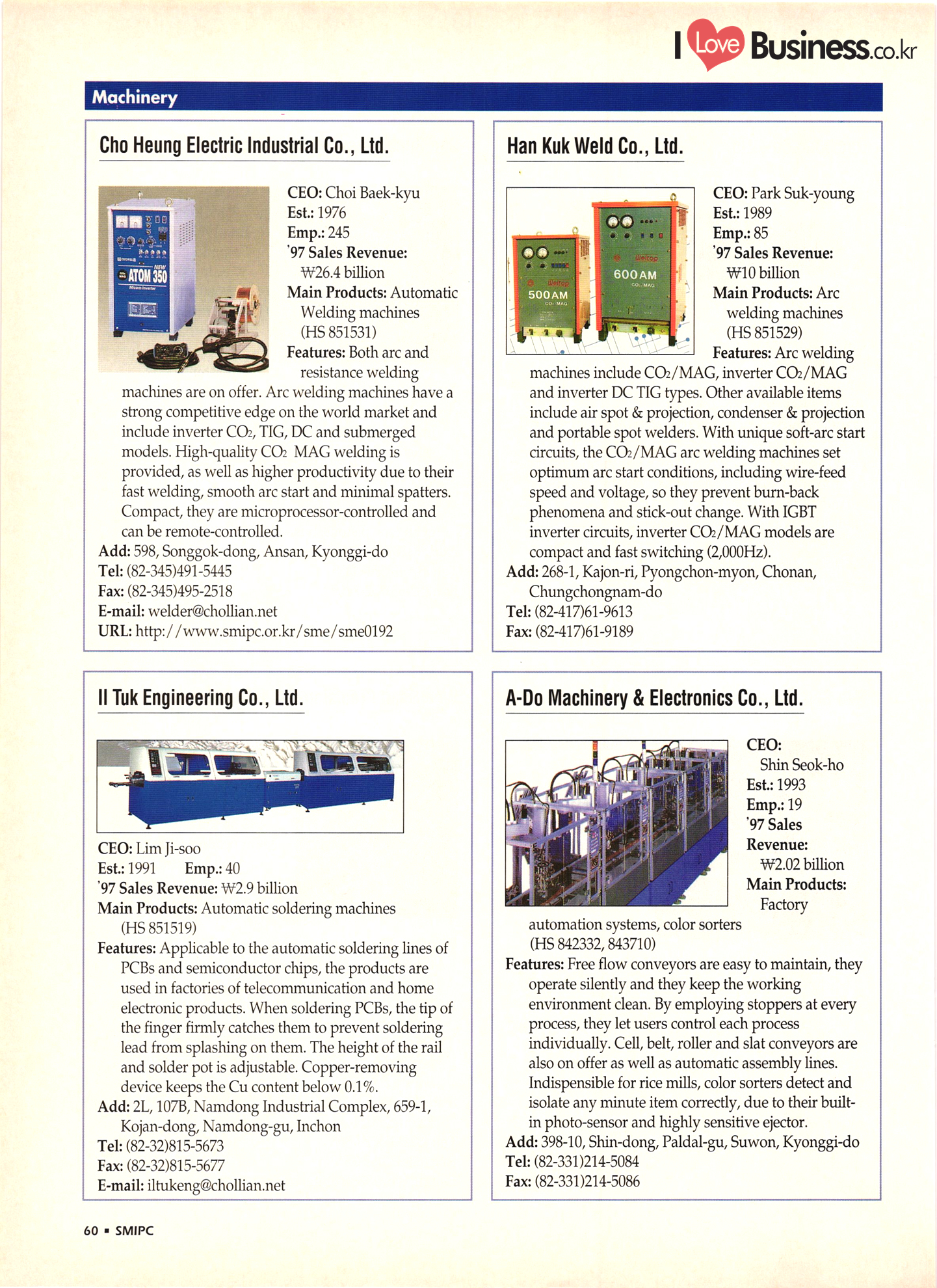 | I Love Business.co.kr small ME www.smallme.co.kr Quality Products from Korea CONTENTS • Metal Products • Machinery ..... Precision Equipment & Instrumentation • Electronic & Electric Products ........ 119 • Automobile Parts & ................... 191 Other Transportation Equipment • Chemical Products • Textile & Leather Products ......... Published on Aug. 5, 1998 by Small & Medium Industry Promotion Corporation (SMIPC) Add: 24-3, Yoido-dong, Yongdungpo-gu, Seoul, Korea Tel: (82-2)769-6841-50 Fax: (82-2)769-6959, 782-9702 E-mail: webmaster@smipc.or.kr URL: http://www.smipc.or.kr http://home.smipc.or.kr • Building Materials · • Household & Misc. Goods ........... Edited by Maekyung Buyers Guide Corp. Add: Trade Center PO Box 8, Seoul, Korea Tel: (82-2)551-2376-90 Fax: (82-2)551-2377, 2383 E-mail: mkbg@buyersguide.co.kr URL: http://www.buyersguide.co.kr Price: W20,000 Love Business Machinery Cutting tools Molds & dies Gears & reducers Material handling equipment Pumps & compressors Valves & fittings Blowers & fans Boilers Heat exchangers Packing M/C Metal working M/C Machine parts Welding M/C Automation equipment Construction equipment Food processing M/C Textile M/C & parts Paper working M/C Printing M/C Plastic processing M/C Semiconductor manufacturing equipment Refrigerators & air handling equipment 'Water treatment equipment Other industrial M/C |