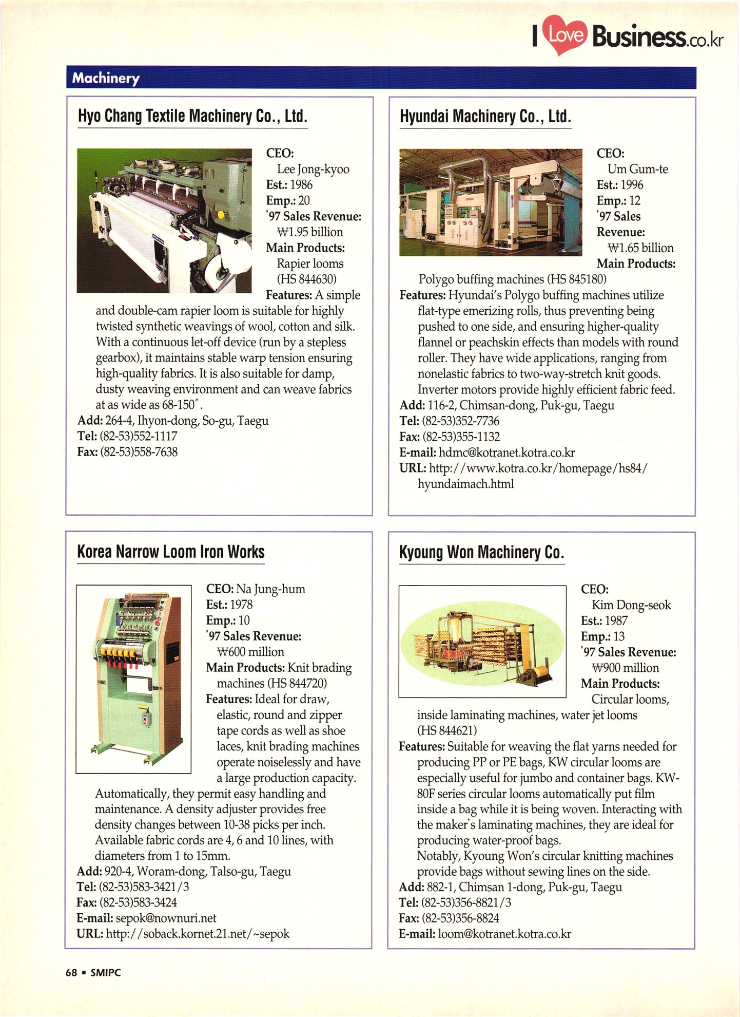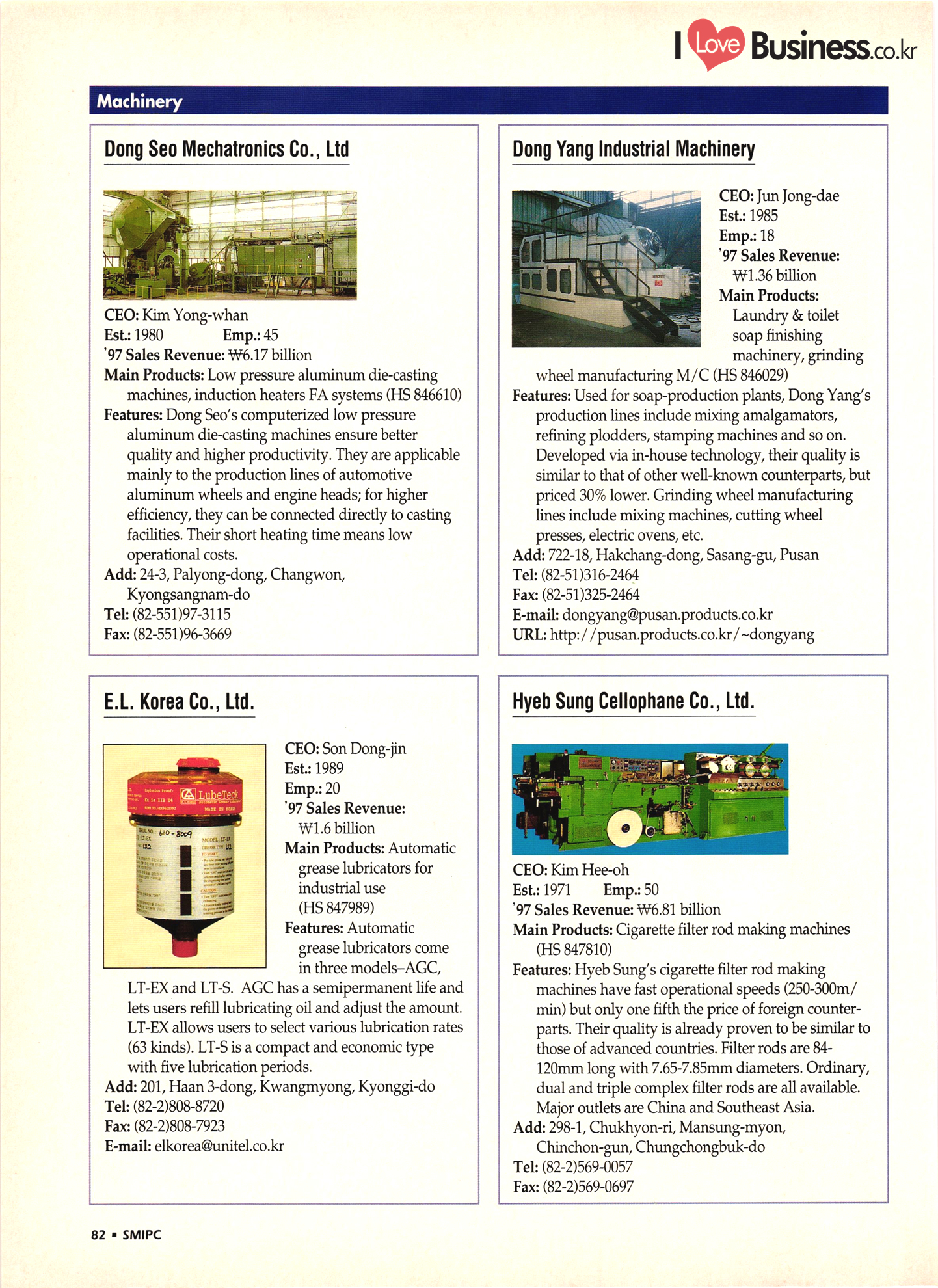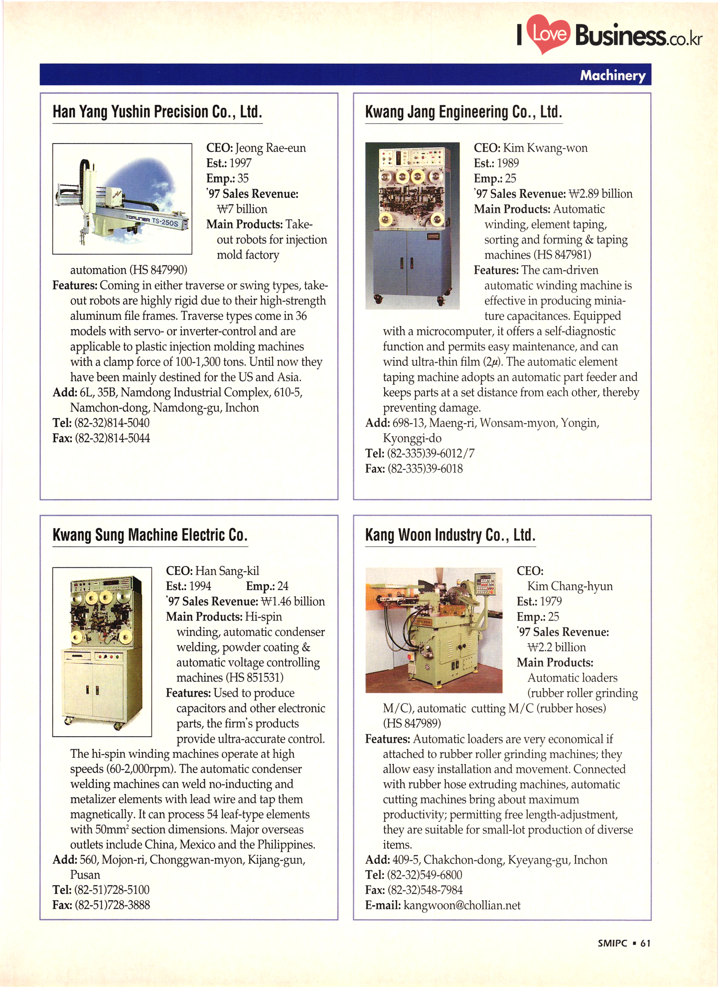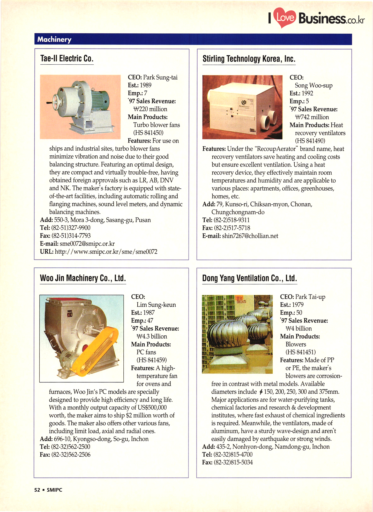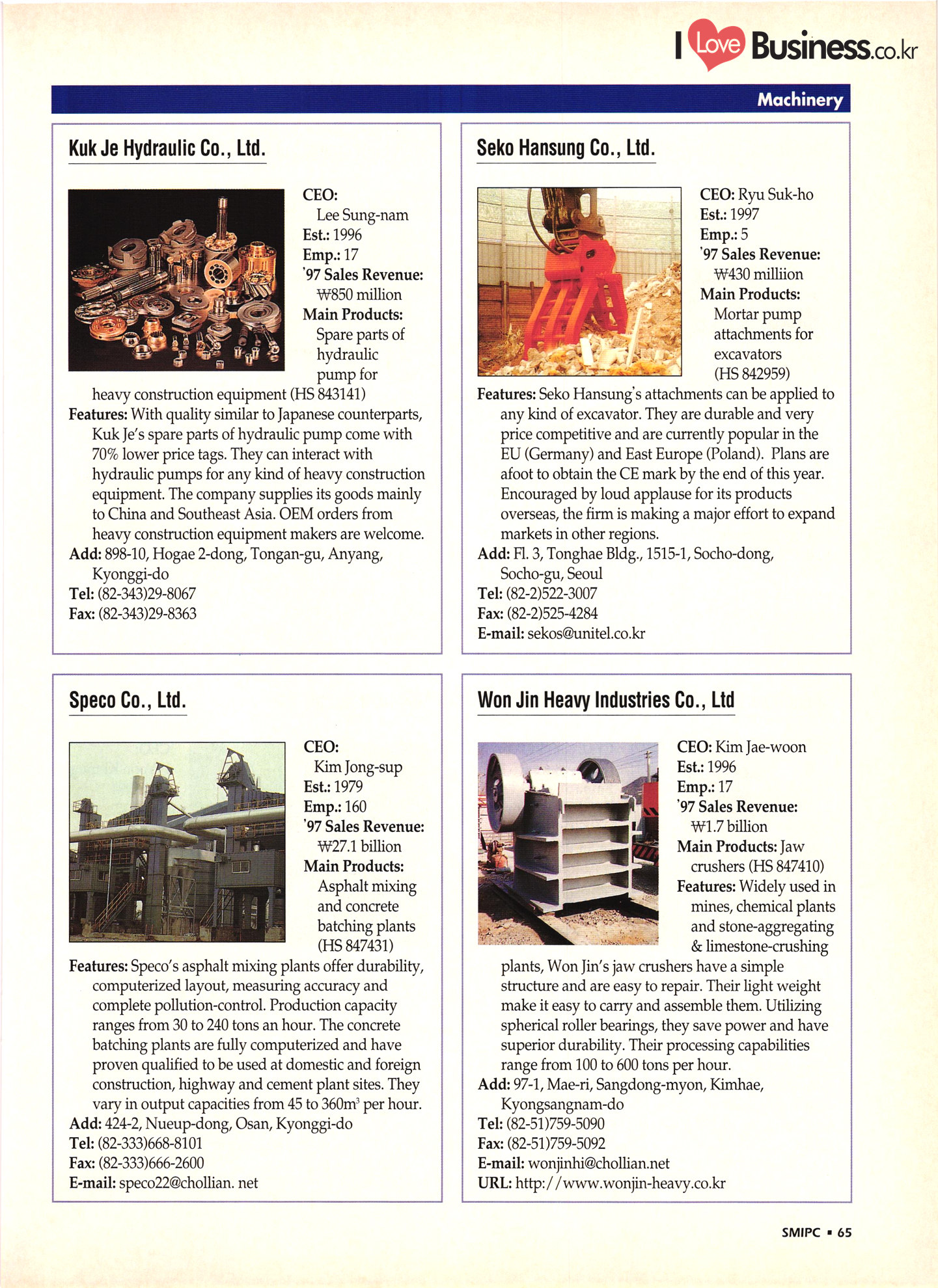 | I Love Business.co.kr small ME www.smallme.co.kr Quality Products from Korea CONTENTS • Metal Products • Machinery ..... Precision Equipment & Instrumentation • Electronic & Electric Products ........ 119 • Automobile Parts & ................... 191 Other Transportation Equipment • Chemical Products • Textile & Leather Products ......... Published on Aug. 5, 1998 by Small & Medium Industry Promotion Corporation (SMIPC) Add: 24-3, Yoido-dong, Yongdungpo-gu, Seoul, Korea Tel: (82-2)769-6841-50 Fax: (82-2)769-6959, 782-9702 E-mail: webmaster@smipc.or.kr URL: http://www.smipc.or.kr http://home.smipc.or.kr • Building Materials · • Household & Misc. Goods ........... Edited by Maekyung Buyers Guide Corp. Add: Trade Center PO Box 8, Seoul, Korea Tel: (82-2)551-2376-90 Fax: (82-2)551-2377, 2383 E-mail: mkbg@buyersguide.co.kr URL: http://www.buyersguide.co.kr Price: W20,000 Love Business Machinery Cutting tools Molds & dies Gears & reducers Material handling equipment Pumps & compressors Valves & fittings Blowers & fans Boilers Heat exchangers Packing M/C Metal working M/C Machine parts Welding M/C Automation equipment Construction equipment Food processing M/C Textile M/C & parts Paper working M/C Printing M/C Plastic processing M/C Semiconductor manufacturing equipment Refrigerators & air handling equipment 'Water treatment equipment Other industrial M/C |