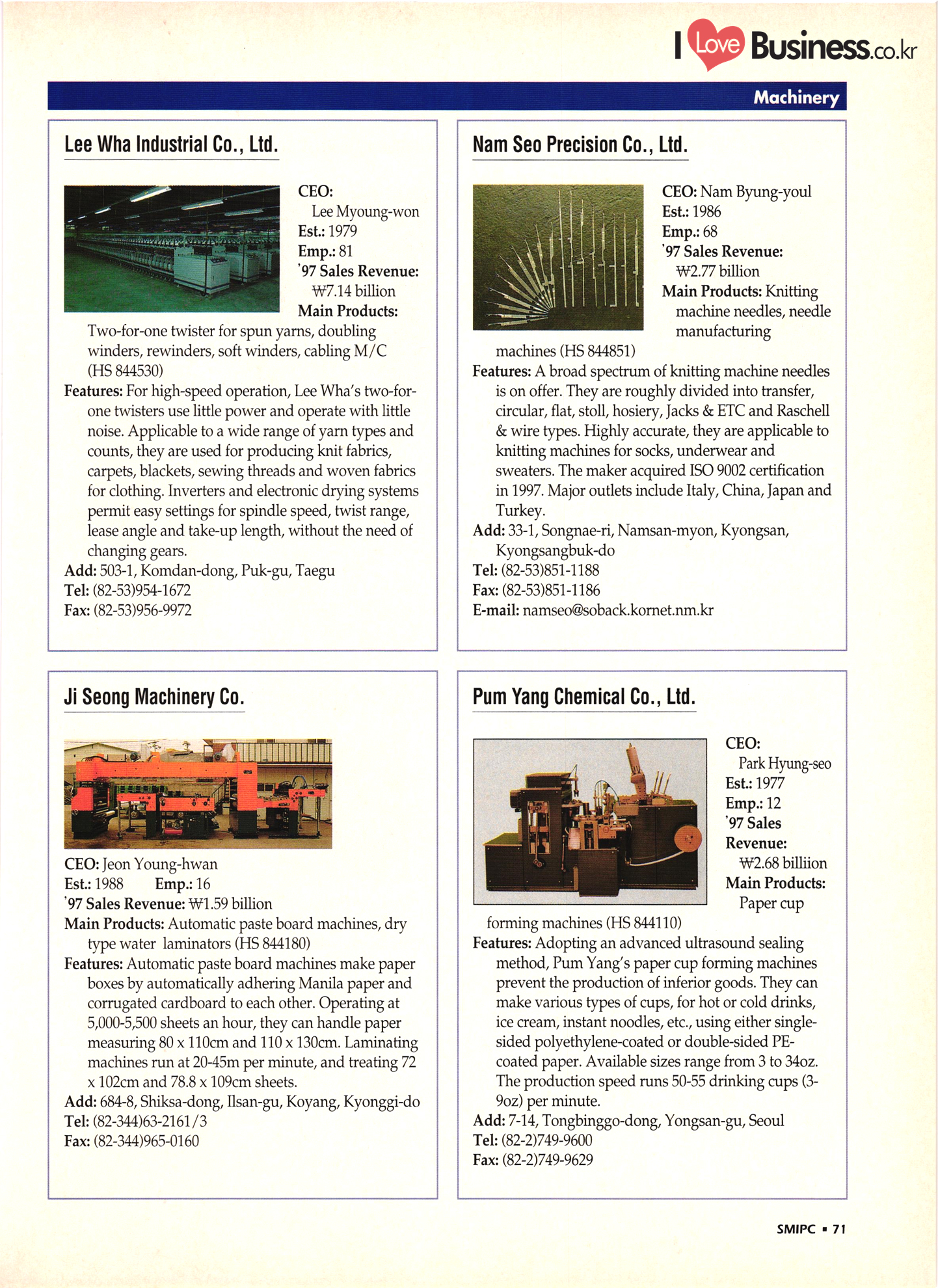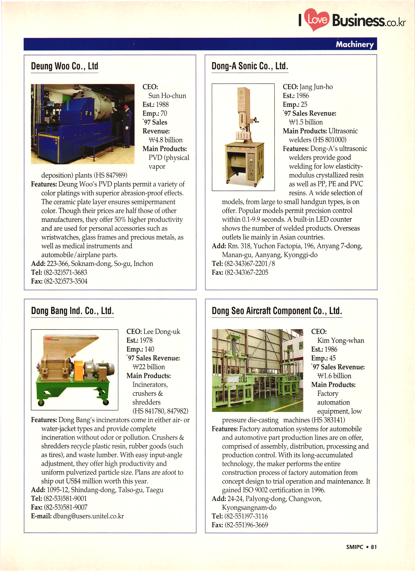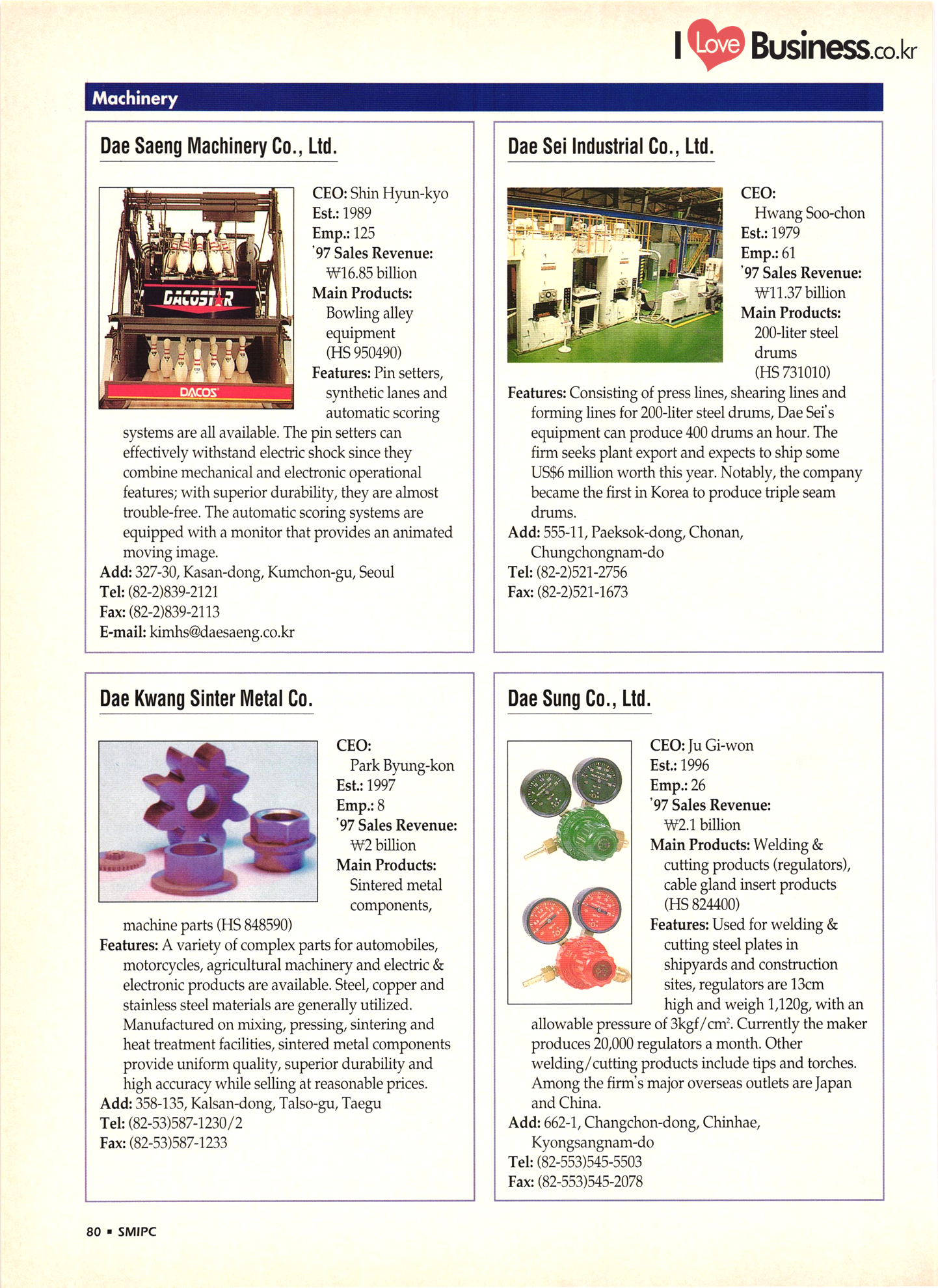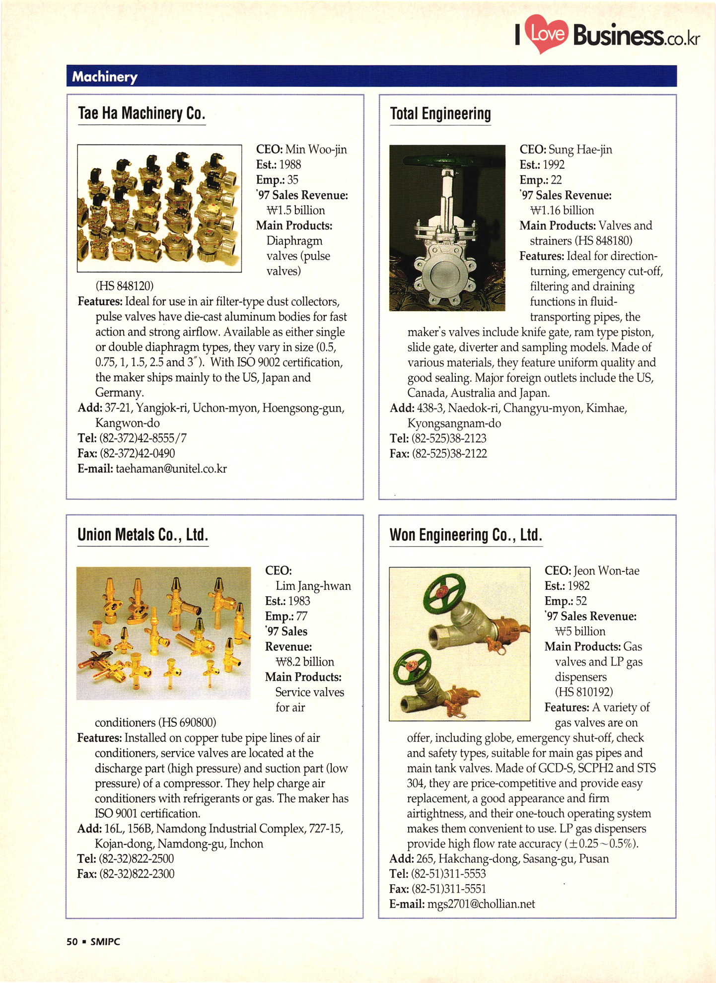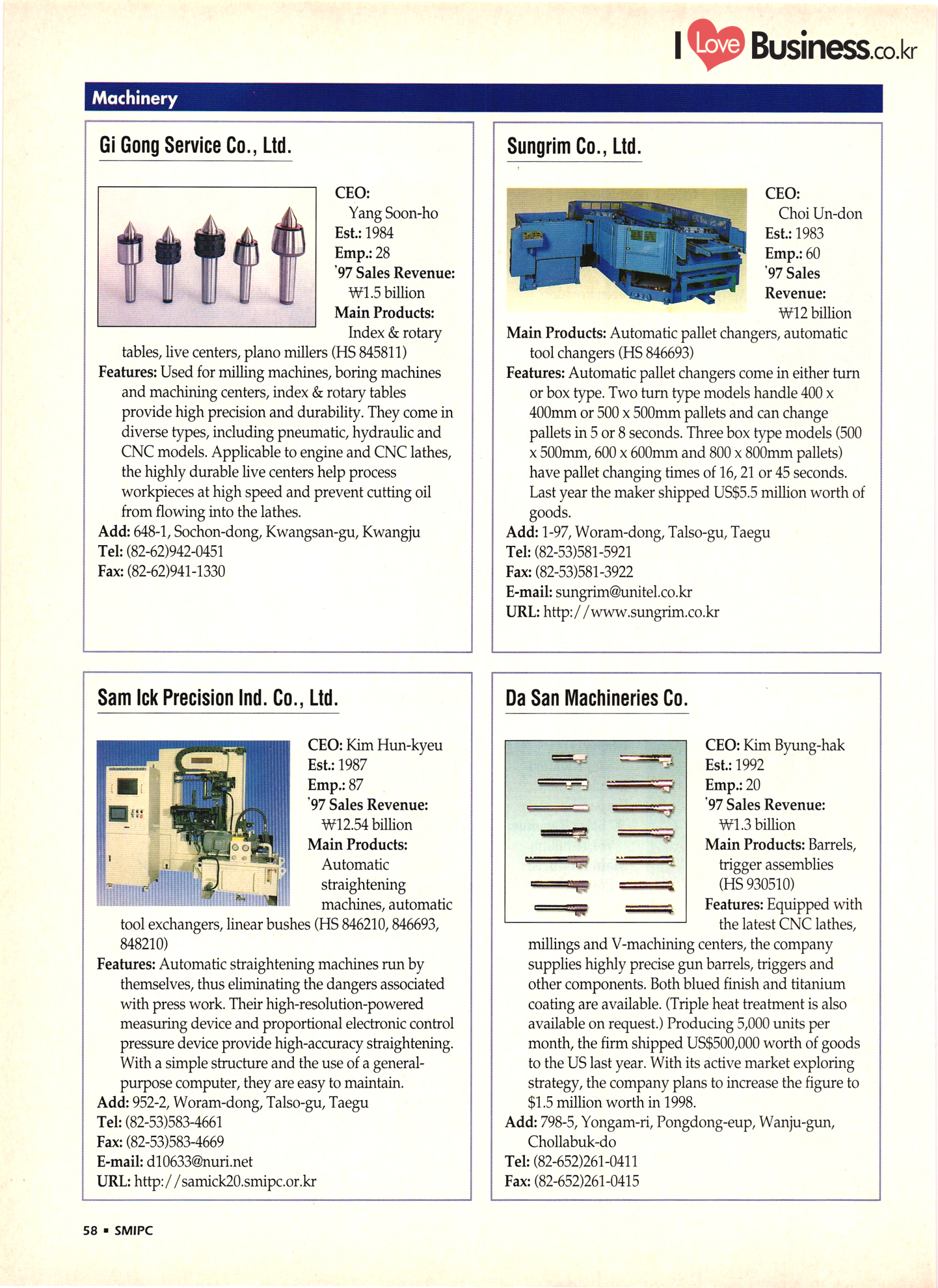 | I Love Business.co.kr small ME www.smallme.co.kr Quality Products from Korea CONTENTS • Metal Products • Machinery ..... Precision Equipment & Instrumentation • Electronic & Electric Products ........ 119 • Automobile Parts & ................... 191 Other Transportation Equipment • Chemical Products • Textile & Leather Products ......... Published on Aug. 5, 1998 by Small & Medium Industry Promotion Corporation (SMIPC) Add: 24-3, Yoido-dong, Yongdungpo-gu, Seoul, Korea Tel: (82-2)769-6841-50 Fax: (82-2)769-6959, 782-9702 E-mail: webmaster@smipc.or.kr URL: http://www.smipc.or.kr http://home.smipc.or.kr • Building Materials · • Household & Misc. Goods ........... Edited by Maekyung Buyers Guide Corp. Add: Trade Center PO Box 8, Seoul, Korea Tel: (82-2)551-2376-90 Fax: (82-2)551-2377, 2383 E-mail: mkbg@buyersguide.co.kr URL: http://www.buyersguide.co.kr Price: W20,000 Love Business Machinery Cutting tools Molds & dies Gears & reducers Material handling equipment Pumps & compressors Valves & fittings Blowers & fans Boilers Heat exchangers Packing M/C Metal working M/C Machine parts Welding M/C Automation equipment Construction equipment Food processing M/C Textile M/C & parts Paper working M/C Printing M/C Plastic processing M/C Semiconductor manufacturing equipment Refrigerators & air handling equipment 'Water treatment equipment Other industrial M/C |